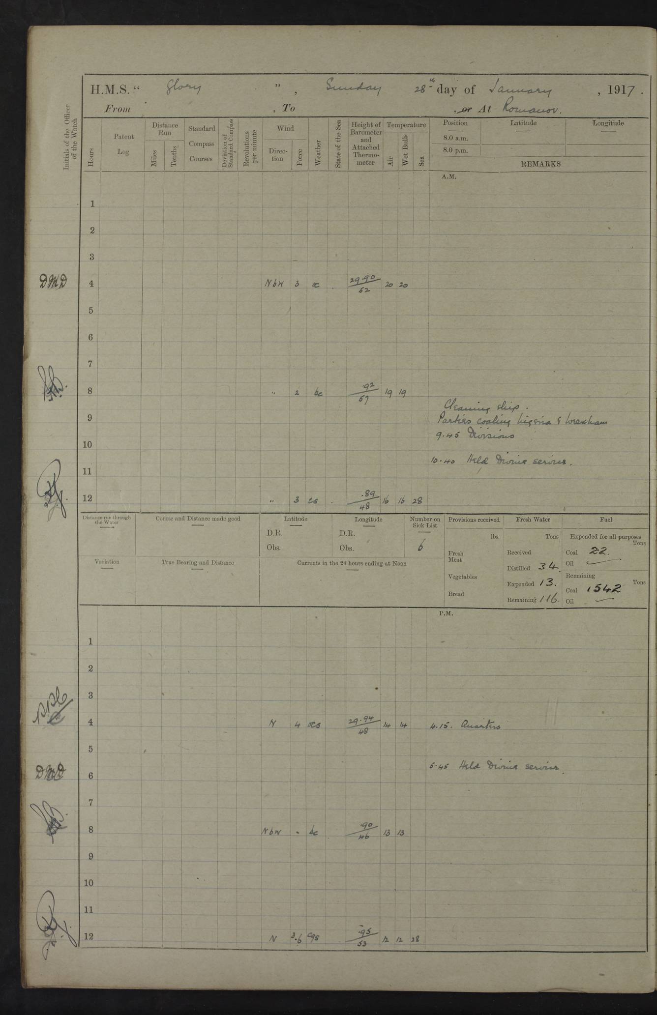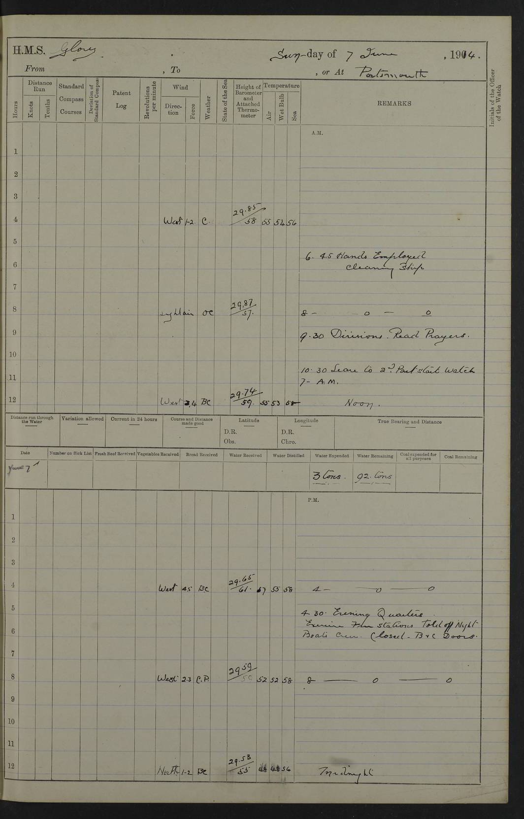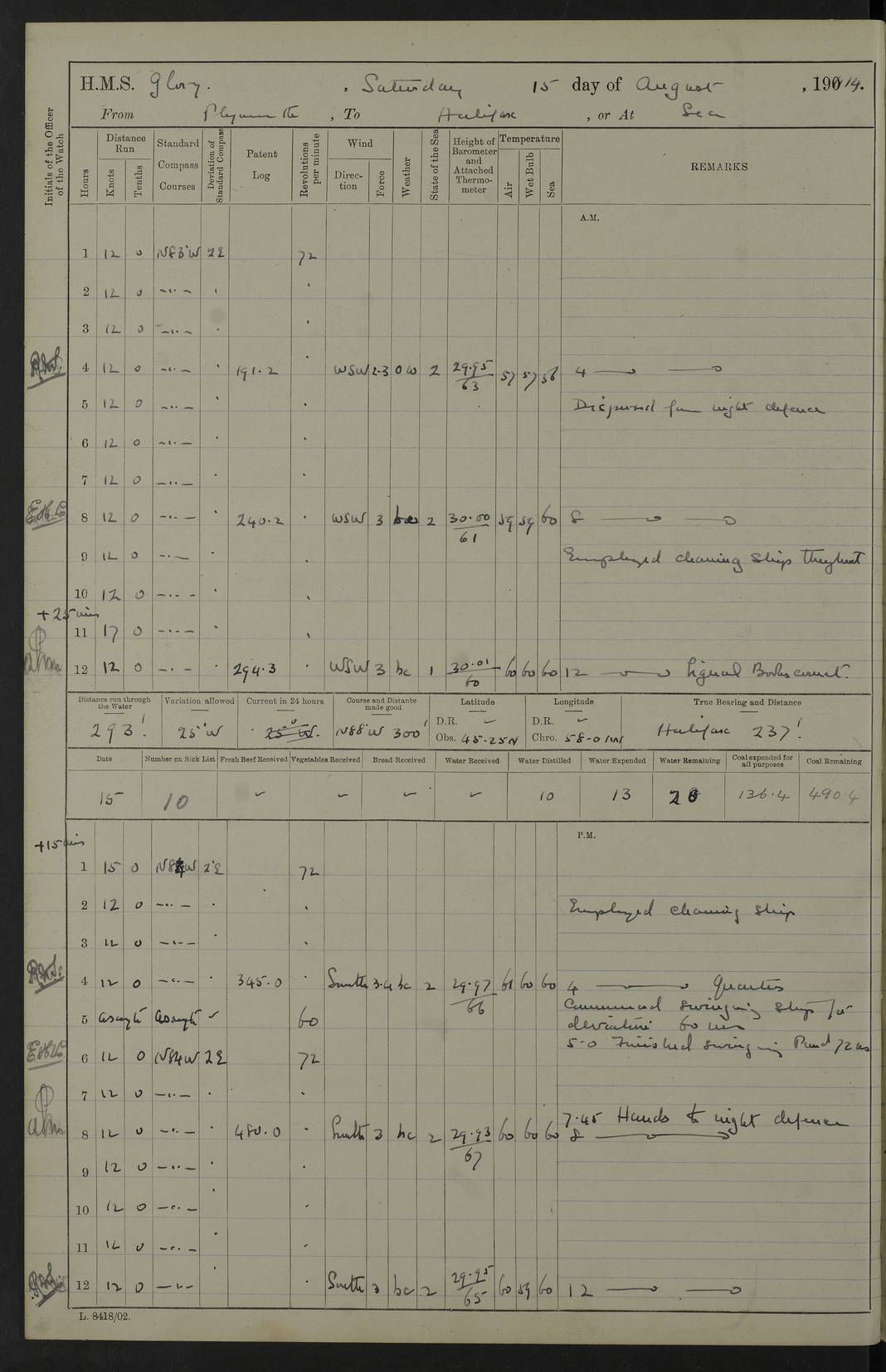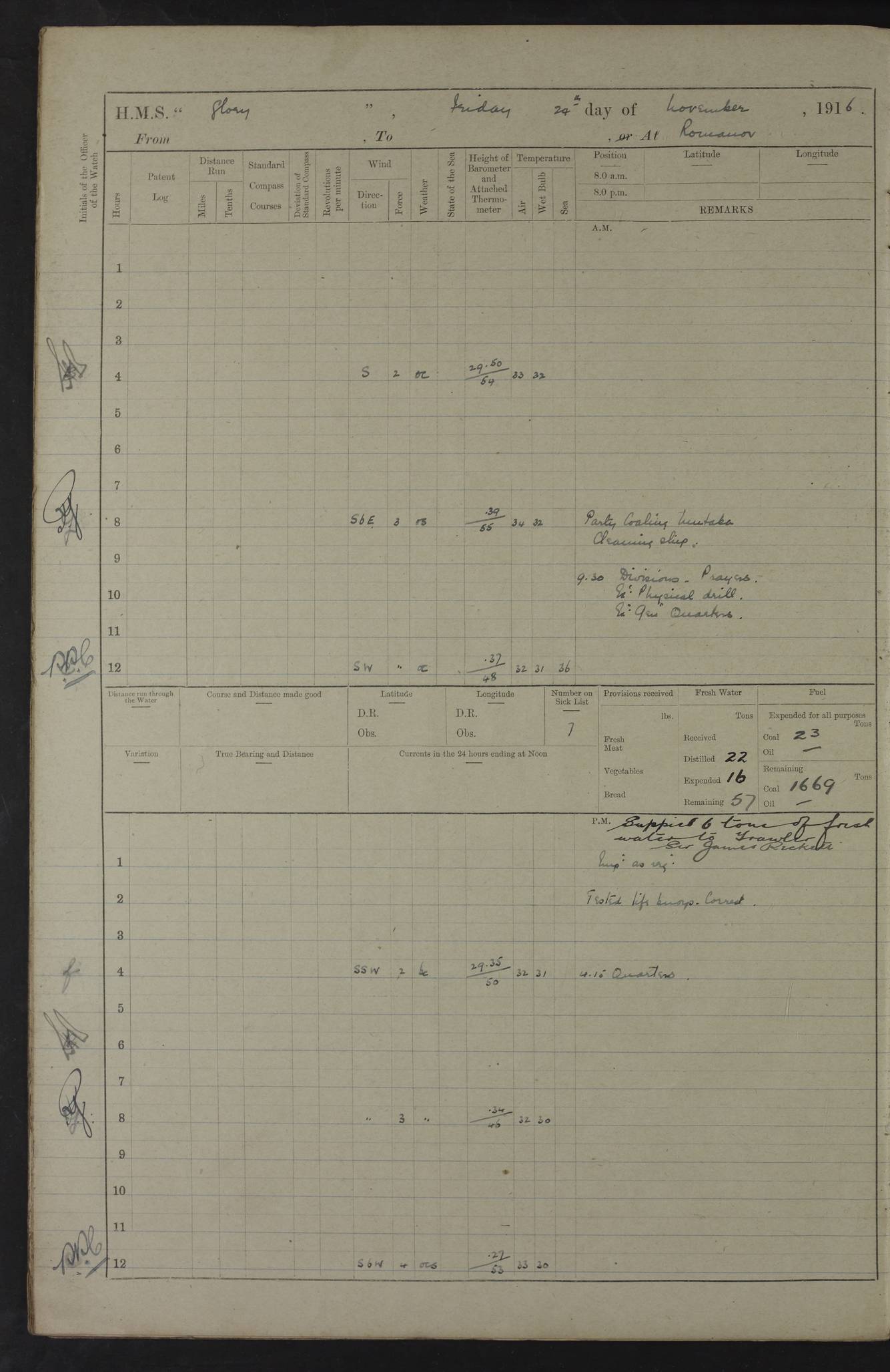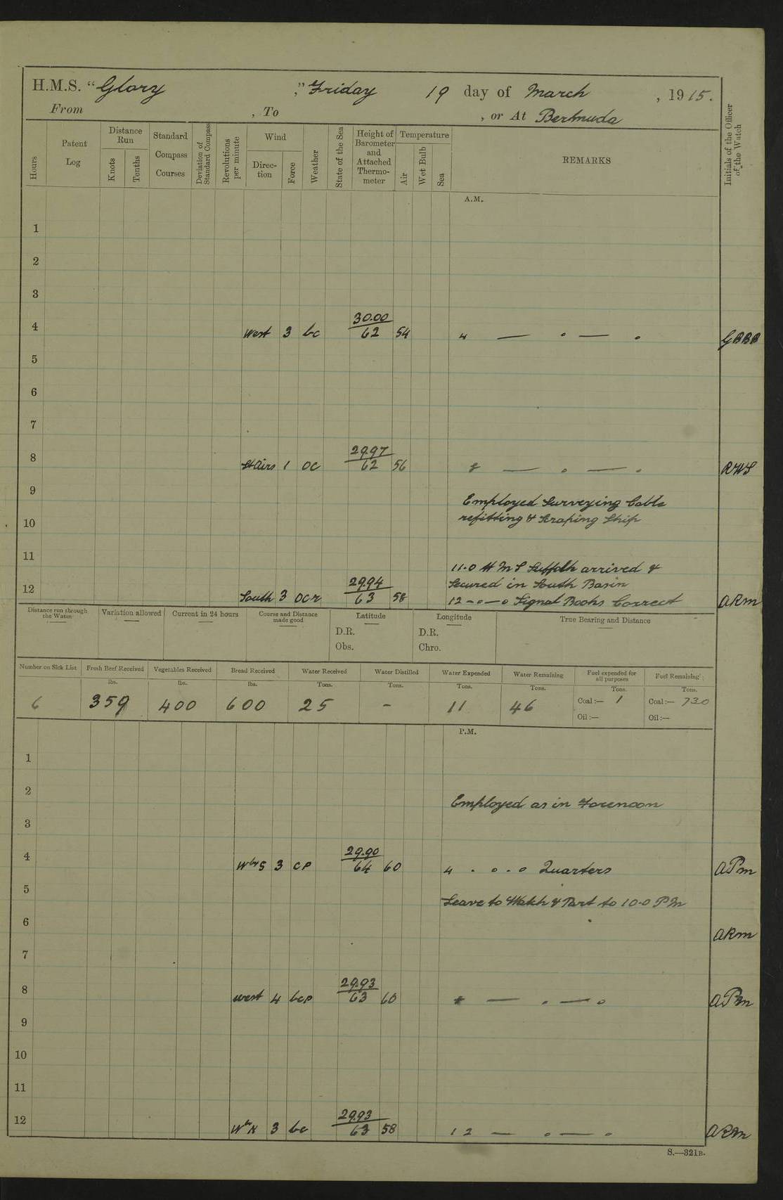 22 June 1915 At sea, Gibraltar to Lemnos Lat 36.1, Long -1.3 4.15am: Sighted land on starboard bow. 10.20am: Stopped port engine for repairs. 11.20am: proceeded with port engine. pm: a/c due to change in deviation. 10.00pm: Cape Tenez Light abeam, 18 miles. 4f73cd61a2fc8ea9030015f6: (https://s3.amazonaws.com:443/oldweather/ADM53-43015/0012_1.jpg) 23 June 1915 At sea, Gibraltar to Lemnos Lat 37.5, Long 4.8 Number on sick list: 4 5.00am: Secured from night defence stations. Placed anti-submarine guns. pm: Life saving appliances served out to men stationed in ? ?at abandon ship. 4f73cd61a2fc8ea9030015f7: (https://s3.amazonaws.com:443/oldweather/ADM53-43015/0013_0.jpg) 24 June 1915 At sea, Gibraltar to Lemnos Lat 37.4, Long 10.8 Position in log clearly bears no resemblance to the location of the ship. Position above is approximate and is based sighting of Zembra Island at 11.55am. 5.00am: Dispersed from night defence stations. Manned anti-submarine guns. am: Sighted two French torpedo boats. am: Torpedo boats passed to ~ No 362, 363. am: Sighted land on starboard beam. 11.55am: Zembra Island abeam, 25 miles. 2.00pm: Sighted Pantellaria S34ºE. 4.45pm: Pantellaria Light House abeam 12 miles. 4f73cd61a2fc8ea9030015f8: (https://s3.amazonaws.com:443/oldweather/ADM53-43015/0013_1.jpg) 25 June 1915 At sea, Gibraltar to Lemnos Lat 35.5, Long 16.7 2.10am: Gozo Light abeam 17 miles. 5.00am: Dispersed from night defence stations. Manned anti-submarine guns. 4f73cd61a2fc8ea9030015f9: (https://s3.amazonaws.com:443/oldweather/ADM53-43015/0014_0.jpg) 26 June 1915 At sea, Gibraltar to Lemnos Lat 35.5, Long 22.6 Number on sick list: 5 5.00am: Dispersed from night defence stations. Manned anti-submarine guns. am: Aired night clothing. am: marines at maxim practice on quarter deck. 2.00pm: Observed land on either bow. 3.00pm: Sighted French patrol destroyer. 4.15pm: Sighted French patrol destroyer. 9.40pm: Milo Peak N63ºW. 10.26pm: Polino Light abeam to port 5.5 miles. 4f73cd62a2fc8ea9030015fa: (https://s3.amazonaws.com:443/oldweather/ADM53-43015/0014_1.jpg) 27 June 1915 At sea and at Lemnos Lat 39.1, Long 24.4 From 0.50 to 3.05am sighting of multiple light houses. 3.50am: a/c to N39ºW and commenced to zig-zag. 5.00am: Dispersed from night defence stations and placed anti-submarine guns and look-outs. am: Lost overboard by accident Hazlewood fender, pat. 311, one in number. 10.30am: Held Divine Service onboard. pm: Met and signalled HMS Minerva on patrol duty. pm: Courses and speeds as requisite while waiting orders to approach Mudros. 3.00pm: Proceeded. 5.16pm: Increased to 90 revs, commenced to zig-zag. Course as requisite for Mudros. 7.00pm: Entered Mudros Bay. 7.47pm: Stopped. Let go port anchor in ‘M3’. 8.30pm: Darkened ship. pm: Manned one 6” and one 12 pdr. 4f73cd62a2fc8ea9030015fb: (https://s3.amazonaws.com:443/oldweather/ADM53-43015/0015_0.jpg) 28 June 1915 Mudros Bay, Lemnos Lat 39.89, Long 25.24 5,00am: HMS Vengeance entered harbour. HMS Vengeance was a pre-dreadnought of the Canopus class, launched in 1899 at Vickers, Barrow, and sold for scrapping in 1921. Details at http://en.wikipedia.org/wiki/HMS_Vengeance_(1899) . am/pm/: hands preparing for coaling and about ship’s work. pm: Collier Wabana secured alongside. 4f73cd62a2fc8ea9030015fc: (https://s3.amazonaws.com:443/oldweather/ADM53-43015/0015_1.jpg) 29 June 1915 Mudros Bay, Lemnos Lat 39.89, Long 25.24 5.15am: Commenced coaling. 2.00pm: Finished coaling. Collier left. 4f73cd62a2fc8ea9030015fd: (https://s3.amazonaws.com:443/oldweather/ADM53-43015/0016_0.jpg) 30 June 1915 Mudros Bay, Lemnos Lat 39.89, Long 25.24 am: Parties away sanding, and with fire engines onshore. am: Boats away disembarking troops. am: French Flagship Patrie sailed. The Patrie was a French pre-dreadnought, launched at La Seyne shipyard in 1903, and stricken in 1921. Details at http://en.wikipedia.org/wiki/French_battleship_Patrie . 6.30pm: Hands to bathe. 4f73cd63a2fc8ea9030015fe: (https://s3.amazonaws.com:443/oldweather/ADM53-43015/0016_1.jpg) 4f73cd63a2fc8ea9030015ff: (https://s3.amazonaws.com:443/oldweather/ADM53-43015/0017_0.jpg) 4f73cd63a2fc8ea903001600: (https://s3.amazonaws.com:443/oldweather/ADM53-43015/0017_1.jpg) 4f73cd63a2fc8ea903001601: (https://s3.amazonaws.com:443/oldweather/ADM53-43015/0018_0.jpg) 4f73cd64a2fc8ea903001602: (https://s3.amazonaws.com:443/oldweather/ADM53-43015/0018_1.jpg) LOGS FOR JULY 1915 From July to October 1915, HMS Glory spent her time at Port Mudros. Certain activities typically took place daily and are not generally noted in the pages below. These activities include: Lighting fires in the picket boat around 4am and drawing the fires in the late evening; Divisions at around 9–9.30am and Evening Quarters at 4pm; Darken ship at around 8.30pm; Daily ‘cleaning ship’, with variations thereof; SBC (for ‘Signal Books Correct’) at the watch changes. 4f73cd64a2fc8ea903001603: (https://s3.amazonaws.com:443/oldweather/ADM53-43016/0000_0.jpg) 4f73cd64a2fc8ea903001604: (https://s3.amazonaws.com:443/oldweather/ADM53-43016/0000_1.jpg) 4f73cd65a2fc8ea903001605: (https://s3.amazonaws.com:443/oldweather/ADM53-43016/0001_0.jpg) 4f73cd65a2fc8ea903001606: (https://s3.amazonaws.com:443/oldweather/ADM53-43016/0001_1.jpg) 1 July 1915 Port Mudros Lat 39.89, Long 25.24 6.30am: Landed working parties preparing boom defence ships. am: Discharged Acting Commander Rayne to Hector. Hector was a kite balloon ship. No further details readily available. 5.00pm: Tug T.10 made fast astern. 7.15pm: HMS Venerable went out. 7.30pm: HMS Chatham went out. HMS Chatham was a ‘Town’ cruiser and lead ship of her class. She was launched in 1911 at Chatham Dockyard and sold in 1926. Details at http://en.wikipedia.org/wiki/HMS_Chatham_(1911) . 4f73cd65a2fc8ea903001607: (https://s3.amazonaws.com:443/oldweather/ADM53-43016/0002_0.jpg) 2 July 1915 Port Mudros Lat 39.89, Long 25.24 5.35am: Landed working parties preparing boom defence ships. am/pm: Boom defence par