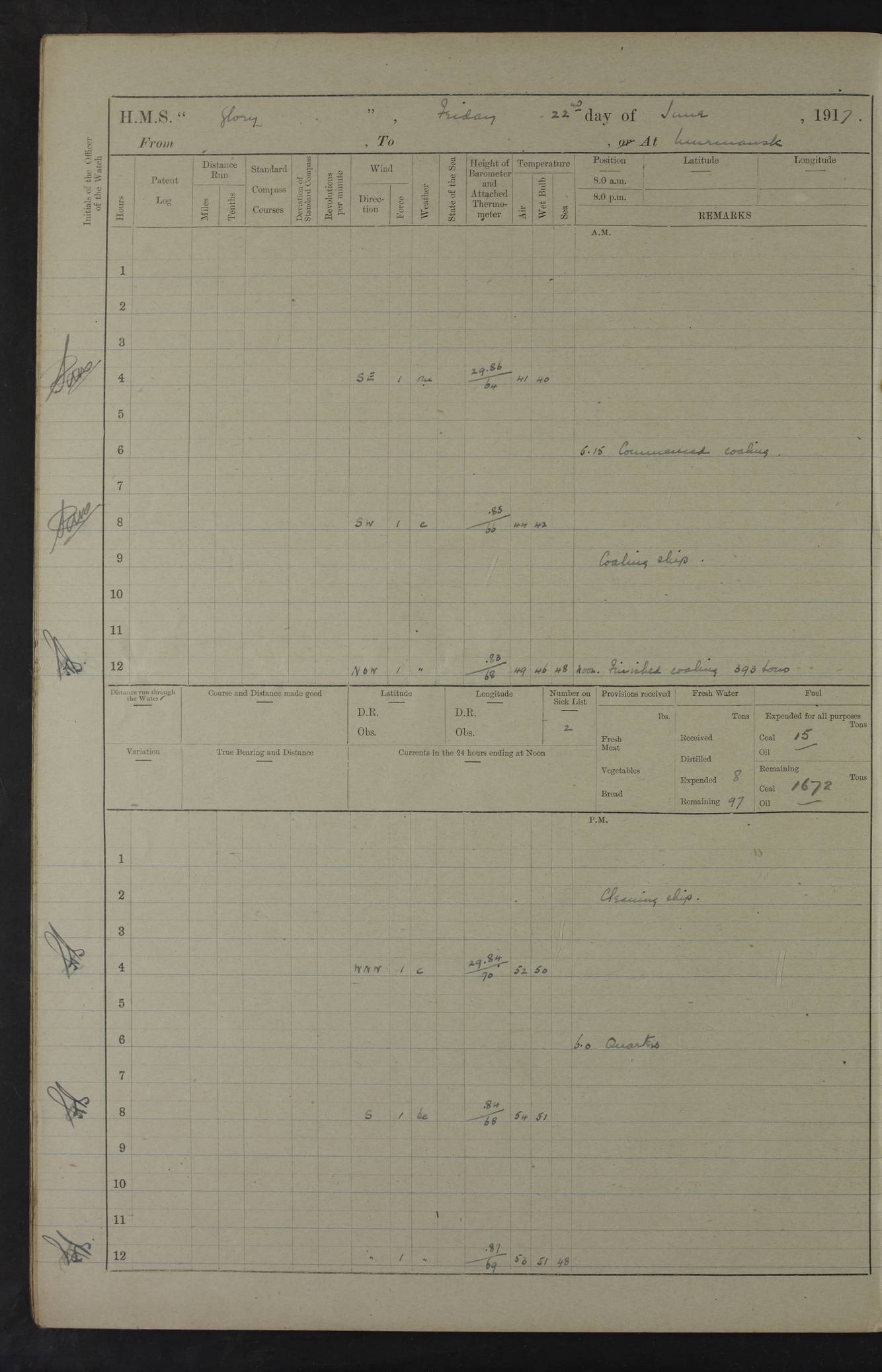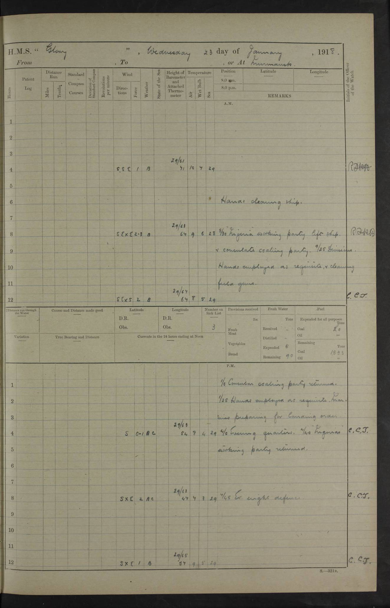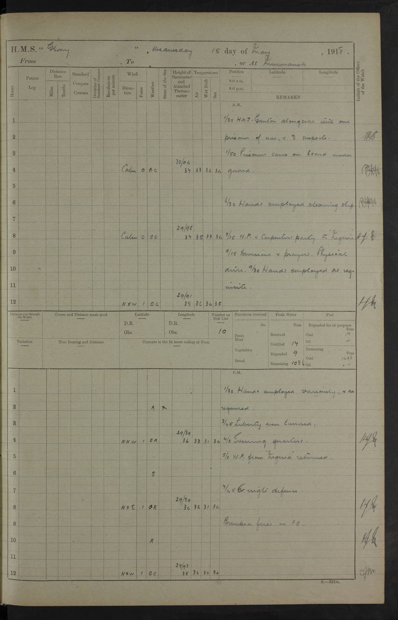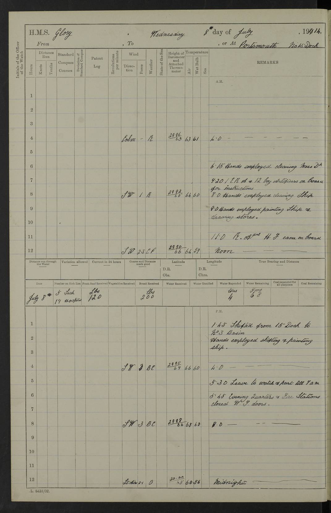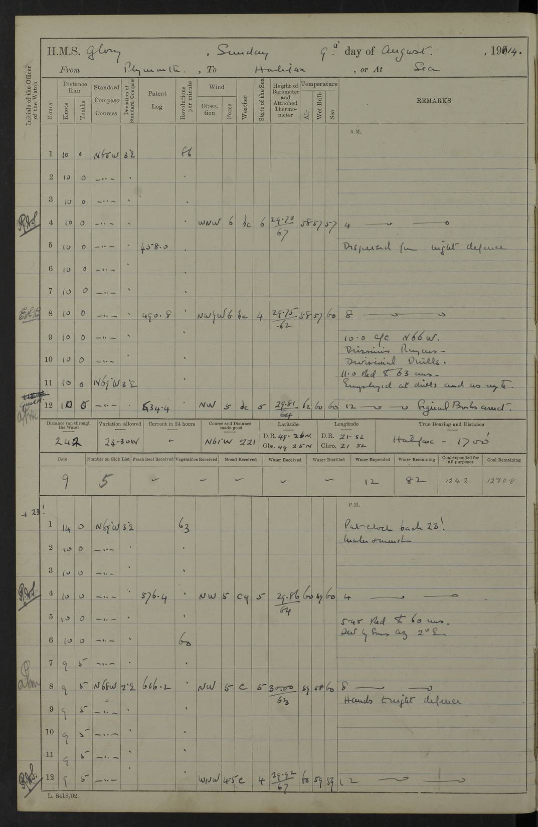 22 June 1915 At sea, Gibraltar to Lemnos Lat 36.1, Long -1.3 4.15am: Sighted land on starboard bow. 10.20am: Stopped port engine for repairs. 11.20am: proceeded with port engine. pm: a/c due to change in deviation. 10.00pm: Cape Tenez Light abeam, 18 miles. 4f73cd61a2fc8ea9030015f6: (https://s3.amazonaws.com:443/oldweather/ADM53-43015/0012_1.jpg) 23 June 1915 At sea, Gibraltar to Lemnos Lat 37.5, Long 4.8 Number on sick list: 4 5.00am: Secured from night defence stations. Placed anti-submarine guns. pm: Life saving appliances served out to men stationed in ? ?at abandon ship. 4f73cd61a2fc8ea9030015f7: (https://s3.amazonaws.com:443/oldweather/ADM53-43015/0013_0.jpg) 24 June 1915 At sea, Gibraltar to Lemnos Lat 37.4, Long 10.8 Position in log clearly bears no resemblance to the location of the ship. Position above is approximate and is based sighting of Zembra Island at 11.55am. 5.00am: Dispersed from night defence stations. Manned anti-submarine guns. am: Sighted two French torpedo boats. am: Torpedo boats passed to ~ No 362, 363. am: Sighted land on starboard beam. 11.55am: Zembra Island abeam, 25 miles. 2.00pm: Sighted Pantellaria S34ºE. 4.45pm: Pantellaria Light House abeam 12 miles. 4f73cd61a2fc8ea9030015f8: (https://s3.amazonaws.com:443/oldweather/ADM53-43015/0013_1.jpg) 25 June 1915 At sea, Gibraltar to Lemnos Lat 35.5, Long 16.7 2.10am: Gozo Light abeam 17 miles. 5.00am: Dispersed from night defence stations. Manned anti-submarine guns. 4f73cd61a2fc8ea9030015f9: (https://s3.amazonaws.com:443/oldweather/ADM53-43015/0014_0.jpg) 26 June 1915 At sea, Gibraltar to Lemnos Lat 35.5, Long 22.6 Number on sick list: 5 5.00am: Dispersed from night defence stations. Manned anti-submarine guns. am: Aired night clothing. am: marines at maxim practice on quarter deck. 2.00pm: Observed land on either bow. 3.00pm: Sighted French patrol destroyer. 4.15pm: Sighted French patrol destroyer. 9.40pm: Milo Peak N63ºW. 10.26pm: Polino Light abeam to port 5.5 miles. 4f73cd62a2fc8ea9030015fa: (https://s3.amazonaws.com:443/oldweather/ADM53-43015/0014_1.jpg) 27 June 1915 At sea and at Lemnos Lat 39.1, Long 24.4 From 0.50 to 3.05am sighting of multiple light houses. 3.50am: a/c to N39ºW and commenced to zig-zag. 5.00am: Dispersed from night defence stations and placed anti-submarine guns and look-outs. am: Lost overboard by accident Hazlewood fender, pat. 311, one in number. 10.30am: Held Divine Service onboard. pm: Met and signalled HMS Minerva on patrol duty. pm: Courses and speeds as requisite while waiting orders to approach Mudros. 3.00pm: Proceeded. 5.16pm: Increased to 90 revs, commenced to zig-zag. Course as requisite for Mudros. 7.00pm: Entered Mudros Bay. 7.47pm: Stopped. Let go port anchor in ‘M3’. 8.30pm: Darkened ship. pm: Manned one 6” and one 12 pdr. 4f73cd62a2fc8ea9030015fb: (https://s3.amazonaws.com:443/oldweather/ADM53-43015/0015_0.jpg) 28 June 1915 Mudros Bay, Lemnos Lat 39.89, Long 25.24 5,00am: HMS Vengeance entered harbour. HMS Vengeance was a pre-dreadnought of the Canopus class, launched in 1899 at Vickers, Barrow, and sold for scrapping in 1921. Details at http://en.wikipedia.org/wiki/HMS_Vengeance_(1899) . am/pm/: hands preparing for coaling and about ship’s work. pm: Collier Wabana secured alongside. 4f73cd62a2fc8ea9030015fc: (https://s3.amazonaws.com:443/oldweather/ADM53-43015/0015_1.jpg) 29 June 1915 Mudros Bay, Lemnos Lat 39.89, Long 25.24 5.15am: Commenced coaling. 2.00pm: Finished coaling. Collier left. 4f73cd62a2fc8ea9030015fd: (https://s3.amazonaws.com:443/oldweather/ADM53-43015/0016_0.jpg) 30 June 1915 Mudros Bay, Lemnos Lat 39.89, Long 25.24 am: Parties away sanding, and with fire engines onshore. am: Boats away disembarking troops. am: French Flagship Patrie sailed. The Patrie was a French pre-dreadnought, launched at La Seyne shipyard in 1903, and stricken in 1921. Details at http://en.wikipedia.org/wiki/French_battleship_Patrie . 6.30pm: Hands to bathe. 4f73cd63a2fc8ea9030015fe: (https://s3.amazonaws.com:443/oldweather/ADM53-43015/0016_1.jpg) 4f73cd63a2fc8ea9030015ff: (https://s3.amazonaws.com:443/oldweather/ADM53-43015/0017_0.jpg) 4f73cd63a2fc8ea903001600: (https://s3.amazonaws.com:443/oldweather/ADM53-43015/0017_1.jpg) 4f73cd63a2fc8ea903001601: (https://s3.amazonaws.com:443/oldweather/ADM53-43015/0018_0.jpg) 4f73cd64a2fc8ea903001602: (https://s3.amazonaws.com:443/oldweather/ADM53-43015/0018_1.jpg) LOGS FOR JULY 1915 From July to October 1915, HMS Glory spent her time at Port Mudros. Certain activities typically took place daily and are not generally noted in the pages below. These activities include: Lighting fires in the picket boat around 4am and drawing the fires in the late evening; Divisions at around 9–9.30am and Evening Quarters at 4pm; Darken ship at around 8.30pm; Daily ‘cleaning ship’, with variations thereof; SBC (for ‘Signal Books Correct’) at the watch changes. 4f73cd64a2fc8ea903001603: (https://s3.amazonaws.com:443/oldweather/ADM53-43016/0000_0.jpg) 4f73cd64a2fc8ea903001604: (https://s3.amazonaws.com:443/oldweather/ADM53-43016/0000_1.jpg) 4f73cd65a2fc8ea903001605: (https://s3.amazonaws.com:443/oldweather/ADM53-43016/0001_0.jpg) 4f73cd65a2fc8ea903001606: (https://s3.amazonaws.com:443/oldweather/ADM53-43016/0001_1.jpg) 1 July 1915 Port Mudros Lat 39.89, Long 25.24 6.30am: Landed working parties preparing boom defence ships. am: Discharged Acting Commander Rayne to Hector. Hector was a kite balloon ship. No further details readily available. 5.00pm: Tug T.10 made fast astern. 7.15pm: HMS Venerable went out. 7.30pm: HMS Chatham went out. HMS Chatham was a ‘Town’ cruiser and lead ship of her class. She was launched in 1911 at Chatham Dockyard and sold in 1926. Details at http://en.wikipedia.org/wiki/HMS_Chatham_(1911) . 4f73cd65a2fc8ea903001607: (https://s3.amazonaws.com:443/oldweather/ADM53-43016/0002_0.jpg) 2 July 1915 Port Mudros Lat 39.89, Long 25.24 5.35am: Landed working parties preparing boom defence ships. am/pm: Boom defence par