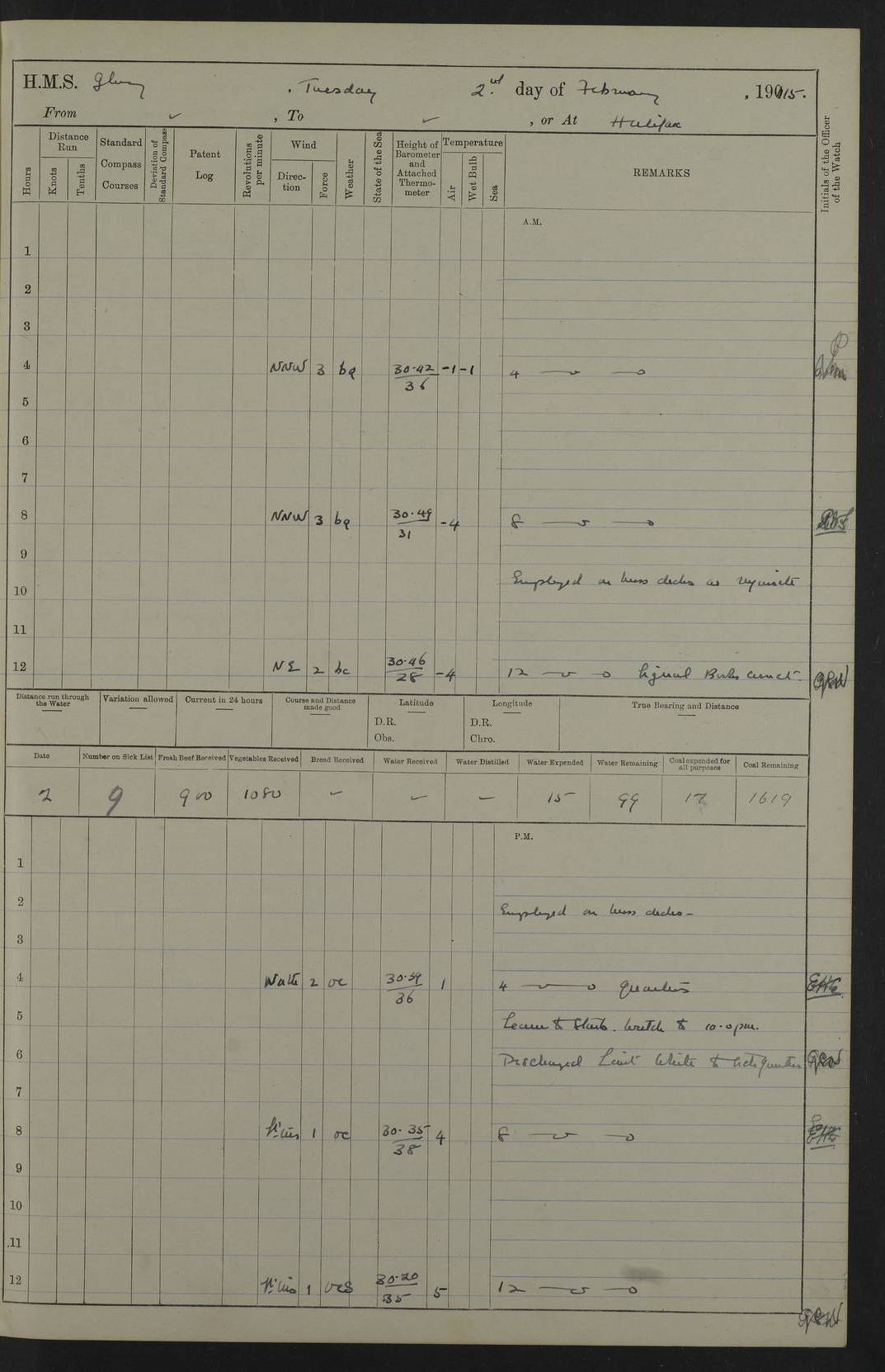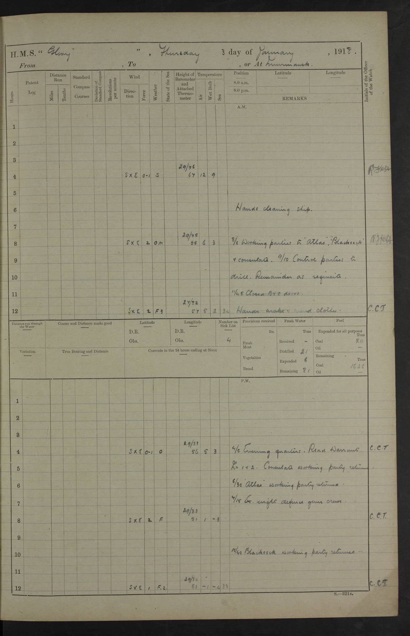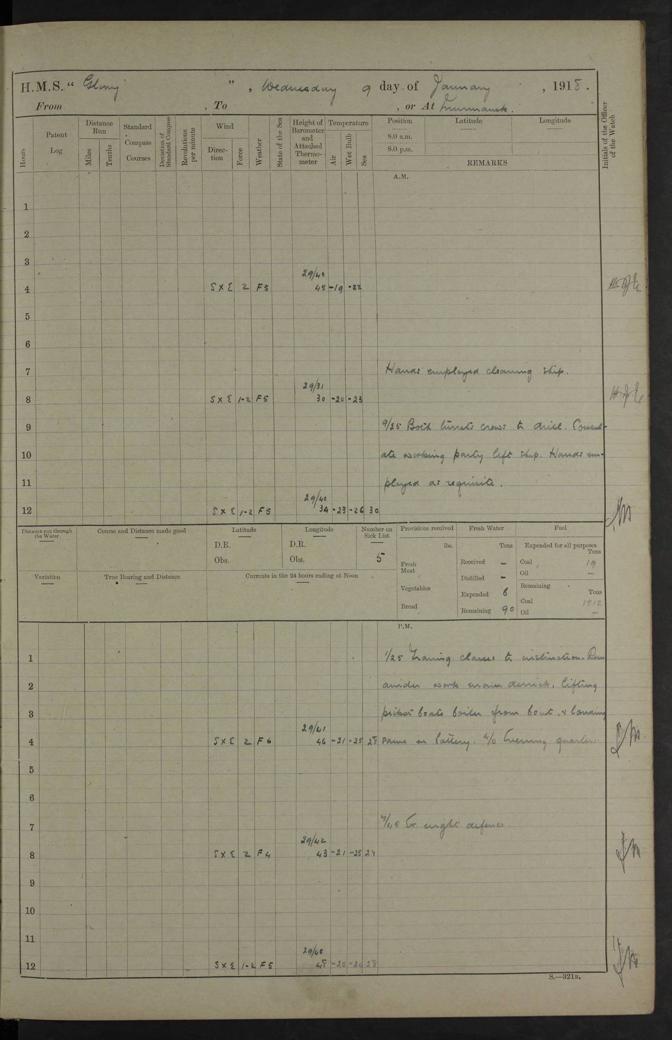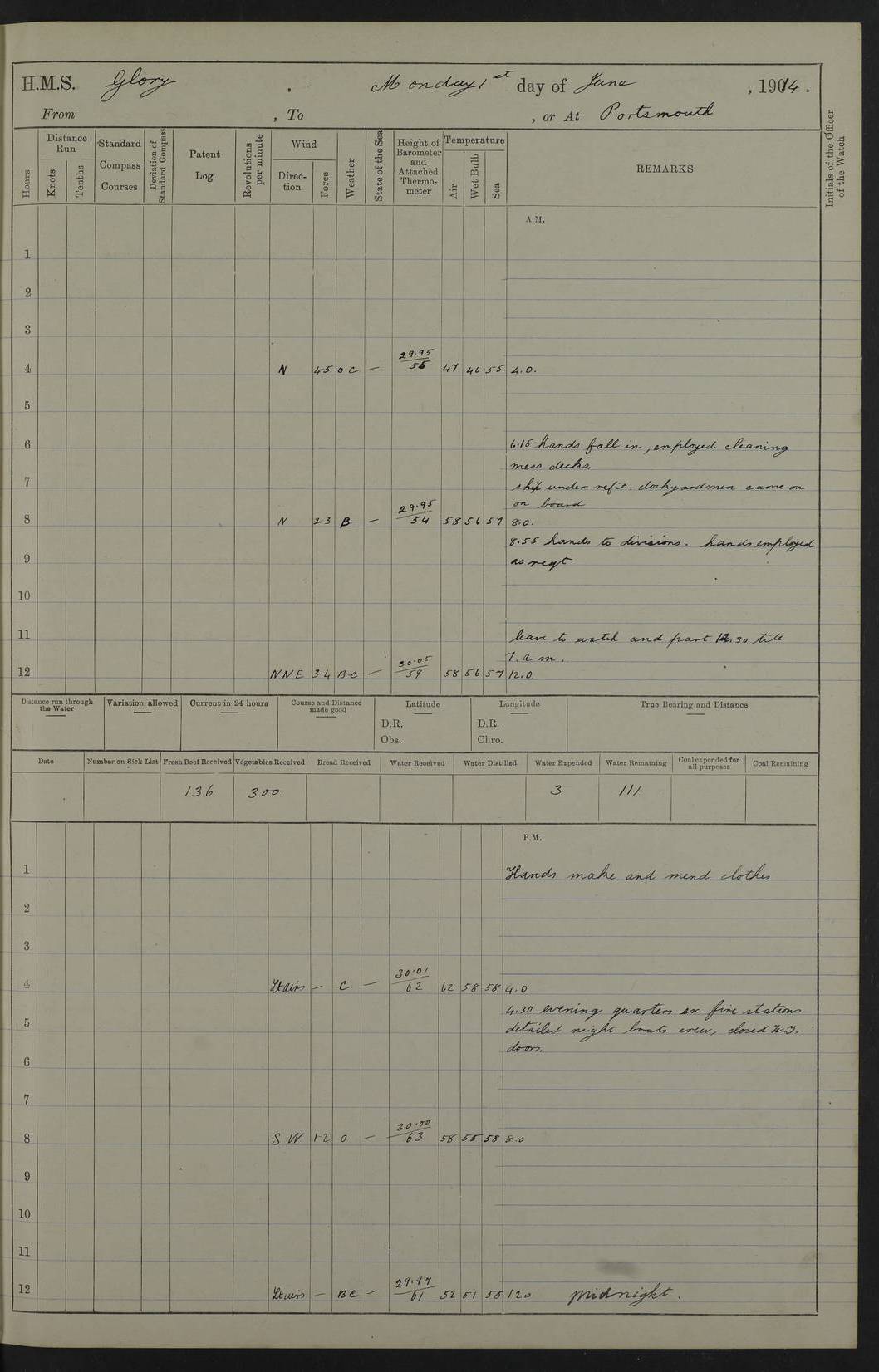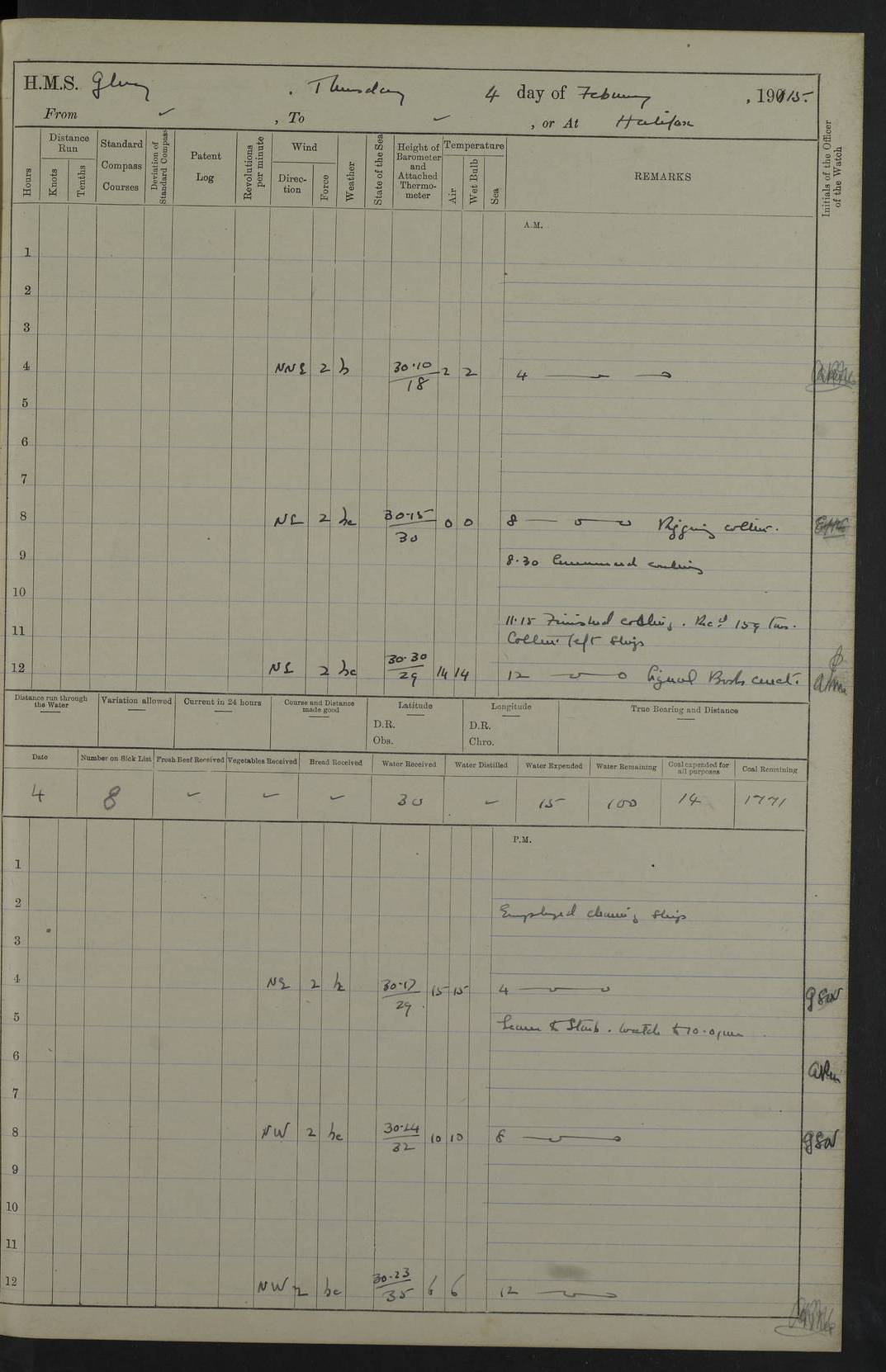 22 June 1915 At sea, Gibraltar to Lemnos Lat 36.1, Long -1.3 4.15am: Sighted land on starboard bow. 10.20am: Stopped port engine for repairs. 11.20am: proceeded with port engine. pm: a/c due to change in deviation. 10.00pm: Cape Tenez Light abeam, 18 miles. 4f73cd61a2fc8ea9030015f6: (https://s3.amazonaws.com:443/oldweather/ADM53-43015/0012_1.jpg) 23 June 1915 At sea, Gibraltar to Lemnos Lat 37.5, Long 4.8 Number on sick list: 4 5.00am: Secured from night defence stations. Placed anti-submarine guns. pm: Life saving appliances served out to men stationed in ? ?at abandon ship. 4f73cd61a2fc8ea9030015f7: (https://s3.amazonaws.com:443/oldweather/ADM53-43015/0013_0.jpg) 24 June 1915 At sea, Gibraltar to Lemnos Lat 37.4, Long 10.8 Position in log clearly bears no resemblance to the location of the ship. Position above is approximate and is based sighting of Zembra Island at 11.55am. 5.00am: Dispersed from night defence stations. Manned anti-submarine guns. am: Sighted two French torpedo boats. am: Torpedo boats passed to ~ No 362, 363. am: Sighted land on starboard beam. 11.55am: Zembra Island abeam, 25 miles. 2.00pm: Sighted Pantellaria S34ºE. 4.45pm: Pantellaria Light House abeam 12 miles. 4f73cd61a2fc8ea9030015f8: (https://s3.amazonaws.com:443/oldweather/ADM53-43015/0013_1.jpg) 25 June 1915 At sea, Gibraltar to Lemnos Lat 35.5, Long 16.7 2.10am: Gozo Light abeam 17 miles. 5.00am: Dispersed from night defence stations. Manned anti-submarine guns. 4f73cd61a2fc8ea9030015f9: (https://s3.amazonaws.com:443/oldweather/ADM53-43015/0014_0.jpg) 26 June 1915 At sea, Gibraltar to Lemnos Lat 35.5, Long 22.6 Number on sick list: 5 5.00am: Dispersed from night defence stations. Manned anti-submarine guns. am: Aired night clothing. am: marines at maxim practice on quarter deck. 2.00pm: Observed land on either bow. 3.00pm: Sighted French patrol destroyer. 4.15pm: Sighted French patrol destroyer. 9.40pm: Milo Peak N63ºW. 10.26pm: Polino Light abeam to port 5.5 miles. 4f73cd62a2fc8ea9030015fa: (https://s3.amazonaws.com:443/oldweather/ADM53-43015/0014_1.jpg) 27 June 1915 At sea and at Lemnos Lat 39.1, Long 24.4 From 0.50 to 3.05am sighting of multiple light houses. 3.50am: a/c to N39ºW and commenced to zig-zag. 5.00am: Dispersed from night defence stations and placed anti-submarine guns and look-outs. am: Lost overboard by accident Hazlewood fender, pat. 311, one in number. 10.30am: Held Divine Service onboard. pm: Met and signalled HMS Minerva on patrol duty. pm: Courses and speeds as requisite while waiting orders to approach Mudros. 3.00pm: Proceeded. 5.16pm: Increased to 90 revs, commenced to zig-zag. Course as requisite for Mudros. 7.00pm: Entered Mudros Bay. 7.47pm: Stopped. Let go port anchor in ‘M3’. 8.30pm: Darkened ship. pm: Manned one 6” and one 12 pdr. 4f73cd62a2fc8ea9030015fb: (https://s3.amazonaws.com:443/oldweather/ADM53-43015/0015_0.jpg) 28 June 1915 Mudros Bay, Lemnos Lat 39.89, Long 25.24 5,00am: HMS Vengeance entered harbour. HMS Vengeance was a pre-dreadnought of the Canopus class, launched in 1899 at Vickers, Barrow, and sold for scrapping in 1921. Details at http://en.wikipedia.org/wiki/HMS_Vengeance_(1899) . am/pm/: hands preparing for coaling and about ship’s work. pm: Collier Wabana secured alongside. 4f73cd62a2fc8ea9030015fc: (https://s3.amazonaws.com:443/oldweather/ADM53-43015/0015_1.jpg) 29 June 1915 Mudros Bay, Lemnos Lat 39.89, Long 25.24 5.15am: Commenced coaling. 2.00pm: Finished coaling. Collier left. 4f73cd62a2fc8ea9030015fd: (https://s3.amazonaws.com:443/oldweather/ADM53-43015/0016_0.jpg) 30 June 1915 Mudros Bay, Lemnos Lat 39.89, Long 25.24 am: Parties away sanding, and with fire engines onshore. am: Boats away disembarking troops. am: French Flagship Patrie sailed. The Patrie was a French pre-dreadnought, launched at La Seyne shipyard in 1903, and stricken in 1921. Details at http://en.wikipedia.org/wiki/French_battleship_Patrie . 6.30pm: Hands to bathe. 4f73cd63a2fc8ea9030015fe: (https://s3.amazonaws.com:443/oldweather/ADM53-43015/0016_1.jpg) 4f73cd63a2fc8ea9030015ff: (https://s3.amazonaws.com:443/oldweather/ADM53-43015/0017_0.jpg) 4f73cd63a2fc8ea903001600: (https://s3.amazonaws.com:443/oldweather/ADM53-43015/0017_1.jpg) 4f73cd63a2fc8ea903001601: (https://s3.amazonaws.com:443/oldweather/ADM53-43015/0018_0.jpg) 4f73cd64a2fc8ea903001602: (https://s3.amazonaws.com:443/oldweather/ADM53-43015/0018_1.jpg) LOGS FOR JULY 1915 From July to October 1915, HMS Glory spent her time at Port Mudros. Certain activities typically took place daily and are not generally noted in the pages below. These activities include: Lighting fires in the picket boat around 4am and drawing the fires in the late evening; Divisions at around 9–9.30am and Evening Quarters at 4pm; Darken ship at around 8.30pm; Daily ‘cleaning ship’, with variations thereof; SBC (for ‘Signal Books Correct’) at the watch changes. 4f73cd64a2fc8ea903001603: (https://s3.amazonaws.com:443/oldweather/ADM53-43016/0000_0.jpg) 4f73cd64a2fc8ea903001604: (https://s3.amazonaws.com:443/oldweather/ADM53-43016/0000_1.jpg) 4f73cd65a2fc8ea903001605: (https://s3.amazonaws.com:443/oldweather/ADM53-43016/0001_0.jpg) 4f73cd65a2fc8ea903001606: (https://s3.amazonaws.com:443/oldweather/ADM53-43016/0001_1.jpg) 1 July 1915 Port Mudros Lat 39.89, Long 25.24 6.30am: Landed working parties preparing boom defence ships. am: Discharged Acting Commander Rayne to Hector. Hector was a kite balloon ship. No further details readily available. 5.00pm: Tug T.10 made fast astern. 7.15pm: HMS Venerable went out. 7.30pm: HMS Chatham went out. HMS Chatham was a ‘Town’ cruiser and lead ship of her class. She was launched in 1911 at Chatham Dockyard and sold in 1926. Details at http://en.wikipedia.org/wiki/HMS_Chatham_(1911) . 4f73cd65a2fc8ea903001607: (https://s3.amazonaws.com:443/oldweather/ADM53-43016/0002_0.jpg) 2 July 1915 Port Mudros Lat 39.89, Long 25.24 5.35am: Landed working parties preparing boom defence ships. am/pm: Boom defence par