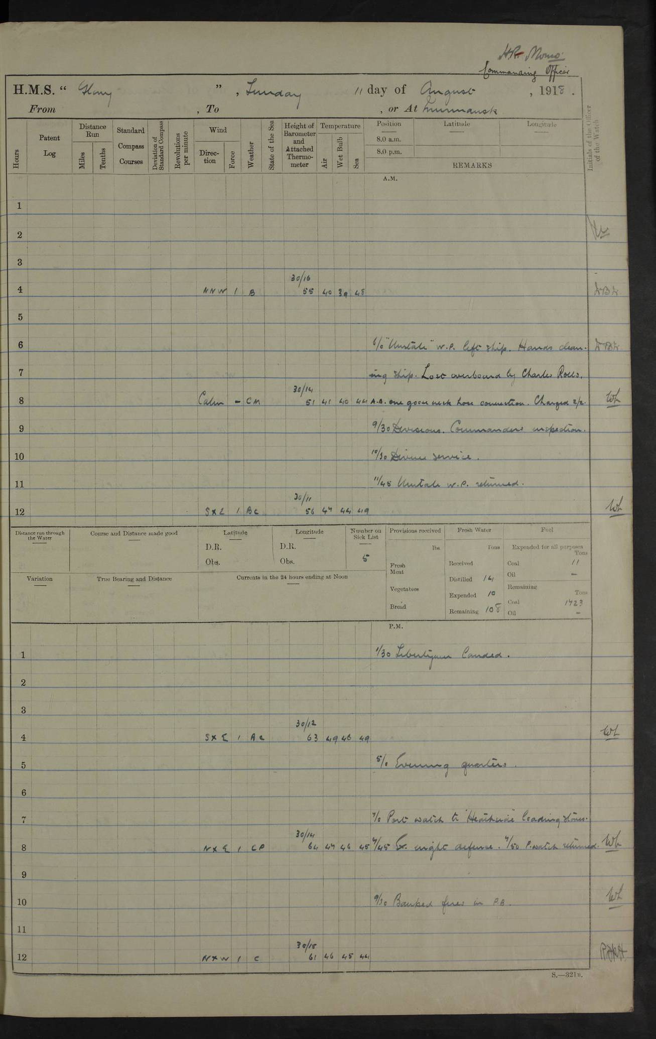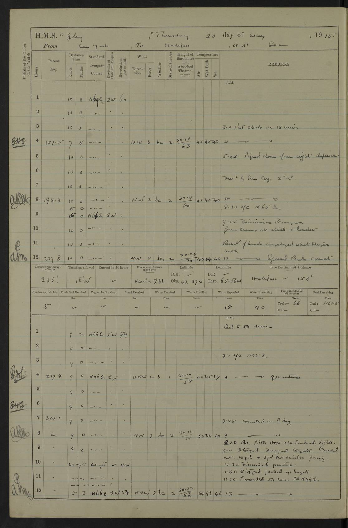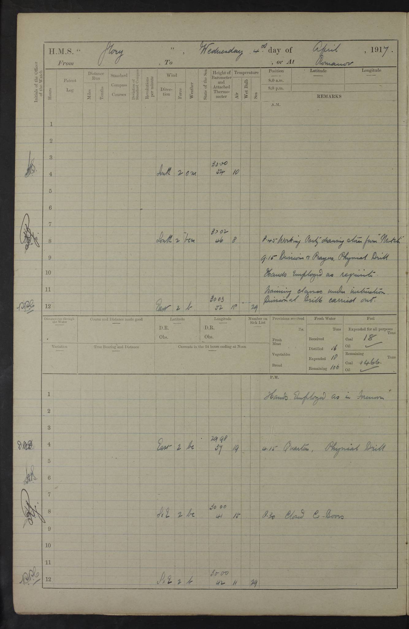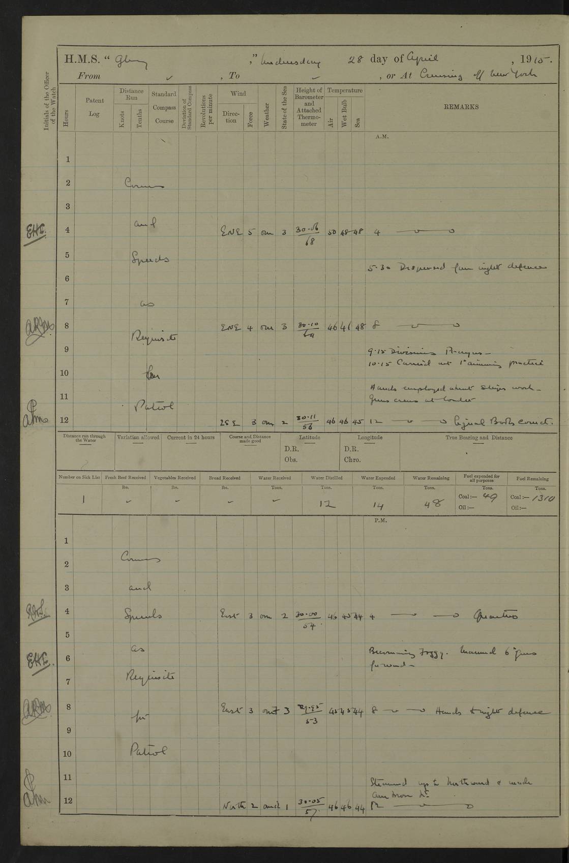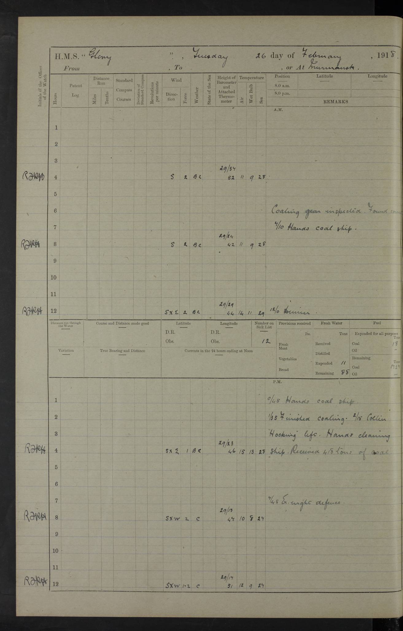 22 June 1915 At sea, Gibraltar to Lemnos Lat 36.1, Long -1.3 4.15am: Sighted land on starboard bow. 10.20am: Stopped port engine for repairs. 11.20am: proceeded with port engine. pm: a/c due to change in deviation. 10.00pm: Cape Tenez Light abeam, 18 miles. 4f73cd61a2fc8ea9030015f6: (https://s3.amazonaws.com:443/oldweather/ADM53-43015/0012_1.jpg) 23 June 1915 At sea, Gibraltar to Lemnos Lat 37.5, Long 4.8 Number on sick list: 4 5.00am: Secured from night defence stations. Placed anti-submarine guns. pm: Life saving appliances served out to men stationed in ? ?at abandon ship. 4f73cd61a2fc8ea9030015f7: (https://s3.amazonaws.com:443/oldweather/ADM53-43015/0013_0.jpg) 24 June 1915 At sea, Gibraltar to Lemnos Lat 37.4, Long 10.8 Position in log clearly bears no resemblance to the location of the ship. Position above is approximate and is based sighting of Zembra Island at 11.55am. 5.00am: Dispersed from night defence stations. Manned anti-submarine guns. am: Sighted two French torpedo boats. am: Torpedo boats passed to ~ No 362, 363. am: Sighted land on starboard beam. 11.55am: Zembra Island abeam, 25 miles. 2.00pm: Sighted Pantellaria S34ºE. 4.45pm: Pantellaria Light House abeam 12 miles. 4f73cd61a2fc8ea9030015f8: (https://s3.amazonaws.com:443/oldweather/ADM53-43015/0013_1.jpg) 25 June 1915 At sea, Gibraltar to Lemnos Lat 35.5, Long 16.7 2.10am: Gozo Light abeam 17 miles. 5.00am: Dispersed from night defence stations. Manned anti-submarine guns. 4f73cd61a2fc8ea9030015f9: (https://s3.amazonaws.com:443/oldweather/ADM53-43015/0014_0.jpg) 26 June 1915 At sea, Gibraltar to Lemnos Lat 35.5, Long 22.6 Number on sick list: 5 5.00am: Dispersed from night defence stations. Manned anti-submarine guns. am: Aired night clothing. am: marines at maxim practice on quarter deck. 2.00pm: Observed land on either bow. 3.00pm: Sighted French patrol destroyer. 4.15pm: Sighted French patrol destroyer. 9.40pm: Milo Peak N63ºW. 10.26pm: Polino Light abeam to port 5.5 miles. 4f73cd62a2fc8ea9030015fa: (https://s3.amazonaws.com:443/oldweather/ADM53-43015/0014_1.jpg) 27 June 1915 At sea and at Lemnos Lat 39.1, Long 24.4 From 0.50 to 3.05am sighting of multiple light houses. 3.50am: a/c to N39ºW and commenced to zig-zag. 5.00am: Dispersed from night defence stations and placed anti-submarine guns and look-outs. am: Lost overboard by accident Hazlewood fender, pat. 311, one in number. 10.30am: Held Divine Service onboard. pm: Met and signalled HMS Minerva on patrol duty. pm: Courses and speeds as requisite while waiting orders to approach Mudros. 3.00pm: Proceeded. 5.16pm: Increased to 90 revs, commenced to zig-zag. Course as requisite for Mudros. 7.00pm: Entered Mudros Bay. 7.47pm: Stopped. Let go port anchor in ‘M3’. 8.30pm: Darkened ship. pm: Manned one 6” and one 12 pdr. 4f73cd62a2fc8ea9030015fb: (https://s3.amazonaws.com:443/oldweather/ADM53-43015/0015_0.jpg) 28 June 1915 Mudros Bay, Lemnos Lat 39.89, Long 25.24 5,00am: HMS Vengeance entered harbour. HMS Vengeance was a pre-dreadnought of the Canopus class, launched in 1899 at Vickers, Barrow, and sold for scrapping in 1921. Details at http://en.wikipedia.org/wiki/HMS_Vengeance_(1899) . am/pm/: hands preparing for coaling and about ship’s work. pm: Collier Wabana secured alongside. 4f73cd62a2fc8ea9030015fc: (https://s3.amazonaws.com:443/oldweather/ADM53-43015/0015_1.jpg) 29 June 1915 Mudros Bay, Lemnos Lat 39.89, Long 25.24 5.15am: Commenced coaling. 2.00pm: Finished coaling. Collier left. 4f73cd62a2fc8ea9030015fd: (https://s3.amazonaws.com:443/oldweather/ADM53-43015/0016_0.jpg) 30 June 1915 Mudros Bay, Lemnos Lat 39.89, Long 25.24 am: Parties away sanding, and with fire engines onshore. am: Boats away disembarking troops. am: French Flagship Patrie sailed. The Patrie was a French pre-dreadnought, launched at La Seyne shipyard in 1903, and stricken in 1921. Details at http://en.wikipedia.org/wiki/French_battleship_Patrie . 6.30pm: Hands to bathe. 4f73cd63a2fc8ea9030015fe: (https://s3.amazonaws.com:443/oldweather/ADM53-43015/0016_1.jpg) 4f73cd63a2fc8ea9030015ff: (https://s3.amazonaws.com:443/oldweather/ADM53-43015/0017_0.jpg) 4f73cd63a2fc8ea903001600: (https://s3.amazonaws.com:443/oldweather/ADM53-43015/0017_1.jpg) 4f73cd63a2fc8ea903001601: (https://s3.amazonaws.com:443/oldweather/ADM53-43015/0018_0.jpg) 4f73cd64a2fc8ea903001602: (https://s3.amazonaws.com:443/oldweather/ADM53-43015/0018_1.jpg) LOGS FOR JULY 1915 From July to October 1915, HMS Glory spent her time at Port Mudros. Certain activities typically took place daily and are not generally noted in the pages below. These activities include: Lighting fires in the picket boat around 4am and drawing the fires in the late evening; Divisions at around 9–9.30am and Evening Quarters at 4pm; Darken ship at around 8.30pm; Daily ‘cleaning ship’, with variations thereof; SBC (for ‘Signal Books Correct’) at the watch changes. 4f73cd64a2fc8ea903001603: (https://s3.amazonaws.com:443/oldweather/ADM53-43016/0000_0.jpg) 4f73cd64a2fc8ea903001604: (https://s3.amazonaws.com:443/oldweather/ADM53-43016/0000_1.jpg) 4f73cd65a2fc8ea903001605: (https://s3.amazonaws.com:443/oldweather/ADM53-43016/0001_0.jpg) 4f73cd65a2fc8ea903001606: (https://s3.amazonaws.com:443/oldweather/ADM53-43016/0001_1.jpg) 1 July 1915 Port Mudros Lat 39.89, Long 25.24 6.30am: Landed working parties preparing boom defence ships. am: Discharged Acting Commander Rayne to Hector. Hector was a kite balloon ship. No further details readily available. 5.00pm: Tug T.10 made fast astern. 7.15pm: HMS Venerable went out. 7.30pm: HMS Chatham went out. HMS Chatham was a ‘Town’ cruiser and lead ship of her class. She was launched in 1911 at Chatham Dockyard and sold in 1926. Details at http://en.wikipedia.org/wiki/HMS_Chatham_(1911) . 4f73cd65a2fc8ea903001607: (https://s3.amazonaws.com:443/oldweather/ADM53-43016/0002_0.jpg) 2 July 1915 Port Mudros Lat 39.89, Long 25.24 5.35am: Landed working parties preparing boom defence ships. am/pm: Boom defence par