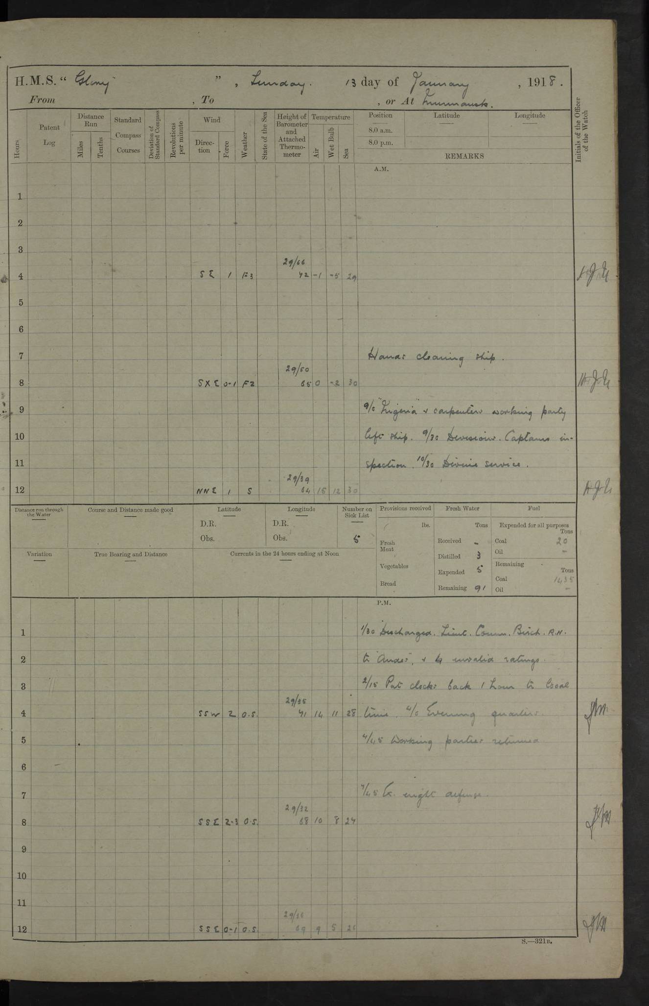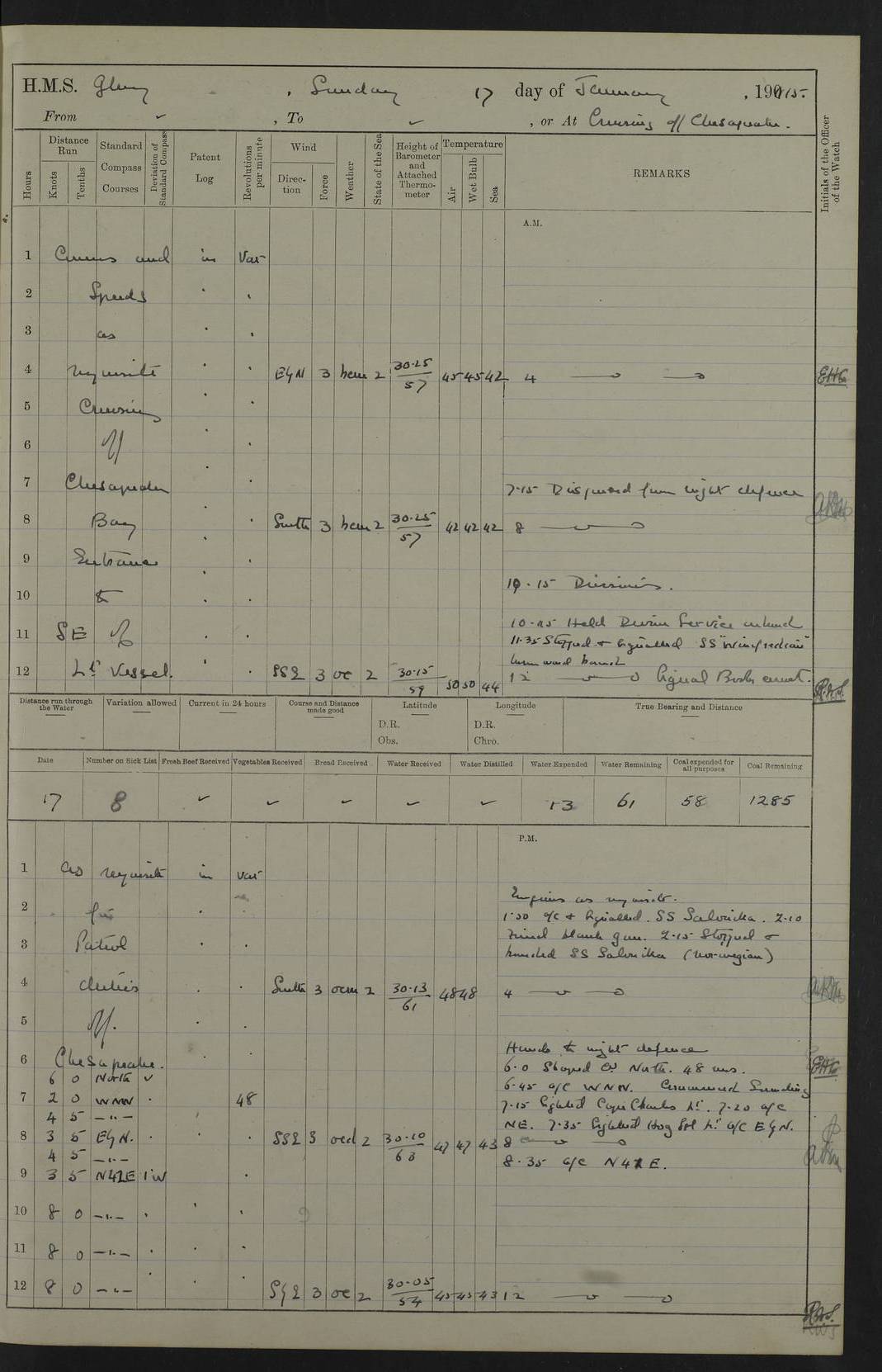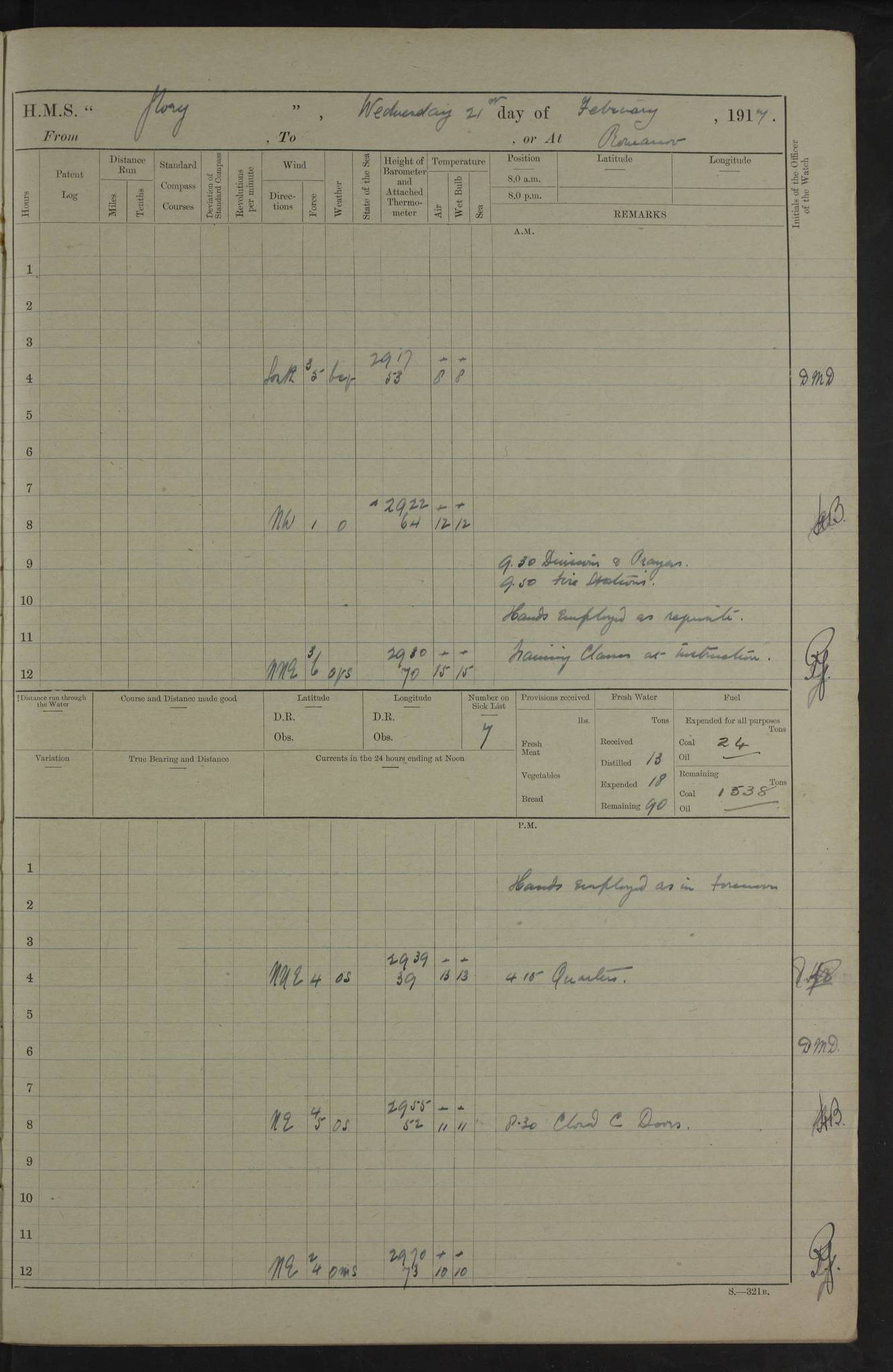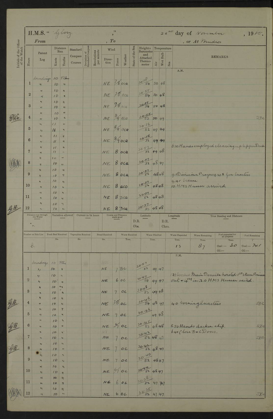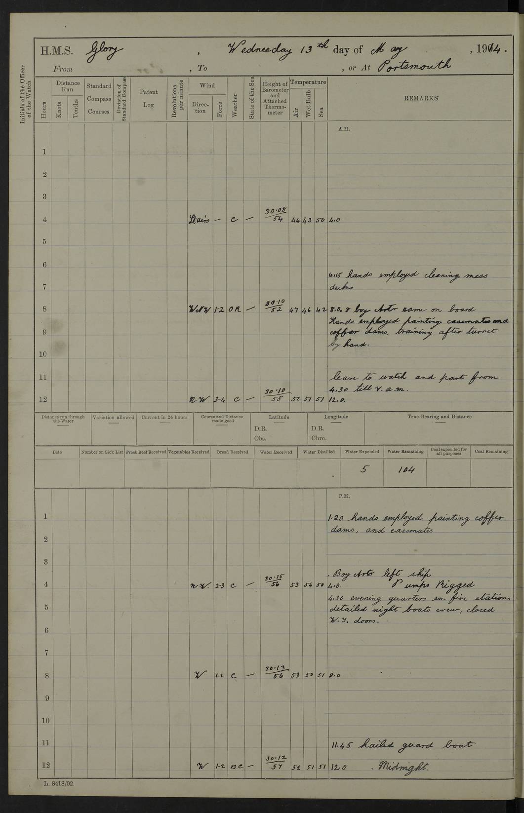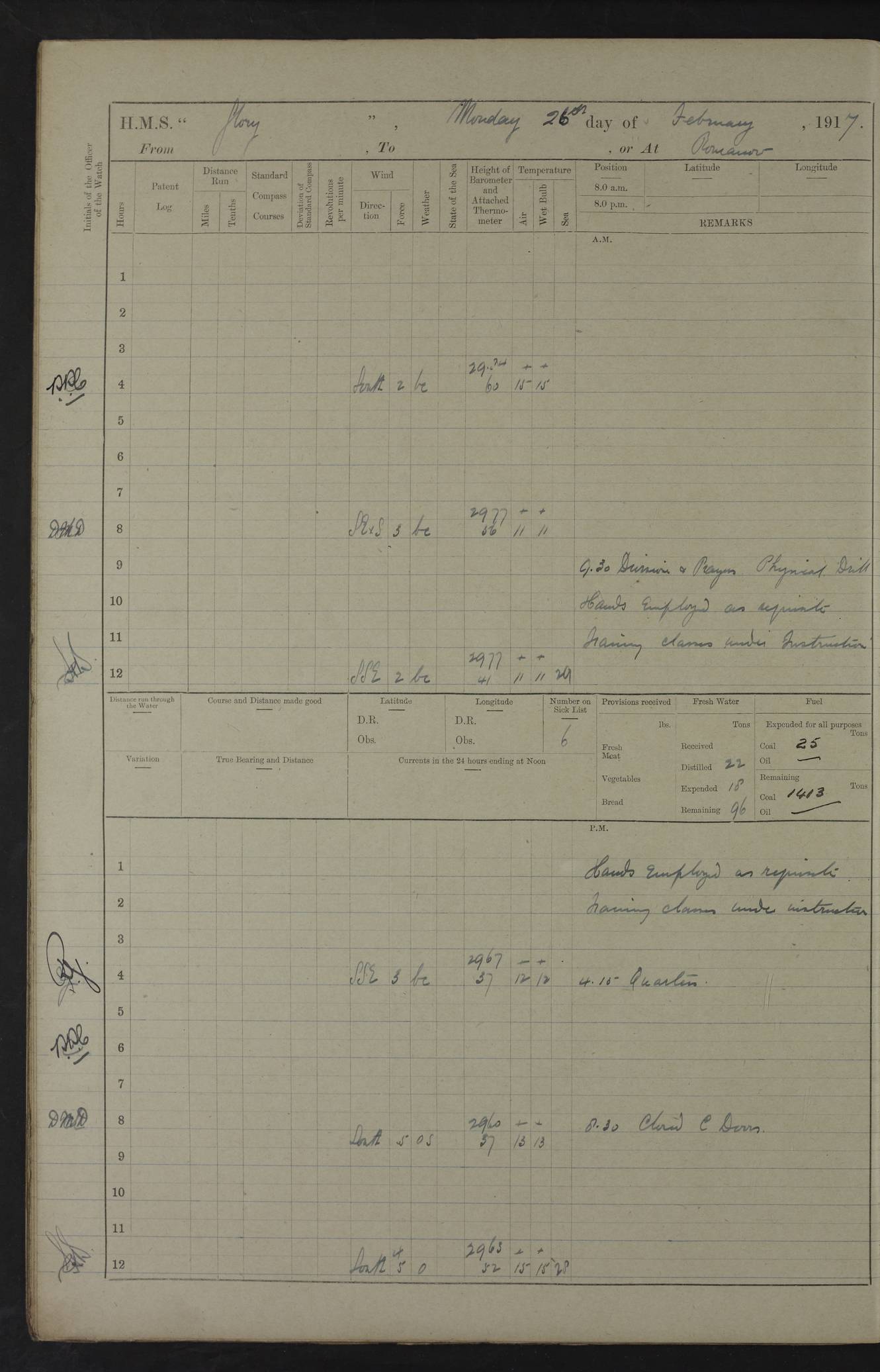 22 June 1915 At sea, Gibraltar to Lemnos Lat 36.1, Long -1.3 4.15am: Sighted land on starboard bow. 10.20am: Stopped port engine for repairs. 11.20am: proceeded with port engine. pm: a/c due to change in deviation. 10.00pm: Cape Tenez Light abeam, 18 miles. 4f73cd61a2fc8ea9030015f6: (https://s3.amazonaws.com:443/oldweather/ADM53-43015/0012_1.jpg) 23 June 1915 At sea, Gibraltar to Lemnos Lat 37.5, Long 4.8 Number on sick list: 4 5.00am: Secured from night defence stations. Placed anti-submarine guns. pm: Life saving appliances served out to men stationed in ? ?at abandon ship. 4f73cd61a2fc8ea9030015f7: (https://s3.amazonaws.com:443/oldweather/ADM53-43015/0013_0.jpg) 24 June 1915 At sea, Gibraltar to Lemnos Lat 37.4, Long 10.8 Position in log clearly bears no resemblance to the location of the ship. Position above is approximate and is based sighting of Zembra Island at 11.55am. 5.00am: Dispersed from night defence stations. Manned anti-submarine guns. am: Sighted two French torpedo boats. am: Torpedo boats passed to ~ No 362, 363. am: Sighted land on starboard beam. 11.55am: Zembra Island abeam, 25 miles. 2.00pm: Sighted Pantellaria S34ºE. 4.45pm: Pantellaria Light House abeam 12 miles. 4f73cd61a2fc8ea9030015f8: (https://s3.amazonaws.com:443/oldweather/ADM53-43015/0013_1.jpg) 25 June 1915 At sea, Gibraltar to Lemnos Lat 35.5, Long 16.7 2.10am: Gozo Light abeam 17 miles. 5.00am: Dispersed from night defence stations. Manned anti-submarine guns. 4f73cd61a2fc8ea9030015f9: (https://s3.amazonaws.com:443/oldweather/ADM53-43015/0014_0.jpg) 26 June 1915 At sea, Gibraltar to Lemnos Lat 35.5, Long 22.6 Number on sick list: 5 5.00am: Dispersed from night defence stations. Manned anti-submarine guns. am: Aired night clothing. am: marines at maxim practice on quarter deck. 2.00pm: Observed land on either bow. 3.00pm: Sighted French patrol destroyer. 4.15pm: Sighted French patrol destroyer. 9.40pm: Milo Peak N63ºW. 10.26pm: Polino Light abeam to port 5.5 miles. 4f73cd62a2fc8ea9030015fa: (https://s3.amazonaws.com:443/oldweather/ADM53-43015/0014_1.jpg) 27 June 1915 At sea and at Lemnos Lat 39.1, Long 24.4 From 0.50 to 3.05am sighting of multiple light houses. 3.50am: a/c to N39ºW and commenced to zig-zag. 5.00am: Dispersed from night defence stations and placed anti-submarine guns and look-outs. am: Lost overboard by accident Hazlewood fender, pat. 311, one in number. 10.30am: Held Divine Service onboard. pm: Met and signalled HMS Minerva on patrol duty. pm: Courses and speeds as requisite while waiting orders to approach Mudros. 3.00pm: Proceeded. 5.16pm: Increased to 90 revs, commenced to zig-zag. Course as requisite for Mudros. 7.00pm: Entered Mudros Bay. 7.47pm: Stopped. Let go port anchor in ‘M3’. 8.30pm: Darkened ship. pm: Manned one 6” and one 12 pdr. 4f73cd62a2fc8ea9030015fb: (https://s3.amazonaws.com:443/oldweather/ADM53-43015/0015_0.jpg) 28 June 1915 Mudros Bay, Lemnos Lat 39.89, Long 25.24 5,00am: HMS Vengeance entered harbour. HMS Vengeance was a pre-dreadnought of the Canopus class, launched in 1899 at Vickers, Barrow, and sold for scrapping in 1921. Details at http://en.wikipedia.org/wiki/HMS_Vengeance_(1899) . am/pm/: hands preparing for coaling and about ship’s work. pm: Collier Wabana secured alongside. 4f73cd62a2fc8ea9030015fc: (https://s3.amazonaws.com:443/oldweather/ADM53-43015/0015_1.jpg) 29 June 1915 Mudros Bay, Lemnos Lat 39.89, Long 25.24 5.15am: Commenced coaling. 2.00pm: Finished coaling. Collier left. 4f73cd62a2fc8ea9030015fd: (https://s3.amazonaws.com:443/oldweather/ADM53-43015/0016_0.jpg) 30 June 1915 Mudros Bay, Lemnos Lat 39.89, Long 25.24 am: Parties away sanding, and with fire engines onshore. am: Boats away disembarking troops. am: French Flagship Patrie sailed. The Patrie was a French pre-dreadnought, launched at La Seyne shipyard in 1903, and stricken in 1921. Details at http://en.wikipedia.org/wiki/French_battleship_Patrie . 6.30pm: Hands to bathe. 4f73cd63a2fc8ea9030015fe: (https://s3.amazonaws.com:443/oldweather/ADM53-43015/0016_1.jpg) 4f73cd63a2fc8ea9030015ff: (https://s3.amazonaws.com:443/oldweather/ADM53-43015/0017_0.jpg) 4f73cd63a2fc8ea903001600: (https://s3.amazonaws.com:443/oldweather/ADM53-43015/0017_1.jpg) 4f73cd63a2fc8ea903001601: (https://s3.amazonaws.com:443/oldweather/ADM53-43015/0018_0.jpg) 4f73cd64a2fc8ea903001602: (https://s3.amazonaws.com:443/oldweather/ADM53-43015/0018_1.jpg) LOGS FOR JULY 1915 From July to October 1915, HMS Glory spent her time at Port Mudros. Certain activities typically took place daily and are not generally noted in the pages below. These activities include: Lighting fires in the picket boat around 4am and drawing the fires in the late evening; Divisions at around 9–9.30am and Evening Quarters at 4pm; Darken ship at around 8.30pm; Daily ‘cleaning ship’, with variations thereof; SBC (for ‘Signal Books Correct’) at the watch changes. 4f73cd64a2fc8ea903001603: (https://s3.amazonaws.com:443/oldweather/ADM53-43016/0000_0.jpg) 4f73cd64a2fc8ea903001604: (https://s3.amazonaws.com:443/oldweather/ADM53-43016/0000_1.jpg) 4f73cd65a2fc8ea903001605: (https://s3.amazonaws.com:443/oldweather/ADM53-43016/0001_0.jpg) 4f73cd65a2fc8ea903001606: (https://s3.amazonaws.com:443/oldweather/ADM53-43016/0001_1.jpg) 1 July 1915 Port Mudros Lat 39.89, Long 25.24 6.30am: Landed working parties preparing boom defence ships. am: Discharged Acting Commander Rayne to Hector. Hector was a kite balloon ship. No further details readily available. 5.00pm: Tug T.10 made fast astern. 7.15pm: HMS Venerable went out. 7.30pm: HMS Chatham went out. HMS Chatham was a ‘Town’ cruiser and lead ship of her class. She was launched in 1911 at Chatham Dockyard and sold in 1926. Details at http://en.wikipedia.org/wiki/HMS_Chatham_(1911) . 4f73cd65a2fc8ea903001607: (https://s3.amazonaws.com:443/oldweather/ADM53-43016/0002_0.jpg) 2 July 1915 Port Mudros Lat 39.89, Long 25.24 5.35am: Landed working parties preparing boom defence ships. am/pm: Boom defence par