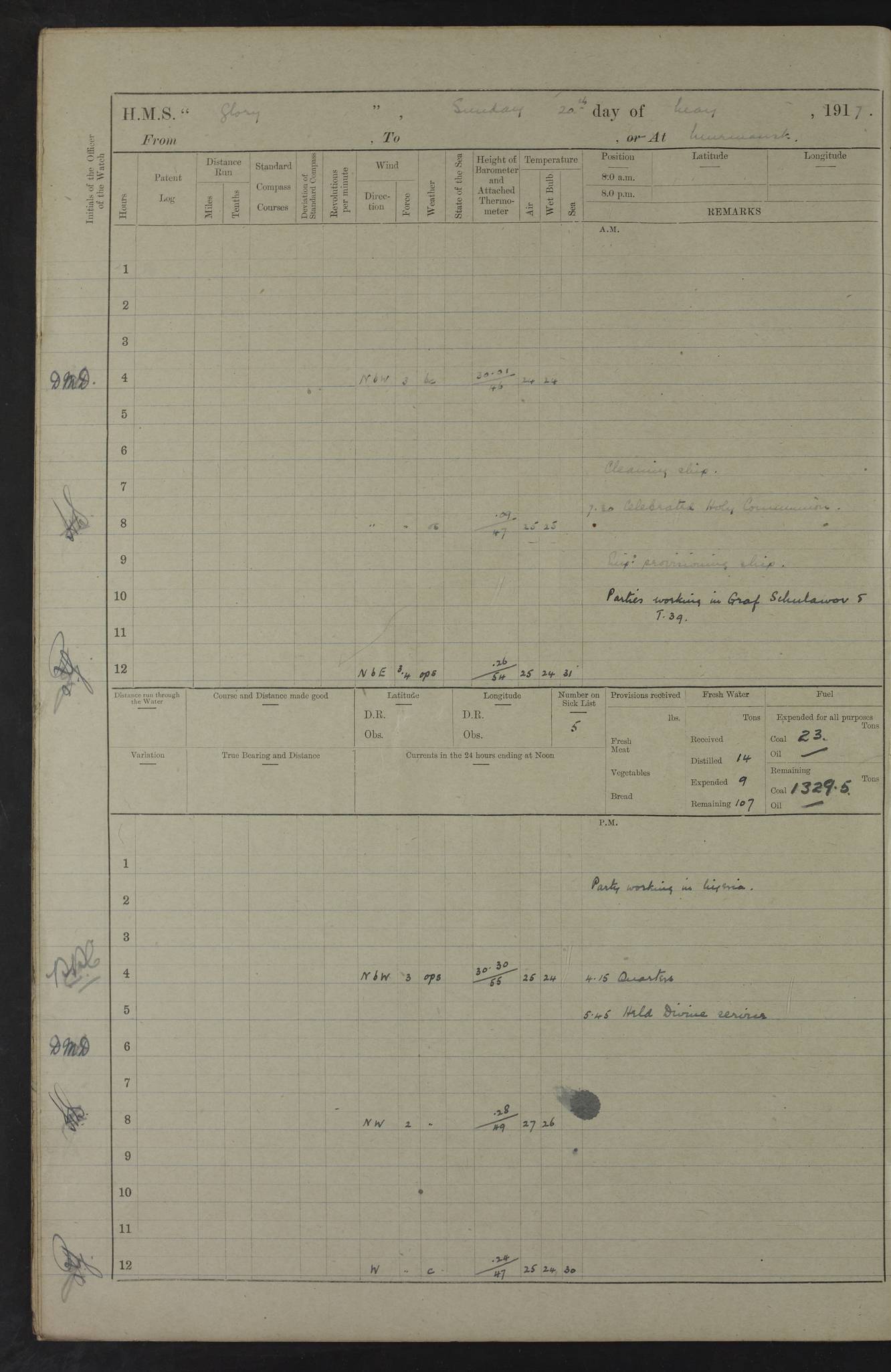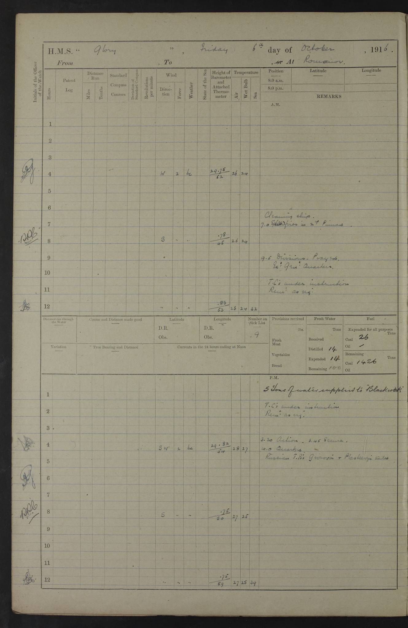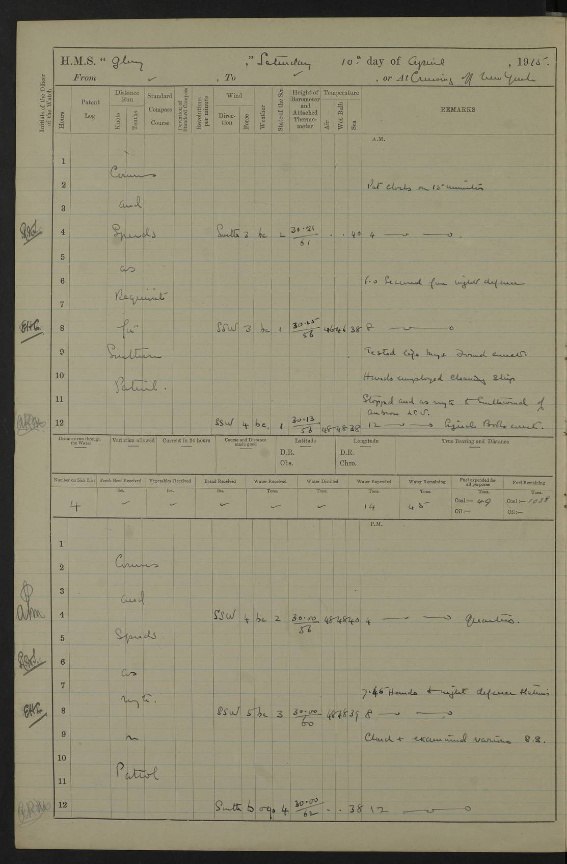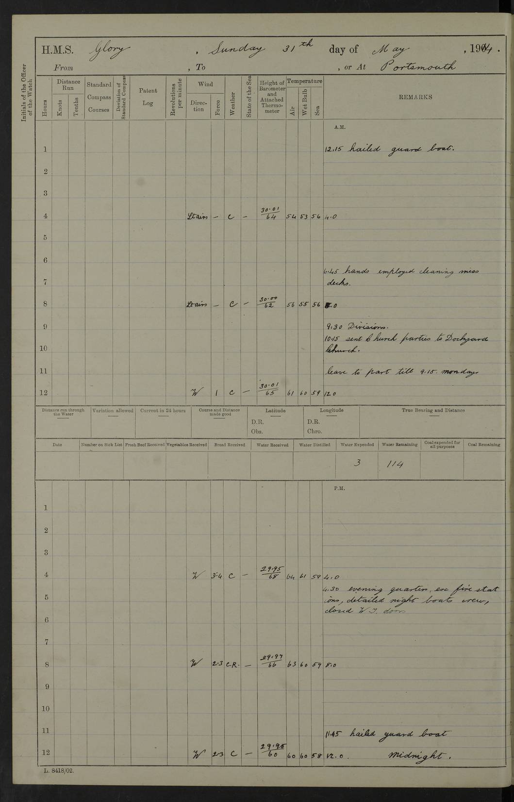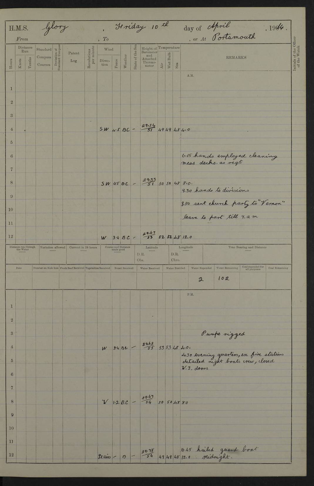 22 June 1915 At sea, Gibraltar to Lemnos Lat 36.1, Long -1.3 4.15am: Sighted land on starboard bow. 10.20am: Stopped port engine for repairs. 11.20am: proceeded with port engine. pm: a/c due to change in deviation. 10.00pm: Cape Tenez Light abeam, 18 miles. 4f73cd61a2fc8ea9030015f6: (https://s3.amazonaws.com:443/oldweather/ADM53-43015/0012_1.jpg) 23 June 1915 At sea, Gibraltar to Lemnos Lat 37.5, Long 4.8 Number on sick list: 4 5.00am: Secured from night defence stations. Placed anti-submarine guns. pm: Life saving appliances served out to men stationed in ? ?at abandon ship. 4f73cd61a2fc8ea9030015f7: (https://s3.amazonaws.com:443/oldweather/ADM53-43015/0013_0.jpg) 24 June 1915 At sea, Gibraltar to Lemnos Lat 37.4, Long 10.8 Position in log clearly bears no resemblance to the location of the ship. Position above is approximate and is based sighting of Zembra Island at 11.55am. 5.00am: Dispersed from night defence stations. Manned anti-submarine guns. am: Sighted two French torpedo boats. am: Torpedo boats passed to ~ No 362, 363. am: Sighted land on starboard beam. 11.55am: Zembra Island abeam, 25 miles. 2.00pm: Sighted Pantellaria S34ºE. 4.45pm: Pantellaria Light House abeam 12 miles. 4f73cd61a2fc8ea9030015f8: (https://s3.amazonaws.com:443/oldweather/ADM53-43015/0013_1.jpg) 25 June 1915 At sea, Gibraltar to Lemnos Lat 35.5, Long 16.7 2.10am: Gozo Light abeam 17 miles. 5.00am: Dispersed from night defence stations. Manned anti-submarine guns. 4f73cd61a2fc8ea9030015f9: (https://s3.amazonaws.com:443/oldweather/ADM53-43015/0014_0.jpg) 26 June 1915 At sea, Gibraltar to Lemnos Lat 35.5, Long 22.6 Number on sick list: 5 5.00am: Dispersed from night defence stations. Manned anti-submarine guns. am: Aired night clothing. am: marines at maxim practice on quarter deck. 2.00pm: Observed land on either bow. 3.00pm: Sighted French patrol destroyer. 4.15pm: Sighted French patrol destroyer. 9.40pm: Milo Peak N63ºW. 10.26pm: Polino Light abeam to port 5.5 miles. 4f73cd62a2fc8ea9030015fa: (https://s3.amazonaws.com:443/oldweather/ADM53-43015/0014_1.jpg) 27 June 1915 At sea and at Lemnos Lat 39.1, Long 24.4 From 0.50 to 3.05am sighting of multiple light houses. 3.50am: a/c to N39ºW and commenced to zig-zag. 5.00am: Dispersed from night defence stations and placed anti-submarine guns and look-outs. am: Lost overboard by accident Hazlewood fender, pat. 311, one in number. 10.30am: Held Divine Service onboard. pm: Met and signalled HMS Minerva on patrol duty. pm: Courses and speeds as requisite while waiting orders to approach Mudros. 3.00pm: Proceeded. 5.16pm: Increased to 90 revs, commenced to zig-zag. Course as requisite for Mudros. 7.00pm: Entered Mudros Bay. 7.47pm: Stopped. Let go port anchor in ‘M3’. 8.30pm: Darkened ship. pm: Manned one 6” and one 12 pdr. 4f73cd62a2fc8ea9030015fb: (https://s3.amazonaws.com:443/oldweather/ADM53-43015/0015_0.jpg) 28 June 1915 Mudros Bay, Lemnos Lat 39.89, Long 25.24 5,00am: HMS Vengeance entered harbour. HMS Vengeance was a pre-dreadnought of the Canopus class, launched in 1899 at Vickers, Barrow, and sold for scrapping in 1921. Details at http://en.wikipedia.org/wiki/HMS_Vengeance_(1899) . am/pm/: hands preparing for coaling and about ship’s work. pm: Collier Wabana secured alongside. 4f73cd62a2fc8ea9030015fc: (https://s3.amazonaws.com:443/oldweather/ADM53-43015/0015_1.jpg) 29 June 1915 Mudros Bay, Lemnos Lat 39.89, Long 25.24 5.15am: Commenced coaling. 2.00pm: Finished coaling. Collier left. 4f73cd62a2fc8ea9030015fd: (https://s3.amazonaws.com:443/oldweather/ADM53-43015/0016_0.jpg) 30 June 1915 Mudros Bay, Lemnos Lat 39.89, Long 25.24 am: Parties away sanding, and with fire engines onshore. am: Boats away disembarking troops. am: French Flagship Patrie sailed. The Patrie was a French pre-dreadnought, launched at La Seyne shipyard in 1903, and stricken in 1921. Details at http://en.wikipedia.org/wiki/French_battleship_Patrie . 6.30pm: Hands to bathe. 4f73cd63a2fc8ea9030015fe: (https://s3.amazonaws.com:443/oldweather/ADM53-43015/0016_1.jpg) 4f73cd63a2fc8ea9030015ff: (https://s3.amazonaws.com:443/oldweather/ADM53-43015/0017_0.jpg) 4f73cd63a2fc8ea903001600: (https://s3.amazonaws.com:443/oldweather/ADM53-43015/0017_1.jpg) 4f73cd63a2fc8ea903001601: (https://s3.amazonaws.com:443/oldweather/ADM53-43015/0018_0.jpg) 4f73cd64a2fc8ea903001602: (https://s3.amazonaws.com:443/oldweather/ADM53-43015/0018_1.jpg) LOGS FOR JULY 1915 From July to October 1915, HMS Glory spent her time at Port Mudros. Certain activities typically took place daily and are not generally noted in the pages below. These activities include: Lighting fires in the picket boat around 4am and drawing the fires in the late evening; Divisions at around 9–9.30am and Evening Quarters at 4pm; Darken ship at around 8.30pm; Daily ‘cleaning ship’, with variations thereof; SBC (for ‘Signal Books Correct’) at the watch changes. 4f73cd64a2fc8ea903001603: (https://s3.amazonaws.com:443/oldweather/ADM53-43016/0000_0.jpg) 4f73cd64a2fc8ea903001604: (https://s3.amazonaws.com:443/oldweather/ADM53-43016/0000_1.jpg) 4f73cd65a2fc8ea903001605: (https://s3.amazonaws.com:443/oldweather/ADM53-43016/0001_0.jpg) 4f73cd65a2fc8ea903001606: (https://s3.amazonaws.com:443/oldweather/ADM53-43016/0001_1.jpg) 1 July 1915 Port Mudros Lat 39.89, Long 25.24 6.30am: Landed working parties preparing boom defence ships. am: Discharged Acting Commander Rayne to Hector. Hector was a kite balloon ship. No further details readily available. 5.00pm: Tug T.10 made fast astern. 7.15pm: HMS Venerable went out. 7.30pm: HMS Chatham went out. HMS Chatham was a ‘Town’ cruiser and lead ship of her class. She was launched in 1911 at Chatham Dockyard and sold in 1926. Details at http://en.wikipedia.org/wiki/HMS_Chatham_(1911) . 4f73cd65a2fc8ea903001607: (https://s3.amazonaws.com:443/oldweather/ADM53-43016/0002_0.jpg) 2 July 1915 Port Mudros Lat 39.89, Long 25.24 5.35am: Landed working parties preparing boom defence ships. am/pm: Boom defence par
