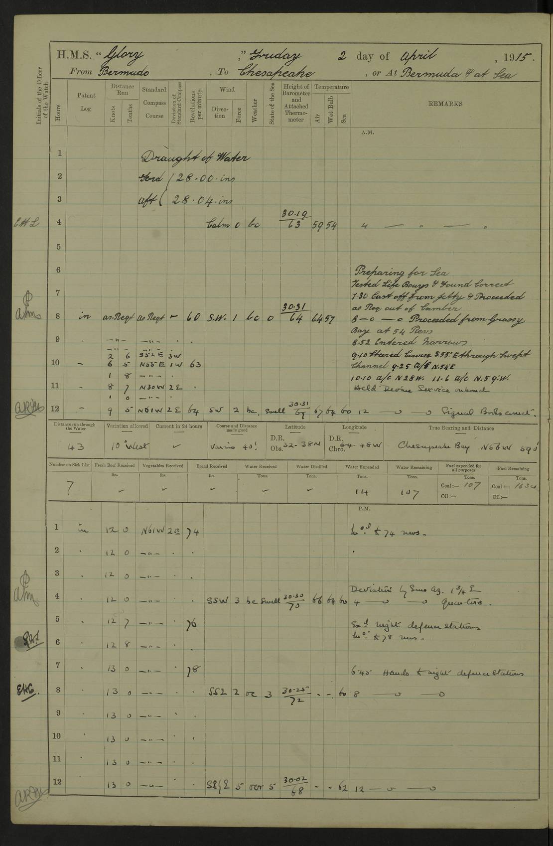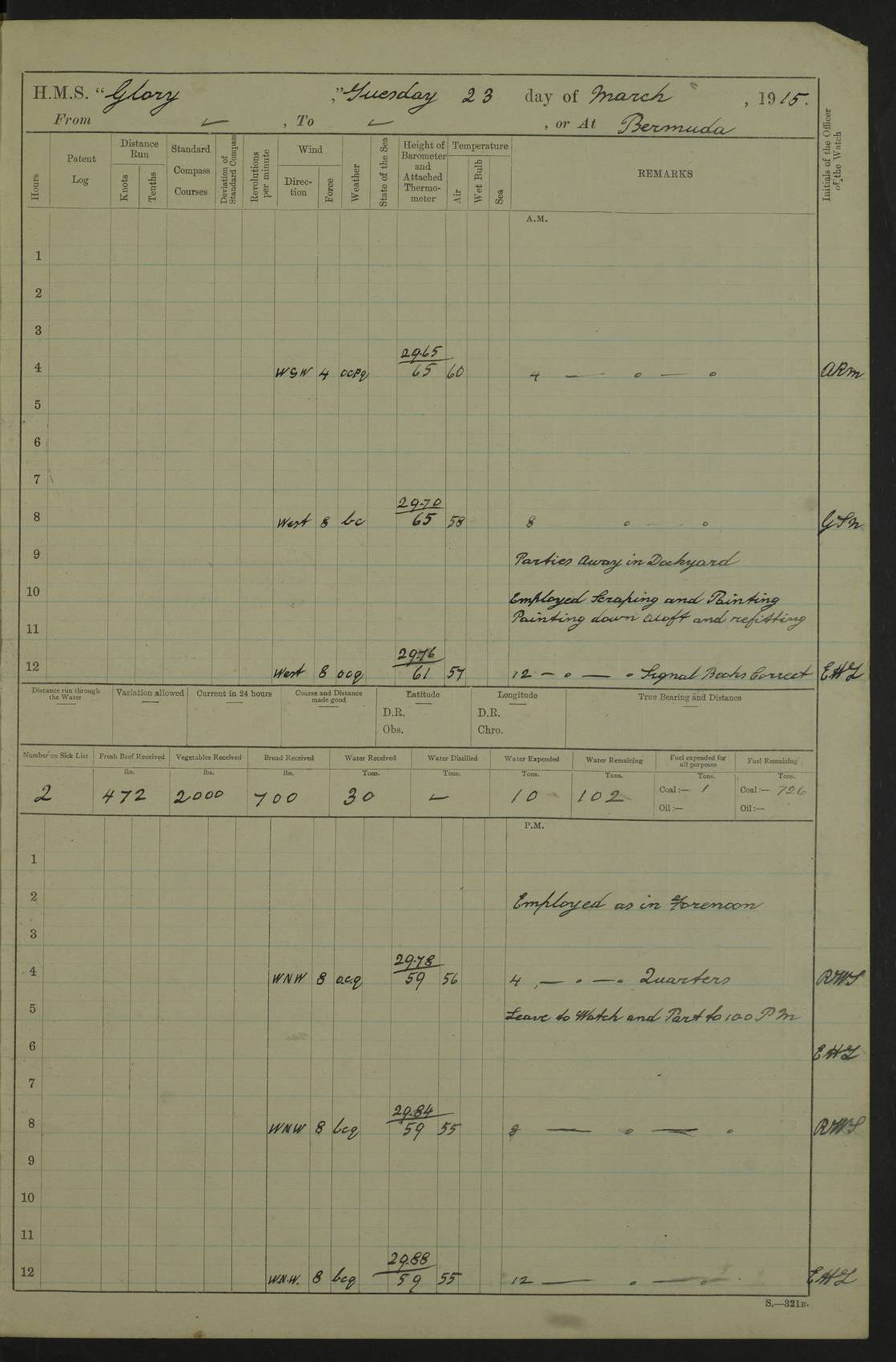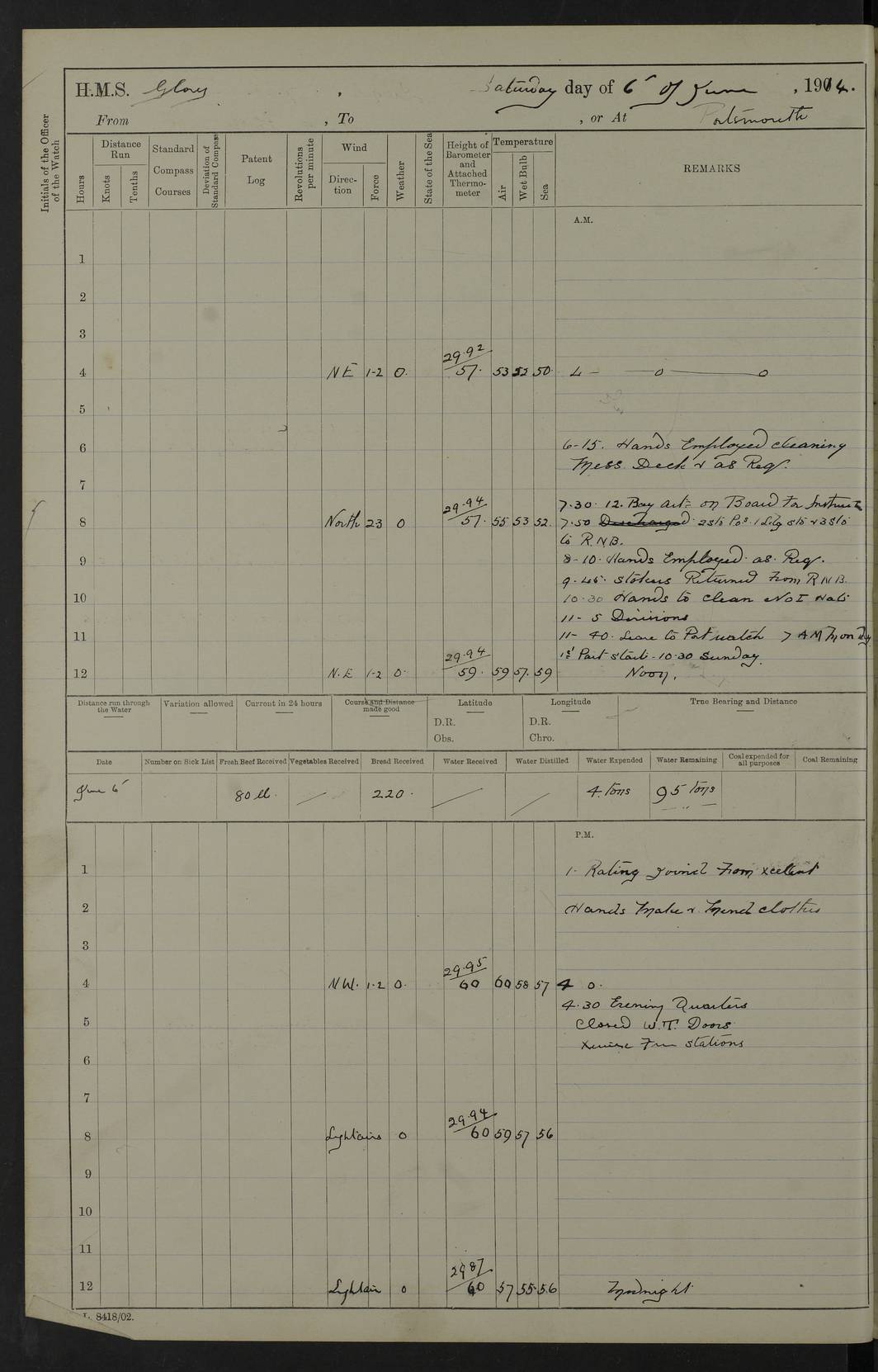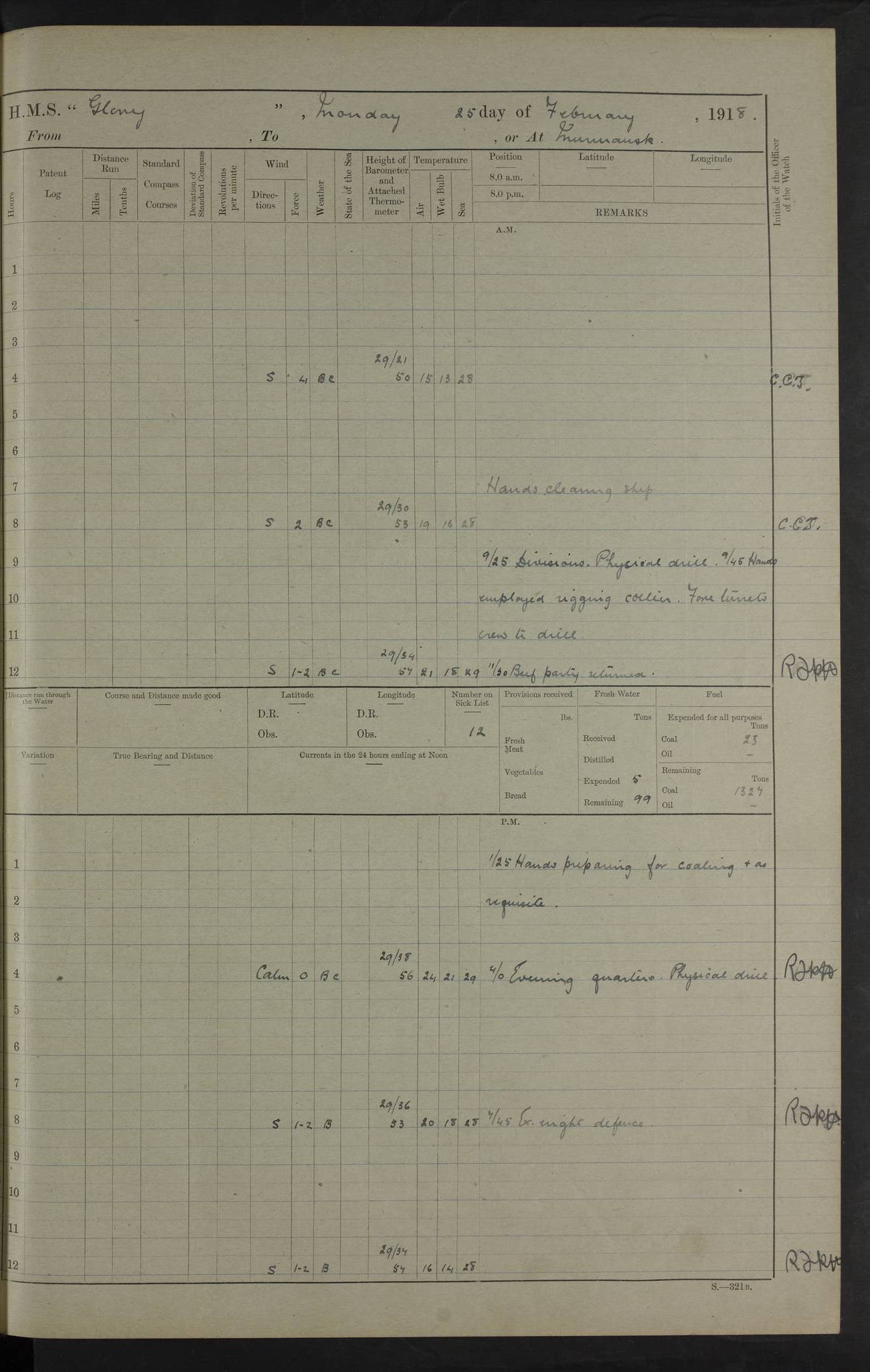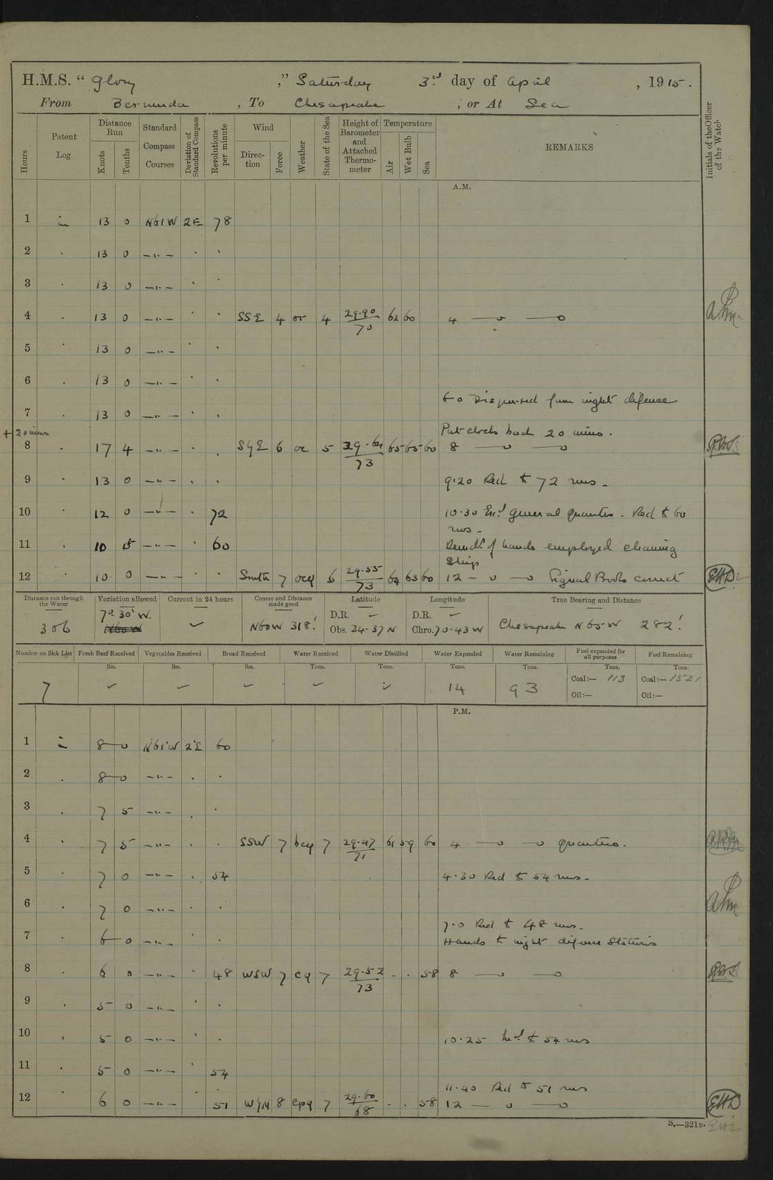 22 June 1915 At sea, Gibraltar to Lemnos Lat 36.1, Long -1.3 4.15am: Sighted land on starboard bow. 10.20am: Stopped port engine for repairs. 11.20am: proceeded with port engine. pm: a/c due to change in deviation. 10.00pm: Cape Tenez Light abeam, 18 miles. 4f73cd61a2fc8ea9030015f6: (https://s3.amazonaws.com:443/oldweather/ADM53-43015/0012_1.jpg) 23 June 1915 At sea, Gibraltar to Lemnos Lat 37.5, Long 4.8 Number on sick list: 4 5.00am: Secured from night defence stations. Placed anti-submarine guns. pm: Life saving appliances served out to men stationed in ? ?at abandon ship. 4f73cd61a2fc8ea9030015f7: (https://s3.amazonaws.com:443/oldweather/ADM53-43015/0013_0.jpg) 24 June 1915 At sea, Gibraltar to Lemnos Lat 37.4, Long 10.8 Position in log clearly bears no resemblance to the location of the ship. Position above is approximate and is based sighting of Zembra Island at 11.55am. 5.00am: Dispersed from night defence stations. Manned anti-submarine guns. am: Sighted two French torpedo boats. am: Torpedo boats passed to ~ No 362, 363. am: Sighted land on starboard beam. 11.55am: Zembra Island abeam, 25 miles. 2.00pm: Sighted Pantellaria S34ºE. 4.45pm: Pantellaria Light House abeam 12 miles. 4f73cd61a2fc8ea9030015f8: (https://s3.amazonaws.com:443/oldweather/ADM53-43015/0013_1.jpg) 25 June 1915 At sea, Gibraltar to Lemnos Lat 35.5, Long 16.7 2.10am: Gozo Light abeam 17 miles. 5.00am: Dispersed from night defence stations. Manned anti-submarine guns. 4f73cd61a2fc8ea9030015f9: (https://s3.amazonaws.com:443/oldweather/ADM53-43015/0014_0.jpg) 26 June 1915 At sea, Gibraltar to Lemnos Lat 35.5, Long 22.6 Number on sick list: 5 5.00am: Dispersed from night defence stations. Manned anti-submarine guns. am: Aired night clothing. am: marines at maxim practice on quarter deck. 2.00pm: Observed land on either bow. 3.00pm: Sighted French patrol destroyer. 4.15pm: Sighted French patrol destroyer. 9.40pm: Milo Peak N63ºW. 10.26pm: Polino Light abeam to port 5.5 miles. 4f73cd62a2fc8ea9030015fa: (https://s3.amazonaws.com:443/oldweather/ADM53-43015/0014_1.jpg) 27 June 1915 At sea and at Lemnos Lat 39.1, Long 24.4 From 0.50 to 3.05am sighting of multiple light houses. 3.50am: a/c to N39ºW and commenced to zig-zag. 5.00am: Dispersed from night defence stations and placed anti-submarine guns and look-outs. am: Lost overboard by accident Hazlewood fender, pat. 311, one in number. 10.30am: Held Divine Service onboard. pm: Met and signalled HMS Minerva on patrol duty. pm: Courses and speeds as requisite while waiting orders to approach Mudros. 3.00pm: Proceeded. 5.16pm: Increased to 90 revs, commenced to zig-zag. Course as requisite for Mudros. 7.00pm: Entered Mudros Bay. 7.47pm: Stopped. Let go port anchor in ‘M3’. 8.30pm: Darkened ship. pm: Manned one 6” and one 12 pdr. 4f73cd62a2fc8ea9030015fb: (https://s3.amazonaws.com:443/oldweather/ADM53-43015/0015_0.jpg) 28 June 1915 Mudros Bay, Lemnos Lat 39.89, Long 25.24 5,00am: HMS Vengeance entered harbour. HMS Vengeance was a pre-dreadnought of the Canopus class, launched in 1899 at Vickers, Barrow, and sold for scrapping in 1921. Details at http://en.wikipedia.org/wiki/HMS_Vengeance_(1899) . am/pm/: hands preparing for coaling and about ship’s work. pm: Collier Wabana secured alongside. 4f73cd62a2fc8ea9030015fc: (https://s3.amazonaws.com:443/oldweather/ADM53-43015/0015_1.jpg) 29 June 1915 Mudros Bay, Lemnos Lat 39.89, Long 25.24 5.15am: Commenced coaling. 2.00pm: Finished coaling. Collier left. 4f73cd62a2fc8ea9030015fd: (https://s3.amazonaws.com:443/oldweather/ADM53-43015/0016_0.jpg) 30 June 1915 Mudros Bay, Lemnos Lat 39.89, Long 25.24 am: Parties away sanding, and with fire engines onshore. am: Boats away disembarking troops. am: French Flagship Patrie sailed. The Patrie was a French pre-dreadnought, launched at La Seyne shipyard in 1903, and stricken in 1921. Details at http://en.wikipedia.org/wiki/French_battleship_Patrie . 6.30pm: Hands to bathe. 4f73cd63a2fc8ea9030015fe: (https://s3.amazonaws.com:443/oldweather/ADM53-43015/0016_1.jpg) 4f73cd63a2fc8ea9030015ff: (https://s3.amazonaws.com:443/oldweather/ADM53-43015/0017_0.jpg) 4f73cd63a2fc8ea903001600: (https://s3.amazonaws.com:443/oldweather/ADM53-43015/0017_1.jpg) 4f73cd63a2fc8ea903001601: (https://s3.amazonaws.com:443/oldweather/ADM53-43015/0018_0.jpg) 4f73cd64a2fc8ea903001602: (https://s3.amazonaws.com:443/oldweather/ADM53-43015/0018_1.jpg) LOGS FOR JULY 1915 From July to October 1915, HMS Glory spent her time at Port Mudros. Certain activities typically took place daily and are not generally noted in the pages below. These activities include: Lighting fires in the picket boat around 4am and drawing the fires in the late evening; Divisions at around 9–9.30am and Evening Quarters at 4pm; Darken ship at around 8.30pm; Daily ‘cleaning ship’, with variations thereof; SBC (for ‘Signal Books Correct’) at the watch changes. 4f73cd64a2fc8ea903001603: (https://s3.amazonaws.com:443/oldweather/ADM53-43016/0000_0.jpg) 4f73cd64a2fc8ea903001604: (https://s3.amazonaws.com:443/oldweather/ADM53-43016/0000_1.jpg) 4f73cd65a2fc8ea903001605: (https://s3.amazonaws.com:443/oldweather/ADM53-43016/0001_0.jpg) 4f73cd65a2fc8ea903001606: (https://s3.amazonaws.com:443/oldweather/ADM53-43016/0001_1.jpg) 1 July 1915 Port Mudros Lat 39.89, Long 25.24 6.30am: Landed working parties preparing boom defence ships. am: Discharged Acting Commander Rayne to Hector. Hector was a kite balloon ship. No further details readily available. 5.00pm: Tug T.10 made fast astern. 7.15pm: HMS Venerable went out. 7.30pm: HMS Chatham went out. HMS Chatham was a ‘Town’ cruiser and lead ship of her class. She was launched in 1911 at Chatham Dockyard and sold in 1926. Details at http://en.wikipedia.org/wiki/HMS_Chatham_(1911) . 4f73cd65a2fc8ea903001607: (https://s3.amazonaws.com:443/oldweather/ADM53-43016/0002_0.jpg) 2 July 1915 Port Mudros Lat 39.89, Long 25.24 5.35am: Landed working parties preparing boom defence ships. am/pm: Boom defence par