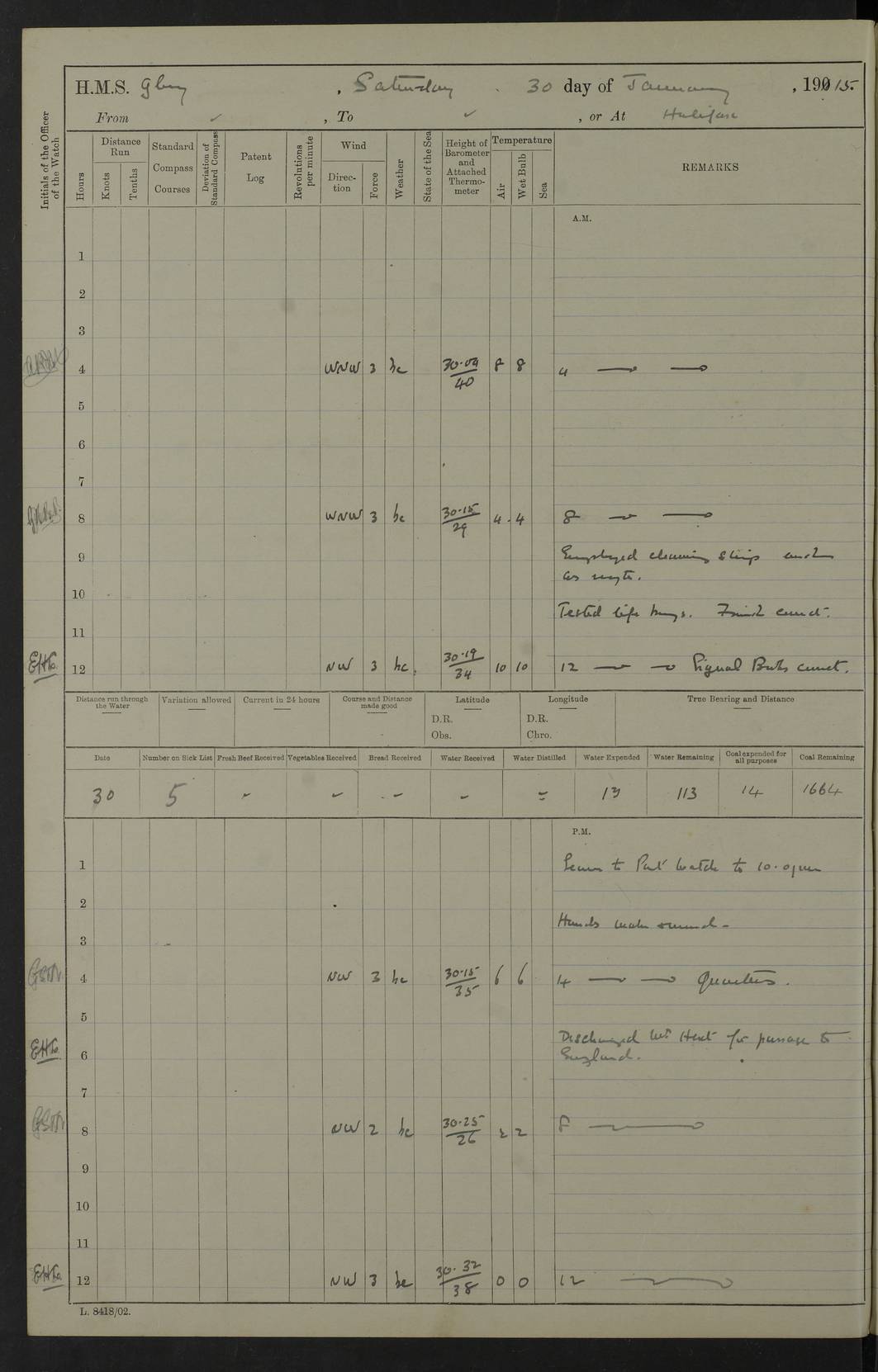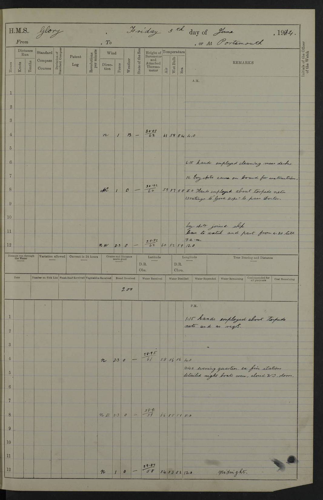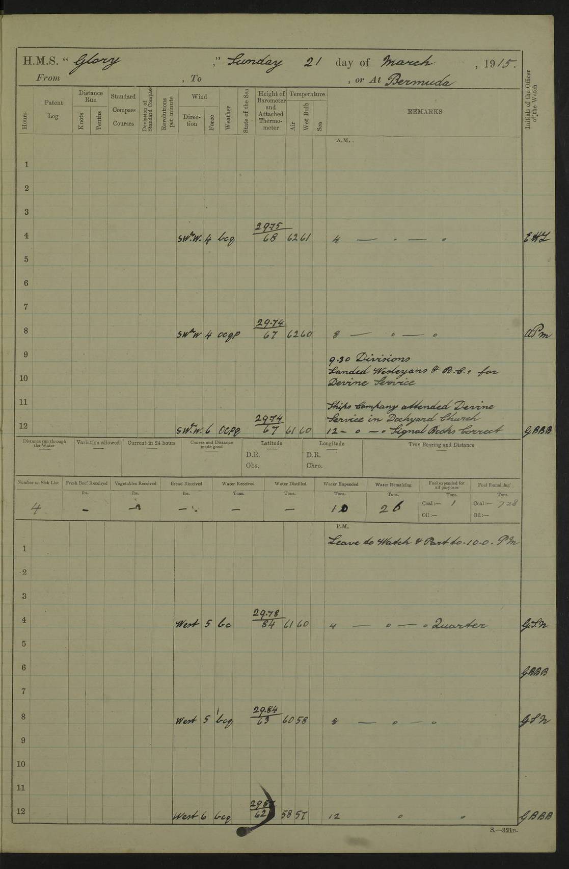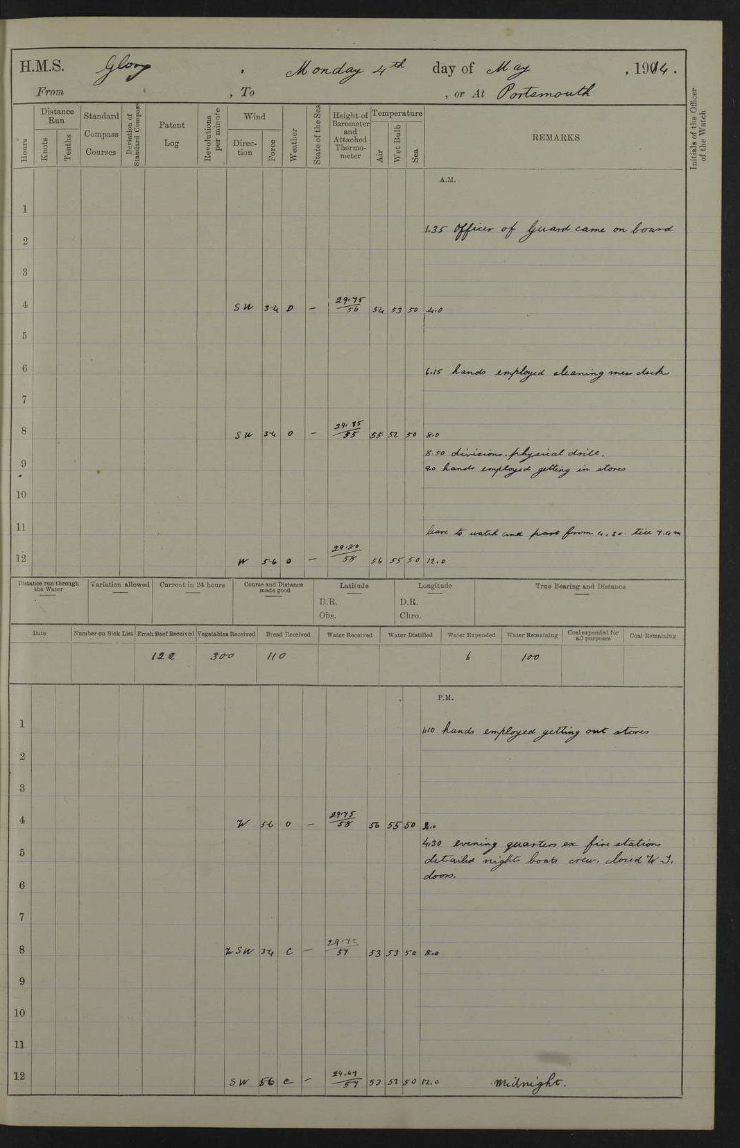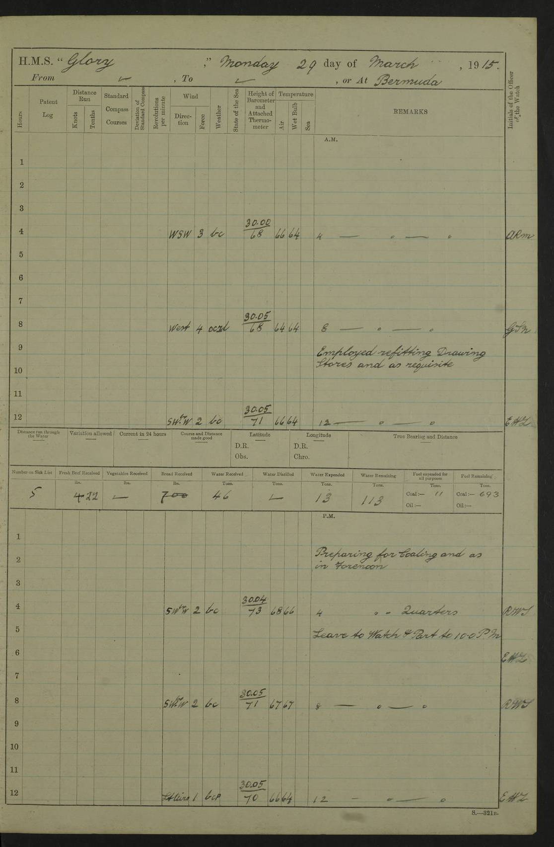 22 June 1915 At sea, Gibraltar to Lemnos Lat 36.1, Long -1.3 4.15am: Sighted land on starboard bow. 10.20am: Stopped port engine for repairs. 11.20am: proceeded with port engine. pm: a/c due to change in deviation. 10.00pm: Cape Tenez Light abeam, 18 miles. 4f73cd61a2fc8ea9030015f6: (https://s3.amazonaws.com:443/oldweather/ADM53-43015/0012_1.jpg) 23 June 1915 At sea, Gibraltar to Lemnos Lat 37.5, Long 4.8 Number on sick list: 4 5.00am: Secured from night defence stations. Placed anti-submarine guns. pm: Life saving appliances served out to men stationed in ? ?at abandon ship. 4f73cd61a2fc8ea9030015f7: (https://s3.amazonaws.com:443/oldweather/ADM53-43015/0013_0.jpg) 24 June 1915 At sea, Gibraltar to Lemnos Lat 37.4, Long 10.8 Position in log clearly bears no resemblance to the location of the ship. Position above is approximate and is based sighting of Zembra Island at 11.55am. 5.00am: Dispersed from night defence stations. Manned anti-submarine guns. am: Sighted two French torpedo boats. am: Torpedo boats passed to ~ No 362, 363. am: Sighted land on starboard beam. 11.55am: Zembra Island abeam, 25 miles. 2.00pm: Sighted Pantellaria S34ºE. 4.45pm: Pantellaria Light House abeam 12 miles. 4f73cd61a2fc8ea9030015f8: (https://s3.amazonaws.com:443/oldweather/ADM53-43015/0013_1.jpg) 25 June 1915 At sea, Gibraltar to Lemnos Lat 35.5, Long 16.7 2.10am: Gozo Light abeam 17 miles. 5.00am: Dispersed from night defence stations. Manned anti-submarine guns. 4f73cd61a2fc8ea9030015f9: (https://s3.amazonaws.com:443/oldweather/ADM53-43015/0014_0.jpg) 26 June 1915 At sea, Gibraltar to Lemnos Lat 35.5, Long 22.6 Number on sick list: 5 5.00am: Dispersed from night defence stations. Manned anti-submarine guns. am: Aired night clothing. am: marines at maxim practice on quarter deck. 2.00pm: Observed land on either bow. 3.00pm: Sighted French patrol destroyer. 4.15pm: Sighted French patrol destroyer. 9.40pm: Milo Peak N63ºW. 10.26pm: Polino Light abeam to port 5.5 miles. 4f73cd62a2fc8ea9030015fa: (https://s3.amazonaws.com:443/oldweather/ADM53-43015/0014_1.jpg) 27 June 1915 At sea and at Lemnos Lat 39.1, Long 24.4 From 0.50 to 3.05am sighting of multiple light houses. 3.50am: a/c to N39ºW and commenced to zig-zag. 5.00am: Dispersed from night defence stations and placed anti-submarine guns and look-outs. am: Lost overboard by accident Hazlewood fender, pat. 311, one in number. 10.30am: Held Divine Service onboard. pm: Met and signalled HMS Minerva on patrol duty. pm: Courses and speeds as requisite while waiting orders to approach Mudros. 3.00pm: Proceeded. 5.16pm: Increased to 90 revs, commenced to zig-zag. Course as requisite for Mudros. 7.00pm: Entered Mudros Bay. 7.47pm: Stopped. Let go port anchor in ‘M3’. 8.30pm: Darkened ship. pm: Manned one 6” and one 12 pdr. 4f73cd62a2fc8ea9030015fb: (https://s3.amazonaws.com:443/oldweather/ADM53-43015/0015_0.jpg) 28 June 1915 Mudros Bay, Lemnos Lat 39.89, Long 25.24 5,00am: HMS Vengeance entered harbour. HMS Vengeance was a pre-dreadnought of the Canopus class, launched in 1899 at Vickers, Barrow, and sold for scrapping in 1921. Details at http://en.wikipedia.org/wiki/HMS_Vengeance_(1899) . am/pm/: hands preparing for coaling and about ship’s work. pm: Collier Wabana secured alongside. 4f73cd62a2fc8ea9030015fc: (https://s3.amazonaws.com:443/oldweather/ADM53-43015/0015_1.jpg) 29 June 1915 Mudros Bay, Lemnos Lat 39.89, Long 25.24 5.15am: Commenced coaling. 2.00pm: Finished coaling. Collier left. 4f73cd62a2fc8ea9030015fd: (https://s3.amazonaws.com:443/oldweather/ADM53-43015/0016_0.jpg) 30 June 1915 Mudros Bay, Lemnos Lat 39.89, Long 25.24 am: Parties away sanding, and with fire engines onshore. am: Boats away disembarking troops. am: French Flagship Patrie sailed. The Patrie was a French pre-dreadnought, launched at La Seyne shipyard in 1903, and stricken in 1921. Details at http://en.wikipedia.org/wiki/French_battleship_Patrie . 6.30pm: Hands to bathe. 4f73cd63a2fc8ea9030015fe: (https://s3.amazonaws.com:443/oldweather/ADM53-43015/0016_1.jpg) 4f73cd63a2fc8ea9030015ff: (https://s3.amazonaws.com:443/oldweather/ADM53-43015/0017_0.jpg) 4f73cd63a2fc8ea903001600: (https://s3.amazonaws.com:443/oldweather/ADM53-43015/0017_1.jpg) 4f73cd63a2fc8ea903001601: (https://s3.amazonaws.com:443/oldweather/ADM53-43015/0018_0.jpg) 4f73cd64a2fc8ea903001602: (https://s3.amazonaws.com:443/oldweather/ADM53-43015/0018_1.jpg) LOGS FOR JULY 1915 From July to October 1915, HMS Glory spent her time at Port Mudros. Certain activities typically took place daily and are not generally noted in the pages below. These activities include: Lighting fires in the picket boat around 4am and drawing the fires in the late evening; Divisions at around 9–9.30am and Evening Quarters at 4pm; Darken ship at around 8.30pm; Daily ‘cleaning ship’, with variations thereof; SBC (for ‘Signal Books Correct’) at the watch changes. 4f73cd64a2fc8ea903001603: (https://s3.amazonaws.com:443/oldweather/ADM53-43016/0000_0.jpg) 4f73cd64a2fc8ea903001604: (https://s3.amazonaws.com:443/oldweather/ADM53-43016/0000_1.jpg) 4f73cd65a2fc8ea903001605: (https://s3.amazonaws.com:443/oldweather/ADM53-43016/0001_0.jpg) 4f73cd65a2fc8ea903001606: (https://s3.amazonaws.com:443/oldweather/ADM53-43016/0001_1.jpg) 1 July 1915 Port Mudros Lat 39.89, Long 25.24 6.30am: Landed working parties preparing boom defence ships. am: Discharged Acting Commander Rayne to Hector. Hector was a kite balloon ship. No further details readily available. 5.00pm: Tug T.10 made fast astern. 7.15pm: HMS Venerable went out. 7.30pm: HMS Chatham went out. HMS Chatham was a ‘Town’ cruiser and lead ship of her class. She was launched in 1911 at Chatham Dockyard and sold in 1926. Details at http://en.wikipedia.org/wiki/HMS_Chatham_(1911) . 4f73cd65a2fc8ea903001607: (https://s3.amazonaws.com:443/oldweather/ADM53-43016/0002_0.jpg) 2 July 1915 Port Mudros Lat 39.89, Long 25.24 5.35am: Landed working parties preparing boom defence ships. am/pm: Boom defence par