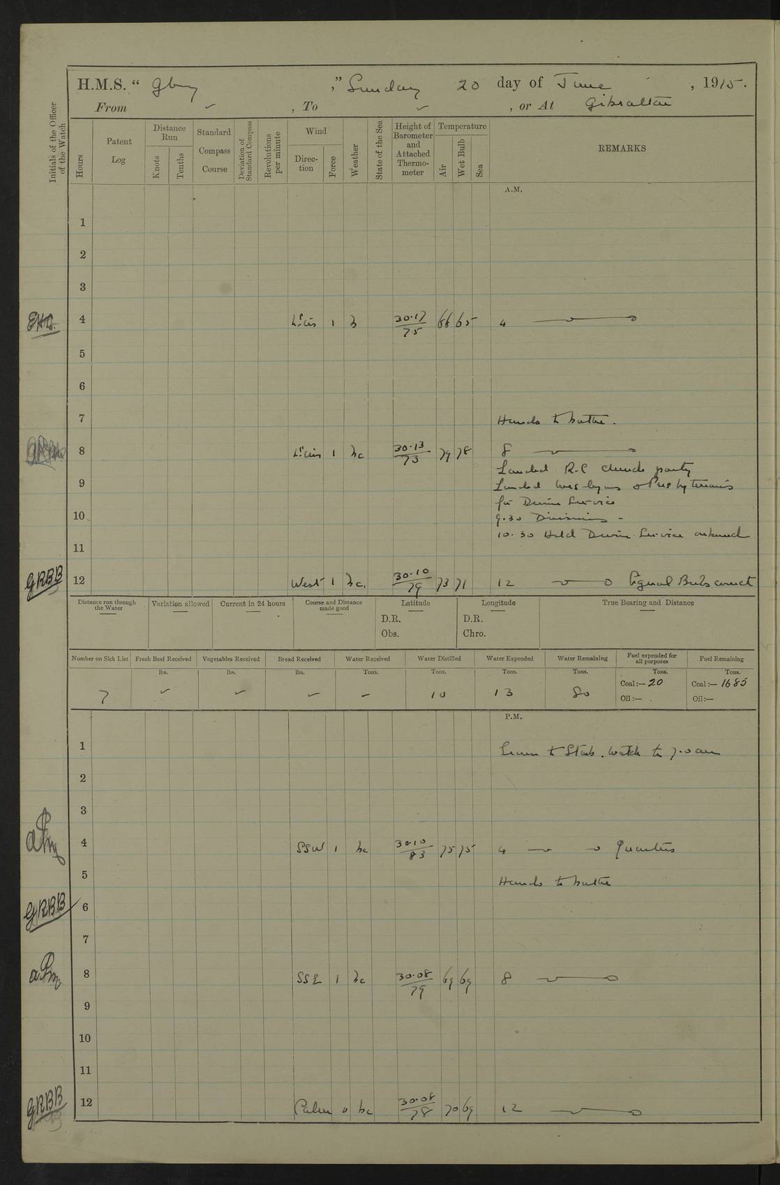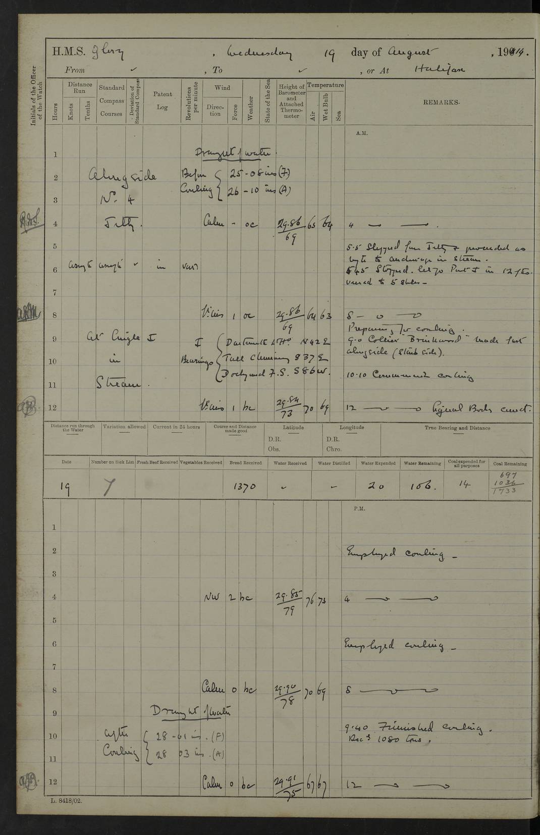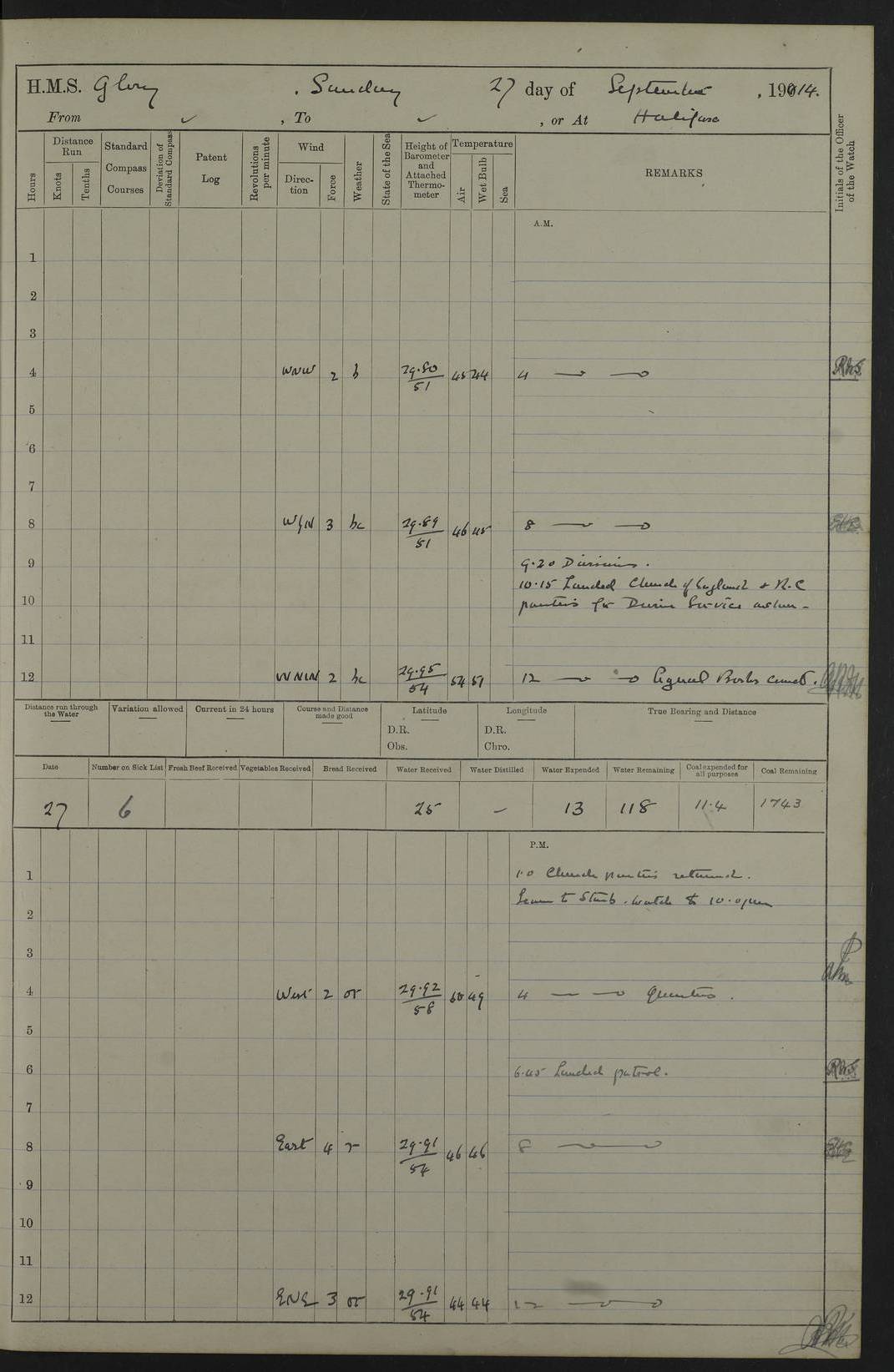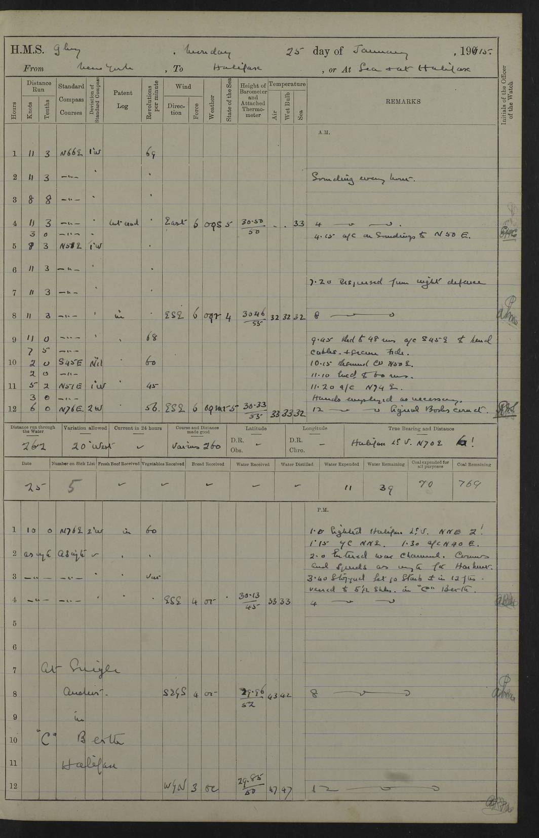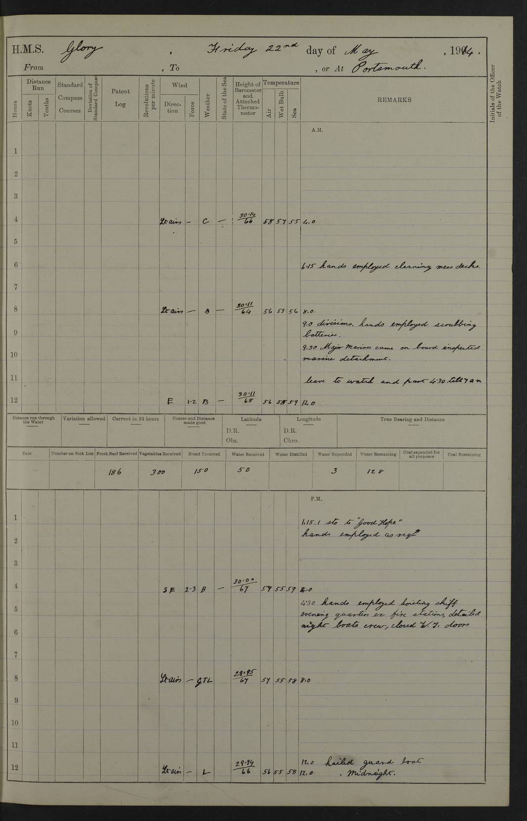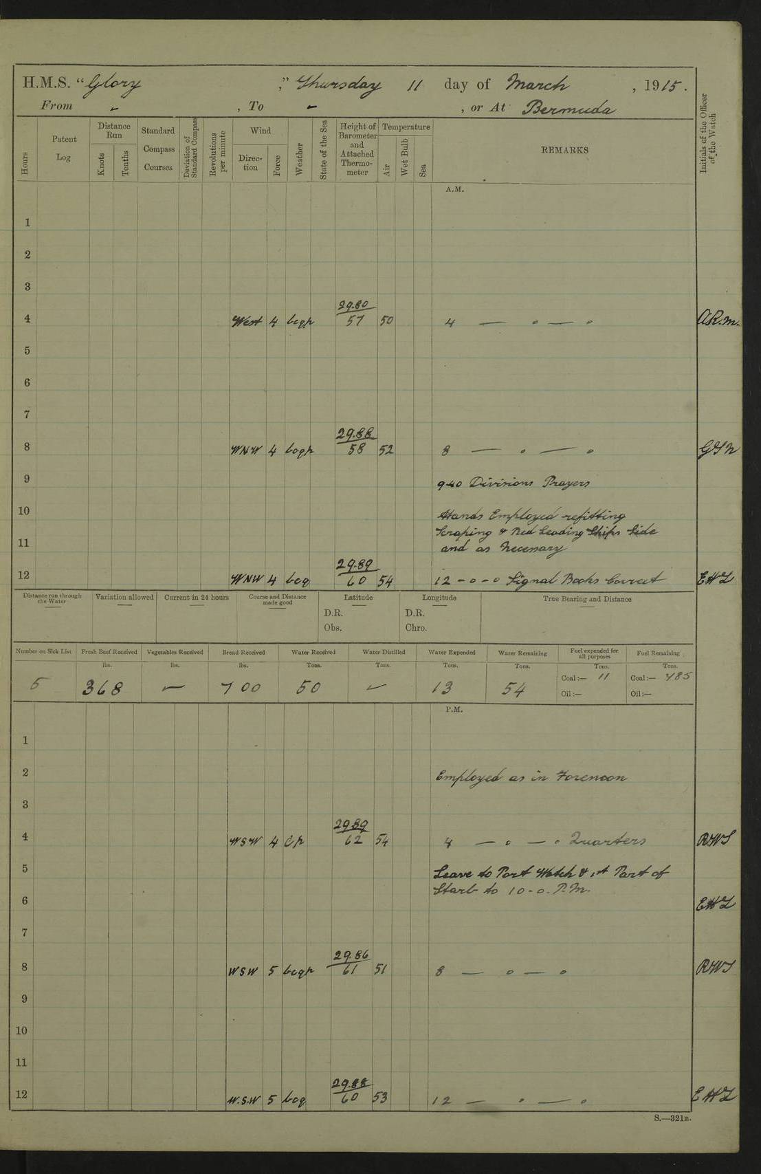 22 June 1915 At sea, Gibraltar to Lemnos Lat 36.1, Long -1.3 4.15am: Sighted land on starboard bow. 10.20am: Stopped port engine for repairs. 11.20am: proceeded with port engine. pm: a/c due to change in deviation. 10.00pm: Cape Tenez Light abeam, 18 miles. 4f73cd61a2fc8ea9030015f6: (https://s3.amazonaws.com:443/oldweather/ADM53-43015/0012_1.jpg) 23 June 1915 At sea, Gibraltar to Lemnos Lat 37.5, Long 4.8 Number on sick list: 4 5.00am: Secured from night defence stations. Placed anti-submarine guns. pm: Life saving appliances served out to men stationed in ? ?at abandon ship. 4f73cd61a2fc8ea9030015f7: (https://s3.amazonaws.com:443/oldweather/ADM53-43015/0013_0.jpg) 24 June 1915 At sea, Gibraltar to Lemnos Lat 37.4, Long 10.8 Position in log clearly bears no resemblance to the location of the ship. Position above is approximate and is based sighting of Zembra Island at 11.55am. 5.00am: Dispersed from night defence stations. Manned anti-submarine guns. am: Sighted two French torpedo boats. am: Torpedo boats passed to ~ No 362, 363. am: Sighted land on starboard beam. 11.55am: Zembra Island abeam, 25 miles. 2.00pm: Sighted Pantellaria S34ºE. 4.45pm: Pantellaria Light House abeam 12 miles. 4f73cd61a2fc8ea9030015f8: (https://s3.amazonaws.com:443/oldweather/ADM53-43015/0013_1.jpg) 25 June 1915 At sea, Gibraltar to Lemnos Lat 35.5, Long 16.7 2.10am: Gozo Light abeam 17 miles. 5.00am: Dispersed from night defence stations. Manned anti-submarine guns. 4f73cd61a2fc8ea9030015f9: (https://s3.amazonaws.com:443/oldweather/ADM53-43015/0014_0.jpg) 26 June 1915 At sea, Gibraltar to Lemnos Lat 35.5, Long 22.6 Number on sick list: 5 5.00am: Dispersed from night defence stations. Manned anti-submarine guns. am: Aired night clothing. am: marines at maxim practice on quarter deck. 2.00pm: Observed land on either bow. 3.00pm: Sighted French patrol destroyer. 4.15pm: Sighted French patrol destroyer. 9.40pm: Milo Peak N63ºW. 10.26pm: Polino Light abeam to port 5.5 miles. 4f73cd62a2fc8ea9030015fa: (https://s3.amazonaws.com:443/oldweather/ADM53-43015/0014_1.jpg) 27 June 1915 At sea and at Lemnos Lat 39.1, Long 24.4 From 0.50 to 3.05am sighting of multiple light houses. 3.50am: a/c to N39ºW and commenced to zig-zag. 5.00am: Dispersed from night defence stations and placed anti-submarine guns and look-outs. am: Lost overboard by accident Hazlewood fender, pat. 311, one in number. 10.30am: Held Divine Service onboard. pm: Met and signalled HMS Minerva on patrol duty. pm: Courses and speeds as requisite while waiting orders to approach Mudros. 3.00pm: Proceeded. 5.16pm: Increased to 90 revs, commenced to zig-zag. Course as requisite for Mudros. 7.00pm: Entered Mudros Bay. 7.47pm: Stopped. Let go port anchor in ‘M3’. 8.30pm: Darkened ship. pm: Manned one 6” and one 12 pdr. 4f73cd62a2fc8ea9030015fb: (https://s3.amazonaws.com:443/oldweather/ADM53-43015/0015_0.jpg) 28 June 1915 Mudros Bay, Lemnos Lat 39.89, Long 25.24 5,00am: HMS Vengeance entered harbour. HMS Vengeance was a pre-dreadnought of the Canopus class, launched in 1899 at Vickers, Barrow, and sold for scrapping in 1921. Details at http://en.wikipedia.org/wiki/HMS_Vengeance_(1899) . am/pm/: hands preparing for coaling and about ship’s work. pm: Collier Wabana secured alongside. 4f73cd62a2fc8ea9030015fc: (https://s3.amazonaws.com:443/oldweather/ADM53-43015/0015_1.jpg) 29 June 1915 Mudros Bay, Lemnos Lat 39.89, Long 25.24 5.15am: Commenced coaling. 2.00pm: Finished coaling. Collier left. 4f73cd62a2fc8ea9030015fd: (https://s3.amazonaws.com:443/oldweather/ADM53-43015/0016_0.jpg) 30 June 1915 Mudros Bay, Lemnos Lat 39.89, Long 25.24 am: Parties away sanding, and with fire engines onshore. am: Boats away disembarking troops. am: French Flagship Patrie sailed. The Patrie was a French pre-dreadnought, launched at La Seyne shipyard in 1903, and stricken in 1921. Details at http://en.wikipedia.org/wiki/French_battleship_Patrie . 6.30pm: Hands to bathe. 4f73cd63a2fc8ea9030015fe: (https://s3.amazonaws.com:443/oldweather/ADM53-43015/0016_1.jpg) 4f73cd63a2fc8ea9030015ff: (https://s3.amazonaws.com:443/oldweather/ADM53-43015/0017_0.jpg) 4f73cd63a2fc8ea903001600: (https://s3.amazonaws.com:443/oldweather/ADM53-43015/0017_1.jpg) 4f73cd63a2fc8ea903001601: (https://s3.amazonaws.com:443/oldweather/ADM53-43015/0018_0.jpg) 4f73cd64a2fc8ea903001602: (https://s3.amazonaws.com:443/oldweather/ADM53-43015/0018_1.jpg) LOGS FOR JULY 1915 From July to October 1915, HMS Glory spent her time at Port Mudros. Certain activities typically took place daily and are not generally noted in the pages below. These activities include: Lighting fires in the picket boat around 4am and drawing the fires in the late evening; Divisions at around 9–9.30am and Evening Quarters at 4pm; Darken ship at around 8.30pm; Daily ‘cleaning ship’, with variations thereof; SBC (for ‘Signal Books Correct’) at the watch changes. 4f73cd64a2fc8ea903001603: (https://s3.amazonaws.com:443/oldweather/ADM53-43016/0000_0.jpg) 4f73cd64a2fc8ea903001604: (https://s3.amazonaws.com:443/oldweather/ADM53-43016/0000_1.jpg) 4f73cd65a2fc8ea903001605: (https://s3.amazonaws.com:443/oldweather/ADM53-43016/0001_0.jpg) 4f73cd65a2fc8ea903001606: (https://s3.amazonaws.com:443/oldweather/ADM53-43016/0001_1.jpg) 1 July 1915 Port Mudros Lat 39.89, Long 25.24 6.30am: Landed working parties preparing boom defence ships. am: Discharged Acting Commander Rayne to Hector. Hector was a kite balloon ship. No further details readily available. 5.00pm: Tug T.10 made fast astern. 7.15pm: HMS Venerable went out. 7.30pm: HMS Chatham went out. HMS Chatham was a ‘Town’ cruiser and lead ship of her class. She was launched in 1911 at Chatham Dockyard and sold in 1926. Details at http://en.wikipedia.org/wiki/HMS_Chatham_(1911) . 4f73cd65a2fc8ea903001607: (https://s3.amazonaws.com:443/oldweather/ADM53-43016/0002_0.jpg) 2 July 1915 Port Mudros Lat 39.89, Long 25.24 5.35am: Landed working parties preparing boom defence ships. am/pm: Boom defence par