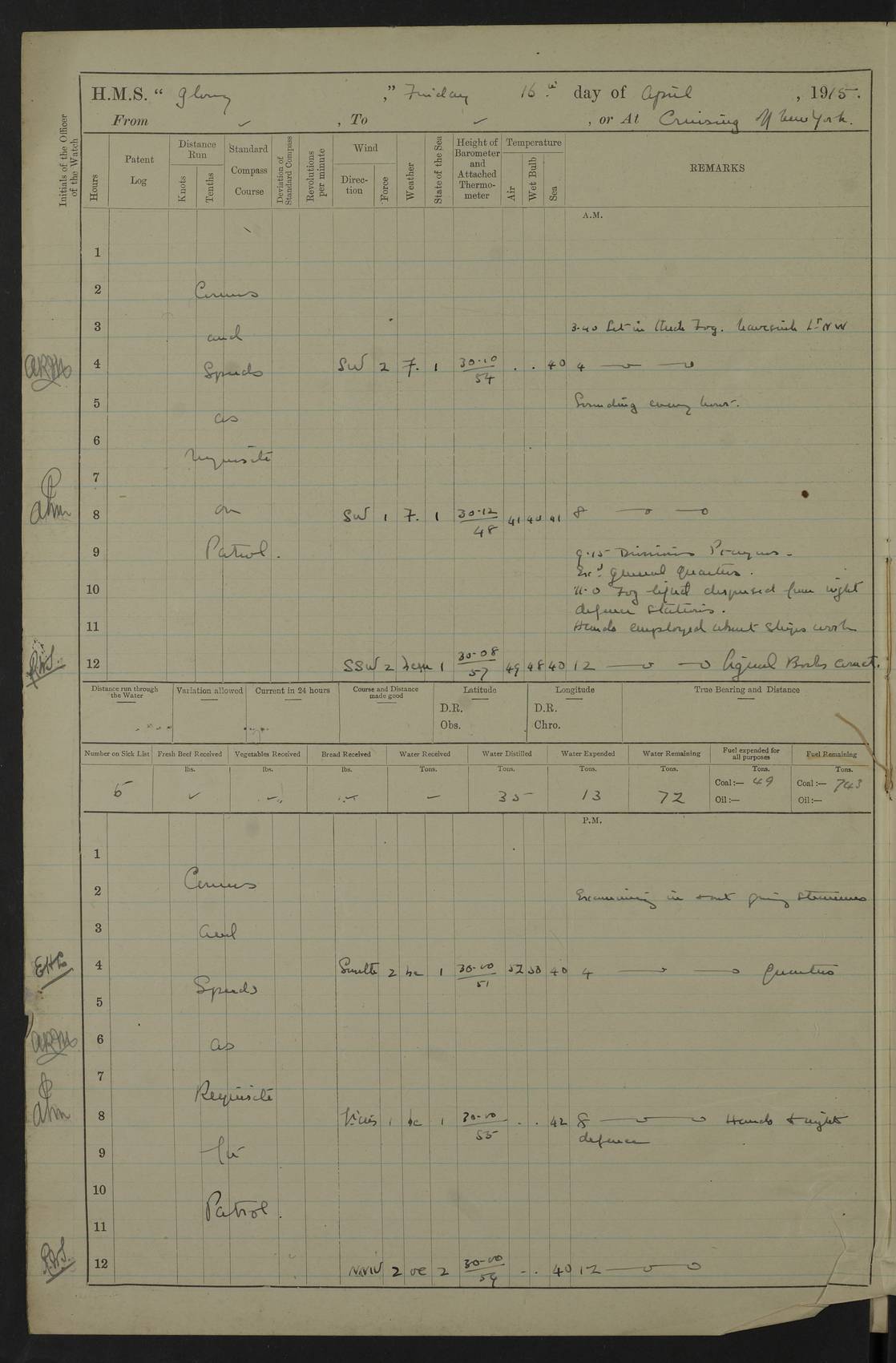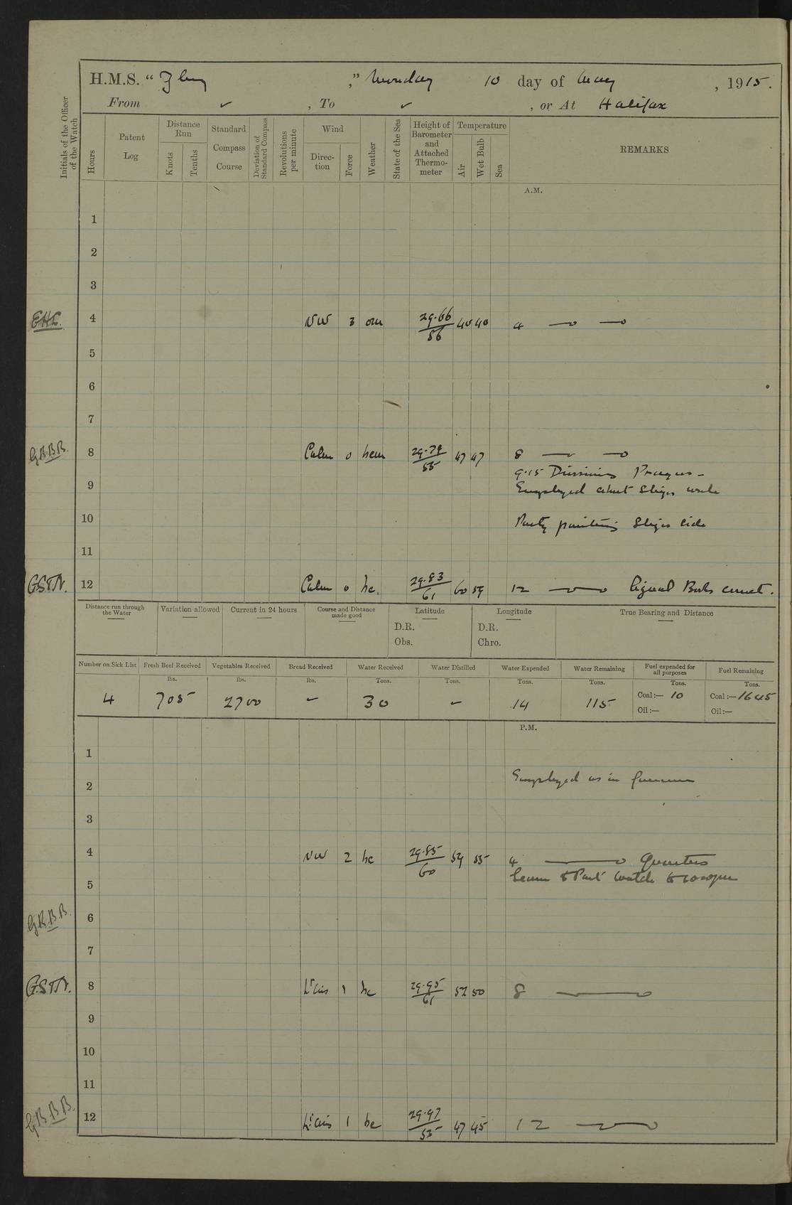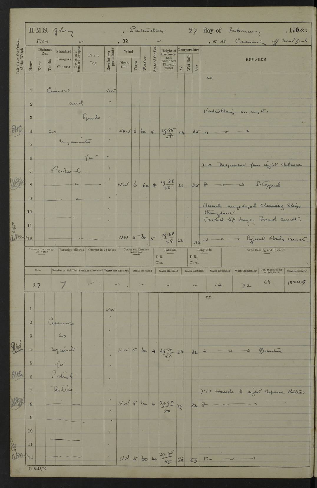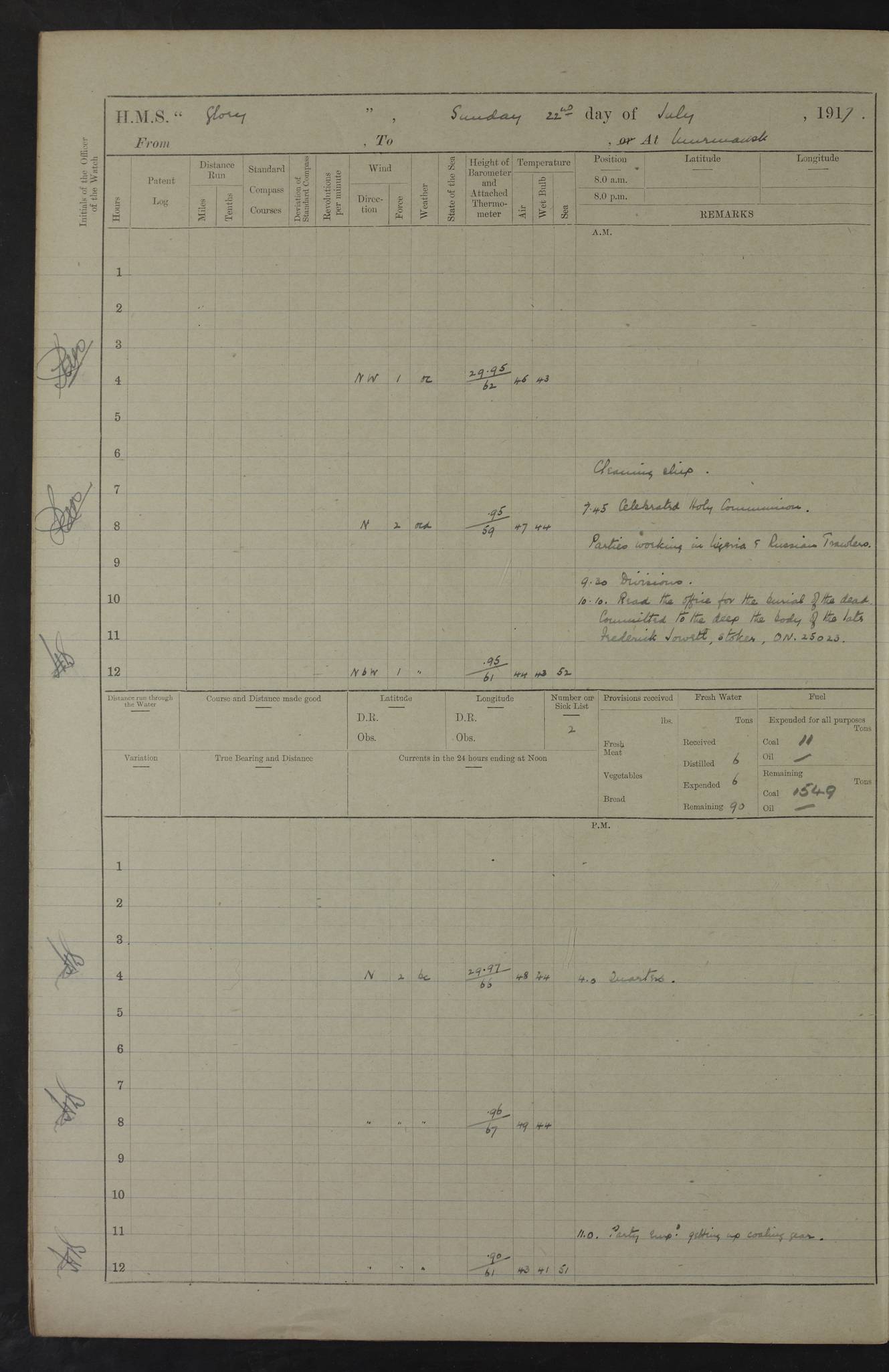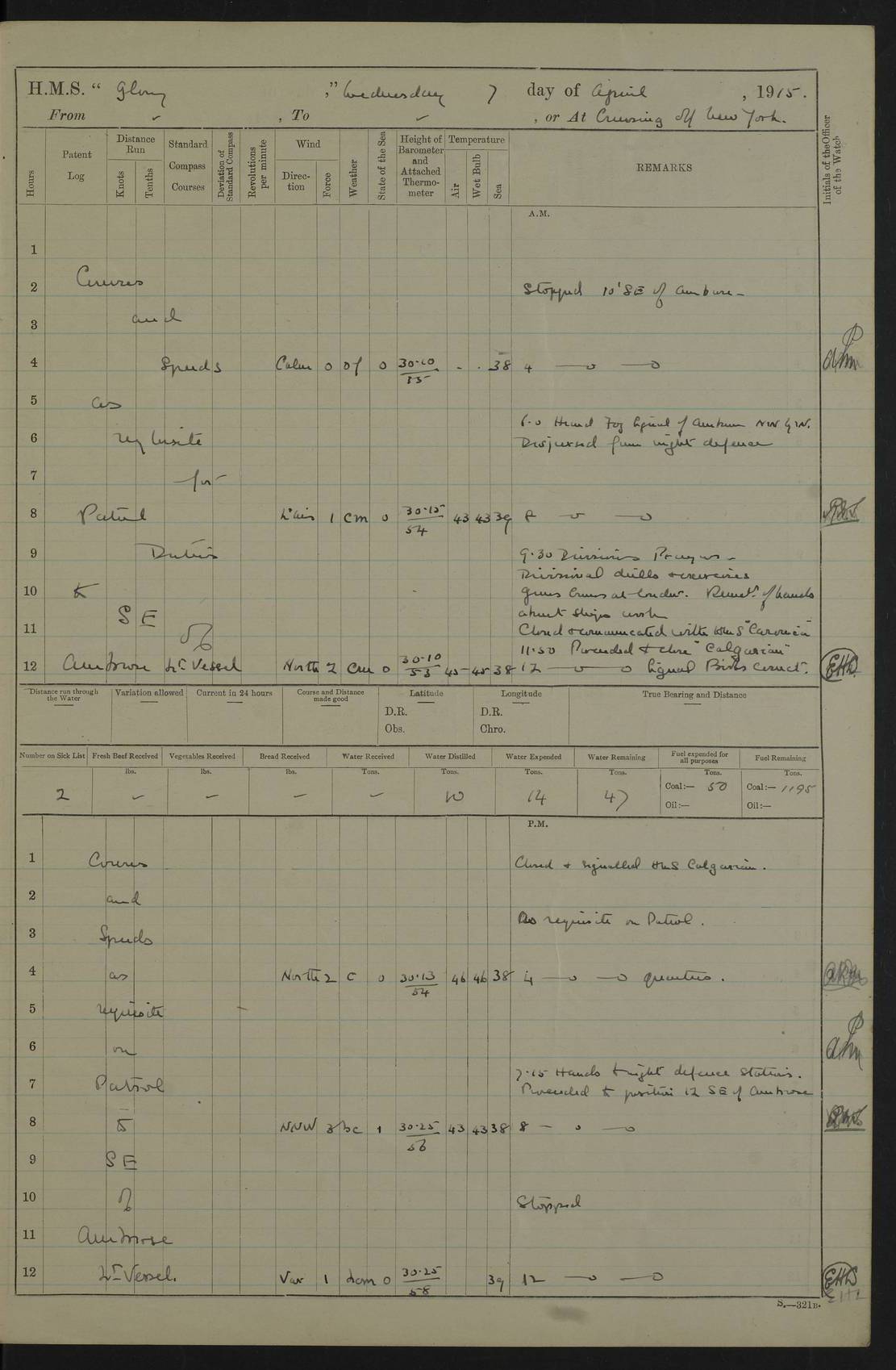 22 June 1915 At sea, Gibraltar to Lemnos Lat 36.1, Long -1.3 4.15am: Sighted land on starboard bow. 10.20am: Stopped port engine for repairs. 11.20am: proceeded with port engine. pm: a/c due to change in deviation. 10.00pm: Cape Tenez Light abeam, 18 miles. 4f73cd61a2fc8ea9030015f6: (https://s3.amazonaws.com:443/oldweather/ADM53-43015/0012_1.jpg) 23 June 1915 At sea, Gibraltar to Lemnos Lat 37.5, Long 4.8 Number on sick list: 4 5.00am: Secured from night defence stations. Placed anti-submarine guns. pm: Life saving appliances served out to men stationed in ? ?at abandon ship. 4f73cd61a2fc8ea9030015f7: (https://s3.amazonaws.com:443/oldweather/ADM53-43015/0013_0.jpg) 24 June 1915 At sea, Gibraltar to Lemnos Lat 37.4, Long 10.8 Position in log clearly bears no resemblance to the location of the ship. Position above is approximate and is based sighting of Zembra Island at 11.55am. 5.00am: Dispersed from night defence stations. Manned anti-submarine guns. am: Sighted two French torpedo boats. am: Torpedo boats passed to ~ No 362, 363. am: Sighted land on starboard beam. 11.55am: Zembra Island abeam, 25 miles. 2.00pm: Sighted Pantellaria S34ºE. 4.45pm: Pantellaria Light House abeam 12 miles. 4f73cd61a2fc8ea9030015f8: (https://s3.amazonaws.com:443/oldweather/ADM53-43015/0013_1.jpg) 25 June 1915 At sea, Gibraltar to Lemnos Lat 35.5, Long 16.7 2.10am: Gozo Light abeam 17 miles. 5.00am: Dispersed from night defence stations. Manned anti-submarine guns. 4f73cd61a2fc8ea9030015f9: (https://s3.amazonaws.com:443/oldweather/ADM53-43015/0014_0.jpg) 26 June 1915 At sea, Gibraltar to Lemnos Lat 35.5, Long 22.6 Number on sick list: 5 5.00am: Dispersed from night defence stations. Manned anti-submarine guns. am: Aired night clothing. am: marines at maxim practice on quarter deck. 2.00pm: Observed land on either bow. 3.00pm: Sighted French patrol destroyer. 4.15pm: Sighted French patrol destroyer. 9.40pm: Milo Peak N63ºW. 10.26pm: Polino Light abeam to port 5.5 miles. 4f73cd62a2fc8ea9030015fa: (https://s3.amazonaws.com:443/oldweather/ADM53-43015/0014_1.jpg) 27 June 1915 At sea and at Lemnos Lat 39.1, Long 24.4 From 0.50 to 3.05am sighting of multiple light houses. 3.50am: a/c to N39ºW and commenced to zig-zag. 5.00am: Dispersed from night defence stations and placed anti-submarine guns and look-outs. am: Lost overboard by accident Hazlewood fender, pat. 311, one in number. 10.30am: Held Divine Service onboard. pm: Met and signalled HMS Minerva on patrol duty. pm: Courses and speeds as requisite while waiting orders to approach Mudros. 3.00pm: Proceeded. 5.16pm: Increased to 90 revs, commenced to zig-zag. Course as requisite for Mudros. 7.00pm: Entered Mudros Bay. 7.47pm: Stopped. Let go port anchor in ‘M3’. 8.30pm: Darkened ship. pm: Manned one 6” and one 12 pdr. 4f73cd62a2fc8ea9030015fb: (https://s3.amazonaws.com:443/oldweather/ADM53-43015/0015_0.jpg) 28 June 1915 Mudros Bay, Lemnos Lat 39.89, Long 25.24 5,00am: HMS Vengeance entered harbour. HMS Vengeance was a pre-dreadnought of the Canopus class, launched in 1899 at Vickers, Barrow, and sold for scrapping in 1921. Details at http://en.wikipedia.org/wiki/HMS_Vengeance_(1899) . am/pm/: hands preparing for coaling and about ship’s work. pm: Collier Wabana secured alongside. 4f73cd62a2fc8ea9030015fc: (https://s3.amazonaws.com:443/oldweather/ADM53-43015/0015_1.jpg) 29 June 1915 Mudros Bay, Lemnos Lat 39.89, Long 25.24 5.15am: Commenced coaling. 2.00pm: Finished coaling. Collier left. 4f73cd62a2fc8ea9030015fd: (https://s3.amazonaws.com:443/oldweather/ADM53-43015/0016_0.jpg) 30 June 1915 Mudros Bay, Lemnos Lat 39.89, Long 25.24 am: Parties away sanding, and with fire engines onshore. am: Boats away disembarking troops. am: French Flagship Patrie sailed. The Patrie was a French pre-dreadnought, launched at La Seyne shipyard in 1903, and stricken in 1921. Details at http://en.wikipedia.org/wiki/French_battleship_Patrie . 6.30pm: Hands to bathe. 4f73cd63a2fc8ea9030015fe: (https://s3.amazonaws.com:443/oldweather/ADM53-43015/0016_1.jpg) 4f73cd63a2fc8ea9030015ff: (https://s3.amazonaws.com:443/oldweather/ADM53-43015/0017_0.jpg) 4f73cd63a2fc8ea903001600: (https://s3.amazonaws.com:443/oldweather/ADM53-43015/0017_1.jpg) 4f73cd63a2fc8ea903001601: (https://s3.amazonaws.com:443/oldweather/ADM53-43015/0018_0.jpg) 4f73cd64a2fc8ea903001602: (https://s3.amazonaws.com:443/oldweather/ADM53-43015/0018_1.jpg) LOGS FOR JULY 1915 From July to October 1915, HMS Glory spent her time at Port Mudros. Certain activities typically took place daily and are not generally noted in the pages below. These activities include: Lighting fires in the picket boat around 4am and drawing the fires in the late evening; Divisions at around 9–9.30am and Evening Quarters at 4pm; Darken ship at around 8.30pm; Daily ‘cleaning ship’, with variations thereof; SBC (for ‘Signal Books Correct’) at the watch changes. 4f73cd64a2fc8ea903001603: (https://s3.amazonaws.com:443/oldweather/ADM53-43016/0000_0.jpg) 4f73cd64a2fc8ea903001604: (https://s3.amazonaws.com:443/oldweather/ADM53-43016/0000_1.jpg) 4f73cd65a2fc8ea903001605: (https://s3.amazonaws.com:443/oldweather/ADM53-43016/0001_0.jpg) 4f73cd65a2fc8ea903001606: (https://s3.amazonaws.com:443/oldweather/ADM53-43016/0001_1.jpg) 1 July 1915 Port Mudros Lat 39.89, Long 25.24 6.30am: Landed working parties preparing boom defence ships. am: Discharged Acting Commander Rayne to Hector. Hector was a kite balloon ship. No further details readily available. 5.00pm: Tug T.10 made fast astern. 7.15pm: HMS Venerable went out. 7.30pm: HMS Chatham went out. HMS Chatham was a ‘Town’ cruiser and lead ship of her class. She was launched in 1911 at Chatham Dockyard and sold in 1926. Details at http://en.wikipedia.org/wiki/HMS_Chatham_(1911) . 4f73cd65a2fc8ea903001607: (https://s3.amazonaws.com:443/oldweather/ADM53-43016/0002_0.jpg) 2 July 1915 Port Mudros Lat 39.89, Long 25.24 5.35am: Landed working parties preparing boom defence ships. am/pm: Boom defence par