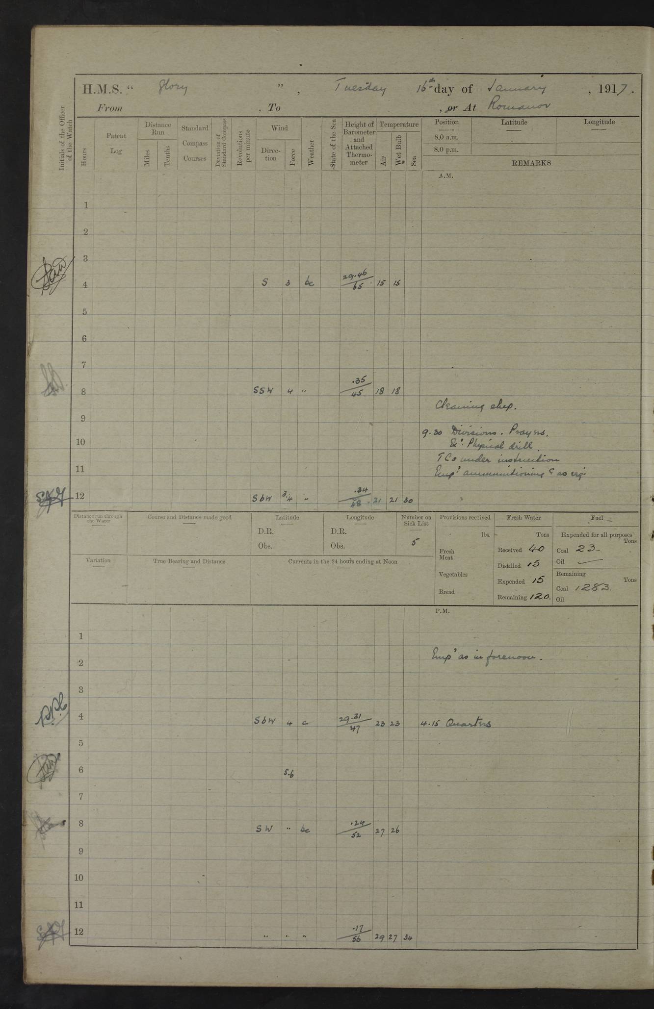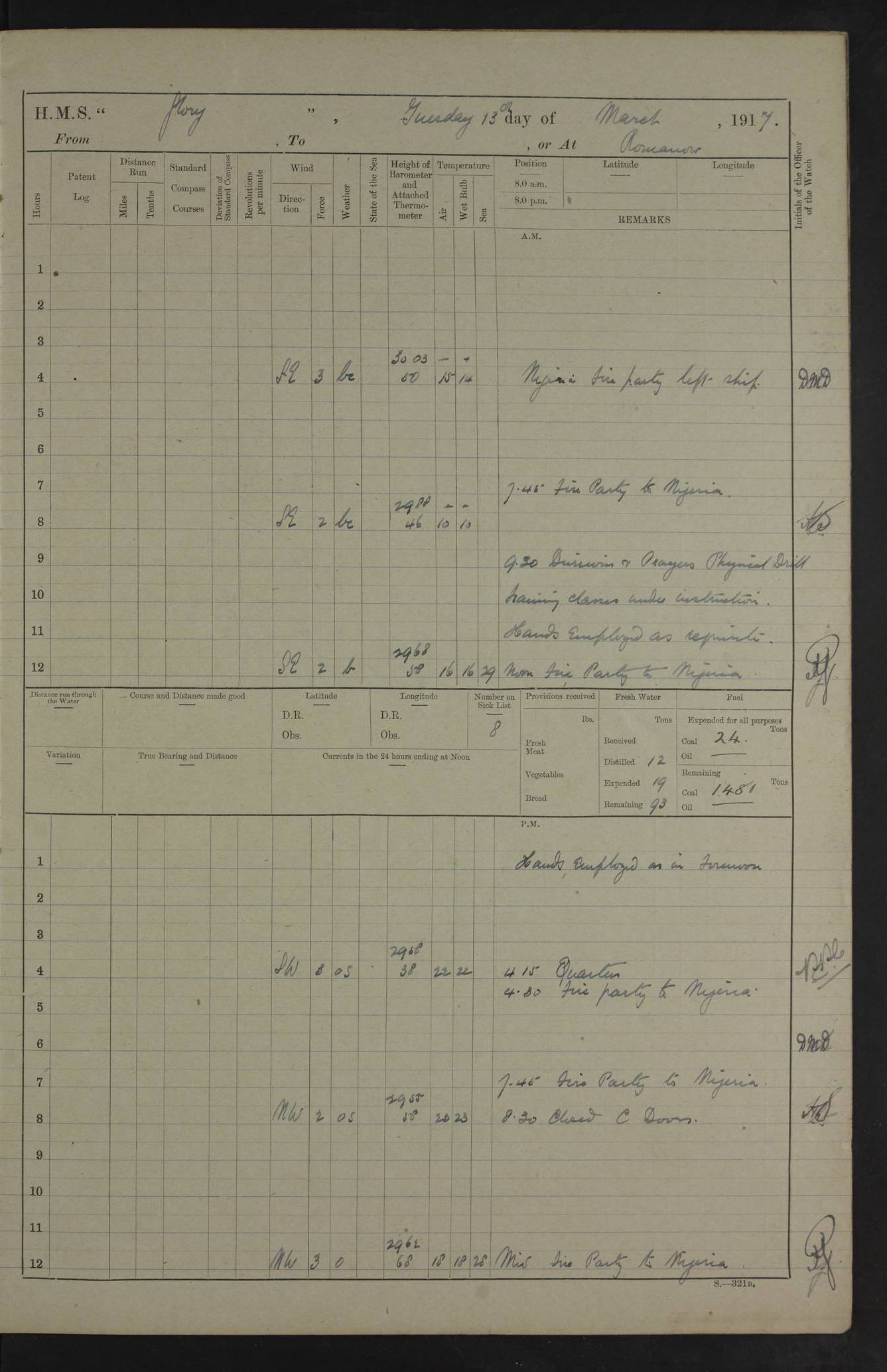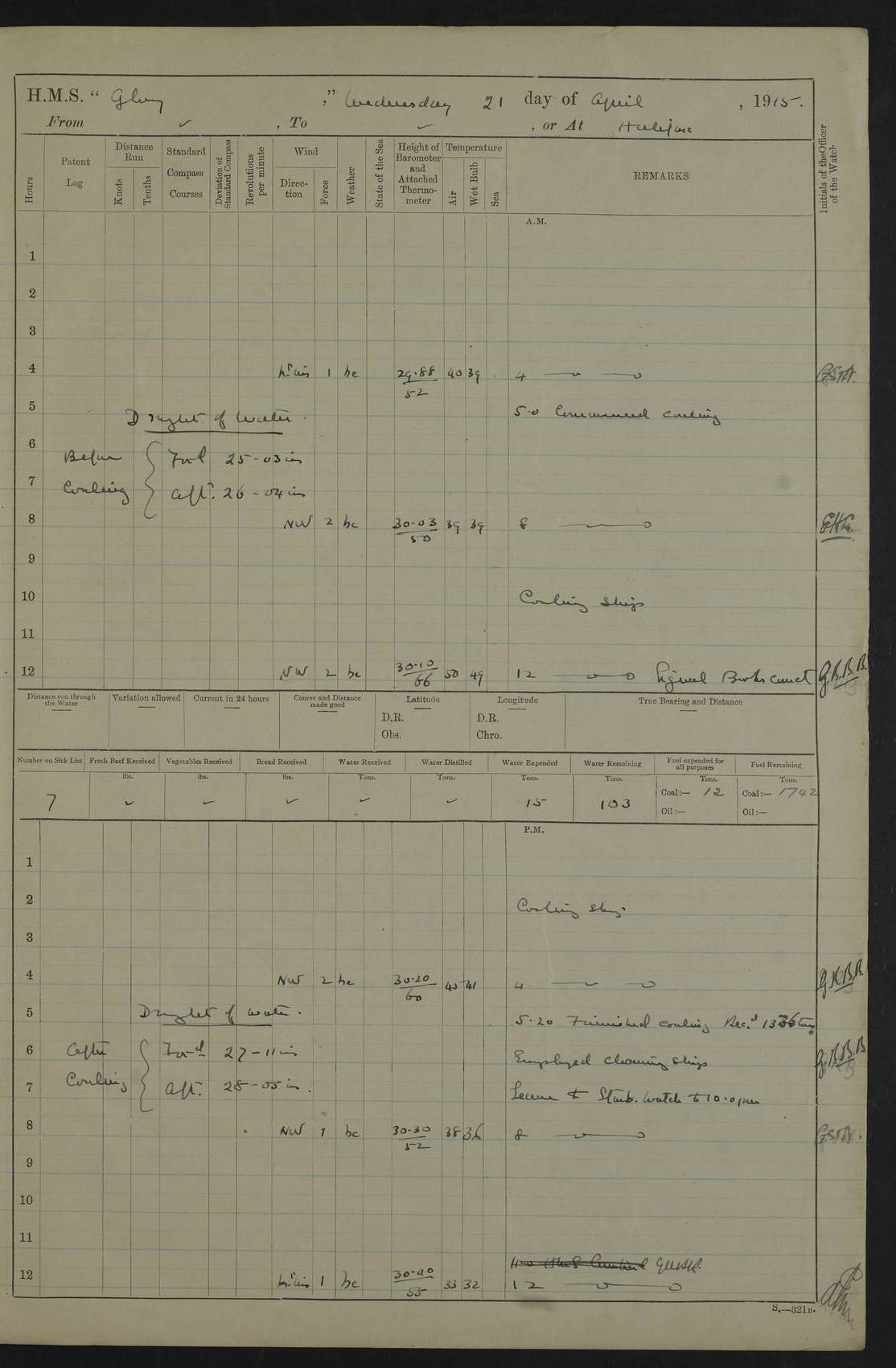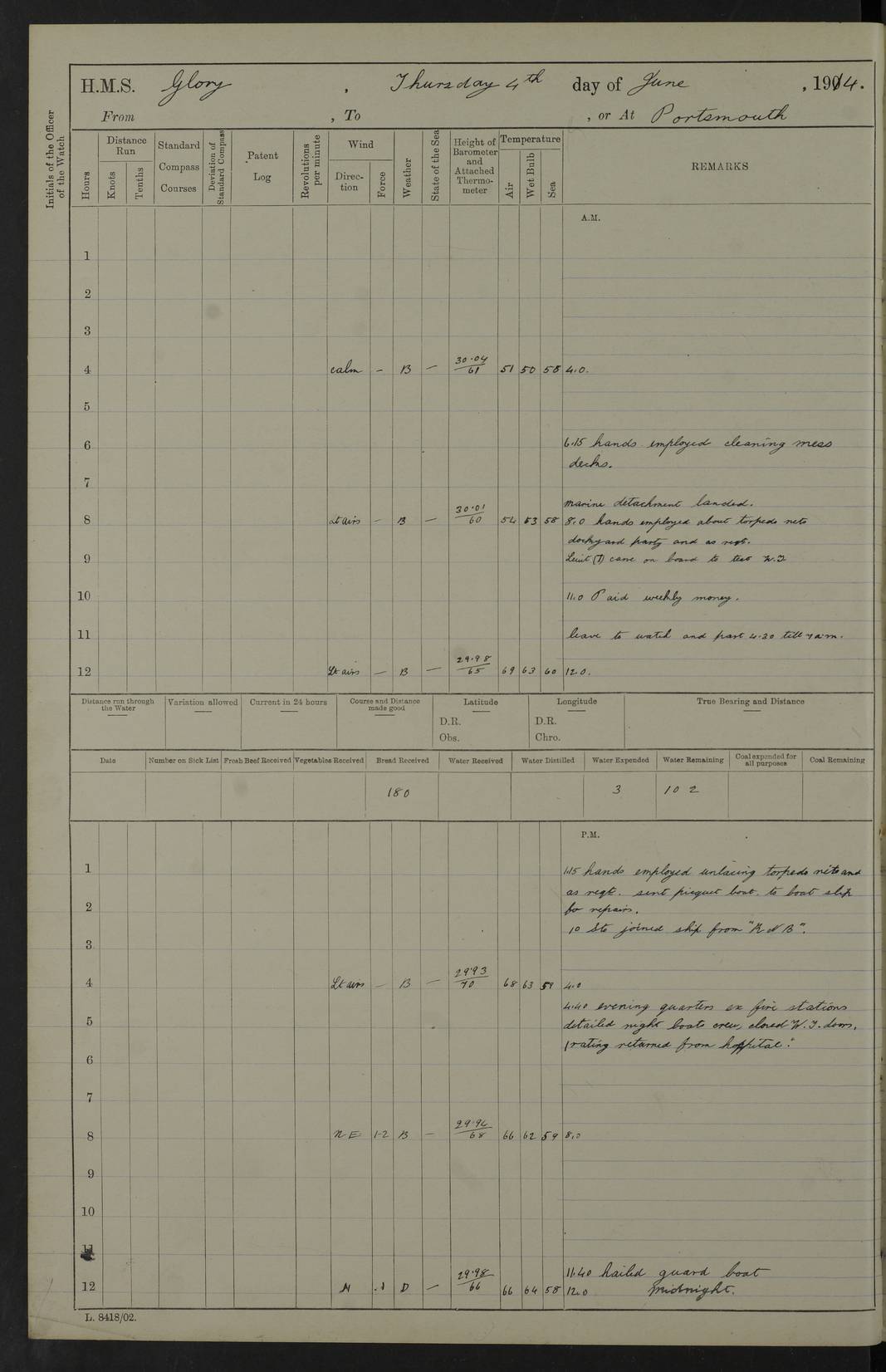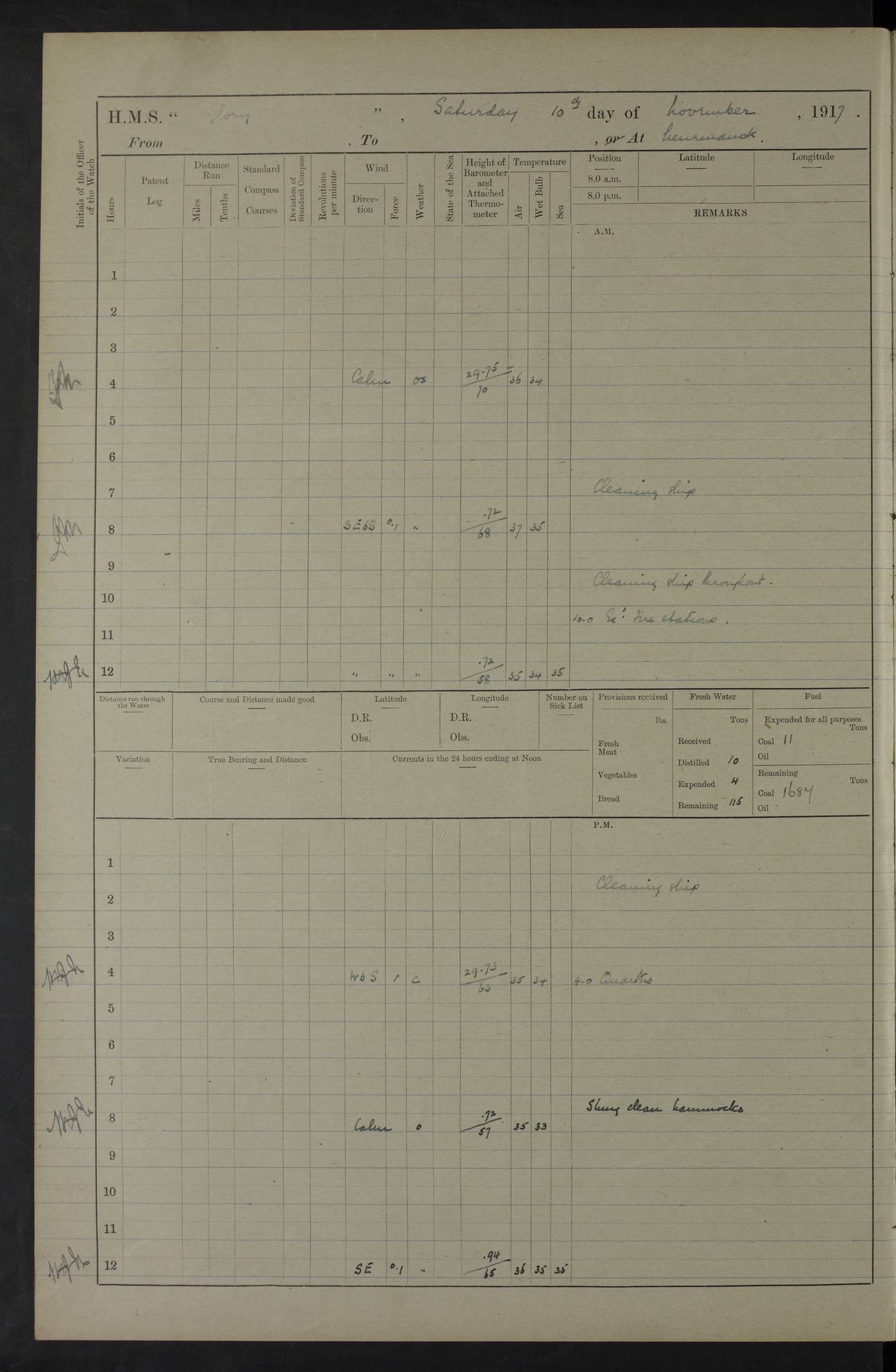 22 June 1915 At sea, Gibraltar to Lemnos Lat 36.1, Long -1.3 4.15am: Sighted land on starboard bow. 10.20am: Stopped port engine for repairs. 11.20am: proceeded with port engine. pm: a/c due to change in deviation. 10.00pm: Cape Tenez Light abeam, 18 miles. 4f73cd61a2fc8ea9030015f6: (https://s3.amazonaws.com:443/oldweather/ADM53-43015/0012_1.jpg) 23 June 1915 At sea, Gibraltar to Lemnos Lat 37.5, Long 4.8 Number on sick list: 4 5.00am: Secured from night defence stations. Placed anti-submarine guns. pm: Life saving appliances served out to men stationed in ? ?at abandon ship. 4f73cd61a2fc8ea9030015f7: (https://s3.amazonaws.com:443/oldweather/ADM53-43015/0013_0.jpg) 24 June 1915 At sea, Gibraltar to Lemnos Lat 37.4, Long 10.8 Position in log clearly bears no resemblance to the location of the ship. Position above is approximate and is based sighting of Zembra Island at 11.55am. 5.00am: Dispersed from night defence stations. Manned anti-submarine guns. am: Sighted two French torpedo boats. am: Torpedo boats passed to ~ No 362, 363. am: Sighted land on starboard beam. 11.55am: Zembra Island abeam, 25 miles. 2.00pm: Sighted Pantellaria S34ºE. 4.45pm: Pantellaria Light House abeam 12 miles. 4f73cd61a2fc8ea9030015f8: (https://s3.amazonaws.com:443/oldweather/ADM53-43015/0013_1.jpg) 25 June 1915 At sea, Gibraltar to Lemnos Lat 35.5, Long 16.7 2.10am: Gozo Light abeam 17 miles. 5.00am: Dispersed from night defence stations. Manned anti-submarine guns. 4f73cd61a2fc8ea9030015f9: (https://s3.amazonaws.com:443/oldweather/ADM53-43015/0014_0.jpg) 26 June 1915 At sea, Gibraltar to Lemnos Lat 35.5, Long 22.6 Number on sick list: 5 5.00am: Dispersed from night defence stations. Manned anti-submarine guns. am: Aired night clothing. am: marines at maxim practice on quarter deck. 2.00pm: Observed land on either bow. 3.00pm: Sighted French patrol destroyer. 4.15pm: Sighted French patrol destroyer. 9.40pm: Milo Peak N63ºW. 10.26pm: Polino Light abeam to port 5.5 miles. 4f73cd62a2fc8ea9030015fa: (https://s3.amazonaws.com:443/oldweather/ADM53-43015/0014_1.jpg) 27 June 1915 At sea and at Lemnos Lat 39.1, Long 24.4 From 0.50 to 3.05am sighting of multiple light houses. 3.50am: a/c to N39ºW and commenced to zig-zag. 5.00am: Dispersed from night defence stations and placed anti-submarine guns and look-outs. am: Lost overboard by accident Hazlewood fender, pat. 311, one in number. 10.30am: Held Divine Service onboard. pm: Met and signalled HMS Minerva on patrol duty. pm: Courses and speeds as requisite while waiting orders to approach Mudros. 3.00pm: Proceeded. 5.16pm: Increased to 90 revs, commenced to zig-zag. Course as requisite for Mudros. 7.00pm: Entered Mudros Bay. 7.47pm: Stopped. Let go port anchor in ‘M3’. 8.30pm: Darkened ship. pm: Manned one 6” and one 12 pdr. 4f73cd62a2fc8ea9030015fb: (https://s3.amazonaws.com:443/oldweather/ADM53-43015/0015_0.jpg) 28 June 1915 Mudros Bay, Lemnos Lat 39.89, Long 25.24 5,00am: HMS Vengeance entered harbour. HMS Vengeance was a pre-dreadnought of the Canopus class, launched in 1899 at Vickers, Barrow, and sold for scrapping in 1921. Details at http://en.wikipedia.org/wiki/HMS_Vengeance_(1899) . am/pm/: hands preparing for coaling and about ship’s work. pm: Collier Wabana secured alongside. 4f73cd62a2fc8ea9030015fc: (https://s3.amazonaws.com:443/oldweather/ADM53-43015/0015_1.jpg) 29 June 1915 Mudros Bay, Lemnos Lat 39.89, Long 25.24 5.15am: Commenced coaling. 2.00pm: Finished coaling. Collier left. 4f73cd62a2fc8ea9030015fd: (https://s3.amazonaws.com:443/oldweather/ADM53-43015/0016_0.jpg) 30 June 1915 Mudros Bay, Lemnos Lat 39.89, Long 25.24 am: Parties away sanding, and with fire engines onshore. am: Boats away disembarking troops. am: French Flagship Patrie sailed. The Patrie was a French pre-dreadnought, launched at La Seyne shipyard in 1903, and stricken in 1921. Details at http://en.wikipedia.org/wiki/French_battleship_Patrie . 6.30pm: Hands to bathe. 4f73cd63a2fc8ea9030015fe: (https://s3.amazonaws.com:443/oldweather/ADM53-43015/0016_1.jpg) 4f73cd63a2fc8ea9030015ff: (https://s3.amazonaws.com:443/oldweather/ADM53-43015/0017_0.jpg) 4f73cd63a2fc8ea903001600: (https://s3.amazonaws.com:443/oldweather/ADM53-43015/0017_1.jpg) 4f73cd63a2fc8ea903001601: (https://s3.amazonaws.com:443/oldweather/ADM53-43015/0018_0.jpg) 4f73cd64a2fc8ea903001602: (https://s3.amazonaws.com:443/oldweather/ADM53-43015/0018_1.jpg) LOGS FOR JULY 1915 From July to October 1915, HMS Glory spent her time at Port Mudros. Certain activities typically took place daily and are not generally noted in the pages below. These activities include: Lighting fires in the picket boat around 4am and drawing the fires in the late evening; Divisions at around 9–9.30am and Evening Quarters at 4pm; Darken ship at around 8.30pm; Daily ‘cleaning ship’, with variations thereof; SBC (for ‘Signal Books Correct’) at the watch changes. 4f73cd64a2fc8ea903001603: (https://s3.amazonaws.com:443/oldweather/ADM53-43016/0000_0.jpg) 4f73cd64a2fc8ea903001604: (https://s3.amazonaws.com:443/oldweather/ADM53-43016/0000_1.jpg) 4f73cd65a2fc8ea903001605: (https://s3.amazonaws.com:443/oldweather/ADM53-43016/0001_0.jpg) 4f73cd65a2fc8ea903001606: (https://s3.amazonaws.com:443/oldweather/ADM53-43016/0001_1.jpg) 1 July 1915 Port Mudros Lat 39.89, Long 25.24 6.30am: Landed working parties preparing boom defence ships. am: Discharged Acting Commander Rayne to Hector. Hector was a kite balloon ship. No further details readily available. 5.00pm: Tug T.10 made fast astern. 7.15pm: HMS Venerable went out. 7.30pm: HMS Chatham went out. HMS Chatham was a ‘Town’ cruiser and lead ship of her class. She was launched in 1911 at Chatham Dockyard and sold in 1926. Details at http://en.wikipedia.org/wiki/HMS_Chatham_(1911) . 4f73cd65a2fc8ea903001607: (https://s3.amazonaws.com:443/oldweather/ADM53-43016/0002_0.jpg) 2 July 1915 Port Mudros Lat 39.89, Long 25.24 5.35am: Landed working parties preparing boom defence ships. am/pm: Boom defence par