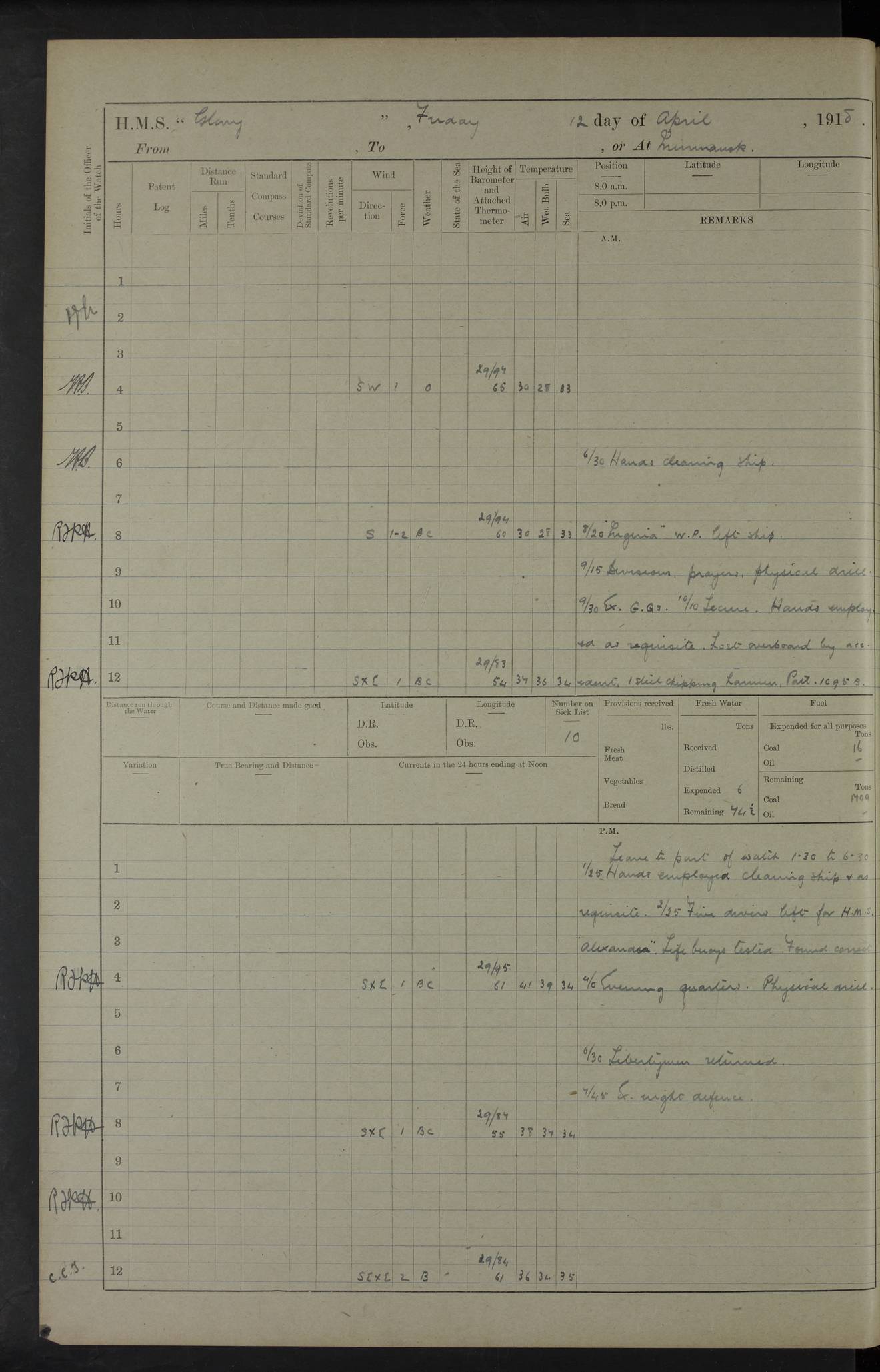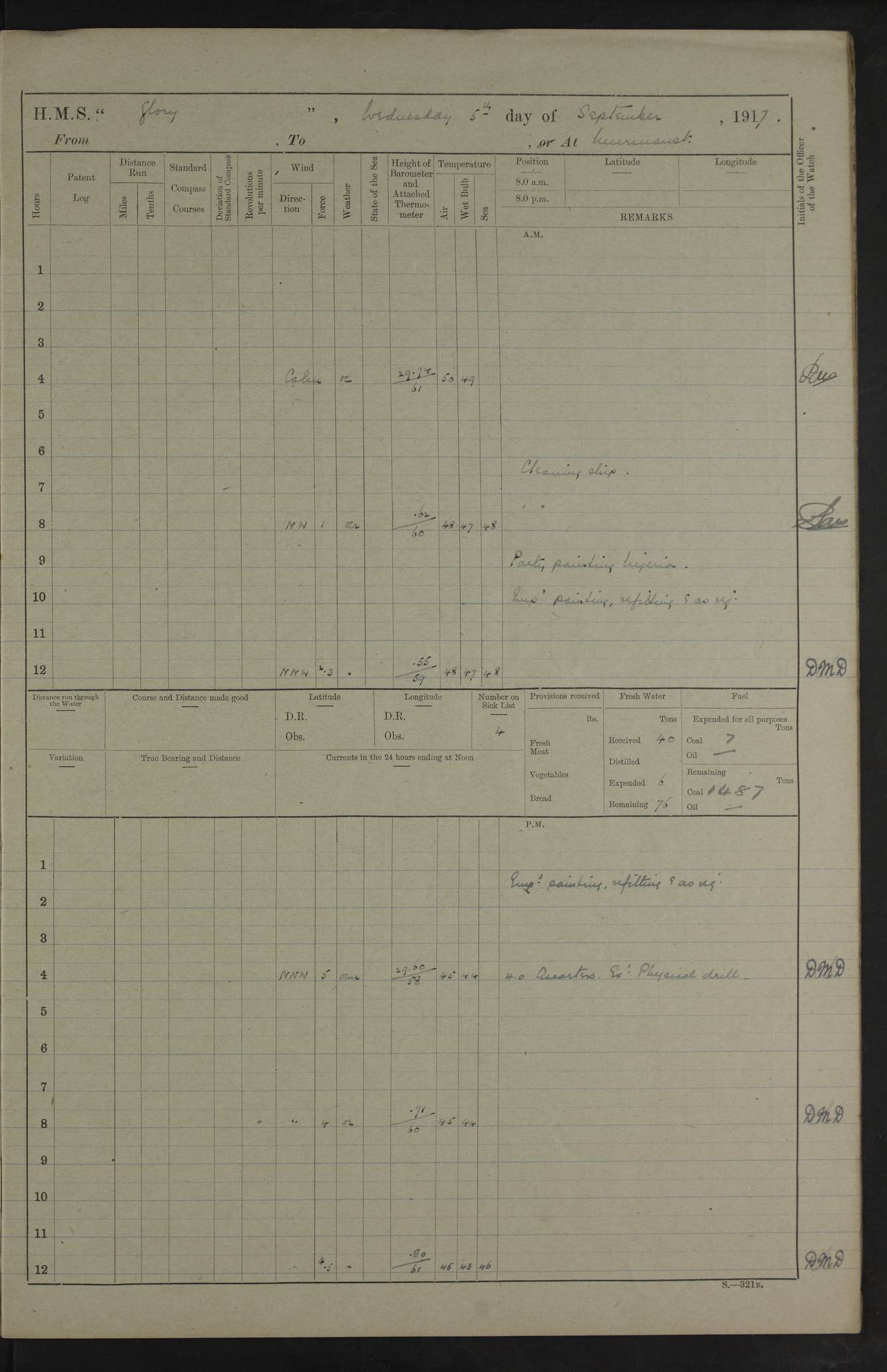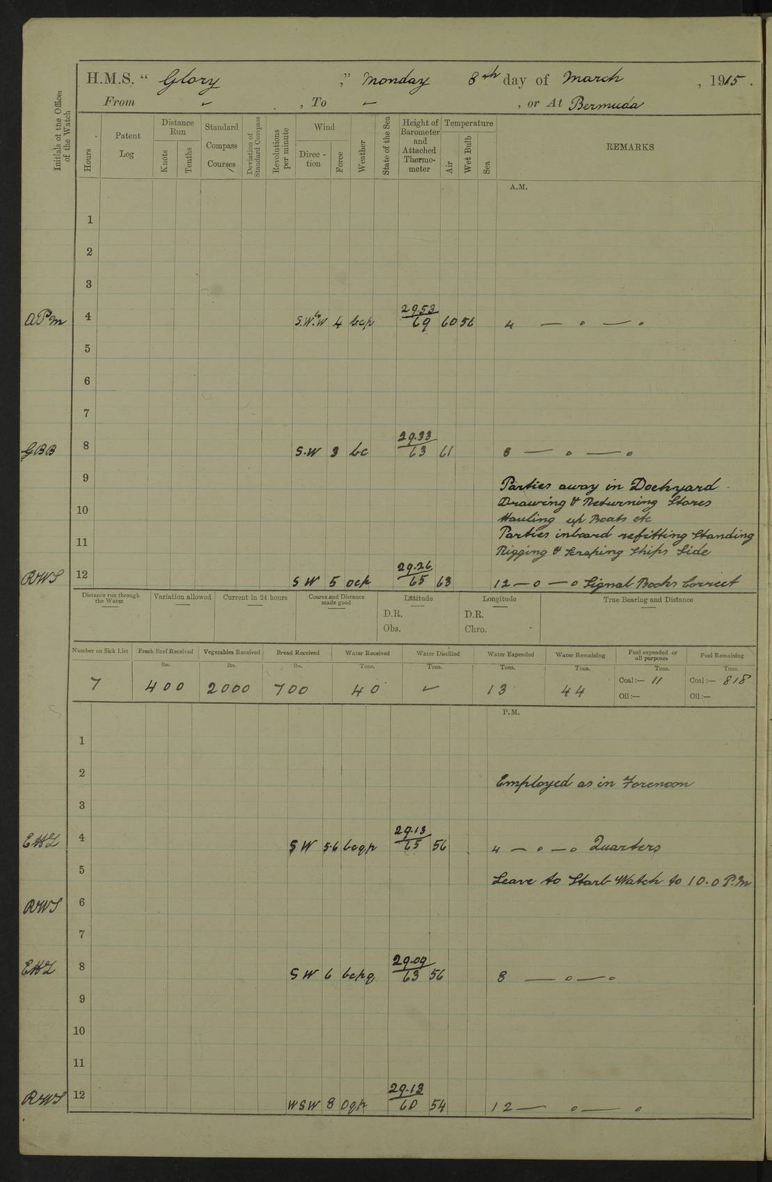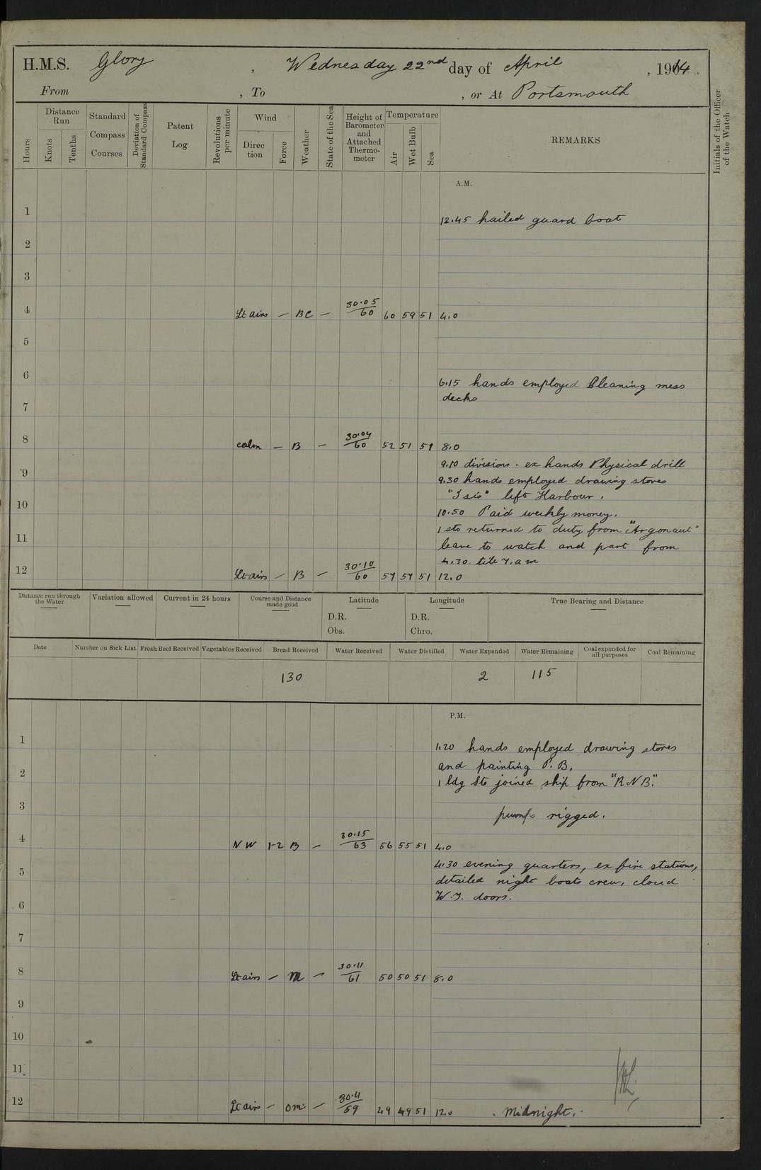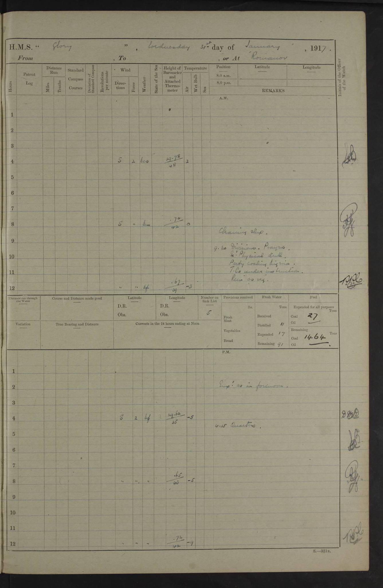 22 June 1915 At sea, Gibraltar to Lemnos Lat 36.1, Long -1.3 4.15am: Sighted land on starboard bow. 10.20am: Stopped port engine for repairs. 11.20am: proceeded with port engine. pm: a/c due to change in deviation. 10.00pm: Cape Tenez Light abeam, 18 miles. 4f73cd61a2fc8ea9030015f6: (https://s3.amazonaws.com:443/oldweather/ADM53-43015/0012_1.jpg) 23 June 1915 At sea, Gibraltar to Lemnos Lat 37.5, Long 4.8 Number on sick list: 4 5.00am: Secured from night defence stations. Placed anti-submarine guns. pm: Life saving appliances served out to men stationed in ? ?at abandon ship. 4f73cd61a2fc8ea9030015f7: (https://s3.amazonaws.com:443/oldweather/ADM53-43015/0013_0.jpg) 24 June 1915 At sea, Gibraltar to Lemnos Lat 37.4, Long 10.8 Position in log clearly bears no resemblance to the location of the ship. Position above is approximate and is based sighting of Zembra Island at 11.55am. 5.00am: Dispersed from night defence stations. Manned anti-submarine guns. am: Sighted two French torpedo boats. am: Torpedo boats passed to ~ No 362, 363. am: Sighted land on starboard beam. 11.55am: Zembra Island abeam, 25 miles. 2.00pm: Sighted Pantellaria S34ºE. 4.45pm: Pantellaria Light House abeam 12 miles. 4f73cd61a2fc8ea9030015f8: (https://s3.amazonaws.com:443/oldweather/ADM53-43015/0013_1.jpg) 25 June 1915 At sea, Gibraltar to Lemnos Lat 35.5, Long 16.7 2.10am: Gozo Light abeam 17 miles. 5.00am: Dispersed from night defence stations. Manned anti-submarine guns. 4f73cd61a2fc8ea9030015f9: (https://s3.amazonaws.com:443/oldweather/ADM53-43015/0014_0.jpg) 26 June 1915 At sea, Gibraltar to Lemnos Lat 35.5, Long 22.6 Number on sick list: 5 5.00am: Dispersed from night defence stations. Manned anti-submarine guns. am: Aired night clothing. am: marines at maxim practice on quarter deck. 2.00pm: Observed land on either bow. 3.00pm: Sighted French patrol destroyer. 4.15pm: Sighted French patrol destroyer. 9.40pm: Milo Peak N63ºW. 10.26pm: Polino Light abeam to port 5.5 miles. 4f73cd62a2fc8ea9030015fa: (https://s3.amazonaws.com:443/oldweather/ADM53-43015/0014_1.jpg) 27 June 1915 At sea and at Lemnos Lat 39.1, Long 24.4 From 0.50 to 3.05am sighting of multiple light houses. 3.50am: a/c to N39ºW and commenced to zig-zag. 5.00am: Dispersed from night defence stations and placed anti-submarine guns and look-outs. am: Lost overboard by accident Hazlewood fender, pat. 311, one in number. 10.30am: Held Divine Service onboard. pm: Met and signalled HMS Minerva on patrol duty. pm: Courses and speeds as requisite while waiting orders to approach Mudros. 3.00pm: Proceeded. 5.16pm: Increased to 90 revs, commenced to zig-zag. Course as requisite for Mudros. 7.00pm: Entered Mudros Bay. 7.47pm: Stopped. Let go port anchor in ‘M3’. 8.30pm: Darkened ship. pm: Manned one 6” and one 12 pdr. 4f73cd62a2fc8ea9030015fb: (https://s3.amazonaws.com:443/oldweather/ADM53-43015/0015_0.jpg) 28 June 1915 Mudros Bay, Lemnos Lat 39.89, Long 25.24 5,00am: HMS Vengeance entered harbour. HMS Vengeance was a pre-dreadnought of the Canopus class, launched in 1899 at Vickers, Barrow, and sold for scrapping in 1921. Details at http://en.wikipedia.org/wiki/HMS_Vengeance_(1899) . am/pm/: hands preparing for coaling and about ship’s work. pm: Collier Wabana secured alongside. 4f73cd62a2fc8ea9030015fc: (https://s3.amazonaws.com:443/oldweather/ADM53-43015/0015_1.jpg) 29 June 1915 Mudros Bay, Lemnos Lat 39.89, Long 25.24 5.15am: Commenced coaling. 2.00pm: Finished coaling. Collier left. 4f73cd62a2fc8ea9030015fd: (https://s3.amazonaws.com:443/oldweather/ADM53-43015/0016_0.jpg) 30 June 1915 Mudros Bay, Lemnos Lat 39.89, Long 25.24 am: Parties away sanding, and with fire engines onshore. am: Boats away disembarking troops. am: French Flagship Patrie sailed. The Patrie was a French pre-dreadnought, launched at La Seyne shipyard in 1903, and stricken in 1921. Details at http://en.wikipedia.org/wiki/French_battleship_Patrie . 6.30pm: Hands to bathe. 4f73cd63a2fc8ea9030015fe: (https://s3.amazonaws.com:443/oldweather/ADM53-43015/0016_1.jpg) 4f73cd63a2fc8ea9030015ff: (https://s3.amazonaws.com:443/oldweather/ADM53-43015/0017_0.jpg) 4f73cd63a2fc8ea903001600: (https://s3.amazonaws.com:443/oldweather/ADM53-43015/0017_1.jpg) 4f73cd63a2fc8ea903001601: (https://s3.amazonaws.com:443/oldweather/ADM53-43015/0018_0.jpg) 4f73cd64a2fc8ea903001602: (https://s3.amazonaws.com:443/oldweather/ADM53-43015/0018_1.jpg) LOGS FOR JULY 1915 From July to October 1915, HMS Glory spent her time at Port Mudros. Certain activities typically took place daily and are not generally noted in the pages below. These activities include: Lighting fires in the picket boat around 4am and drawing the fires in the late evening; Divisions at around 9–9.30am and Evening Quarters at 4pm; Darken ship at around 8.30pm; Daily ‘cleaning ship’, with variations thereof; SBC (for ‘Signal Books Correct’) at the watch changes. 4f73cd64a2fc8ea903001603: (https://s3.amazonaws.com:443/oldweather/ADM53-43016/0000_0.jpg) 4f73cd64a2fc8ea903001604: (https://s3.amazonaws.com:443/oldweather/ADM53-43016/0000_1.jpg) 4f73cd65a2fc8ea903001605: (https://s3.amazonaws.com:443/oldweather/ADM53-43016/0001_0.jpg) 4f73cd65a2fc8ea903001606: (https://s3.amazonaws.com:443/oldweather/ADM53-43016/0001_1.jpg) 1 July 1915 Port Mudros Lat 39.89, Long 25.24 6.30am: Landed working parties preparing boom defence ships. am: Discharged Acting Commander Rayne to Hector. Hector was a kite balloon ship. No further details readily available. 5.00pm: Tug T.10 made fast astern. 7.15pm: HMS Venerable went out. 7.30pm: HMS Chatham went out. HMS Chatham was a ‘Town’ cruiser and lead ship of her class. She was launched in 1911 at Chatham Dockyard and sold in 1926. Details at http://en.wikipedia.org/wiki/HMS_Chatham_(1911) . 4f73cd65a2fc8ea903001607: (https://s3.amazonaws.com:443/oldweather/ADM53-43016/0002_0.jpg) 2 July 1915 Port Mudros Lat 39.89, Long 25.24 5.35am: Landed working parties preparing boom defence ships. am/pm: Boom defence par