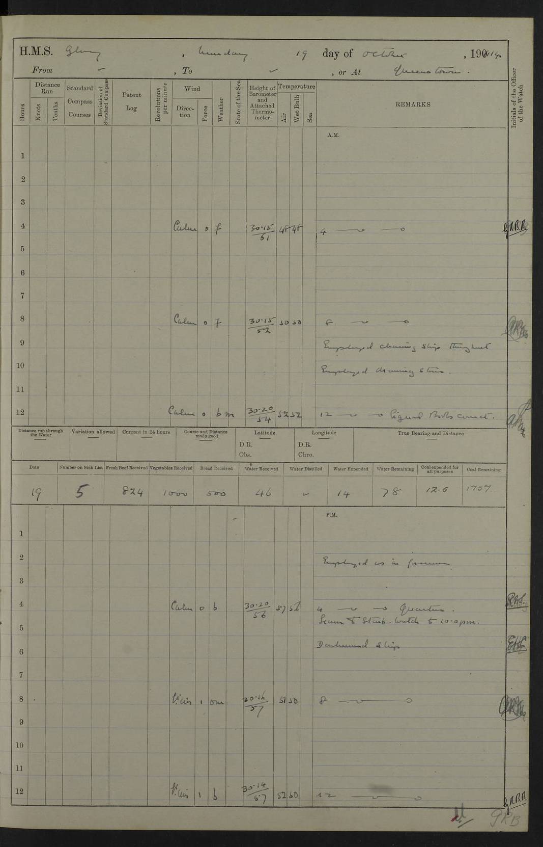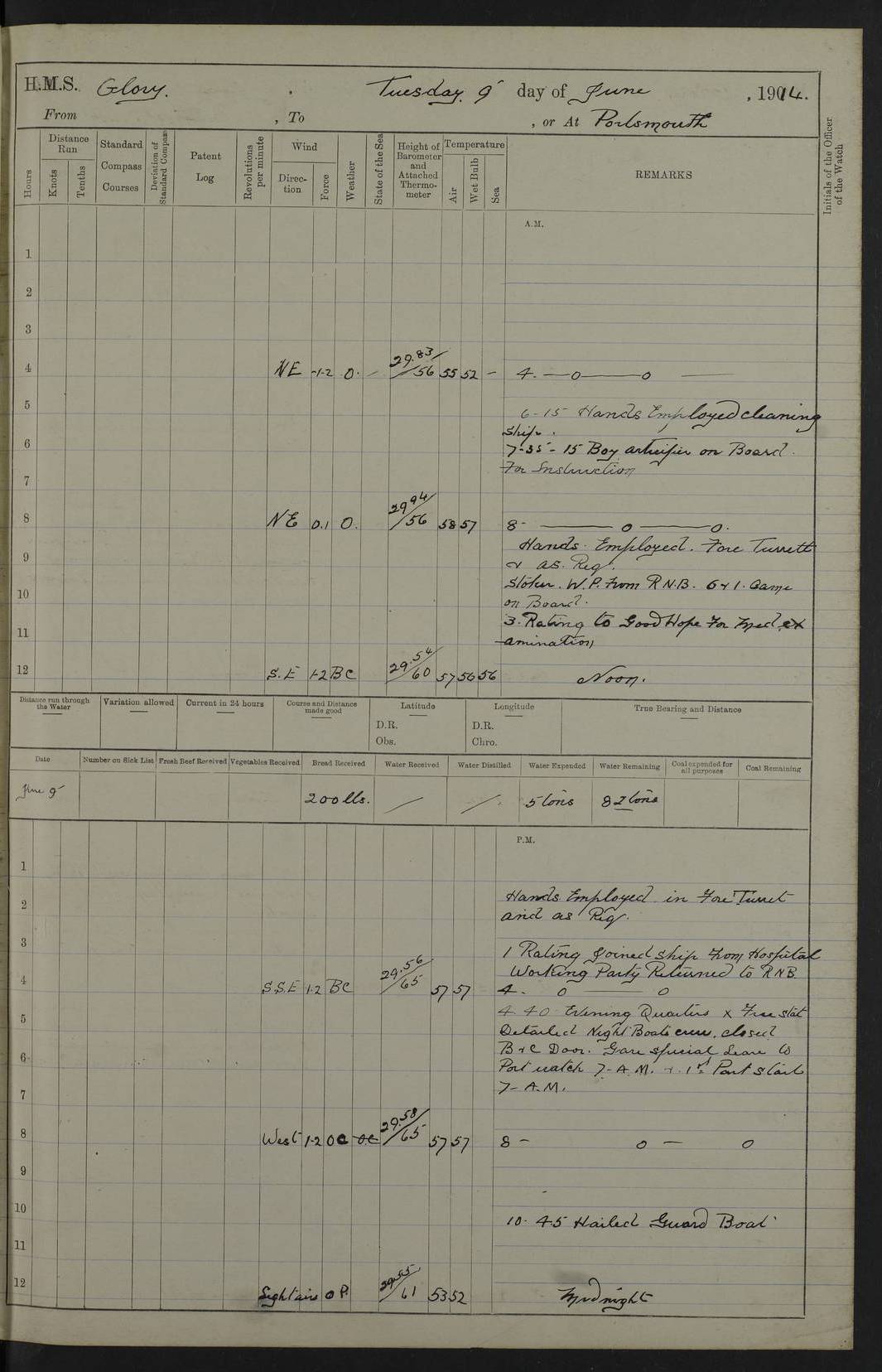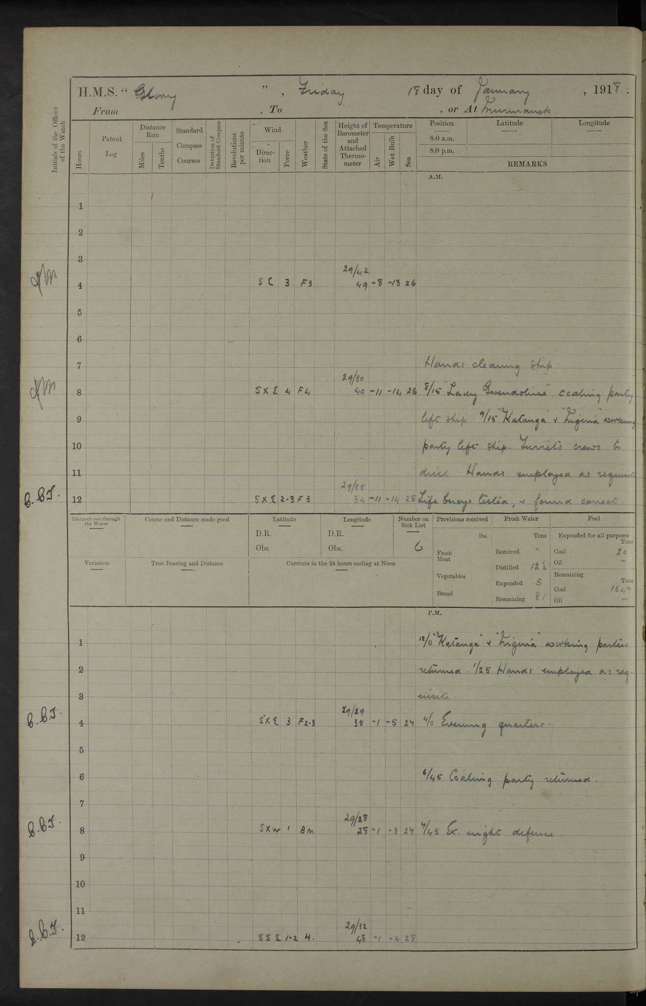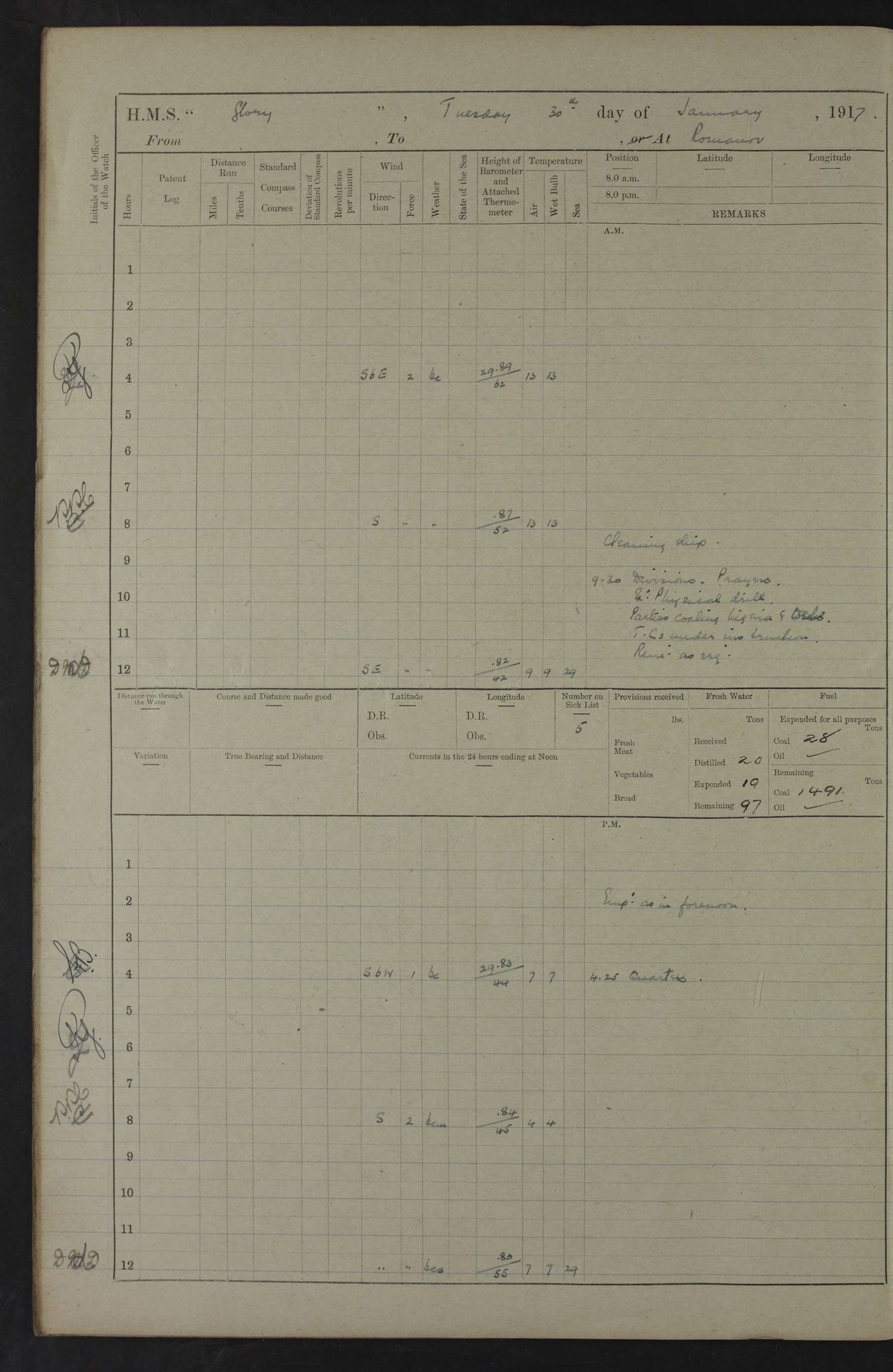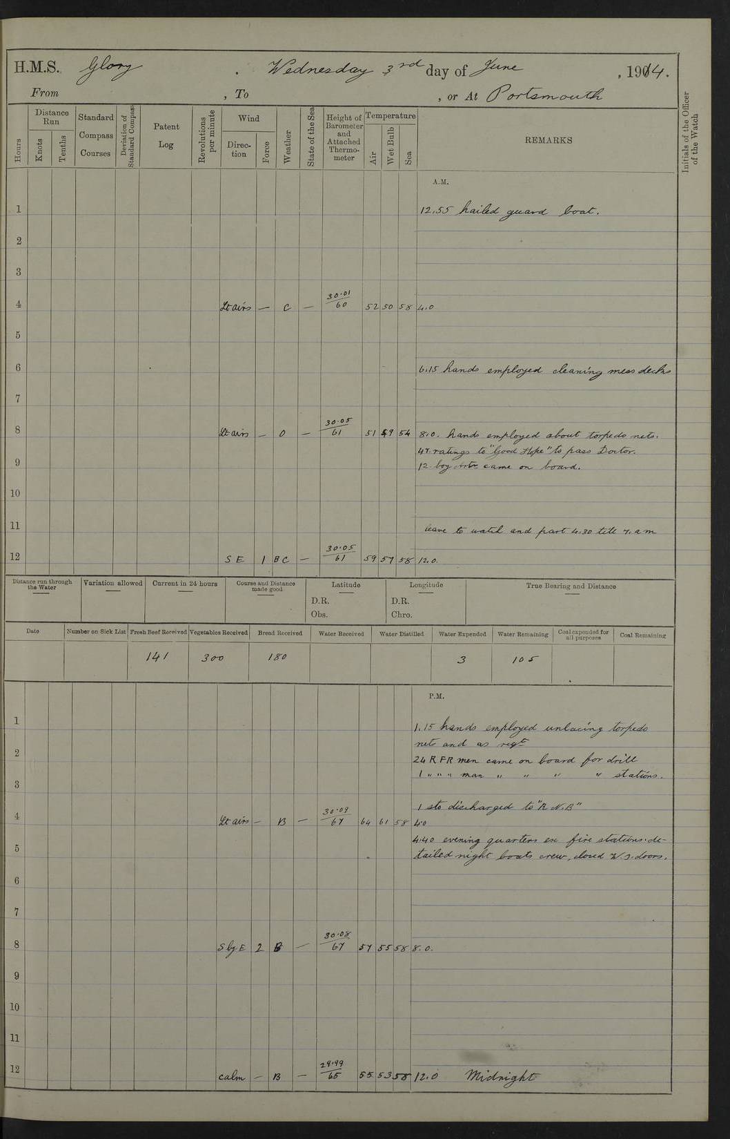 22 June 1915 At sea, Gibraltar to Lemnos Lat 36.1, Long -1.3 4.15am: Sighted land on starboard bow. 10.20am: Stopped port engine for repairs. 11.20am: proceeded with port engine. pm: a/c due to change in deviation. 10.00pm: Cape Tenez Light abeam, 18 miles. 4f73cd61a2fc8ea9030015f6: (https://s3.amazonaws.com:443/oldweather/ADM53-43015/0012_1.jpg) 23 June 1915 At sea, Gibraltar to Lemnos Lat 37.5, Long 4.8 Number on sick list: 4 5.00am: Secured from night defence stations. Placed anti-submarine guns. pm: Life saving appliances served out to men stationed in ? ?at abandon ship. 4f73cd61a2fc8ea9030015f7: (https://s3.amazonaws.com:443/oldweather/ADM53-43015/0013_0.jpg) 24 June 1915 At sea, Gibraltar to Lemnos Lat 37.4, Long 10.8 Position in log clearly bears no resemblance to the location of the ship. Position above is approximate and is based sighting of Zembra Island at 11.55am. 5.00am: Dispersed from night defence stations. Manned anti-submarine guns. am: Sighted two French torpedo boats. am: Torpedo boats passed to ~ No 362, 363. am: Sighted land on starboard beam. 11.55am: Zembra Island abeam, 25 miles. 2.00pm: Sighted Pantellaria S34ºE. 4.45pm: Pantellaria Light House abeam 12 miles. 4f73cd61a2fc8ea9030015f8: (https://s3.amazonaws.com:443/oldweather/ADM53-43015/0013_1.jpg) 25 June 1915 At sea, Gibraltar to Lemnos Lat 35.5, Long 16.7 2.10am: Gozo Light abeam 17 miles. 5.00am: Dispersed from night defence stations. Manned anti-submarine guns. 4f73cd61a2fc8ea9030015f9: (https://s3.amazonaws.com:443/oldweather/ADM53-43015/0014_0.jpg) 26 June 1915 At sea, Gibraltar to Lemnos Lat 35.5, Long 22.6 Number on sick list: 5 5.00am: Dispersed from night defence stations. Manned anti-submarine guns. am: Aired night clothing. am: marines at maxim practice on quarter deck. 2.00pm: Observed land on either bow. 3.00pm: Sighted French patrol destroyer. 4.15pm: Sighted French patrol destroyer. 9.40pm: Milo Peak N63ºW. 10.26pm: Polino Light abeam to port 5.5 miles. 4f73cd62a2fc8ea9030015fa: (https://s3.amazonaws.com:443/oldweather/ADM53-43015/0014_1.jpg) 27 June 1915 At sea and at Lemnos Lat 39.1, Long 24.4 From 0.50 to 3.05am sighting of multiple light houses. 3.50am: a/c to N39ºW and commenced to zig-zag. 5.00am: Dispersed from night defence stations and placed anti-submarine guns and look-outs. am: Lost overboard by accident Hazlewood fender, pat. 311, one in number. 10.30am: Held Divine Service onboard. pm: Met and signalled HMS Minerva on patrol duty. pm: Courses and speeds as requisite while waiting orders to approach Mudros. 3.00pm: Proceeded. 5.16pm: Increased to 90 revs, commenced to zig-zag. Course as requisite for Mudros. 7.00pm: Entered Mudros Bay. 7.47pm: Stopped. Let go port anchor in ‘M3’. 8.30pm: Darkened ship. pm: Manned one 6” and one 12 pdr. 4f73cd62a2fc8ea9030015fb: (https://s3.amazonaws.com:443/oldweather/ADM53-43015/0015_0.jpg) 28 June 1915 Mudros Bay, Lemnos Lat 39.89, Long 25.24 5,00am: HMS Vengeance entered harbour. HMS Vengeance was a pre-dreadnought of the Canopus class, launched in 1899 at Vickers, Barrow, and sold for scrapping in 1921. Details at http://en.wikipedia.org/wiki/HMS_Vengeance_(1899) . am/pm/: hands preparing for coaling and about ship’s work. pm: Collier Wabana secured alongside. 4f73cd62a2fc8ea9030015fc: (https://s3.amazonaws.com:443/oldweather/ADM53-43015/0015_1.jpg) 29 June 1915 Mudros Bay, Lemnos Lat 39.89, Long 25.24 5.15am: Commenced coaling. 2.00pm: Finished coaling. Collier left. 4f73cd62a2fc8ea9030015fd: (https://s3.amazonaws.com:443/oldweather/ADM53-43015/0016_0.jpg) 30 June 1915 Mudros Bay, Lemnos Lat 39.89, Long 25.24 am: Parties away sanding, and with fire engines onshore. am: Boats away disembarking troops. am: French Flagship Patrie sailed. The Patrie was a French pre-dreadnought, launched at La Seyne shipyard in 1903, and stricken in 1921. Details at http://en.wikipedia.org/wiki/French_battleship_Patrie . 6.30pm: Hands to bathe. 4f73cd63a2fc8ea9030015fe: (https://s3.amazonaws.com:443/oldweather/ADM53-43015/0016_1.jpg) 4f73cd63a2fc8ea9030015ff: (https://s3.amazonaws.com:443/oldweather/ADM53-43015/0017_0.jpg) 4f73cd63a2fc8ea903001600: (https://s3.amazonaws.com:443/oldweather/ADM53-43015/0017_1.jpg) 4f73cd63a2fc8ea903001601: (https://s3.amazonaws.com:443/oldweather/ADM53-43015/0018_0.jpg) 4f73cd64a2fc8ea903001602: (https://s3.amazonaws.com:443/oldweather/ADM53-43015/0018_1.jpg) LOGS FOR JULY 1915 From July to October 1915, HMS Glory spent her time at Port Mudros. Certain activities typically took place daily and are not generally noted in the pages below. These activities include: Lighting fires in the picket boat around 4am and drawing the fires in the late evening; Divisions at around 9–9.30am and Evening Quarters at 4pm; Darken ship at around 8.30pm; Daily ‘cleaning ship’, with variations thereof; SBC (for ‘Signal Books Correct’) at the watch changes. 4f73cd64a2fc8ea903001603: (https://s3.amazonaws.com:443/oldweather/ADM53-43016/0000_0.jpg) 4f73cd64a2fc8ea903001604: (https://s3.amazonaws.com:443/oldweather/ADM53-43016/0000_1.jpg) 4f73cd65a2fc8ea903001605: (https://s3.amazonaws.com:443/oldweather/ADM53-43016/0001_0.jpg) 4f73cd65a2fc8ea903001606: (https://s3.amazonaws.com:443/oldweather/ADM53-43016/0001_1.jpg) 1 July 1915 Port Mudros Lat 39.89, Long 25.24 6.30am: Landed working parties preparing boom defence ships. am: Discharged Acting Commander Rayne to Hector. Hector was a kite balloon ship. No further details readily available. 5.00pm: Tug T.10 made fast astern. 7.15pm: HMS Venerable went out. 7.30pm: HMS Chatham went out. HMS Chatham was a ‘Town’ cruiser and lead ship of her class. She was launched in 1911 at Chatham Dockyard and sold in 1926. Details at http://en.wikipedia.org/wiki/HMS_Chatham_(1911) . 4f73cd65a2fc8ea903001607: (https://s3.amazonaws.com:443/oldweather/ADM53-43016/0002_0.jpg) 2 July 1915 Port Mudros Lat 39.89, Long 25.24 5.35am: Landed working parties preparing boom defence ships. am/pm: Boom defence par