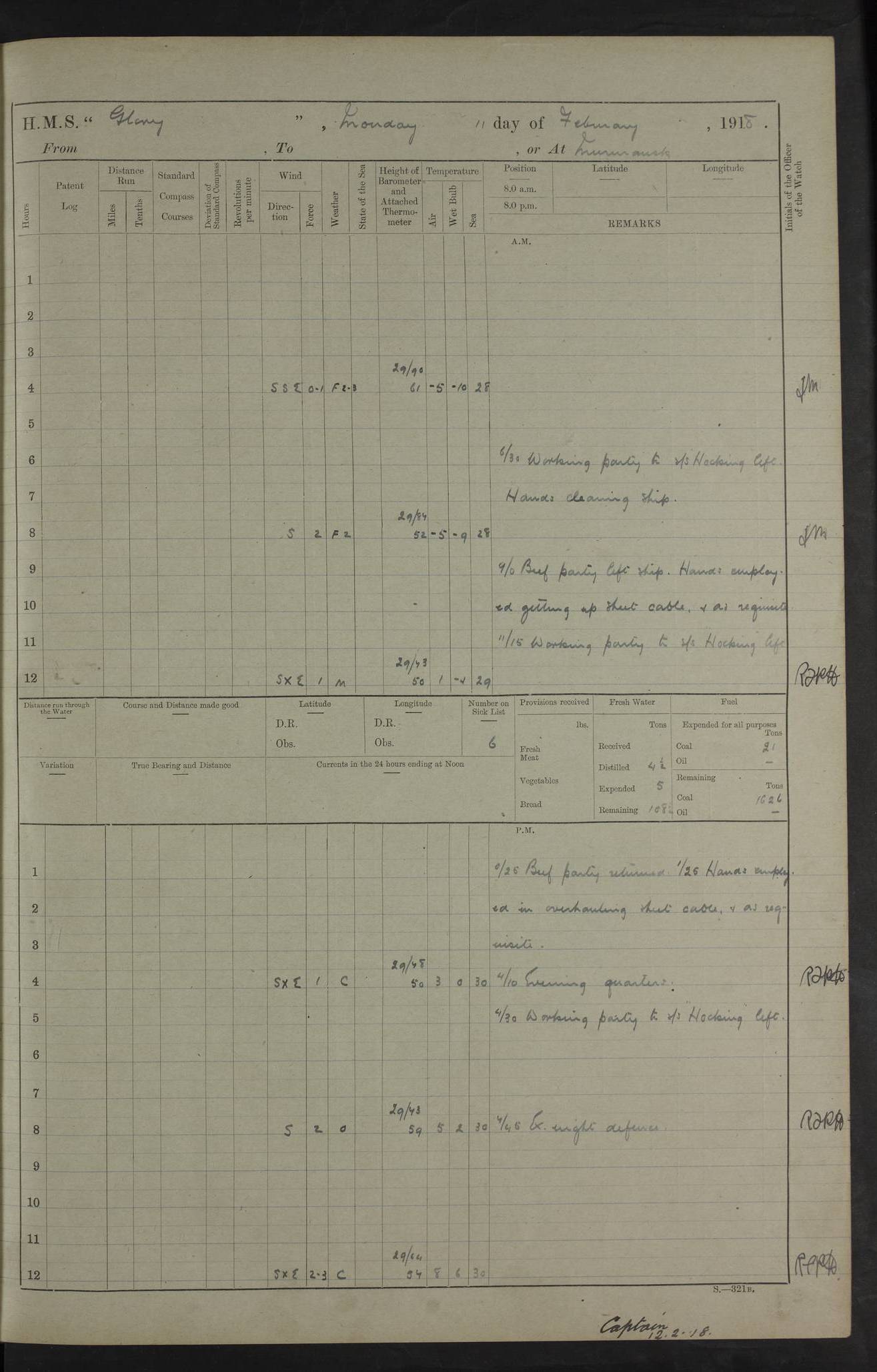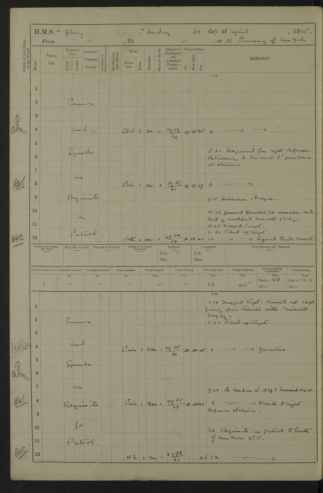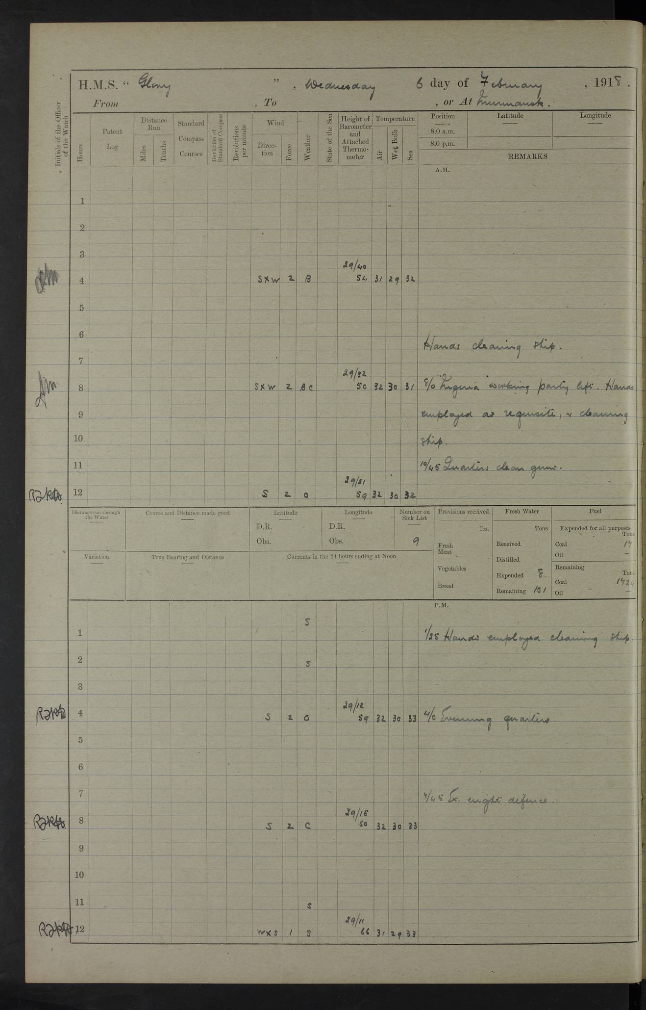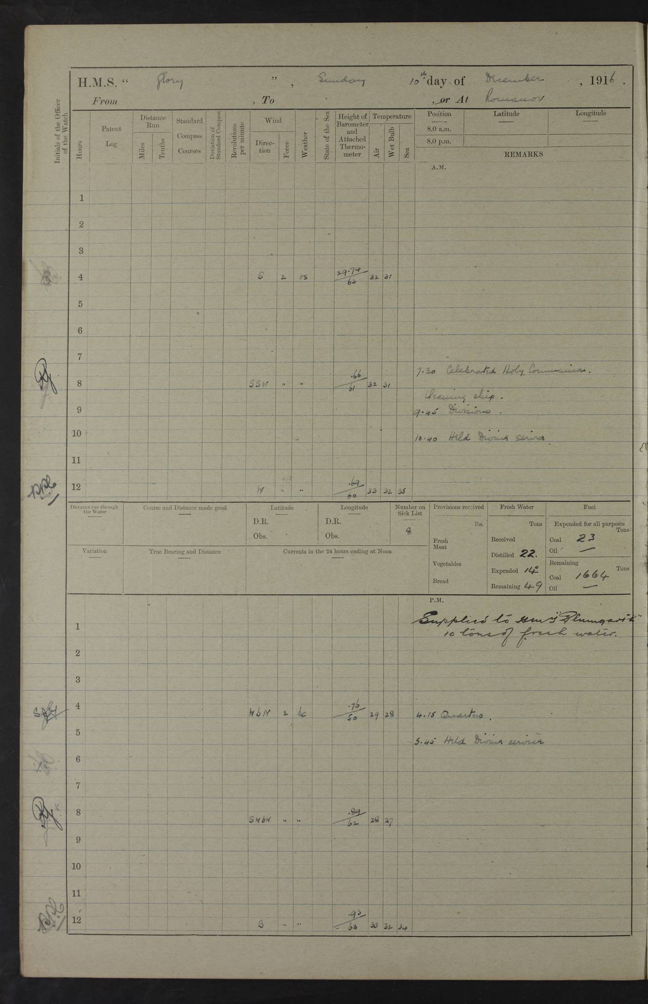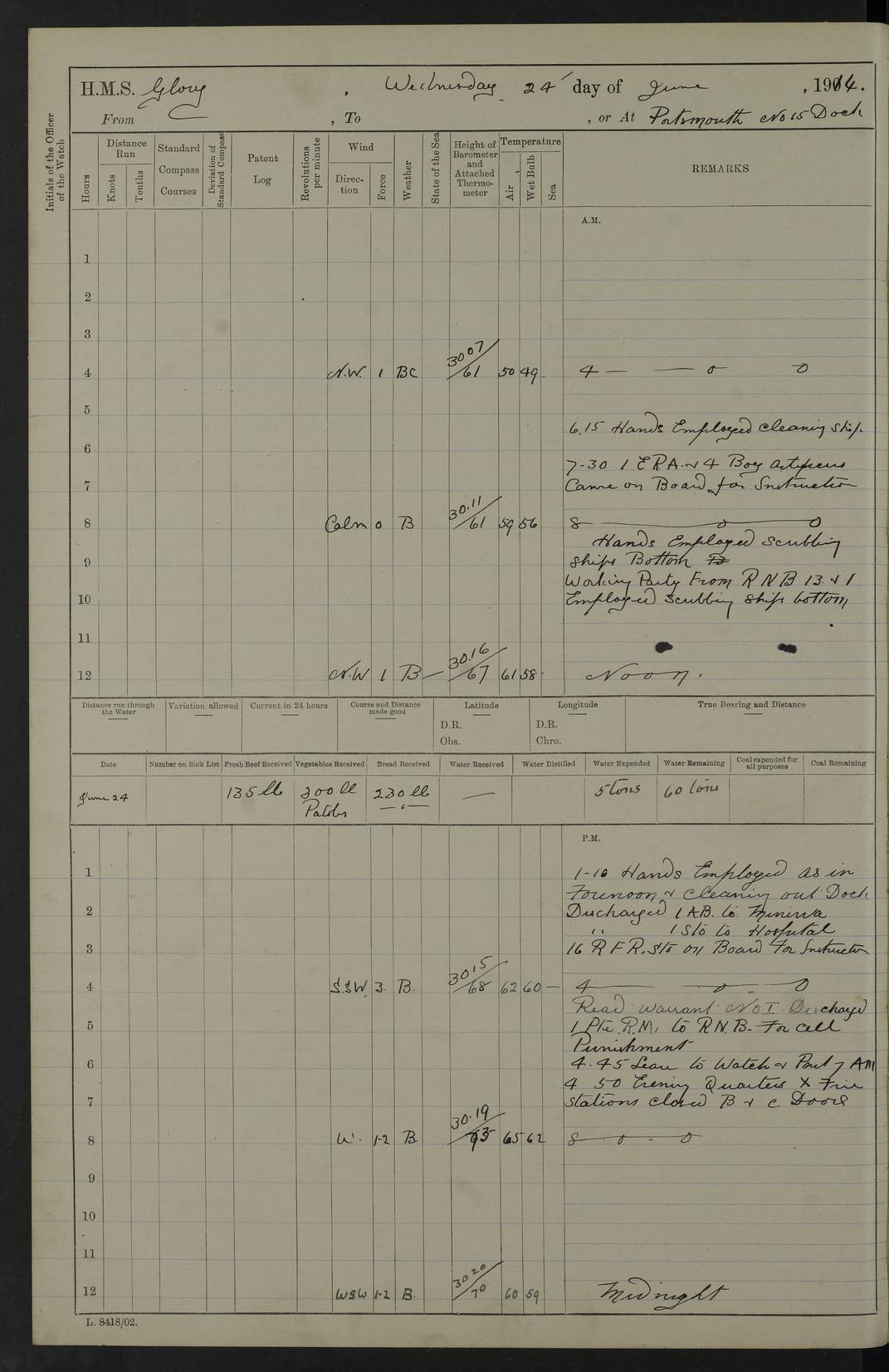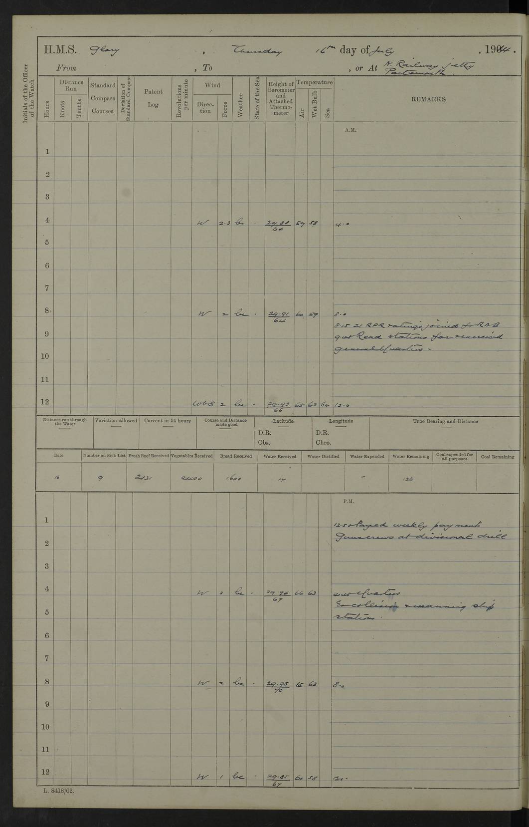 22 June 1915 At sea, Gibraltar to Lemnos Lat 36.1, Long -1.3 4.15am: Sighted land on starboard bow. 10.20am: Stopped port engine for repairs. 11.20am: proceeded with port engine. pm: a/c due to change in deviation. 10.00pm: Cape Tenez Light abeam, 18 miles. 4f73cd61a2fc8ea9030015f6: (https://s3.amazonaws.com:443/oldweather/ADM53-43015/0012_1.jpg) 23 June 1915 At sea, Gibraltar to Lemnos Lat 37.5, Long 4.8 Number on sick list: 4 5.00am: Secured from night defence stations. Placed anti-submarine guns. pm: Life saving appliances served out to men stationed in ? ?at abandon ship. 4f73cd61a2fc8ea9030015f7: (https://s3.amazonaws.com:443/oldweather/ADM53-43015/0013_0.jpg) 24 June 1915 At sea, Gibraltar to Lemnos Lat 37.4, Long 10.8 Position in log clearly bears no resemblance to the location of the ship. Position above is approximate and is based sighting of Zembra Island at 11.55am. 5.00am: Dispersed from night defence stations. Manned anti-submarine guns. am: Sighted two French torpedo boats. am: Torpedo boats passed to ~ No 362, 363. am: Sighted land on starboard beam. 11.55am: Zembra Island abeam, 25 miles. 2.00pm: Sighted Pantellaria S34ºE. 4.45pm: Pantellaria Light House abeam 12 miles. 4f73cd61a2fc8ea9030015f8: (https://s3.amazonaws.com:443/oldweather/ADM53-43015/0013_1.jpg) 25 June 1915 At sea, Gibraltar to Lemnos Lat 35.5, Long 16.7 2.10am: Gozo Light abeam 17 miles. 5.00am: Dispersed from night defence stations. Manned anti-submarine guns. 4f73cd61a2fc8ea9030015f9: (https://s3.amazonaws.com:443/oldweather/ADM53-43015/0014_0.jpg) 26 June 1915 At sea, Gibraltar to Lemnos Lat 35.5, Long 22.6 Number on sick list: 5 5.00am: Dispersed from night defence stations. Manned anti-submarine guns. am: Aired night clothing. am: marines at maxim practice on quarter deck. 2.00pm: Observed land on either bow. 3.00pm: Sighted French patrol destroyer. 4.15pm: Sighted French patrol destroyer. 9.40pm: Milo Peak N63ºW. 10.26pm: Polino Light abeam to port 5.5 miles. 4f73cd62a2fc8ea9030015fa: (https://s3.amazonaws.com:443/oldweather/ADM53-43015/0014_1.jpg) 27 June 1915 At sea and at Lemnos Lat 39.1, Long 24.4 From 0.50 to 3.05am sighting of multiple light houses. 3.50am: a/c to N39ºW and commenced to zig-zag. 5.00am: Dispersed from night defence stations and placed anti-submarine guns and look-outs. am: Lost overboard by accident Hazlewood fender, pat. 311, one in number. 10.30am: Held Divine Service onboard. pm: Met and signalled HMS Minerva on patrol duty. pm: Courses and speeds as requisite while waiting orders to approach Mudros. 3.00pm: Proceeded. 5.16pm: Increased to 90 revs, commenced to zig-zag. Course as requisite for Mudros. 7.00pm: Entered Mudros Bay. 7.47pm: Stopped. Let go port anchor in ‘M3’. 8.30pm: Darkened ship. pm: Manned one 6” and one 12 pdr. 4f73cd62a2fc8ea9030015fb: (https://s3.amazonaws.com:443/oldweather/ADM53-43015/0015_0.jpg) 28 June 1915 Mudros Bay, Lemnos Lat 39.89, Long 25.24 5,00am: HMS Vengeance entered harbour. HMS Vengeance was a pre-dreadnought of the Canopus class, launched in 1899 at Vickers, Barrow, and sold for scrapping in 1921. Details at http://en.wikipedia.org/wiki/HMS_Vengeance_(1899) . am/pm/: hands preparing for coaling and about ship’s work. pm: Collier Wabana secured alongside. 4f73cd62a2fc8ea9030015fc: (https://s3.amazonaws.com:443/oldweather/ADM53-43015/0015_1.jpg) 29 June 1915 Mudros Bay, Lemnos Lat 39.89, Long 25.24 5.15am: Commenced coaling. 2.00pm: Finished coaling. Collier left. 4f73cd62a2fc8ea9030015fd: (https://s3.amazonaws.com:443/oldweather/ADM53-43015/0016_0.jpg) 30 June 1915 Mudros Bay, Lemnos Lat 39.89, Long 25.24 am: Parties away sanding, and with fire engines onshore. am: Boats away disembarking troops. am: French Flagship Patrie sailed. The Patrie was a French pre-dreadnought, launched at La Seyne shipyard in 1903, and stricken in 1921. Details at http://en.wikipedia.org/wiki/French_battleship_Patrie . 6.30pm: Hands to bathe. 4f73cd63a2fc8ea9030015fe: (https://s3.amazonaws.com:443/oldweather/ADM53-43015/0016_1.jpg) 4f73cd63a2fc8ea9030015ff: (https://s3.amazonaws.com:443/oldweather/ADM53-43015/0017_0.jpg) 4f73cd63a2fc8ea903001600: (https://s3.amazonaws.com:443/oldweather/ADM53-43015/0017_1.jpg) 4f73cd63a2fc8ea903001601: (https://s3.amazonaws.com:443/oldweather/ADM53-43015/0018_0.jpg) 4f73cd64a2fc8ea903001602: (https://s3.amazonaws.com:443/oldweather/ADM53-43015/0018_1.jpg) LOGS FOR JULY 1915 From July to October 1915, HMS Glory spent her time at Port Mudros. Certain activities typically took place daily and are not generally noted in the pages below. These activities include: Lighting fires in the picket boat around 4am and drawing the fires in the late evening; Divisions at around 9–9.30am and Evening Quarters at 4pm; Darken ship at around 8.30pm; Daily ‘cleaning ship’, with variations thereof; SBC (for ‘Signal Books Correct’) at the watch changes. 4f73cd64a2fc8ea903001603: (https://s3.amazonaws.com:443/oldweather/ADM53-43016/0000_0.jpg) 4f73cd64a2fc8ea903001604: (https://s3.amazonaws.com:443/oldweather/ADM53-43016/0000_1.jpg) 4f73cd65a2fc8ea903001605: (https://s3.amazonaws.com:443/oldweather/ADM53-43016/0001_0.jpg) 4f73cd65a2fc8ea903001606: (https://s3.amazonaws.com:443/oldweather/ADM53-43016/0001_1.jpg) 1 July 1915 Port Mudros Lat 39.89, Long 25.24 6.30am: Landed working parties preparing boom defence ships. am: Discharged Acting Commander Rayne to Hector. Hector was a kite balloon ship. No further details readily available. 5.00pm: Tug T.10 made fast astern. 7.15pm: HMS Venerable went out. 7.30pm: HMS Chatham went out. HMS Chatham was a ‘Town’ cruiser and lead ship of her class. She was launched in 1911 at Chatham Dockyard and sold in 1926. Details at http://en.wikipedia.org/wiki/HMS_Chatham_(1911) . 4f73cd65a2fc8ea903001607: (https://s3.amazonaws.com:443/oldweather/ADM53-43016/0002_0.jpg) 2 July 1915 Port Mudros Lat 39.89, Long 25.24 5.35am: Landed working parties preparing boom defence ships. am/pm: Boom defence par