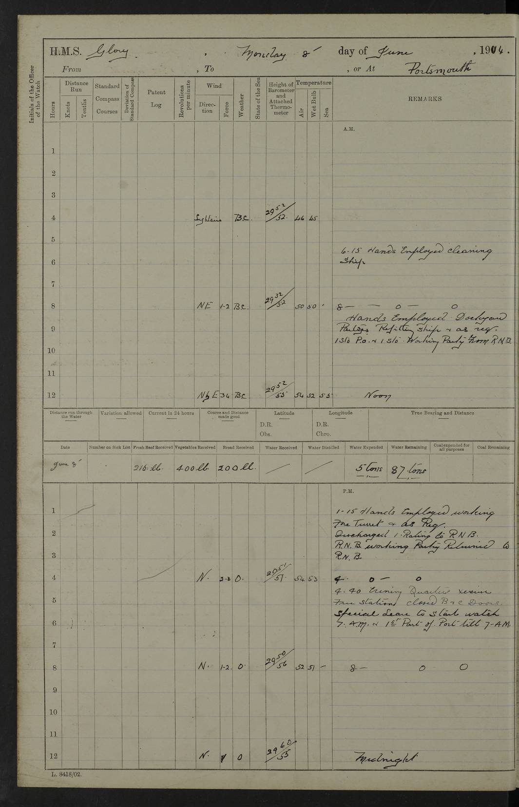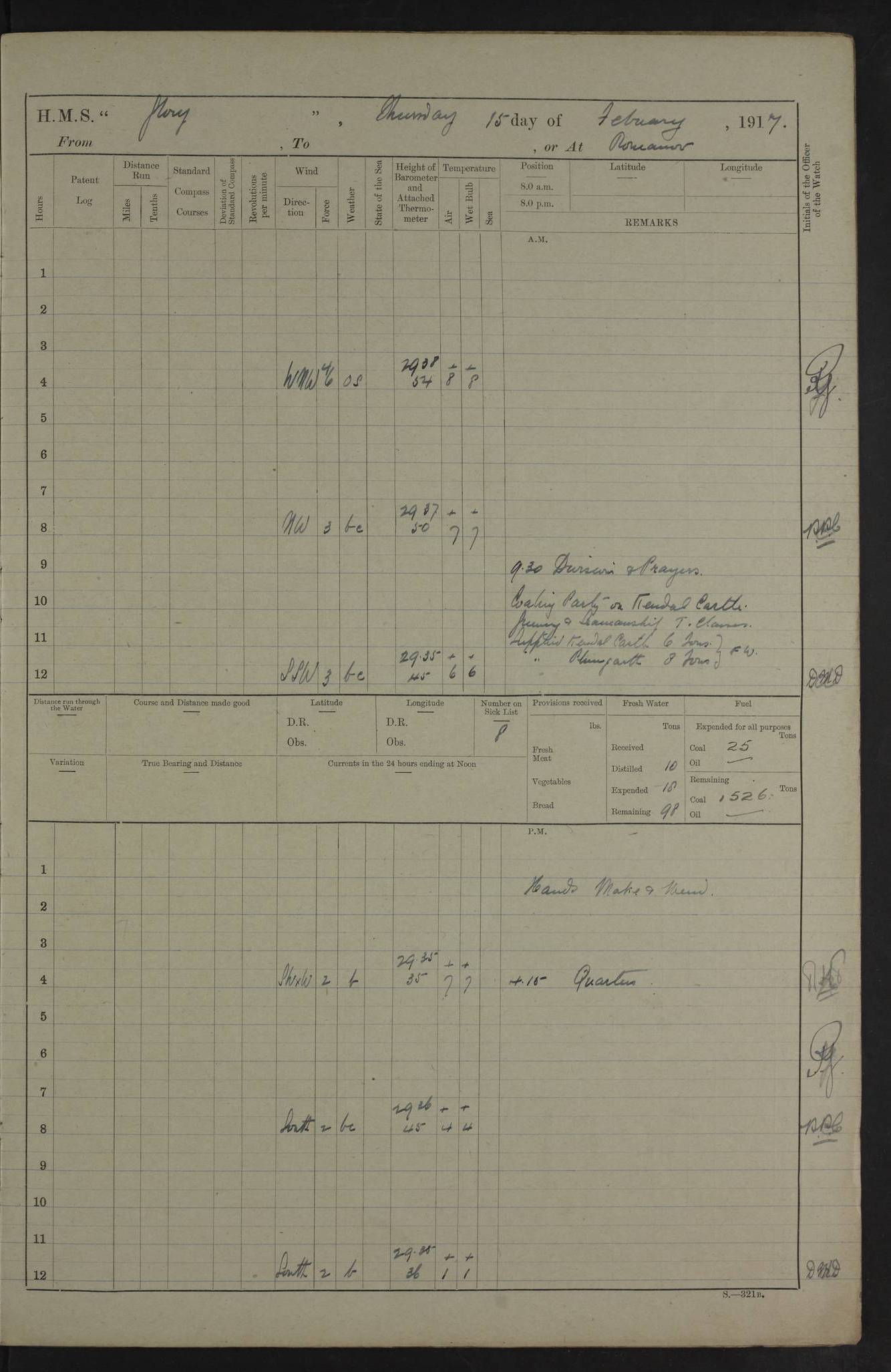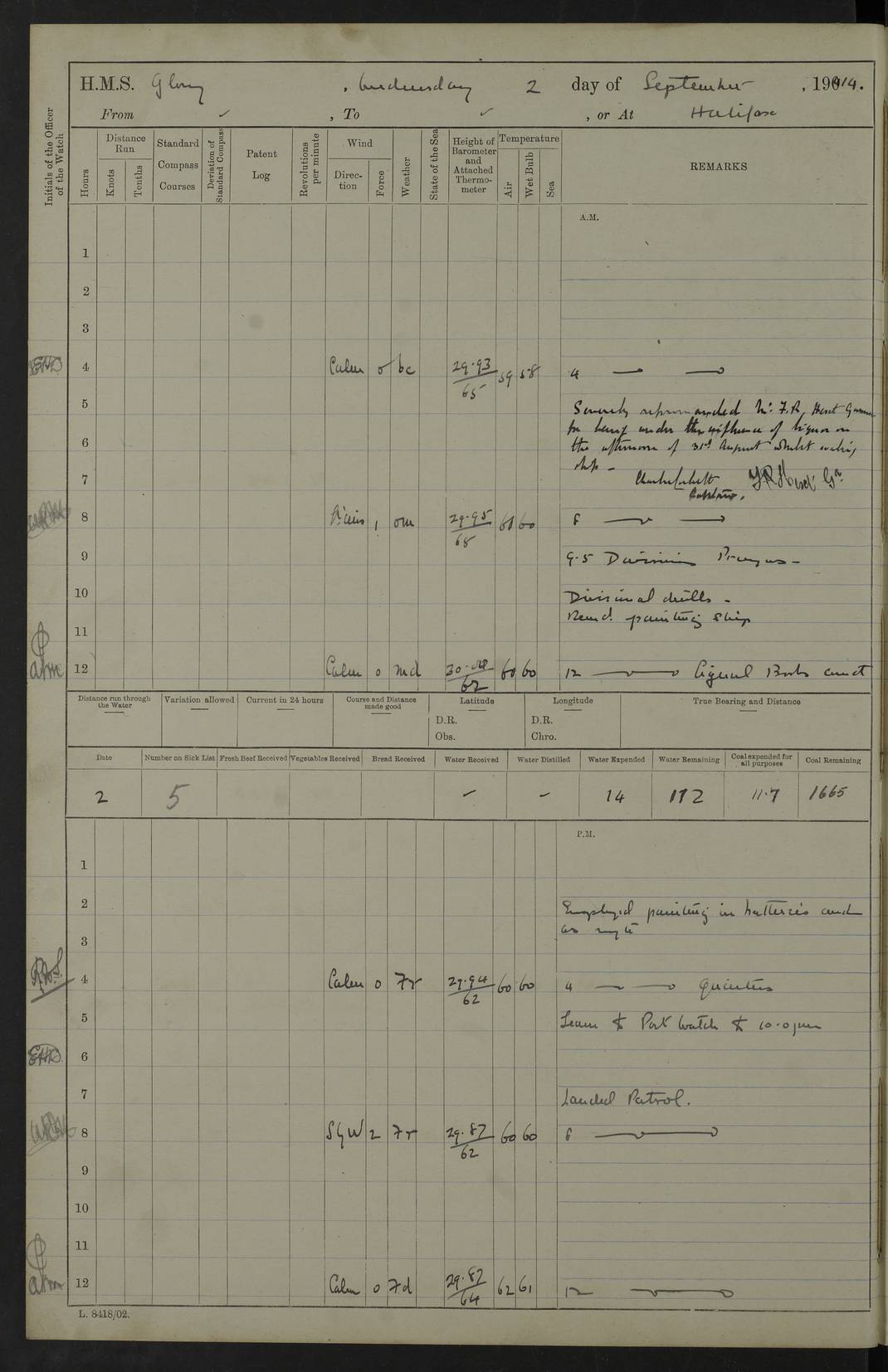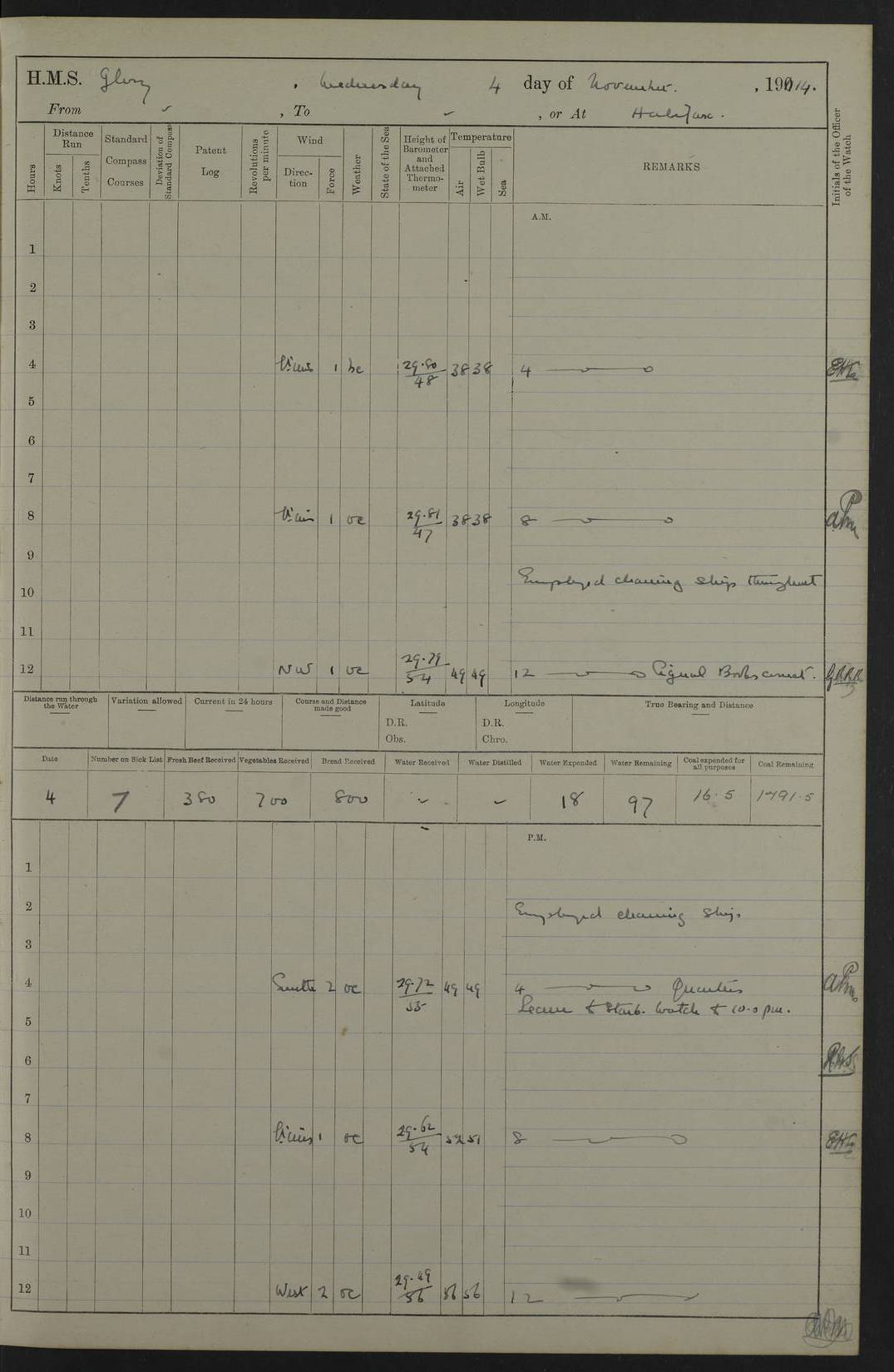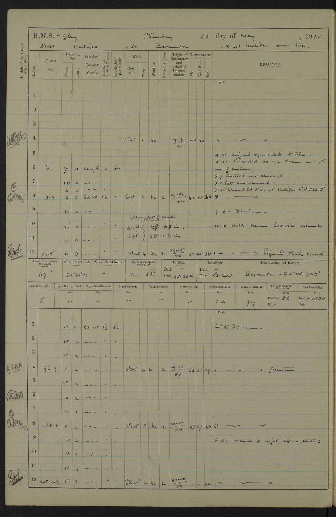 22 June 1915 At sea, Gibraltar to Lemnos Lat 36.1, Long -1.3 4.15am: Sighted land on starboard bow. 10.20am: Stopped port engine for repairs. 11.20am: proceeded with port engine. pm: a/c due to change in deviation. 10.00pm: Cape Tenez Light abeam, 18 miles. 4f73cd61a2fc8ea9030015f6: (https://s3.amazonaws.com:443/oldweather/ADM53-43015/0012_1.jpg) 23 June 1915 At sea, Gibraltar to Lemnos Lat 37.5, Long 4.8 Number on sick list: 4 5.00am: Secured from night defence stations. Placed anti-submarine guns. pm: Life saving appliances served out to men stationed in ? ?at abandon ship. 4f73cd61a2fc8ea9030015f7: (https://s3.amazonaws.com:443/oldweather/ADM53-43015/0013_0.jpg) 24 June 1915 At sea, Gibraltar to Lemnos Lat 37.4, Long 10.8 Position in log clearly bears no resemblance to the location of the ship. Position above is approximate and is based sighting of Zembra Island at 11.55am. 5.00am: Dispersed from night defence stations. Manned anti-submarine guns. am: Sighted two French torpedo boats. am: Torpedo boats passed to ~ No 362, 363. am: Sighted land on starboard beam. 11.55am: Zembra Island abeam, 25 miles. 2.00pm: Sighted Pantellaria S34ºE. 4.45pm: Pantellaria Light House abeam 12 miles. 4f73cd61a2fc8ea9030015f8: (https://s3.amazonaws.com:443/oldweather/ADM53-43015/0013_1.jpg) 25 June 1915 At sea, Gibraltar to Lemnos Lat 35.5, Long 16.7 2.10am: Gozo Light abeam 17 miles. 5.00am: Dispersed from night defence stations. Manned anti-submarine guns. 4f73cd61a2fc8ea9030015f9: (https://s3.amazonaws.com:443/oldweather/ADM53-43015/0014_0.jpg) 26 June 1915 At sea, Gibraltar to Lemnos Lat 35.5, Long 22.6 Number on sick list: 5 5.00am: Dispersed from night defence stations. Manned anti-submarine guns. am: Aired night clothing. am: marines at maxim practice on quarter deck. 2.00pm: Observed land on either bow. 3.00pm: Sighted French patrol destroyer. 4.15pm: Sighted French patrol destroyer. 9.40pm: Milo Peak N63ºW. 10.26pm: Polino Light abeam to port 5.5 miles. 4f73cd62a2fc8ea9030015fa: (https://s3.amazonaws.com:443/oldweather/ADM53-43015/0014_1.jpg) 27 June 1915 At sea and at Lemnos Lat 39.1, Long 24.4 From 0.50 to 3.05am sighting of multiple light houses. 3.50am: a/c to N39ºW and commenced to zig-zag. 5.00am: Dispersed from night defence stations and placed anti-submarine guns and look-outs. am: Lost overboard by accident Hazlewood fender, pat. 311, one in number. 10.30am: Held Divine Service onboard. pm: Met and signalled HMS Minerva on patrol duty. pm: Courses and speeds as requisite while waiting orders to approach Mudros. 3.00pm: Proceeded. 5.16pm: Increased to 90 revs, commenced to zig-zag. Course as requisite for Mudros. 7.00pm: Entered Mudros Bay. 7.47pm: Stopped. Let go port anchor in ‘M3’. 8.30pm: Darkened ship. pm: Manned one 6” and one 12 pdr. 4f73cd62a2fc8ea9030015fb: (https://s3.amazonaws.com:443/oldweather/ADM53-43015/0015_0.jpg) 28 June 1915 Mudros Bay, Lemnos Lat 39.89, Long 25.24 5,00am: HMS Vengeance entered harbour. HMS Vengeance was a pre-dreadnought of the Canopus class, launched in 1899 at Vickers, Barrow, and sold for scrapping in 1921. Details at http://en.wikipedia.org/wiki/HMS_Vengeance_(1899) . am/pm/: hands preparing for coaling and about ship’s work. pm: Collier Wabana secured alongside. 4f73cd62a2fc8ea9030015fc: (https://s3.amazonaws.com:443/oldweather/ADM53-43015/0015_1.jpg) 29 June 1915 Mudros Bay, Lemnos Lat 39.89, Long 25.24 5.15am: Commenced coaling. 2.00pm: Finished coaling. Collier left. 4f73cd62a2fc8ea9030015fd: (https://s3.amazonaws.com:443/oldweather/ADM53-43015/0016_0.jpg) 30 June 1915 Mudros Bay, Lemnos Lat 39.89, Long 25.24 am: Parties away sanding, and with fire engines onshore. am: Boats away disembarking troops. am: French Flagship Patrie sailed. The Patrie was a French pre-dreadnought, launched at La Seyne shipyard in 1903, and stricken in 1921. Details at http://en.wikipedia.org/wiki/French_battleship_Patrie . 6.30pm: Hands to bathe. 4f73cd63a2fc8ea9030015fe: (https://s3.amazonaws.com:443/oldweather/ADM53-43015/0016_1.jpg) 4f73cd63a2fc8ea9030015ff: (https://s3.amazonaws.com:443/oldweather/ADM53-43015/0017_0.jpg) 4f73cd63a2fc8ea903001600: (https://s3.amazonaws.com:443/oldweather/ADM53-43015/0017_1.jpg) 4f73cd63a2fc8ea903001601: (https://s3.amazonaws.com:443/oldweather/ADM53-43015/0018_0.jpg) 4f73cd64a2fc8ea903001602: (https://s3.amazonaws.com:443/oldweather/ADM53-43015/0018_1.jpg) LOGS FOR JULY 1915 From July to October 1915, HMS Glory spent her time at Port Mudros. Certain activities typically took place daily and are not generally noted in the pages below. These activities include: Lighting fires in the picket boat around 4am and drawing the fires in the late evening; Divisions at around 9–9.30am and Evening Quarters at 4pm; Darken ship at around 8.30pm; Daily ‘cleaning ship’, with variations thereof; SBC (for ‘Signal Books Correct’) at the watch changes. 4f73cd64a2fc8ea903001603: (https://s3.amazonaws.com:443/oldweather/ADM53-43016/0000_0.jpg) 4f73cd64a2fc8ea903001604: (https://s3.amazonaws.com:443/oldweather/ADM53-43016/0000_1.jpg) 4f73cd65a2fc8ea903001605: (https://s3.amazonaws.com:443/oldweather/ADM53-43016/0001_0.jpg) 4f73cd65a2fc8ea903001606: (https://s3.amazonaws.com:443/oldweather/ADM53-43016/0001_1.jpg) 1 July 1915 Port Mudros Lat 39.89, Long 25.24 6.30am: Landed working parties preparing boom defence ships. am: Discharged Acting Commander Rayne to Hector. Hector was a kite balloon ship. No further details readily available. 5.00pm: Tug T.10 made fast astern. 7.15pm: HMS Venerable went out. 7.30pm: HMS Chatham went out. HMS Chatham was a ‘Town’ cruiser and lead ship of her class. She was launched in 1911 at Chatham Dockyard and sold in 1926. Details at http://en.wikipedia.org/wiki/HMS_Chatham_(1911) . 4f73cd65a2fc8ea903001607: (https://s3.amazonaws.com:443/oldweather/ADM53-43016/0002_0.jpg) 2 July 1915 Port Mudros Lat 39.89, Long 25.24 5.35am: Landed working parties preparing boom defence ships. am/pm: Boom defence par