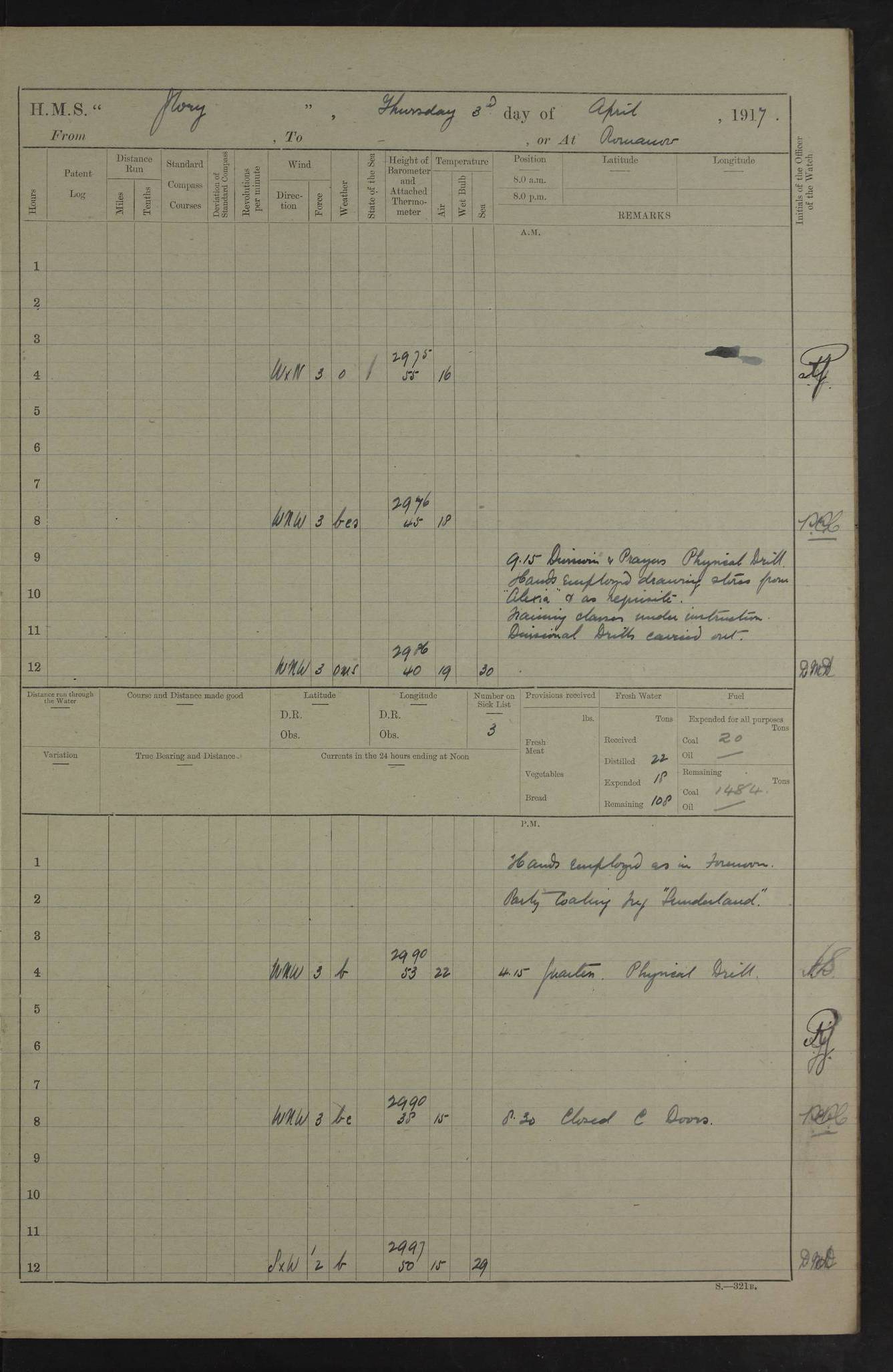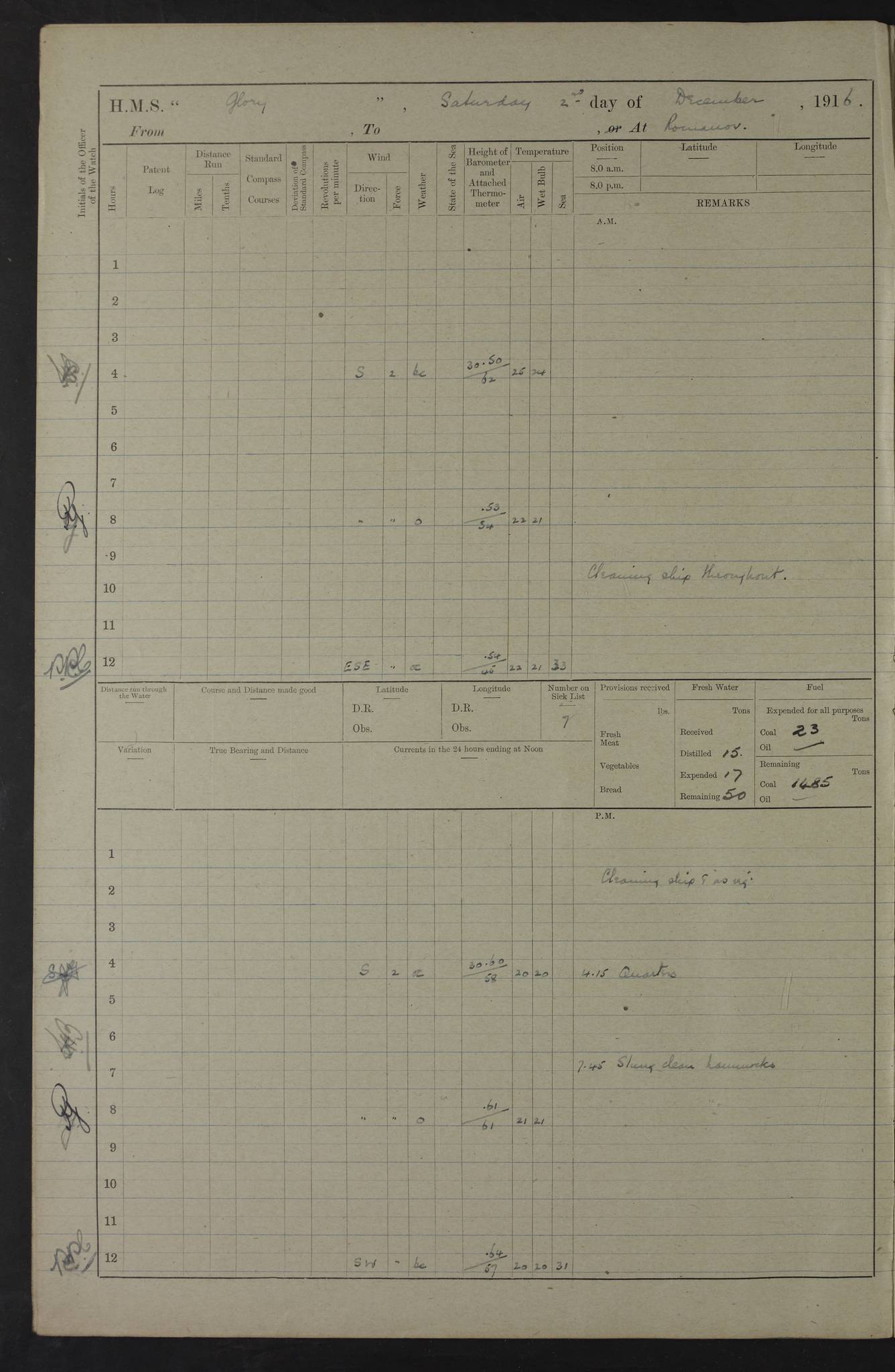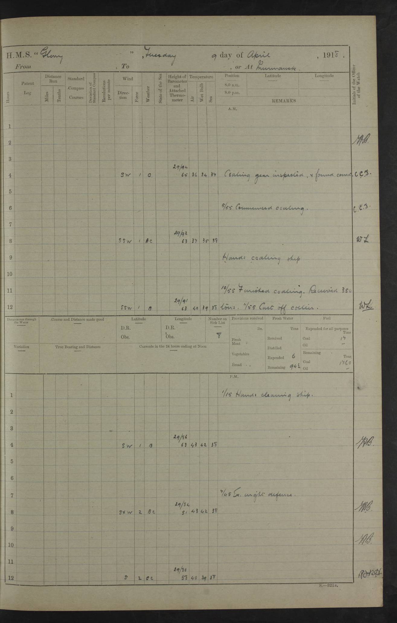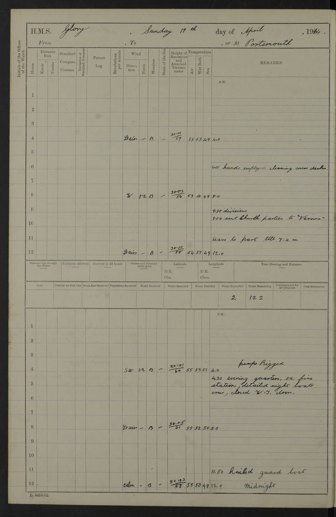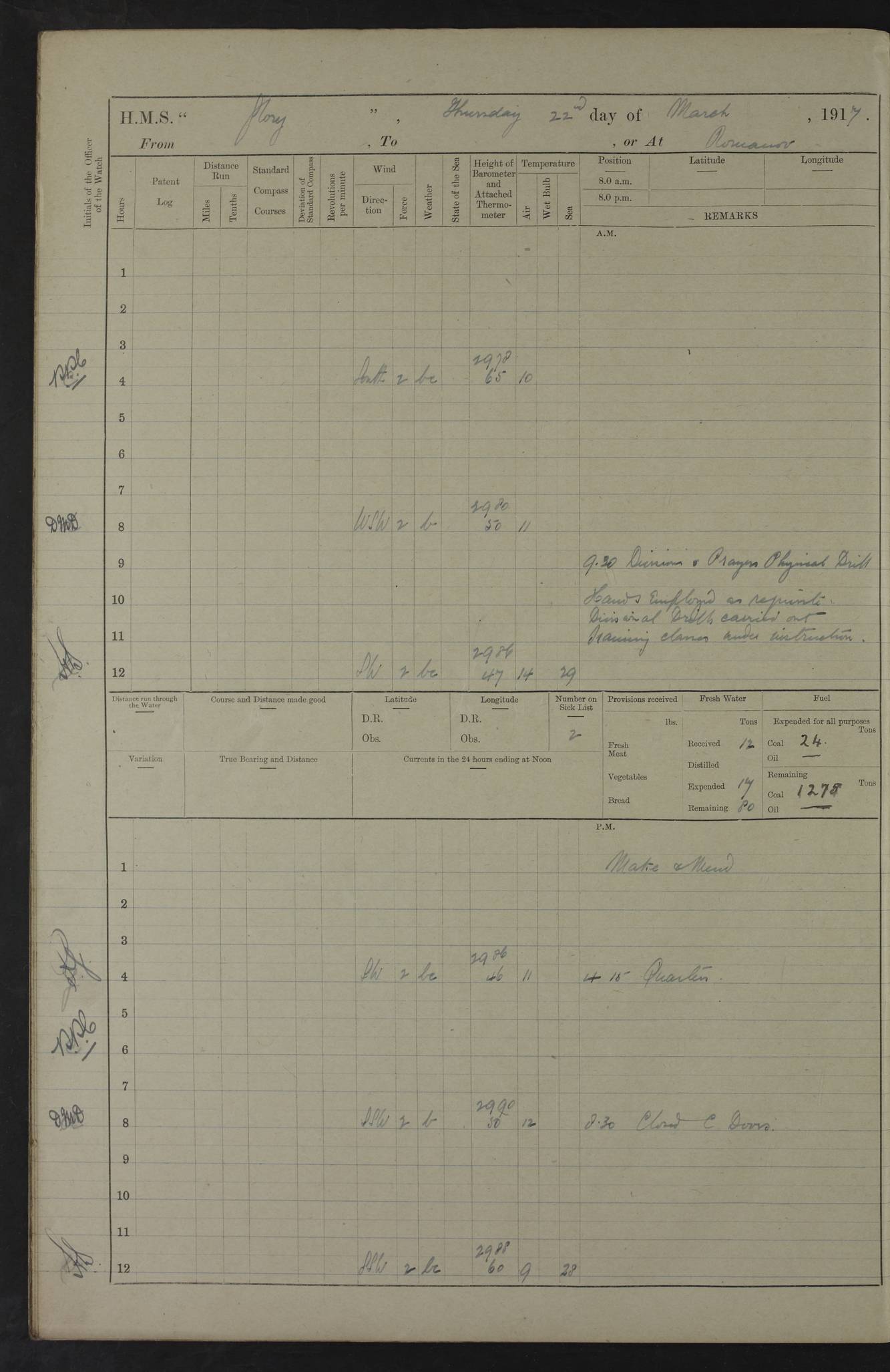 22 June 1915 At sea, Gibraltar to Lemnos Lat 36.1, Long -1.3 4.15am: Sighted land on starboard bow. 10.20am: Stopped port engine for repairs. 11.20am: proceeded with port engine. pm: a/c due to change in deviation. 10.00pm: Cape Tenez Light abeam, 18 miles. 4f73cd61a2fc8ea9030015f6: (https://s3.amazonaws.com:443/oldweather/ADM53-43015/0012_1.jpg) 23 June 1915 At sea, Gibraltar to Lemnos Lat 37.5, Long 4.8 Number on sick list: 4 5.00am: Secured from night defence stations. Placed anti-submarine guns. pm: Life saving appliances served out to men stationed in ? ?at abandon ship. 4f73cd61a2fc8ea9030015f7: (https://s3.amazonaws.com:443/oldweather/ADM53-43015/0013_0.jpg) 24 June 1915 At sea, Gibraltar to Lemnos Lat 37.4, Long 10.8 Position in log clearly bears no resemblance to the location of the ship. Position above is approximate and is based sighting of Zembra Island at 11.55am. 5.00am: Dispersed from night defence stations. Manned anti-submarine guns. am: Sighted two French torpedo boats. am: Torpedo boats passed to ~ No 362, 363. am: Sighted land on starboard beam. 11.55am: Zembra Island abeam, 25 miles. 2.00pm: Sighted Pantellaria S34ºE. 4.45pm: Pantellaria Light House abeam 12 miles. 4f73cd61a2fc8ea9030015f8: (https://s3.amazonaws.com:443/oldweather/ADM53-43015/0013_1.jpg) 25 June 1915 At sea, Gibraltar to Lemnos Lat 35.5, Long 16.7 2.10am: Gozo Light abeam 17 miles. 5.00am: Dispersed from night defence stations. Manned anti-submarine guns. 4f73cd61a2fc8ea9030015f9: (https://s3.amazonaws.com:443/oldweather/ADM53-43015/0014_0.jpg) 26 June 1915 At sea, Gibraltar to Lemnos Lat 35.5, Long 22.6 Number on sick list: 5 5.00am: Dispersed from night defence stations. Manned anti-submarine guns. am: Aired night clothing. am: marines at maxim practice on quarter deck. 2.00pm: Observed land on either bow. 3.00pm: Sighted French patrol destroyer. 4.15pm: Sighted French patrol destroyer. 9.40pm: Milo Peak N63ºW. 10.26pm: Polino Light abeam to port 5.5 miles. 4f73cd62a2fc8ea9030015fa: (https://s3.amazonaws.com:443/oldweather/ADM53-43015/0014_1.jpg) 27 June 1915 At sea and at Lemnos Lat 39.1, Long 24.4 From 0.50 to 3.05am sighting of multiple light houses. 3.50am: a/c to N39ºW and commenced to zig-zag. 5.00am: Dispersed from night defence stations and placed anti-submarine guns and look-outs. am: Lost overboard by accident Hazlewood fender, pat. 311, one in number. 10.30am: Held Divine Service onboard. pm: Met and signalled HMS Minerva on patrol duty. pm: Courses and speeds as requisite while waiting orders to approach Mudros. 3.00pm: Proceeded. 5.16pm: Increased to 90 revs, commenced to zig-zag. Course as requisite for Mudros. 7.00pm: Entered Mudros Bay. 7.47pm: Stopped. Let go port anchor in ‘M3’. 8.30pm: Darkened ship. pm: Manned one 6” and one 12 pdr. 4f73cd62a2fc8ea9030015fb: (https://s3.amazonaws.com:443/oldweather/ADM53-43015/0015_0.jpg) 28 June 1915 Mudros Bay, Lemnos Lat 39.89, Long 25.24 5,00am: HMS Vengeance entered harbour. HMS Vengeance was a pre-dreadnought of the Canopus class, launched in 1899 at Vickers, Barrow, and sold for scrapping in 1921. Details at http://en.wikipedia.org/wiki/HMS_Vengeance_(1899) . am/pm/: hands preparing for coaling and about ship’s work. pm: Collier Wabana secured alongside. 4f73cd62a2fc8ea9030015fc: (https://s3.amazonaws.com:443/oldweather/ADM53-43015/0015_1.jpg) 29 June 1915 Mudros Bay, Lemnos Lat 39.89, Long 25.24 5.15am: Commenced coaling. 2.00pm: Finished coaling. Collier left. 4f73cd62a2fc8ea9030015fd: (https://s3.amazonaws.com:443/oldweather/ADM53-43015/0016_0.jpg) 30 June 1915 Mudros Bay, Lemnos Lat 39.89, Long 25.24 am: Parties away sanding, and with fire engines onshore. am: Boats away disembarking troops. am: French Flagship Patrie sailed. The Patrie was a French pre-dreadnought, launched at La Seyne shipyard in 1903, and stricken in 1921. Details at http://en.wikipedia.org/wiki/French_battleship_Patrie . 6.30pm: Hands to bathe. 4f73cd63a2fc8ea9030015fe: (https://s3.amazonaws.com:443/oldweather/ADM53-43015/0016_1.jpg) 4f73cd63a2fc8ea9030015ff: (https://s3.amazonaws.com:443/oldweather/ADM53-43015/0017_0.jpg) 4f73cd63a2fc8ea903001600: (https://s3.amazonaws.com:443/oldweather/ADM53-43015/0017_1.jpg) 4f73cd63a2fc8ea903001601: (https://s3.amazonaws.com:443/oldweather/ADM53-43015/0018_0.jpg) 4f73cd64a2fc8ea903001602: (https://s3.amazonaws.com:443/oldweather/ADM53-43015/0018_1.jpg) LOGS FOR JULY 1915 From July to October 1915, HMS Glory spent her time at Port Mudros. Certain activities typically took place daily and are not generally noted in the pages below. These activities include: Lighting fires in the picket boat around 4am and drawing the fires in the late evening; Divisions at around 9–9.30am and Evening Quarters at 4pm; Darken ship at around 8.30pm; Daily ‘cleaning ship’, with variations thereof; SBC (for ‘Signal Books Correct’) at the watch changes. 4f73cd64a2fc8ea903001603: (https://s3.amazonaws.com:443/oldweather/ADM53-43016/0000_0.jpg) 4f73cd64a2fc8ea903001604: (https://s3.amazonaws.com:443/oldweather/ADM53-43016/0000_1.jpg) 4f73cd65a2fc8ea903001605: (https://s3.amazonaws.com:443/oldweather/ADM53-43016/0001_0.jpg) 4f73cd65a2fc8ea903001606: (https://s3.amazonaws.com:443/oldweather/ADM53-43016/0001_1.jpg) 1 July 1915 Port Mudros Lat 39.89, Long 25.24 6.30am: Landed working parties preparing boom defence ships. am: Discharged Acting Commander Rayne to Hector. Hector was a kite balloon ship. No further details readily available. 5.00pm: Tug T.10 made fast astern. 7.15pm: HMS Venerable went out. 7.30pm: HMS Chatham went out. HMS Chatham was a ‘Town’ cruiser and lead ship of her class. She was launched in 1911 at Chatham Dockyard and sold in 1926. Details at http://en.wikipedia.org/wiki/HMS_Chatham_(1911) . 4f73cd65a2fc8ea903001607: (https://s3.amazonaws.com:443/oldweather/ADM53-43016/0002_0.jpg) 2 July 1915 Port Mudros Lat 39.89, Long 25.24 5.35am: Landed working parties preparing boom defence ships. am/pm: Boom defence par