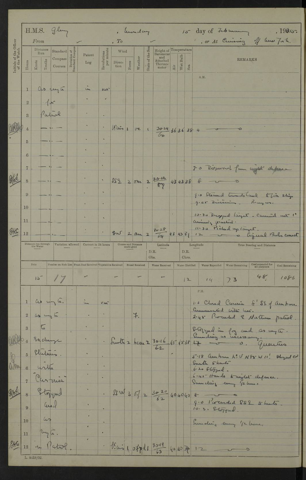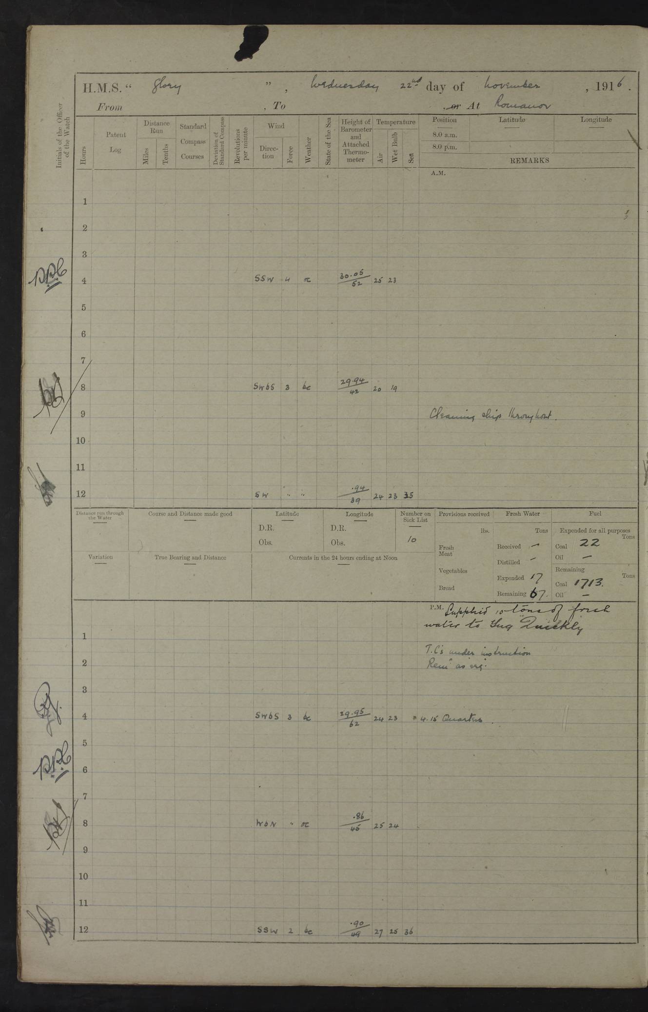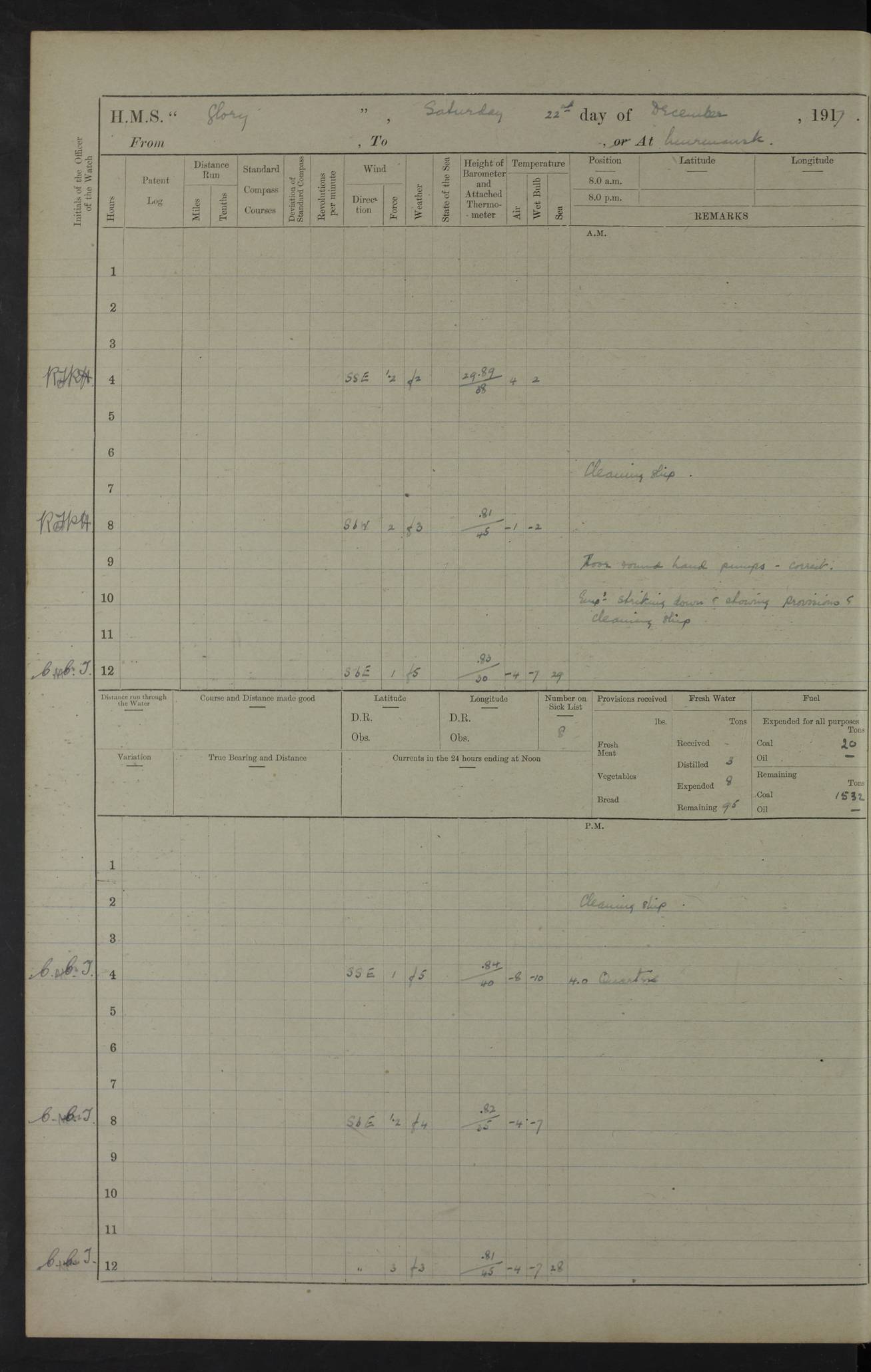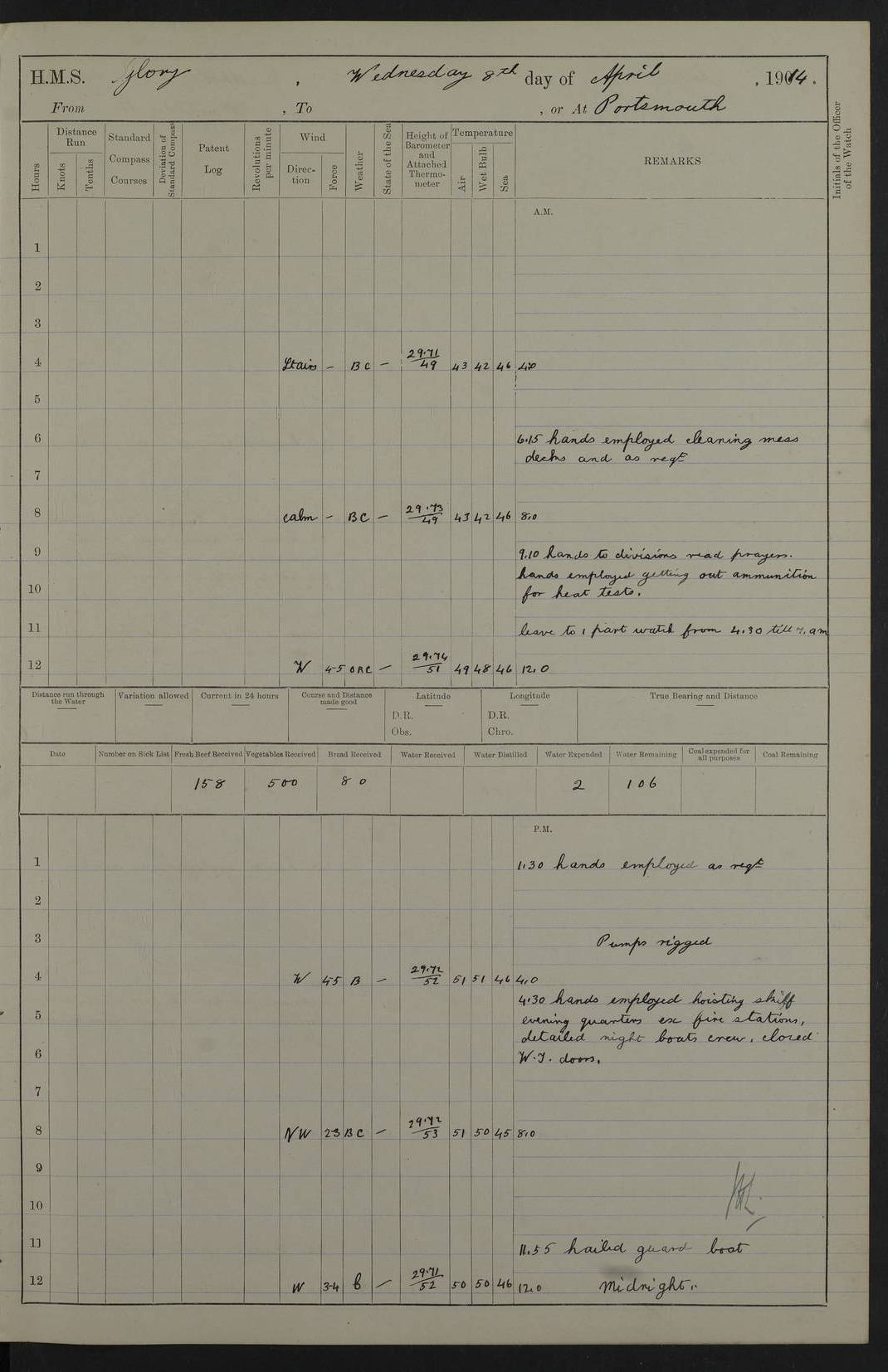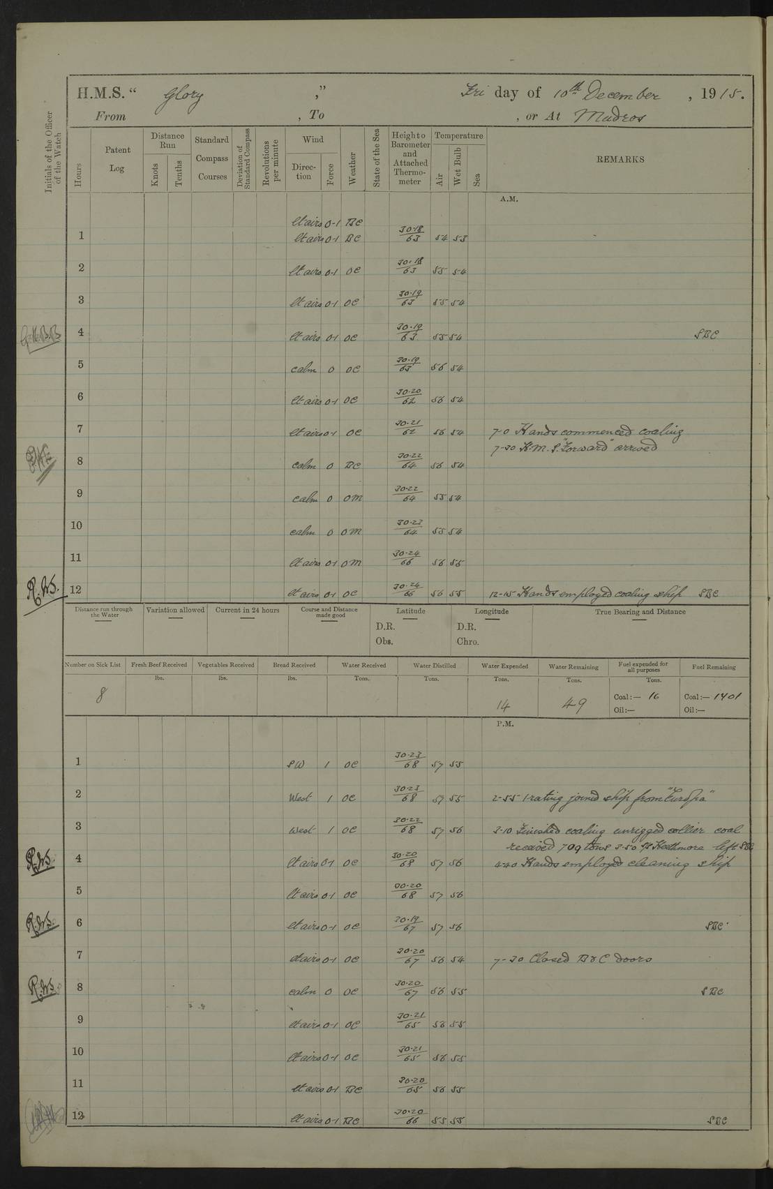 22 June 1915 At sea, Gibraltar to Lemnos Lat 36.1, Long -1.3 4.15am: Sighted land on starboard bow. 10.20am: Stopped port engine for repairs. 11.20am: proceeded with port engine. pm: a/c due to change in deviation. 10.00pm: Cape Tenez Light abeam, 18 miles. 4f73cd61a2fc8ea9030015f6: (https://s3.amazonaws.com:443/oldweather/ADM53-43015/0012_1.jpg) 23 June 1915 At sea, Gibraltar to Lemnos Lat 37.5, Long 4.8 Number on sick list: 4 5.00am: Secured from night defence stations. Placed anti-submarine guns. pm: Life saving appliances served out to men stationed in ? ?at abandon ship. 4f73cd61a2fc8ea9030015f7: (https://s3.amazonaws.com:443/oldweather/ADM53-43015/0013_0.jpg) 24 June 1915 At sea, Gibraltar to Lemnos Lat 37.4, Long 10.8 Position in log clearly bears no resemblance to the location of the ship. Position above is approximate and is based sighting of Zembra Island at 11.55am. 5.00am: Dispersed from night defence stations. Manned anti-submarine guns. am: Sighted two French torpedo boats. am: Torpedo boats passed to ~ No 362, 363. am: Sighted land on starboard beam. 11.55am: Zembra Island abeam, 25 miles. 2.00pm: Sighted Pantellaria S34ºE. 4.45pm: Pantellaria Light House abeam 12 miles. 4f73cd61a2fc8ea9030015f8: (https://s3.amazonaws.com:443/oldweather/ADM53-43015/0013_1.jpg) 25 June 1915 At sea, Gibraltar to Lemnos Lat 35.5, Long 16.7 2.10am: Gozo Light abeam 17 miles. 5.00am: Dispersed from night defence stations. Manned anti-submarine guns. 4f73cd61a2fc8ea9030015f9: (https://s3.amazonaws.com:443/oldweather/ADM53-43015/0014_0.jpg) 26 June 1915 At sea, Gibraltar to Lemnos Lat 35.5, Long 22.6 Number on sick list: 5 5.00am: Dispersed from night defence stations. Manned anti-submarine guns. am: Aired night clothing. am: marines at maxim practice on quarter deck. 2.00pm: Observed land on either bow. 3.00pm: Sighted French patrol destroyer. 4.15pm: Sighted French patrol destroyer. 9.40pm: Milo Peak N63ºW. 10.26pm: Polino Light abeam to port 5.5 miles. 4f73cd62a2fc8ea9030015fa: (https://s3.amazonaws.com:443/oldweather/ADM53-43015/0014_1.jpg) 27 June 1915 At sea and at Lemnos Lat 39.1, Long 24.4 From 0.50 to 3.05am sighting of multiple light houses. 3.50am: a/c to N39ºW and commenced to zig-zag. 5.00am: Dispersed from night defence stations and placed anti-submarine guns and look-outs. am: Lost overboard by accident Hazlewood fender, pat. 311, one in number. 10.30am: Held Divine Service onboard. pm: Met and signalled HMS Minerva on patrol duty. pm: Courses and speeds as requisite while waiting orders to approach Mudros. 3.00pm: Proceeded. 5.16pm: Increased to 90 revs, commenced to zig-zag. Course as requisite for Mudros. 7.00pm: Entered Mudros Bay. 7.47pm: Stopped. Let go port anchor in ‘M3’. 8.30pm: Darkened ship. pm: Manned one 6” and one 12 pdr. 4f73cd62a2fc8ea9030015fb: (https://s3.amazonaws.com:443/oldweather/ADM53-43015/0015_0.jpg) 28 June 1915 Mudros Bay, Lemnos Lat 39.89, Long 25.24 5,00am: HMS Vengeance entered harbour. HMS Vengeance was a pre-dreadnought of the Canopus class, launched in 1899 at Vickers, Barrow, and sold for scrapping in 1921. Details at http://en.wikipedia.org/wiki/HMS_Vengeance_(1899) . am/pm/: hands preparing for coaling and about ship’s work. pm: Collier Wabana secured alongside. 4f73cd62a2fc8ea9030015fc: (https://s3.amazonaws.com:443/oldweather/ADM53-43015/0015_1.jpg) 29 June 1915 Mudros Bay, Lemnos Lat 39.89, Long 25.24 5.15am: Commenced coaling. 2.00pm: Finished coaling. Collier left. 4f73cd62a2fc8ea9030015fd: (https://s3.amazonaws.com:443/oldweather/ADM53-43015/0016_0.jpg) 30 June 1915 Mudros Bay, Lemnos Lat 39.89, Long 25.24 am: Parties away sanding, and with fire engines onshore. am: Boats away disembarking troops. am: French Flagship Patrie sailed. The Patrie was a French pre-dreadnought, launched at La Seyne shipyard in 1903, and stricken in 1921. Details at http://en.wikipedia.org/wiki/French_battleship_Patrie . 6.30pm: Hands to bathe. 4f73cd63a2fc8ea9030015fe: (https://s3.amazonaws.com:443/oldweather/ADM53-43015/0016_1.jpg) 4f73cd63a2fc8ea9030015ff: (https://s3.amazonaws.com:443/oldweather/ADM53-43015/0017_0.jpg) 4f73cd63a2fc8ea903001600: (https://s3.amazonaws.com:443/oldweather/ADM53-43015/0017_1.jpg) 4f73cd63a2fc8ea903001601: (https://s3.amazonaws.com:443/oldweather/ADM53-43015/0018_0.jpg) 4f73cd64a2fc8ea903001602: (https://s3.amazonaws.com:443/oldweather/ADM53-43015/0018_1.jpg) LOGS FOR JULY 1915 From July to October 1915, HMS Glory spent her time at Port Mudros. Certain activities typically took place daily and are not generally noted in the pages below. These activities include: Lighting fires in the picket boat around 4am and drawing the fires in the late evening; Divisions at around 9–9.30am and Evening Quarters at 4pm; Darken ship at around 8.30pm; Daily ‘cleaning ship’, with variations thereof; SBC (for ‘Signal Books Correct’) at the watch changes. 4f73cd64a2fc8ea903001603: (https://s3.amazonaws.com:443/oldweather/ADM53-43016/0000_0.jpg) 4f73cd64a2fc8ea903001604: (https://s3.amazonaws.com:443/oldweather/ADM53-43016/0000_1.jpg) 4f73cd65a2fc8ea903001605: (https://s3.amazonaws.com:443/oldweather/ADM53-43016/0001_0.jpg) 4f73cd65a2fc8ea903001606: (https://s3.amazonaws.com:443/oldweather/ADM53-43016/0001_1.jpg) 1 July 1915 Port Mudros Lat 39.89, Long 25.24 6.30am: Landed working parties preparing boom defence ships. am: Discharged Acting Commander Rayne to Hector. Hector was a kite balloon ship. No further details readily available. 5.00pm: Tug T.10 made fast astern. 7.15pm: HMS Venerable went out. 7.30pm: HMS Chatham went out. HMS Chatham was a ‘Town’ cruiser and lead ship of her class. She was launched in 1911 at Chatham Dockyard and sold in 1926. Details at http://en.wikipedia.org/wiki/HMS_Chatham_(1911) . 4f73cd65a2fc8ea903001607: (https://s3.amazonaws.com:443/oldweather/ADM53-43016/0002_0.jpg) 2 July 1915 Port Mudros Lat 39.89, Long 25.24 5.35am: Landed working parties preparing boom defence ships. am/pm: Boom defence par