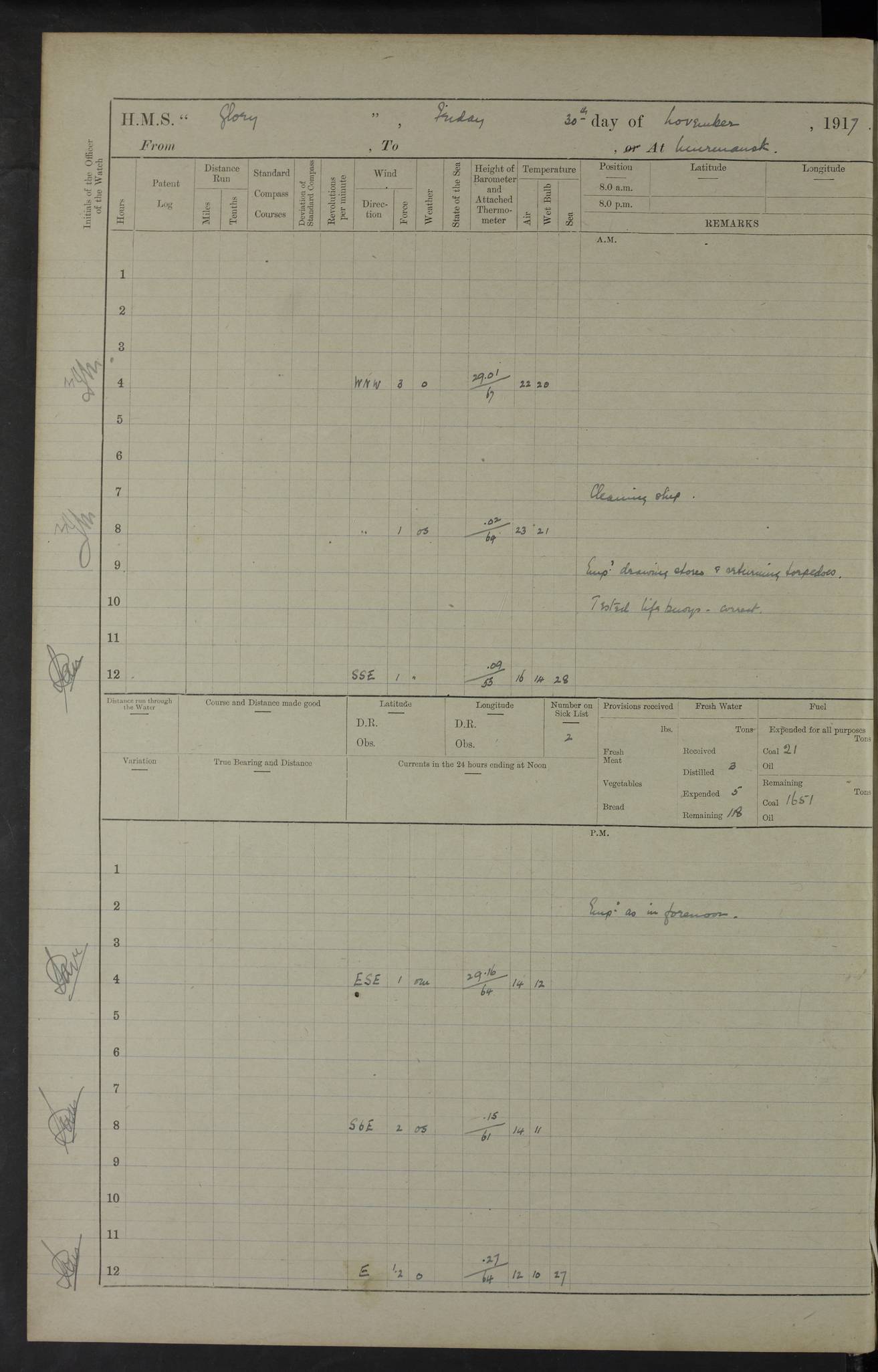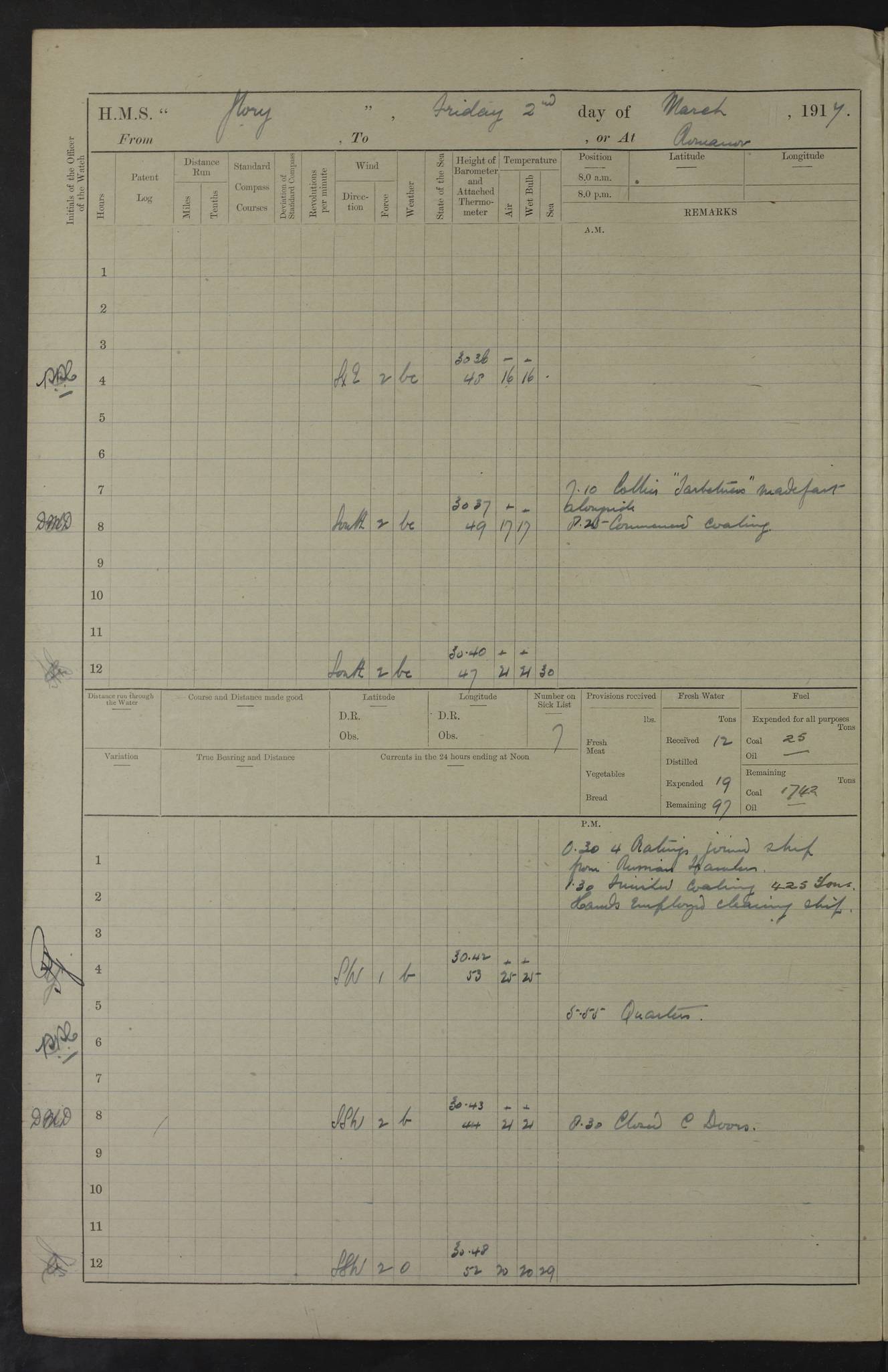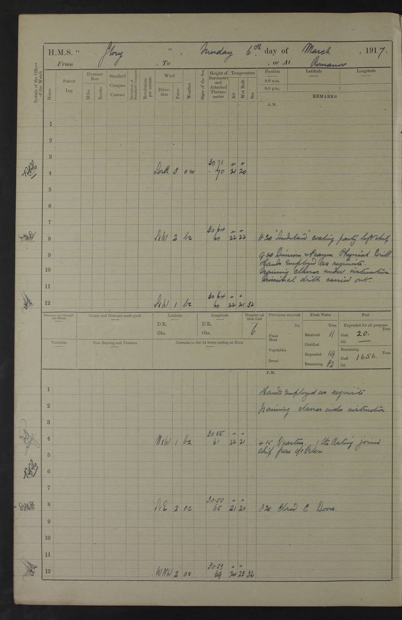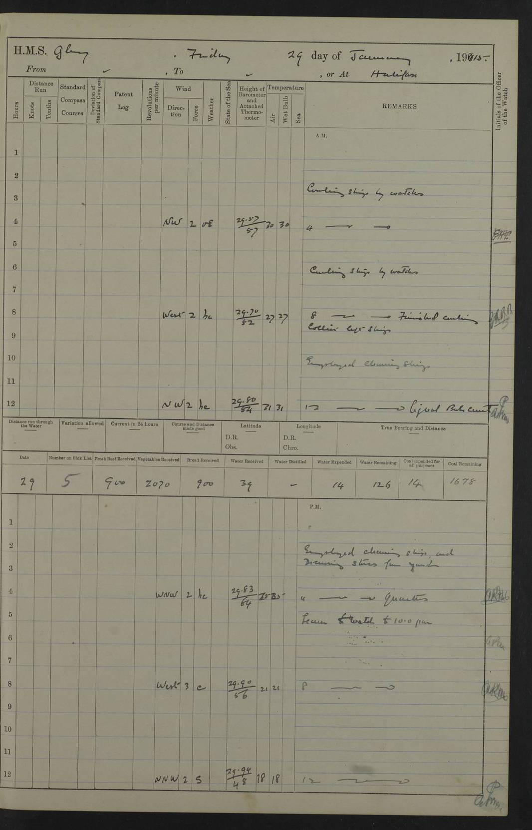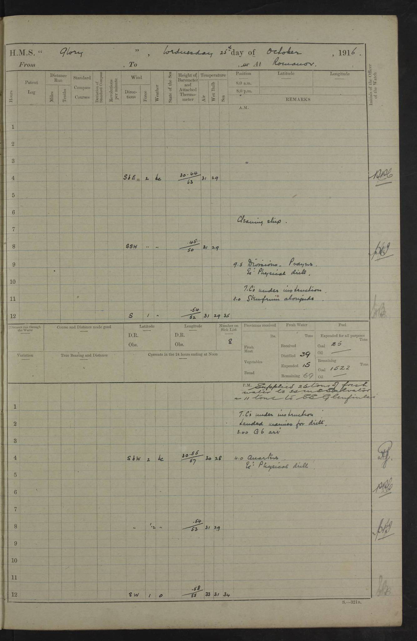 22 June 1915 At sea, Gibraltar to Lemnos Lat 36.1, Long -1.3 4.15am: Sighted land on starboard bow. 10.20am: Stopped port engine for repairs. 11.20am: proceeded with port engine. pm: a/c due to change in deviation. 10.00pm: Cape Tenez Light abeam, 18 miles. 4f73cd61a2fc8ea9030015f6: (https://s3.amazonaws.com:443/oldweather/ADM53-43015/0012_1.jpg) 23 June 1915 At sea, Gibraltar to Lemnos Lat 37.5, Long 4.8 Number on sick list: 4 5.00am: Secured from night defence stations. Placed anti-submarine guns. pm: Life saving appliances served out to men stationed in ? ?at abandon ship. 4f73cd61a2fc8ea9030015f7: (https://s3.amazonaws.com:443/oldweather/ADM53-43015/0013_0.jpg) 24 June 1915 At sea, Gibraltar to Lemnos Lat 37.4, Long 10.8 Position in log clearly bears no resemblance to the location of the ship. Position above is approximate and is based sighting of Zembra Island at 11.55am. 5.00am: Dispersed from night defence stations. Manned anti-submarine guns. am: Sighted two French torpedo boats. am: Torpedo boats passed to ~ No 362, 363. am: Sighted land on starboard beam. 11.55am: Zembra Island abeam, 25 miles. 2.00pm: Sighted Pantellaria S34ºE. 4.45pm: Pantellaria Light House abeam 12 miles. 4f73cd61a2fc8ea9030015f8: (https://s3.amazonaws.com:443/oldweather/ADM53-43015/0013_1.jpg) 25 June 1915 At sea, Gibraltar to Lemnos Lat 35.5, Long 16.7 2.10am: Gozo Light abeam 17 miles. 5.00am: Dispersed from night defence stations. Manned anti-submarine guns. 4f73cd61a2fc8ea9030015f9: (https://s3.amazonaws.com:443/oldweather/ADM53-43015/0014_0.jpg) 26 June 1915 At sea, Gibraltar to Lemnos Lat 35.5, Long 22.6 Number on sick list: 5 5.00am: Dispersed from night defence stations. Manned anti-submarine guns. am: Aired night clothing. am: marines at maxim practice on quarter deck. 2.00pm: Observed land on either bow. 3.00pm: Sighted French patrol destroyer. 4.15pm: Sighted French patrol destroyer. 9.40pm: Milo Peak N63ºW. 10.26pm: Polino Light abeam to port 5.5 miles. 4f73cd62a2fc8ea9030015fa: (https://s3.amazonaws.com:443/oldweather/ADM53-43015/0014_1.jpg) 27 June 1915 At sea and at Lemnos Lat 39.1, Long 24.4 From 0.50 to 3.05am sighting of multiple light houses. 3.50am: a/c to N39ºW and commenced to zig-zag. 5.00am: Dispersed from night defence stations and placed anti-submarine guns and look-outs. am: Lost overboard by accident Hazlewood fender, pat. 311, one in number. 10.30am: Held Divine Service onboard. pm: Met and signalled HMS Minerva on patrol duty. pm: Courses and speeds as requisite while waiting orders to approach Mudros. 3.00pm: Proceeded. 5.16pm: Increased to 90 revs, commenced to zig-zag. Course as requisite for Mudros. 7.00pm: Entered Mudros Bay. 7.47pm: Stopped. Let go port anchor in ‘M3’. 8.30pm: Darkened ship. pm: Manned one 6” and one 12 pdr. 4f73cd62a2fc8ea9030015fb: (https://s3.amazonaws.com:443/oldweather/ADM53-43015/0015_0.jpg) 28 June 1915 Mudros Bay, Lemnos Lat 39.89, Long 25.24 5,00am: HMS Vengeance entered harbour. HMS Vengeance was a pre-dreadnought of the Canopus class, launched in 1899 at Vickers, Barrow, and sold for scrapping in 1921. Details at http://en.wikipedia.org/wiki/HMS_Vengeance_(1899) . am/pm/: hands preparing for coaling and about ship’s work. pm: Collier Wabana secured alongside. 4f73cd62a2fc8ea9030015fc: (https://s3.amazonaws.com:443/oldweather/ADM53-43015/0015_1.jpg) 29 June 1915 Mudros Bay, Lemnos Lat 39.89, Long 25.24 5.15am: Commenced coaling. 2.00pm: Finished coaling. Collier left. 4f73cd62a2fc8ea9030015fd: (https://s3.amazonaws.com:443/oldweather/ADM53-43015/0016_0.jpg) 30 June 1915 Mudros Bay, Lemnos Lat 39.89, Long 25.24 am: Parties away sanding, and with fire engines onshore. am: Boats away disembarking troops. am: French Flagship Patrie sailed. The Patrie was a French pre-dreadnought, launched at La Seyne shipyard in 1903, and stricken in 1921. Details at http://en.wikipedia.org/wiki/French_battleship_Patrie . 6.30pm: Hands to bathe. 4f73cd63a2fc8ea9030015fe: (https://s3.amazonaws.com:443/oldweather/ADM53-43015/0016_1.jpg) 4f73cd63a2fc8ea9030015ff: (https://s3.amazonaws.com:443/oldweather/ADM53-43015/0017_0.jpg) 4f73cd63a2fc8ea903001600: (https://s3.amazonaws.com:443/oldweather/ADM53-43015/0017_1.jpg) 4f73cd63a2fc8ea903001601: (https://s3.amazonaws.com:443/oldweather/ADM53-43015/0018_0.jpg) 4f73cd64a2fc8ea903001602: (https://s3.amazonaws.com:443/oldweather/ADM53-43015/0018_1.jpg) LOGS FOR JULY 1915 From July to October 1915, HMS Glory spent her time at Port Mudros. Certain activities typically took place daily and are not generally noted in the pages below. These activities include: Lighting fires in the picket boat around 4am and drawing the fires in the late evening; Divisions at around 9–9.30am and Evening Quarters at 4pm; Darken ship at around 8.30pm; Daily ‘cleaning ship’, with variations thereof; SBC (for ‘Signal Books Correct’) at the watch changes. 4f73cd64a2fc8ea903001603: (https://s3.amazonaws.com:443/oldweather/ADM53-43016/0000_0.jpg) 4f73cd64a2fc8ea903001604: (https://s3.amazonaws.com:443/oldweather/ADM53-43016/0000_1.jpg) 4f73cd65a2fc8ea903001605: (https://s3.amazonaws.com:443/oldweather/ADM53-43016/0001_0.jpg) 4f73cd65a2fc8ea903001606: (https://s3.amazonaws.com:443/oldweather/ADM53-43016/0001_1.jpg) 1 July 1915 Port Mudros Lat 39.89, Long 25.24 6.30am: Landed working parties preparing boom defence ships. am: Discharged Acting Commander Rayne to Hector. Hector was a kite balloon ship. No further details readily available. 5.00pm: Tug T.10 made fast astern. 7.15pm: HMS Venerable went out. 7.30pm: HMS Chatham went out. HMS Chatham was a ‘Town’ cruiser and lead ship of her class. She was launched in 1911 at Chatham Dockyard and sold in 1926. Details at http://en.wikipedia.org/wiki/HMS_Chatham_(1911) . 4f73cd65a2fc8ea903001607: (https://s3.amazonaws.com:443/oldweather/ADM53-43016/0002_0.jpg) 2 July 1915 Port Mudros Lat 39.89, Long 25.24 5.35am: Landed working parties preparing boom defence ships. am/pm: Boom defence par