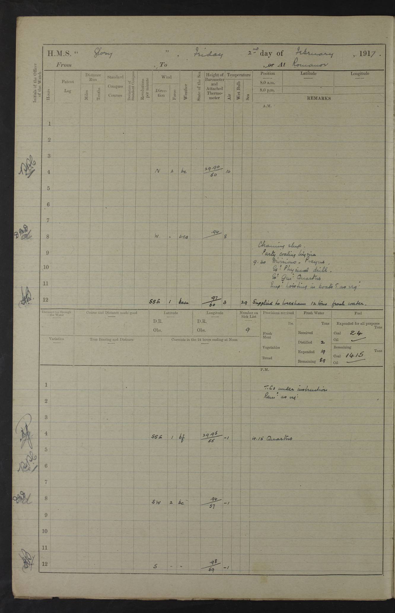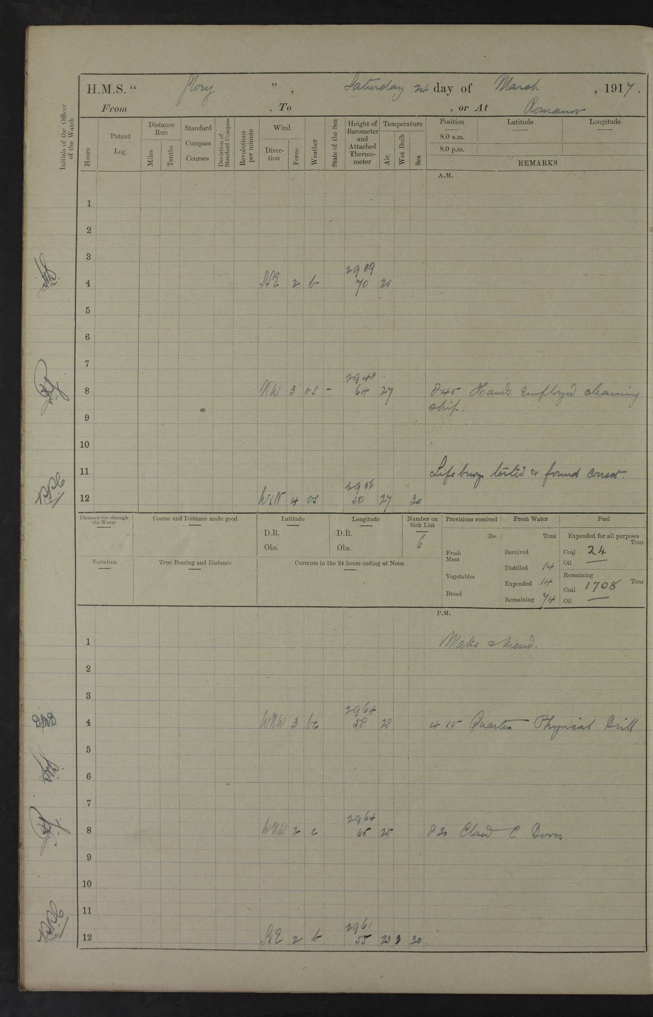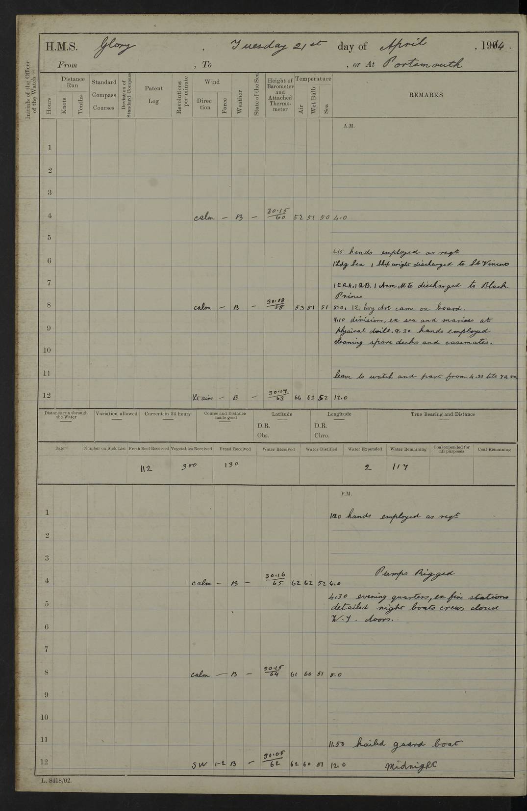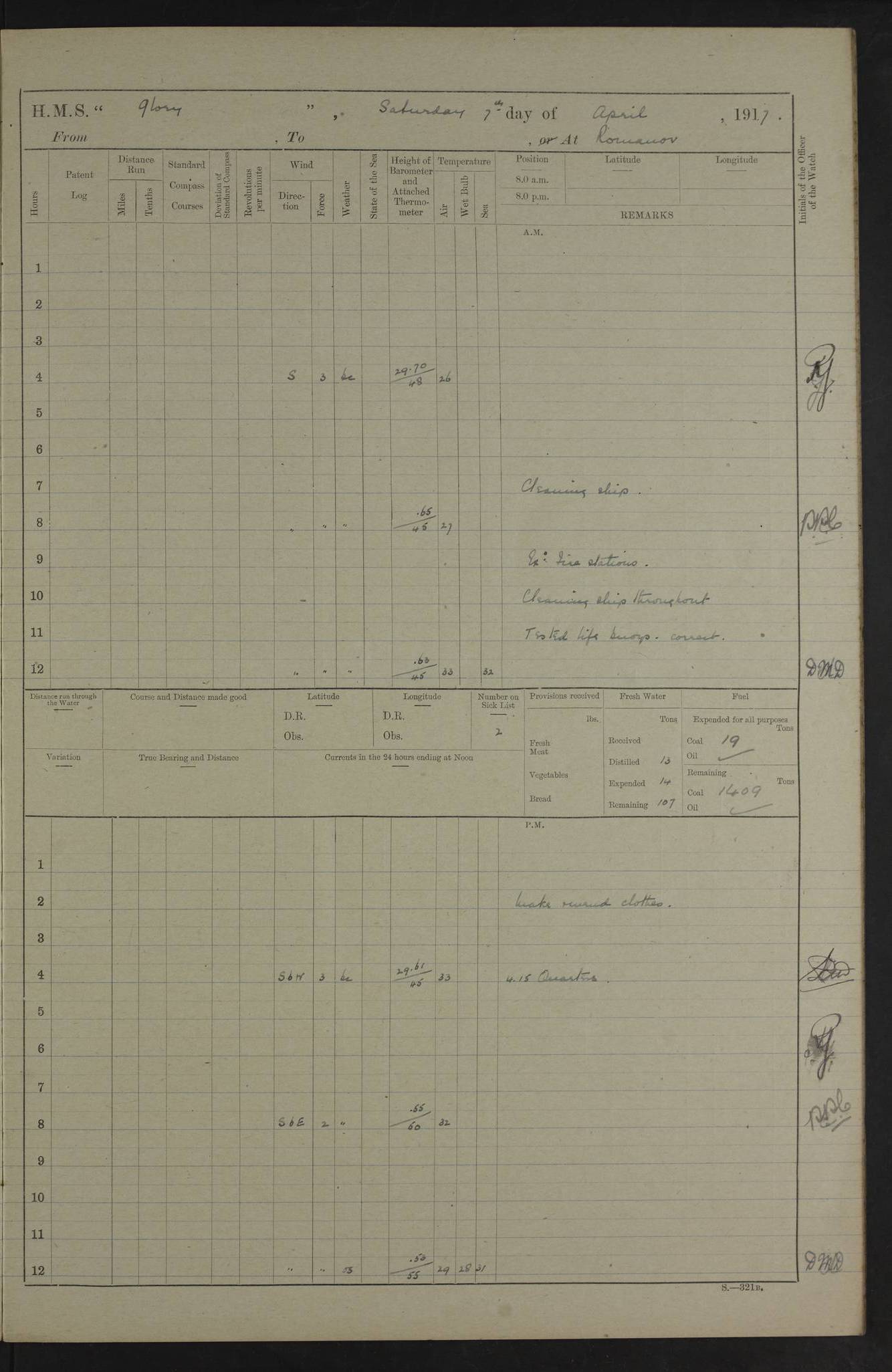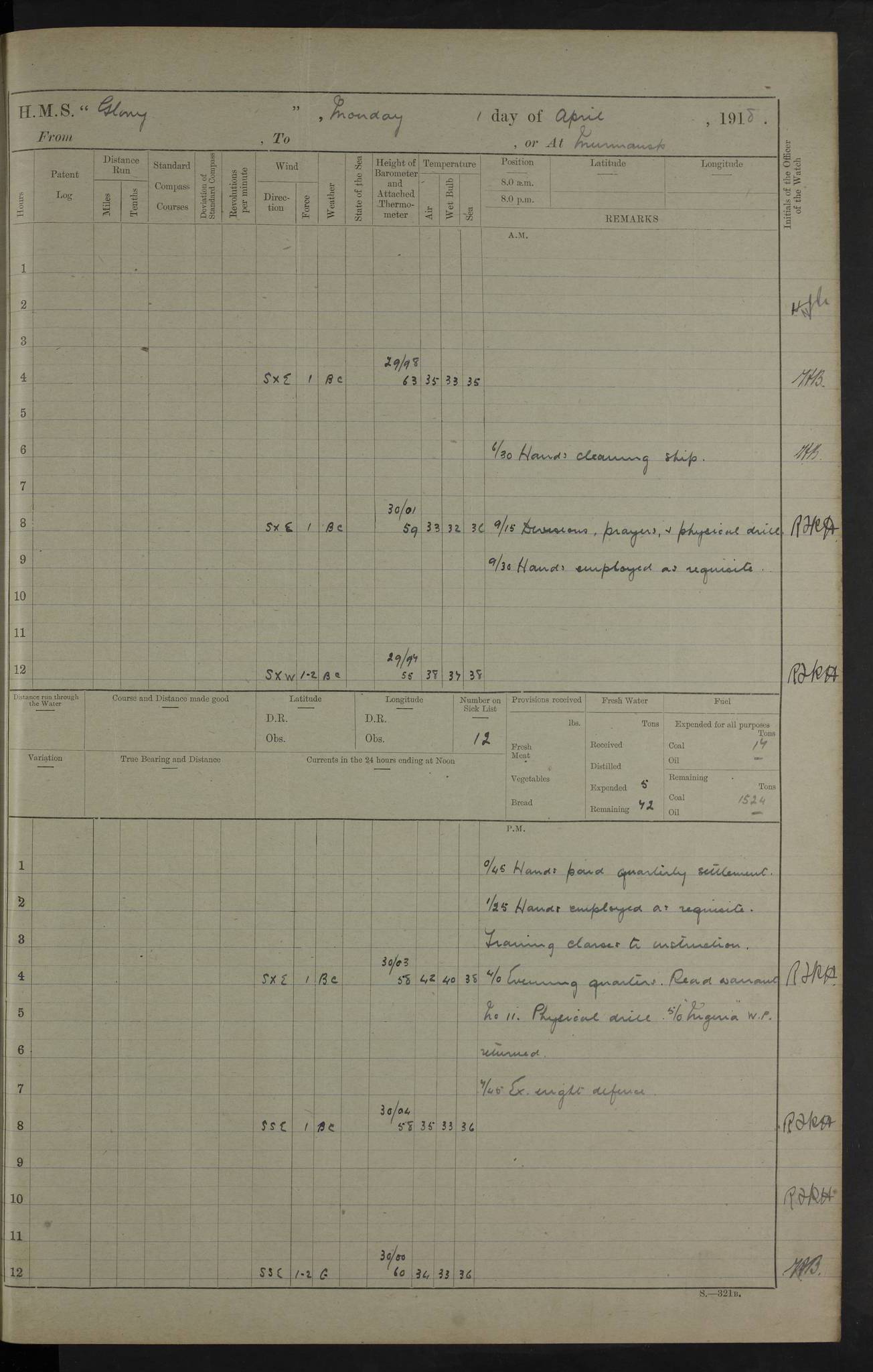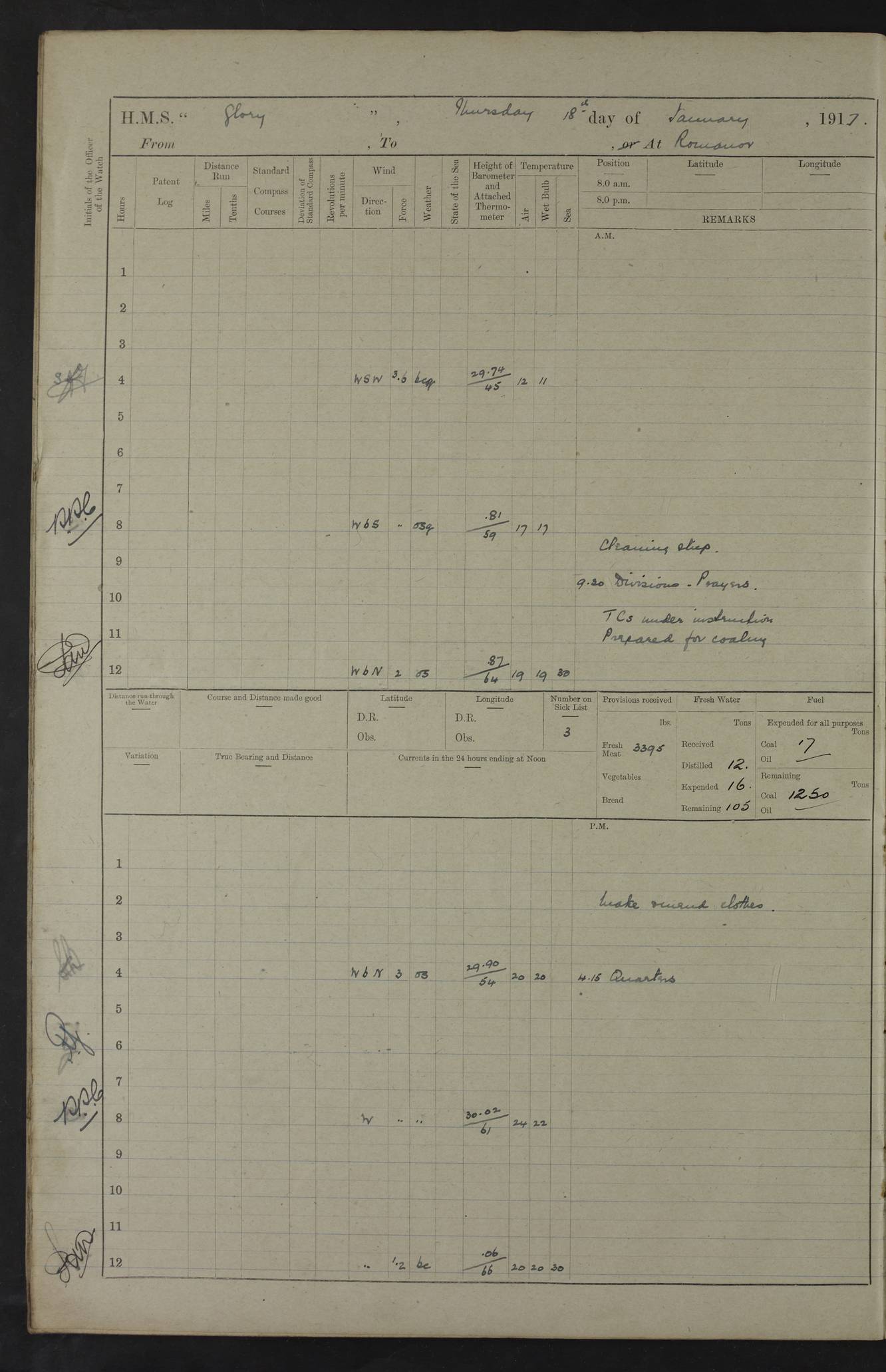 22 June 1915 At sea, Gibraltar to Lemnos Lat 36.1, Long -1.3 4.15am: Sighted land on starboard bow. 10.20am: Stopped port engine for repairs. 11.20am: proceeded with port engine. pm: a/c due to change in deviation. 10.00pm: Cape Tenez Light abeam, 18 miles. 4f73cd61a2fc8ea9030015f6: (https://s3.amazonaws.com:443/oldweather/ADM53-43015/0012_1.jpg) 23 June 1915 At sea, Gibraltar to Lemnos Lat 37.5, Long 4.8 Number on sick list: 4 5.00am: Secured from night defence stations. Placed anti-submarine guns. pm: Life saving appliances served out to men stationed in ? ?at abandon ship. 4f73cd61a2fc8ea9030015f7: (https://s3.amazonaws.com:443/oldweather/ADM53-43015/0013_0.jpg) 24 June 1915 At sea, Gibraltar to Lemnos Lat 37.4, Long 10.8 Position in log clearly bears no resemblance to the location of the ship. Position above is approximate and is based sighting of Zembra Island at 11.55am. 5.00am: Dispersed from night defence stations. Manned anti-submarine guns. am: Sighted two French torpedo boats. am: Torpedo boats passed to ~ No 362, 363. am: Sighted land on starboard beam. 11.55am: Zembra Island abeam, 25 miles. 2.00pm: Sighted Pantellaria S34ºE. 4.45pm: Pantellaria Light House abeam 12 miles. 4f73cd61a2fc8ea9030015f8: (https://s3.amazonaws.com:443/oldweather/ADM53-43015/0013_1.jpg) 25 June 1915 At sea, Gibraltar to Lemnos Lat 35.5, Long 16.7 2.10am: Gozo Light abeam 17 miles. 5.00am: Dispersed from night defence stations. Manned anti-submarine guns. 4f73cd61a2fc8ea9030015f9: (https://s3.amazonaws.com:443/oldweather/ADM53-43015/0014_0.jpg) 26 June 1915 At sea, Gibraltar to Lemnos Lat 35.5, Long 22.6 Number on sick list: 5 5.00am: Dispersed from night defence stations. Manned anti-submarine guns. am: Aired night clothing. am: marines at maxim practice on quarter deck. 2.00pm: Observed land on either bow. 3.00pm: Sighted French patrol destroyer. 4.15pm: Sighted French patrol destroyer. 9.40pm: Milo Peak N63ºW. 10.26pm: Polino Light abeam to port 5.5 miles. 4f73cd62a2fc8ea9030015fa: (https://s3.amazonaws.com:443/oldweather/ADM53-43015/0014_1.jpg) 27 June 1915 At sea and at Lemnos Lat 39.1, Long 24.4 From 0.50 to 3.05am sighting of multiple light houses. 3.50am: a/c to N39ºW and commenced to zig-zag. 5.00am: Dispersed from night defence stations and placed anti-submarine guns and look-outs. am: Lost overboard by accident Hazlewood fender, pat. 311, one in number. 10.30am: Held Divine Service onboard. pm: Met and signalled HMS Minerva on patrol duty. pm: Courses and speeds as requisite while waiting orders to approach Mudros. 3.00pm: Proceeded. 5.16pm: Increased to 90 revs, commenced to zig-zag. Course as requisite for Mudros. 7.00pm: Entered Mudros Bay. 7.47pm: Stopped. Let go port anchor in ‘M3’. 8.30pm: Darkened ship. pm: Manned one 6” and one 12 pdr. 4f73cd62a2fc8ea9030015fb: (https://s3.amazonaws.com:443/oldweather/ADM53-43015/0015_0.jpg) 28 June 1915 Mudros Bay, Lemnos Lat 39.89, Long 25.24 5,00am: HMS Vengeance entered harbour. HMS Vengeance was a pre-dreadnought of the Canopus class, launched in 1899 at Vickers, Barrow, and sold for scrapping in 1921. Details at http://en.wikipedia.org/wiki/HMS_Vengeance_(1899) . am/pm/: hands preparing for coaling and about ship’s work. pm: Collier Wabana secured alongside. 4f73cd62a2fc8ea9030015fc: (https://s3.amazonaws.com:443/oldweather/ADM53-43015/0015_1.jpg) 29 June 1915 Mudros Bay, Lemnos Lat 39.89, Long 25.24 5.15am: Commenced coaling. 2.00pm: Finished coaling. Collier left. 4f73cd62a2fc8ea9030015fd: (https://s3.amazonaws.com:443/oldweather/ADM53-43015/0016_0.jpg) 30 June 1915 Mudros Bay, Lemnos Lat 39.89, Long 25.24 am: Parties away sanding, and with fire engines onshore. am: Boats away disembarking troops. am: French Flagship Patrie sailed. The Patrie was a French pre-dreadnought, launched at La Seyne shipyard in 1903, and stricken in 1921. Details at http://en.wikipedia.org/wiki/French_battleship_Patrie . 6.30pm: Hands to bathe. 4f73cd63a2fc8ea9030015fe: (https://s3.amazonaws.com:443/oldweather/ADM53-43015/0016_1.jpg) 4f73cd63a2fc8ea9030015ff: (https://s3.amazonaws.com:443/oldweather/ADM53-43015/0017_0.jpg) 4f73cd63a2fc8ea903001600: (https://s3.amazonaws.com:443/oldweather/ADM53-43015/0017_1.jpg) 4f73cd63a2fc8ea903001601: (https://s3.amazonaws.com:443/oldweather/ADM53-43015/0018_0.jpg) 4f73cd64a2fc8ea903001602: (https://s3.amazonaws.com:443/oldweather/ADM53-43015/0018_1.jpg) LOGS FOR JULY 1915 From July to October 1915, HMS Glory spent her time at Port Mudros. Certain activities typically took place daily and are not generally noted in the pages below. These activities include: Lighting fires in the picket boat around 4am and drawing the fires in the late evening; Divisions at around 9–9.30am and Evening Quarters at 4pm; Darken ship at around 8.30pm; Daily ‘cleaning ship’, with variations thereof; SBC (for ‘Signal Books Correct’) at the watch changes. 4f73cd64a2fc8ea903001603: (https://s3.amazonaws.com:443/oldweather/ADM53-43016/0000_0.jpg) 4f73cd64a2fc8ea903001604: (https://s3.amazonaws.com:443/oldweather/ADM53-43016/0000_1.jpg) 4f73cd65a2fc8ea903001605: (https://s3.amazonaws.com:443/oldweather/ADM53-43016/0001_0.jpg) 4f73cd65a2fc8ea903001606: (https://s3.amazonaws.com:443/oldweather/ADM53-43016/0001_1.jpg) 1 July 1915 Port Mudros Lat 39.89, Long 25.24 6.30am: Landed working parties preparing boom defence ships. am: Discharged Acting Commander Rayne to Hector. Hector was a kite balloon ship. No further details readily available. 5.00pm: Tug T.10 made fast astern. 7.15pm: HMS Venerable went out. 7.30pm: HMS Chatham went out. HMS Chatham was a ‘Town’ cruiser and lead ship of her class. She was launched in 1911 at Chatham Dockyard and sold in 1926. Details at http://en.wikipedia.org/wiki/HMS_Chatham_(1911) . 4f73cd65a2fc8ea903001607: (https://s3.amazonaws.com:443/oldweather/ADM53-43016/0002_0.jpg) 2 July 1915 Port Mudros Lat 39.89, Long 25.24 5.35am: Landed working parties preparing boom defence ships. am/pm: Boom defence par