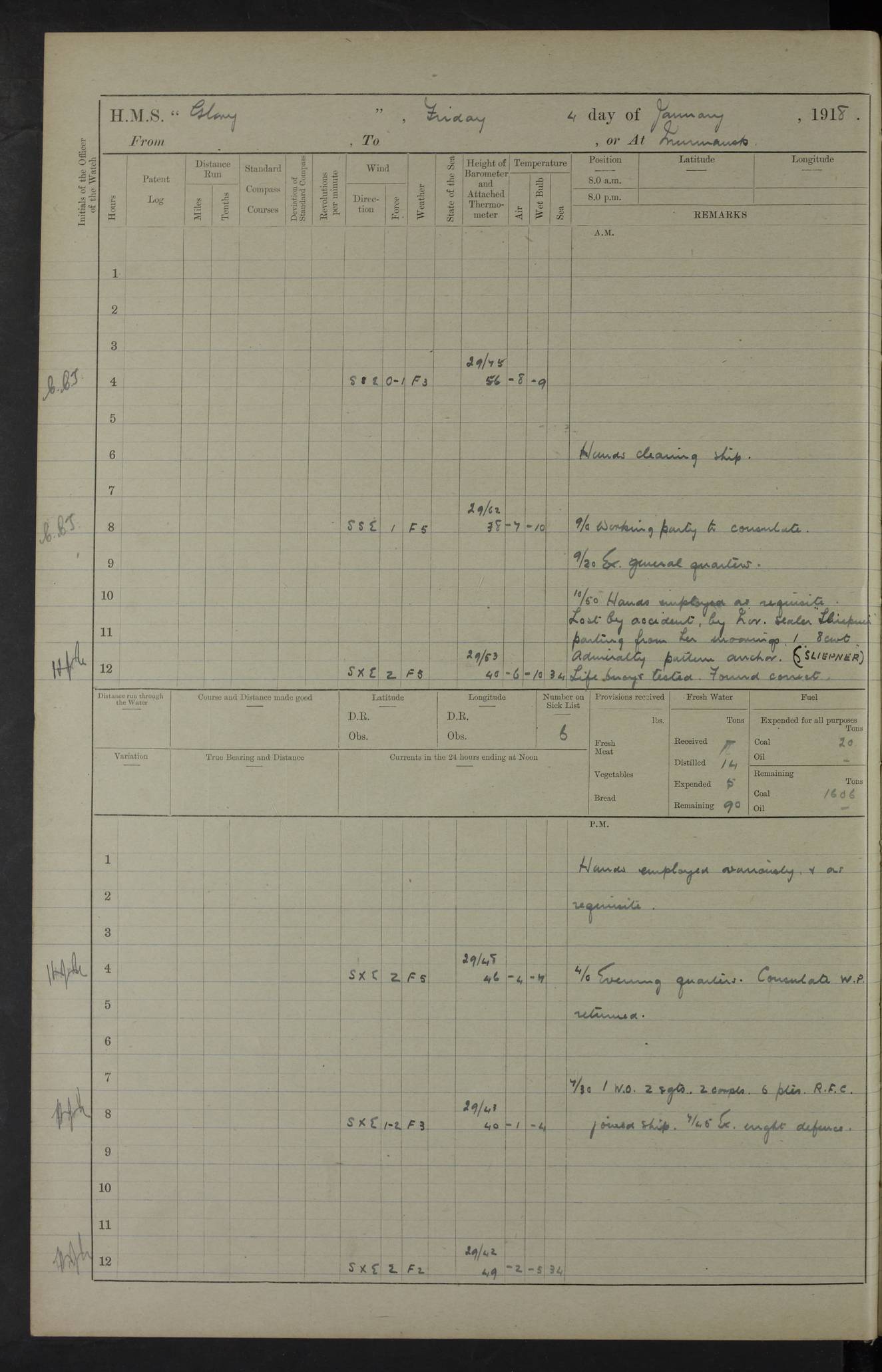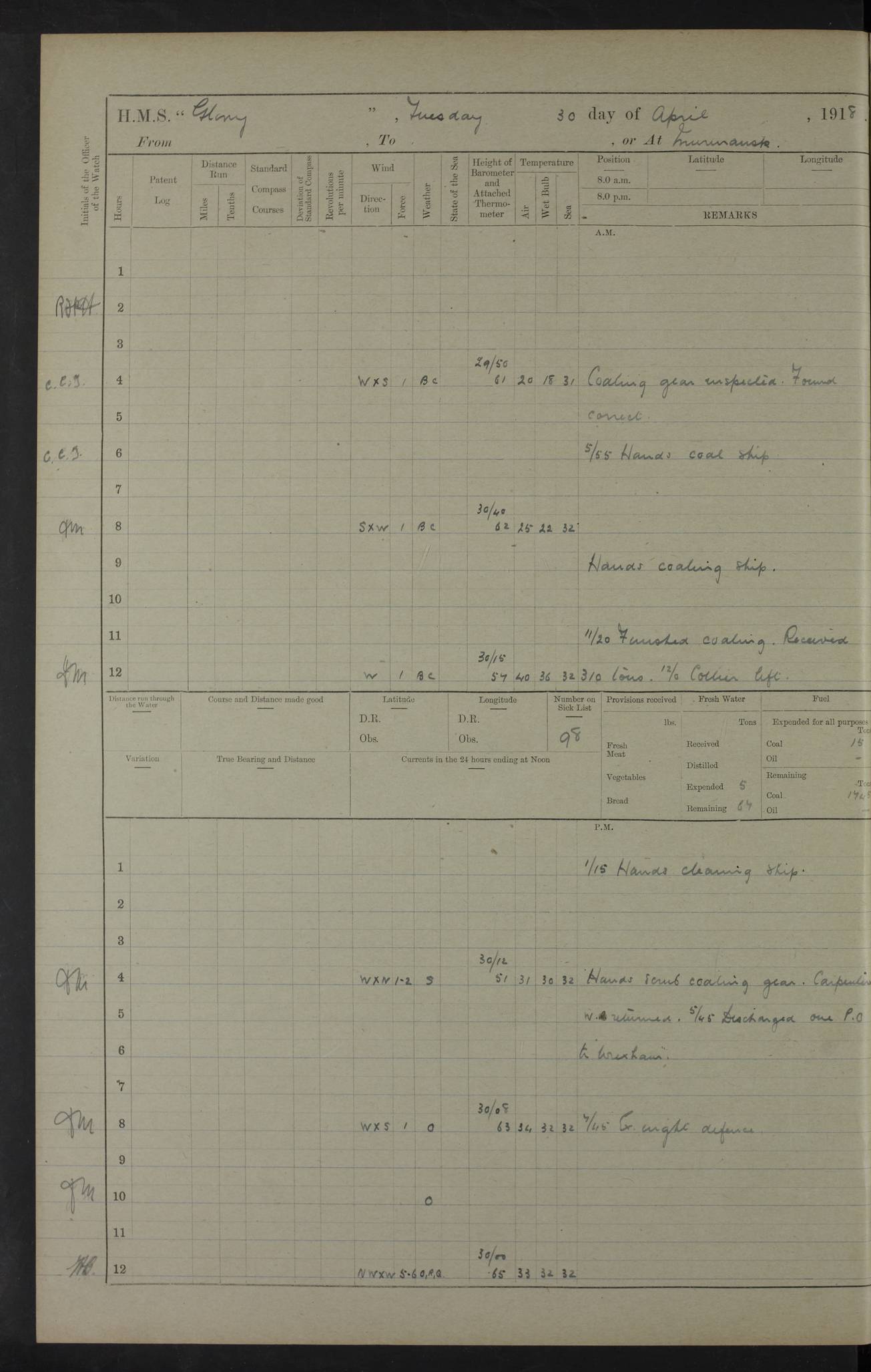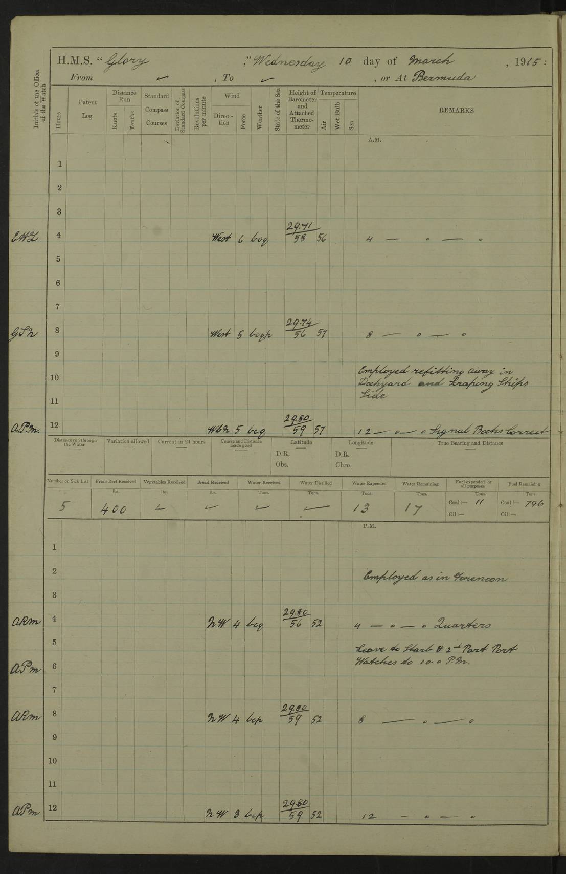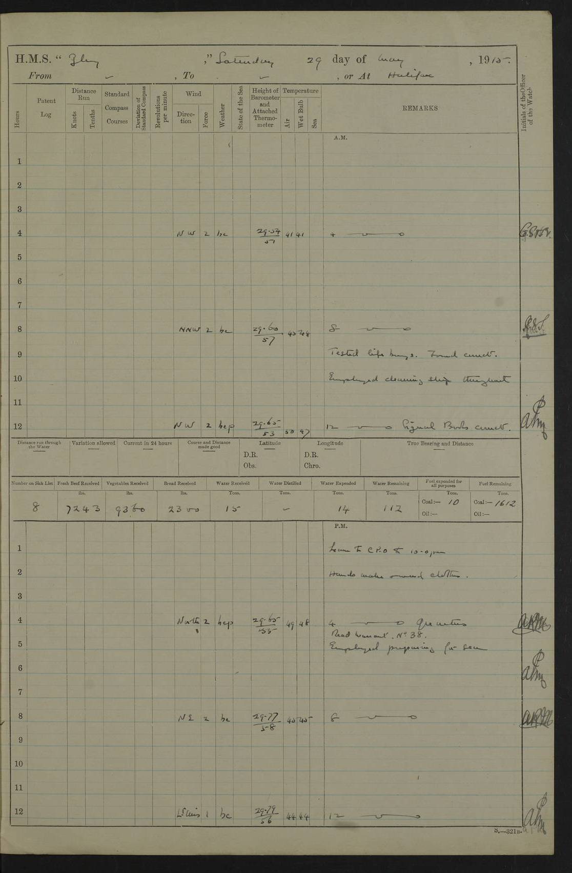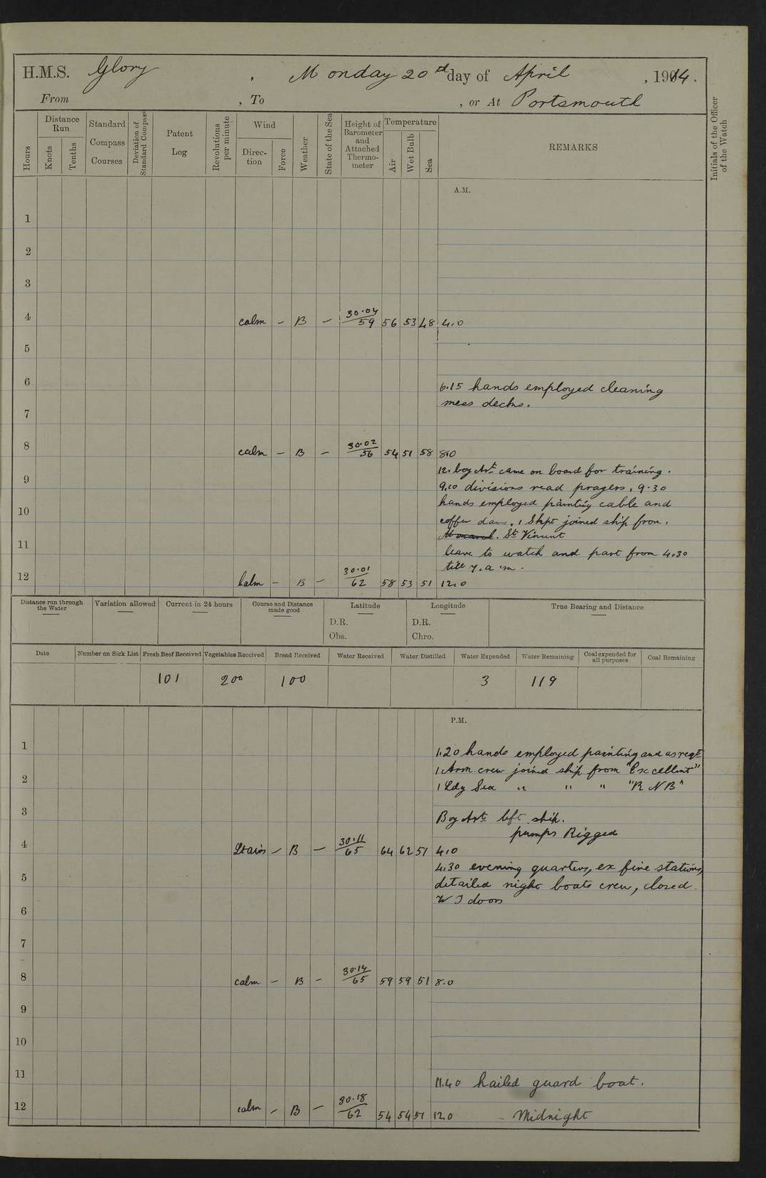 22 June 1915 At sea, Gibraltar to Lemnos Lat 36.1, Long -1.3 4.15am: Sighted land on starboard bow. 10.20am: Stopped port engine for repairs. 11.20am: proceeded with port engine. pm: a/c due to change in deviation. 10.00pm: Cape Tenez Light abeam, 18 miles. 4f73cd61a2fc8ea9030015f6: (https://s3.amazonaws.com:443/oldweather/ADM53-43015/0012_1.jpg) 23 June 1915 At sea, Gibraltar to Lemnos Lat 37.5, Long 4.8 Number on sick list: 4 5.00am: Secured from night defence stations. Placed anti-submarine guns. pm: Life saving appliances served out to men stationed in ? ?at abandon ship. 4f73cd61a2fc8ea9030015f7: (https://s3.amazonaws.com:443/oldweather/ADM53-43015/0013_0.jpg) 24 June 1915 At sea, Gibraltar to Lemnos Lat 37.4, Long 10.8 Position in log clearly bears no resemblance to the location of the ship. Position above is approximate and is based sighting of Zembra Island at 11.55am. 5.00am: Dispersed from night defence stations. Manned anti-submarine guns. am: Sighted two French torpedo boats. am: Torpedo boats passed to ~ No 362, 363. am: Sighted land on starboard beam. 11.55am: Zembra Island abeam, 25 miles. 2.00pm: Sighted Pantellaria S34ºE. 4.45pm: Pantellaria Light House abeam 12 miles. 4f73cd61a2fc8ea9030015f8: (https://s3.amazonaws.com:443/oldweather/ADM53-43015/0013_1.jpg) 25 June 1915 At sea, Gibraltar to Lemnos Lat 35.5, Long 16.7 2.10am: Gozo Light abeam 17 miles. 5.00am: Dispersed from night defence stations. Manned anti-submarine guns. 4f73cd61a2fc8ea9030015f9: (https://s3.amazonaws.com:443/oldweather/ADM53-43015/0014_0.jpg) 26 June 1915 At sea, Gibraltar to Lemnos Lat 35.5, Long 22.6 Number on sick list: 5 5.00am: Dispersed from night defence stations. Manned anti-submarine guns. am: Aired night clothing. am: marines at maxim practice on quarter deck. 2.00pm: Observed land on either bow. 3.00pm: Sighted French patrol destroyer. 4.15pm: Sighted French patrol destroyer. 9.40pm: Milo Peak N63ºW. 10.26pm: Polino Light abeam to port 5.5 miles. 4f73cd62a2fc8ea9030015fa: (https://s3.amazonaws.com:443/oldweather/ADM53-43015/0014_1.jpg) 27 June 1915 At sea and at Lemnos Lat 39.1, Long 24.4 From 0.50 to 3.05am sighting of multiple light houses. 3.50am: a/c to N39ºW and commenced to zig-zag. 5.00am: Dispersed from night defence stations and placed anti-submarine guns and look-outs. am: Lost overboard by accident Hazlewood fender, pat. 311, one in number. 10.30am: Held Divine Service onboard. pm: Met and signalled HMS Minerva on patrol duty. pm: Courses and speeds as requisite while waiting orders to approach Mudros. 3.00pm: Proceeded. 5.16pm: Increased to 90 revs, commenced to zig-zag. Course as requisite for Mudros. 7.00pm: Entered Mudros Bay. 7.47pm: Stopped. Let go port anchor in ‘M3’. 8.30pm: Darkened ship. pm: Manned one 6” and one 12 pdr. 4f73cd62a2fc8ea9030015fb: (https://s3.amazonaws.com:443/oldweather/ADM53-43015/0015_0.jpg) 28 June 1915 Mudros Bay, Lemnos Lat 39.89, Long 25.24 5,00am: HMS Vengeance entered harbour. HMS Vengeance was a pre-dreadnought of the Canopus class, launched in 1899 at Vickers, Barrow, and sold for scrapping in 1921. Details at http://en.wikipedia.org/wiki/HMS_Vengeance_(1899) . am/pm/: hands preparing for coaling and about ship’s work. pm: Collier Wabana secured alongside. 4f73cd62a2fc8ea9030015fc: (https://s3.amazonaws.com:443/oldweather/ADM53-43015/0015_1.jpg) 29 June 1915 Mudros Bay, Lemnos Lat 39.89, Long 25.24 5.15am: Commenced coaling. 2.00pm: Finished coaling. Collier left. 4f73cd62a2fc8ea9030015fd: (https://s3.amazonaws.com:443/oldweather/ADM53-43015/0016_0.jpg) 30 June 1915 Mudros Bay, Lemnos Lat 39.89, Long 25.24 am: Parties away sanding, and with fire engines onshore. am: Boats away disembarking troops. am: French Flagship Patrie sailed. The Patrie was a French pre-dreadnought, launched at La Seyne shipyard in 1903, and stricken in 1921. Details at http://en.wikipedia.org/wiki/French_battleship_Patrie . 6.30pm: Hands to bathe. 4f73cd63a2fc8ea9030015fe: (https://s3.amazonaws.com:443/oldweather/ADM53-43015/0016_1.jpg) 4f73cd63a2fc8ea9030015ff: (https://s3.amazonaws.com:443/oldweather/ADM53-43015/0017_0.jpg) 4f73cd63a2fc8ea903001600: (https://s3.amazonaws.com:443/oldweather/ADM53-43015/0017_1.jpg) 4f73cd63a2fc8ea903001601: (https://s3.amazonaws.com:443/oldweather/ADM53-43015/0018_0.jpg) 4f73cd64a2fc8ea903001602: (https://s3.amazonaws.com:443/oldweather/ADM53-43015/0018_1.jpg) LOGS FOR JULY 1915 From July to October 1915, HMS Glory spent her time at Port Mudros. Certain activities typically took place daily and are not generally noted in the pages below. These activities include: Lighting fires in the picket boat around 4am and drawing the fires in the late evening; Divisions at around 9–9.30am and Evening Quarters at 4pm; Darken ship at around 8.30pm; Daily ‘cleaning ship’, with variations thereof; SBC (for ‘Signal Books Correct’) at the watch changes. 4f73cd64a2fc8ea903001603: (https://s3.amazonaws.com:443/oldweather/ADM53-43016/0000_0.jpg) 4f73cd64a2fc8ea903001604: (https://s3.amazonaws.com:443/oldweather/ADM53-43016/0000_1.jpg) 4f73cd65a2fc8ea903001605: (https://s3.amazonaws.com:443/oldweather/ADM53-43016/0001_0.jpg) 4f73cd65a2fc8ea903001606: (https://s3.amazonaws.com:443/oldweather/ADM53-43016/0001_1.jpg) 1 July 1915 Port Mudros Lat 39.89, Long 25.24 6.30am: Landed working parties preparing boom defence ships. am: Discharged Acting Commander Rayne to Hector. Hector was a kite balloon ship. No further details readily available. 5.00pm: Tug T.10 made fast astern. 7.15pm: HMS Venerable went out. 7.30pm: HMS Chatham went out. HMS Chatham was a ‘Town’ cruiser and lead ship of her class. She was launched in 1911 at Chatham Dockyard and sold in 1926. Details at http://en.wikipedia.org/wiki/HMS_Chatham_(1911) . 4f73cd65a2fc8ea903001607: (https://s3.amazonaws.com:443/oldweather/ADM53-43016/0002_0.jpg) 2 July 1915 Port Mudros Lat 39.89, Long 25.24 5.35am: Landed working parties preparing boom defence ships. am/pm: Boom defence par