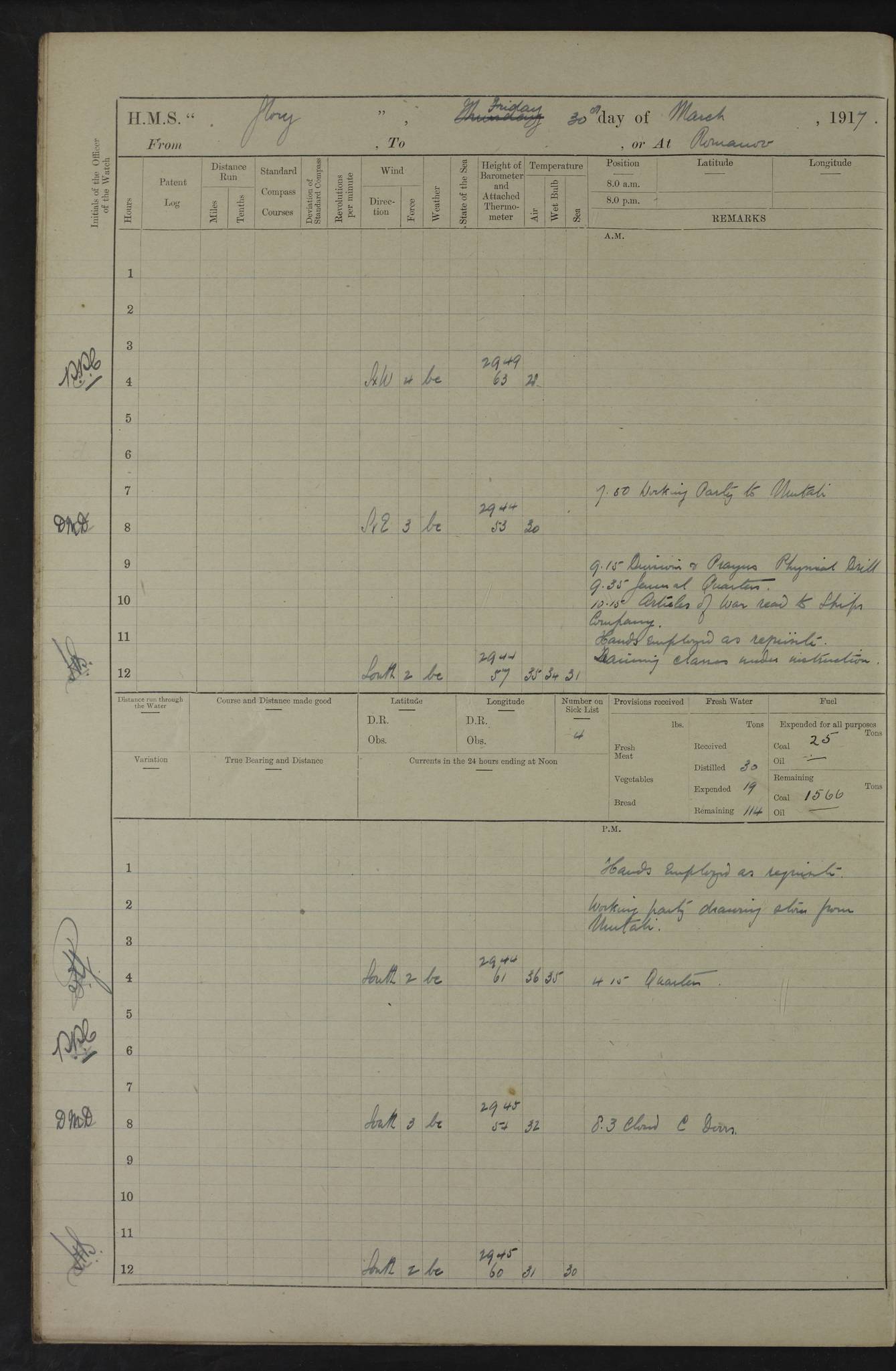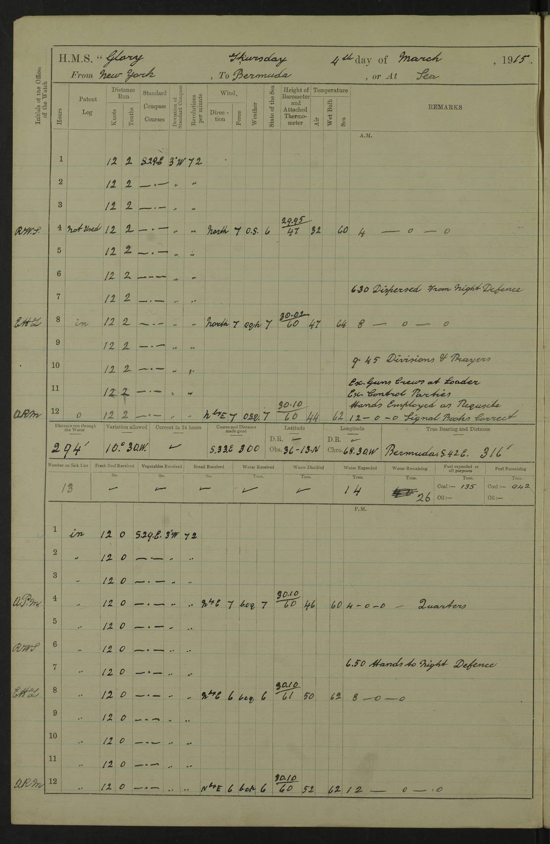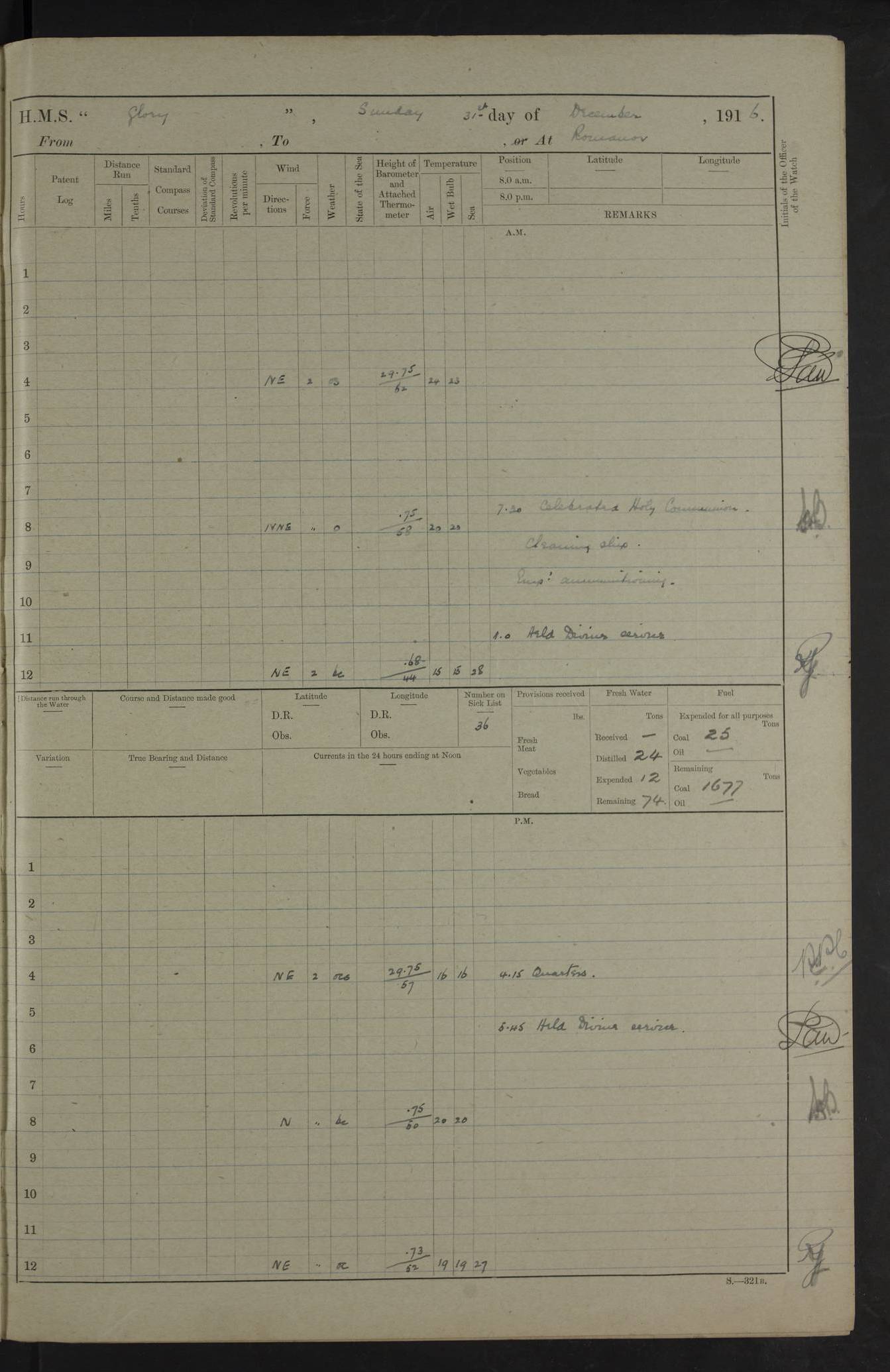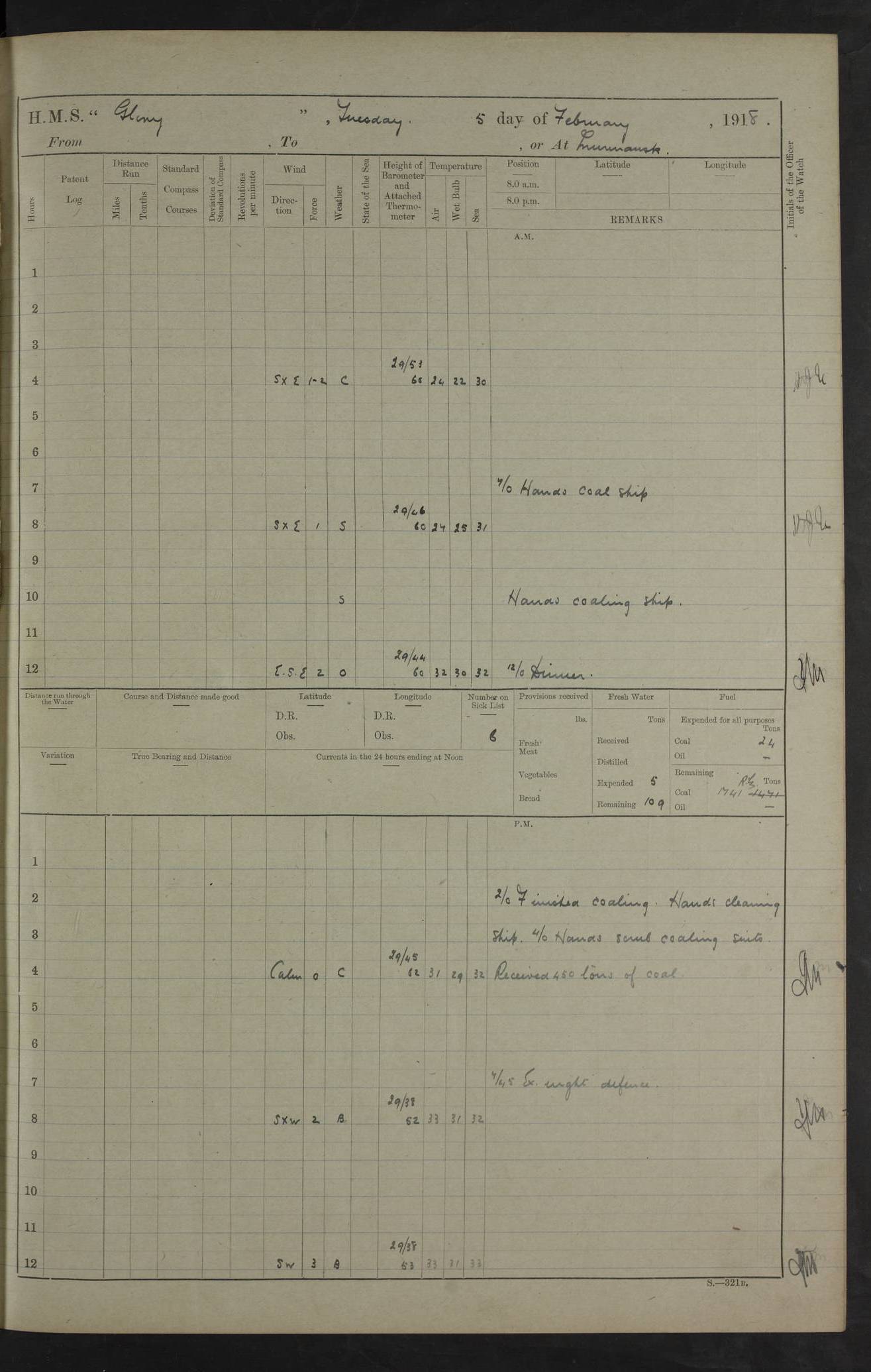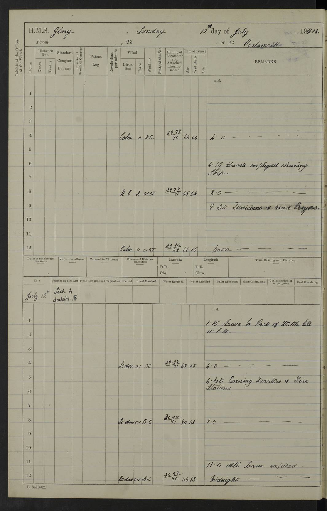 22 June 1915 At sea, Gibraltar to Lemnos Lat 36.1, Long -1.3 4.15am: Sighted land on starboard bow. 10.20am: Stopped port engine for repairs. 11.20am: proceeded with port engine. pm: a/c due to change in deviation. 10.00pm: Cape Tenez Light abeam, 18 miles. 4f73cd61a2fc8ea9030015f6: (https://s3.amazonaws.com:443/oldweather/ADM53-43015/0012_1.jpg) 23 June 1915 At sea, Gibraltar to Lemnos Lat 37.5, Long 4.8 Number on sick list: 4 5.00am: Secured from night defence stations. Placed anti-submarine guns. pm: Life saving appliances served out to men stationed in ? ?at abandon ship. 4f73cd61a2fc8ea9030015f7: (https://s3.amazonaws.com:443/oldweather/ADM53-43015/0013_0.jpg) 24 June 1915 At sea, Gibraltar to Lemnos Lat 37.4, Long 10.8 Position in log clearly bears no resemblance to the location of the ship. Position above is approximate and is based sighting of Zembra Island at 11.55am. 5.00am: Dispersed from night defence stations. Manned anti-submarine guns. am: Sighted two French torpedo boats. am: Torpedo boats passed to ~ No 362, 363. am: Sighted land on starboard beam. 11.55am: Zembra Island abeam, 25 miles. 2.00pm: Sighted Pantellaria S34ºE. 4.45pm: Pantellaria Light House abeam 12 miles. 4f73cd61a2fc8ea9030015f8: (https://s3.amazonaws.com:443/oldweather/ADM53-43015/0013_1.jpg) 25 June 1915 At sea, Gibraltar to Lemnos Lat 35.5, Long 16.7 2.10am: Gozo Light abeam 17 miles. 5.00am: Dispersed from night defence stations. Manned anti-submarine guns. 4f73cd61a2fc8ea9030015f9: (https://s3.amazonaws.com:443/oldweather/ADM53-43015/0014_0.jpg) 26 June 1915 At sea, Gibraltar to Lemnos Lat 35.5, Long 22.6 Number on sick list: 5 5.00am: Dispersed from night defence stations. Manned anti-submarine guns. am: Aired night clothing. am: marines at maxim practice on quarter deck. 2.00pm: Observed land on either bow. 3.00pm: Sighted French patrol destroyer. 4.15pm: Sighted French patrol destroyer. 9.40pm: Milo Peak N63ºW. 10.26pm: Polino Light abeam to port 5.5 miles. 4f73cd62a2fc8ea9030015fa: (https://s3.amazonaws.com:443/oldweather/ADM53-43015/0014_1.jpg) 27 June 1915 At sea and at Lemnos Lat 39.1, Long 24.4 From 0.50 to 3.05am sighting of multiple light houses. 3.50am: a/c to N39ºW and commenced to zig-zag. 5.00am: Dispersed from night defence stations and placed anti-submarine guns and look-outs. am: Lost overboard by accident Hazlewood fender, pat. 311, one in number. 10.30am: Held Divine Service onboard. pm: Met and signalled HMS Minerva on patrol duty. pm: Courses and speeds as requisite while waiting orders to approach Mudros. 3.00pm: Proceeded. 5.16pm: Increased to 90 revs, commenced to zig-zag. Course as requisite for Mudros. 7.00pm: Entered Mudros Bay. 7.47pm: Stopped. Let go port anchor in ‘M3’. 8.30pm: Darkened ship. pm: Manned one 6” and one 12 pdr. 4f73cd62a2fc8ea9030015fb: (https://s3.amazonaws.com:443/oldweather/ADM53-43015/0015_0.jpg) 28 June 1915 Mudros Bay, Lemnos Lat 39.89, Long 25.24 5,00am: HMS Vengeance entered harbour. HMS Vengeance was a pre-dreadnought of the Canopus class, launched in 1899 at Vickers, Barrow, and sold for scrapping in 1921. Details at http://en.wikipedia.org/wiki/HMS_Vengeance_(1899) . am/pm/: hands preparing for coaling and about ship’s work. pm: Collier Wabana secured alongside. 4f73cd62a2fc8ea9030015fc: (https://s3.amazonaws.com:443/oldweather/ADM53-43015/0015_1.jpg) 29 June 1915 Mudros Bay, Lemnos Lat 39.89, Long 25.24 5.15am: Commenced coaling. 2.00pm: Finished coaling. Collier left. 4f73cd62a2fc8ea9030015fd: (https://s3.amazonaws.com:443/oldweather/ADM53-43015/0016_0.jpg) 30 June 1915 Mudros Bay, Lemnos Lat 39.89, Long 25.24 am: Parties away sanding, and with fire engines onshore. am: Boats away disembarking troops. am: French Flagship Patrie sailed. The Patrie was a French pre-dreadnought, launched at La Seyne shipyard in 1903, and stricken in 1921. Details at http://en.wikipedia.org/wiki/French_battleship_Patrie . 6.30pm: Hands to bathe. 4f73cd63a2fc8ea9030015fe: (https://s3.amazonaws.com:443/oldweather/ADM53-43015/0016_1.jpg) 4f73cd63a2fc8ea9030015ff: (https://s3.amazonaws.com:443/oldweather/ADM53-43015/0017_0.jpg) 4f73cd63a2fc8ea903001600: (https://s3.amazonaws.com:443/oldweather/ADM53-43015/0017_1.jpg) 4f73cd63a2fc8ea903001601: (https://s3.amazonaws.com:443/oldweather/ADM53-43015/0018_0.jpg) 4f73cd64a2fc8ea903001602: (https://s3.amazonaws.com:443/oldweather/ADM53-43015/0018_1.jpg) LOGS FOR JULY 1915 From July to October 1915, HMS Glory spent her time at Port Mudros. Certain activities typically took place daily and are not generally noted in the pages below. These activities include: Lighting fires in the picket boat around 4am and drawing the fires in the late evening; Divisions at around 9–9.30am and Evening Quarters at 4pm; Darken ship at around 8.30pm; Daily ‘cleaning ship’, with variations thereof; SBC (for ‘Signal Books Correct’) at the watch changes. 4f73cd64a2fc8ea903001603: (https://s3.amazonaws.com:443/oldweather/ADM53-43016/0000_0.jpg) 4f73cd64a2fc8ea903001604: (https://s3.amazonaws.com:443/oldweather/ADM53-43016/0000_1.jpg) 4f73cd65a2fc8ea903001605: (https://s3.amazonaws.com:443/oldweather/ADM53-43016/0001_0.jpg) 4f73cd65a2fc8ea903001606: (https://s3.amazonaws.com:443/oldweather/ADM53-43016/0001_1.jpg) 1 July 1915 Port Mudros Lat 39.89, Long 25.24 6.30am: Landed working parties preparing boom defence ships. am: Discharged Acting Commander Rayne to Hector. Hector was a kite balloon ship. No further details readily available. 5.00pm: Tug T.10 made fast astern. 7.15pm: HMS Venerable went out. 7.30pm: HMS Chatham went out. HMS Chatham was a ‘Town’ cruiser and lead ship of her class. She was launched in 1911 at Chatham Dockyard and sold in 1926. Details at http://en.wikipedia.org/wiki/HMS_Chatham_(1911) . 4f73cd65a2fc8ea903001607: (https://s3.amazonaws.com:443/oldweather/ADM53-43016/0002_0.jpg) 2 July 1915 Port Mudros Lat 39.89, Long 25.24 5.35am: Landed working parties preparing boom defence ships. am/pm: Boom defence par