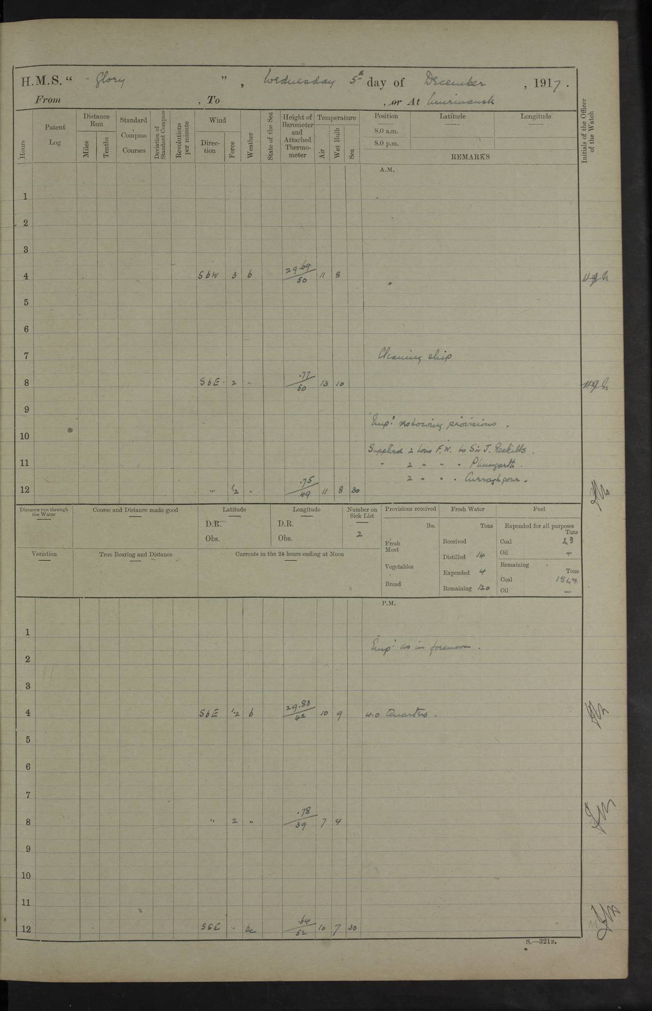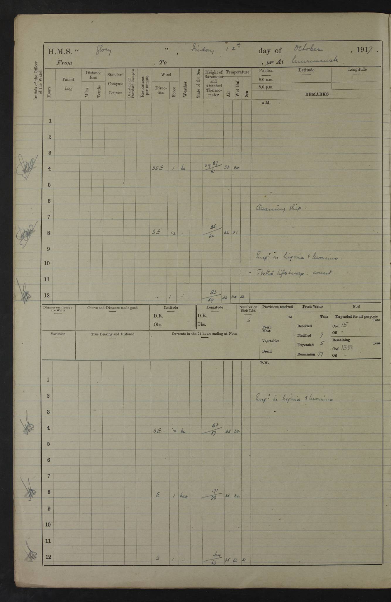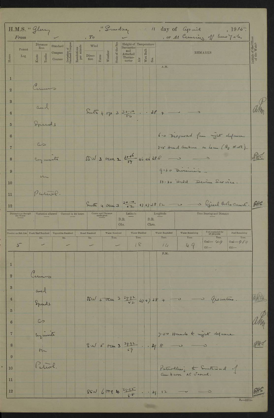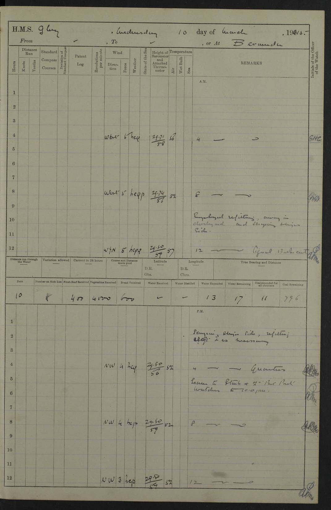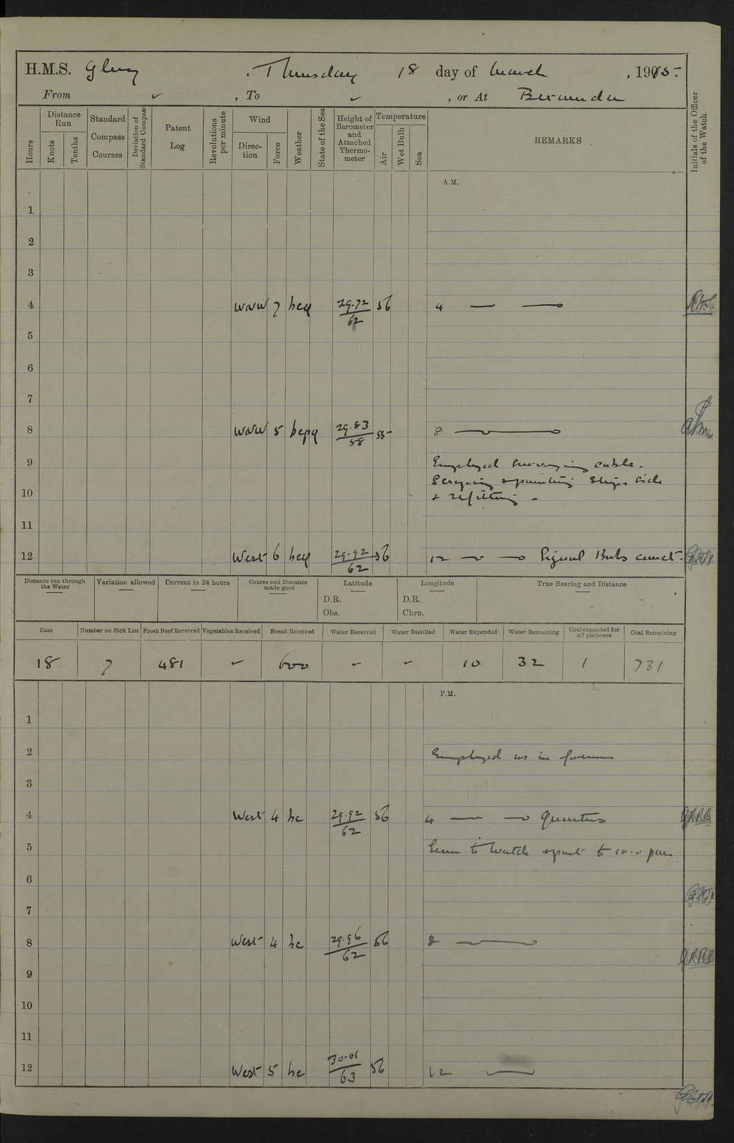 22 June 1915 At sea, Gibraltar to Lemnos Lat 36.1, Long -1.3 4.15am: Sighted land on starboard bow. 10.20am: Stopped port engine for repairs. 11.20am: proceeded with port engine. pm: a/c due to change in deviation. 10.00pm: Cape Tenez Light abeam, 18 miles. 4f73cd61a2fc8ea9030015f6: (https://s3.amazonaws.com:443/oldweather/ADM53-43015/0012_1.jpg) 23 June 1915 At sea, Gibraltar to Lemnos Lat 37.5, Long 4.8 Number on sick list: 4 5.00am: Secured from night defence stations. Placed anti-submarine guns. pm: Life saving appliances served out to men stationed in ? ?at abandon ship. 4f73cd61a2fc8ea9030015f7: (https://s3.amazonaws.com:443/oldweather/ADM53-43015/0013_0.jpg) 24 June 1915 At sea, Gibraltar to Lemnos Lat 37.4, Long 10.8 Position in log clearly bears no resemblance to the location of the ship. Position above is approximate and is based sighting of Zembra Island at 11.55am. 5.00am: Dispersed from night defence stations. Manned anti-submarine guns. am: Sighted two French torpedo boats. am: Torpedo boats passed to ~ No 362, 363. am: Sighted land on starboard beam. 11.55am: Zembra Island abeam, 25 miles. 2.00pm: Sighted Pantellaria S34ºE. 4.45pm: Pantellaria Light House abeam 12 miles. 4f73cd61a2fc8ea9030015f8: (https://s3.amazonaws.com:443/oldweather/ADM53-43015/0013_1.jpg) 25 June 1915 At sea, Gibraltar to Lemnos Lat 35.5, Long 16.7 2.10am: Gozo Light abeam 17 miles. 5.00am: Dispersed from night defence stations. Manned anti-submarine guns. 4f73cd61a2fc8ea9030015f9: (https://s3.amazonaws.com:443/oldweather/ADM53-43015/0014_0.jpg) 26 June 1915 At sea, Gibraltar to Lemnos Lat 35.5, Long 22.6 Number on sick list: 5 5.00am: Dispersed from night defence stations. Manned anti-submarine guns. am: Aired night clothing. am: marines at maxim practice on quarter deck. 2.00pm: Observed land on either bow. 3.00pm: Sighted French patrol destroyer. 4.15pm: Sighted French patrol destroyer. 9.40pm: Milo Peak N63ºW. 10.26pm: Polino Light abeam to port 5.5 miles. 4f73cd62a2fc8ea9030015fa: (https://s3.amazonaws.com:443/oldweather/ADM53-43015/0014_1.jpg) 27 June 1915 At sea and at Lemnos Lat 39.1, Long 24.4 From 0.50 to 3.05am sighting of multiple light houses. 3.50am: a/c to N39ºW and commenced to zig-zag. 5.00am: Dispersed from night defence stations and placed anti-submarine guns and look-outs. am: Lost overboard by accident Hazlewood fender, pat. 311, one in number. 10.30am: Held Divine Service onboard. pm: Met and signalled HMS Minerva on patrol duty. pm: Courses and speeds as requisite while waiting orders to approach Mudros. 3.00pm: Proceeded. 5.16pm: Increased to 90 revs, commenced to zig-zag. Course as requisite for Mudros. 7.00pm: Entered Mudros Bay. 7.47pm: Stopped. Let go port anchor in ‘M3’. 8.30pm: Darkened ship. pm: Manned one 6” and one 12 pdr. 4f73cd62a2fc8ea9030015fb: (https://s3.amazonaws.com:443/oldweather/ADM53-43015/0015_0.jpg) 28 June 1915 Mudros Bay, Lemnos Lat 39.89, Long 25.24 5,00am: HMS Vengeance entered harbour. HMS Vengeance was a pre-dreadnought of the Canopus class, launched in 1899 at Vickers, Barrow, and sold for scrapping in 1921. Details at http://en.wikipedia.org/wiki/HMS_Vengeance_(1899) . am/pm/: hands preparing for coaling and about ship’s work. pm: Collier Wabana secured alongside. 4f73cd62a2fc8ea9030015fc: (https://s3.amazonaws.com:443/oldweather/ADM53-43015/0015_1.jpg) 29 June 1915 Mudros Bay, Lemnos Lat 39.89, Long 25.24 5.15am: Commenced coaling. 2.00pm: Finished coaling. Collier left. 4f73cd62a2fc8ea9030015fd: (https://s3.amazonaws.com:443/oldweather/ADM53-43015/0016_0.jpg) 30 June 1915 Mudros Bay, Lemnos Lat 39.89, Long 25.24 am: Parties away sanding, and with fire engines onshore. am: Boats away disembarking troops. am: French Flagship Patrie sailed. The Patrie was a French pre-dreadnought, launched at La Seyne shipyard in 1903, and stricken in 1921. Details at http://en.wikipedia.org/wiki/French_battleship_Patrie . 6.30pm: Hands to bathe. 4f73cd63a2fc8ea9030015fe: (https://s3.amazonaws.com:443/oldweather/ADM53-43015/0016_1.jpg) 4f73cd63a2fc8ea9030015ff: (https://s3.amazonaws.com:443/oldweather/ADM53-43015/0017_0.jpg) 4f73cd63a2fc8ea903001600: (https://s3.amazonaws.com:443/oldweather/ADM53-43015/0017_1.jpg) 4f73cd63a2fc8ea903001601: (https://s3.amazonaws.com:443/oldweather/ADM53-43015/0018_0.jpg) 4f73cd64a2fc8ea903001602: (https://s3.amazonaws.com:443/oldweather/ADM53-43015/0018_1.jpg) LOGS FOR JULY 1915 From July to October 1915, HMS Glory spent her time at Port Mudros. Certain activities typically took place daily and are not generally noted in the pages below. These activities include: Lighting fires in the picket boat around 4am and drawing the fires in the late evening; Divisions at around 9–9.30am and Evening Quarters at 4pm; Darken ship at around 8.30pm; Daily ‘cleaning ship’, with variations thereof; SBC (for ‘Signal Books Correct’) at the watch changes. 4f73cd64a2fc8ea903001603: (https://s3.amazonaws.com:443/oldweather/ADM53-43016/0000_0.jpg) 4f73cd64a2fc8ea903001604: (https://s3.amazonaws.com:443/oldweather/ADM53-43016/0000_1.jpg) 4f73cd65a2fc8ea903001605: (https://s3.amazonaws.com:443/oldweather/ADM53-43016/0001_0.jpg) 4f73cd65a2fc8ea903001606: (https://s3.amazonaws.com:443/oldweather/ADM53-43016/0001_1.jpg) 1 July 1915 Port Mudros Lat 39.89, Long 25.24 6.30am: Landed working parties preparing boom defence ships. am: Discharged Acting Commander Rayne to Hector. Hector was a kite balloon ship. No further details readily available. 5.00pm: Tug T.10 made fast astern. 7.15pm: HMS Venerable went out. 7.30pm: HMS Chatham went out. HMS Chatham was a ‘Town’ cruiser and lead ship of her class. She was launched in 1911 at Chatham Dockyard and sold in 1926. Details at http://en.wikipedia.org/wiki/HMS_Chatham_(1911) . 4f73cd65a2fc8ea903001607: (https://s3.amazonaws.com:443/oldweather/ADM53-43016/0002_0.jpg) 2 July 1915 Port Mudros Lat 39.89, Long 25.24 5.35am: Landed working parties preparing boom defence ships. am/pm: Boom defence par