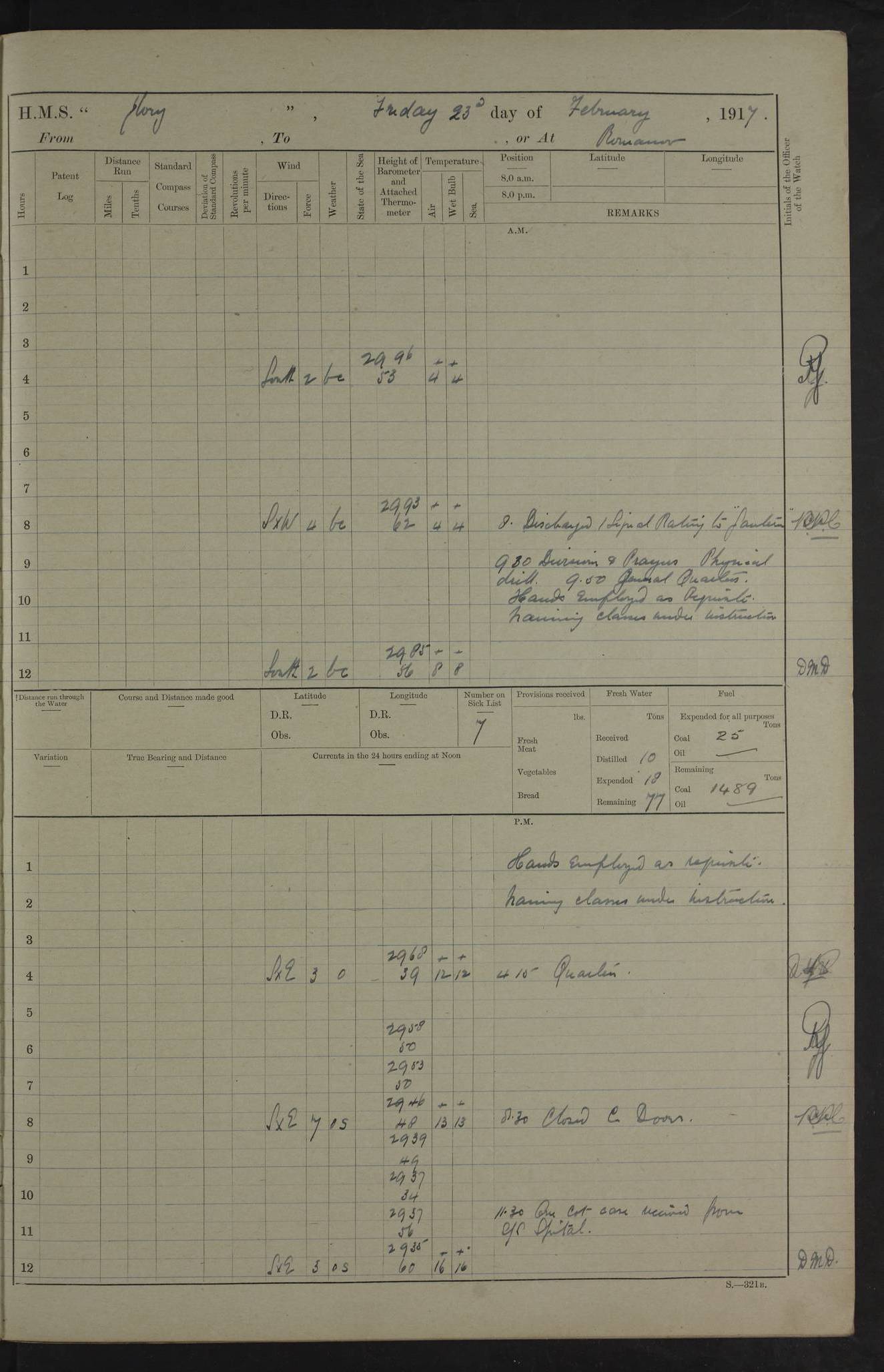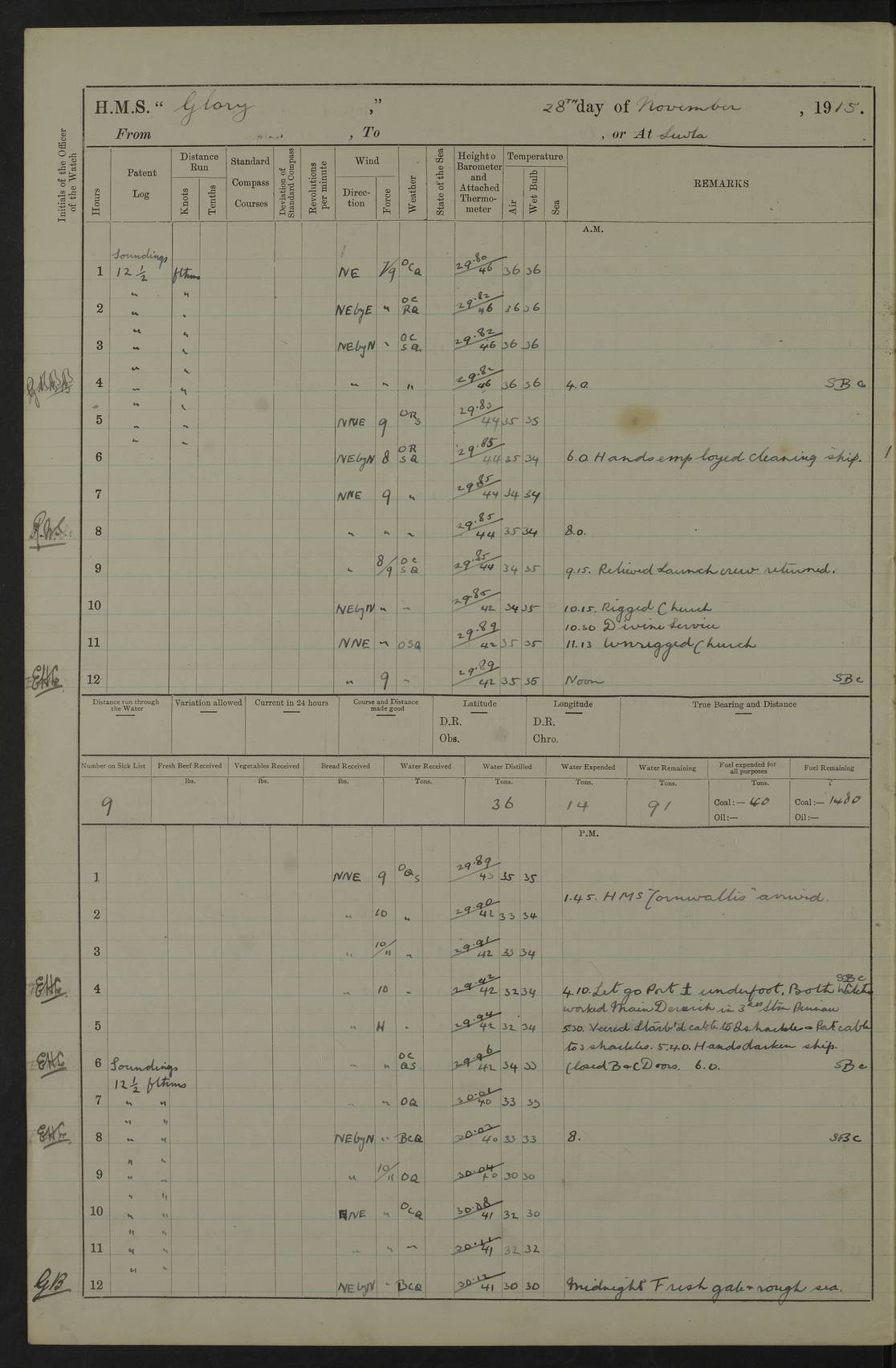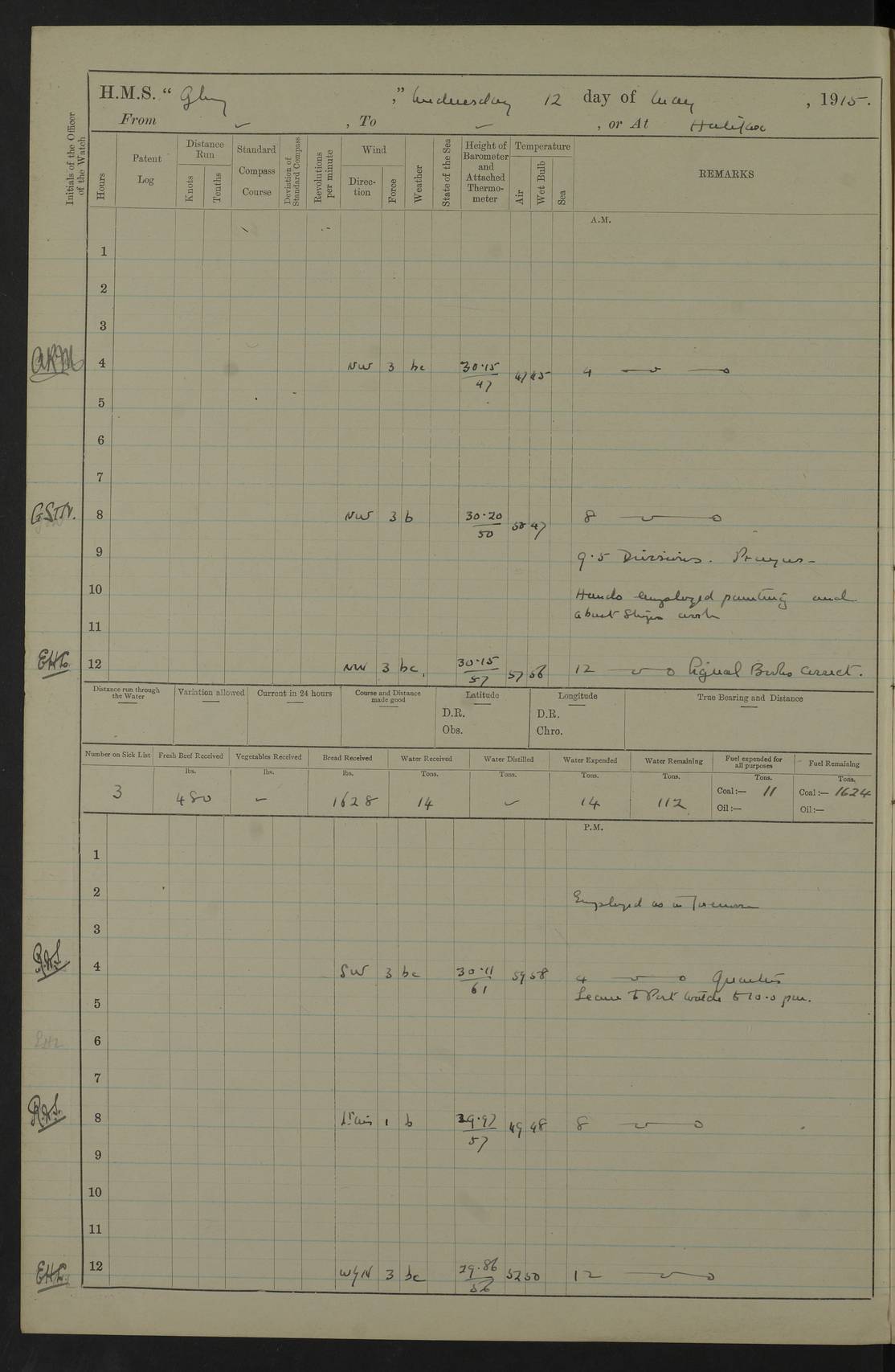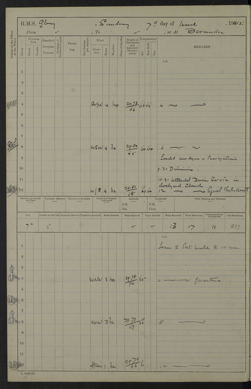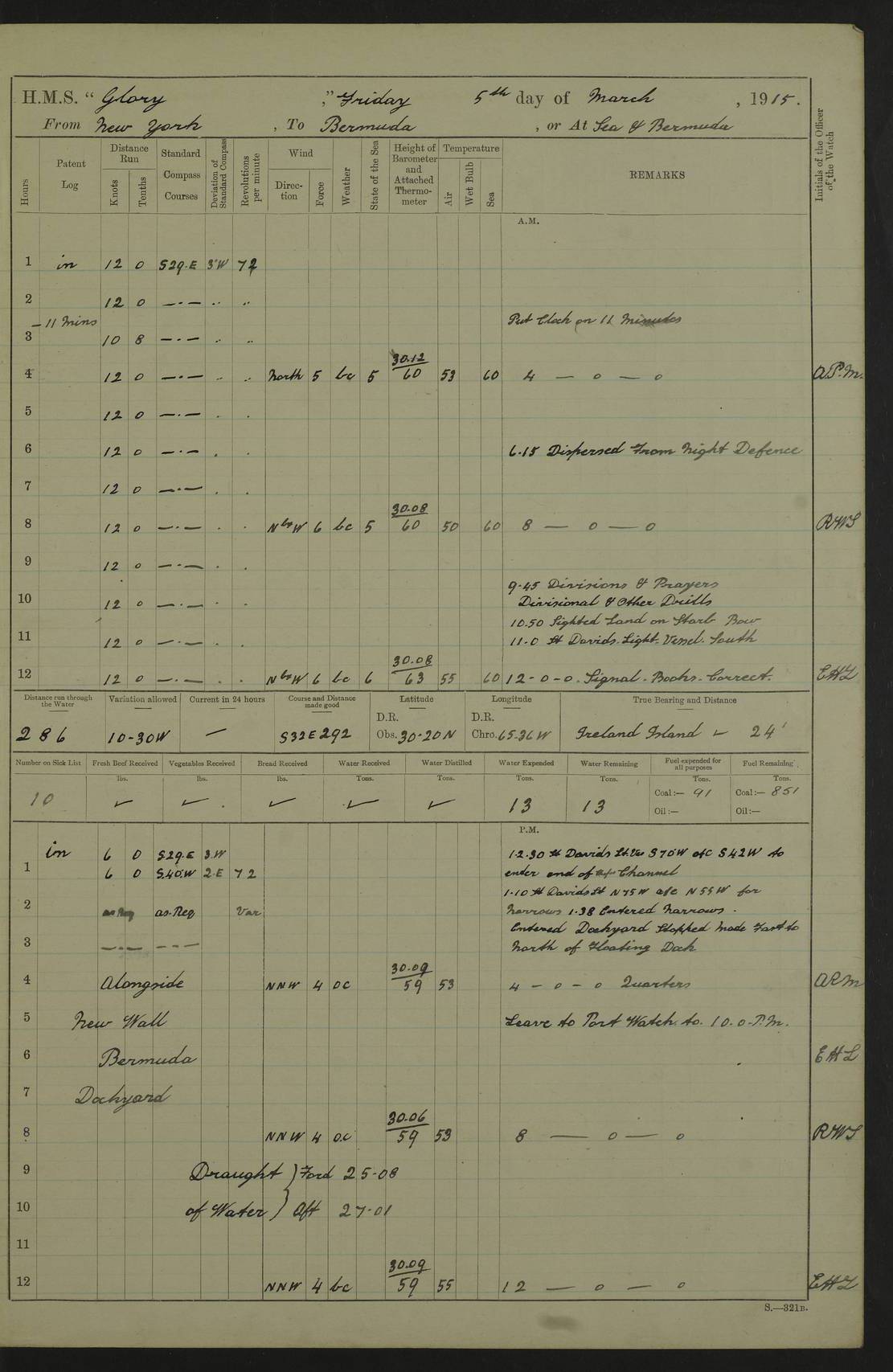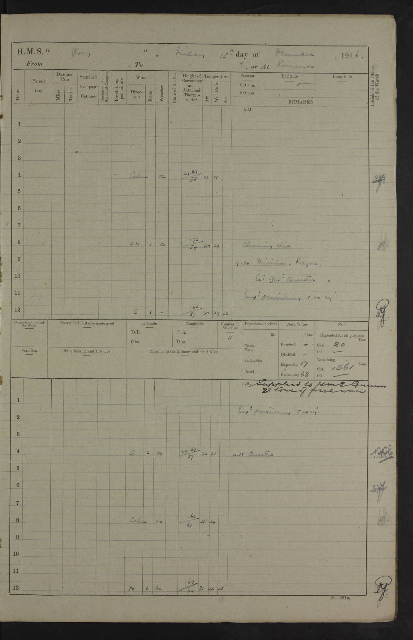 22 June 1915 At sea, Gibraltar to Lemnos Lat 36.1, Long -1.3 4.15am: Sighted land on starboard bow. 10.20am: Stopped port engine for repairs. 11.20am: proceeded with port engine. pm: a/c due to change in deviation. 10.00pm: Cape Tenez Light abeam, 18 miles. 4f73cd61a2fc8ea9030015f6: (https://s3.amazonaws.com:443/oldweather/ADM53-43015/0012_1.jpg) 23 June 1915 At sea, Gibraltar to Lemnos Lat 37.5, Long 4.8 Number on sick list: 4 5.00am: Secured from night defence stations. Placed anti-submarine guns. pm: Life saving appliances served out to men stationed in ? ?at abandon ship. 4f73cd61a2fc8ea9030015f7: (https://s3.amazonaws.com:443/oldweather/ADM53-43015/0013_0.jpg) 24 June 1915 At sea, Gibraltar to Lemnos Lat 37.4, Long 10.8 Position in log clearly bears no resemblance to the location of the ship. Position above is approximate and is based sighting of Zembra Island at 11.55am. 5.00am: Dispersed from night defence stations. Manned anti-submarine guns. am: Sighted two French torpedo boats. am: Torpedo boats passed to ~ No 362, 363. am: Sighted land on starboard beam. 11.55am: Zembra Island abeam, 25 miles. 2.00pm: Sighted Pantellaria S34ºE. 4.45pm: Pantellaria Light House abeam 12 miles. 4f73cd61a2fc8ea9030015f8: (https://s3.amazonaws.com:443/oldweather/ADM53-43015/0013_1.jpg) 25 June 1915 At sea, Gibraltar to Lemnos Lat 35.5, Long 16.7 2.10am: Gozo Light abeam 17 miles. 5.00am: Dispersed from night defence stations. Manned anti-submarine guns. 4f73cd61a2fc8ea9030015f9: (https://s3.amazonaws.com:443/oldweather/ADM53-43015/0014_0.jpg) 26 June 1915 At sea, Gibraltar to Lemnos Lat 35.5, Long 22.6 Number on sick list: 5 5.00am: Dispersed from night defence stations. Manned anti-submarine guns. am: Aired night clothing. am: marines at maxim practice on quarter deck. 2.00pm: Observed land on either bow. 3.00pm: Sighted French patrol destroyer. 4.15pm: Sighted French patrol destroyer. 9.40pm: Milo Peak N63ºW. 10.26pm: Polino Light abeam to port 5.5 miles. 4f73cd62a2fc8ea9030015fa: (https://s3.amazonaws.com:443/oldweather/ADM53-43015/0014_1.jpg) 27 June 1915 At sea and at Lemnos Lat 39.1, Long 24.4 From 0.50 to 3.05am sighting of multiple light houses. 3.50am: a/c to N39ºW and commenced to zig-zag. 5.00am: Dispersed from night defence stations and placed anti-submarine guns and look-outs. am: Lost overboard by accident Hazlewood fender, pat. 311, one in number. 10.30am: Held Divine Service onboard. pm: Met and signalled HMS Minerva on patrol duty. pm: Courses and speeds as requisite while waiting orders to approach Mudros. 3.00pm: Proceeded. 5.16pm: Increased to 90 revs, commenced to zig-zag. Course as requisite for Mudros. 7.00pm: Entered Mudros Bay. 7.47pm: Stopped. Let go port anchor in ‘M3’. 8.30pm: Darkened ship. pm: Manned one 6” and one 12 pdr. 4f73cd62a2fc8ea9030015fb: (https://s3.amazonaws.com:443/oldweather/ADM53-43015/0015_0.jpg) 28 June 1915 Mudros Bay, Lemnos Lat 39.89, Long 25.24 5,00am: HMS Vengeance entered harbour. HMS Vengeance was a pre-dreadnought of the Canopus class, launched in 1899 at Vickers, Barrow, and sold for scrapping in 1921. Details at http://en.wikipedia.org/wiki/HMS_Vengeance_(1899) . am/pm/: hands preparing for coaling and about ship’s work. pm: Collier Wabana secured alongside. 4f73cd62a2fc8ea9030015fc: (https://s3.amazonaws.com:443/oldweather/ADM53-43015/0015_1.jpg) 29 June 1915 Mudros Bay, Lemnos Lat 39.89, Long 25.24 5.15am: Commenced coaling. 2.00pm: Finished coaling. Collier left. 4f73cd62a2fc8ea9030015fd: (https://s3.amazonaws.com:443/oldweather/ADM53-43015/0016_0.jpg) 30 June 1915 Mudros Bay, Lemnos Lat 39.89, Long 25.24 am: Parties away sanding, and with fire engines onshore. am: Boats away disembarking troops. am: French Flagship Patrie sailed. The Patrie was a French pre-dreadnought, launched at La Seyne shipyard in 1903, and stricken in 1921. Details at http://en.wikipedia.org/wiki/French_battleship_Patrie . 6.30pm: Hands to bathe. 4f73cd63a2fc8ea9030015fe: (https://s3.amazonaws.com:443/oldweather/ADM53-43015/0016_1.jpg) 4f73cd63a2fc8ea9030015ff: (https://s3.amazonaws.com:443/oldweather/ADM53-43015/0017_0.jpg) 4f73cd63a2fc8ea903001600: (https://s3.amazonaws.com:443/oldweather/ADM53-43015/0017_1.jpg) 4f73cd63a2fc8ea903001601: (https://s3.amazonaws.com:443/oldweather/ADM53-43015/0018_0.jpg) 4f73cd64a2fc8ea903001602: (https://s3.amazonaws.com:443/oldweather/ADM53-43015/0018_1.jpg) LOGS FOR JULY 1915 From July to October 1915, HMS Glory spent her time at Port Mudros. Certain activities typically took place daily and are not generally noted in the pages below. These activities include: Lighting fires in the picket boat around 4am and drawing the fires in the late evening; Divisions at around 9–9.30am and Evening Quarters at 4pm; Darken ship at around 8.30pm; Daily ‘cleaning ship’, with variations thereof; SBC (for ‘Signal Books Correct’) at the watch changes. 4f73cd64a2fc8ea903001603: (https://s3.amazonaws.com:443/oldweather/ADM53-43016/0000_0.jpg) 4f73cd64a2fc8ea903001604: (https://s3.amazonaws.com:443/oldweather/ADM53-43016/0000_1.jpg) 4f73cd65a2fc8ea903001605: (https://s3.amazonaws.com:443/oldweather/ADM53-43016/0001_0.jpg) 4f73cd65a2fc8ea903001606: (https://s3.amazonaws.com:443/oldweather/ADM53-43016/0001_1.jpg) 1 July 1915 Port Mudros Lat 39.89, Long 25.24 6.30am: Landed working parties preparing boom defence ships. am: Discharged Acting Commander Rayne to Hector. Hector was a kite balloon ship. No further details readily available. 5.00pm: Tug T.10 made fast astern. 7.15pm: HMS Venerable went out. 7.30pm: HMS Chatham went out. HMS Chatham was a ‘Town’ cruiser and lead ship of her class. She was launched in 1911 at Chatham Dockyard and sold in 1926. Details at http://en.wikipedia.org/wiki/HMS_Chatham_(1911) . 4f73cd65a2fc8ea903001607: (https://s3.amazonaws.com:443/oldweather/ADM53-43016/0002_0.jpg) 2 July 1915 Port Mudros Lat 39.89, Long 25.24 5.35am: Landed working parties preparing boom defence ships. am/pm: Boom defence par