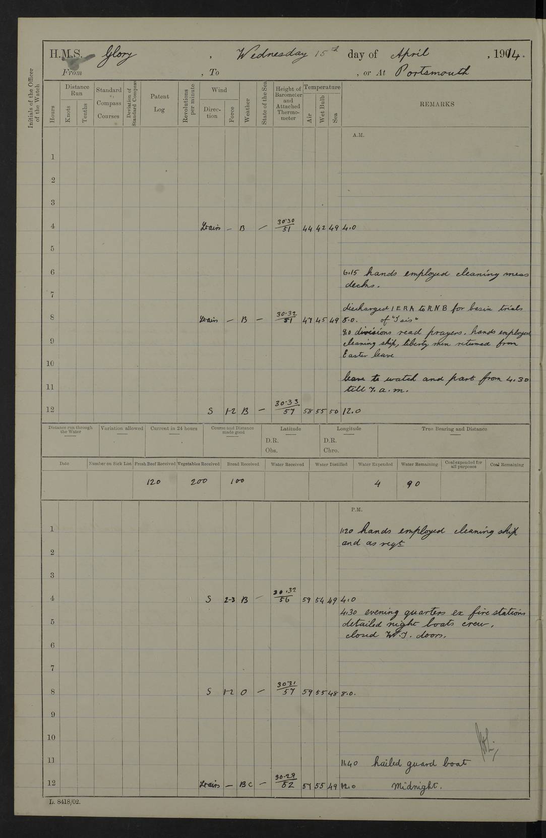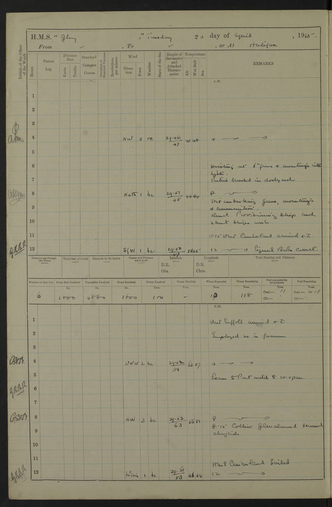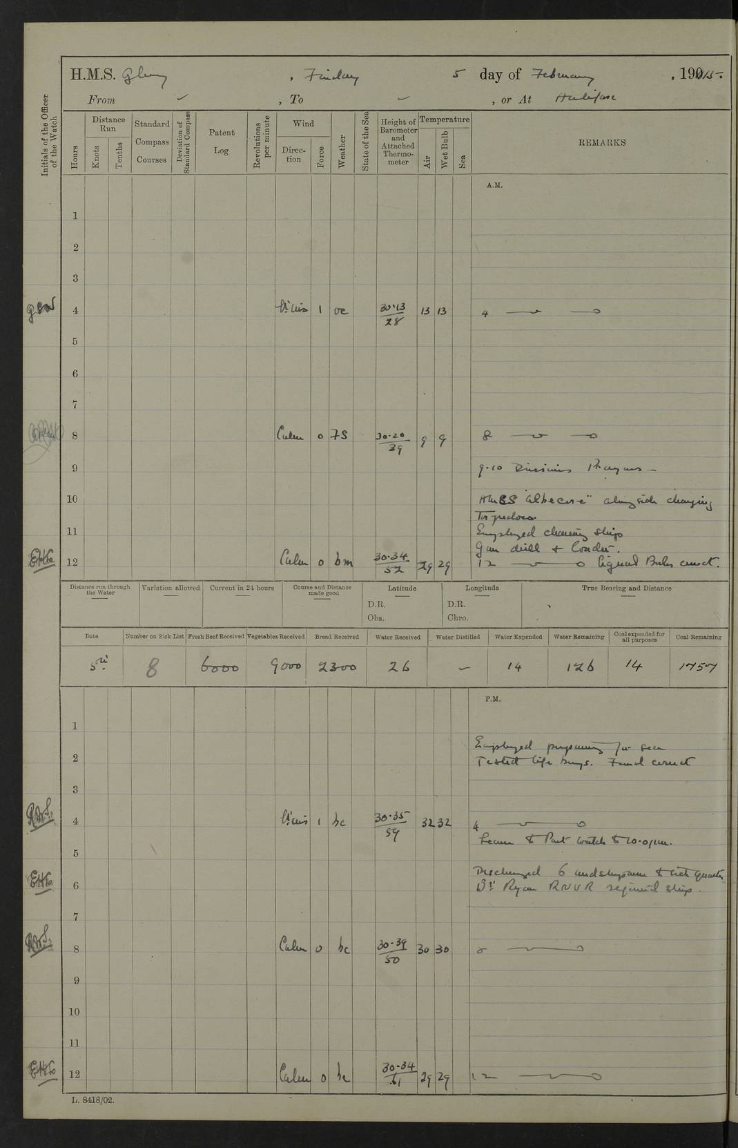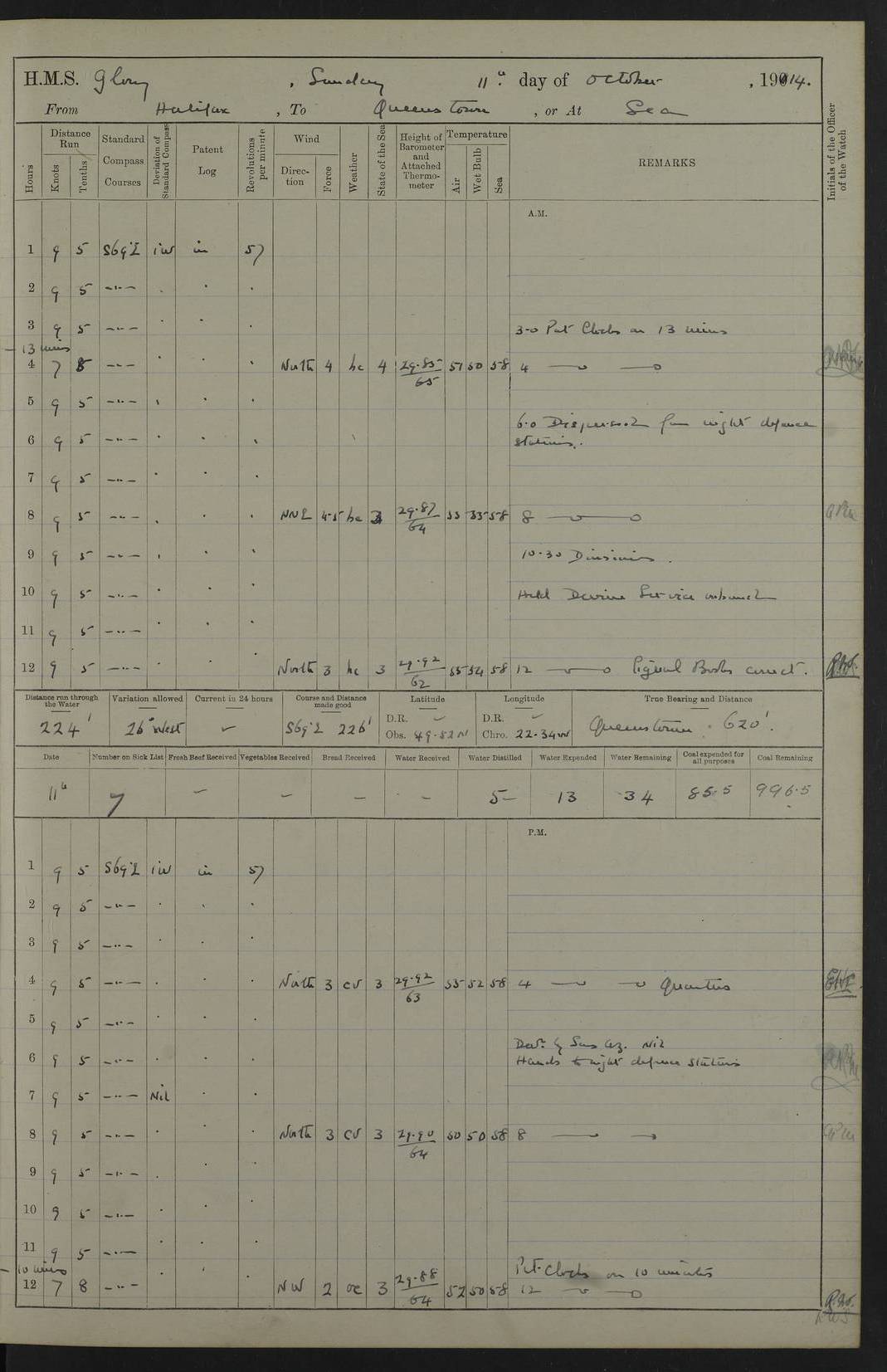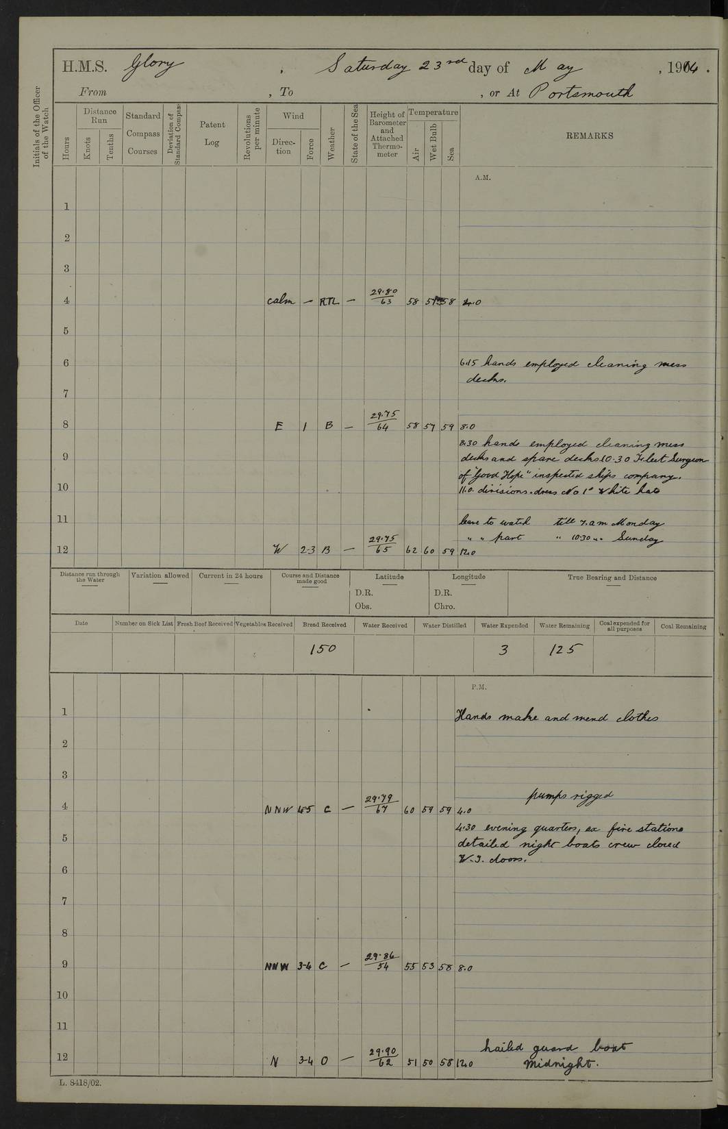 22 June 1915 At sea, Gibraltar to Lemnos Lat 36.1, Long -1.3 4.15am: Sighted land on starboard bow. 10.20am: Stopped port engine for repairs. 11.20am: proceeded with port engine. pm: a/c due to change in deviation. 10.00pm: Cape Tenez Light abeam, 18 miles. 4f73cd61a2fc8ea9030015f6: (https://s3.amazonaws.com:443/oldweather/ADM53-43015/0012_1.jpg) 23 June 1915 At sea, Gibraltar to Lemnos Lat 37.5, Long 4.8 Number on sick list: 4 5.00am: Secured from night defence stations. Placed anti-submarine guns. pm: Life saving appliances served out to men stationed in ? ?at abandon ship. 4f73cd61a2fc8ea9030015f7: (https://s3.amazonaws.com:443/oldweather/ADM53-43015/0013_0.jpg) 24 June 1915 At sea, Gibraltar to Lemnos Lat 37.4, Long 10.8 Position in log clearly bears no resemblance to the location of the ship. Position above is approximate and is based sighting of Zembra Island at 11.55am. 5.00am: Dispersed from night defence stations. Manned anti-submarine guns. am: Sighted two French torpedo boats. am: Torpedo boats passed to ~ No 362, 363. am: Sighted land on starboard beam. 11.55am: Zembra Island abeam, 25 miles. 2.00pm: Sighted Pantellaria S34ºE. 4.45pm: Pantellaria Light House abeam 12 miles. 4f73cd61a2fc8ea9030015f8: (https://s3.amazonaws.com:443/oldweather/ADM53-43015/0013_1.jpg) 25 June 1915 At sea, Gibraltar to Lemnos Lat 35.5, Long 16.7 2.10am: Gozo Light abeam 17 miles. 5.00am: Dispersed from night defence stations. Manned anti-submarine guns. 4f73cd61a2fc8ea9030015f9: (https://s3.amazonaws.com:443/oldweather/ADM53-43015/0014_0.jpg) 26 June 1915 At sea, Gibraltar to Lemnos Lat 35.5, Long 22.6 Number on sick list: 5 5.00am: Dispersed from night defence stations. Manned anti-submarine guns. am: Aired night clothing. am: marines at maxim practice on quarter deck. 2.00pm: Observed land on either bow. 3.00pm: Sighted French patrol destroyer. 4.15pm: Sighted French patrol destroyer. 9.40pm: Milo Peak N63ºW. 10.26pm: Polino Light abeam to port 5.5 miles. 4f73cd62a2fc8ea9030015fa: (https://s3.amazonaws.com:443/oldweather/ADM53-43015/0014_1.jpg) 27 June 1915 At sea and at Lemnos Lat 39.1, Long 24.4 From 0.50 to 3.05am sighting of multiple light houses. 3.50am: a/c to N39ºW and commenced to zig-zag. 5.00am: Dispersed from night defence stations and placed anti-submarine guns and look-outs. am: Lost overboard by accident Hazlewood fender, pat. 311, one in number. 10.30am: Held Divine Service onboard. pm: Met and signalled HMS Minerva on patrol duty. pm: Courses and speeds as requisite while waiting orders to approach Mudros. 3.00pm: Proceeded. 5.16pm: Increased to 90 revs, commenced to zig-zag. Course as requisite for Mudros. 7.00pm: Entered Mudros Bay. 7.47pm: Stopped. Let go port anchor in ‘M3’. 8.30pm: Darkened ship. pm: Manned one 6” and one 12 pdr. 4f73cd62a2fc8ea9030015fb: (https://s3.amazonaws.com:443/oldweather/ADM53-43015/0015_0.jpg) 28 June 1915 Mudros Bay, Lemnos Lat 39.89, Long 25.24 5,00am: HMS Vengeance entered harbour. HMS Vengeance was a pre-dreadnought of the Canopus class, launched in 1899 at Vickers, Barrow, and sold for scrapping in 1921. Details at http://en.wikipedia.org/wiki/HMS_Vengeance_(1899) . am/pm/: hands preparing for coaling and about ship’s work. pm: Collier Wabana secured alongside. 4f73cd62a2fc8ea9030015fc: (https://s3.amazonaws.com:443/oldweather/ADM53-43015/0015_1.jpg) 29 June 1915 Mudros Bay, Lemnos Lat 39.89, Long 25.24 5.15am: Commenced coaling. 2.00pm: Finished coaling. Collier left. 4f73cd62a2fc8ea9030015fd: (https://s3.amazonaws.com:443/oldweather/ADM53-43015/0016_0.jpg) 30 June 1915 Mudros Bay, Lemnos Lat 39.89, Long 25.24 am: Parties away sanding, and with fire engines onshore. am: Boats away disembarking troops. am: French Flagship Patrie sailed. The Patrie was a French pre-dreadnought, launched at La Seyne shipyard in 1903, and stricken in 1921. Details at http://en.wikipedia.org/wiki/French_battleship_Patrie . 6.30pm: Hands to bathe. 4f73cd63a2fc8ea9030015fe: (https://s3.amazonaws.com:443/oldweather/ADM53-43015/0016_1.jpg) 4f73cd63a2fc8ea9030015ff: (https://s3.amazonaws.com:443/oldweather/ADM53-43015/0017_0.jpg) 4f73cd63a2fc8ea903001600: (https://s3.amazonaws.com:443/oldweather/ADM53-43015/0017_1.jpg) 4f73cd63a2fc8ea903001601: (https://s3.amazonaws.com:443/oldweather/ADM53-43015/0018_0.jpg) 4f73cd64a2fc8ea903001602: (https://s3.amazonaws.com:443/oldweather/ADM53-43015/0018_1.jpg) LOGS FOR JULY 1915 From July to October 1915, HMS Glory spent her time at Port Mudros. Certain activities typically took place daily and are not generally noted in the pages below. These activities include: Lighting fires in the picket boat around 4am and drawing the fires in the late evening; Divisions at around 9–9.30am and Evening Quarters at 4pm; Darken ship at around 8.30pm; Daily ‘cleaning ship’, with variations thereof; SBC (for ‘Signal Books Correct’) at the watch changes. 4f73cd64a2fc8ea903001603: (https://s3.amazonaws.com:443/oldweather/ADM53-43016/0000_0.jpg) 4f73cd64a2fc8ea903001604: (https://s3.amazonaws.com:443/oldweather/ADM53-43016/0000_1.jpg) 4f73cd65a2fc8ea903001605: (https://s3.amazonaws.com:443/oldweather/ADM53-43016/0001_0.jpg) 4f73cd65a2fc8ea903001606: (https://s3.amazonaws.com:443/oldweather/ADM53-43016/0001_1.jpg) 1 July 1915 Port Mudros Lat 39.89, Long 25.24 6.30am: Landed working parties preparing boom defence ships. am: Discharged Acting Commander Rayne to Hector. Hector was a kite balloon ship. No further details readily available. 5.00pm: Tug T.10 made fast astern. 7.15pm: HMS Venerable went out. 7.30pm: HMS Chatham went out. HMS Chatham was a ‘Town’ cruiser and lead ship of her class. She was launched in 1911 at Chatham Dockyard and sold in 1926. Details at http://en.wikipedia.org/wiki/HMS_Chatham_(1911) . 4f73cd65a2fc8ea903001607: (https://s3.amazonaws.com:443/oldweather/ADM53-43016/0002_0.jpg) 2 July 1915 Port Mudros Lat 39.89, Long 25.24 5.35am: Landed working parties preparing boom defence ships. am/pm: Boom defence par
