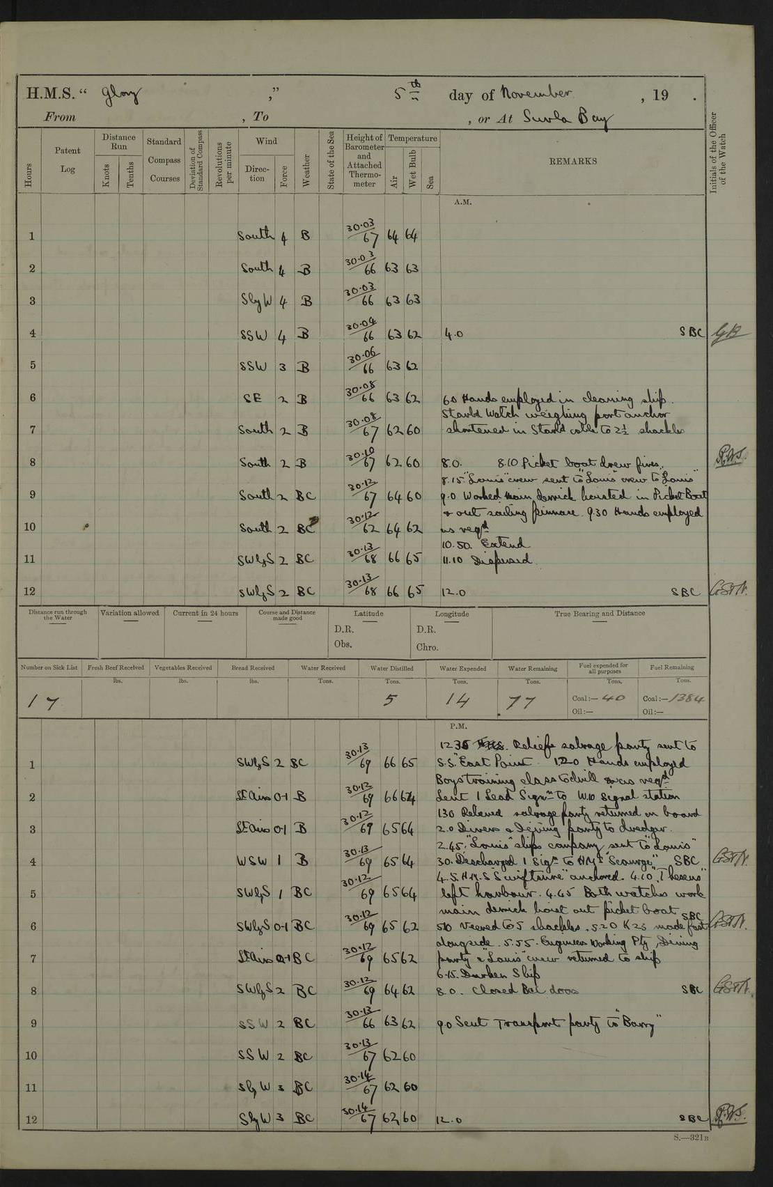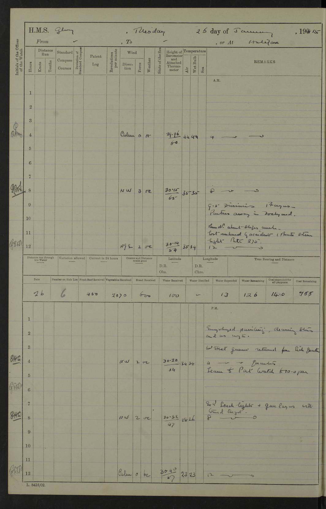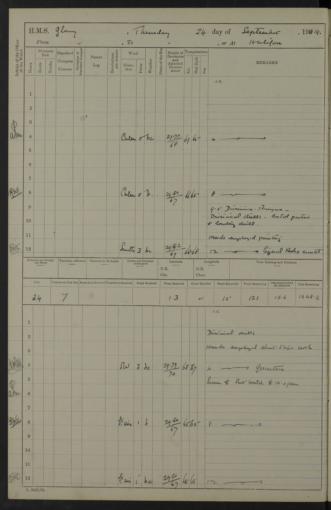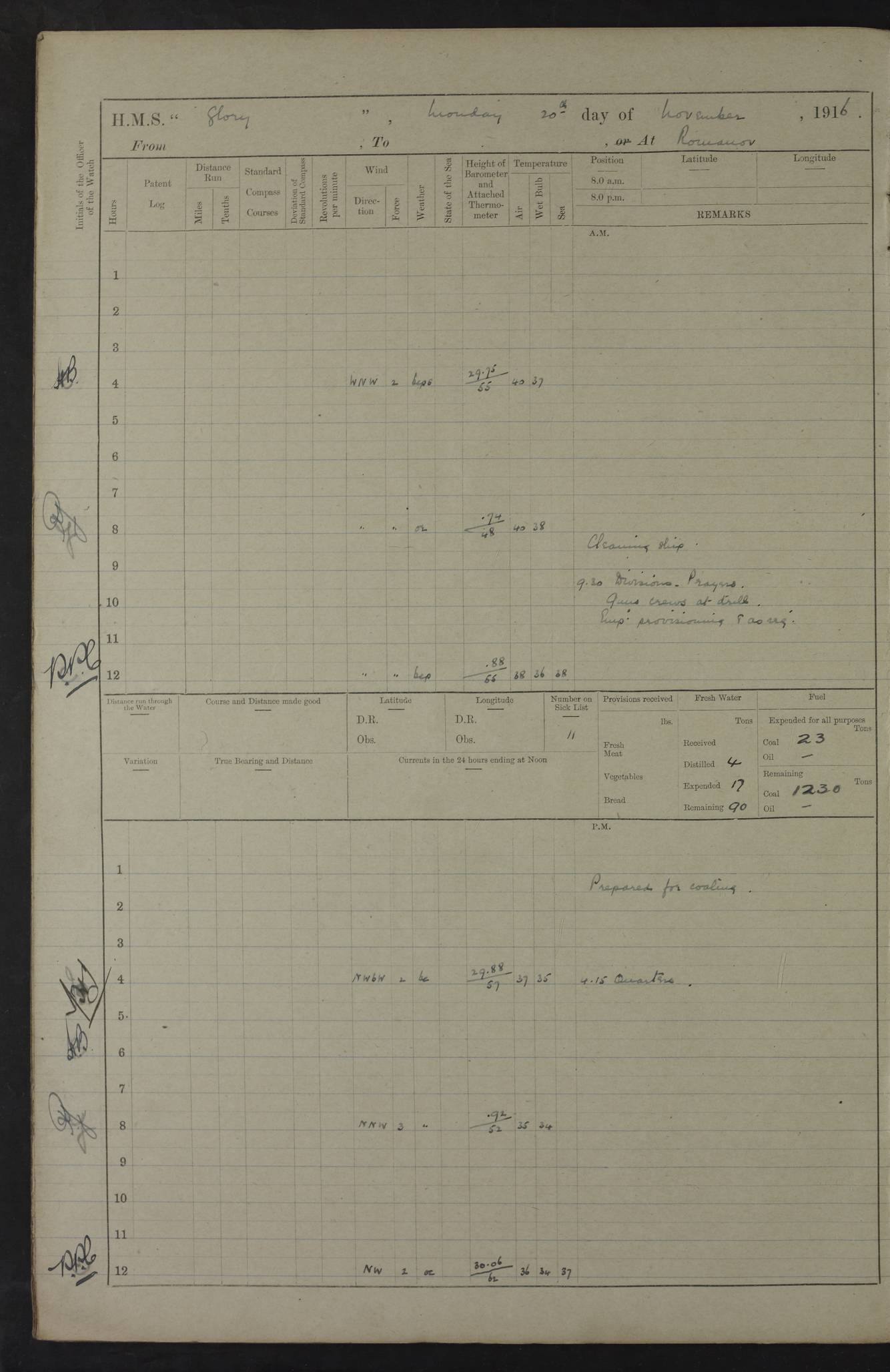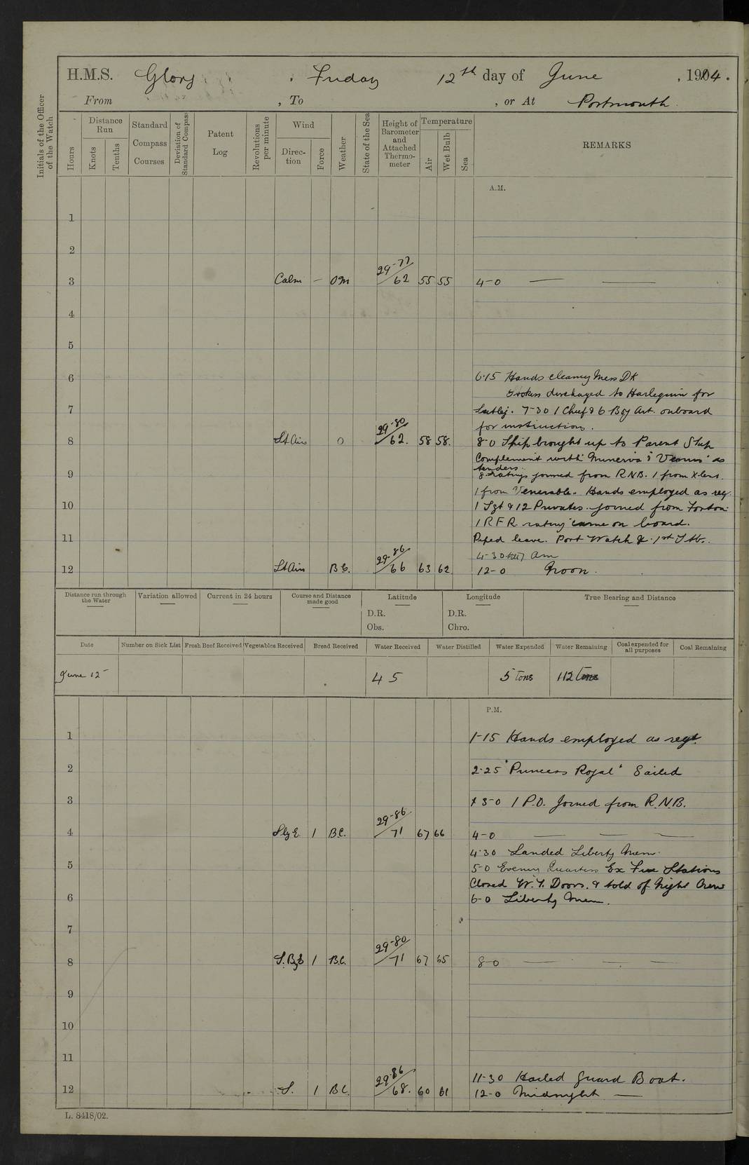 22 June 1915 At sea, Gibraltar to Lemnos Lat 36.1, Long -1.3 4.15am: Sighted land on starboard bow. 10.20am: Stopped port engine for repairs. 11.20am: proceeded with port engine. pm: a/c due to change in deviation. 10.00pm: Cape Tenez Light abeam, 18 miles. 4f73cd61a2fc8ea9030015f6: (https://s3.amazonaws.com:443/oldweather/ADM53-43015/0012_1.jpg) 23 June 1915 At sea, Gibraltar to Lemnos Lat 37.5, Long 4.8 Number on sick list: 4 5.00am: Secured from night defence stations. Placed anti-submarine guns. pm: Life saving appliances served out to men stationed in ? ?at abandon ship. 4f73cd61a2fc8ea9030015f7: (https://s3.amazonaws.com:443/oldweather/ADM53-43015/0013_0.jpg) 24 June 1915 At sea, Gibraltar to Lemnos Lat 37.4, Long 10.8 Position in log clearly bears no resemblance to the location of the ship. Position above is approximate and is based sighting of Zembra Island at 11.55am. 5.00am: Dispersed from night defence stations. Manned anti-submarine guns. am: Sighted two French torpedo boats. am: Torpedo boats passed to ~ No 362, 363. am: Sighted land on starboard beam. 11.55am: Zembra Island abeam, 25 miles. 2.00pm: Sighted Pantellaria S34ºE. 4.45pm: Pantellaria Light House abeam 12 miles. 4f73cd61a2fc8ea9030015f8: (https://s3.amazonaws.com:443/oldweather/ADM53-43015/0013_1.jpg) 25 June 1915 At sea, Gibraltar to Lemnos Lat 35.5, Long 16.7 2.10am: Gozo Light abeam 17 miles. 5.00am: Dispersed from night defence stations. Manned anti-submarine guns. 4f73cd61a2fc8ea9030015f9: (https://s3.amazonaws.com:443/oldweather/ADM53-43015/0014_0.jpg) 26 June 1915 At sea, Gibraltar to Lemnos Lat 35.5, Long 22.6 Number on sick list: 5 5.00am: Dispersed from night defence stations. Manned anti-submarine guns. am: Aired night clothing. am: marines at maxim practice on quarter deck. 2.00pm: Observed land on either bow. 3.00pm: Sighted French patrol destroyer. 4.15pm: Sighted French patrol destroyer. 9.40pm: Milo Peak N63ºW. 10.26pm: Polino Light abeam to port 5.5 miles. 4f73cd62a2fc8ea9030015fa: (https://s3.amazonaws.com:443/oldweather/ADM53-43015/0014_1.jpg) 27 June 1915 At sea and at Lemnos Lat 39.1, Long 24.4 From 0.50 to 3.05am sighting of multiple light houses. 3.50am: a/c to N39ºW and commenced to zig-zag. 5.00am: Dispersed from night defence stations and placed anti-submarine guns and look-outs. am: Lost overboard by accident Hazlewood fender, pat. 311, one in number. 10.30am: Held Divine Service onboard. pm: Met and signalled HMS Minerva on patrol duty. pm: Courses and speeds as requisite while waiting orders to approach Mudros. 3.00pm: Proceeded. 5.16pm: Increased to 90 revs, commenced to zig-zag. Course as requisite for Mudros. 7.00pm: Entered Mudros Bay. 7.47pm: Stopped. Let go port anchor in ‘M3’. 8.30pm: Darkened ship. pm: Manned one 6” and one 12 pdr. 4f73cd62a2fc8ea9030015fb: (https://s3.amazonaws.com:443/oldweather/ADM53-43015/0015_0.jpg) 28 June 1915 Mudros Bay, Lemnos Lat 39.89, Long 25.24 5,00am: HMS Vengeance entered harbour. HMS Vengeance was a pre-dreadnought of the Canopus class, launched in 1899 at Vickers, Barrow, and sold for scrapping in 1921. Details at http://en.wikipedia.org/wiki/HMS_Vengeance_(1899) . am/pm/: hands preparing for coaling and about ship’s work. pm: Collier Wabana secured alongside. 4f73cd62a2fc8ea9030015fc: (https://s3.amazonaws.com:443/oldweather/ADM53-43015/0015_1.jpg) 29 June 1915 Mudros Bay, Lemnos Lat 39.89, Long 25.24 5.15am: Commenced coaling. 2.00pm: Finished coaling. Collier left. 4f73cd62a2fc8ea9030015fd: (https://s3.amazonaws.com:443/oldweather/ADM53-43015/0016_0.jpg) 30 June 1915 Mudros Bay, Lemnos Lat 39.89, Long 25.24 am: Parties away sanding, and with fire engines onshore. am: Boats away disembarking troops. am: French Flagship Patrie sailed. The Patrie was a French pre-dreadnought, launched at La Seyne shipyard in 1903, and stricken in 1921. Details at http://en.wikipedia.org/wiki/French_battleship_Patrie . 6.30pm: Hands to bathe. 4f73cd63a2fc8ea9030015fe: (https://s3.amazonaws.com:443/oldweather/ADM53-43015/0016_1.jpg) 4f73cd63a2fc8ea9030015ff: (https://s3.amazonaws.com:443/oldweather/ADM53-43015/0017_0.jpg) 4f73cd63a2fc8ea903001600: (https://s3.amazonaws.com:443/oldweather/ADM53-43015/0017_1.jpg) 4f73cd63a2fc8ea903001601: (https://s3.amazonaws.com:443/oldweather/ADM53-43015/0018_0.jpg) 4f73cd64a2fc8ea903001602: (https://s3.amazonaws.com:443/oldweather/ADM53-43015/0018_1.jpg) LOGS FOR JULY 1915 From July to October 1915, HMS Glory spent her time at Port Mudros. Certain activities typically took place daily and are not generally noted in the pages below. These activities include: Lighting fires in the picket boat around 4am and drawing the fires in the late evening; Divisions at around 9–9.30am and Evening Quarters at 4pm; Darken ship at around 8.30pm; Daily ‘cleaning ship’, with variations thereof; SBC (for ‘Signal Books Correct’) at the watch changes. 4f73cd64a2fc8ea903001603: (https://s3.amazonaws.com:443/oldweather/ADM53-43016/0000_0.jpg) 4f73cd64a2fc8ea903001604: (https://s3.amazonaws.com:443/oldweather/ADM53-43016/0000_1.jpg) 4f73cd65a2fc8ea903001605: (https://s3.amazonaws.com:443/oldweather/ADM53-43016/0001_0.jpg) 4f73cd65a2fc8ea903001606: (https://s3.amazonaws.com:443/oldweather/ADM53-43016/0001_1.jpg) 1 July 1915 Port Mudros Lat 39.89, Long 25.24 6.30am: Landed working parties preparing boom defence ships. am: Discharged Acting Commander Rayne to Hector. Hector was a kite balloon ship. No further details readily available. 5.00pm: Tug T.10 made fast astern. 7.15pm: HMS Venerable went out. 7.30pm: HMS Chatham went out. HMS Chatham was a ‘Town’ cruiser and lead ship of her class. She was launched in 1911 at Chatham Dockyard and sold in 1926. Details at http://en.wikipedia.org/wiki/HMS_Chatham_(1911) . 4f73cd65a2fc8ea903001607: (https://s3.amazonaws.com:443/oldweather/ADM53-43016/0002_0.jpg) 2 July 1915 Port Mudros Lat 39.89, Long 25.24 5.35am: Landed working parties preparing boom defence ships. am/pm: Boom defence par