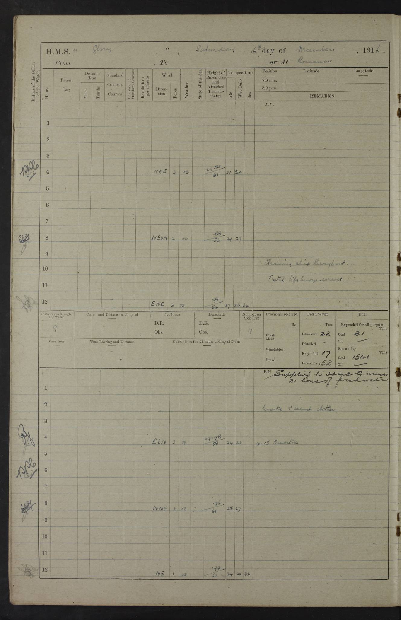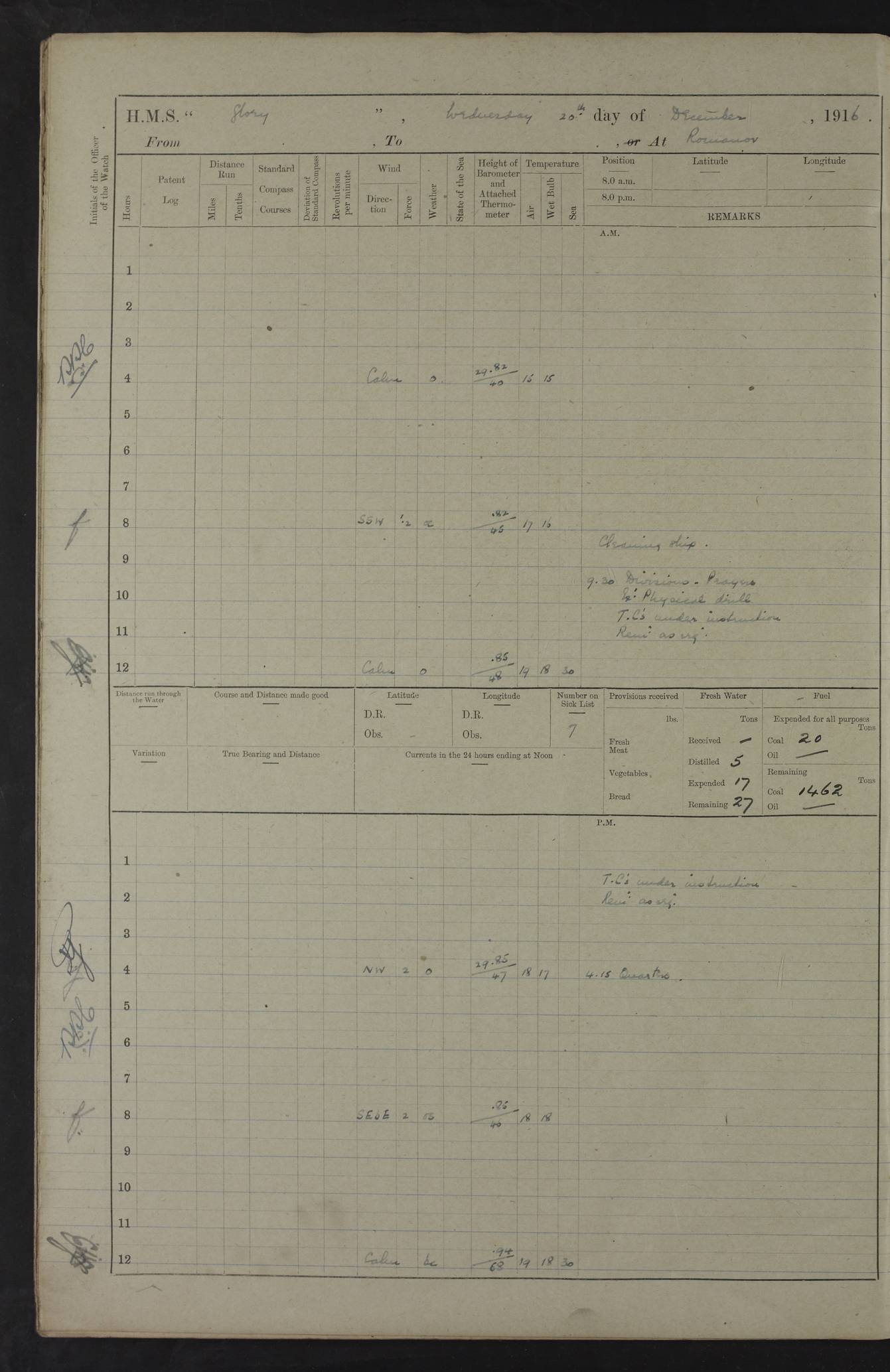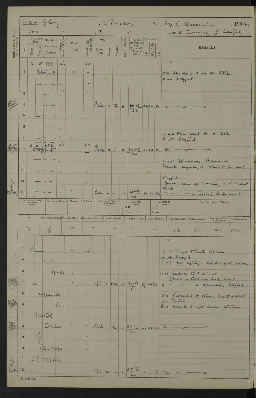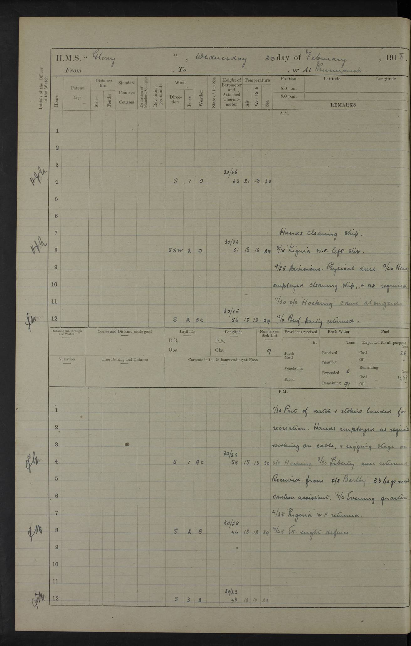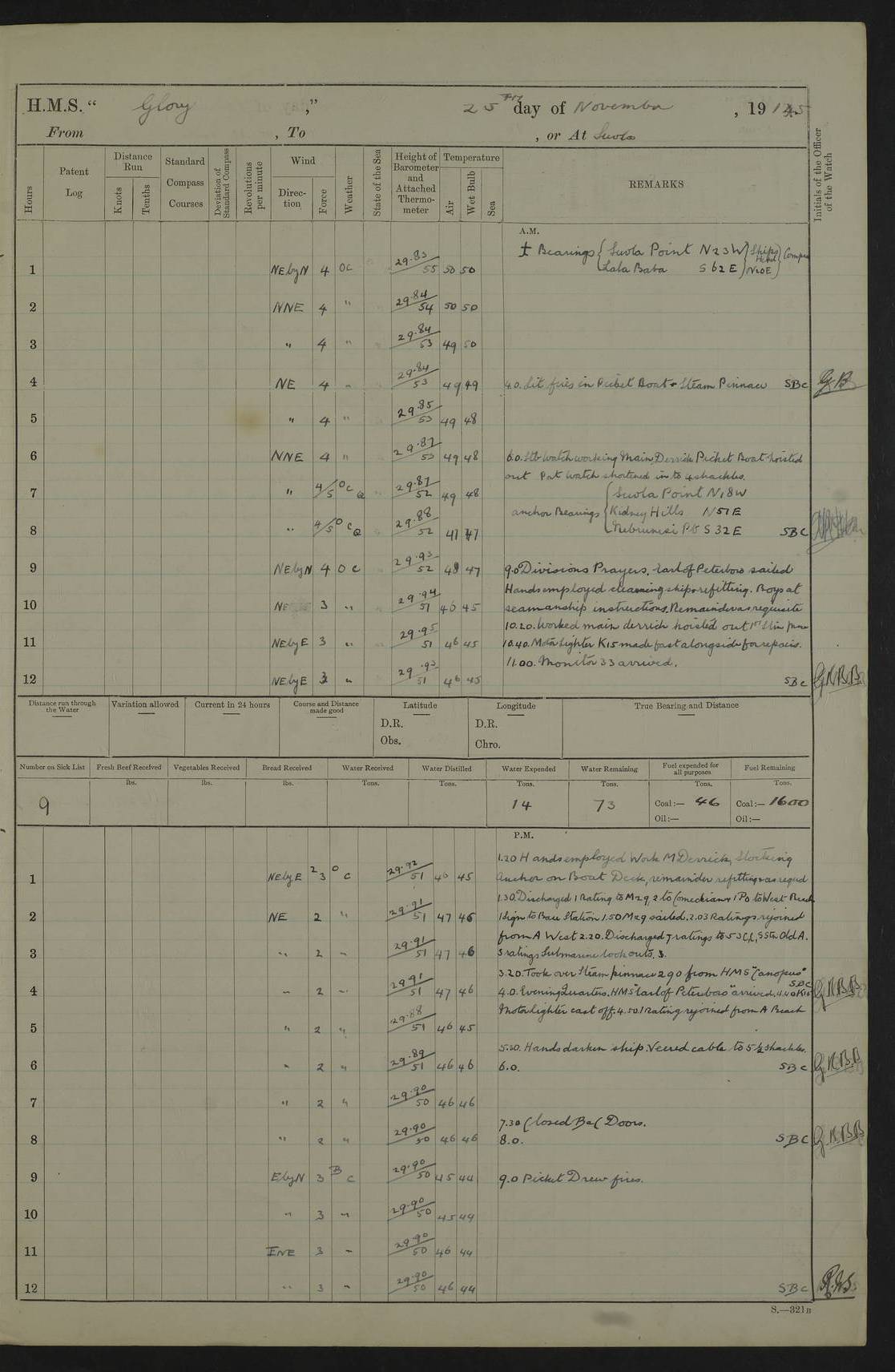 22 June 1915 At sea, Gibraltar to Lemnos Lat 36.1, Long -1.3 4.15am: Sighted land on starboard bow. 10.20am: Stopped port engine for repairs. 11.20am: proceeded with port engine. pm: a/c due to change in deviation. 10.00pm: Cape Tenez Light abeam, 18 miles. 4f73cd61a2fc8ea9030015f6: (https://s3.amazonaws.com:443/oldweather/ADM53-43015/0012_1.jpg) 23 June 1915 At sea, Gibraltar to Lemnos Lat 37.5, Long 4.8 Number on sick list: 4 5.00am: Secured from night defence stations. Placed anti-submarine guns. pm: Life saving appliances served out to men stationed in ? ?at abandon ship. 4f73cd61a2fc8ea9030015f7: (https://s3.amazonaws.com:443/oldweather/ADM53-43015/0013_0.jpg) 24 June 1915 At sea, Gibraltar to Lemnos Lat 37.4, Long 10.8 Position in log clearly bears no resemblance to the location of the ship. Position above is approximate and is based sighting of Zembra Island at 11.55am. 5.00am: Dispersed from night defence stations. Manned anti-submarine guns. am: Sighted two French torpedo boats. am: Torpedo boats passed to ~ No 362, 363. am: Sighted land on starboard beam. 11.55am: Zembra Island abeam, 25 miles. 2.00pm: Sighted Pantellaria S34ºE. 4.45pm: Pantellaria Light House abeam 12 miles. 4f73cd61a2fc8ea9030015f8: (https://s3.amazonaws.com:443/oldweather/ADM53-43015/0013_1.jpg) 25 June 1915 At sea, Gibraltar to Lemnos Lat 35.5, Long 16.7 2.10am: Gozo Light abeam 17 miles. 5.00am: Dispersed from night defence stations. Manned anti-submarine guns. 4f73cd61a2fc8ea9030015f9: (https://s3.amazonaws.com:443/oldweather/ADM53-43015/0014_0.jpg) 26 June 1915 At sea, Gibraltar to Lemnos Lat 35.5, Long 22.6 Number on sick list: 5 5.00am: Dispersed from night defence stations. Manned anti-submarine guns. am: Aired night clothing. am: marines at maxim practice on quarter deck. 2.00pm: Observed land on either bow. 3.00pm: Sighted French patrol destroyer. 4.15pm: Sighted French patrol destroyer. 9.40pm: Milo Peak N63ºW. 10.26pm: Polino Light abeam to port 5.5 miles. 4f73cd62a2fc8ea9030015fa: (https://s3.amazonaws.com:443/oldweather/ADM53-43015/0014_1.jpg) 27 June 1915 At sea and at Lemnos Lat 39.1, Long 24.4 From 0.50 to 3.05am sighting of multiple light houses. 3.50am: a/c to N39ºW and commenced to zig-zag. 5.00am: Dispersed from night defence stations and placed anti-submarine guns and look-outs. am: Lost overboard by accident Hazlewood fender, pat. 311, one in number. 10.30am: Held Divine Service onboard. pm: Met and signalled HMS Minerva on patrol duty. pm: Courses and speeds as requisite while waiting orders to approach Mudros. 3.00pm: Proceeded. 5.16pm: Increased to 90 revs, commenced to zig-zag. Course as requisite for Mudros. 7.00pm: Entered Mudros Bay. 7.47pm: Stopped. Let go port anchor in ‘M3’. 8.30pm: Darkened ship. pm: Manned one 6” and one 12 pdr. 4f73cd62a2fc8ea9030015fb: (https://s3.amazonaws.com:443/oldweather/ADM53-43015/0015_0.jpg) 28 June 1915 Mudros Bay, Lemnos Lat 39.89, Long 25.24 5,00am: HMS Vengeance entered harbour. HMS Vengeance was a pre-dreadnought of the Canopus class, launched in 1899 at Vickers, Barrow, and sold for scrapping in 1921. Details at http://en.wikipedia.org/wiki/HMS_Vengeance_(1899) . am/pm/: hands preparing for coaling and about ship’s work. pm: Collier Wabana secured alongside. 4f73cd62a2fc8ea9030015fc: (https://s3.amazonaws.com:443/oldweather/ADM53-43015/0015_1.jpg) 29 June 1915 Mudros Bay, Lemnos Lat 39.89, Long 25.24 5.15am: Commenced coaling. 2.00pm: Finished coaling. Collier left. 4f73cd62a2fc8ea9030015fd: (https://s3.amazonaws.com:443/oldweather/ADM53-43015/0016_0.jpg) 30 June 1915 Mudros Bay, Lemnos Lat 39.89, Long 25.24 am: Parties away sanding, and with fire engines onshore. am: Boats away disembarking troops. am: French Flagship Patrie sailed. The Patrie was a French pre-dreadnought, launched at La Seyne shipyard in 1903, and stricken in 1921. Details at http://en.wikipedia.org/wiki/French_battleship_Patrie . 6.30pm: Hands to bathe. 4f73cd63a2fc8ea9030015fe: (https://s3.amazonaws.com:443/oldweather/ADM53-43015/0016_1.jpg) 4f73cd63a2fc8ea9030015ff: (https://s3.amazonaws.com:443/oldweather/ADM53-43015/0017_0.jpg) 4f73cd63a2fc8ea903001600: (https://s3.amazonaws.com:443/oldweather/ADM53-43015/0017_1.jpg) 4f73cd63a2fc8ea903001601: (https://s3.amazonaws.com:443/oldweather/ADM53-43015/0018_0.jpg) 4f73cd64a2fc8ea903001602: (https://s3.amazonaws.com:443/oldweather/ADM53-43015/0018_1.jpg) LOGS FOR JULY 1915 From July to October 1915, HMS Glory spent her time at Port Mudros. Certain activities typically took place daily and are not generally noted in the pages below. These activities include: Lighting fires in the picket boat around 4am and drawing the fires in the late evening; Divisions at around 9–9.30am and Evening Quarters at 4pm; Darken ship at around 8.30pm; Daily ‘cleaning ship’, with variations thereof; SBC (for ‘Signal Books Correct’) at the watch changes. 4f73cd64a2fc8ea903001603: (https://s3.amazonaws.com:443/oldweather/ADM53-43016/0000_0.jpg) 4f73cd64a2fc8ea903001604: (https://s3.amazonaws.com:443/oldweather/ADM53-43016/0000_1.jpg) 4f73cd65a2fc8ea903001605: (https://s3.amazonaws.com:443/oldweather/ADM53-43016/0001_0.jpg) 4f73cd65a2fc8ea903001606: (https://s3.amazonaws.com:443/oldweather/ADM53-43016/0001_1.jpg) 1 July 1915 Port Mudros Lat 39.89, Long 25.24 6.30am: Landed working parties preparing boom defence ships. am: Discharged Acting Commander Rayne to Hector. Hector was a kite balloon ship. No further details readily available. 5.00pm: Tug T.10 made fast astern. 7.15pm: HMS Venerable went out. 7.30pm: HMS Chatham went out. HMS Chatham was a ‘Town’ cruiser and lead ship of her class. She was launched in 1911 at Chatham Dockyard and sold in 1926. Details at http://en.wikipedia.org/wiki/HMS_Chatham_(1911) . 4f73cd65a2fc8ea903001607: (https://s3.amazonaws.com:443/oldweather/ADM53-43016/0002_0.jpg) 2 July 1915 Port Mudros Lat 39.89, Long 25.24 5.35am: Landed working parties preparing boom defence ships. am/pm: Boom defence par