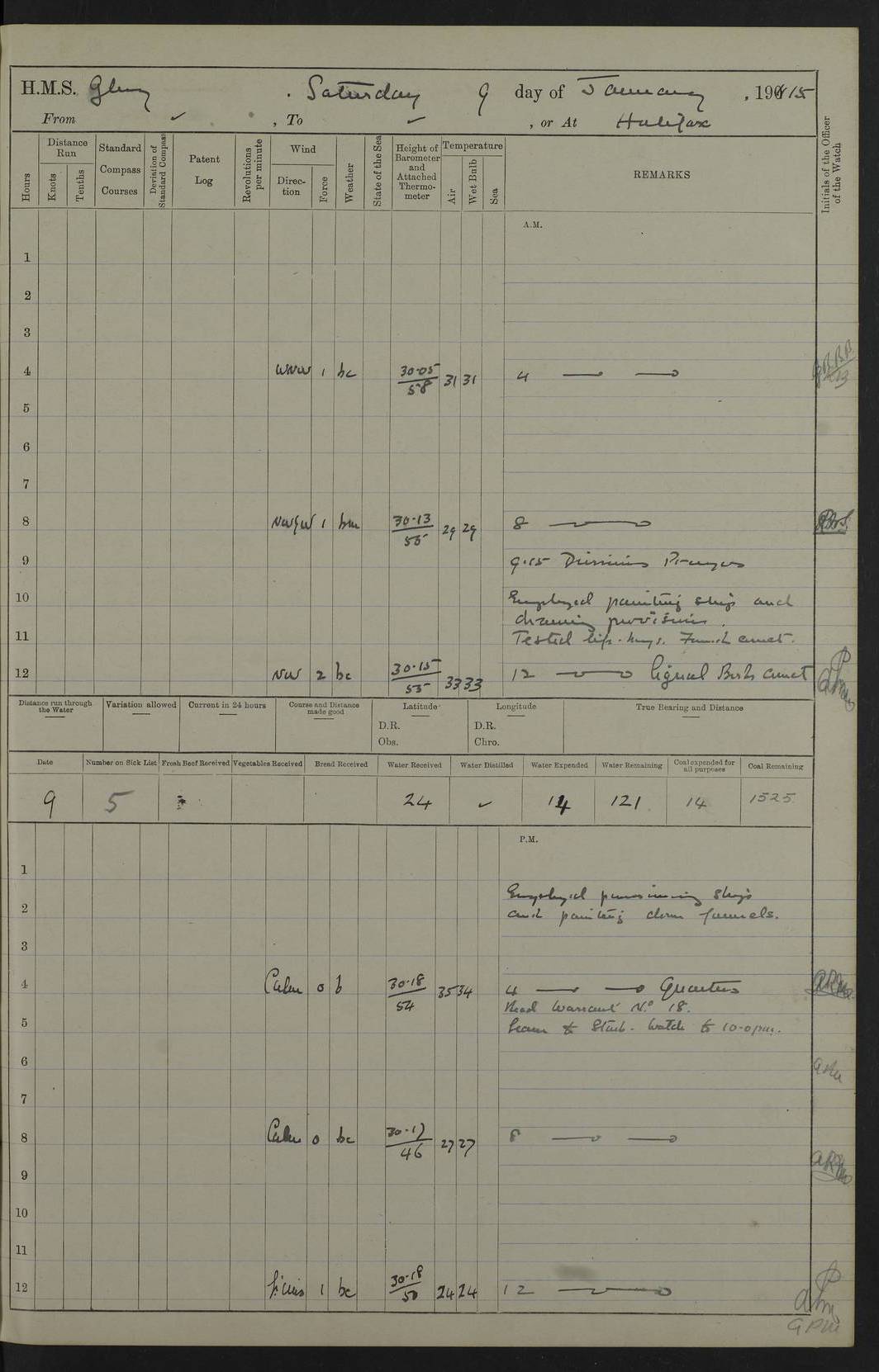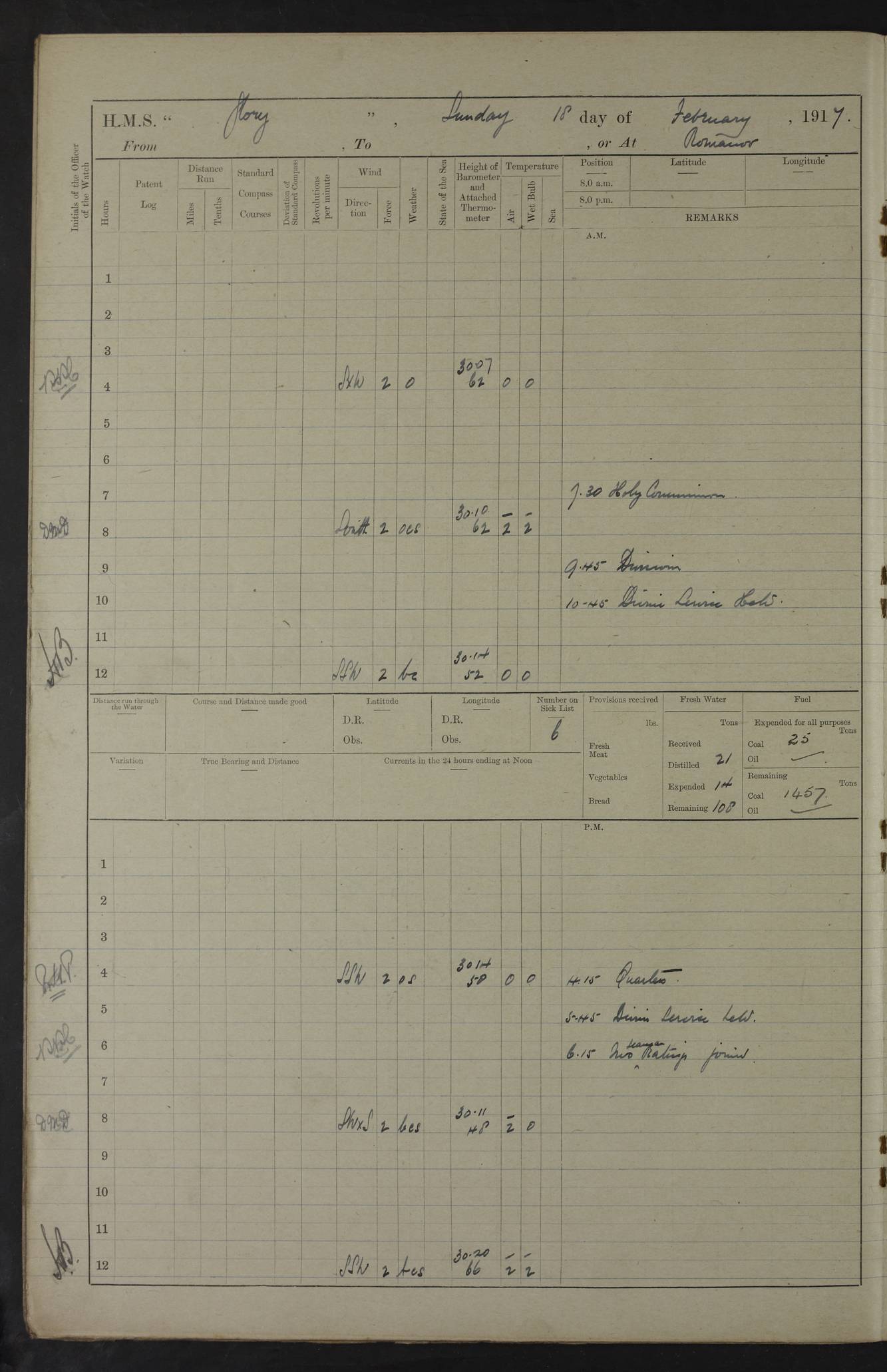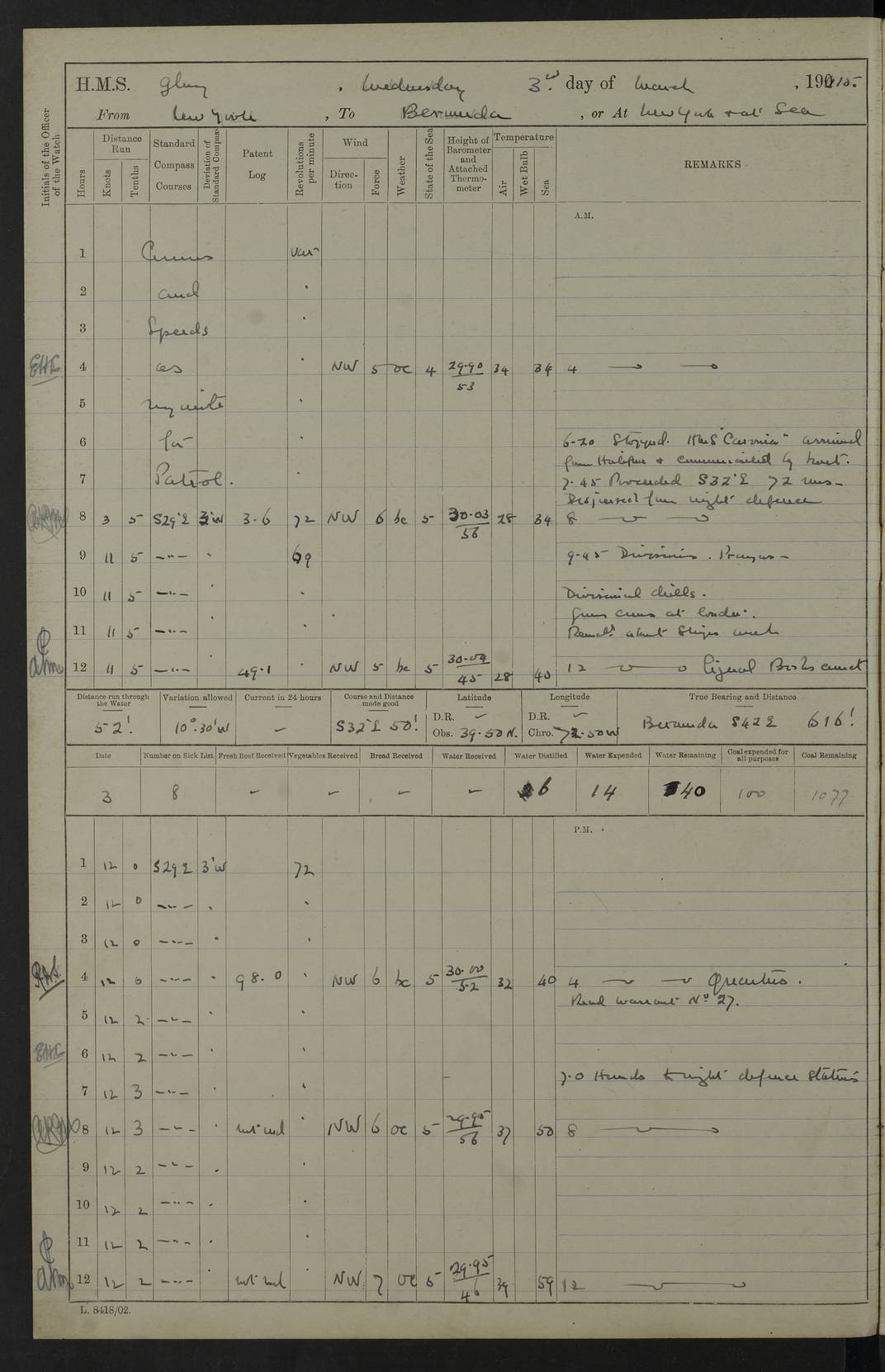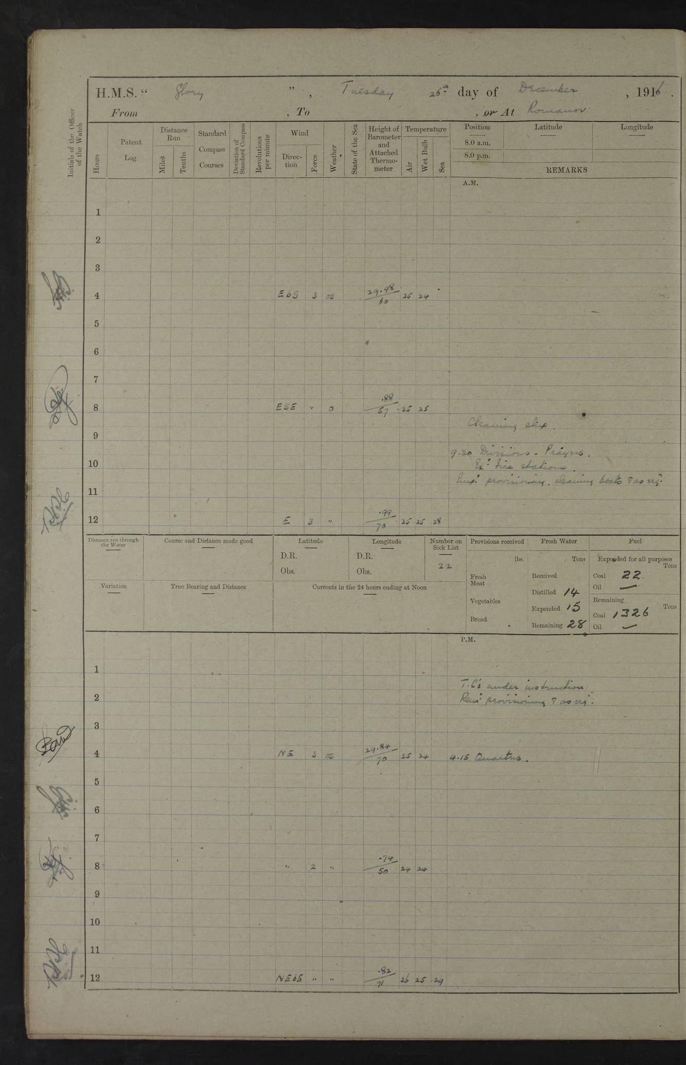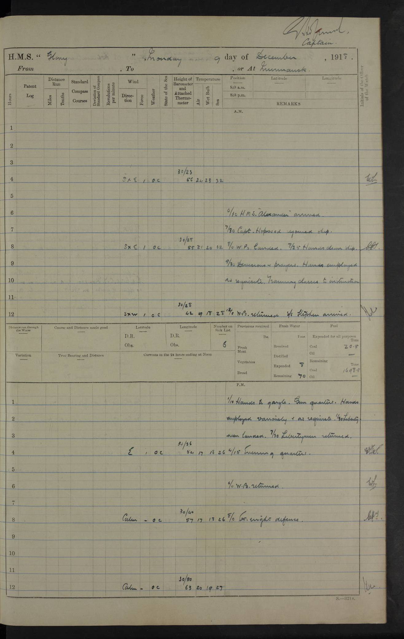 22 June 1915 At sea, Gibraltar to Lemnos Lat 36.1, Long -1.3 4.15am: Sighted land on starboard bow. 10.20am: Stopped port engine for repairs. 11.20am: proceeded with port engine. pm: a/c due to change in deviation. 10.00pm: Cape Tenez Light abeam, 18 miles. 4f73cd61a2fc8ea9030015f6: (https://s3.amazonaws.com:443/oldweather/ADM53-43015/0012_1.jpg) 23 June 1915 At sea, Gibraltar to Lemnos Lat 37.5, Long 4.8 Number on sick list: 4 5.00am: Secured from night defence stations. Placed anti-submarine guns. pm: Life saving appliances served out to men stationed in ? ?at abandon ship. 4f73cd61a2fc8ea9030015f7: (https://s3.amazonaws.com:443/oldweather/ADM53-43015/0013_0.jpg) 24 June 1915 At sea, Gibraltar to Lemnos Lat 37.4, Long 10.8 Position in log clearly bears no resemblance to the location of the ship. Position above is approximate and is based sighting of Zembra Island at 11.55am. 5.00am: Dispersed from night defence stations. Manned anti-submarine guns. am: Sighted two French torpedo boats. am: Torpedo boats passed to ~ No 362, 363. am: Sighted land on starboard beam. 11.55am: Zembra Island abeam, 25 miles. 2.00pm: Sighted Pantellaria S34ºE. 4.45pm: Pantellaria Light House abeam 12 miles. 4f73cd61a2fc8ea9030015f8: (https://s3.amazonaws.com:443/oldweather/ADM53-43015/0013_1.jpg) 25 June 1915 At sea, Gibraltar to Lemnos Lat 35.5, Long 16.7 2.10am: Gozo Light abeam 17 miles. 5.00am: Dispersed from night defence stations. Manned anti-submarine guns. 4f73cd61a2fc8ea9030015f9: (https://s3.amazonaws.com:443/oldweather/ADM53-43015/0014_0.jpg) 26 June 1915 At sea, Gibraltar to Lemnos Lat 35.5, Long 22.6 Number on sick list: 5 5.00am: Dispersed from night defence stations. Manned anti-submarine guns. am: Aired night clothing. am: marines at maxim practice on quarter deck. 2.00pm: Observed land on either bow. 3.00pm: Sighted French patrol destroyer. 4.15pm: Sighted French patrol destroyer. 9.40pm: Milo Peak N63ºW. 10.26pm: Polino Light abeam to port 5.5 miles. 4f73cd62a2fc8ea9030015fa: (https://s3.amazonaws.com:443/oldweather/ADM53-43015/0014_1.jpg) 27 June 1915 At sea and at Lemnos Lat 39.1, Long 24.4 From 0.50 to 3.05am sighting of multiple light houses. 3.50am: a/c to N39ºW and commenced to zig-zag. 5.00am: Dispersed from night defence stations and placed anti-submarine guns and look-outs. am: Lost overboard by accident Hazlewood fender, pat. 311, one in number. 10.30am: Held Divine Service onboard. pm: Met and signalled HMS Minerva on patrol duty. pm: Courses and speeds as requisite while waiting orders to approach Mudros. 3.00pm: Proceeded. 5.16pm: Increased to 90 revs, commenced to zig-zag. Course as requisite for Mudros. 7.00pm: Entered Mudros Bay. 7.47pm: Stopped. Let go port anchor in ‘M3’. 8.30pm: Darkened ship. pm: Manned one 6” and one 12 pdr. 4f73cd62a2fc8ea9030015fb: (https://s3.amazonaws.com:443/oldweather/ADM53-43015/0015_0.jpg) 28 June 1915 Mudros Bay, Lemnos Lat 39.89, Long 25.24 5,00am: HMS Vengeance entered harbour. HMS Vengeance was a pre-dreadnought of the Canopus class, launched in 1899 at Vickers, Barrow, and sold for scrapping in 1921. Details at http://en.wikipedia.org/wiki/HMS_Vengeance_(1899) . am/pm/: hands preparing for coaling and about ship’s work. pm: Collier Wabana secured alongside. 4f73cd62a2fc8ea9030015fc: (https://s3.amazonaws.com:443/oldweather/ADM53-43015/0015_1.jpg) 29 June 1915 Mudros Bay, Lemnos Lat 39.89, Long 25.24 5.15am: Commenced coaling. 2.00pm: Finished coaling. Collier left. 4f73cd62a2fc8ea9030015fd: (https://s3.amazonaws.com:443/oldweather/ADM53-43015/0016_0.jpg) 30 June 1915 Mudros Bay, Lemnos Lat 39.89, Long 25.24 am: Parties away sanding, and with fire engines onshore. am: Boats away disembarking troops. am: French Flagship Patrie sailed. The Patrie was a French pre-dreadnought, launched at La Seyne shipyard in 1903, and stricken in 1921. Details at http://en.wikipedia.org/wiki/French_battleship_Patrie . 6.30pm: Hands to bathe. 4f73cd63a2fc8ea9030015fe: (https://s3.amazonaws.com:443/oldweather/ADM53-43015/0016_1.jpg) 4f73cd63a2fc8ea9030015ff: (https://s3.amazonaws.com:443/oldweather/ADM53-43015/0017_0.jpg) 4f73cd63a2fc8ea903001600: (https://s3.amazonaws.com:443/oldweather/ADM53-43015/0017_1.jpg) 4f73cd63a2fc8ea903001601: (https://s3.amazonaws.com:443/oldweather/ADM53-43015/0018_0.jpg) 4f73cd64a2fc8ea903001602: (https://s3.amazonaws.com:443/oldweather/ADM53-43015/0018_1.jpg) LOGS FOR JULY 1915 From July to October 1915, HMS Glory spent her time at Port Mudros. Certain activities typically took place daily and are not generally noted in the pages below. These activities include: Lighting fires in the picket boat around 4am and drawing the fires in the late evening; Divisions at around 9–9.30am and Evening Quarters at 4pm; Darken ship at around 8.30pm; Daily ‘cleaning ship’, with variations thereof; SBC (for ‘Signal Books Correct’) at the watch changes. 4f73cd64a2fc8ea903001603: (https://s3.amazonaws.com:443/oldweather/ADM53-43016/0000_0.jpg) 4f73cd64a2fc8ea903001604: (https://s3.amazonaws.com:443/oldweather/ADM53-43016/0000_1.jpg) 4f73cd65a2fc8ea903001605: (https://s3.amazonaws.com:443/oldweather/ADM53-43016/0001_0.jpg) 4f73cd65a2fc8ea903001606: (https://s3.amazonaws.com:443/oldweather/ADM53-43016/0001_1.jpg) 1 July 1915 Port Mudros Lat 39.89, Long 25.24 6.30am: Landed working parties preparing boom defence ships. am: Discharged Acting Commander Rayne to Hector. Hector was a kite balloon ship. No further details readily available. 5.00pm: Tug T.10 made fast astern. 7.15pm: HMS Venerable went out. 7.30pm: HMS Chatham went out. HMS Chatham was a ‘Town’ cruiser and lead ship of her class. She was launched in 1911 at Chatham Dockyard and sold in 1926. Details at http://en.wikipedia.org/wiki/HMS_Chatham_(1911) . 4f73cd65a2fc8ea903001607: (https://s3.amazonaws.com:443/oldweather/ADM53-43016/0002_0.jpg) 2 July 1915 Port Mudros Lat 39.89, Long 25.24 5.35am: Landed working parties preparing boom defence ships. am/pm: Boom defence par