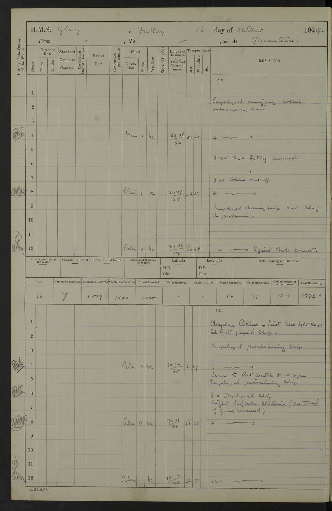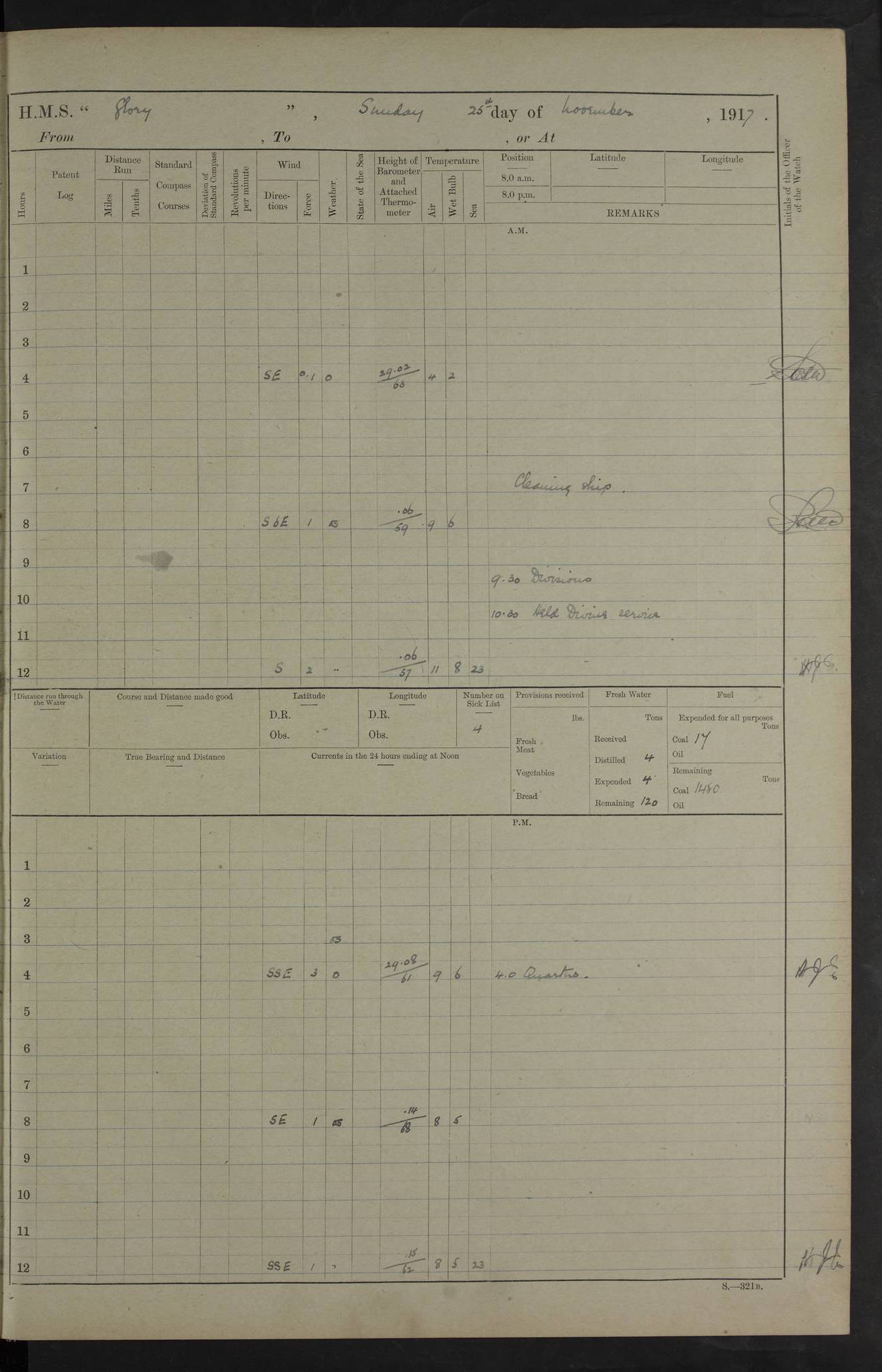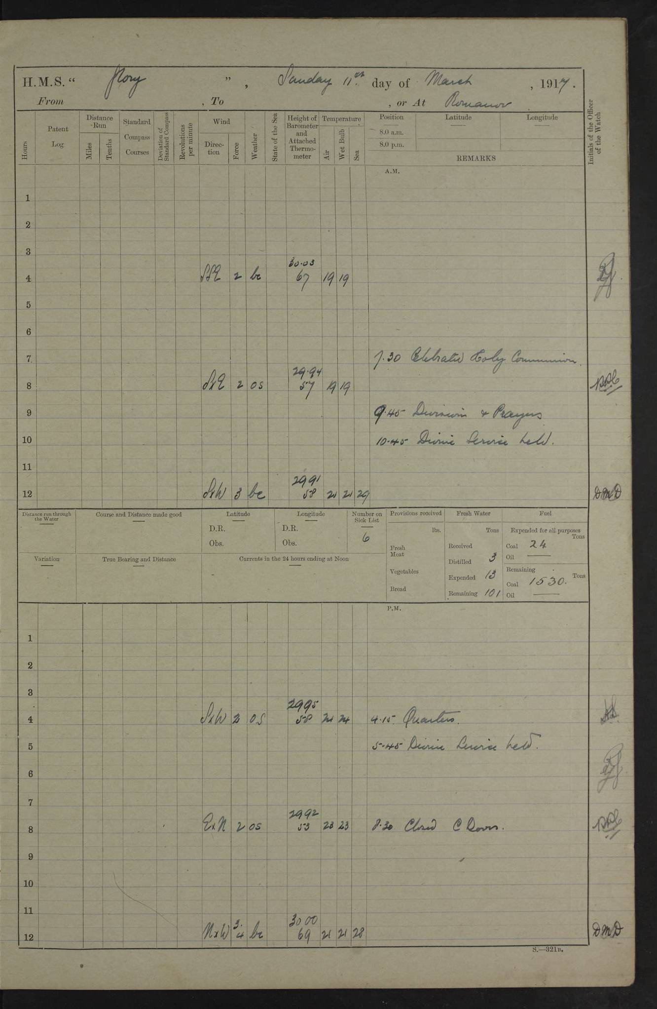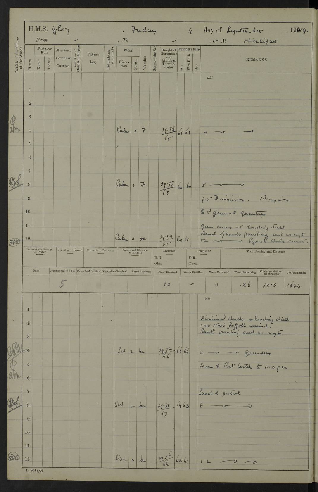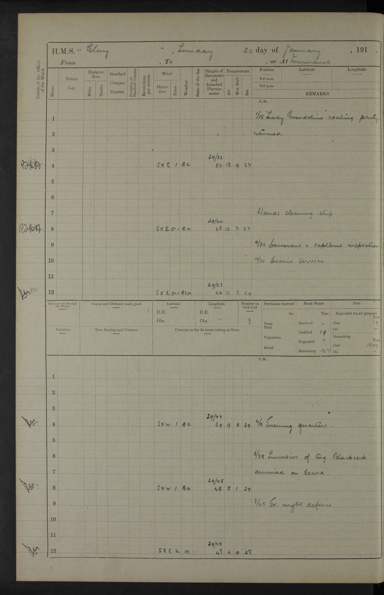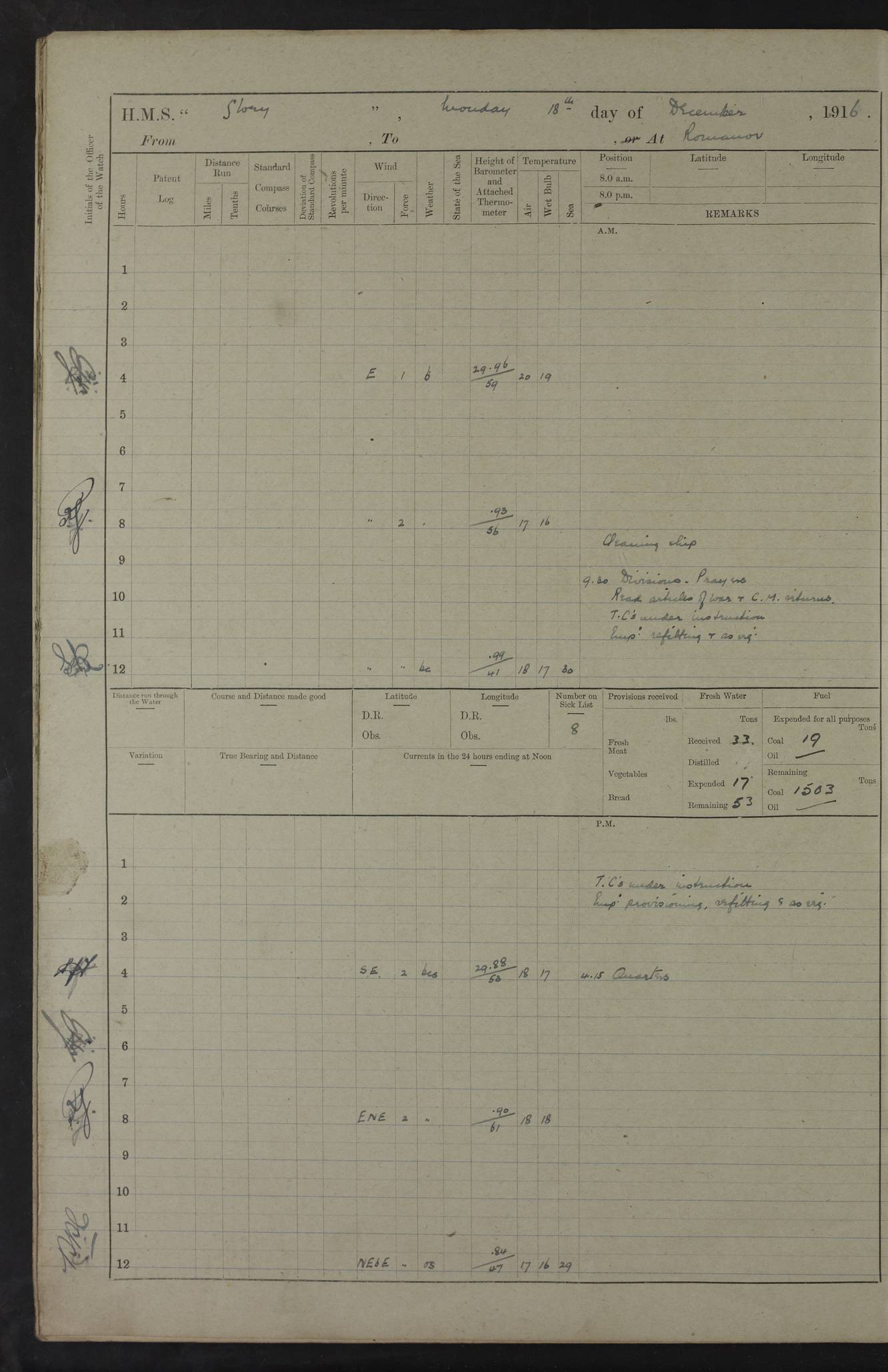 22 June 1915 At sea, Gibraltar to Lemnos Lat 36.1, Long -1.3 4.15am: Sighted land on starboard bow. 10.20am: Stopped port engine for repairs. 11.20am: proceeded with port engine. pm: a/c due to change in deviation. 10.00pm: Cape Tenez Light abeam, 18 miles. 4f73cd61a2fc8ea9030015f6: (https://s3.amazonaws.com:443/oldweather/ADM53-43015/0012_1.jpg) 23 June 1915 At sea, Gibraltar to Lemnos Lat 37.5, Long 4.8 Number on sick list: 4 5.00am: Secured from night defence stations. Placed anti-submarine guns. pm: Life saving appliances served out to men stationed in ? ?at abandon ship. 4f73cd61a2fc8ea9030015f7: (https://s3.amazonaws.com:443/oldweather/ADM53-43015/0013_0.jpg) 24 June 1915 At sea, Gibraltar to Lemnos Lat 37.4, Long 10.8 Position in log clearly bears no resemblance to the location of the ship. Position above is approximate and is based sighting of Zembra Island at 11.55am. 5.00am: Dispersed from night defence stations. Manned anti-submarine guns. am: Sighted two French torpedo boats. am: Torpedo boats passed to ~ No 362, 363. am: Sighted land on starboard beam. 11.55am: Zembra Island abeam, 25 miles. 2.00pm: Sighted Pantellaria S34ºE. 4.45pm: Pantellaria Light House abeam 12 miles. 4f73cd61a2fc8ea9030015f8: (https://s3.amazonaws.com:443/oldweather/ADM53-43015/0013_1.jpg) 25 June 1915 At sea, Gibraltar to Lemnos Lat 35.5, Long 16.7 2.10am: Gozo Light abeam 17 miles. 5.00am: Dispersed from night defence stations. Manned anti-submarine guns. 4f73cd61a2fc8ea9030015f9: (https://s3.amazonaws.com:443/oldweather/ADM53-43015/0014_0.jpg) 26 June 1915 At sea, Gibraltar to Lemnos Lat 35.5, Long 22.6 Number on sick list: 5 5.00am: Dispersed from night defence stations. Manned anti-submarine guns. am: Aired night clothing. am: marines at maxim practice on quarter deck. 2.00pm: Observed land on either bow. 3.00pm: Sighted French patrol destroyer. 4.15pm: Sighted French patrol destroyer. 9.40pm: Milo Peak N63ºW. 10.26pm: Polino Light abeam to port 5.5 miles. 4f73cd62a2fc8ea9030015fa: (https://s3.amazonaws.com:443/oldweather/ADM53-43015/0014_1.jpg) 27 June 1915 At sea and at Lemnos Lat 39.1, Long 24.4 From 0.50 to 3.05am sighting of multiple light houses. 3.50am: a/c to N39ºW and commenced to zig-zag. 5.00am: Dispersed from night defence stations and placed anti-submarine guns and look-outs. am: Lost overboard by accident Hazlewood fender, pat. 311, one in number. 10.30am: Held Divine Service onboard. pm: Met and signalled HMS Minerva on patrol duty. pm: Courses and speeds as requisite while waiting orders to approach Mudros. 3.00pm: Proceeded. 5.16pm: Increased to 90 revs, commenced to zig-zag. Course as requisite for Mudros. 7.00pm: Entered Mudros Bay. 7.47pm: Stopped. Let go port anchor in ‘M3’. 8.30pm: Darkened ship. pm: Manned one 6” and one 12 pdr. 4f73cd62a2fc8ea9030015fb: (https://s3.amazonaws.com:443/oldweather/ADM53-43015/0015_0.jpg) 28 June 1915 Mudros Bay, Lemnos Lat 39.89, Long 25.24 5,00am: HMS Vengeance entered harbour. HMS Vengeance was a pre-dreadnought of the Canopus class, launched in 1899 at Vickers, Barrow, and sold for scrapping in 1921. Details at http://en.wikipedia.org/wiki/HMS_Vengeance_(1899) . am/pm/: hands preparing for coaling and about ship’s work. pm: Collier Wabana secured alongside. 4f73cd62a2fc8ea9030015fc: (https://s3.amazonaws.com:443/oldweather/ADM53-43015/0015_1.jpg) 29 June 1915 Mudros Bay, Lemnos Lat 39.89, Long 25.24 5.15am: Commenced coaling. 2.00pm: Finished coaling. Collier left. 4f73cd62a2fc8ea9030015fd: (https://s3.amazonaws.com:443/oldweather/ADM53-43015/0016_0.jpg) 30 June 1915 Mudros Bay, Lemnos Lat 39.89, Long 25.24 am: Parties away sanding, and with fire engines onshore. am: Boats away disembarking troops. am: French Flagship Patrie sailed. The Patrie was a French pre-dreadnought, launched at La Seyne shipyard in 1903, and stricken in 1921. Details at http://en.wikipedia.org/wiki/French_battleship_Patrie . 6.30pm: Hands to bathe. 4f73cd63a2fc8ea9030015fe: (https://s3.amazonaws.com:443/oldweather/ADM53-43015/0016_1.jpg) 4f73cd63a2fc8ea9030015ff: (https://s3.amazonaws.com:443/oldweather/ADM53-43015/0017_0.jpg) 4f73cd63a2fc8ea903001600: (https://s3.amazonaws.com:443/oldweather/ADM53-43015/0017_1.jpg) 4f73cd63a2fc8ea903001601: (https://s3.amazonaws.com:443/oldweather/ADM53-43015/0018_0.jpg) 4f73cd64a2fc8ea903001602: (https://s3.amazonaws.com:443/oldweather/ADM53-43015/0018_1.jpg) LOGS FOR JULY 1915 From July to October 1915, HMS Glory spent her time at Port Mudros. Certain activities typically took place daily and are not generally noted in the pages below. These activities include: Lighting fires in the picket boat around 4am and drawing the fires in the late evening; Divisions at around 9–9.30am and Evening Quarters at 4pm; Darken ship at around 8.30pm; Daily ‘cleaning ship’, with variations thereof; SBC (for ‘Signal Books Correct’) at the watch changes. 4f73cd64a2fc8ea903001603: (https://s3.amazonaws.com:443/oldweather/ADM53-43016/0000_0.jpg) 4f73cd64a2fc8ea903001604: (https://s3.amazonaws.com:443/oldweather/ADM53-43016/0000_1.jpg) 4f73cd65a2fc8ea903001605: (https://s3.amazonaws.com:443/oldweather/ADM53-43016/0001_0.jpg) 4f73cd65a2fc8ea903001606: (https://s3.amazonaws.com:443/oldweather/ADM53-43016/0001_1.jpg) 1 July 1915 Port Mudros Lat 39.89, Long 25.24 6.30am: Landed working parties preparing boom defence ships. am: Discharged Acting Commander Rayne to Hector. Hector was a kite balloon ship. No further details readily available. 5.00pm: Tug T.10 made fast astern. 7.15pm: HMS Venerable went out. 7.30pm: HMS Chatham went out. HMS Chatham was a ‘Town’ cruiser and lead ship of her class. She was launched in 1911 at Chatham Dockyard and sold in 1926. Details at http://en.wikipedia.org/wiki/HMS_Chatham_(1911) . 4f73cd65a2fc8ea903001607: (https://s3.amazonaws.com:443/oldweather/ADM53-43016/0002_0.jpg) 2 July 1915 Port Mudros Lat 39.89, Long 25.24 5.35am: Landed working parties preparing boom defence ships. am/pm: Boom defence par