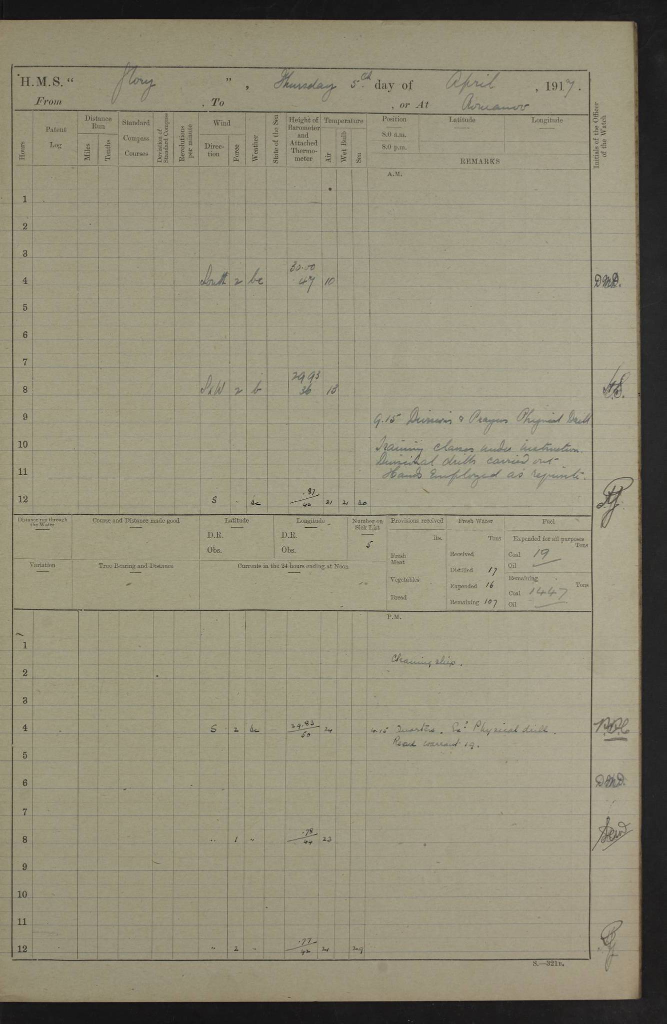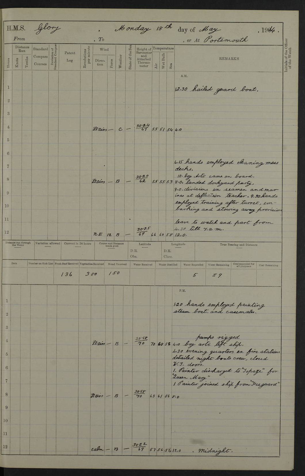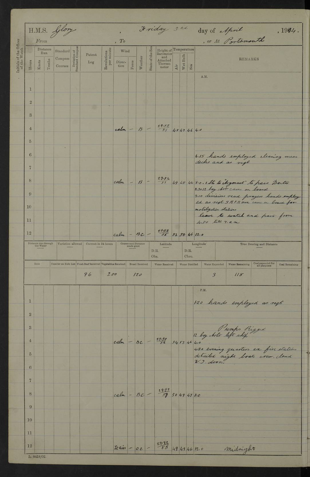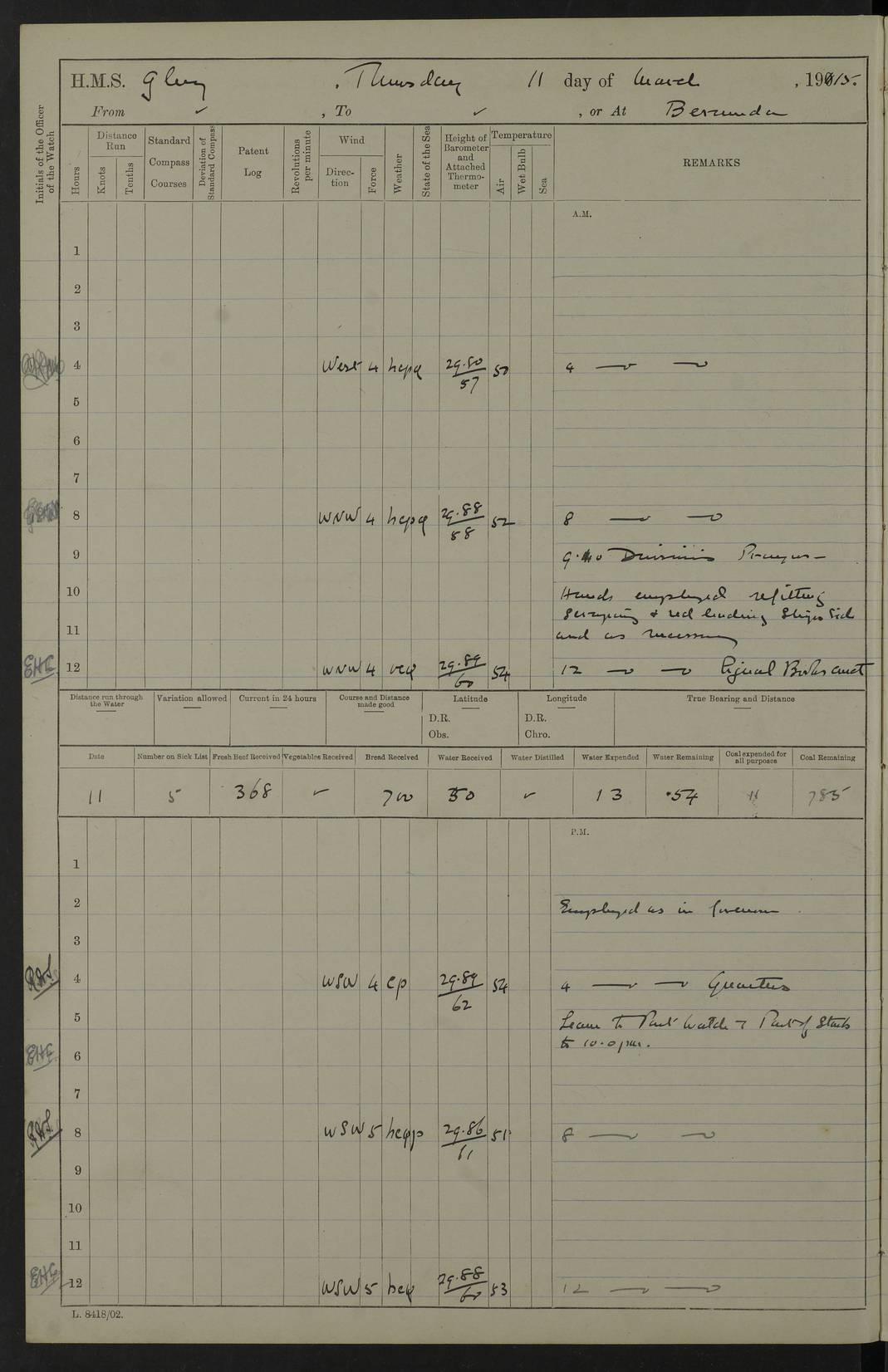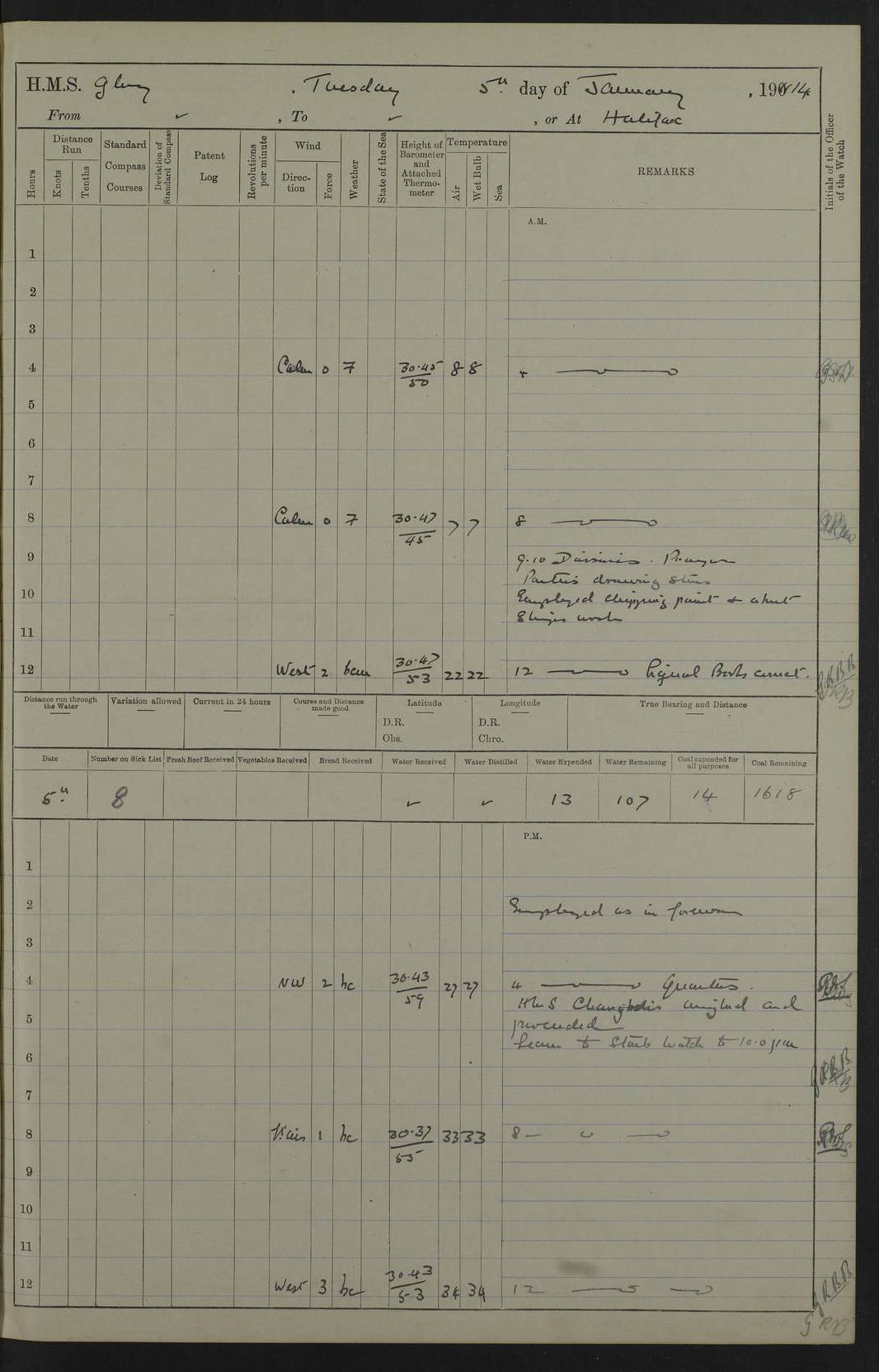 22 June 1915 At sea, Gibraltar to Lemnos Lat 36.1, Long -1.3 4.15am: Sighted land on starboard bow. 10.20am: Stopped port engine for repairs. 11.20am: proceeded with port engine. pm: a/c due to change in deviation. 10.00pm: Cape Tenez Light abeam, 18 miles. 4f73cd61a2fc8ea9030015f6: (https://s3.amazonaws.com:443/oldweather/ADM53-43015/0012_1.jpg) 23 June 1915 At sea, Gibraltar to Lemnos Lat 37.5, Long 4.8 Number on sick list: 4 5.00am: Secured from night defence stations. Placed anti-submarine guns. pm: Life saving appliances served out to men stationed in ? ?at abandon ship. 4f73cd61a2fc8ea9030015f7: (https://s3.amazonaws.com:443/oldweather/ADM53-43015/0013_0.jpg) 24 June 1915 At sea, Gibraltar to Lemnos Lat 37.4, Long 10.8 Position in log clearly bears no resemblance to the location of the ship. Position above is approximate and is based sighting of Zembra Island at 11.55am. 5.00am: Dispersed from night defence stations. Manned anti-submarine guns. am: Sighted two French torpedo boats. am: Torpedo boats passed to ~ No 362, 363. am: Sighted land on starboard beam. 11.55am: Zembra Island abeam, 25 miles. 2.00pm: Sighted Pantellaria S34ºE. 4.45pm: Pantellaria Light House abeam 12 miles. 4f73cd61a2fc8ea9030015f8: (https://s3.amazonaws.com:443/oldweather/ADM53-43015/0013_1.jpg) 25 June 1915 At sea, Gibraltar to Lemnos Lat 35.5, Long 16.7 2.10am: Gozo Light abeam 17 miles. 5.00am: Dispersed from night defence stations. Manned anti-submarine guns. 4f73cd61a2fc8ea9030015f9: (https://s3.amazonaws.com:443/oldweather/ADM53-43015/0014_0.jpg) 26 June 1915 At sea, Gibraltar to Lemnos Lat 35.5, Long 22.6 Number on sick list: 5 5.00am: Dispersed from night defence stations. Manned anti-submarine guns. am: Aired night clothing. am: marines at maxim practice on quarter deck. 2.00pm: Observed land on either bow. 3.00pm: Sighted French patrol destroyer. 4.15pm: Sighted French patrol destroyer. 9.40pm: Milo Peak N63ºW. 10.26pm: Polino Light abeam to port 5.5 miles. 4f73cd62a2fc8ea9030015fa: (https://s3.amazonaws.com:443/oldweather/ADM53-43015/0014_1.jpg) 27 June 1915 At sea and at Lemnos Lat 39.1, Long 24.4 From 0.50 to 3.05am sighting of multiple light houses. 3.50am: a/c to N39ºW and commenced to zig-zag. 5.00am: Dispersed from night defence stations and placed anti-submarine guns and look-outs. am: Lost overboard by accident Hazlewood fender, pat. 311, one in number. 10.30am: Held Divine Service onboard. pm: Met and signalled HMS Minerva on patrol duty. pm: Courses and speeds as requisite while waiting orders to approach Mudros. 3.00pm: Proceeded. 5.16pm: Increased to 90 revs, commenced to zig-zag. Course as requisite for Mudros. 7.00pm: Entered Mudros Bay. 7.47pm: Stopped. Let go port anchor in ‘M3’. 8.30pm: Darkened ship. pm: Manned one 6” and one 12 pdr. 4f73cd62a2fc8ea9030015fb: (https://s3.amazonaws.com:443/oldweather/ADM53-43015/0015_0.jpg) 28 June 1915 Mudros Bay, Lemnos Lat 39.89, Long 25.24 5,00am: HMS Vengeance entered harbour. HMS Vengeance was a pre-dreadnought of the Canopus class, launched in 1899 at Vickers, Barrow, and sold for scrapping in 1921. Details at http://en.wikipedia.org/wiki/HMS_Vengeance_(1899) . am/pm/: hands preparing for coaling and about ship’s work. pm: Collier Wabana secured alongside. 4f73cd62a2fc8ea9030015fc: (https://s3.amazonaws.com:443/oldweather/ADM53-43015/0015_1.jpg) 29 June 1915 Mudros Bay, Lemnos Lat 39.89, Long 25.24 5.15am: Commenced coaling. 2.00pm: Finished coaling. Collier left. 4f73cd62a2fc8ea9030015fd: (https://s3.amazonaws.com:443/oldweather/ADM53-43015/0016_0.jpg) 30 June 1915 Mudros Bay, Lemnos Lat 39.89, Long 25.24 am: Parties away sanding, and with fire engines onshore. am: Boats away disembarking troops. am: French Flagship Patrie sailed. The Patrie was a French pre-dreadnought, launched at La Seyne shipyard in 1903, and stricken in 1921. Details at http://en.wikipedia.org/wiki/French_battleship_Patrie . 6.30pm: Hands to bathe. 4f73cd63a2fc8ea9030015fe: (https://s3.amazonaws.com:443/oldweather/ADM53-43015/0016_1.jpg) 4f73cd63a2fc8ea9030015ff: (https://s3.amazonaws.com:443/oldweather/ADM53-43015/0017_0.jpg) 4f73cd63a2fc8ea903001600: (https://s3.amazonaws.com:443/oldweather/ADM53-43015/0017_1.jpg) 4f73cd63a2fc8ea903001601: (https://s3.amazonaws.com:443/oldweather/ADM53-43015/0018_0.jpg) 4f73cd64a2fc8ea903001602: (https://s3.amazonaws.com:443/oldweather/ADM53-43015/0018_1.jpg) LOGS FOR JULY 1915 From July to October 1915, HMS Glory spent her time at Port Mudros. Certain activities typically took place daily and are not generally noted in the pages below. These activities include: Lighting fires in the picket boat around 4am and drawing the fires in the late evening; Divisions at around 9–9.30am and Evening Quarters at 4pm; Darken ship at around 8.30pm; Daily ‘cleaning ship’, with variations thereof; SBC (for ‘Signal Books Correct’) at the watch changes. 4f73cd64a2fc8ea903001603: (https://s3.amazonaws.com:443/oldweather/ADM53-43016/0000_0.jpg) 4f73cd64a2fc8ea903001604: (https://s3.amazonaws.com:443/oldweather/ADM53-43016/0000_1.jpg) 4f73cd65a2fc8ea903001605: (https://s3.amazonaws.com:443/oldweather/ADM53-43016/0001_0.jpg) 4f73cd65a2fc8ea903001606: (https://s3.amazonaws.com:443/oldweather/ADM53-43016/0001_1.jpg) 1 July 1915 Port Mudros Lat 39.89, Long 25.24 6.30am: Landed working parties preparing boom defence ships. am: Discharged Acting Commander Rayne to Hector. Hector was a kite balloon ship. No further details readily available. 5.00pm: Tug T.10 made fast astern. 7.15pm: HMS Venerable went out. 7.30pm: HMS Chatham went out. HMS Chatham was a ‘Town’ cruiser and lead ship of her class. She was launched in 1911 at Chatham Dockyard and sold in 1926. Details at http://en.wikipedia.org/wiki/HMS_Chatham_(1911) . 4f73cd65a2fc8ea903001607: (https://s3.amazonaws.com:443/oldweather/ADM53-43016/0002_0.jpg) 2 July 1915 Port Mudros Lat 39.89, Long 25.24 5.35am: Landed working parties preparing boom defence ships. am/pm: Boom defence par