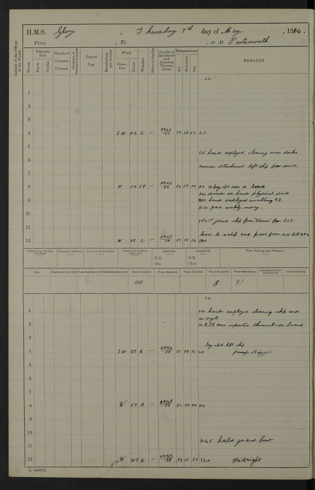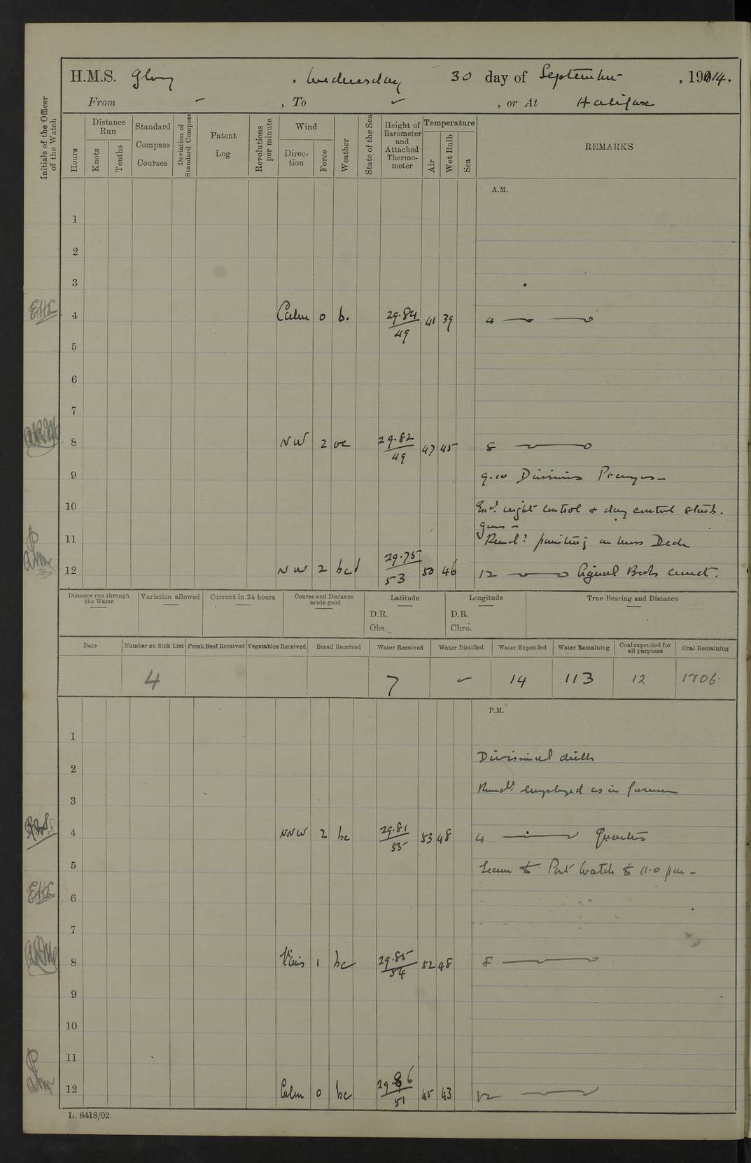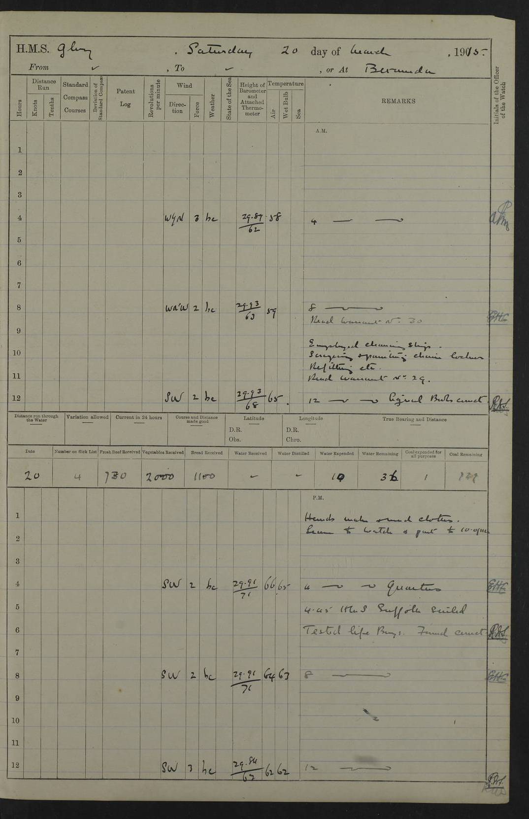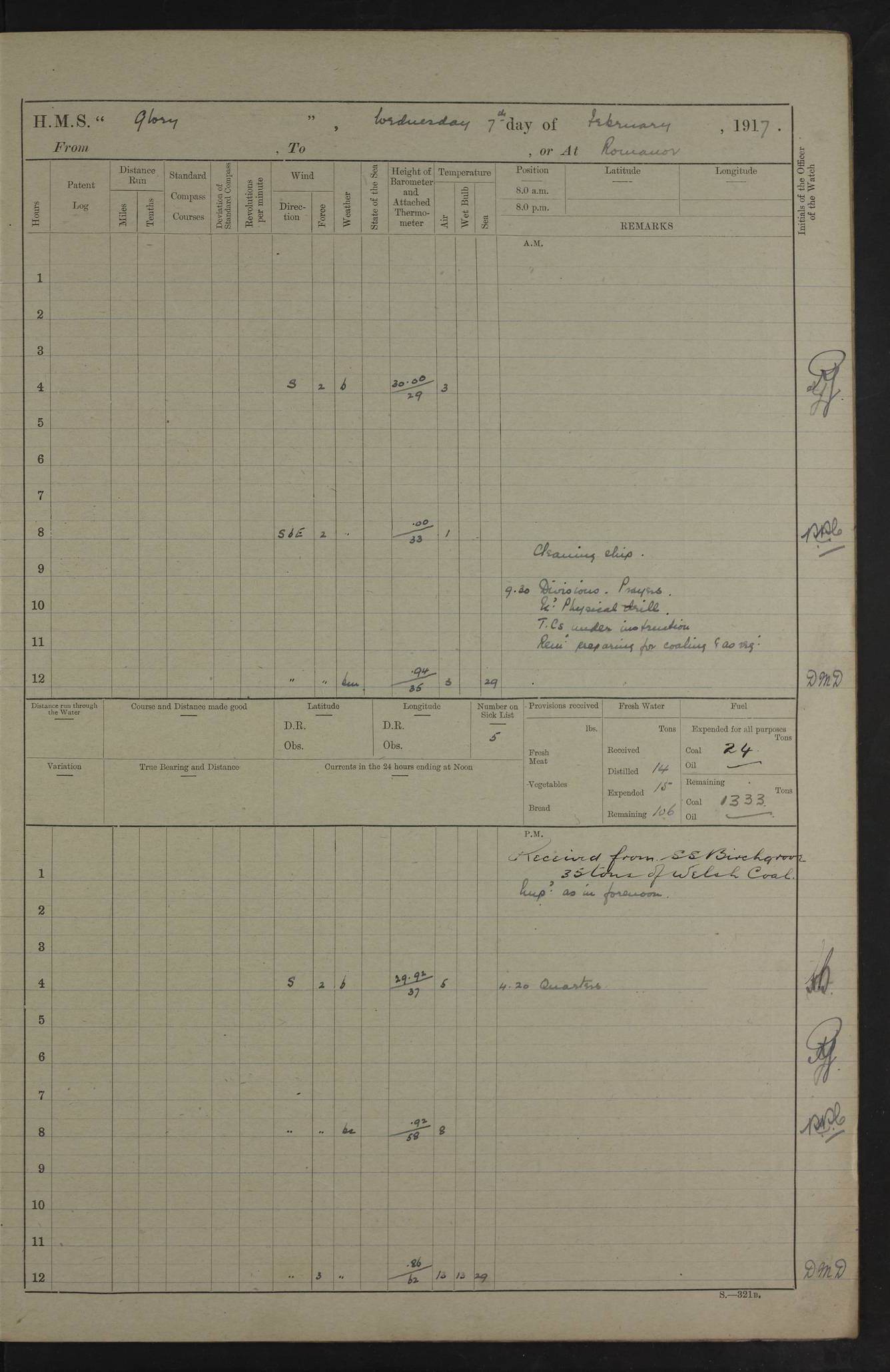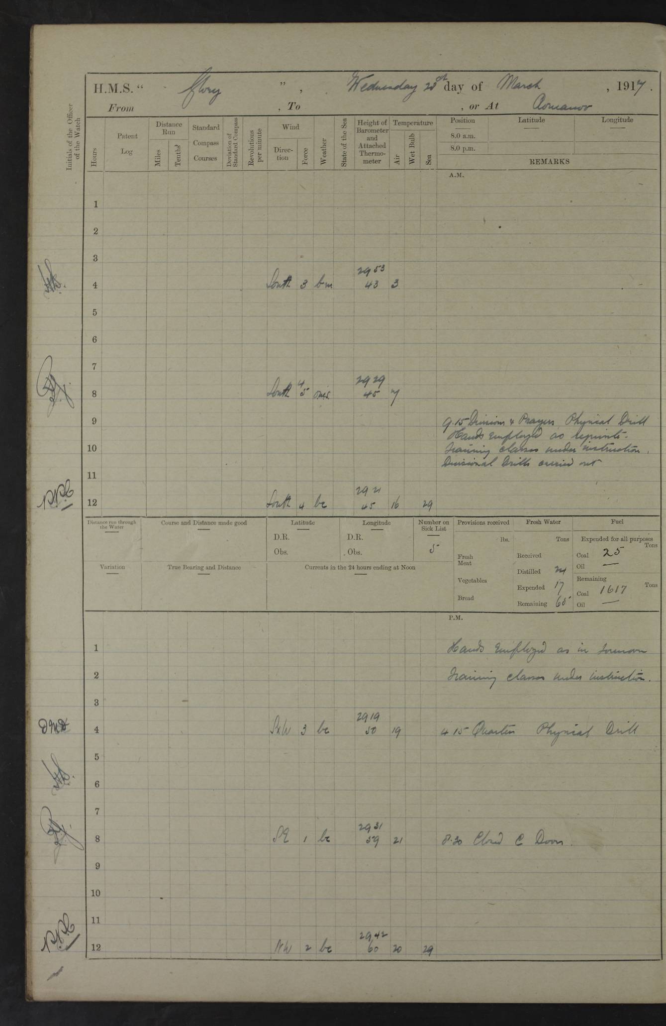 22 June 1915 At sea, Gibraltar to Lemnos Lat 36.1, Long -1.3 4.15am: Sighted land on starboard bow. 10.20am: Stopped port engine for repairs. 11.20am: proceeded with port engine. pm: a/c due to change in deviation. 10.00pm: Cape Tenez Light abeam, 18 miles. 4f73cd61a2fc8ea9030015f6: (https://s3.amazonaws.com:443/oldweather/ADM53-43015/0012_1.jpg) 23 June 1915 At sea, Gibraltar to Lemnos Lat 37.5, Long 4.8 Number on sick list: 4 5.00am: Secured from night defence stations. Placed anti-submarine guns. pm: Life saving appliances served out to men stationed in ? ?at abandon ship. 4f73cd61a2fc8ea9030015f7: (https://s3.amazonaws.com:443/oldweather/ADM53-43015/0013_0.jpg) 24 June 1915 At sea, Gibraltar to Lemnos Lat 37.4, Long 10.8 Position in log clearly bears no resemblance to the location of the ship. Position above is approximate and is based sighting of Zembra Island at 11.55am. 5.00am: Dispersed from night defence stations. Manned anti-submarine guns. am: Sighted two French torpedo boats. am: Torpedo boats passed to ~ No 362, 363. am: Sighted land on starboard beam. 11.55am: Zembra Island abeam, 25 miles. 2.00pm: Sighted Pantellaria S34ºE. 4.45pm: Pantellaria Light House abeam 12 miles. 4f73cd61a2fc8ea9030015f8: (https://s3.amazonaws.com:443/oldweather/ADM53-43015/0013_1.jpg) 25 June 1915 At sea, Gibraltar to Lemnos Lat 35.5, Long 16.7 2.10am: Gozo Light abeam 17 miles. 5.00am: Dispersed from night defence stations. Manned anti-submarine guns. 4f73cd61a2fc8ea9030015f9: (https://s3.amazonaws.com:443/oldweather/ADM53-43015/0014_0.jpg) 26 June 1915 At sea, Gibraltar to Lemnos Lat 35.5, Long 22.6 Number on sick list: 5 5.00am: Dispersed from night defence stations. Manned anti-submarine guns. am: Aired night clothing. am: marines at maxim practice on quarter deck. 2.00pm: Observed land on either bow. 3.00pm: Sighted French patrol destroyer. 4.15pm: Sighted French patrol destroyer. 9.40pm: Milo Peak N63ºW. 10.26pm: Polino Light abeam to port 5.5 miles. 4f73cd62a2fc8ea9030015fa: (https://s3.amazonaws.com:443/oldweather/ADM53-43015/0014_1.jpg) 27 June 1915 At sea and at Lemnos Lat 39.1, Long 24.4 From 0.50 to 3.05am sighting of multiple light houses. 3.50am: a/c to N39ºW and commenced to zig-zag. 5.00am: Dispersed from night defence stations and placed anti-submarine guns and look-outs. am: Lost overboard by accident Hazlewood fender, pat. 311, one in number. 10.30am: Held Divine Service onboard. pm: Met and signalled HMS Minerva on patrol duty. pm: Courses and speeds as requisite while waiting orders to approach Mudros. 3.00pm: Proceeded. 5.16pm: Increased to 90 revs, commenced to zig-zag. Course as requisite for Mudros. 7.00pm: Entered Mudros Bay. 7.47pm: Stopped. Let go port anchor in ‘M3’. 8.30pm: Darkened ship. pm: Manned one 6” and one 12 pdr. 4f73cd62a2fc8ea9030015fb: (https://s3.amazonaws.com:443/oldweather/ADM53-43015/0015_0.jpg) 28 June 1915 Mudros Bay, Lemnos Lat 39.89, Long 25.24 5,00am: HMS Vengeance entered harbour. HMS Vengeance was a pre-dreadnought of the Canopus class, launched in 1899 at Vickers, Barrow, and sold for scrapping in 1921. Details at http://en.wikipedia.org/wiki/HMS_Vengeance_(1899) . am/pm/: hands preparing for coaling and about ship’s work. pm: Collier Wabana secured alongside. 4f73cd62a2fc8ea9030015fc: (https://s3.amazonaws.com:443/oldweather/ADM53-43015/0015_1.jpg) 29 June 1915 Mudros Bay, Lemnos Lat 39.89, Long 25.24 5.15am: Commenced coaling. 2.00pm: Finished coaling. Collier left. 4f73cd62a2fc8ea9030015fd: (https://s3.amazonaws.com:443/oldweather/ADM53-43015/0016_0.jpg) 30 June 1915 Mudros Bay, Lemnos Lat 39.89, Long 25.24 am: Parties away sanding, and with fire engines onshore. am: Boats away disembarking troops. am: French Flagship Patrie sailed. The Patrie was a French pre-dreadnought, launched at La Seyne shipyard in 1903, and stricken in 1921. Details at http://en.wikipedia.org/wiki/French_battleship_Patrie . 6.30pm: Hands to bathe. 4f73cd63a2fc8ea9030015fe: (https://s3.amazonaws.com:443/oldweather/ADM53-43015/0016_1.jpg) 4f73cd63a2fc8ea9030015ff: (https://s3.amazonaws.com:443/oldweather/ADM53-43015/0017_0.jpg) 4f73cd63a2fc8ea903001600: (https://s3.amazonaws.com:443/oldweather/ADM53-43015/0017_1.jpg) 4f73cd63a2fc8ea903001601: (https://s3.amazonaws.com:443/oldweather/ADM53-43015/0018_0.jpg) 4f73cd64a2fc8ea903001602: (https://s3.amazonaws.com:443/oldweather/ADM53-43015/0018_1.jpg) LOGS FOR JULY 1915 From July to October 1915, HMS Glory spent her time at Port Mudros. Certain activities typically took place daily and are not generally noted in the pages below. These activities include: Lighting fires in the picket boat around 4am and drawing the fires in the late evening; Divisions at around 9–9.30am and Evening Quarters at 4pm; Darken ship at around 8.30pm; Daily ‘cleaning ship’, with variations thereof; SBC (for ‘Signal Books Correct’) at the watch changes. 4f73cd64a2fc8ea903001603: (https://s3.amazonaws.com:443/oldweather/ADM53-43016/0000_0.jpg) 4f73cd64a2fc8ea903001604: (https://s3.amazonaws.com:443/oldweather/ADM53-43016/0000_1.jpg) 4f73cd65a2fc8ea903001605: (https://s3.amazonaws.com:443/oldweather/ADM53-43016/0001_0.jpg) 4f73cd65a2fc8ea903001606: (https://s3.amazonaws.com:443/oldweather/ADM53-43016/0001_1.jpg) 1 July 1915 Port Mudros Lat 39.89, Long 25.24 6.30am: Landed working parties preparing boom defence ships. am: Discharged Acting Commander Rayne to Hector. Hector was a kite balloon ship. No further details readily available. 5.00pm: Tug T.10 made fast astern. 7.15pm: HMS Venerable went out. 7.30pm: HMS Chatham went out. HMS Chatham was a ‘Town’ cruiser and lead ship of her class. She was launched in 1911 at Chatham Dockyard and sold in 1926. Details at http://en.wikipedia.org/wiki/HMS_Chatham_(1911) . 4f73cd65a2fc8ea903001607: (https://s3.amazonaws.com:443/oldweather/ADM53-43016/0002_0.jpg) 2 July 1915 Port Mudros Lat 39.89, Long 25.24 5.35am: Landed working parties preparing boom defence ships. am/pm: Boom defence par