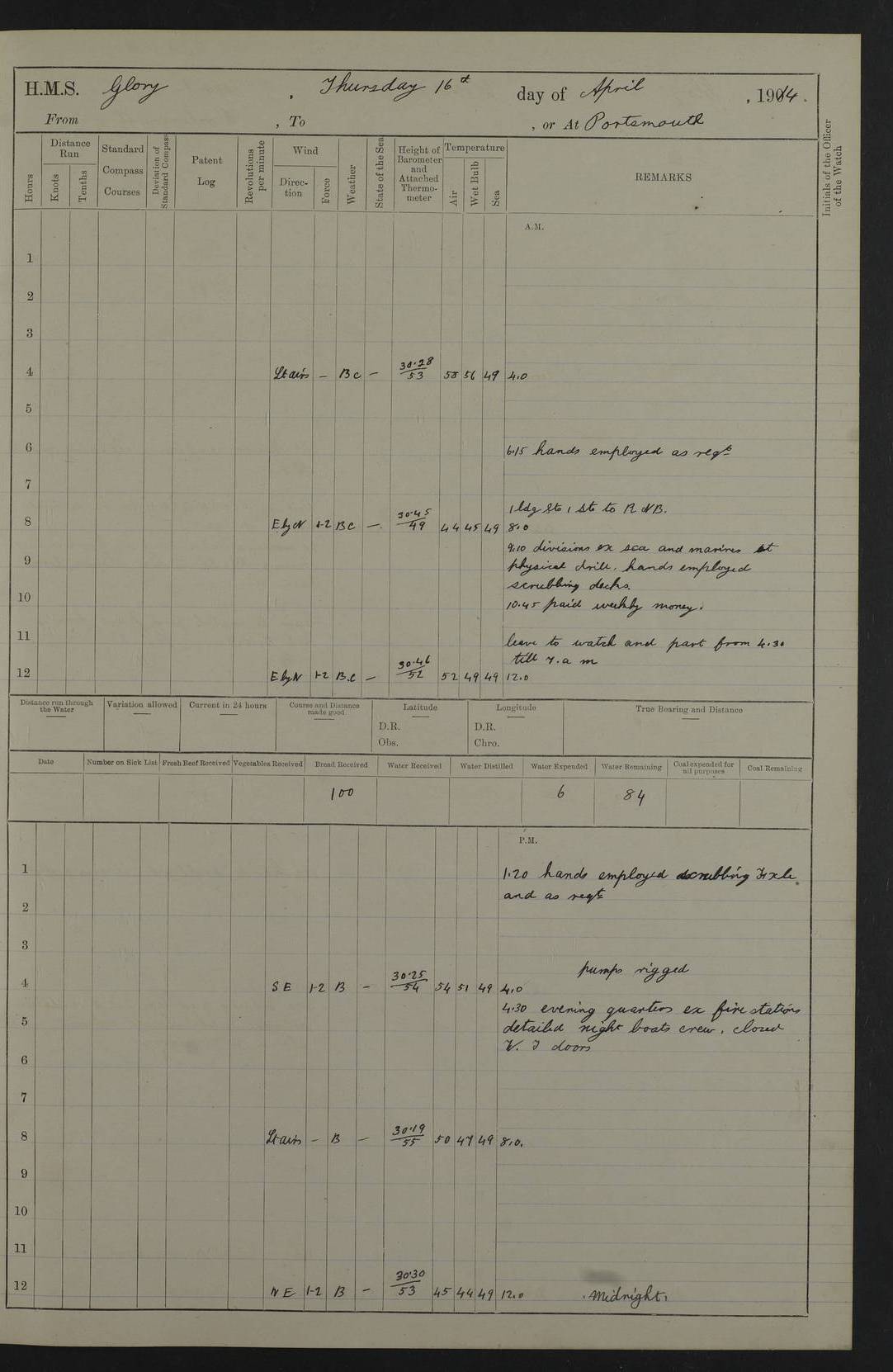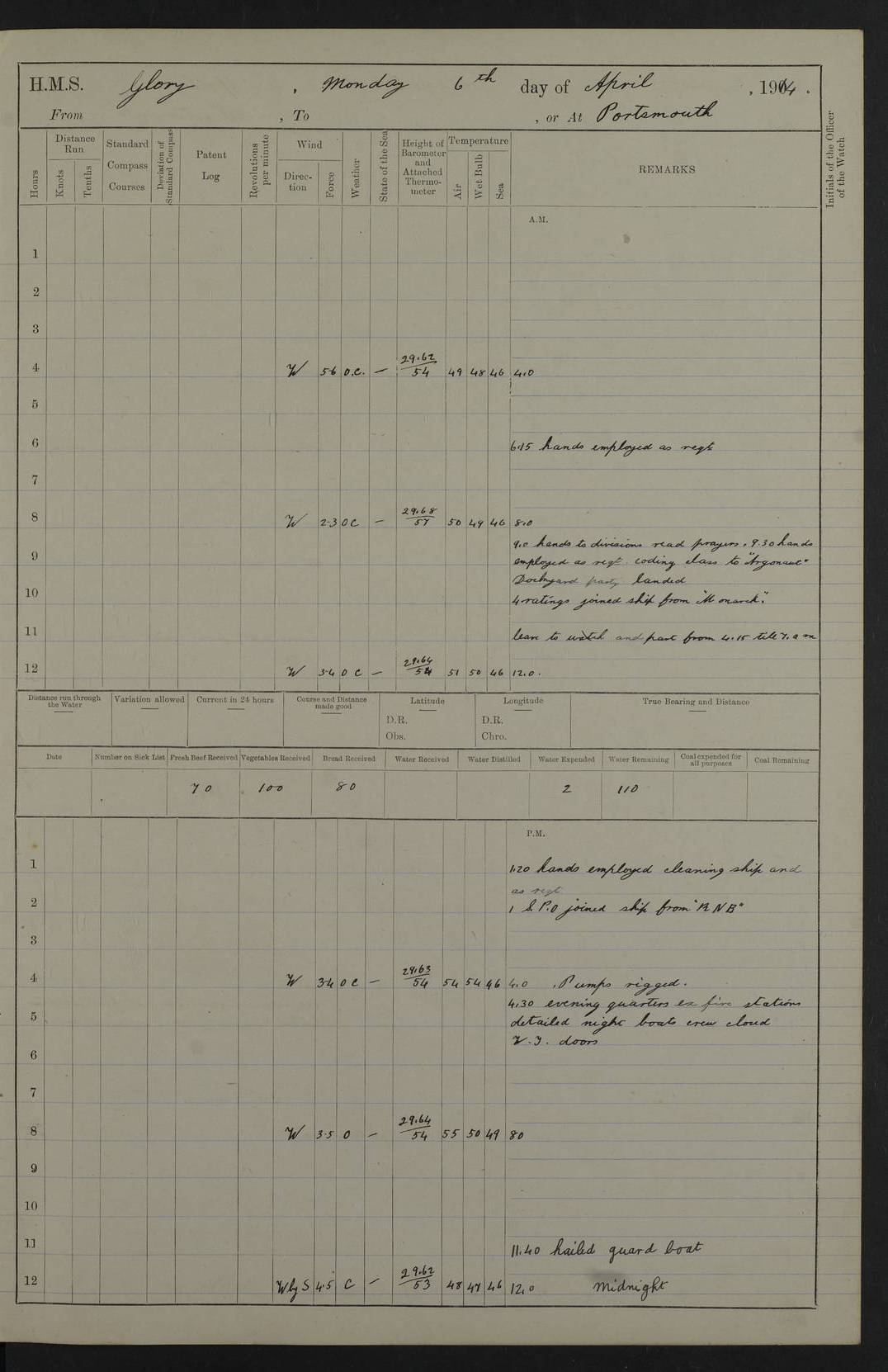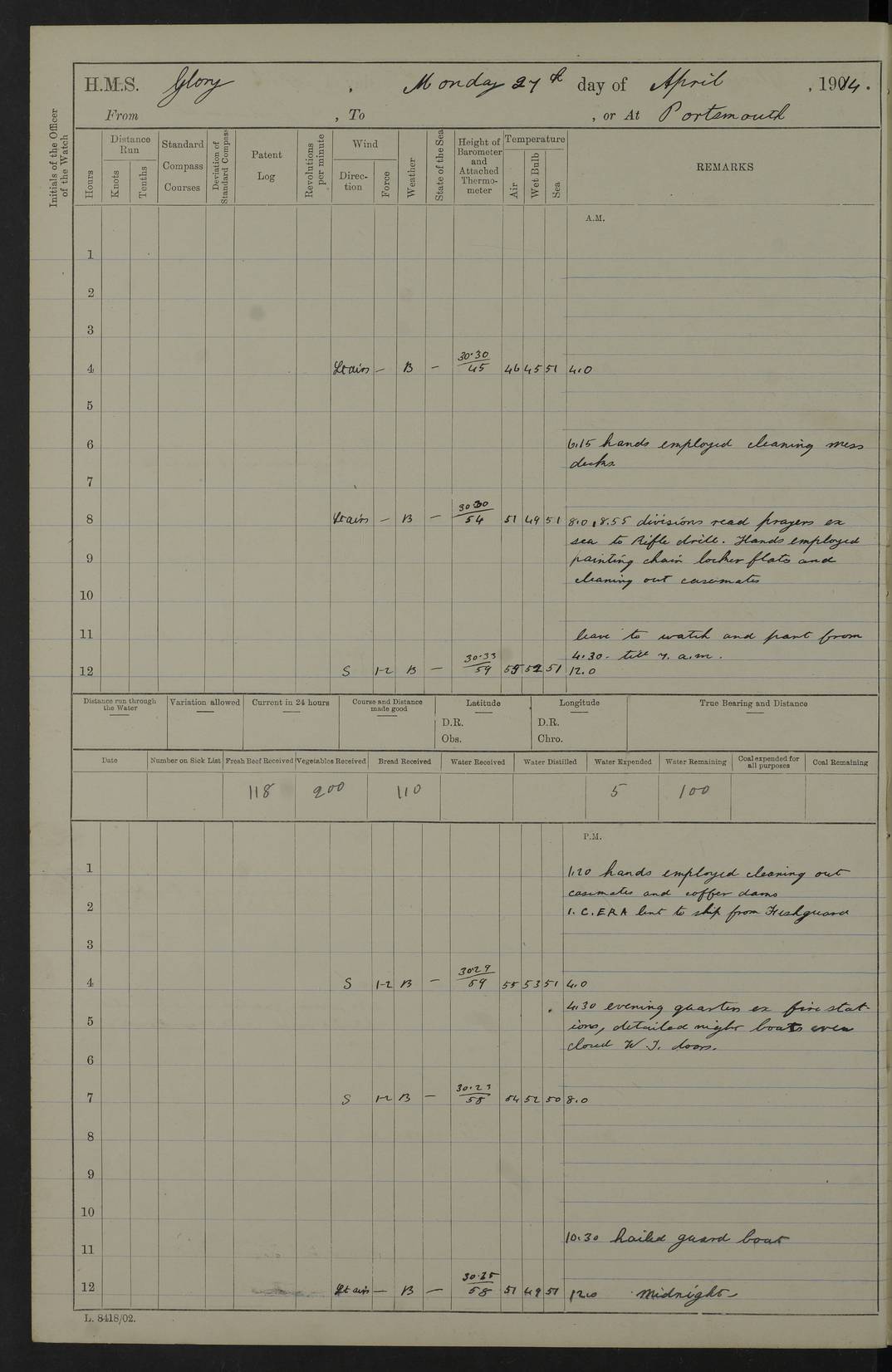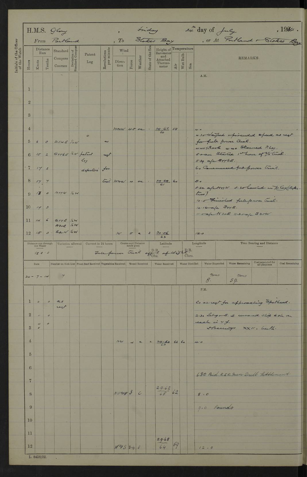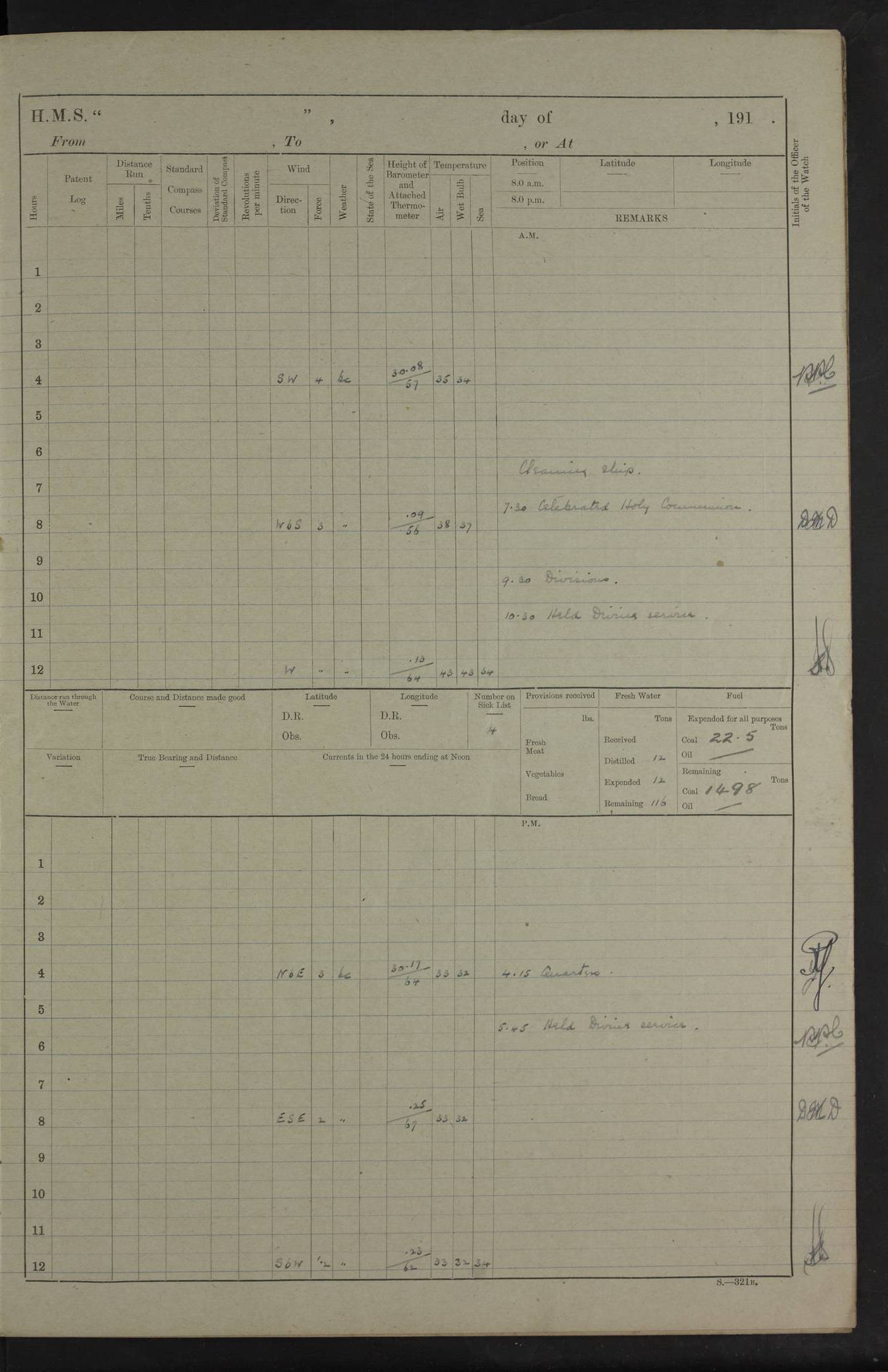 22 June 1915 At sea, Gibraltar to Lemnos Lat 36.1, Long -1.3 4.15am: Sighted land on starboard bow. 10.20am: Stopped port engine for repairs. 11.20am: proceeded with port engine. pm: a/c due to change in deviation. 10.00pm: Cape Tenez Light abeam, 18 miles. 4f73cd61a2fc8ea9030015f6: (https://s3.amazonaws.com:443/oldweather/ADM53-43015/0012_1.jpg) 23 June 1915 At sea, Gibraltar to Lemnos Lat 37.5, Long 4.8 Number on sick list: 4 5.00am: Secured from night defence stations. Placed anti-submarine guns. pm: Life saving appliances served out to men stationed in ? ?at abandon ship. 4f73cd61a2fc8ea9030015f7: (https://s3.amazonaws.com:443/oldweather/ADM53-43015/0013_0.jpg) 24 June 1915 At sea, Gibraltar to Lemnos Lat 37.4, Long 10.8 Position in log clearly bears no resemblance to the location of the ship. Position above is approximate and is based sighting of Zembra Island at 11.55am. 5.00am: Dispersed from night defence stations. Manned anti-submarine guns. am: Sighted two French torpedo boats. am: Torpedo boats passed to ~ No 362, 363. am: Sighted land on starboard beam. 11.55am: Zembra Island abeam, 25 miles. 2.00pm: Sighted Pantellaria S34ºE. 4.45pm: Pantellaria Light House abeam 12 miles. 4f73cd61a2fc8ea9030015f8: (https://s3.amazonaws.com:443/oldweather/ADM53-43015/0013_1.jpg) 25 June 1915 At sea, Gibraltar to Lemnos Lat 35.5, Long 16.7 2.10am: Gozo Light abeam 17 miles. 5.00am: Dispersed from night defence stations. Manned anti-submarine guns. 4f73cd61a2fc8ea9030015f9: (https://s3.amazonaws.com:443/oldweather/ADM53-43015/0014_0.jpg) 26 June 1915 At sea, Gibraltar to Lemnos Lat 35.5, Long 22.6 Number on sick list: 5 5.00am: Dispersed from night defence stations. Manned anti-submarine guns. am: Aired night clothing. am: marines at maxim practice on quarter deck. 2.00pm: Observed land on either bow. 3.00pm: Sighted French patrol destroyer. 4.15pm: Sighted French patrol destroyer. 9.40pm: Milo Peak N63ºW. 10.26pm: Polino Light abeam to port 5.5 miles. 4f73cd62a2fc8ea9030015fa: (https://s3.amazonaws.com:443/oldweather/ADM53-43015/0014_1.jpg) 27 June 1915 At sea and at Lemnos Lat 39.1, Long 24.4 From 0.50 to 3.05am sighting of multiple light houses. 3.50am: a/c to N39ºW and commenced to zig-zag. 5.00am: Dispersed from night defence stations and placed anti-submarine guns and look-outs. am: Lost overboard by accident Hazlewood fender, pat. 311, one in number. 10.30am: Held Divine Service onboard. pm: Met and signalled HMS Minerva on patrol duty. pm: Courses and speeds as requisite while waiting orders to approach Mudros. 3.00pm: Proceeded. 5.16pm: Increased to 90 revs, commenced to zig-zag. Course as requisite for Mudros. 7.00pm: Entered Mudros Bay. 7.47pm: Stopped. Let go port anchor in ‘M3’. 8.30pm: Darkened ship. pm: Manned one 6” and one 12 pdr. 4f73cd62a2fc8ea9030015fb: (https://s3.amazonaws.com:443/oldweather/ADM53-43015/0015_0.jpg) 28 June 1915 Mudros Bay, Lemnos Lat 39.89, Long 25.24 5,00am: HMS Vengeance entered harbour. HMS Vengeance was a pre-dreadnought of the Canopus class, launched in 1899 at Vickers, Barrow, and sold for scrapping in 1921. Details at http://en.wikipedia.org/wiki/HMS_Vengeance_(1899) . am/pm/: hands preparing for coaling and about ship’s work. pm: Collier Wabana secured alongside. 4f73cd62a2fc8ea9030015fc: (https://s3.amazonaws.com:443/oldweather/ADM53-43015/0015_1.jpg) 29 June 1915 Mudros Bay, Lemnos Lat 39.89, Long 25.24 5.15am: Commenced coaling. 2.00pm: Finished coaling. Collier left. 4f73cd62a2fc8ea9030015fd: (https://s3.amazonaws.com:443/oldweather/ADM53-43015/0016_0.jpg) 30 June 1915 Mudros Bay, Lemnos Lat 39.89, Long 25.24 am: Parties away sanding, and with fire engines onshore. am: Boats away disembarking troops. am: French Flagship Patrie sailed. The Patrie was a French pre-dreadnought, launched at La Seyne shipyard in 1903, and stricken in 1921. Details at http://en.wikipedia.org/wiki/French_battleship_Patrie . 6.30pm: Hands to bathe. 4f73cd63a2fc8ea9030015fe: (https://s3.amazonaws.com:443/oldweather/ADM53-43015/0016_1.jpg) 4f73cd63a2fc8ea9030015ff: (https://s3.amazonaws.com:443/oldweather/ADM53-43015/0017_0.jpg) 4f73cd63a2fc8ea903001600: (https://s3.amazonaws.com:443/oldweather/ADM53-43015/0017_1.jpg) 4f73cd63a2fc8ea903001601: (https://s3.amazonaws.com:443/oldweather/ADM53-43015/0018_0.jpg) 4f73cd64a2fc8ea903001602: (https://s3.amazonaws.com:443/oldweather/ADM53-43015/0018_1.jpg) LOGS FOR JULY 1915 From July to October 1915, HMS Glory spent her time at Port Mudros. Certain activities typically took place daily and are not generally noted in the pages below. These activities include: Lighting fires in the picket boat around 4am and drawing the fires in the late evening; Divisions at around 9–9.30am and Evening Quarters at 4pm; Darken ship at around 8.30pm; Daily ‘cleaning ship’, with variations thereof; SBC (for ‘Signal Books Correct’) at the watch changes. 4f73cd64a2fc8ea903001603: (https://s3.amazonaws.com:443/oldweather/ADM53-43016/0000_0.jpg) 4f73cd64a2fc8ea903001604: (https://s3.amazonaws.com:443/oldweather/ADM53-43016/0000_1.jpg) 4f73cd65a2fc8ea903001605: (https://s3.amazonaws.com:443/oldweather/ADM53-43016/0001_0.jpg) 4f73cd65a2fc8ea903001606: (https://s3.amazonaws.com:443/oldweather/ADM53-43016/0001_1.jpg) 1 July 1915 Port Mudros Lat 39.89, Long 25.24 6.30am: Landed working parties preparing boom defence ships. am: Discharged Acting Commander Rayne to Hector. Hector was a kite balloon ship. No further details readily available. 5.00pm: Tug T.10 made fast astern. 7.15pm: HMS Venerable went out. 7.30pm: HMS Chatham went out. HMS Chatham was a ‘Town’ cruiser and lead ship of her class. She was launched in 1911 at Chatham Dockyard and sold in 1926. Details at http://en.wikipedia.org/wiki/HMS_Chatham_(1911) . 4f73cd65a2fc8ea903001607: (https://s3.amazonaws.com:443/oldweather/ADM53-43016/0002_0.jpg) 2 July 1915 Port Mudros Lat 39.89, Long 25.24 5.35am: Landed working parties preparing boom defence ships. am/pm: Boom defence par