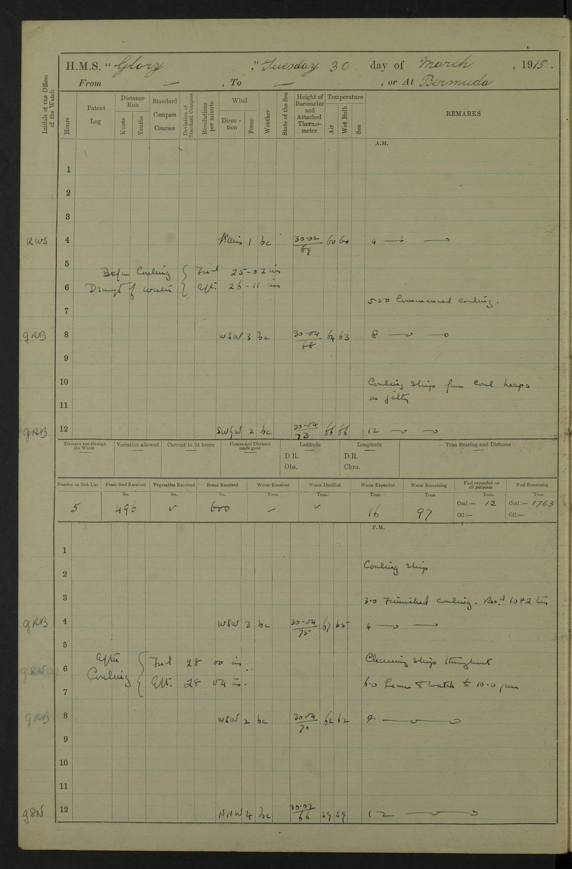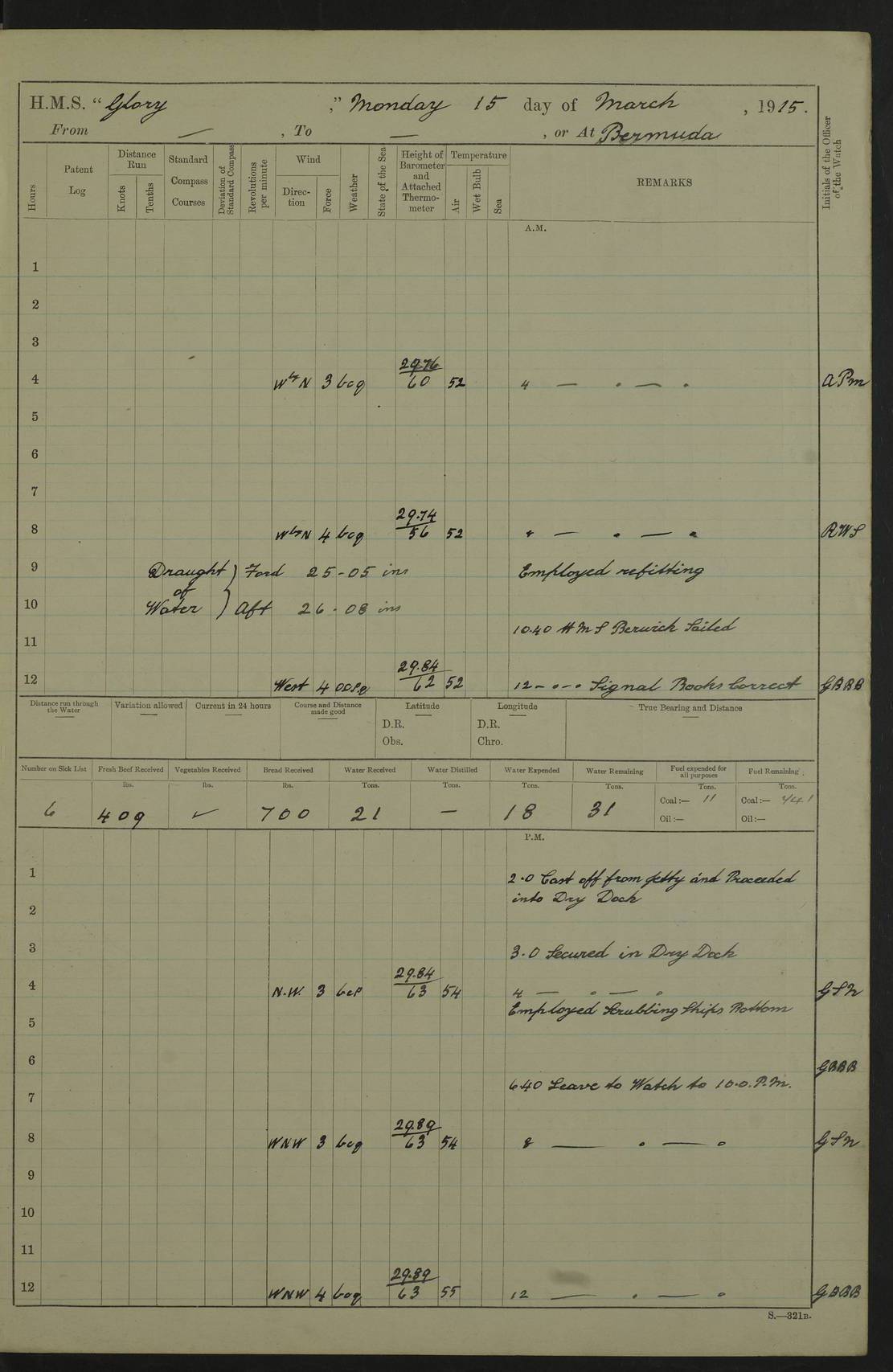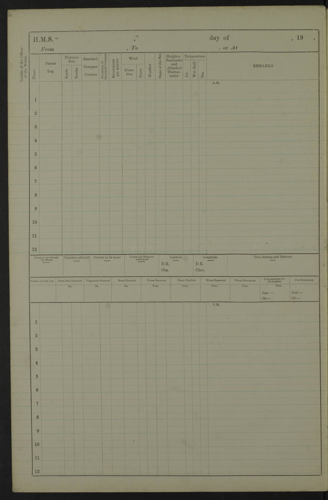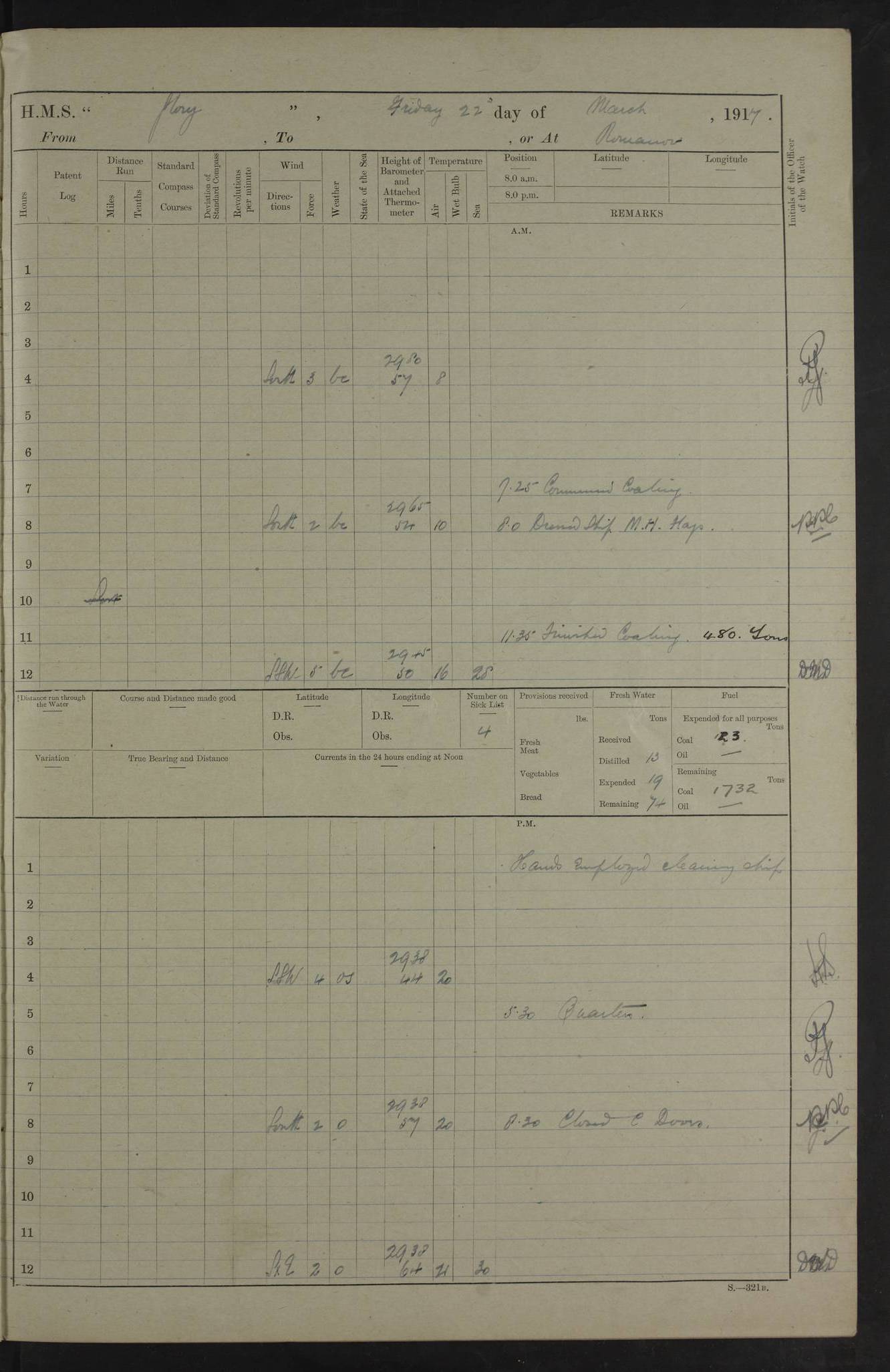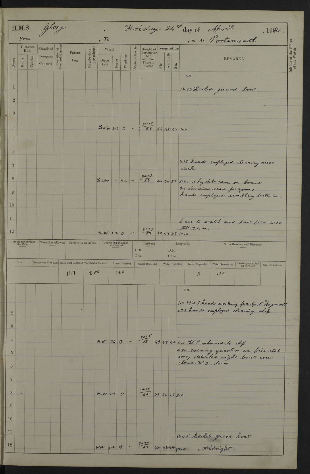 22 June 1915 At sea, Gibraltar to Lemnos Lat 36.1, Long -1.3 4.15am: Sighted land on starboard bow. 10.20am: Stopped port engine for repairs. 11.20am: proceeded with port engine. pm: a/c due to change in deviation. 10.00pm: Cape Tenez Light abeam, 18 miles. 4f73cd61a2fc8ea9030015f6: (https://s3.amazonaws.com:443/oldweather/ADM53-43015/0012_1.jpg) 23 June 1915 At sea, Gibraltar to Lemnos Lat 37.5, Long 4.8 Number on sick list: 4 5.00am: Secured from night defence stations. Placed anti-submarine guns. pm: Life saving appliances served out to men stationed in ? ?at abandon ship. 4f73cd61a2fc8ea9030015f7: (https://s3.amazonaws.com:443/oldweather/ADM53-43015/0013_0.jpg) 24 June 1915 At sea, Gibraltar to Lemnos Lat 37.4, Long 10.8 Position in log clearly bears no resemblance to the location of the ship. Position above is approximate and is based sighting of Zembra Island at 11.55am. 5.00am: Dispersed from night defence stations. Manned anti-submarine guns. am: Sighted two French torpedo boats. am: Torpedo boats passed to ~ No 362, 363. am: Sighted land on starboard beam. 11.55am: Zembra Island abeam, 25 miles. 2.00pm: Sighted Pantellaria S34ºE. 4.45pm: Pantellaria Light House abeam 12 miles. 4f73cd61a2fc8ea9030015f8: (https://s3.amazonaws.com:443/oldweather/ADM53-43015/0013_1.jpg) 25 June 1915 At sea, Gibraltar to Lemnos Lat 35.5, Long 16.7 2.10am: Gozo Light abeam 17 miles. 5.00am: Dispersed from night defence stations. Manned anti-submarine guns. 4f73cd61a2fc8ea9030015f9: (https://s3.amazonaws.com:443/oldweather/ADM53-43015/0014_0.jpg) 26 June 1915 At sea, Gibraltar to Lemnos Lat 35.5, Long 22.6 Number on sick list: 5 5.00am: Dispersed from night defence stations. Manned anti-submarine guns. am: Aired night clothing. am: marines at maxim practice on quarter deck. 2.00pm: Observed land on either bow. 3.00pm: Sighted French patrol destroyer. 4.15pm: Sighted French patrol destroyer. 9.40pm: Milo Peak N63ºW. 10.26pm: Polino Light abeam to port 5.5 miles. 4f73cd62a2fc8ea9030015fa: (https://s3.amazonaws.com:443/oldweather/ADM53-43015/0014_1.jpg) 27 June 1915 At sea and at Lemnos Lat 39.1, Long 24.4 From 0.50 to 3.05am sighting of multiple light houses. 3.50am: a/c to N39ºW and commenced to zig-zag. 5.00am: Dispersed from night defence stations and placed anti-submarine guns and look-outs. am: Lost overboard by accident Hazlewood fender, pat. 311, one in number. 10.30am: Held Divine Service onboard. pm: Met and signalled HMS Minerva on patrol duty. pm: Courses and speeds as requisite while waiting orders to approach Mudros. 3.00pm: Proceeded. 5.16pm: Increased to 90 revs, commenced to zig-zag. Course as requisite for Mudros. 7.00pm: Entered Mudros Bay. 7.47pm: Stopped. Let go port anchor in ‘M3’. 8.30pm: Darkened ship. pm: Manned one 6” and one 12 pdr. 4f73cd62a2fc8ea9030015fb: (https://s3.amazonaws.com:443/oldweather/ADM53-43015/0015_0.jpg) 28 June 1915 Mudros Bay, Lemnos Lat 39.89, Long 25.24 5,00am: HMS Vengeance entered harbour. HMS Vengeance was a pre-dreadnought of the Canopus class, launched in 1899 at Vickers, Barrow, and sold for scrapping in 1921. Details at http://en.wikipedia.org/wiki/HMS_Vengeance_(1899) . am/pm/: hands preparing for coaling and about ship’s work. pm: Collier Wabana secured alongside. 4f73cd62a2fc8ea9030015fc: (https://s3.amazonaws.com:443/oldweather/ADM53-43015/0015_1.jpg) 29 June 1915 Mudros Bay, Lemnos Lat 39.89, Long 25.24 5.15am: Commenced coaling. 2.00pm: Finished coaling. Collier left. 4f73cd62a2fc8ea9030015fd: (https://s3.amazonaws.com:443/oldweather/ADM53-43015/0016_0.jpg) 30 June 1915 Mudros Bay, Lemnos Lat 39.89, Long 25.24 am: Parties away sanding, and with fire engines onshore. am: Boats away disembarking troops. am: French Flagship Patrie sailed. The Patrie was a French pre-dreadnought, launched at La Seyne shipyard in 1903, and stricken in 1921. Details at http://en.wikipedia.org/wiki/French_battleship_Patrie . 6.30pm: Hands to bathe. 4f73cd63a2fc8ea9030015fe: (https://s3.amazonaws.com:443/oldweather/ADM53-43015/0016_1.jpg) 4f73cd63a2fc8ea9030015ff: (https://s3.amazonaws.com:443/oldweather/ADM53-43015/0017_0.jpg) 4f73cd63a2fc8ea903001600: (https://s3.amazonaws.com:443/oldweather/ADM53-43015/0017_1.jpg) 4f73cd63a2fc8ea903001601: (https://s3.amazonaws.com:443/oldweather/ADM53-43015/0018_0.jpg) 4f73cd64a2fc8ea903001602: (https://s3.amazonaws.com:443/oldweather/ADM53-43015/0018_1.jpg) LOGS FOR JULY 1915 From July to October 1915, HMS Glory spent her time at Port Mudros. Certain activities typically took place daily and are not generally noted in the pages below. These activities include: Lighting fires in the picket boat around 4am and drawing the fires in the late evening; Divisions at around 9–9.30am and Evening Quarters at 4pm; Darken ship at around 8.30pm; Daily ‘cleaning ship’, with variations thereof; SBC (for ‘Signal Books Correct’) at the watch changes. 4f73cd64a2fc8ea903001603: (https://s3.amazonaws.com:443/oldweather/ADM53-43016/0000_0.jpg) 4f73cd64a2fc8ea903001604: (https://s3.amazonaws.com:443/oldweather/ADM53-43016/0000_1.jpg) 4f73cd65a2fc8ea903001605: (https://s3.amazonaws.com:443/oldweather/ADM53-43016/0001_0.jpg) 4f73cd65a2fc8ea903001606: (https://s3.amazonaws.com:443/oldweather/ADM53-43016/0001_1.jpg) 1 July 1915 Port Mudros Lat 39.89, Long 25.24 6.30am: Landed working parties preparing boom defence ships. am: Discharged Acting Commander Rayne to Hector. Hector was a kite balloon ship. No further details readily available. 5.00pm: Tug T.10 made fast astern. 7.15pm: HMS Venerable went out. 7.30pm: HMS Chatham went out. HMS Chatham was a ‘Town’ cruiser and lead ship of her class. She was launched in 1911 at Chatham Dockyard and sold in 1926. Details at http://en.wikipedia.org/wiki/HMS_Chatham_(1911) . 4f73cd65a2fc8ea903001607: (https://s3.amazonaws.com:443/oldweather/ADM53-43016/0002_0.jpg) 2 July 1915 Port Mudros Lat 39.89, Long 25.24 5.35am: Landed working parties preparing boom defence ships. am/pm: Boom defence par