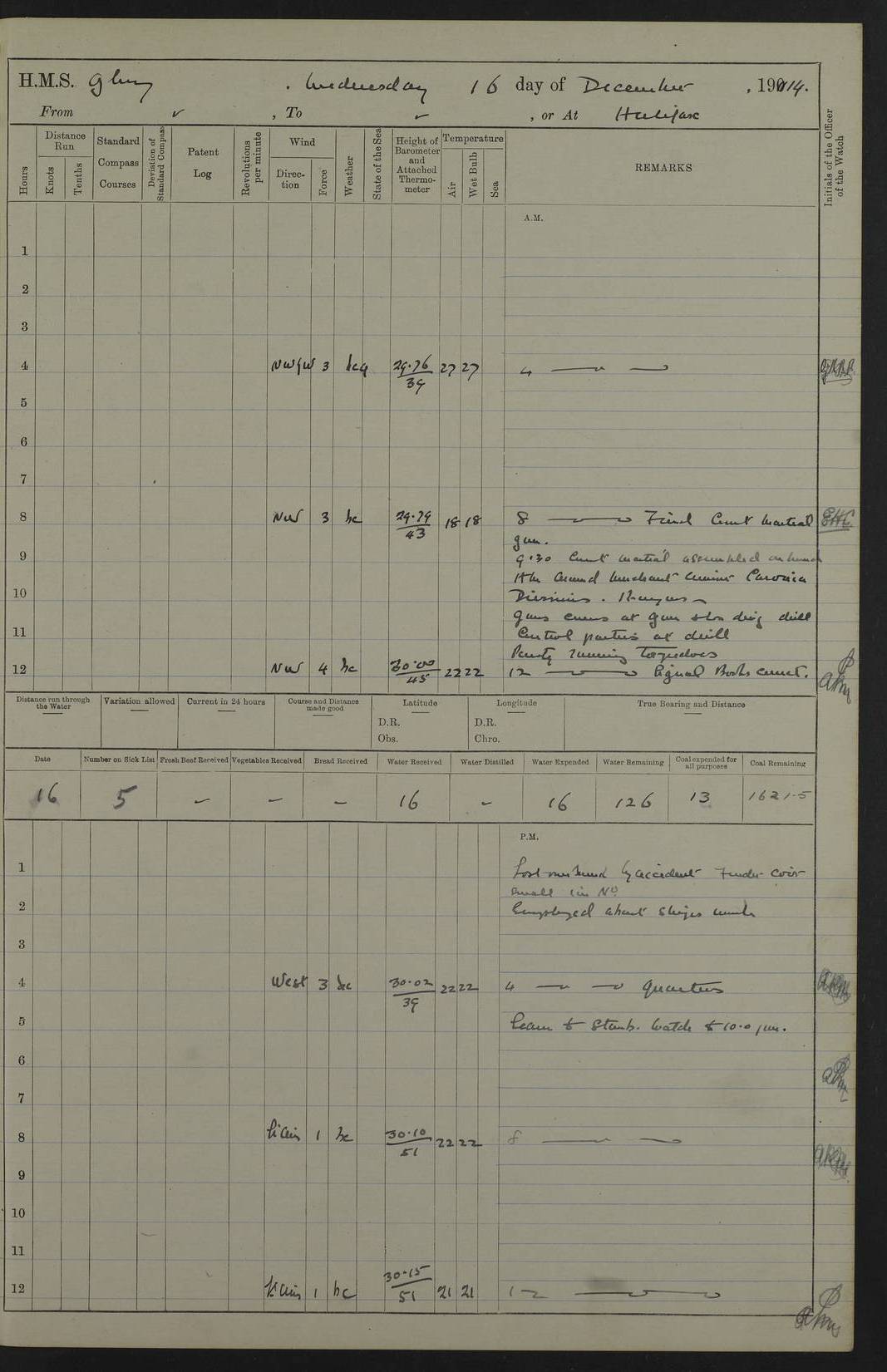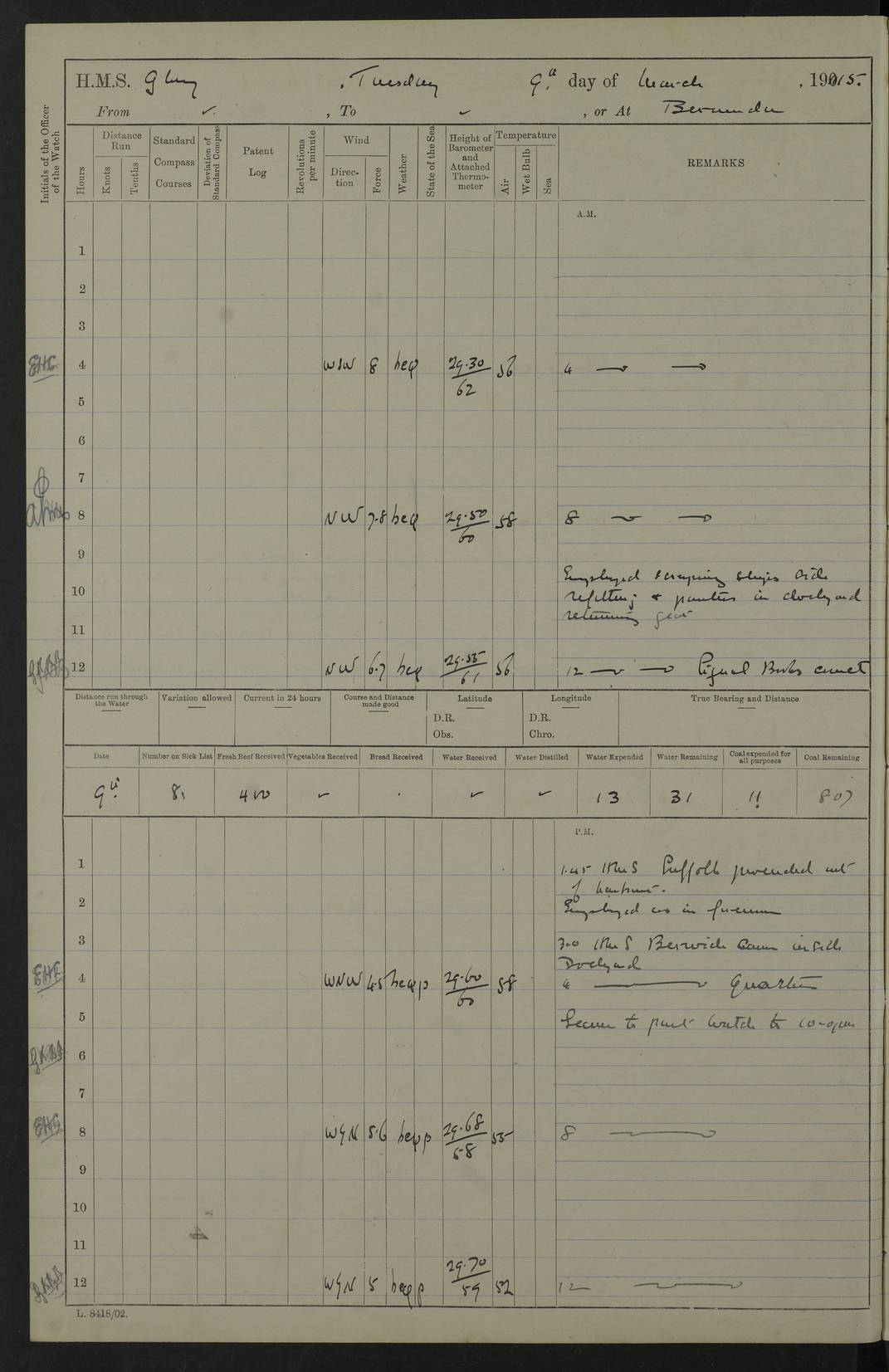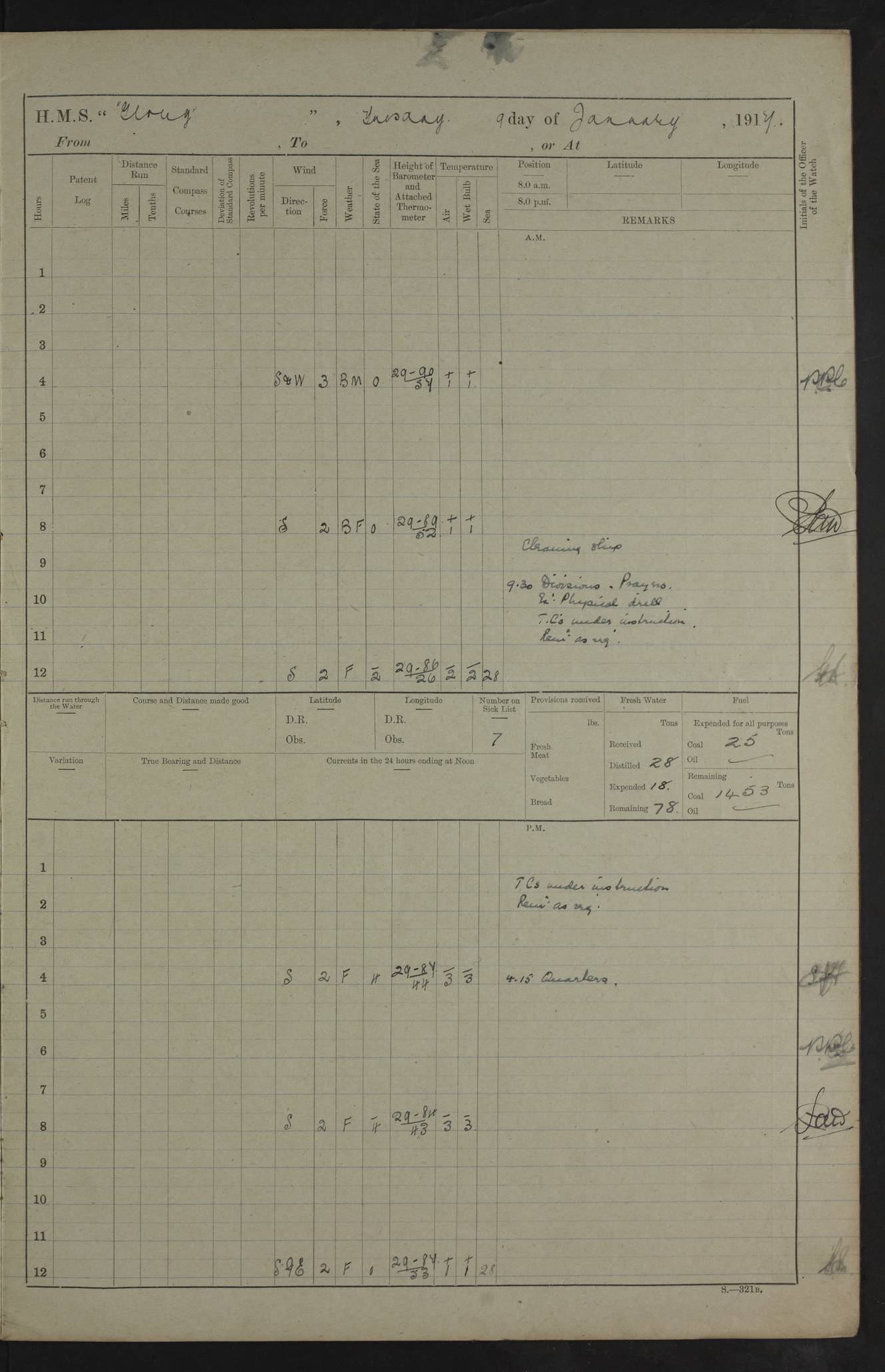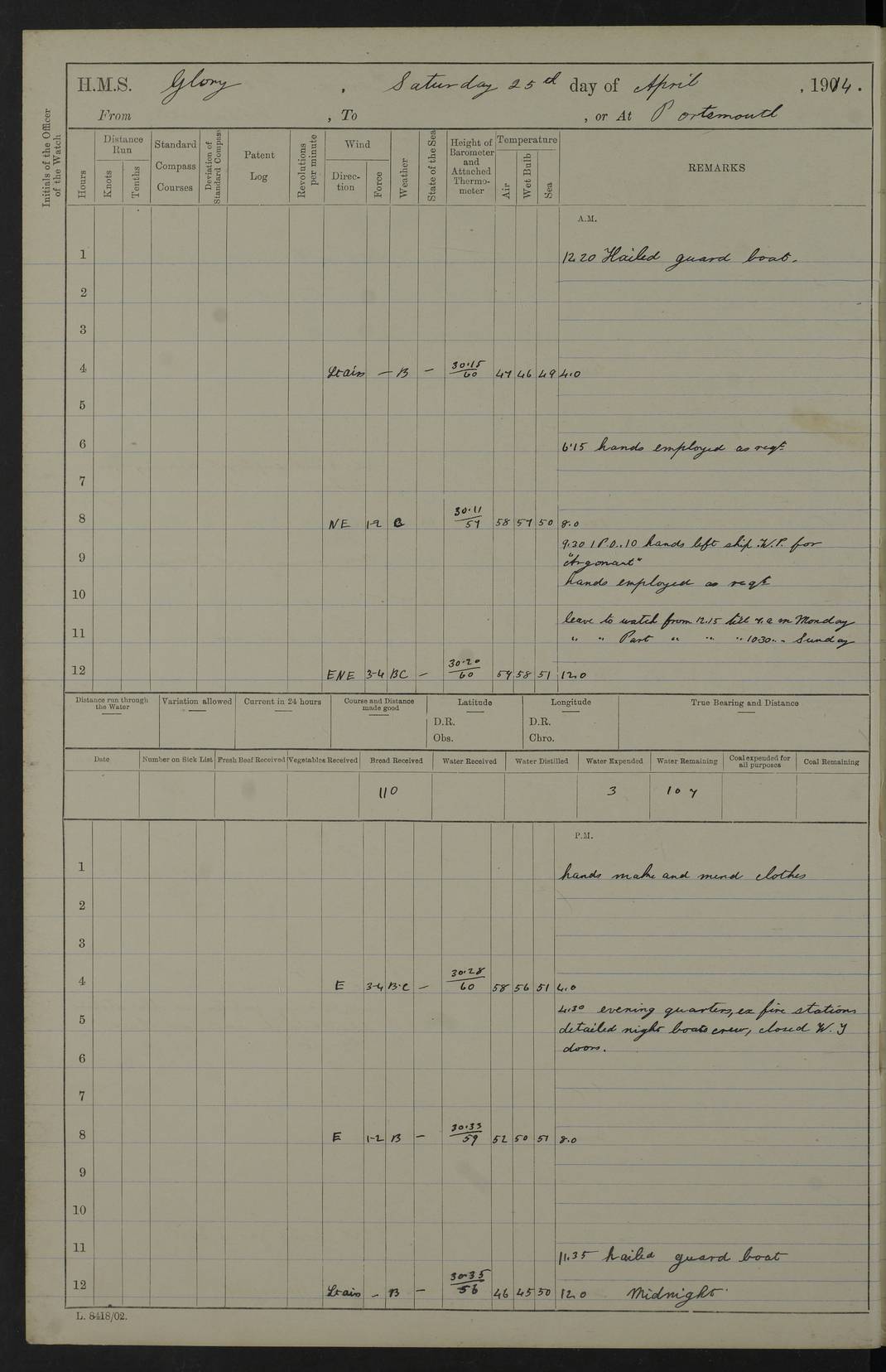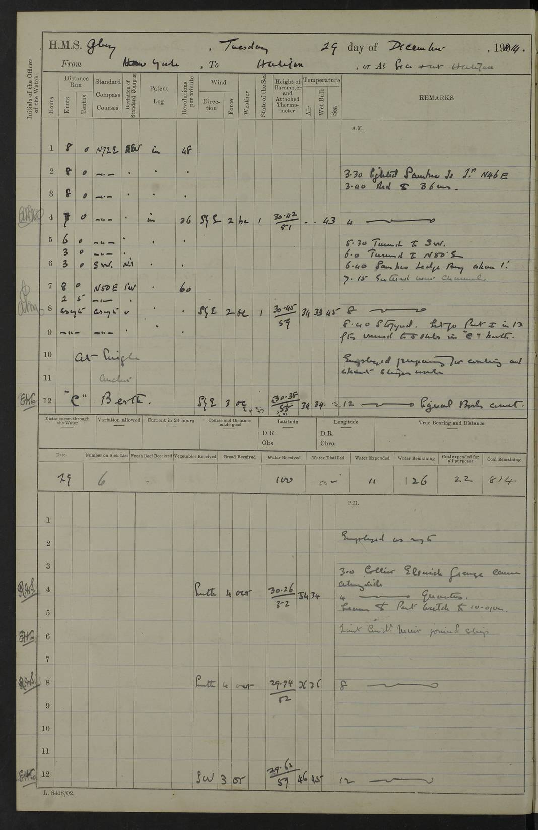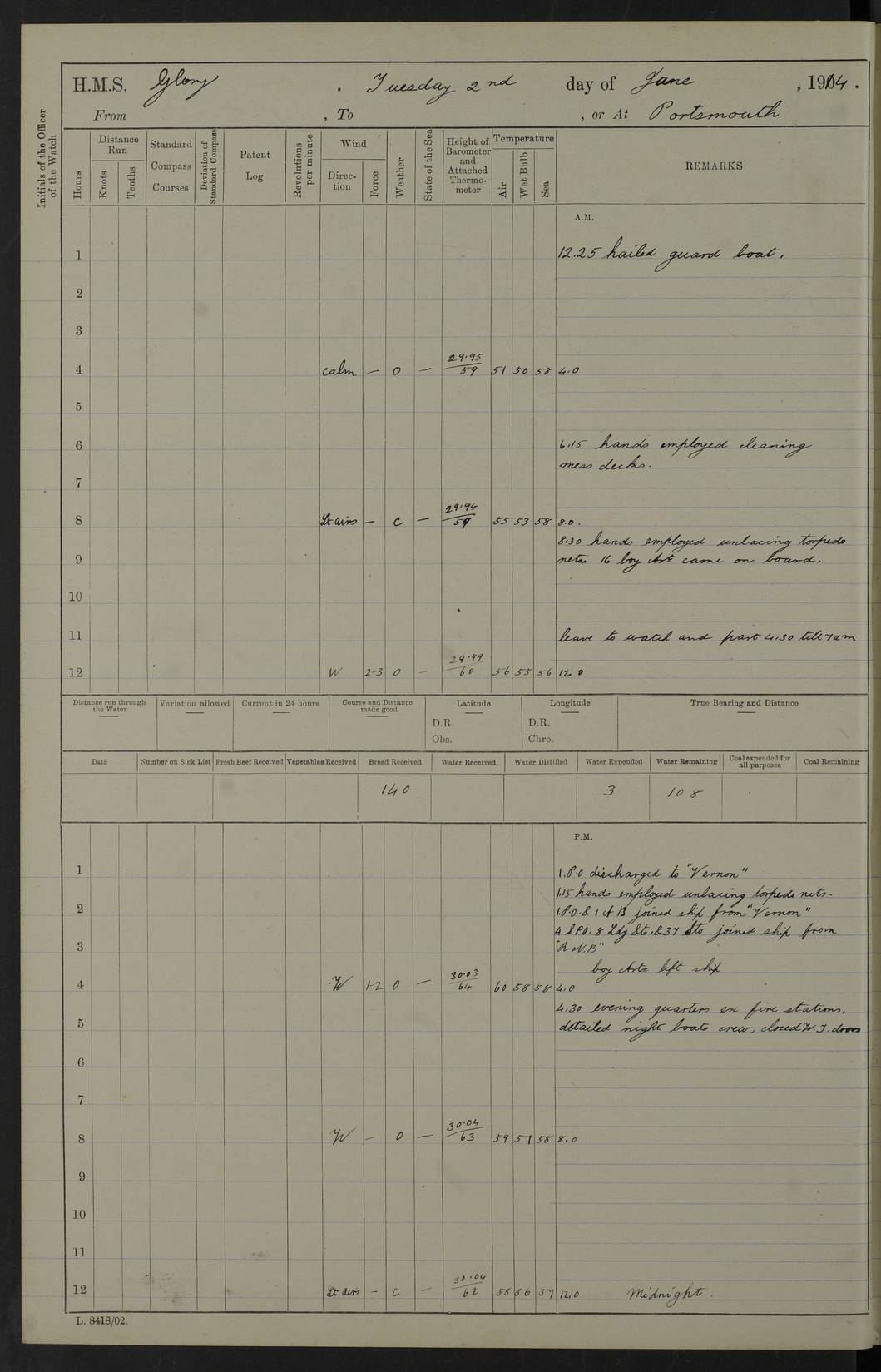 22 June 1915 At sea, Gibraltar to Lemnos Lat 36.1, Long -1.3 4.15am: Sighted land on starboard bow. 10.20am: Stopped port engine for repairs. 11.20am: proceeded with port engine. pm: a/c due to change in deviation. 10.00pm: Cape Tenez Light abeam, 18 miles. 4f73cd61a2fc8ea9030015f6: (https://s3.amazonaws.com:443/oldweather/ADM53-43015/0012_1.jpg) 23 June 1915 At sea, Gibraltar to Lemnos Lat 37.5, Long 4.8 Number on sick list: 4 5.00am: Secured from night defence stations. Placed anti-submarine guns. pm: Life saving appliances served out to men stationed in ? ?at abandon ship. 4f73cd61a2fc8ea9030015f7: (https://s3.amazonaws.com:443/oldweather/ADM53-43015/0013_0.jpg) 24 June 1915 At sea, Gibraltar to Lemnos Lat 37.4, Long 10.8 Position in log clearly bears no resemblance to the location of the ship. Position above is approximate and is based sighting of Zembra Island at 11.55am. 5.00am: Dispersed from night defence stations. Manned anti-submarine guns. am: Sighted two French torpedo boats. am: Torpedo boats passed to ~ No 362, 363. am: Sighted land on starboard beam. 11.55am: Zembra Island abeam, 25 miles. 2.00pm: Sighted Pantellaria S34ºE. 4.45pm: Pantellaria Light House abeam 12 miles. 4f73cd61a2fc8ea9030015f8: (https://s3.amazonaws.com:443/oldweather/ADM53-43015/0013_1.jpg) 25 June 1915 At sea, Gibraltar to Lemnos Lat 35.5, Long 16.7 2.10am: Gozo Light abeam 17 miles. 5.00am: Dispersed from night defence stations. Manned anti-submarine guns. 4f73cd61a2fc8ea9030015f9: (https://s3.amazonaws.com:443/oldweather/ADM53-43015/0014_0.jpg) 26 June 1915 At sea, Gibraltar to Lemnos Lat 35.5, Long 22.6 Number on sick list: 5 5.00am: Dispersed from night defence stations. Manned anti-submarine guns. am: Aired night clothing. am: marines at maxim practice on quarter deck. 2.00pm: Observed land on either bow. 3.00pm: Sighted French patrol destroyer. 4.15pm: Sighted French patrol destroyer. 9.40pm: Milo Peak N63ºW. 10.26pm: Polino Light abeam to port 5.5 miles. 4f73cd62a2fc8ea9030015fa: (https://s3.amazonaws.com:443/oldweather/ADM53-43015/0014_1.jpg) 27 June 1915 At sea and at Lemnos Lat 39.1, Long 24.4 From 0.50 to 3.05am sighting of multiple light houses. 3.50am: a/c to N39ºW and commenced to zig-zag. 5.00am: Dispersed from night defence stations and placed anti-submarine guns and look-outs. am: Lost overboard by accident Hazlewood fender, pat. 311, one in number. 10.30am: Held Divine Service onboard. pm: Met and signalled HMS Minerva on patrol duty. pm: Courses and speeds as requisite while waiting orders to approach Mudros. 3.00pm: Proceeded. 5.16pm: Increased to 90 revs, commenced to zig-zag. Course as requisite for Mudros. 7.00pm: Entered Mudros Bay. 7.47pm: Stopped. Let go port anchor in ‘M3’. 8.30pm: Darkened ship. pm: Manned one 6” and one 12 pdr. 4f73cd62a2fc8ea9030015fb: (https://s3.amazonaws.com:443/oldweather/ADM53-43015/0015_0.jpg) 28 June 1915 Mudros Bay, Lemnos Lat 39.89, Long 25.24 5,00am: HMS Vengeance entered harbour. HMS Vengeance was a pre-dreadnought of the Canopus class, launched in 1899 at Vickers, Barrow, and sold for scrapping in 1921. Details at http://en.wikipedia.org/wiki/HMS_Vengeance_(1899) . am/pm/: hands preparing for coaling and about ship’s work. pm: Collier Wabana secured alongside. 4f73cd62a2fc8ea9030015fc: (https://s3.amazonaws.com:443/oldweather/ADM53-43015/0015_1.jpg) 29 June 1915 Mudros Bay, Lemnos Lat 39.89, Long 25.24 5.15am: Commenced coaling. 2.00pm: Finished coaling. Collier left. 4f73cd62a2fc8ea9030015fd: (https://s3.amazonaws.com:443/oldweather/ADM53-43015/0016_0.jpg) 30 June 1915 Mudros Bay, Lemnos Lat 39.89, Long 25.24 am: Parties away sanding, and with fire engines onshore. am: Boats away disembarking troops. am: French Flagship Patrie sailed. The Patrie was a French pre-dreadnought, launched at La Seyne shipyard in 1903, and stricken in 1921. Details at http://en.wikipedia.org/wiki/French_battleship_Patrie . 6.30pm: Hands to bathe. 4f73cd63a2fc8ea9030015fe: (https://s3.amazonaws.com:443/oldweather/ADM53-43015/0016_1.jpg) 4f73cd63a2fc8ea9030015ff: (https://s3.amazonaws.com:443/oldweather/ADM53-43015/0017_0.jpg) 4f73cd63a2fc8ea903001600: (https://s3.amazonaws.com:443/oldweather/ADM53-43015/0017_1.jpg) 4f73cd63a2fc8ea903001601: (https://s3.amazonaws.com:443/oldweather/ADM53-43015/0018_0.jpg) 4f73cd64a2fc8ea903001602: (https://s3.amazonaws.com:443/oldweather/ADM53-43015/0018_1.jpg) LOGS FOR JULY 1915 From July to October 1915, HMS Glory spent her time at Port Mudros. Certain activities typically took place daily and are not generally noted in the pages below. These activities include: Lighting fires in the picket boat around 4am and drawing the fires in the late evening; Divisions at around 9–9.30am and Evening Quarters at 4pm; Darken ship at around 8.30pm; Daily ‘cleaning ship’, with variations thereof; SBC (for ‘Signal Books Correct’) at the watch changes. 4f73cd64a2fc8ea903001603: (https://s3.amazonaws.com:443/oldweather/ADM53-43016/0000_0.jpg) 4f73cd64a2fc8ea903001604: (https://s3.amazonaws.com:443/oldweather/ADM53-43016/0000_1.jpg) 4f73cd65a2fc8ea903001605: (https://s3.amazonaws.com:443/oldweather/ADM53-43016/0001_0.jpg) 4f73cd65a2fc8ea903001606: (https://s3.amazonaws.com:443/oldweather/ADM53-43016/0001_1.jpg) 1 July 1915 Port Mudros Lat 39.89, Long 25.24 6.30am: Landed working parties preparing boom defence ships. am: Discharged Acting Commander Rayne to Hector. Hector was a kite balloon ship. No further details readily available. 5.00pm: Tug T.10 made fast astern. 7.15pm: HMS Venerable went out. 7.30pm: HMS Chatham went out. HMS Chatham was a ‘Town’ cruiser and lead ship of her class. She was launched in 1911 at Chatham Dockyard and sold in 1926. Details at http://en.wikipedia.org/wiki/HMS_Chatham_(1911) . 4f73cd65a2fc8ea903001607: (https://s3.amazonaws.com:443/oldweather/ADM53-43016/0002_0.jpg) 2 July 1915 Port Mudros Lat 39.89, Long 25.24 5.35am: Landed working parties preparing boom defence ships. am/pm: Boom defence par