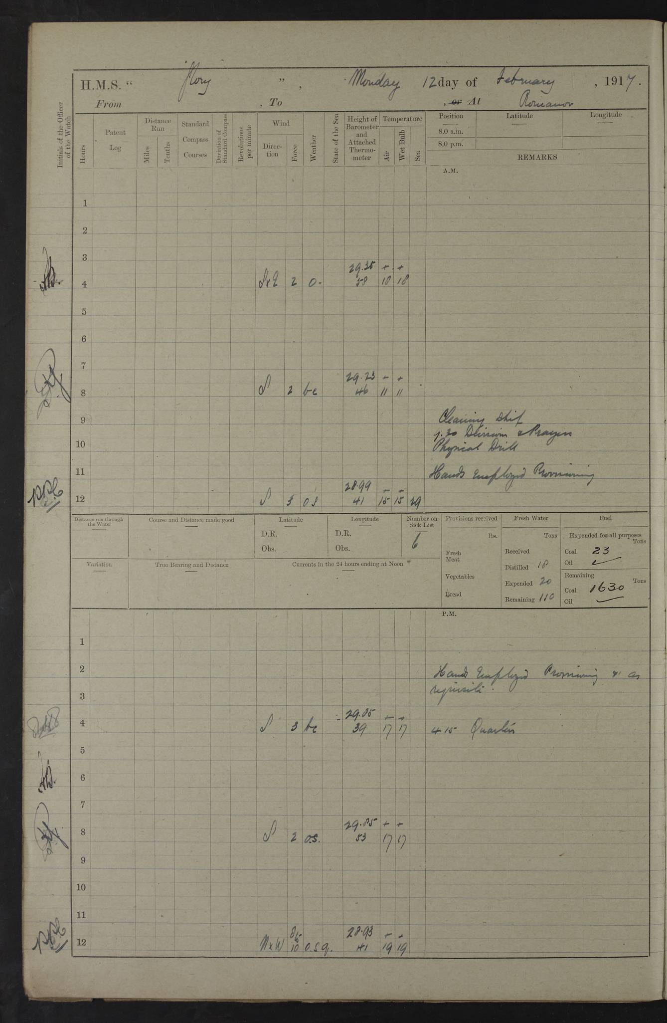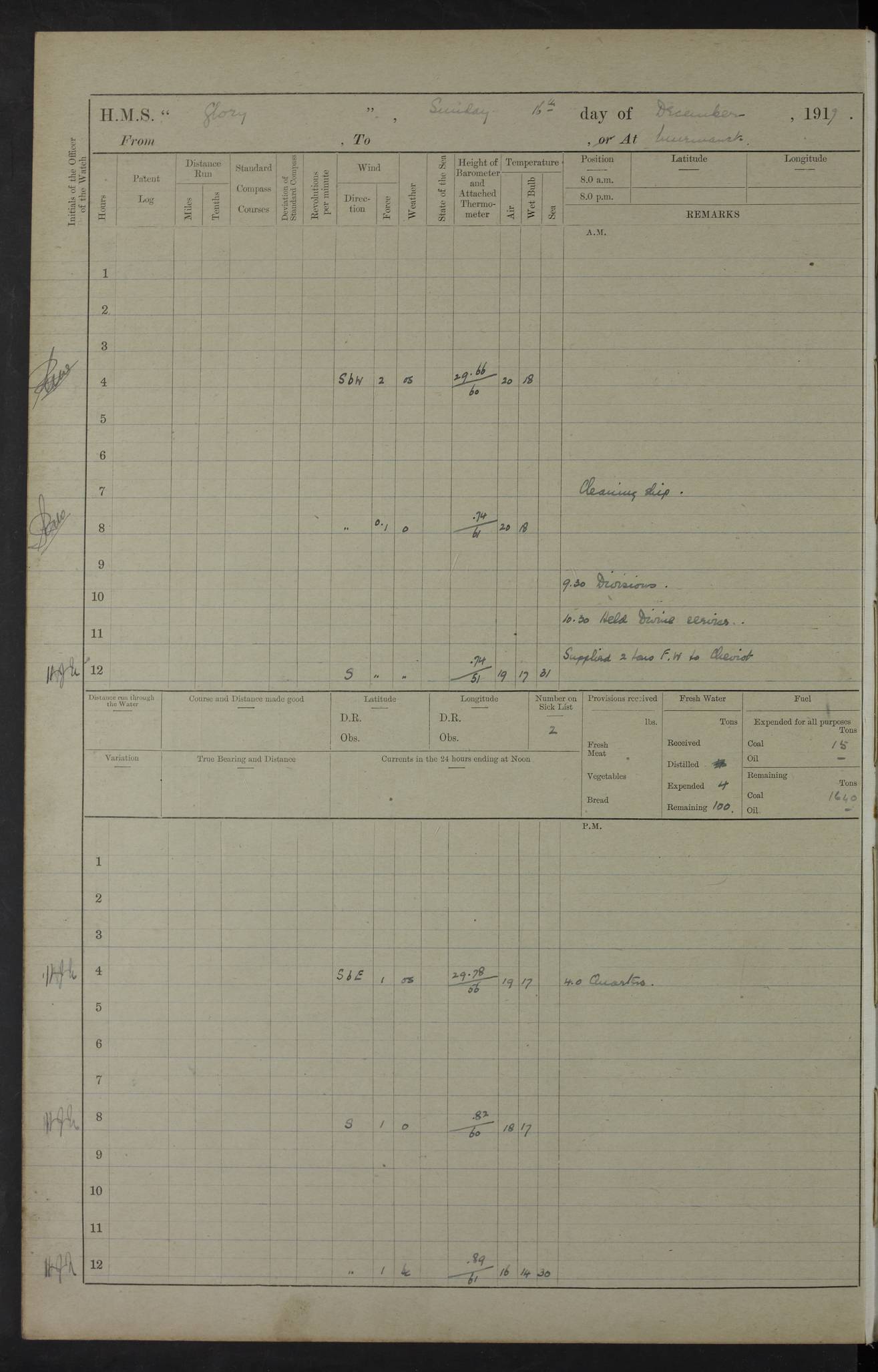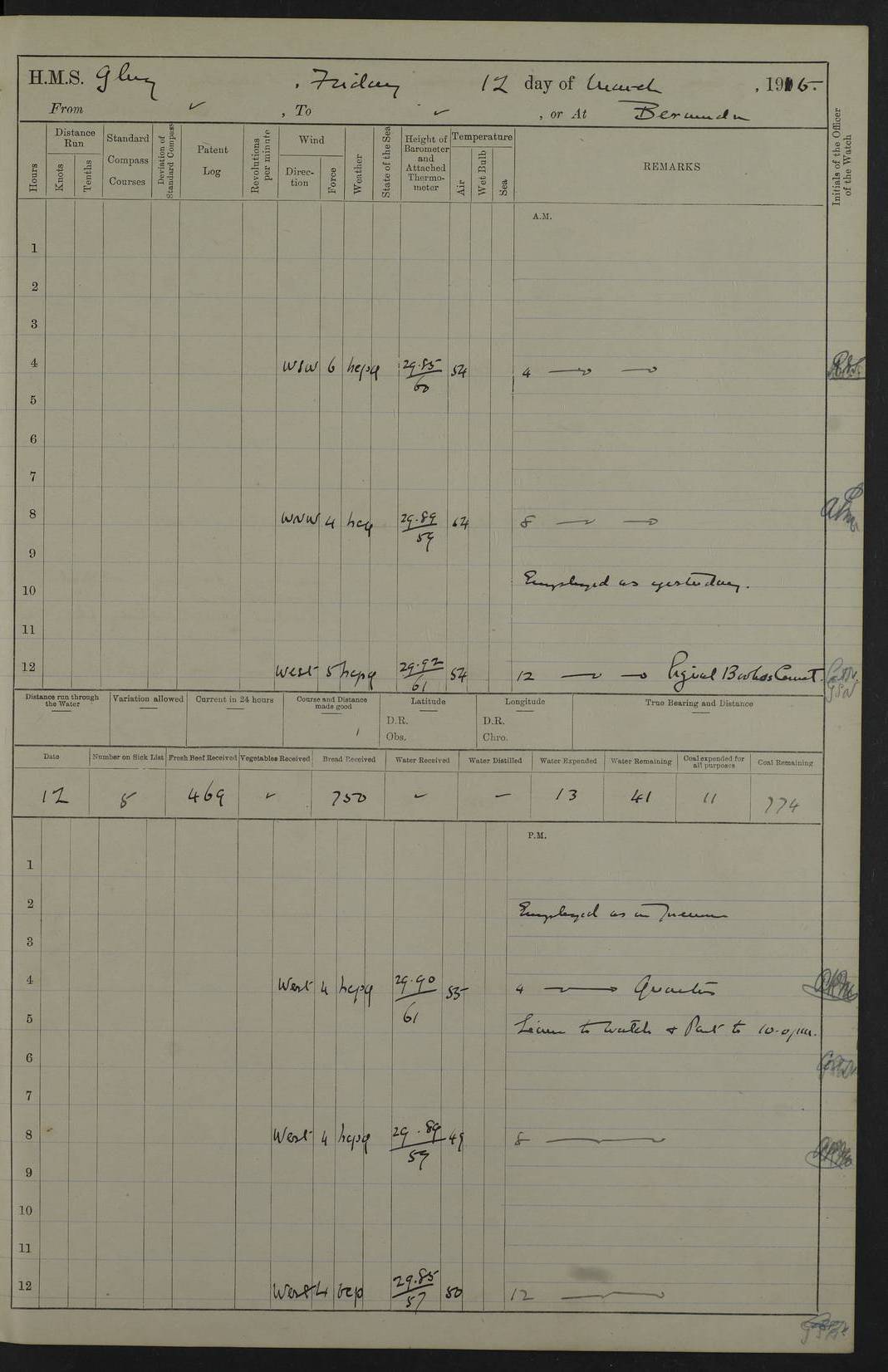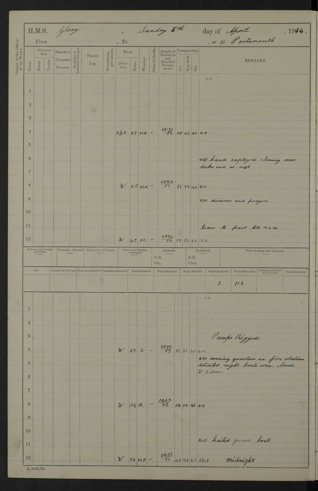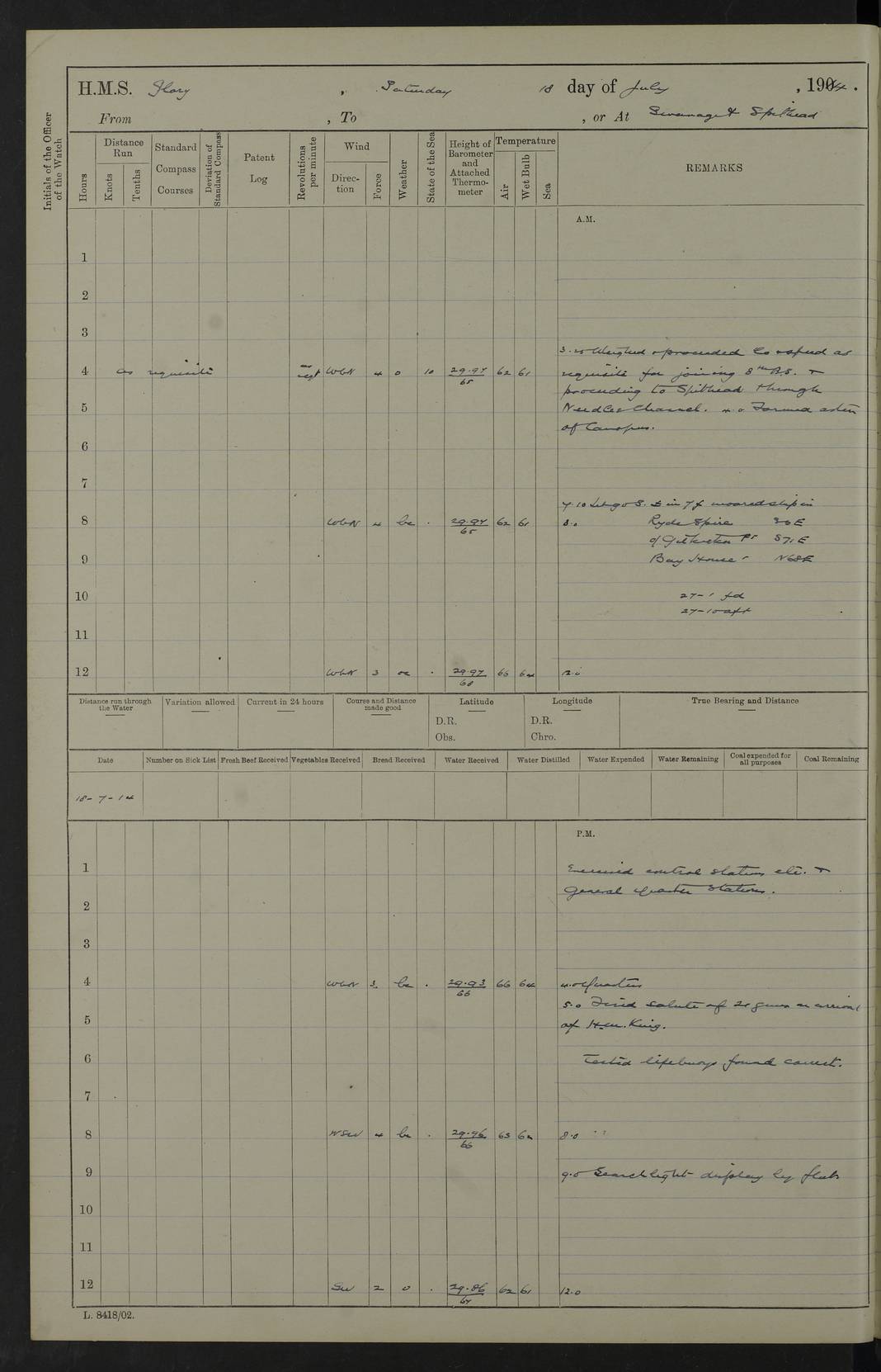 22 June 1915 At sea, Gibraltar to Lemnos Lat 36.1, Long -1.3 4.15am: Sighted land on starboard bow. 10.20am: Stopped port engine for repairs. 11.20am: proceeded with port engine. pm: a/c due to change in deviation. 10.00pm: Cape Tenez Light abeam, 18 miles. 4f73cd61a2fc8ea9030015f6: (https://s3.amazonaws.com:443/oldweather/ADM53-43015/0012_1.jpg) 23 June 1915 At sea, Gibraltar to Lemnos Lat 37.5, Long 4.8 Number on sick list: 4 5.00am: Secured from night defence stations. Placed anti-submarine guns. pm: Life saving appliances served out to men stationed in ? ?at abandon ship. 4f73cd61a2fc8ea9030015f7: (https://s3.amazonaws.com:443/oldweather/ADM53-43015/0013_0.jpg) 24 June 1915 At sea, Gibraltar to Lemnos Lat 37.4, Long 10.8 Position in log clearly bears no resemblance to the location of the ship. Position above is approximate and is based sighting of Zembra Island at 11.55am. 5.00am: Dispersed from night defence stations. Manned anti-submarine guns. am: Sighted two French torpedo boats. am: Torpedo boats passed to ~ No 362, 363. am: Sighted land on starboard beam. 11.55am: Zembra Island abeam, 25 miles. 2.00pm: Sighted Pantellaria S34ºE. 4.45pm: Pantellaria Light House abeam 12 miles. 4f73cd61a2fc8ea9030015f8: (https://s3.amazonaws.com:443/oldweather/ADM53-43015/0013_1.jpg) 25 June 1915 At sea, Gibraltar to Lemnos Lat 35.5, Long 16.7 2.10am: Gozo Light abeam 17 miles. 5.00am: Dispersed from night defence stations. Manned anti-submarine guns. 4f73cd61a2fc8ea9030015f9: (https://s3.amazonaws.com:443/oldweather/ADM53-43015/0014_0.jpg) 26 June 1915 At sea, Gibraltar to Lemnos Lat 35.5, Long 22.6 Number on sick list: 5 5.00am: Dispersed from night defence stations. Manned anti-submarine guns. am: Aired night clothing. am: marines at maxim practice on quarter deck. 2.00pm: Observed land on either bow. 3.00pm: Sighted French patrol destroyer. 4.15pm: Sighted French patrol destroyer. 9.40pm: Milo Peak N63ºW. 10.26pm: Polino Light abeam to port 5.5 miles. 4f73cd62a2fc8ea9030015fa: (https://s3.amazonaws.com:443/oldweather/ADM53-43015/0014_1.jpg) 27 June 1915 At sea and at Lemnos Lat 39.1, Long 24.4 From 0.50 to 3.05am sighting of multiple light houses. 3.50am: a/c to N39ºW and commenced to zig-zag. 5.00am: Dispersed from night defence stations and placed anti-submarine guns and look-outs. am: Lost overboard by accident Hazlewood fender, pat. 311, one in number. 10.30am: Held Divine Service onboard. pm: Met and signalled HMS Minerva on patrol duty. pm: Courses and speeds as requisite while waiting orders to approach Mudros. 3.00pm: Proceeded. 5.16pm: Increased to 90 revs, commenced to zig-zag. Course as requisite for Mudros. 7.00pm: Entered Mudros Bay. 7.47pm: Stopped. Let go port anchor in ‘M3’. 8.30pm: Darkened ship. pm: Manned one 6” and one 12 pdr. 4f73cd62a2fc8ea9030015fb: (https://s3.amazonaws.com:443/oldweather/ADM53-43015/0015_0.jpg) 28 June 1915 Mudros Bay, Lemnos Lat 39.89, Long 25.24 5,00am: HMS Vengeance entered harbour. HMS Vengeance was a pre-dreadnought of the Canopus class, launched in 1899 at Vickers, Barrow, and sold for scrapping in 1921. Details at http://en.wikipedia.org/wiki/HMS_Vengeance_(1899) . am/pm/: hands preparing for coaling and about ship’s work. pm: Collier Wabana secured alongside. 4f73cd62a2fc8ea9030015fc: (https://s3.amazonaws.com:443/oldweather/ADM53-43015/0015_1.jpg) 29 June 1915 Mudros Bay, Lemnos Lat 39.89, Long 25.24 5.15am: Commenced coaling. 2.00pm: Finished coaling. Collier left. 4f73cd62a2fc8ea9030015fd: (https://s3.amazonaws.com:443/oldweather/ADM53-43015/0016_0.jpg) 30 June 1915 Mudros Bay, Lemnos Lat 39.89, Long 25.24 am: Parties away sanding, and with fire engines onshore. am: Boats away disembarking troops. am: French Flagship Patrie sailed. The Patrie was a French pre-dreadnought, launched at La Seyne shipyard in 1903, and stricken in 1921. Details at http://en.wikipedia.org/wiki/French_battleship_Patrie . 6.30pm: Hands to bathe. 4f73cd63a2fc8ea9030015fe: (https://s3.amazonaws.com:443/oldweather/ADM53-43015/0016_1.jpg) 4f73cd63a2fc8ea9030015ff: (https://s3.amazonaws.com:443/oldweather/ADM53-43015/0017_0.jpg) 4f73cd63a2fc8ea903001600: (https://s3.amazonaws.com:443/oldweather/ADM53-43015/0017_1.jpg) 4f73cd63a2fc8ea903001601: (https://s3.amazonaws.com:443/oldweather/ADM53-43015/0018_0.jpg) 4f73cd64a2fc8ea903001602: (https://s3.amazonaws.com:443/oldweather/ADM53-43015/0018_1.jpg) LOGS FOR JULY 1915 From July to October 1915, HMS Glory spent her time at Port Mudros. Certain activities typically took place daily and are not generally noted in the pages below. These activities include: Lighting fires in the picket boat around 4am and drawing the fires in the late evening; Divisions at around 9–9.30am and Evening Quarters at 4pm; Darken ship at around 8.30pm; Daily ‘cleaning ship’, with variations thereof; SBC (for ‘Signal Books Correct’) at the watch changes. 4f73cd64a2fc8ea903001603: (https://s3.amazonaws.com:443/oldweather/ADM53-43016/0000_0.jpg) 4f73cd64a2fc8ea903001604: (https://s3.amazonaws.com:443/oldweather/ADM53-43016/0000_1.jpg) 4f73cd65a2fc8ea903001605: (https://s3.amazonaws.com:443/oldweather/ADM53-43016/0001_0.jpg) 4f73cd65a2fc8ea903001606: (https://s3.amazonaws.com:443/oldweather/ADM53-43016/0001_1.jpg) 1 July 1915 Port Mudros Lat 39.89, Long 25.24 6.30am: Landed working parties preparing boom defence ships. am: Discharged Acting Commander Rayne to Hector. Hector was a kite balloon ship. No further details readily available. 5.00pm: Tug T.10 made fast astern. 7.15pm: HMS Venerable went out. 7.30pm: HMS Chatham went out. HMS Chatham was a ‘Town’ cruiser and lead ship of her class. She was launched in 1911 at Chatham Dockyard and sold in 1926. Details at http://en.wikipedia.org/wiki/HMS_Chatham_(1911) . 4f73cd65a2fc8ea903001607: (https://s3.amazonaws.com:443/oldweather/ADM53-43016/0002_0.jpg) 2 July 1915 Port Mudros Lat 39.89, Long 25.24 5.35am: Landed working parties preparing boom defence ships. am/pm: Boom defence par