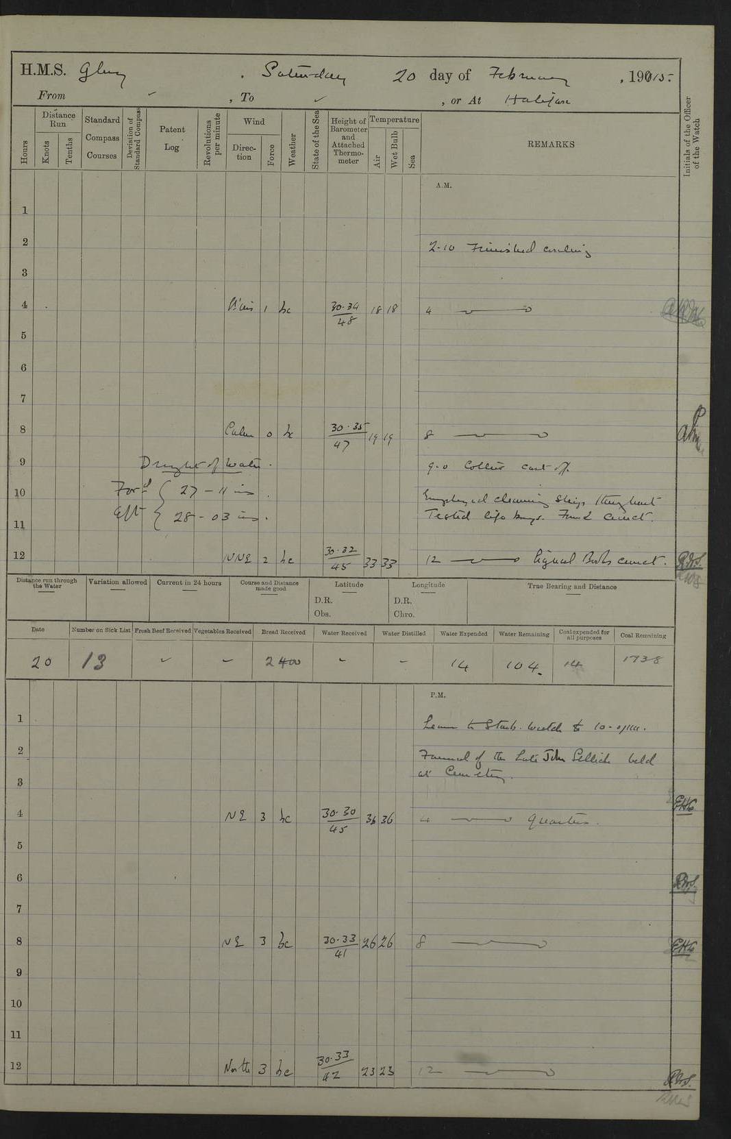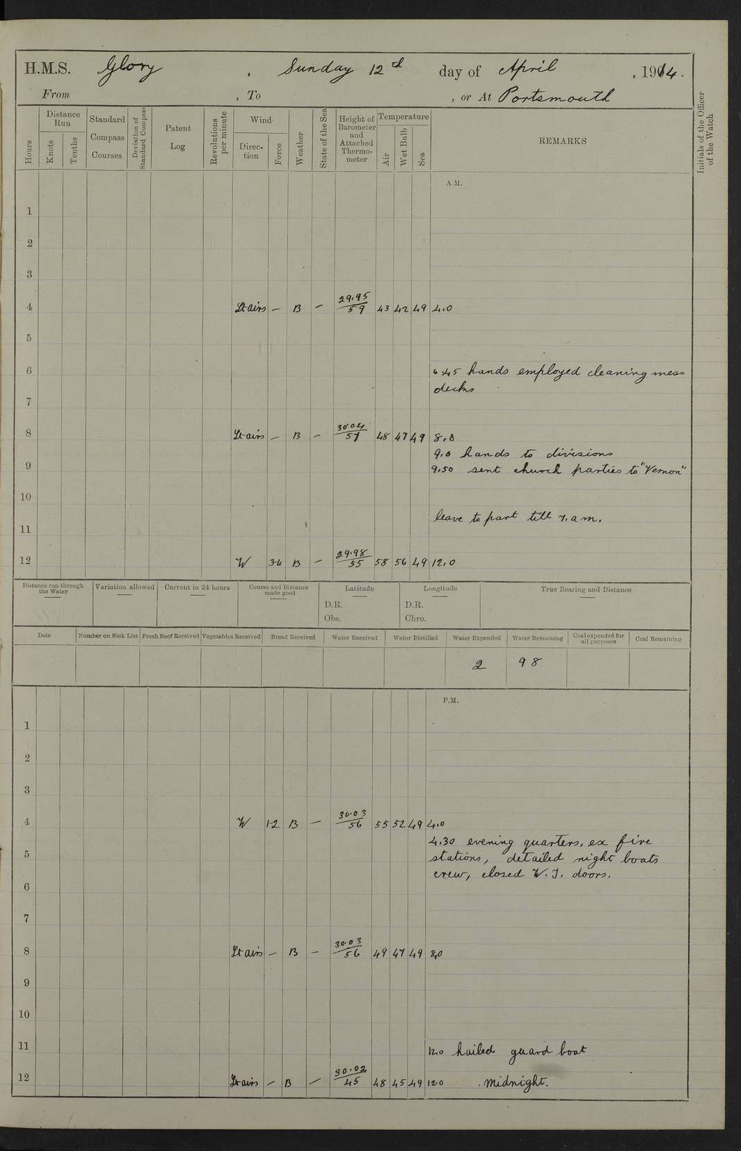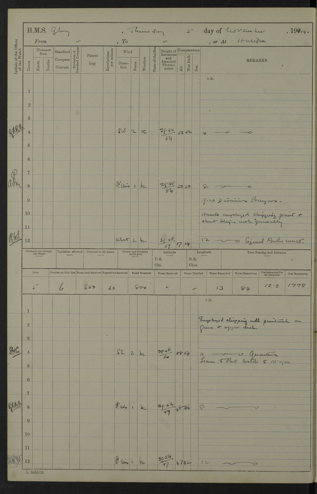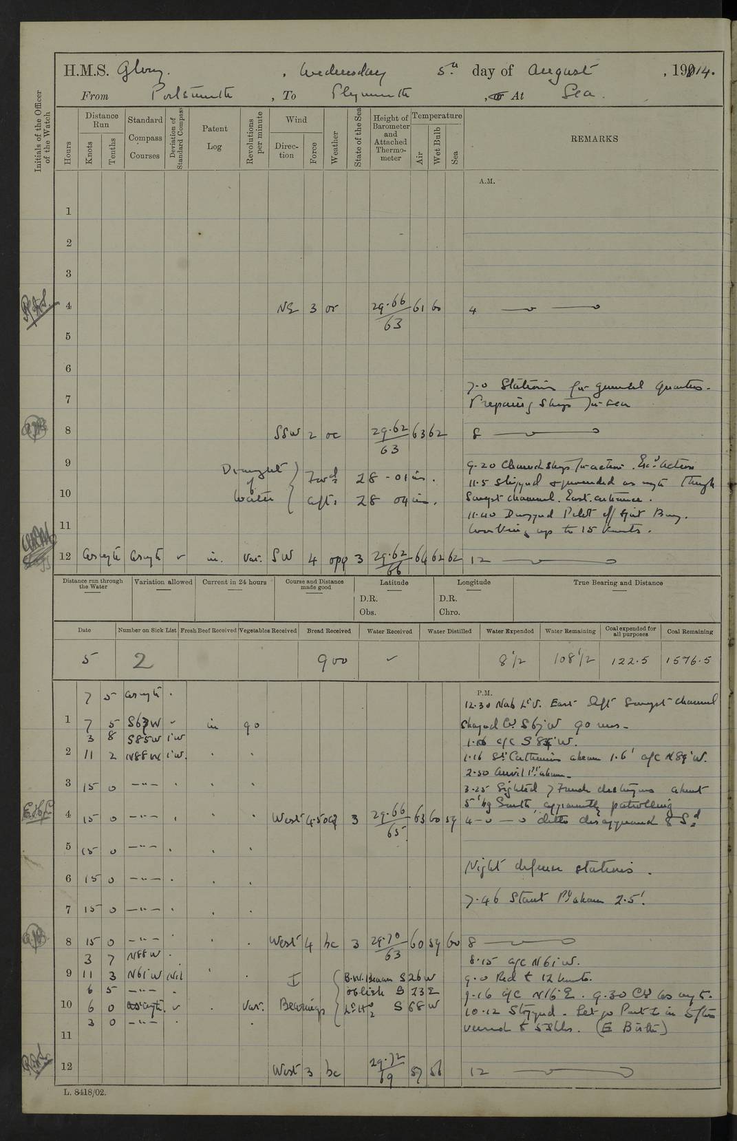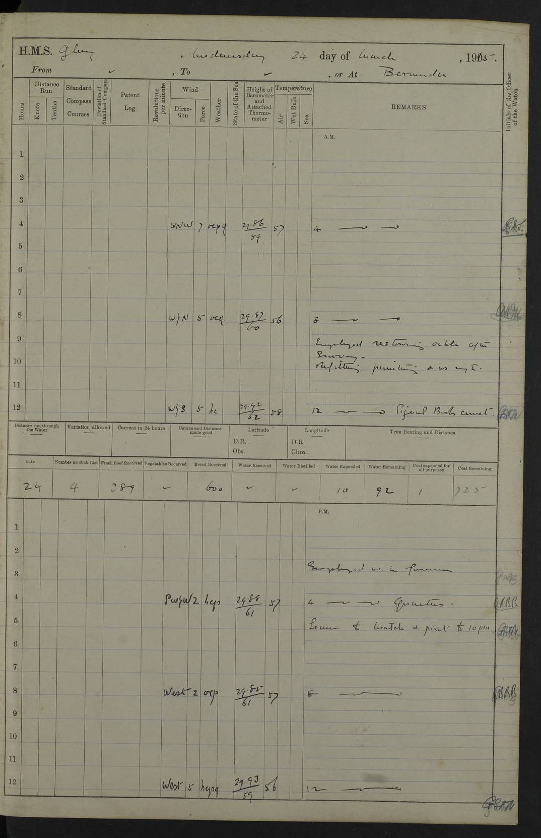 22 June 1915 At sea, Gibraltar to Lemnos Lat 36.1, Long -1.3 4.15am: Sighted land on starboard bow. 10.20am: Stopped port engine for repairs. 11.20am: proceeded with port engine. pm: a/c due to change in deviation. 10.00pm: Cape Tenez Light abeam, 18 miles. 4f73cd61a2fc8ea9030015f6: (https://s3.amazonaws.com:443/oldweather/ADM53-43015/0012_1.jpg) 23 June 1915 At sea, Gibraltar to Lemnos Lat 37.5, Long 4.8 Number on sick list: 4 5.00am: Secured from night defence stations. Placed anti-submarine guns. pm: Life saving appliances served out to men stationed in ? ?at abandon ship. 4f73cd61a2fc8ea9030015f7: (https://s3.amazonaws.com:443/oldweather/ADM53-43015/0013_0.jpg) 24 June 1915 At sea, Gibraltar to Lemnos Lat 37.4, Long 10.8 Position in log clearly bears no resemblance to the location of the ship. Position above is approximate and is based sighting of Zembra Island at 11.55am. 5.00am: Dispersed from night defence stations. Manned anti-submarine guns. am: Sighted two French torpedo boats. am: Torpedo boats passed to ~ No 362, 363. am: Sighted land on starboard beam. 11.55am: Zembra Island abeam, 25 miles. 2.00pm: Sighted Pantellaria S34ºE. 4.45pm: Pantellaria Light House abeam 12 miles. 4f73cd61a2fc8ea9030015f8: (https://s3.amazonaws.com:443/oldweather/ADM53-43015/0013_1.jpg) 25 June 1915 At sea, Gibraltar to Lemnos Lat 35.5, Long 16.7 2.10am: Gozo Light abeam 17 miles. 5.00am: Dispersed from night defence stations. Manned anti-submarine guns. 4f73cd61a2fc8ea9030015f9: (https://s3.amazonaws.com:443/oldweather/ADM53-43015/0014_0.jpg) 26 June 1915 At sea, Gibraltar to Lemnos Lat 35.5, Long 22.6 Number on sick list: 5 5.00am: Dispersed from night defence stations. Manned anti-submarine guns. am: Aired night clothing. am: marines at maxim practice on quarter deck. 2.00pm: Observed land on either bow. 3.00pm: Sighted French patrol destroyer. 4.15pm: Sighted French patrol destroyer. 9.40pm: Milo Peak N63ºW. 10.26pm: Polino Light abeam to port 5.5 miles. 4f73cd62a2fc8ea9030015fa: (https://s3.amazonaws.com:443/oldweather/ADM53-43015/0014_1.jpg) 27 June 1915 At sea and at Lemnos Lat 39.1, Long 24.4 From 0.50 to 3.05am sighting of multiple light houses. 3.50am: a/c to N39ºW and commenced to zig-zag. 5.00am: Dispersed from night defence stations and placed anti-submarine guns and look-outs. am: Lost overboard by accident Hazlewood fender, pat. 311, one in number. 10.30am: Held Divine Service onboard. pm: Met and signalled HMS Minerva on patrol duty. pm: Courses and speeds as requisite while waiting orders to approach Mudros. 3.00pm: Proceeded. 5.16pm: Increased to 90 revs, commenced to zig-zag. Course as requisite for Mudros. 7.00pm: Entered Mudros Bay. 7.47pm: Stopped. Let go port anchor in ‘M3’. 8.30pm: Darkened ship. pm: Manned one 6” and one 12 pdr. 4f73cd62a2fc8ea9030015fb: (https://s3.amazonaws.com:443/oldweather/ADM53-43015/0015_0.jpg) 28 June 1915 Mudros Bay, Lemnos Lat 39.89, Long 25.24 5,00am: HMS Vengeance entered harbour. HMS Vengeance was a pre-dreadnought of the Canopus class, launched in 1899 at Vickers, Barrow, and sold for scrapping in 1921. Details at http://en.wikipedia.org/wiki/HMS_Vengeance_(1899) . am/pm/: hands preparing for coaling and about ship’s work. pm: Collier Wabana secured alongside. 4f73cd62a2fc8ea9030015fc: (https://s3.amazonaws.com:443/oldweather/ADM53-43015/0015_1.jpg) 29 June 1915 Mudros Bay, Lemnos Lat 39.89, Long 25.24 5.15am: Commenced coaling. 2.00pm: Finished coaling. Collier left. 4f73cd62a2fc8ea9030015fd: (https://s3.amazonaws.com:443/oldweather/ADM53-43015/0016_0.jpg) 30 June 1915 Mudros Bay, Lemnos Lat 39.89, Long 25.24 am: Parties away sanding, and with fire engines onshore. am: Boats away disembarking troops. am: French Flagship Patrie sailed. The Patrie was a French pre-dreadnought, launched at La Seyne shipyard in 1903, and stricken in 1921. Details at http://en.wikipedia.org/wiki/French_battleship_Patrie . 6.30pm: Hands to bathe. 4f73cd63a2fc8ea9030015fe: (https://s3.amazonaws.com:443/oldweather/ADM53-43015/0016_1.jpg) 4f73cd63a2fc8ea9030015ff: (https://s3.amazonaws.com:443/oldweather/ADM53-43015/0017_0.jpg) 4f73cd63a2fc8ea903001600: (https://s3.amazonaws.com:443/oldweather/ADM53-43015/0017_1.jpg) 4f73cd63a2fc8ea903001601: (https://s3.amazonaws.com:443/oldweather/ADM53-43015/0018_0.jpg) 4f73cd64a2fc8ea903001602: (https://s3.amazonaws.com:443/oldweather/ADM53-43015/0018_1.jpg) LOGS FOR JULY 1915 From July to October 1915, HMS Glory spent her time at Port Mudros. Certain activities typically took place daily and are not generally noted in the pages below. These activities include: Lighting fires in the picket boat around 4am and drawing the fires in the late evening; Divisions at around 9–9.30am and Evening Quarters at 4pm; Darken ship at around 8.30pm; Daily ‘cleaning ship’, with variations thereof; SBC (for ‘Signal Books Correct’) at the watch changes. 4f73cd64a2fc8ea903001603: (https://s3.amazonaws.com:443/oldweather/ADM53-43016/0000_0.jpg) 4f73cd64a2fc8ea903001604: (https://s3.amazonaws.com:443/oldweather/ADM53-43016/0000_1.jpg) 4f73cd65a2fc8ea903001605: (https://s3.amazonaws.com:443/oldweather/ADM53-43016/0001_0.jpg) 4f73cd65a2fc8ea903001606: (https://s3.amazonaws.com:443/oldweather/ADM53-43016/0001_1.jpg) 1 July 1915 Port Mudros Lat 39.89, Long 25.24 6.30am: Landed working parties preparing boom defence ships. am: Discharged Acting Commander Rayne to Hector. Hector was a kite balloon ship. No further details readily available. 5.00pm: Tug T.10 made fast astern. 7.15pm: HMS Venerable went out. 7.30pm: HMS Chatham went out. HMS Chatham was a ‘Town’ cruiser and lead ship of her class. She was launched in 1911 at Chatham Dockyard and sold in 1926. Details at http://en.wikipedia.org/wiki/HMS_Chatham_(1911) . 4f73cd65a2fc8ea903001607: (https://s3.amazonaws.com:443/oldweather/ADM53-43016/0002_0.jpg) 2 July 1915 Port Mudros Lat 39.89, Long 25.24 5.35am: Landed working parties preparing boom defence ships. am/pm: Boom defence par