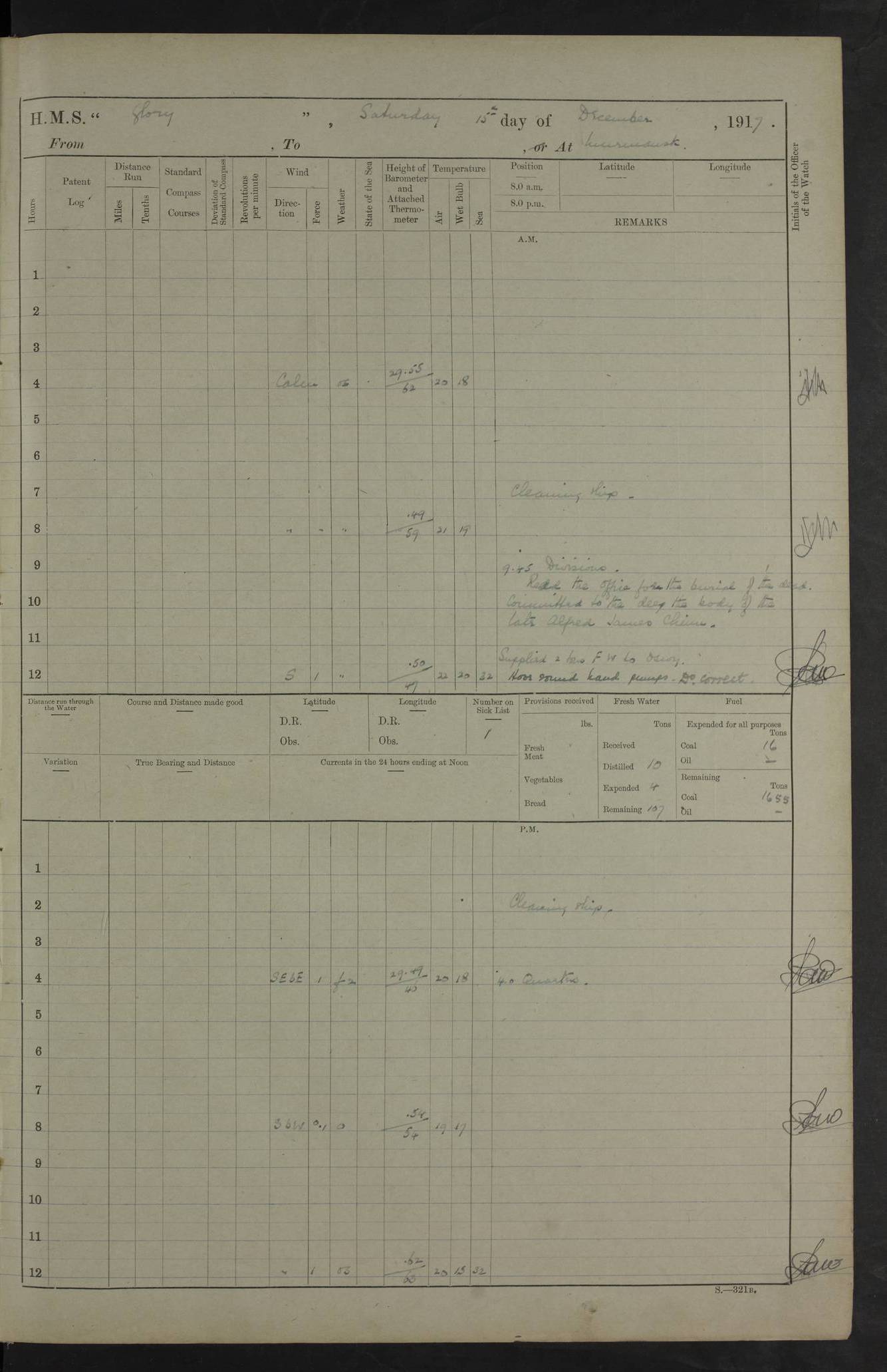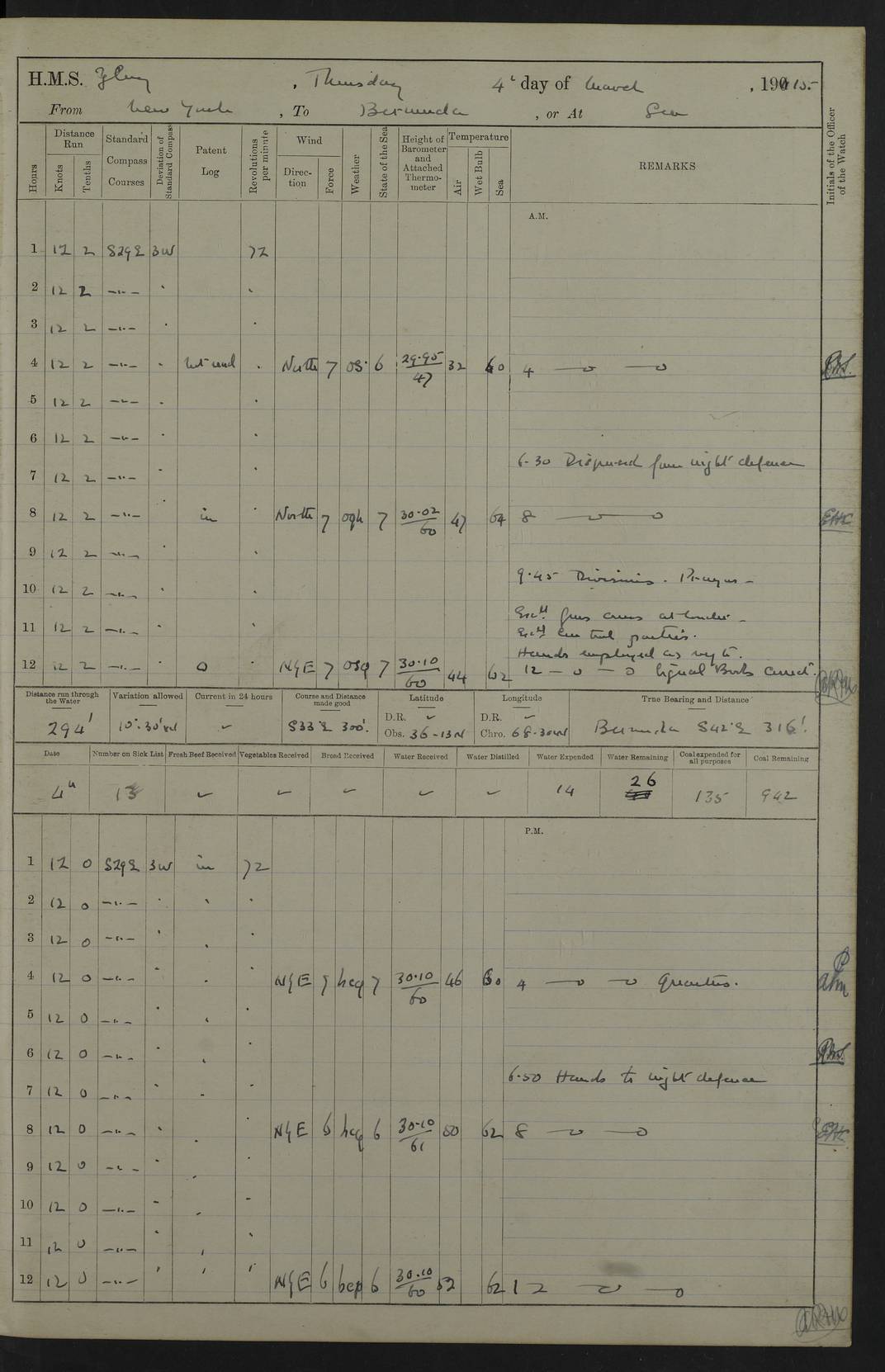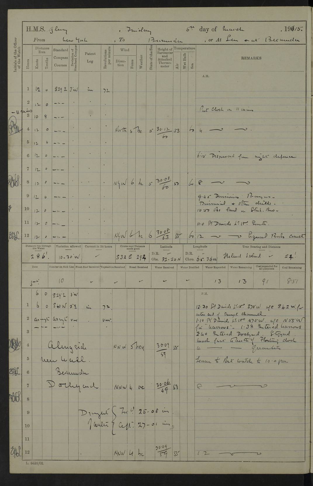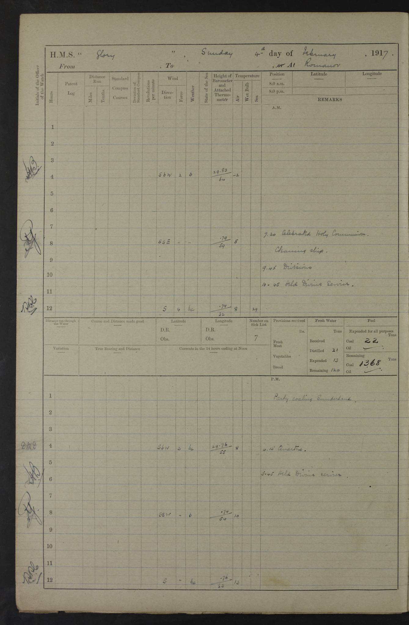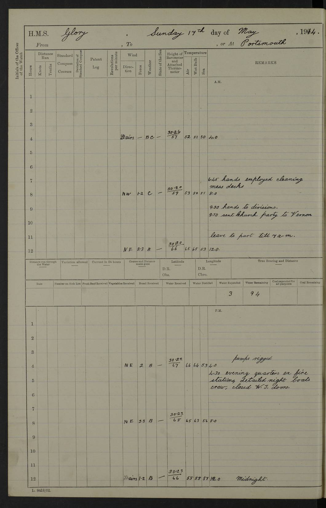 22 June 1915 At sea, Gibraltar to Lemnos Lat 36.1, Long -1.3 4.15am: Sighted land on starboard bow. 10.20am: Stopped port engine for repairs. 11.20am: proceeded with port engine. pm: a/c due to change in deviation. 10.00pm: Cape Tenez Light abeam, 18 miles. 4f73cd61a2fc8ea9030015f6: (https://s3.amazonaws.com:443/oldweather/ADM53-43015/0012_1.jpg) 23 June 1915 At sea, Gibraltar to Lemnos Lat 37.5, Long 4.8 Number on sick list: 4 5.00am: Secured from night defence stations. Placed anti-submarine guns. pm: Life saving appliances served out to men stationed in ? ?at abandon ship. 4f73cd61a2fc8ea9030015f7: (https://s3.amazonaws.com:443/oldweather/ADM53-43015/0013_0.jpg) 24 June 1915 At sea, Gibraltar to Lemnos Lat 37.4, Long 10.8 Position in log clearly bears no resemblance to the location of the ship. Position above is approximate and is based sighting of Zembra Island at 11.55am. 5.00am: Dispersed from night defence stations. Manned anti-submarine guns. am: Sighted two French torpedo boats. am: Torpedo boats passed to ~ No 362, 363. am: Sighted land on starboard beam. 11.55am: Zembra Island abeam, 25 miles. 2.00pm: Sighted Pantellaria S34ºE. 4.45pm: Pantellaria Light House abeam 12 miles. 4f73cd61a2fc8ea9030015f8: (https://s3.amazonaws.com:443/oldweather/ADM53-43015/0013_1.jpg) 25 June 1915 At sea, Gibraltar to Lemnos Lat 35.5, Long 16.7 2.10am: Gozo Light abeam 17 miles. 5.00am: Dispersed from night defence stations. Manned anti-submarine guns. 4f73cd61a2fc8ea9030015f9: (https://s3.amazonaws.com:443/oldweather/ADM53-43015/0014_0.jpg) 26 June 1915 At sea, Gibraltar to Lemnos Lat 35.5, Long 22.6 Number on sick list: 5 5.00am: Dispersed from night defence stations. Manned anti-submarine guns. am: Aired night clothing. am: marines at maxim practice on quarter deck. 2.00pm: Observed land on either bow. 3.00pm: Sighted French patrol destroyer. 4.15pm: Sighted French patrol destroyer. 9.40pm: Milo Peak N63ºW. 10.26pm: Polino Light abeam to port 5.5 miles. 4f73cd62a2fc8ea9030015fa: (https://s3.amazonaws.com:443/oldweather/ADM53-43015/0014_1.jpg) 27 June 1915 At sea and at Lemnos Lat 39.1, Long 24.4 From 0.50 to 3.05am sighting of multiple light houses. 3.50am: a/c to N39ºW and commenced to zig-zag. 5.00am: Dispersed from night defence stations and placed anti-submarine guns and look-outs. am: Lost overboard by accident Hazlewood fender, pat. 311, one in number. 10.30am: Held Divine Service onboard. pm: Met and signalled HMS Minerva on patrol duty. pm: Courses and speeds as requisite while waiting orders to approach Mudros. 3.00pm: Proceeded. 5.16pm: Increased to 90 revs, commenced to zig-zag. Course as requisite for Mudros. 7.00pm: Entered Mudros Bay. 7.47pm: Stopped. Let go port anchor in ‘M3’. 8.30pm: Darkened ship. pm: Manned one 6” and one 12 pdr. 4f73cd62a2fc8ea9030015fb: (https://s3.amazonaws.com:443/oldweather/ADM53-43015/0015_0.jpg) 28 June 1915 Mudros Bay, Lemnos Lat 39.89, Long 25.24 5,00am: HMS Vengeance entered harbour. HMS Vengeance was a pre-dreadnought of the Canopus class, launched in 1899 at Vickers, Barrow, and sold for scrapping in 1921. Details at http://en.wikipedia.org/wiki/HMS_Vengeance_(1899) . am/pm/: hands preparing for coaling and about ship’s work. pm: Collier Wabana secured alongside. 4f73cd62a2fc8ea9030015fc: (https://s3.amazonaws.com:443/oldweather/ADM53-43015/0015_1.jpg) 29 June 1915 Mudros Bay, Lemnos Lat 39.89, Long 25.24 5.15am: Commenced coaling. 2.00pm: Finished coaling. Collier left. 4f73cd62a2fc8ea9030015fd: (https://s3.amazonaws.com:443/oldweather/ADM53-43015/0016_0.jpg) 30 June 1915 Mudros Bay, Lemnos Lat 39.89, Long 25.24 am: Parties away sanding, and with fire engines onshore. am: Boats away disembarking troops. am: French Flagship Patrie sailed. The Patrie was a French pre-dreadnought, launched at La Seyne shipyard in 1903, and stricken in 1921. Details at http://en.wikipedia.org/wiki/French_battleship_Patrie . 6.30pm: Hands to bathe. 4f73cd63a2fc8ea9030015fe: (https://s3.amazonaws.com:443/oldweather/ADM53-43015/0016_1.jpg) 4f73cd63a2fc8ea9030015ff: (https://s3.amazonaws.com:443/oldweather/ADM53-43015/0017_0.jpg) 4f73cd63a2fc8ea903001600: (https://s3.amazonaws.com:443/oldweather/ADM53-43015/0017_1.jpg) 4f73cd63a2fc8ea903001601: (https://s3.amazonaws.com:443/oldweather/ADM53-43015/0018_0.jpg) 4f73cd64a2fc8ea903001602: (https://s3.amazonaws.com:443/oldweather/ADM53-43015/0018_1.jpg) LOGS FOR JULY 1915 From July to October 1915, HMS Glory spent her time at Port Mudros. Certain activities typically took place daily and are not generally noted in the pages below. These activities include: Lighting fires in the picket boat around 4am and drawing the fires in the late evening; Divisions at around 9–9.30am and Evening Quarters at 4pm; Darken ship at around 8.30pm; Daily ‘cleaning ship’, with variations thereof; SBC (for ‘Signal Books Correct’) at the watch changes. 4f73cd64a2fc8ea903001603: (https://s3.amazonaws.com:443/oldweather/ADM53-43016/0000_0.jpg) 4f73cd64a2fc8ea903001604: (https://s3.amazonaws.com:443/oldweather/ADM53-43016/0000_1.jpg) 4f73cd65a2fc8ea903001605: (https://s3.amazonaws.com:443/oldweather/ADM53-43016/0001_0.jpg) 4f73cd65a2fc8ea903001606: (https://s3.amazonaws.com:443/oldweather/ADM53-43016/0001_1.jpg) 1 July 1915 Port Mudros Lat 39.89, Long 25.24 6.30am: Landed working parties preparing boom defence ships. am: Discharged Acting Commander Rayne to Hector. Hector was a kite balloon ship. No further details readily available. 5.00pm: Tug T.10 made fast astern. 7.15pm: HMS Venerable went out. 7.30pm: HMS Chatham went out. HMS Chatham was a ‘Town’ cruiser and lead ship of her class. She was launched in 1911 at Chatham Dockyard and sold in 1926. Details at http://en.wikipedia.org/wiki/HMS_Chatham_(1911) . 4f73cd65a2fc8ea903001607: (https://s3.amazonaws.com:443/oldweather/ADM53-43016/0002_0.jpg) 2 July 1915 Port Mudros Lat 39.89, Long 25.24 5.35am: Landed working parties preparing boom defence ships. am/pm: Boom defence par
