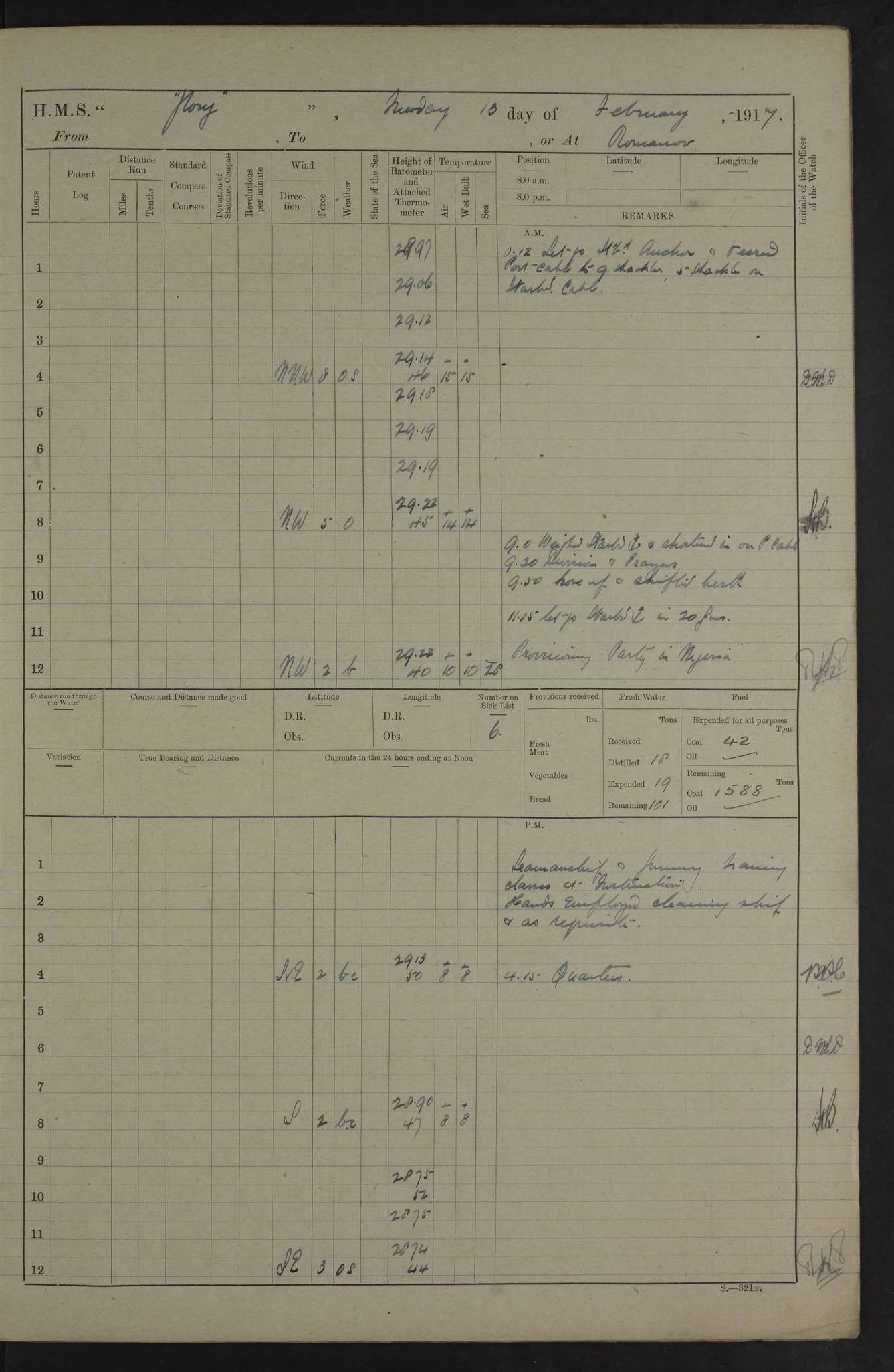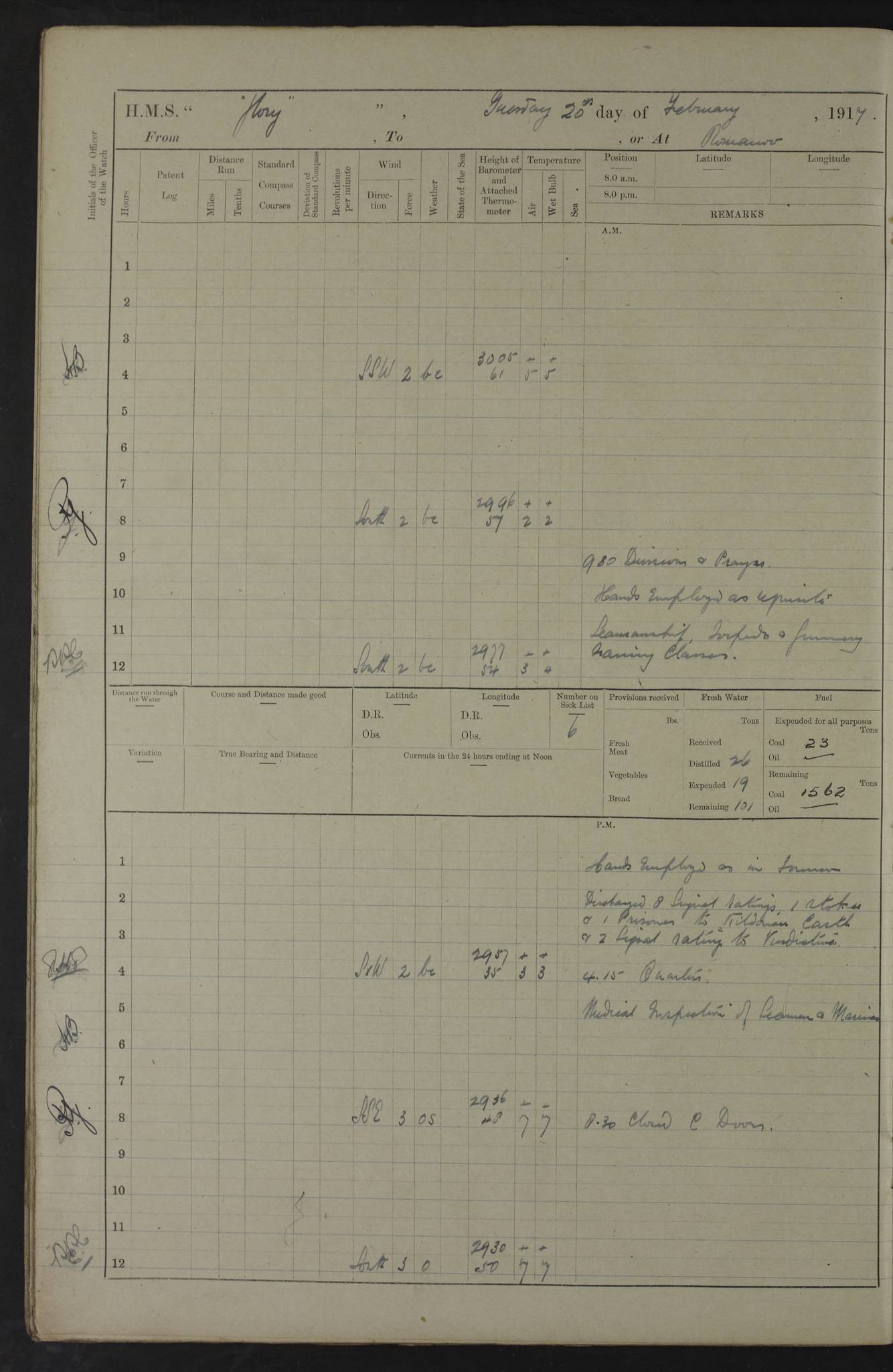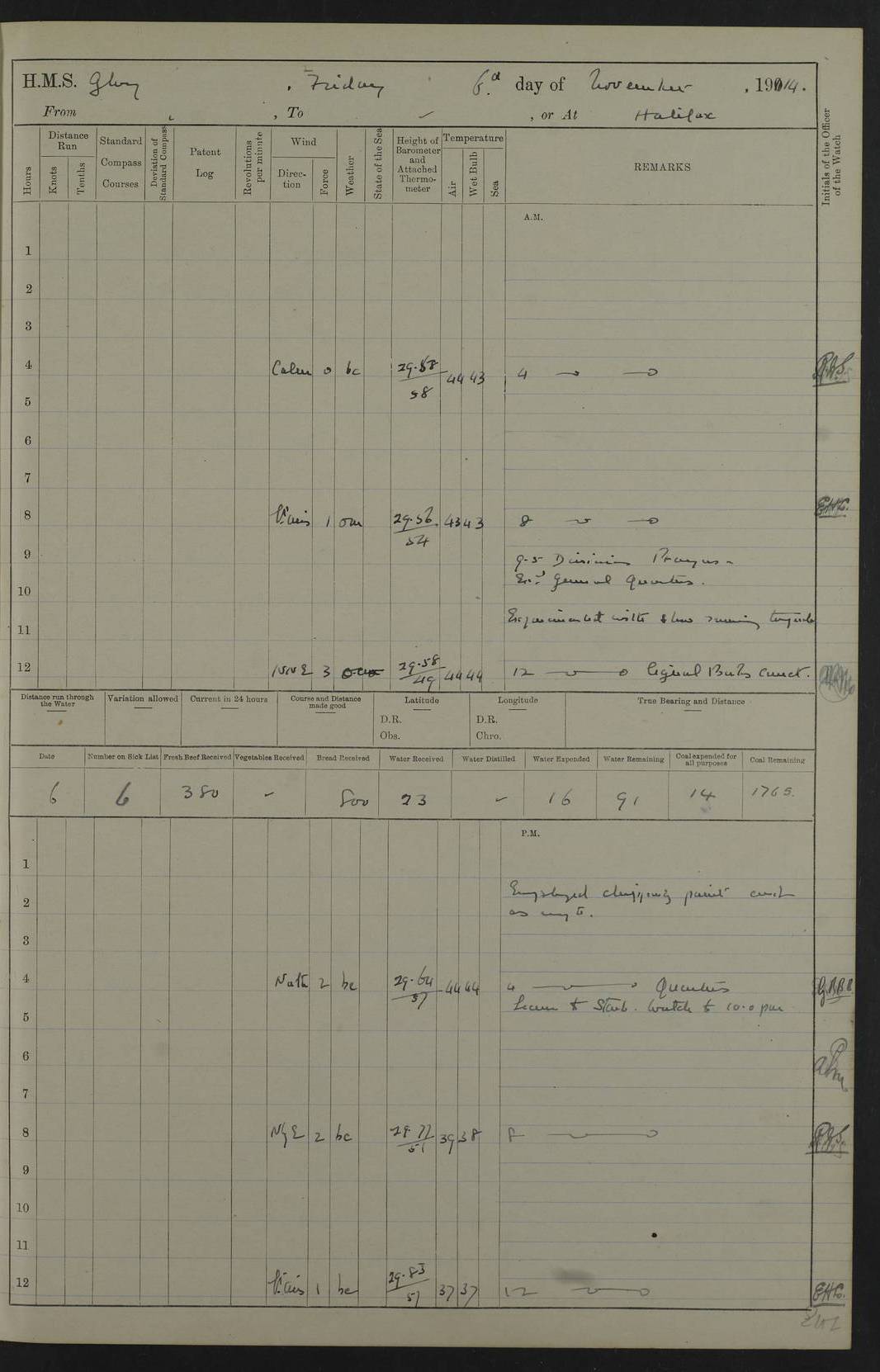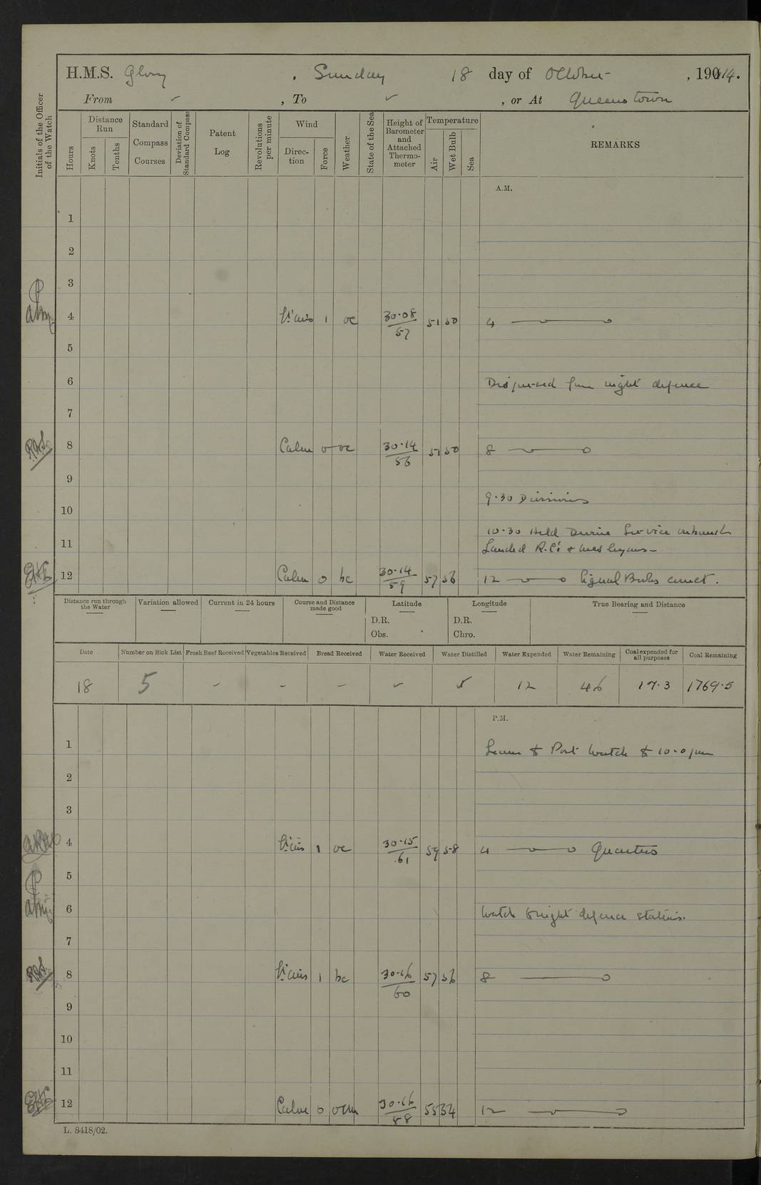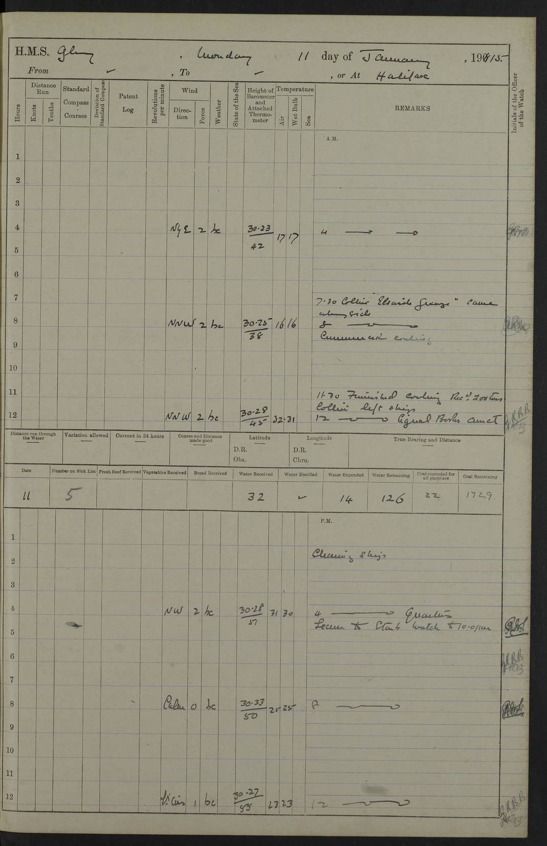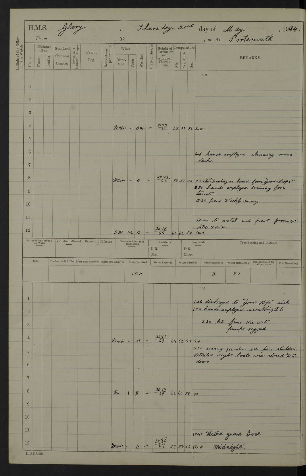 22 June 1915 At sea, Gibraltar to Lemnos Lat 36.1, Long -1.3 4.15am: Sighted land on starboard bow. 10.20am: Stopped port engine for repairs. 11.20am: proceeded with port engine. pm: a/c due to change in deviation. 10.00pm: Cape Tenez Light abeam, 18 miles. 4f73cd61a2fc8ea9030015f6: (https://s3.amazonaws.com:443/oldweather/ADM53-43015/0012_1.jpg) 23 June 1915 At sea, Gibraltar to Lemnos Lat 37.5, Long 4.8 Number on sick list: 4 5.00am: Secured from night defence stations. Placed anti-submarine guns. pm: Life saving appliances served out to men stationed in ? ?at abandon ship. 4f73cd61a2fc8ea9030015f7: (https://s3.amazonaws.com:443/oldweather/ADM53-43015/0013_0.jpg) 24 June 1915 At sea, Gibraltar to Lemnos Lat 37.4, Long 10.8 Position in log clearly bears no resemblance to the location of the ship. Position above is approximate and is based sighting of Zembra Island at 11.55am. 5.00am: Dispersed from night defence stations. Manned anti-submarine guns. am: Sighted two French torpedo boats. am: Torpedo boats passed to ~ No 362, 363. am: Sighted land on starboard beam. 11.55am: Zembra Island abeam, 25 miles. 2.00pm: Sighted Pantellaria S34ºE. 4.45pm: Pantellaria Light House abeam 12 miles. 4f73cd61a2fc8ea9030015f8: (https://s3.amazonaws.com:443/oldweather/ADM53-43015/0013_1.jpg) 25 June 1915 At sea, Gibraltar to Lemnos Lat 35.5, Long 16.7 2.10am: Gozo Light abeam 17 miles. 5.00am: Dispersed from night defence stations. Manned anti-submarine guns. 4f73cd61a2fc8ea9030015f9: (https://s3.amazonaws.com:443/oldweather/ADM53-43015/0014_0.jpg) 26 June 1915 At sea, Gibraltar to Lemnos Lat 35.5, Long 22.6 Number on sick list: 5 5.00am: Dispersed from night defence stations. Manned anti-submarine guns. am: Aired night clothing. am: marines at maxim practice on quarter deck. 2.00pm: Observed land on either bow. 3.00pm: Sighted French patrol destroyer. 4.15pm: Sighted French patrol destroyer. 9.40pm: Milo Peak N63ºW. 10.26pm: Polino Light abeam to port 5.5 miles. 4f73cd62a2fc8ea9030015fa: (https://s3.amazonaws.com:443/oldweather/ADM53-43015/0014_1.jpg) 27 June 1915 At sea and at Lemnos Lat 39.1, Long 24.4 From 0.50 to 3.05am sighting of multiple light houses. 3.50am: a/c to N39ºW and commenced to zig-zag. 5.00am: Dispersed from night defence stations and placed anti-submarine guns and look-outs. am: Lost overboard by accident Hazlewood fender, pat. 311, one in number. 10.30am: Held Divine Service onboard. pm: Met and signalled HMS Minerva on patrol duty. pm: Courses and speeds as requisite while waiting orders to approach Mudros. 3.00pm: Proceeded. 5.16pm: Increased to 90 revs, commenced to zig-zag. Course as requisite for Mudros. 7.00pm: Entered Mudros Bay. 7.47pm: Stopped. Let go port anchor in ‘M3’. 8.30pm: Darkened ship. pm: Manned one 6” and one 12 pdr. 4f73cd62a2fc8ea9030015fb: (https://s3.amazonaws.com:443/oldweather/ADM53-43015/0015_0.jpg) 28 June 1915 Mudros Bay, Lemnos Lat 39.89, Long 25.24 5,00am: HMS Vengeance entered harbour. HMS Vengeance was a pre-dreadnought of the Canopus class, launched in 1899 at Vickers, Barrow, and sold for scrapping in 1921. Details at http://en.wikipedia.org/wiki/HMS_Vengeance_(1899) . am/pm/: hands preparing for coaling and about ship’s work. pm: Collier Wabana secured alongside. 4f73cd62a2fc8ea9030015fc: (https://s3.amazonaws.com:443/oldweather/ADM53-43015/0015_1.jpg) 29 June 1915 Mudros Bay, Lemnos Lat 39.89, Long 25.24 5.15am: Commenced coaling. 2.00pm: Finished coaling. Collier left. 4f73cd62a2fc8ea9030015fd: (https://s3.amazonaws.com:443/oldweather/ADM53-43015/0016_0.jpg) 30 June 1915 Mudros Bay, Lemnos Lat 39.89, Long 25.24 am: Parties away sanding, and with fire engines onshore. am: Boats away disembarking troops. am: French Flagship Patrie sailed. The Patrie was a French pre-dreadnought, launched at La Seyne shipyard in 1903, and stricken in 1921. Details at http://en.wikipedia.org/wiki/French_battleship_Patrie . 6.30pm: Hands to bathe. 4f73cd63a2fc8ea9030015fe: (https://s3.amazonaws.com:443/oldweather/ADM53-43015/0016_1.jpg) 4f73cd63a2fc8ea9030015ff: (https://s3.amazonaws.com:443/oldweather/ADM53-43015/0017_0.jpg) 4f73cd63a2fc8ea903001600: (https://s3.amazonaws.com:443/oldweather/ADM53-43015/0017_1.jpg) 4f73cd63a2fc8ea903001601: (https://s3.amazonaws.com:443/oldweather/ADM53-43015/0018_0.jpg) 4f73cd64a2fc8ea903001602: (https://s3.amazonaws.com:443/oldweather/ADM53-43015/0018_1.jpg) LOGS FOR JULY 1915 From July to October 1915, HMS Glory spent her time at Port Mudros. Certain activities typically took place daily and are not generally noted in the pages below. These activities include: Lighting fires in the picket boat around 4am and drawing the fires in the late evening; Divisions at around 9–9.30am and Evening Quarters at 4pm; Darken ship at around 8.30pm; Daily ‘cleaning ship’, with variations thereof; SBC (for ‘Signal Books Correct’) at the watch changes. 4f73cd64a2fc8ea903001603: (https://s3.amazonaws.com:443/oldweather/ADM53-43016/0000_0.jpg) 4f73cd64a2fc8ea903001604: (https://s3.amazonaws.com:443/oldweather/ADM53-43016/0000_1.jpg) 4f73cd65a2fc8ea903001605: (https://s3.amazonaws.com:443/oldweather/ADM53-43016/0001_0.jpg) 4f73cd65a2fc8ea903001606: (https://s3.amazonaws.com:443/oldweather/ADM53-43016/0001_1.jpg) 1 July 1915 Port Mudros Lat 39.89, Long 25.24 6.30am: Landed working parties preparing boom defence ships. am: Discharged Acting Commander Rayne to Hector. Hector was a kite balloon ship. No further details readily available. 5.00pm: Tug T.10 made fast astern. 7.15pm: HMS Venerable went out. 7.30pm: HMS Chatham went out. HMS Chatham was a ‘Town’ cruiser and lead ship of her class. She was launched in 1911 at Chatham Dockyard and sold in 1926. Details at http://en.wikipedia.org/wiki/HMS_Chatham_(1911) . 4f73cd65a2fc8ea903001607: (https://s3.amazonaws.com:443/oldweather/ADM53-43016/0002_0.jpg) 2 July 1915 Port Mudros Lat 39.89, Long 25.24 5.35am: Landed working parties preparing boom defence ships. am/pm: Boom defence par
