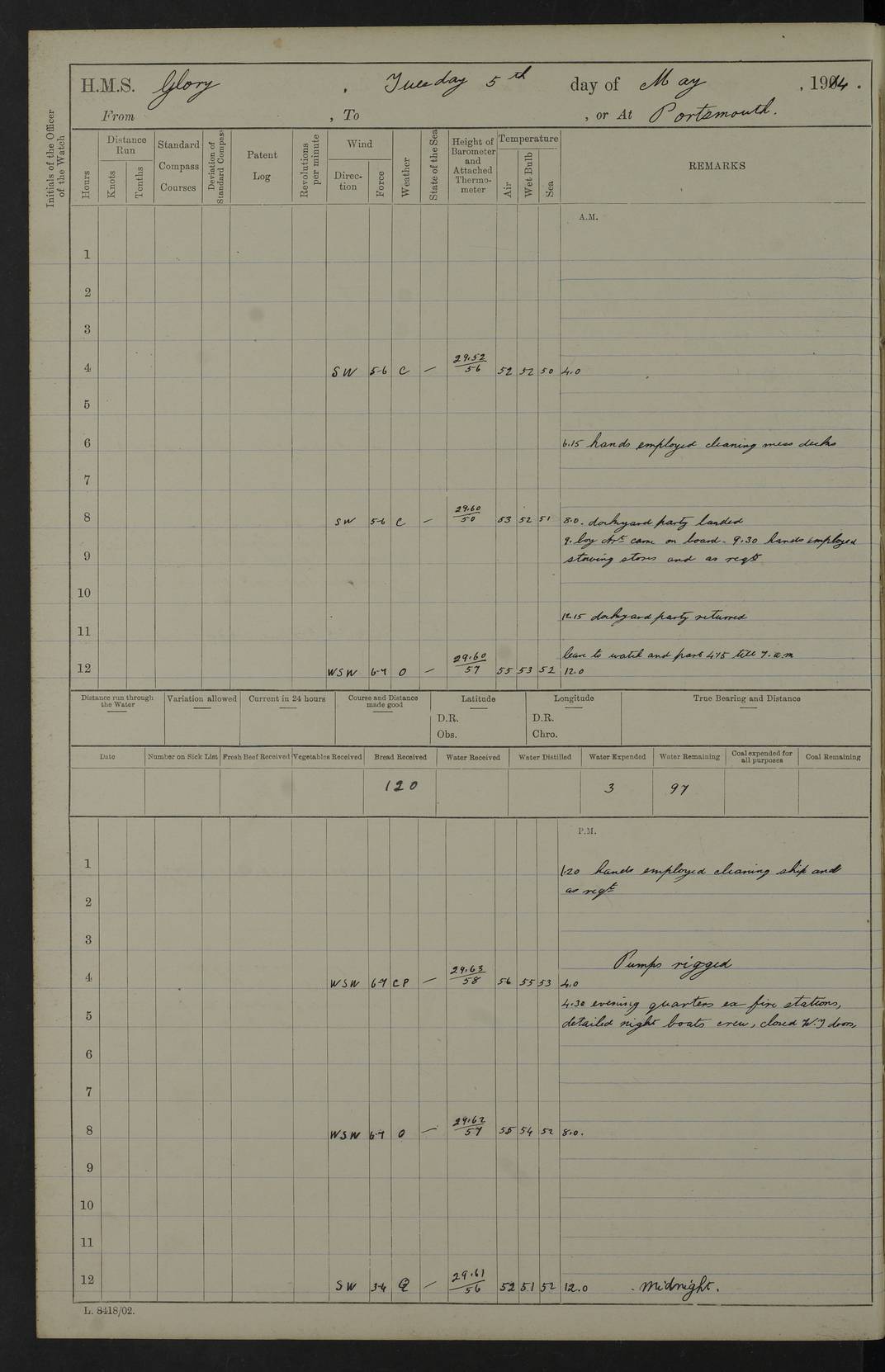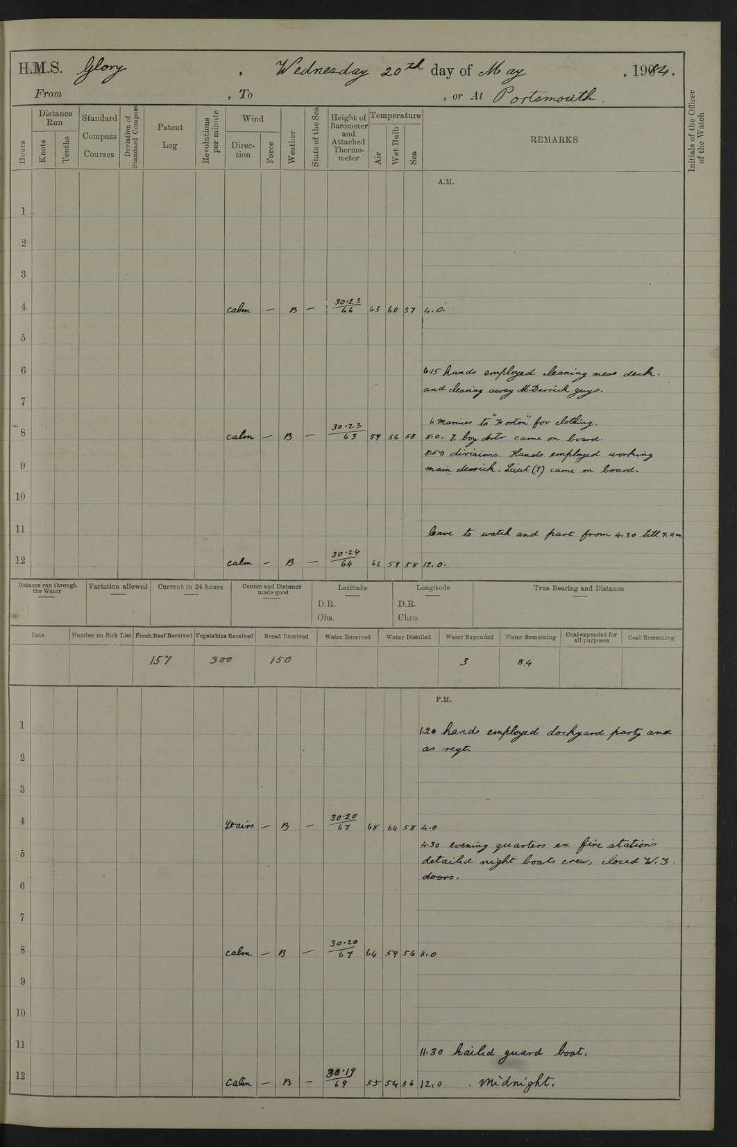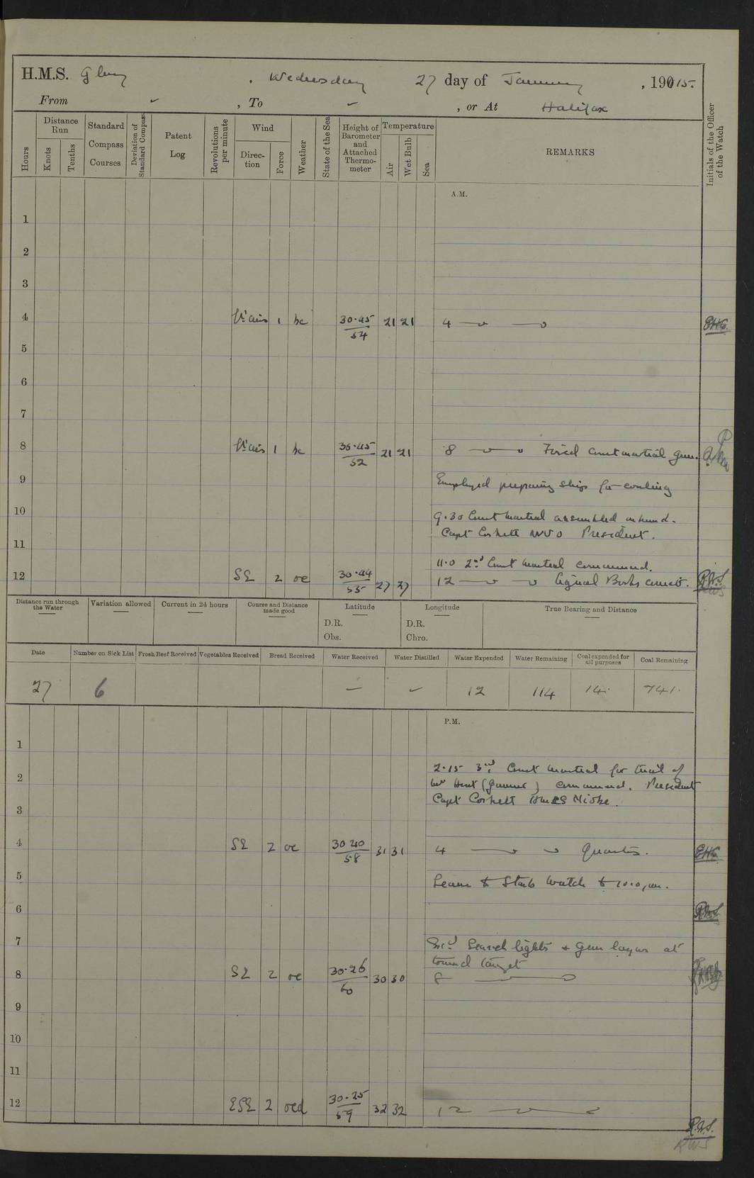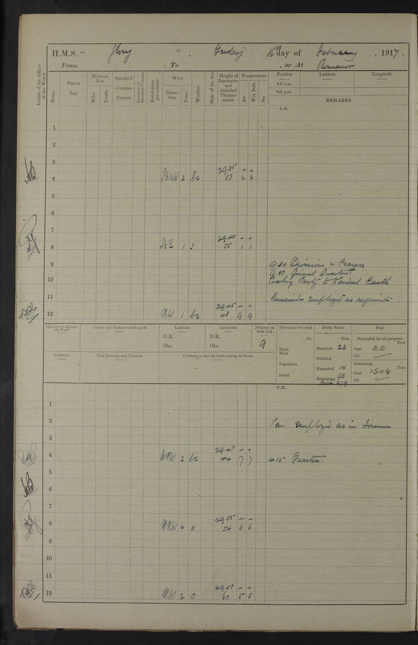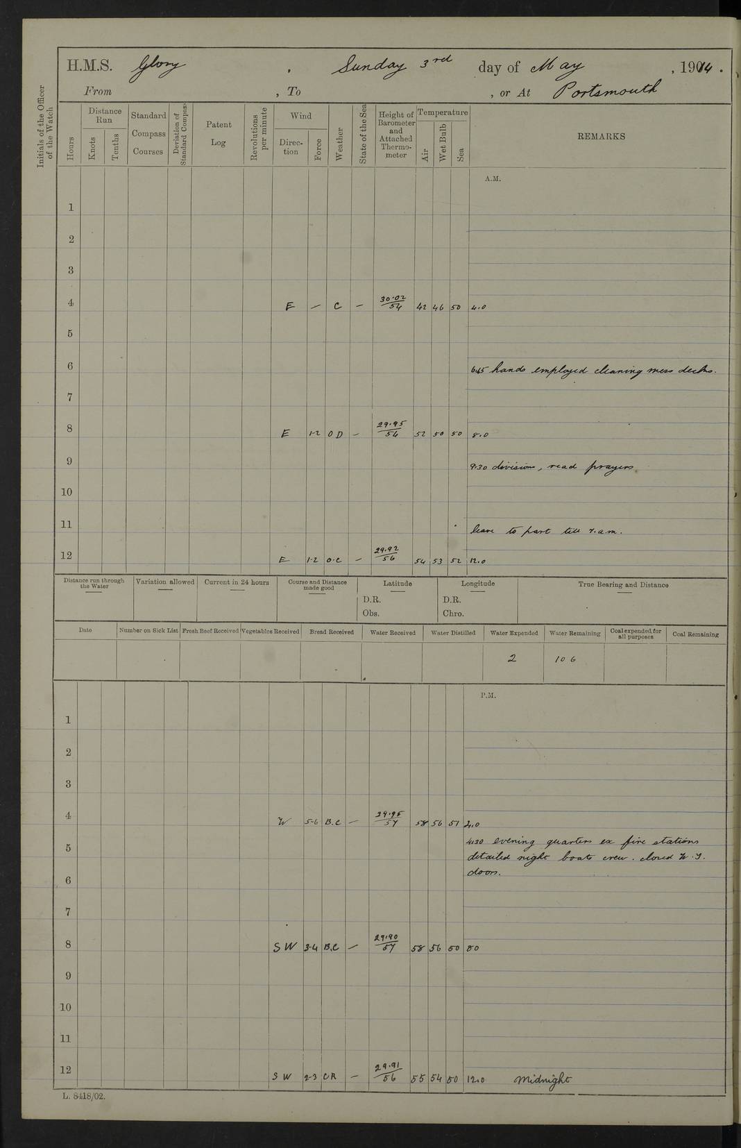 22 June 1915 At sea, Gibraltar to Lemnos Lat 36.1, Long -1.3 4.15am: Sighted land on starboard bow. 10.20am: Stopped port engine for repairs. 11.20am: proceeded with port engine. pm: a/c due to change in deviation. 10.00pm: Cape Tenez Light abeam, 18 miles. 4f73cd61a2fc8ea9030015f6: (https://s3.amazonaws.com:443/oldweather/ADM53-43015/0012_1.jpg) 23 June 1915 At sea, Gibraltar to Lemnos Lat 37.5, Long 4.8 Number on sick list: 4 5.00am: Secured from night defence stations. Placed anti-submarine guns. pm: Life saving appliances served out to men stationed in ? ?at abandon ship. 4f73cd61a2fc8ea9030015f7: (https://s3.amazonaws.com:443/oldweather/ADM53-43015/0013_0.jpg) 24 June 1915 At sea, Gibraltar to Lemnos Lat 37.4, Long 10.8 Position in log clearly bears no resemblance to the location of the ship. Position above is approximate and is based sighting of Zembra Island at 11.55am. 5.00am: Dispersed from night defence stations. Manned anti-submarine guns. am: Sighted two French torpedo boats. am: Torpedo boats passed to ~ No 362, 363. am: Sighted land on starboard beam. 11.55am: Zembra Island abeam, 25 miles. 2.00pm: Sighted Pantellaria S34ºE. 4.45pm: Pantellaria Light House abeam 12 miles. 4f73cd61a2fc8ea9030015f8: (https://s3.amazonaws.com:443/oldweather/ADM53-43015/0013_1.jpg) 25 June 1915 At sea, Gibraltar to Lemnos Lat 35.5, Long 16.7 2.10am: Gozo Light abeam 17 miles. 5.00am: Dispersed from night defence stations. Manned anti-submarine guns. 4f73cd61a2fc8ea9030015f9: (https://s3.amazonaws.com:443/oldweather/ADM53-43015/0014_0.jpg) 26 June 1915 At sea, Gibraltar to Lemnos Lat 35.5, Long 22.6 Number on sick list: 5 5.00am: Dispersed from night defence stations. Manned anti-submarine guns. am: Aired night clothing. am: marines at maxim practice on quarter deck. 2.00pm: Observed land on either bow. 3.00pm: Sighted French patrol destroyer. 4.15pm: Sighted French patrol destroyer. 9.40pm: Milo Peak N63ºW. 10.26pm: Polino Light abeam to port 5.5 miles. 4f73cd62a2fc8ea9030015fa: (https://s3.amazonaws.com:443/oldweather/ADM53-43015/0014_1.jpg) 27 June 1915 At sea and at Lemnos Lat 39.1, Long 24.4 From 0.50 to 3.05am sighting of multiple light houses. 3.50am: a/c to N39ºW and commenced to zig-zag. 5.00am: Dispersed from night defence stations and placed anti-submarine guns and look-outs. am: Lost overboard by accident Hazlewood fender, pat. 311, one in number. 10.30am: Held Divine Service onboard. pm: Met and signalled HMS Minerva on patrol duty. pm: Courses and speeds as requisite while waiting orders to approach Mudros. 3.00pm: Proceeded. 5.16pm: Increased to 90 revs, commenced to zig-zag. Course as requisite for Mudros. 7.00pm: Entered Mudros Bay. 7.47pm: Stopped. Let go port anchor in ‘M3’. 8.30pm: Darkened ship. pm: Manned one 6” and one 12 pdr. 4f73cd62a2fc8ea9030015fb: (https://s3.amazonaws.com:443/oldweather/ADM53-43015/0015_0.jpg) 28 June 1915 Mudros Bay, Lemnos Lat 39.89, Long 25.24 5,00am: HMS Vengeance entered harbour. HMS Vengeance was a pre-dreadnought of the Canopus class, launched in 1899 at Vickers, Barrow, and sold for scrapping in 1921. Details at http://en.wikipedia.org/wiki/HMS_Vengeance_(1899) . am/pm/: hands preparing for coaling and about ship’s work. pm: Collier Wabana secured alongside. 4f73cd62a2fc8ea9030015fc: (https://s3.amazonaws.com:443/oldweather/ADM53-43015/0015_1.jpg) 29 June 1915 Mudros Bay, Lemnos Lat 39.89, Long 25.24 5.15am: Commenced coaling. 2.00pm: Finished coaling. Collier left. 4f73cd62a2fc8ea9030015fd: (https://s3.amazonaws.com:443/oldweather/ADM53-43015/0016_0.jpg) 30 June 1915 Mudros Bay, Lemnos Lat 39.89, Long 25.24 am: Parties away sanding, and with fire engines onshore. am: Boats away disembarking troops. am: French Flagship Patrie sailed. The Patrie was a French pre-dreadnought, launched at La Seyne shipyard in 1903, and stricken in 1921. Details at http://en.wikipedia.org/wiki/French_battleship_Patrie . 6.30pm: Hands to bathe. 4f73cd63a2fc8ea9030015fe: (https://s3.amazonaws.com:443/oldweather/ADM53-43015/0016_1.jpg) 4f73cd63a2fc8ea9030015ff: (https://s3.amazonaws.com:443/oldweather/ADM53-43015/0017_0.jpg) 4f73cd63a2fc8ea903001600: (https://s3.amazonaws.com:443/oldweather/ADM53-43015/0017_1.jpg) 4f73cd63a2fc8ea903001601: (https://s3.amazonaws.com:443/oldweather/ADM53-43015/0018_0.jpg) 4f73cd64a2fc8ea903001602: (https://s3.amazonaws.com:443/oldweather/ADM53-43015/0018_1.jpg) LOGS FOR JULY 1915 From July to October 1915, HMS Glory spent her time at Port Mudros. Certain activities typically took place daily and are not generally noted in the pages below. These activities include: Lighting fires in the picket boat around 4am and drawing the fires in the late evening; Divisions at around 9–9.30am and Evening Quarters at 4pm; Darken ship at around 8.30pm; Daily ‘cleaning ship’, with variations thereof; SBC (for ‘Signal Books Correct’) at the watch changes. 4f73cd64a2fc8ea903001603: (https://s3.amazonaws.com:443/oldweather/ADM53-43016/0000_0.jpg) 4f73cd64a2fc8ea903001604: (https://s3.amazonaws.com:443/oldweather/ADM53-43016/0000_1.jpg) 4f73cd65a2fc8ea903001605: (https://s3.amazonaws.com:443/oldweather/ADM53-43016/0001_0.jpg) 4f73cd65a2fc8ea903001606: (https://s3.amazonaws.com:443/oldweather/ADM53-43016/0001_1.jpg) 1 July 1915 Port Mudros Lat 39.89, Long 25.24 6.30am: Landed working parties preparing boom defence ships. am: Discharged Acting Commander Rayne to Hector. Hector was a kite balloon ship. No further details readily available. 5.00pm: Tug T.10 made fast astern. 7.15pm: HMS Venerable went out. 7.30pm: HMS Chatham went out. HMS Chatham was a ‘Town’ cruiser and lead ship of her class. She was launched in 1911 at Chatham Dockyard and sold in 1926. Details at http://en.wikipedia.org/wiki/HMS_Chatham_(1911) . 4f73cd65a2fc8ea903001607: (https://s3.amazonaws.com:443/oldweather/ADM53-43016/0002_0.jpg) 2 July 1915 Port Mudros Lat 39.89, Long 25.24 5.35am: Landed working parties preparing boom defence ships. am/pm: Boom defence par