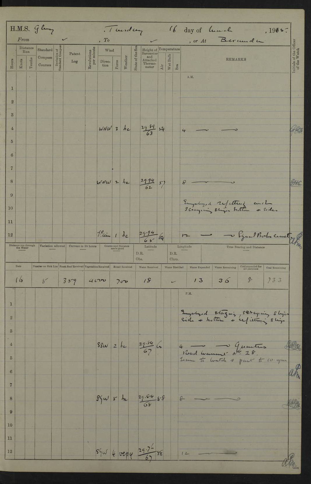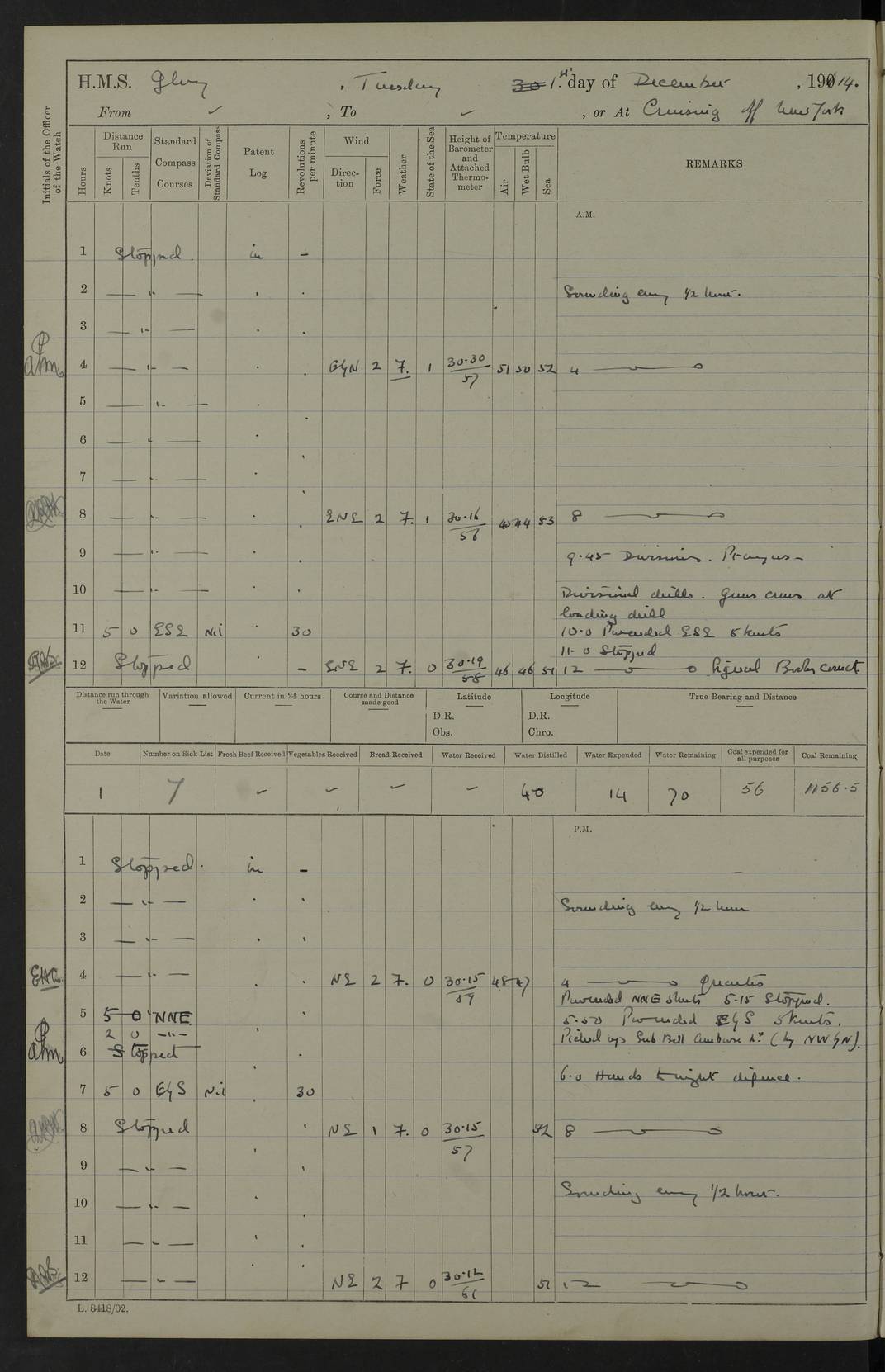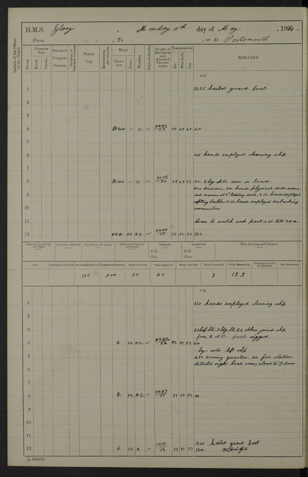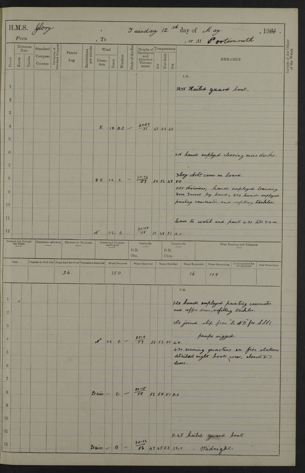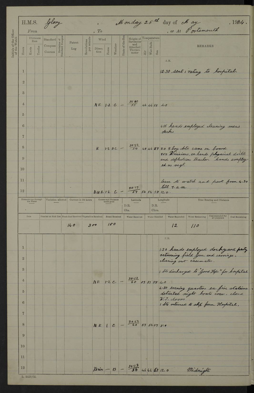 22 June 1915 At sea, Gibraltar to Lemnos Lat 36.1, Long -1.3 4.15am: Sighted land on starboard bow. 10.20am: Stopped port engine for repairs. 11.20am: proceeded with port engine. pm: a/c due to change in deviation. 10.00pm: Cape Tenez Light abeam, 18 miles. 4f73cd61a2fc8ea9030015f6: (https://s3.amazonaws.com:443/oldweather/ADM53-43015/0012_1.jpg) 23 June 1915 At sea, Gibraltar to Lemnos Lat 37.5, Long 4.8 Number on sick list: 4 5.00am: Secured from night defence stations. Placed anti-submarine guns. pm: Life saving appliances served out to men stationed in ? ?at abandon ship. 4f73cd61a2fc8ea9030015f7: (https://s3.amazonaws.com:443/oldweather/ADM53-43015/0013_0.jpg) 24 June 1915 At sea, Gibraltar to Lemnos Lat 37.4, Long 10.8 Position in log clearly bears no resemblance to the location of the ship. Position above is approximate and is based sighting of Zembra Island at 11.55am. 5.00am: Dispersed from night defence stations. Manned anti-submarine guns. am: Sighted two French torpedo boats. am: Torpedo boats passed to ~ No 362, 363. am: Sighted land on starboard beam. 11.55am: Zembra Island abeam, 25 miles. 2.00pm: Sighted Pantellaria S34ºE. 4.45pm: Pantellaria Light House abeam 12 miles. 4f73cd61a2fc8ea9030015f8: (https://s3.amazonaws.com:443/oldweather/ADM53-43015/0013_1.jpg) 25 June 1915 At sea, Gibraltar to Lemnos Lat 35.5, Long 16.7 2.10am: Gozo Light abeam 17 miles. 5.00am: Dispersed from night defence stations. Manned anti-submarine guns. 4f73cd61a2fc8ea9030015f9: (https://s3.amazonaws.com:443/oldweather/ADM53-43015/0014_0.jpg) 26 June 1915 At sea, Gibraltar to Lemnos Lat 35.5, Long 22.6 Number on sick list: 5 5.00am: Dispersed from night defence stations. Manned anti-submarine guns. am: Aired night clothing. am: marines at maxim practice on quarter deck. 2.00pm: Observed land on either bow. 3.00pm: Sighted French patrol destroyer. 4.15pm: Sighted French patrol destroyer. 9.40pm: Milo Peak N63ºW. 10.26pm: Polino Light abeam to port 5.5 miles. 4f73cd62a2fc8ea9030015fa: (https://s3.amazonaws.com:443/oldweather/ADM53-43015/0014_1.jpg) 27 June 1915 At sea and at Lemnos Lat 39.1, Long 24.4 From 0.50 to 3.05am sighting of multiple light houses. 3.50am: a/c to N39ºW and commenced to zig-zag. 5.00am: Dispersed from night defence stations and placed anti-submarine guns and look-outs. am: Lost overboard by accident Hazlewood fender, pat. 311, one in number. 10.30am: Held Divine Service onboard. pm: Met and signalled HMS Minerva on patrol duty. pm: Courses and speeds as requisite while waiting orders to approach Mudros. 3.00pm: Proceeded. 5.16pm: Increased to 90 revs, commenced to zig-zag. Course as requisite for Mudros. 7.00pm: Entered Mudros Bay. 7.47pm: Stopped. Let go port anchor in ‘M3’. 8.30pm: Darkened ship. pm: Manned one 6” and one 12 pdr. 4f73cd62a2fc8ea9030015fb: (https://s3.amazonaws.com:443/oldweather/ADM53-43015/0015_0.jpg) 28 June 1915 Mudros Bay, Lemnos Lat 39.89, Long 25.24 5,00am: HMS Vengeance entered harbour. HMS Vengeance was a pre-dreadnought of the Canopus class, launched in 1899 at Vickers, Barrow, and sold for scrapping in 1921. Details at http://en.wikipedia.org/wiki/HMS_Vengeance_(1899) . am/pm/: hands preparing for coaling and about ship’s work. pm: Collier Wabana secured alongside. 4f73cd62a2fc8ea9030015fc: (https://s3.amazonaws.com:443/oldweather/ADM53-43015/0015_1.jpg) 29 June 1915 Mudros Bay, Lemnos Lat 39.89, Long 25.24 5.15am: Commenced coaling. 2.00pm: Finished coaling. Collier left. 4f73cd62a2fc8ea9030015fd: (https://s3.amazonaws.com:443/oldweather/ADM53-43015/0016_0.jpg) 30 June 1915 Mudros Bay, Lemnos Lat 39.89, Long 25.24 am: Parties away sanding, and with fire engines onshore. am: Boats away disembarking troops. am: French Flagship Patrie sailed. The Patrie was a French pre-dreadnought, launched at La Seyne shipyard in 1903, and stricken in 1921. Details at http://en.wikipedia.org/wiki/French_battleship_Patrie . 6.30pm: Hands to bathe. 4f73cd63a2fc8ea9030015fe: (https://s3.amazonaws.com:443/oldweather/ADM53-43015/0016_1.jpg) 4f73cd63a2fc8ea9030015ff: (https://s3.amazonaws.com:443/oldweather/ADM53-43015/0017_0.jpg) 4f73cd63a2fc8ea903001600: (https://s3.amazonaws.com:443/oldweather/ADM53-43015/0017_1.jpg) 4f73cd63a2fc8ea903001601: (https://s3.amazonaws.com:443/oldweather/ADM53-43015/0018_0.jpg) 4f73cd64a2fc8ea903001602: (https://s3.amazonaws.com:443/oldweather/ADM53-43015/0018_1.jpg) LOGS FOR JULY 1915 From July to October 1915, HMS Glory spent her time at Port Mudros. Certain activities typically took place daily and are not generally noted in the pages below. These activities include: Lighting fires in the picket boat around 4am and drawing the fires in the late evening; Divisions at around 9–9.30am and Evening Quarters at 4pm; Darken ship at around 8.30pm; Daily ‘cleaning ship’, with variations thereof; SBC (for ‘Signal Books Correct’) at the watch changes. 4f73cd64a2fc8ea903001603: (https://s3.amazonaws.com:443/oldweather/ADM53-43016/0000_0.jpg) 4f73cd64a2fc8ea903001604: (https://s3.amazonaws.com:443/oldweather/ADM53-43016/0000_1.jpg) 4f73cd65a2fc8ea903001605: (https://s3.amazonaws.com:443/oldweather/ADM53-43016/0001_0.jpg) 4f73cd65a2fc8ea903001606: (https://s3.amazonaws.com:443/oldweather/ADM53-43016/0001_1.jpg) 1 July 1915 Port Mudros Lat 39.89, Long 25.24 6.30am: Landed working parties preparing boom defence ships. am: Discharged Acting Commander Rayne to Hector. Hector was a kite balloon ship. No further details readily available. 5.00pm: Tug T.10 made fast astern. 7.15pm: HMS Venerable went out. 7.30pm: HMS Chatham went out. HMS Chatham was a ‘Town’ cruiser and lead ship of her class. She was launched in 1911 at Chatham Dockyard and sold in 1926. Details at http://en.wikipedia.org/wiki/HMS_Chatham_(1911) . 4f73cd65a2fc8ea903001607: (https://s3.amazonaws.com:443/oldweather/ADM53-43016/0002_0.jpg) 2 July 1915 Port Mudros Lat 39.89, Long 25.24 5.35am: Landed working parties preparing boom defence ships. am/pm: Boom defence par