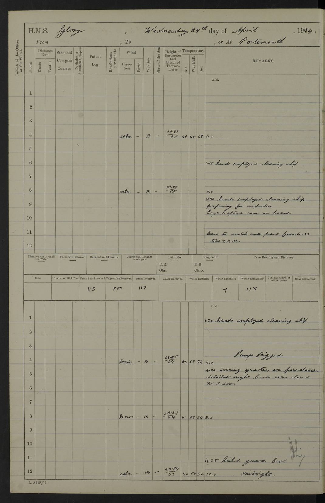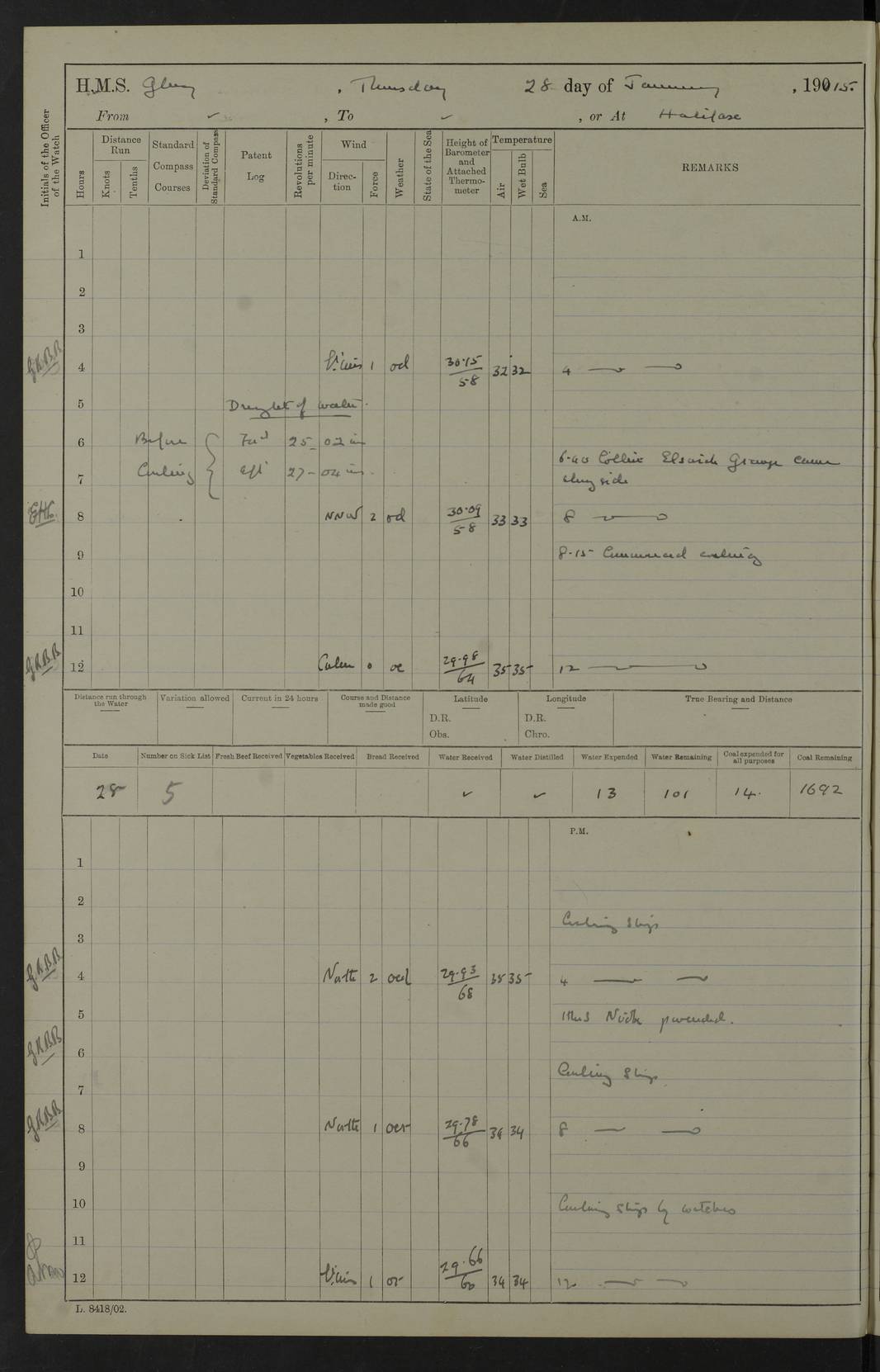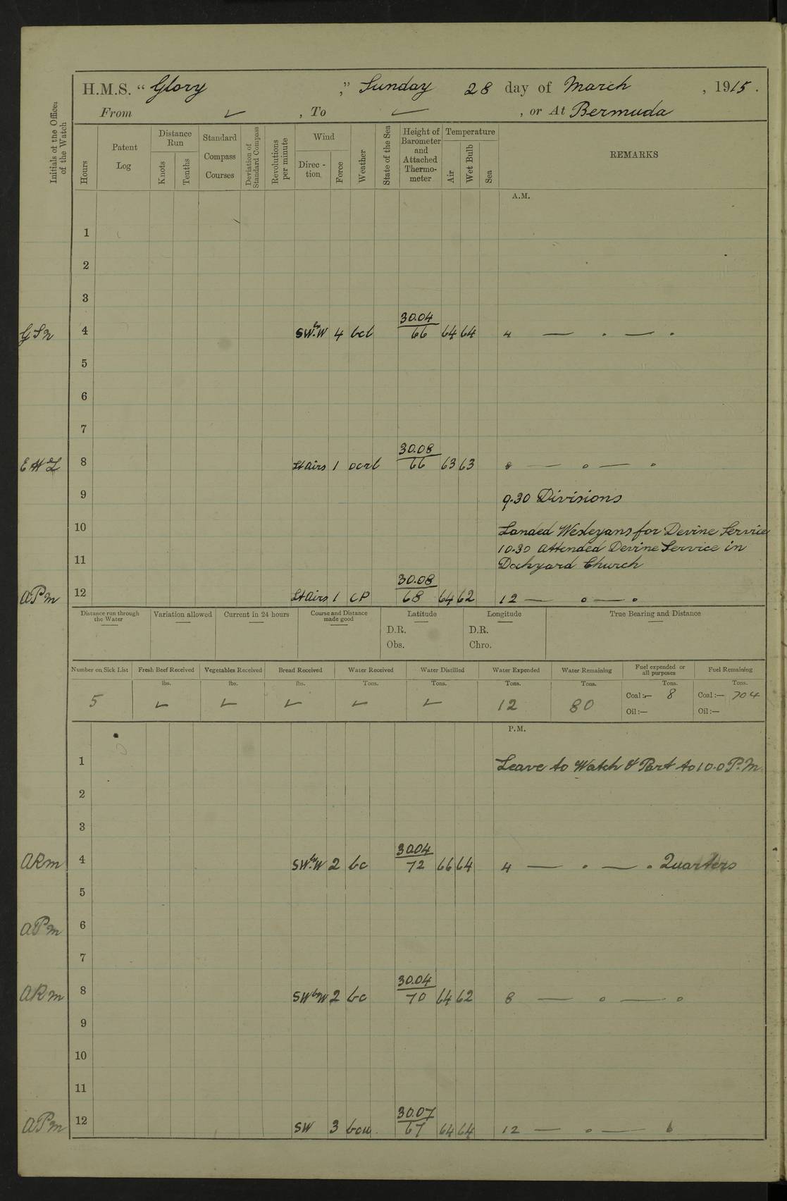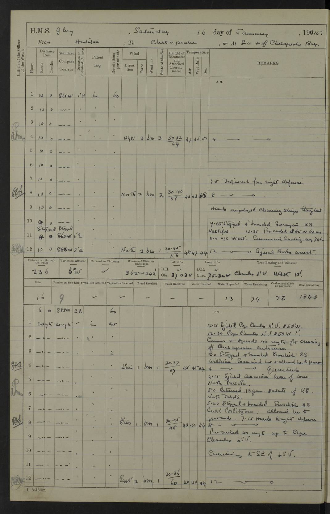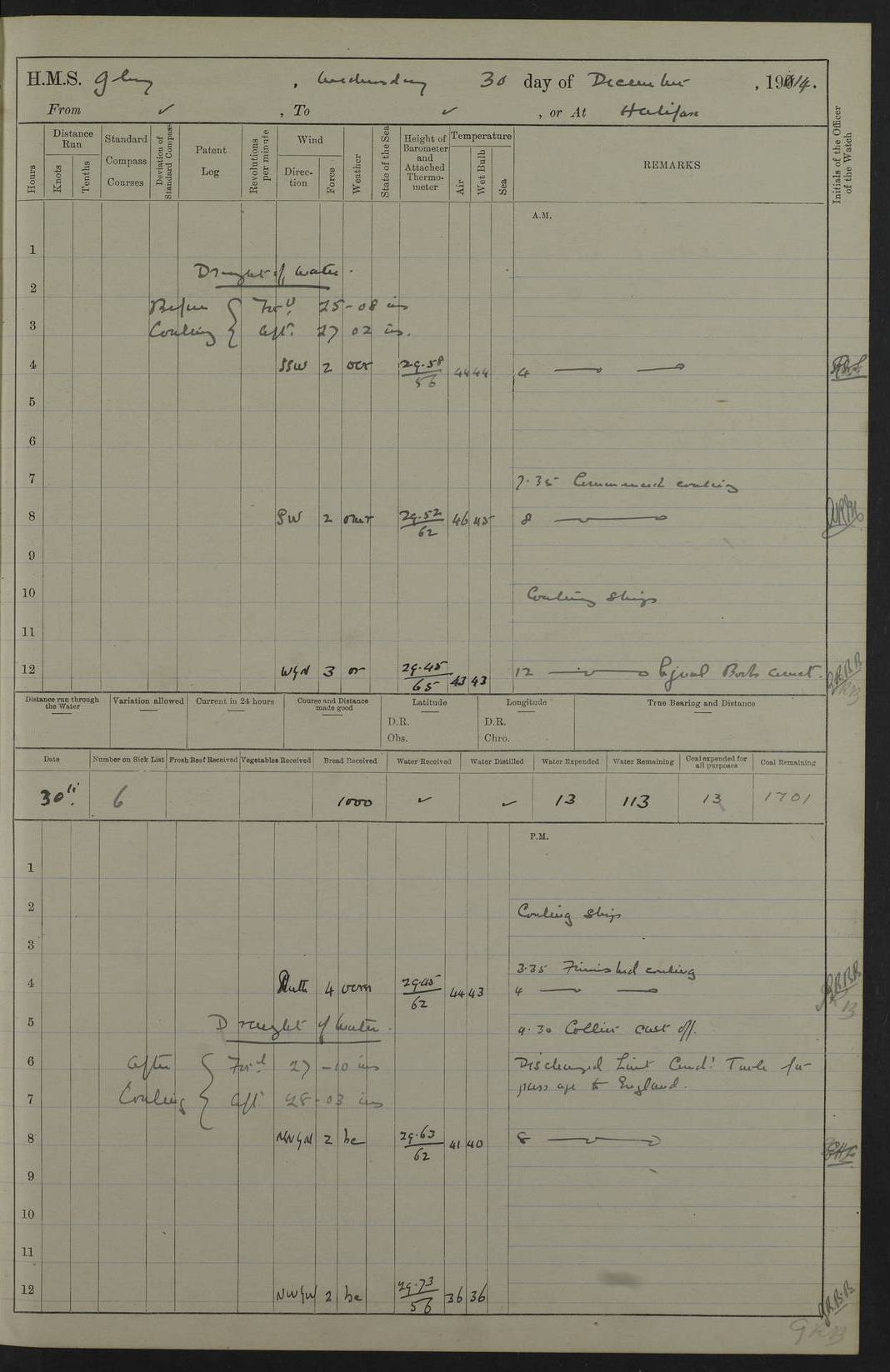 22 June 1915 At sea, Gibraltar to Lemnos Lat 36.1, Long -1.3 4.15am: Sighted land on starboard bow. 10.20am: Stopped port engine for repairs. 11.20am: proceeded with port engine. pm: a/c due to change in deviation. 10.00pm: Cape Tenez Light abeam, 18 miles. 4f73cd61a2fc8ea9030015f6: (https://s3.amazonaws.com:443/oldweather/ADM53-43015/0012_1.jpg) 23 June 1915 At sea, Gibraltar to Lemnos Lat 37.5, Long 4.8 Number on sick list: 4 5.00am: Secured from night defence stations. Placed anti-submarine guns. pm: Life saving appliances served out to men stationed in ? ?at abandon ship. 4f73cd61a2fc8ea9030015f7: (https://s3.amazonaws.com:443/oldweather/ADM53-43015/0013_0.jpg) 24 June 1915 At sea, Gibraltar to Lemnos Lat 37.4, Long 10.8 Position in log clearly bears no resemblance to the location of the ship. Position above is approximate and is based sighting of Zembra Island at 11.55am. 5.00am: Dispersed from night defence stations. Manned anti-submarine guns. am: Sighted two French torpedo boats. am: Torpedo boats passed to ~ No 362, 363. am: Sighted land on starboard beam. 11.55am: Zembra Island abeam, 25 miles. 2.00pm: Sighted Pantellaria S34ºE. 4.45pm: Pantellaria Light House abeam 12 miles. 4f73cd61a2fc8ea9030015f8: (https://s3.amazonaws.com:443/oldweather/ADM53-43015/0013_1.jpg) 25 June 1915 At sea, Gibraltar to Lemnos Lat 35.5, Long 16.7 2.10am: Gozo Light abeam 17 miles. 5.00am: Dispersed from night defence stations. Manned anti-submarine guns. 4f73cd61a2fc8ea9030015f9: (https://s3.amazonaws.com:443/oldweather/ADM53-43015/0014_0.jpg) 26 June 1915 At sea, Gibraltar to Lemnos Lat 35.5, Long 22.6 Number on sick list: 5 5.00am: Dispersed from night defence stations. Manned anti-submarine guns. am: Aired night clothing. am: marines at maxim practice on quarter deck. 2.00pm: Observed land on either bow. 3.00pm: Sighted French patrol destroyer. 4.15pm: Sighted French patrol destroyer. 9.40pm: Milo Peak N63ºW. 10.26pm: Polino Light abeam to port 5.5 miles. 4f73cd62a2fc8ea9030015fa: (https://s3.amazonaws.com:443/oldweather/ADM53-43015/0014_1.jpg) 27 June 1915 At sea and at Lemnos Lat 39.1, Long 24.4 From 0.50 to 3.05am sighting of multiple light houses. 3.50am: a/c to N39ºW and commenced to zig-zag. 5.00am: Dispersed from night defence stations and placed anti-submarine guns and look-outs. am: Lost overboard by accident Hazlewood fender, pat. 311, one in number. 10.30am: Held Divine Service onboard. pm: Met and signalled HMS Minerva on patrol duty. pm: Courses and speeds as requisite while waiting orders to approach Mudros. 3.00pm: Proceeded. 5.16pm: Increased to 90 revs, commenced to zig-zag. Course as requisite for Mudros. 7.00pm: Entered Mudros Bay. 7.47pm: Stopped. Let go port anchor in ‘M3’. 8.30pm: Darkened ship. pm: Manned one 6” and one 12 pdr. 4f73cd62a2fc8ea9030015fb: (https://s3.amazonaws.com:443/oldweather/ADM53-43015/0015_0.jpg) 28 June 1915 Mudros Bay, Lemnos Lat 39.89, Long 25.24 5,00am: HMS Vengeance entered harbour. HMS Vengeance was a pre-dreadnought of the Canopus class, launched in 1899 at Vickers, Barrow, and sold for scrapping in 1921. Details at http://en.wikipedia.org/wiki/HMS_Vengeance_(1899) . am/pm/: hands preparing for coaling and about ship’s work. pm: Collier Wabana secured alongside. 4f73cd62a2fc8ea9030015fc: (https://s3.amazonaws.com:443/oldweather/ADM53-43015/0015_1.jpg) 29 June 1915 Mudros Bay, Lemnos Lat 39.89, Long 25.24 5.15am: Commenced coaling. 2.00pm: Finished coaling. Collier left. 4f73cd62a2fc8ea9030015fd: (https://s3.amazonaws.com:443/oldweather/ADM53-43015/0016_0.jpg) 30 June 1915 Mudros Bay, Lemnos Lat 39.89, Long 25.24 am: Parties away sanding, and with fire engines onshore. am: Boats away disembarking troops. am: French Flagship Patrie sailed. The Patrie was a French pre-dreadnought, launched at La Seyne shipyard in 1903, and stricken in 1921. Details at http://en.wikipedia.org/wiki/French_battleship_Patrie . 6.30pm: Hands to bathe. 4f73cd63a2fc8ea9030015fe: (https://s3.amazonaws.com:443/oldweather/ADM53-43015/0016_1.jpg) 4f73cd63a2fc8ea9030015ff: (https://s3.amazonaws.com:443/oldweather/ADM53-43015/0017_0.jpg) 4f73cd63a2fc8ea903001600: (https://s3.amazonaws.com:443/oldweather/ADM53-43015/0017_1.jpg) 4f73cd63a2fc8ea903001601: (https://s3.amazonaws.com:443/oldweather/ADM53-43015/0018_0.jpg) 4f73cd64a2fc8ea903001602: (https://s3.amazonaws.com:443/oldweather/ADM53-43015/0018_1.jpg) LOGS FOR JULY 1915 From July to October 1915, HMS Glory spent her time at Port Mudros. Certain activities typically took place daily and are not generally noted in the pages below. These activities include: Lighting fires in the picket boat around 4am and drawing the fires in the late evening; Divisions at around 9–9.30am and Evening Quarters at 4pm; Darken ship at around 8.30pm; Daily ‘cleaning ship’, with variations thereof; SBC (for ‘Signal Books Correct’) at the watch changes. 4f73cd64a2fc8ea903001603: (https://s3.amazonaws.com:443/oldweather/ADM53-43016/0000_0.jpg) 4f73cd64a2fc8ea903001604: (https://s3.amazonaws.com:443/oldweather/ADM53-43016/0000_1.jpg) 4f73cd65a2fc8ea903001605: (https://s3.amazonaws.com:443/oldweather/ADM53-43016/0001_0.jpg) 4f73cd65a2fc8ea903001606: (https://s3.amazonaws.com:443/oldweather/ADM53-43016/0001_1.jpg) 1 July 1915 Port Mudros Lat 39.89, Long 25.24 6.30am: Landed working parties preparing boom defence ships. am: Discharged Acting Commander Rayne to Hector. Hector was a kite balloon ship. No further details readily available. 5.00pm: Tug T.10 made fast astern. 7.15pm: HMS Venerable went out. 7.30pm: HMS Chatham went out. HMS Chatham was a ‘Town’ cruiser and lead ship of her class. She was launched in 1911 at Chatham Dockyard and sold in 1926. Details at http://en.wikipedia.org/wiki/HMS_Chatham_(1911) . 4f73cd65a2fc8ea903001607: (https://s3.amazonaws.com:443/oldweather/ADM53-43016/0002_0.jpg) 2 July 1915 Port Mudros Lat 39.89, Long 25.24 5.35am: Landed working parties preparing boom defence ships. am/pm: Boom defence par