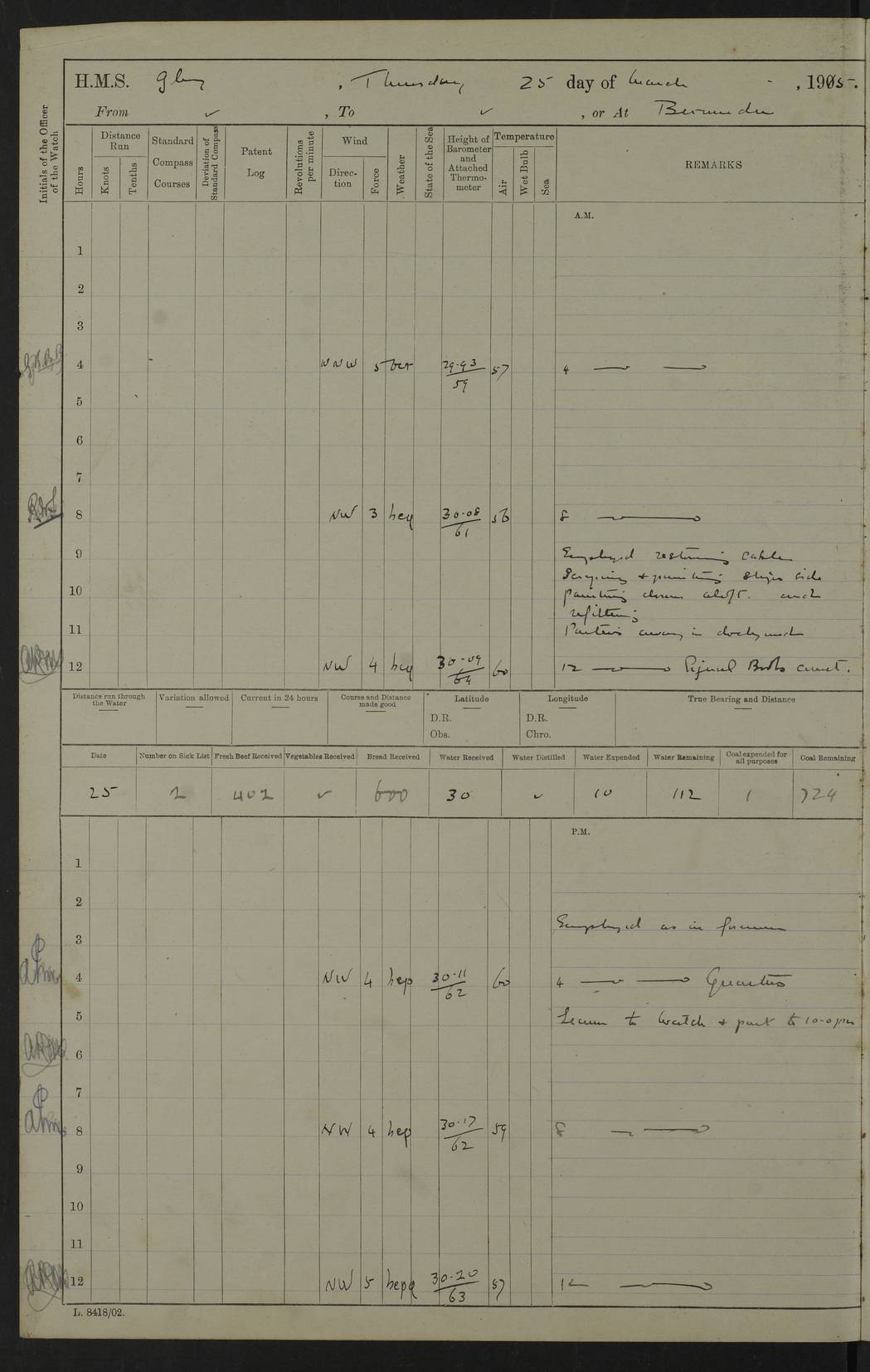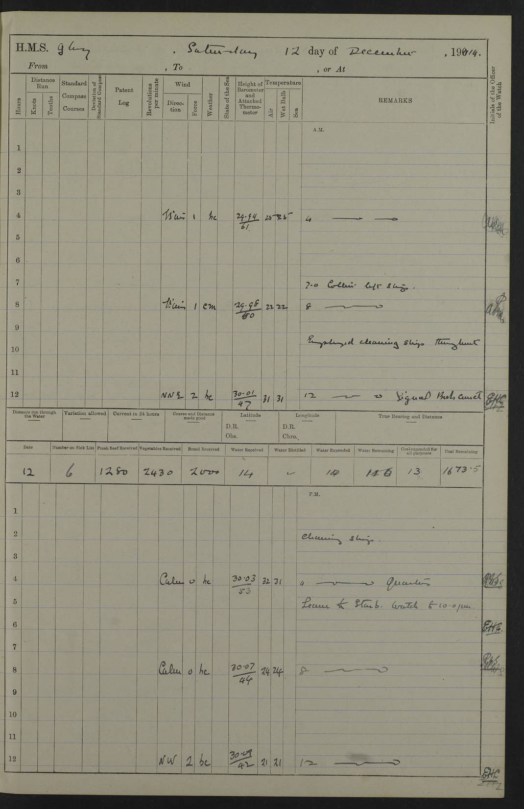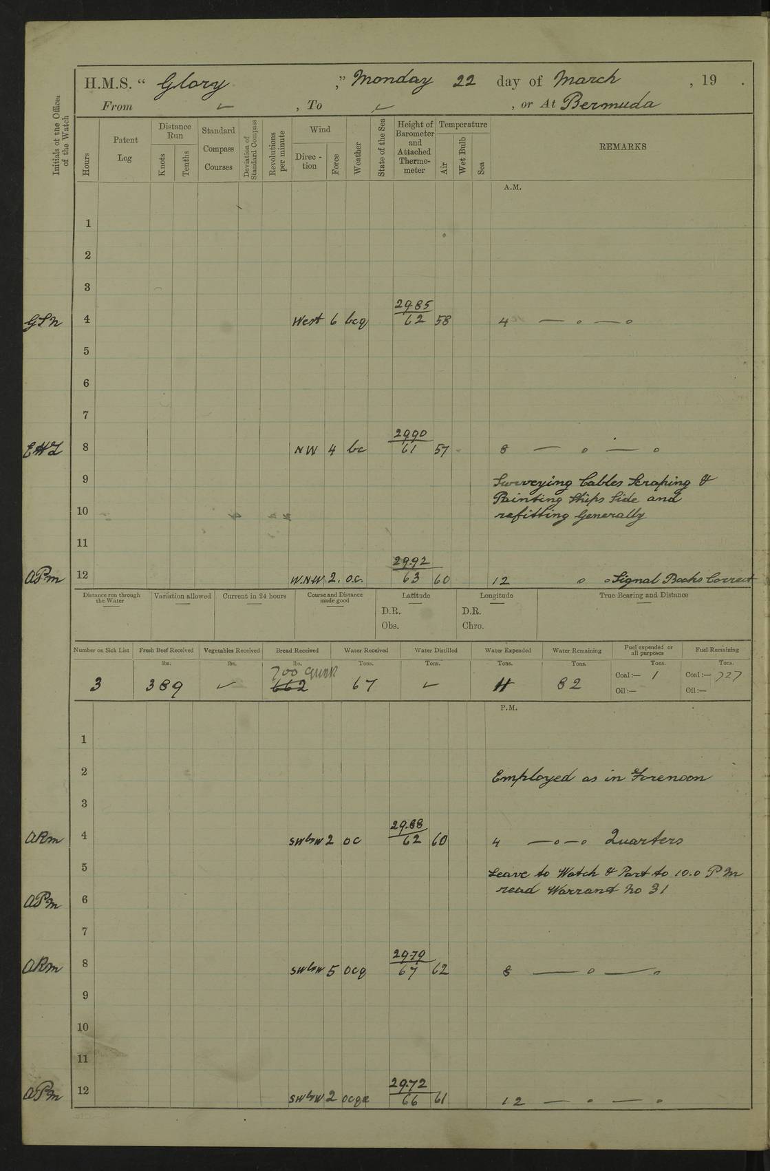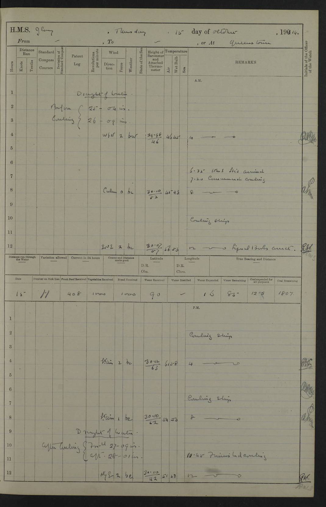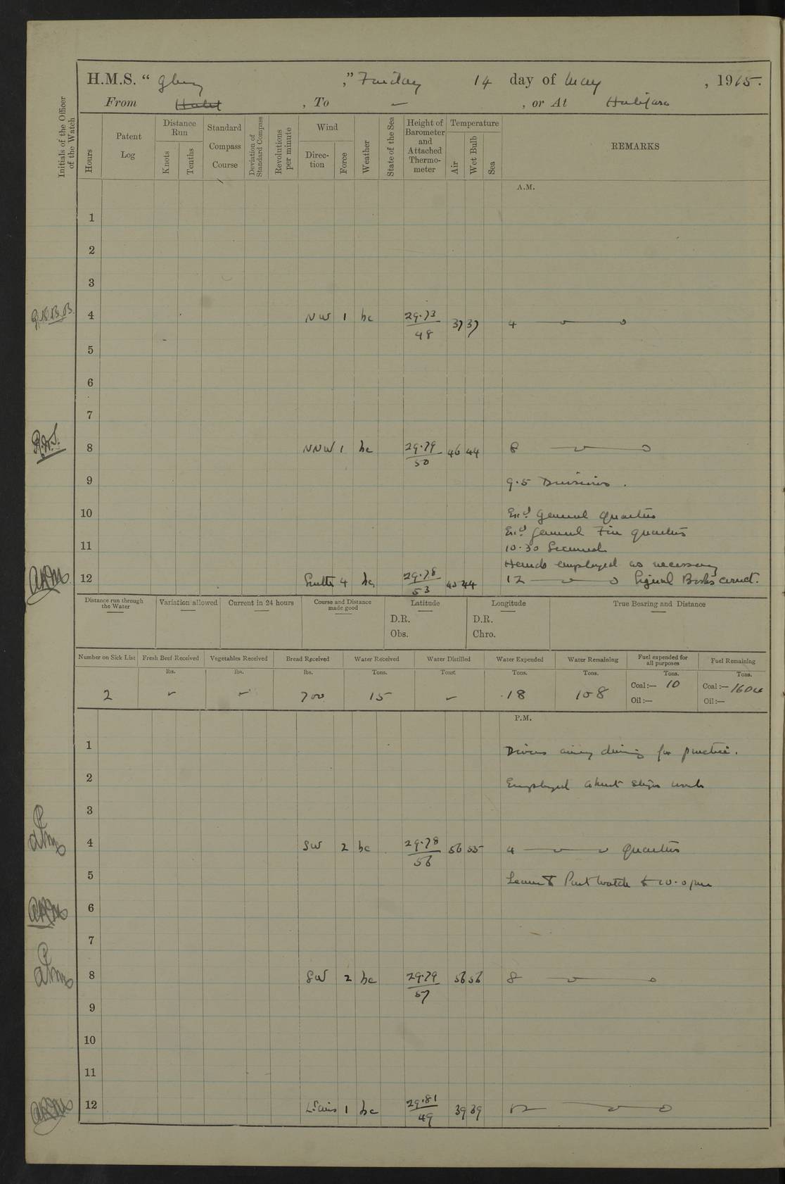 22 June 1915 At sea, Gibraltar to Lemnos Lat 36.1, Long -1.3 4.15am: Sighted land on starboard bow. 10.20am: Stopped port engine for repairs. 11.20am: proceeded with port engine. pm: a/c due to change in deviation. 10.00pm: Cape Tenez Light abeam, 18 miles. 4f73cd61a2fc8ea9030015f6: (https://s3.amazonaws.com:443/oldweather/ADM53-43015/0012_1.jpg) 23 June 1915 At sea, Gibraltar to Lemnos Lat 37.5, Long 4.8 Number on sick list: 4 5.00am: Secured from night defence stations. Placed anti-submarine guns. pm: Life saving appliances served out to men stationed in ? ?at abandon ship. 4f73cd61a2fc8ea9030015f7: (https://s3.amazonaws.com:443/oldweather/ADM53-43015/0013_0.jpg) 24 June 1915 At sea, Gibraltar to Lemnos Lat 37.4, Long 10.8 Position in log clearly bears no resemblance to the location of the ship. Position above is approximate and is based sighting of Zembra Island at 11.55am. 5.00am: Dispersed from night defence stations. Manned anti-submarine guns. am: Sighted two French torpedo boats. am: Torpedo boats passed to ~ No 362, 363. am: Sighted land on starboard beam. 11.55am: Zembra Island abeam, 25 miles. 2.00pm: Sighted Pantellaria S34ºE. 4.45pm: Pantellaria Light House abeam 12 miles. 4f73cd61a2fc8ea9030015f8: (https://s3.amazonaws.com:443/oldweather/ADM53-43015/0013_1.jpg) 25 June 1915 At sea, Gibraltar to Lemnos Lat 35.5, Long 16.7 2.10am: Gozo Light abeam 17 miles. 5.00am: Dispersed from night defence stations. Manned anti-submarine guns. 4f73cd61a2fc8ea9030015f9: (https://s3.amazonaws.com:443/oldweather/ADM53-43015/0014_0.jpg) 26 June 1915 At sea, Gibraltar to Lemnos Lat 35.5, Long 22.6 Number on sick list: 5 5.00am: Dispersed from night defence stations. Manned anti-submarine guns. am: Aired night clothing. am: marines at maxim practice on quarter deck. 2.00pm: Observed land on either bow. 3.00pm: Sighted French patrol destroyer. 4.15pm: Sighted French patrol destroyer. 9.40pm: Milo Peak N63ºW. 10.26pm: Polino Light abeam to port 5.5 miles. 4f73cd62a2fc8ea9030015fa: (https://s3.amazonaws.com:443/oldweather/ADM53-43015/0014_1.jpg) 27 June 1915 At sea and at Lemnos Lat 39.1, Long 24.4 From 0.50 to 3.05am sighting of multiple light houses. 3.50am: a/c to N39ºW and commenced to zig-zag. 5.00am: Dispersed from night defence stations and placed anti-submarine guns and look-outs. am: Lost overboard by accident Hazlewood fender, pat. 311, one in number. 10.30am: Held Divine Service onboard. pm: Met and signalled HMS Minerva on patrol duty. pm: Courses and speeds as requisite while waiting orders to approach Mudros. 3.00pm: Proceeded. 5.16pm: Increased to 90 revs, commenced to zig-zag. Course as requisite for Mudros. 7.00pm: Entered Mudros Bay. 7.47pm: Stopped. Let go port anchor in ‘M3’. 8.30pm: Darkened ship. pm: Manned one 6” and one 12 pdr. 4f73cd62a2fc8ea9030015fb: (https://s3.amazonaws.com:443/oldweather/ADM53-43015/0015_0.jpg) 28 June 1915 Mudros Bay, Lemnos Lat 39.89, Long 25.24 5,00am: HMS Vengeance entered harbour. HMS Vengeance was a pre-dreadnought of the Canopus class, launched in 1899 at Vickers, Barrow, and sold for scrapping in 1921. Details at http://en.wikipedia.org/wiki/HMS_Vengeance_(1899) . am/pm/: hands preparing for coaling and about ship’s work. pm: Collier Wabana secured alongside. 4f73cd62a2fc8ea9030015fc: (https://s3.amazonaws.com:443/oldweather/ADM53-43015/0015_1.jpg) 29 June 1915 Mudros Bay, Lemnos Lat 39.89, Long 25.24 5.15am: Commenced coaling. 2.00pm: Finished coaling. Collier left. 4f73cd62a2fc8ea9030015fd: (https://s3.amazonaws.com:443/oldweather/ADM53-43015/0016_0.jpg) 30 June 1915 Mudros Bay, Lemnos Lat 39.89, Long 25.24 am: Parties away sanding, and with fire engines onshore. am: Boats away disembarking troops. am: French Flagship Patrie sailed. The Patrie was a French pre-dreadnought, launched at La Seyne shipyard in 1903, and stricken in 1921. Details at http://en.wikipedia.org/wiki/French_battleship_Patrie . 6.30pm: Hands to bathe. 4f73cd63a2fc8ea9030015fe: (https://s3.amazonaws.com:443/oldweather/ADM53-43015/0016_1.jpg) 4f73cd63a2fc8ea9030015ff: (https://s3.amazonaws.com:443/oldweather/ADM53-43015/0017_0.jpg) 4f73cd63a2fc8ea903001600: (https://s3.amazonaws.com:443/oldweather/ADM53-43015/0017_1.jpg) 4f73cd63a2fc8ea903001601: (https://s3.amazonaws.com:443/oldweather/ADM53-43015/0018_0.jpg) 4f73cd64a2fc8ea903001602: (https://s3.amazonaws.com:443/oldweather/ADM53-43015/0018_1.jpg) LOGS FOR JULY 1915 From July to October 1915, HMS Glory spent her time at Port Mudros. Certain activities typically took place daily and are not generally noted in the pages below. These activities include: Lighting fires in the picket boat around 4am and drawing the fires in the late evening; Divisions at around 9–9.30am and Evening Quarters at 4pm; Darken ship at around 8.30pm; Daily ‘cleaning ship’, with variations thereof; SBC (for ‘Signal Books Correct’) at the watch changes. 4f73cd64a2fc8ea903001603: (https://s3.amazonaws.com:443/oldweather/ADM53-43016/0000_0.jpg) 4f73cd64a2fc8ea903001604: (https://s3.amazonaws.com:443/oldweather/ADM53-43016/0000_1.jpg) 4f73cd65a2fc8ea903001605: (https://s3.amazonaws.com:443/oldweather/ADM53-43016/0001_0.jpg) 4f73cd65a2fc8ea903001606: (https://s3.amazonaws.com:443/oldweather/ADM53-43016/0001_1.jpg) 1 July 1915 Port Mudros Lat 39.89, Long 25.24 6.30am: Landed working parties preparing boom defence ships. am: Discharged Acting Commander Rayne to Hector. Hector was a kite balloon ship. No further details readily available. 5.00pm: Tug T.10 made fast astern. 7.15pm: HMS Venerable went out. 7.30pm: HMS Chatham went out. HMS Chatham was a ‘Town’ cruiser and lead ship of her class. She was launched in 1911 at Chatham Dockyard and sold in 1926. Details at http://en.wikipedia.org/wiki/HMS_Chatham_(1911) . 4f73cd65a2fc8ea903001607: (https://s3.amazonaws.com:443/oldweather/ADM53-43016/0002_0.jpg) 2 July 1915 Port Mudros Lat 39.89, Long 25.24 5.35am: Landed working parties preparing boom defence ships. am/pm: Boom defence par