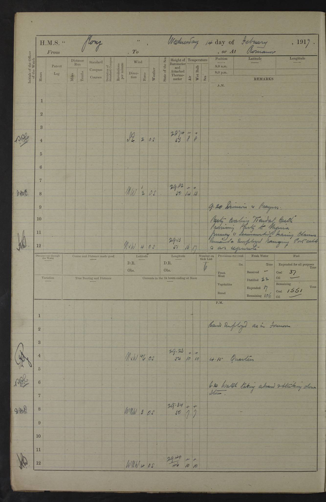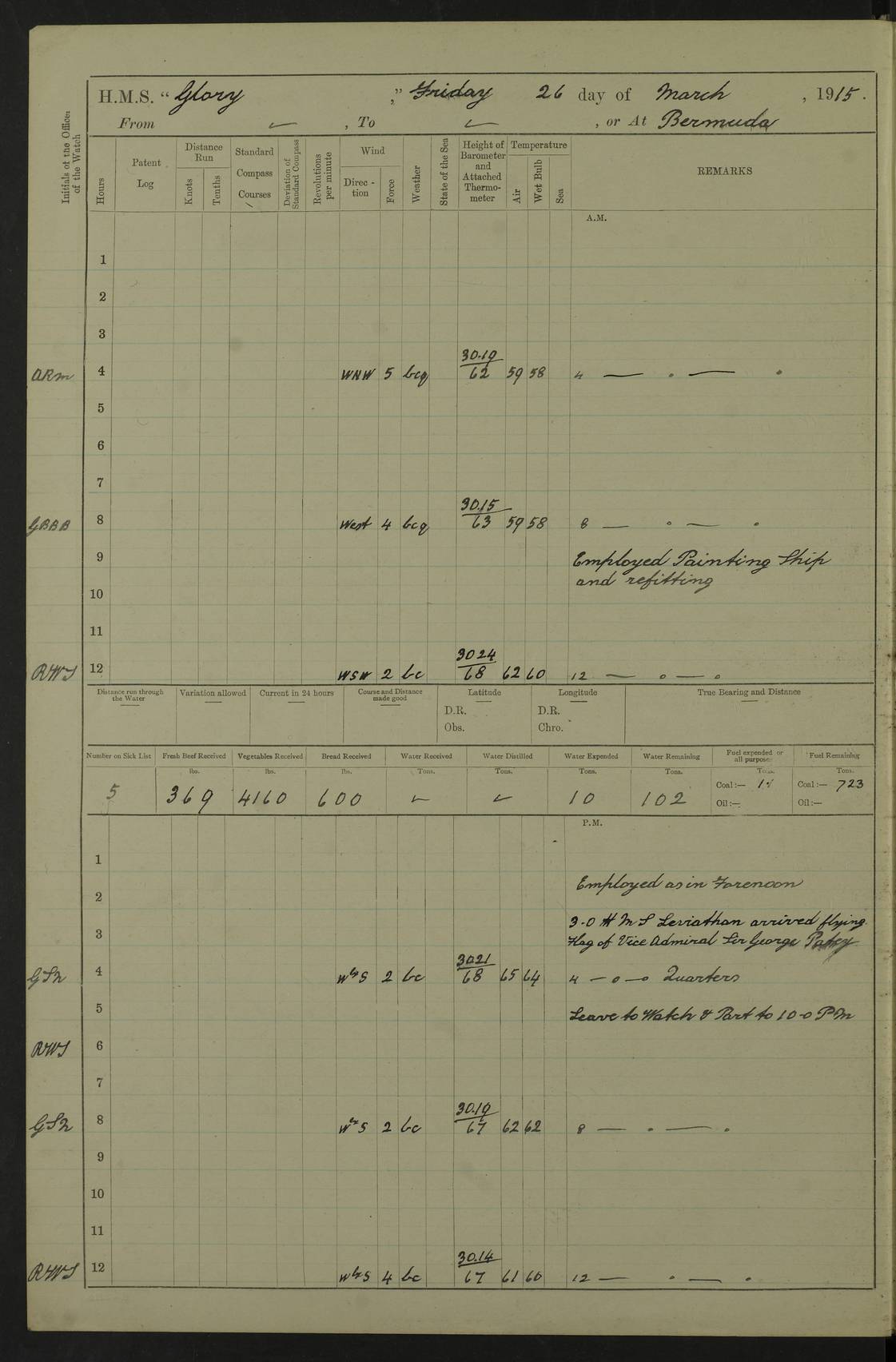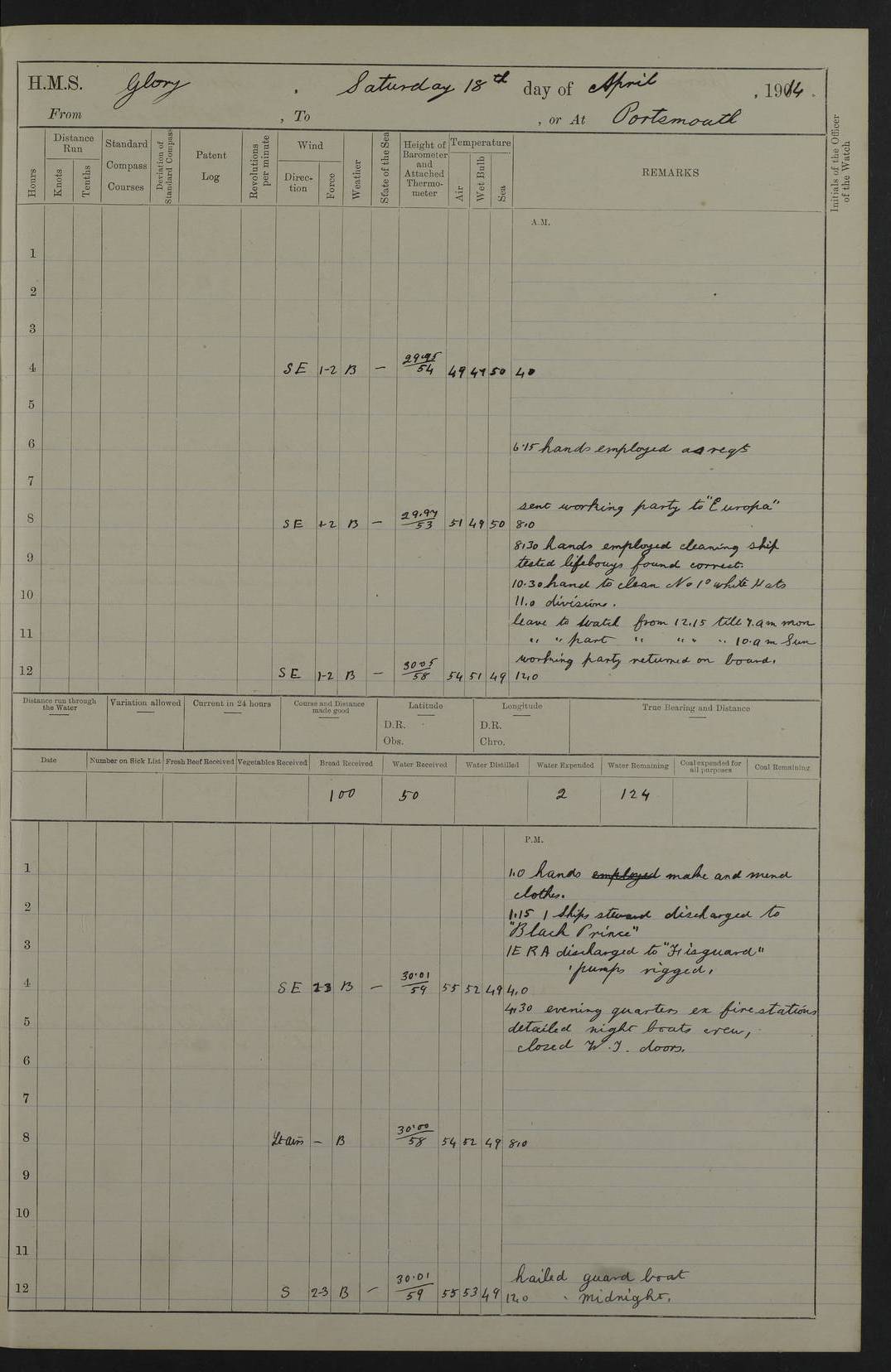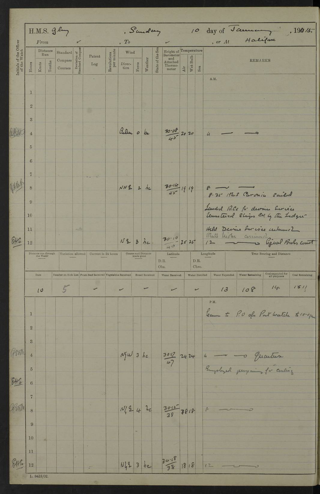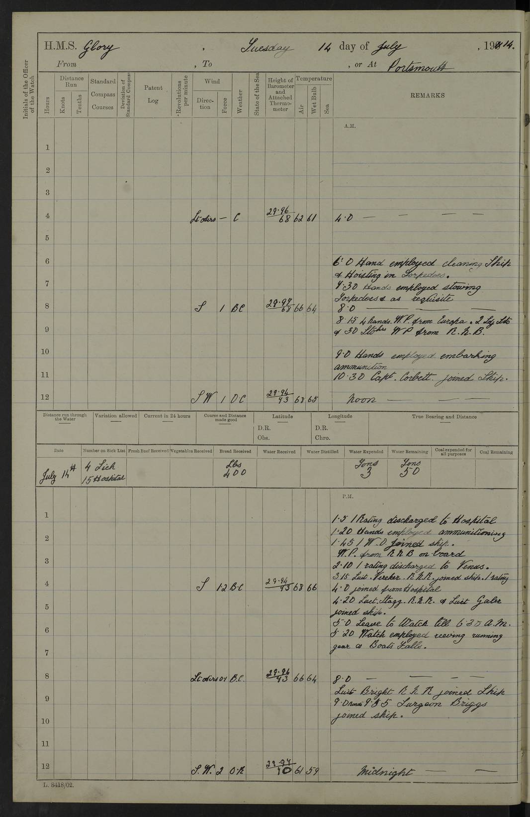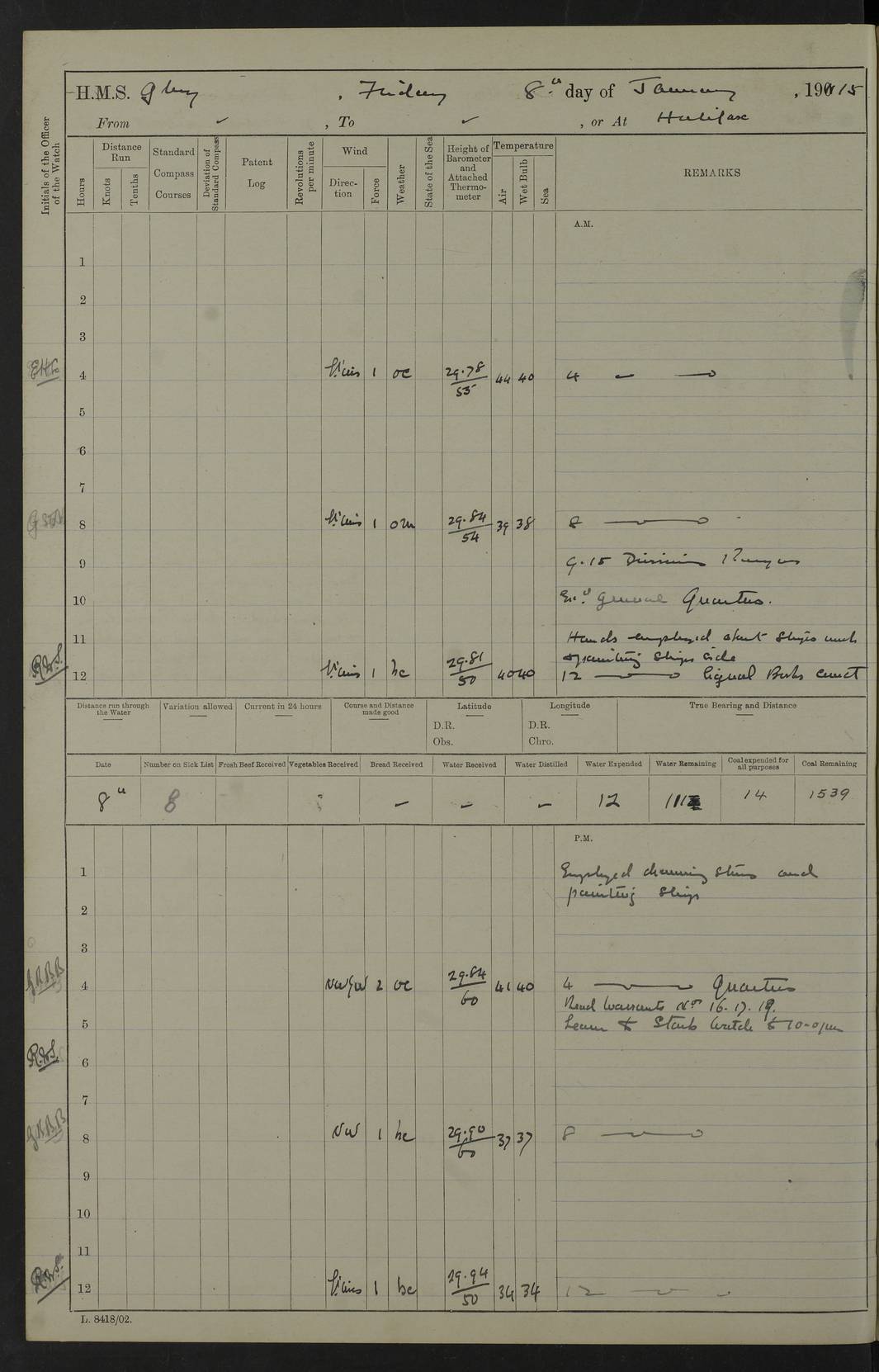 22 June 1915 At sea, Gibraltar to Lemnos Lat 36.1, Long -1.3 4.15am: Sighted land on starboard bow. 10.20am: Stopped port engine for repairs. 11.20am: proceeded with port engine. pm: a/c due to change in deviation. 10.00pm: Cape Tenez Light abeam, 18 miles. 4f73cd61a2fc8ea9030015f6: (https://s3.amazonaws.com:443/oldweather/ADM53-43015/0012_1.jpg) 23 June 1915 At sea, Gibraltar to Lemnos Lat 37.5, Long 4.8 Number on sick list: 4 5.00am: Secured from night defence stations. Placed anti-submarine guns. pm: Life saving appliances served out to men stationed in ? ?at abandon ship. 4f73cd61a2fc8ea9030015f7: (https://s3.amazonaws.com:443/oldweather/ADM53-43015/0013_0.jpg) 24 June 1915 At sea, Gibraltar to Lemnos Lat 37.4, Long 10.8 Position in log clearly bears no resemblance to the location of the ship. Position above is approximate and is based sighting of Zembra Island at 11.55am. 5.00am: Dispersed from night defence stations. Manned anti-submarine guns. am: Sighted two French torpedo boats. am: Torpedo boats passed to ~ No 362, 363. am: Sighted land on starboard beam. 11.55am: Zembra Island abeam, 25 miles. 2.00pm: Sighted Pantellaria S34ºE. 4.45pm: Pantellaria Light House abeam 12 miles. 4f73cd61a2fc8ea9030015f8: (https://s3.amazonaws.com:443/oldweather/ADM53-43015/0013_1.jpg) 25 June 1915 At sea, Gibraltar to Lemnos Lat 35.5, Long 16.7 2.10am: Gozo Light abeam 17 miles. 5.00am: Dispersed from night defence stations. Manned anti-submarine guns. 4f73cd61a2fc8ea9030015f9: (https://s3.amazonaws.com:443/oldweather/ADM53-43015/0014_0.jpg) 26 June 1915 At sea, Gibraltar to Lemnos Lat 35.5, Long 22.6 Number on sick list: 5 5.00am: Dispersed from night defence stations. Manned anti-submarine guns. am: Aired night clothing. am: marines at maxim practice on quarter deck. 2.00pm: Observed land on either bow. 3.00pm: Sighted French patrol destroyer. 4.15pm: Sighted French patrol destroyer. 9.40pm: Milo Peak N63ºW. 10.26pm: Polino Light abeam to port 5.5 miles. 4f73cd62a2fc8ea9030015fa: (https://s3.amazonaws.com:443/oldweather/ADM53-43015/0014_1.jpg) 27 June 1915 At sea and at Lemnos Lat 39.1, Long 24.4 From 0.50 to 3.05am sighting of multiple light houses. 3.50am: a/c to N39ºW and commenced to zig-zag. 5.00am: Dispersed from night defence stations and placed anti-submarine guns and look-outs. am: Lost overboard by accident Hazlewood fender, pat. 311, one in number. 10.30am: Held Divine Service onboard. pm: Met and signalled HMS Minerva on patrol duty. pm: Courses and speeds as requisite while waiting orders to approach Mudros. 3.00pm: Proceeded. 5.16pm: Increased to 90 revs, commenced to zig-zag. Course as requisite for Mudros. 7.00pm: Entered Mudros Bay. 7.47pm: Stopped. Let go port anchor in ‘M3’. 8.30pm: Darkened ship. pm: Manned one 6” and one 12 pdr. 4f73cd62a2fc8ea9030015fb: (https://s3.amazonaws.com:443/oldweather/ADM53-43015/0015_0.jpg) 28 June 1915 Mudros Bay, Lemnos Lat 39.89, Long 25.24 5,00am: HMS Vengeance entered harbour. HMS Vengeance was a pre-dreadnought of the Canopus class, launched in 1899 at Vickers, Barrow, and sold for scrapping in 1921. Details at http://en.wikipedia.org/wiki/HMS_Vengeance_(1899) . am/pm/: hands preparing for coaling and about ship’s work. pm: Collier Wabana secured alongside. 4f73cd62a2fc8ea9030015fc: (https://s3.amazonaws.com:443/oldweather/ADM53-43015/0015_1.jpg) 29 June 1915 Mudros Bay, Lemnos Lat 39.89, Long 25.24 5.15am: Commenced coaling. 2.00pm: Finished coaling. Collier left. 4f73cd62a2fc8ea9030015fd: (https://s3.amazonaws.com:443/oldweather/ADM53-43015/0016_0.jpg) 30 June 1915 Mudros Bay, Lemnos Lat 39.89, Long 25.24 am: Parties away sanding, and with fire engines onshore. am: Boats away disembarking troops. am: French Flagship Patrie sailed. The Patrie was a French pre-dreadnought, launched at La Seyne shipyard in 1903, and stricken in 1921. Details at http://en.wikipedia.org/wiki/French_battleship_Patrie . 6.30pm: Hands to bathe. 4f73cd63a2fc8ea9030015fe: (https://s3.amazonaws.com:443/oldweather/ADM53-43015/0016_1.jpg) 4f73cd63a2fc8ea9030015ff: (https://s3.amazonaws.com:443/oldweather/ADM53-43015/0017_0.jpg) 4f73cd63a2fc8ea903001600: (https://s3.amazonaws.com:443/oldweather/ADM53-43015/0017_1.jpg) 4f73cd63a2fc8ea903001601: (https://s3.amazonaws.com:443/oldweather/ADM53-43015/0018_0.jpg) 4f73cd64a2fc8ea903001602: (https://s3.amazonaws.com:443/oldweather/ADM53-43015/0018_1.jpg) LOGS FOR JULY 1915 From July to October 1915, HMS Glory spent her time at Port Mudros. Certain activities typically took place daily and are not generally noted in the pages below. These activities include: Lighting fires in the picket boat around 4am and drawing the fires in the late evening; Divisions at around 9–9.30am and Evening Quarters at 4pm; Darken ship at around 8.30pm; Daily ‘cleaning ship’, with variations thereof; SBC (for ‘Signal Books Correct’) at the watch changes. 4f73cd64a2fc8ea903001603: (https://s3.amazonaws.com:443/oldweather/ADM53-43016/0000_0.jpg) 4f73cd64a2fc8ea903001604: (https://s3.amazonaws.com:443/oldweather/ADM53-43016/0000_1.jpg) 4f73cd65a2fc8ea903001605: (https://s3.amazonaws.com:443/oldweather/ADM53-43016/0001_0.jpg) 4f73cd65a2fc8ea903001606: (https://s3.amazonaws.com:443/oldweather/ADM53-43016/0001_1.jpg) 1 July 1915 Port Mudros Lat 39.89, Long 25.24 6.30am: Landed working parties preparing boom defence ships. am: Discharged Acting Commander Rayne to Hector. Hector was a kite balloon ship. No further details readily available. 5.00pm: Tug T.10 made fast astern. 7.15pm: HMS Venerable went out. 7.30pm: HMS Chatham went out. HMS Chatham was a ‘Town’ cruiser and lead ship of her class. She was launched in 1911 at Chatham Dockyard and sold in 1926. Details at http://en.wikipedia.org/wiki/HMS_Chatham_(1911) . 4f73cd65a2fc8ea903001607: (https://s3.amazonaws.com:443/oldweather/ADM53-43016/0002_0.jpg) 2 July 1915 Port Mudros Lat 39.89, Long 25.24 5.35am: Landed working parties preparing boom defence ships. am/pm: Boom defence par