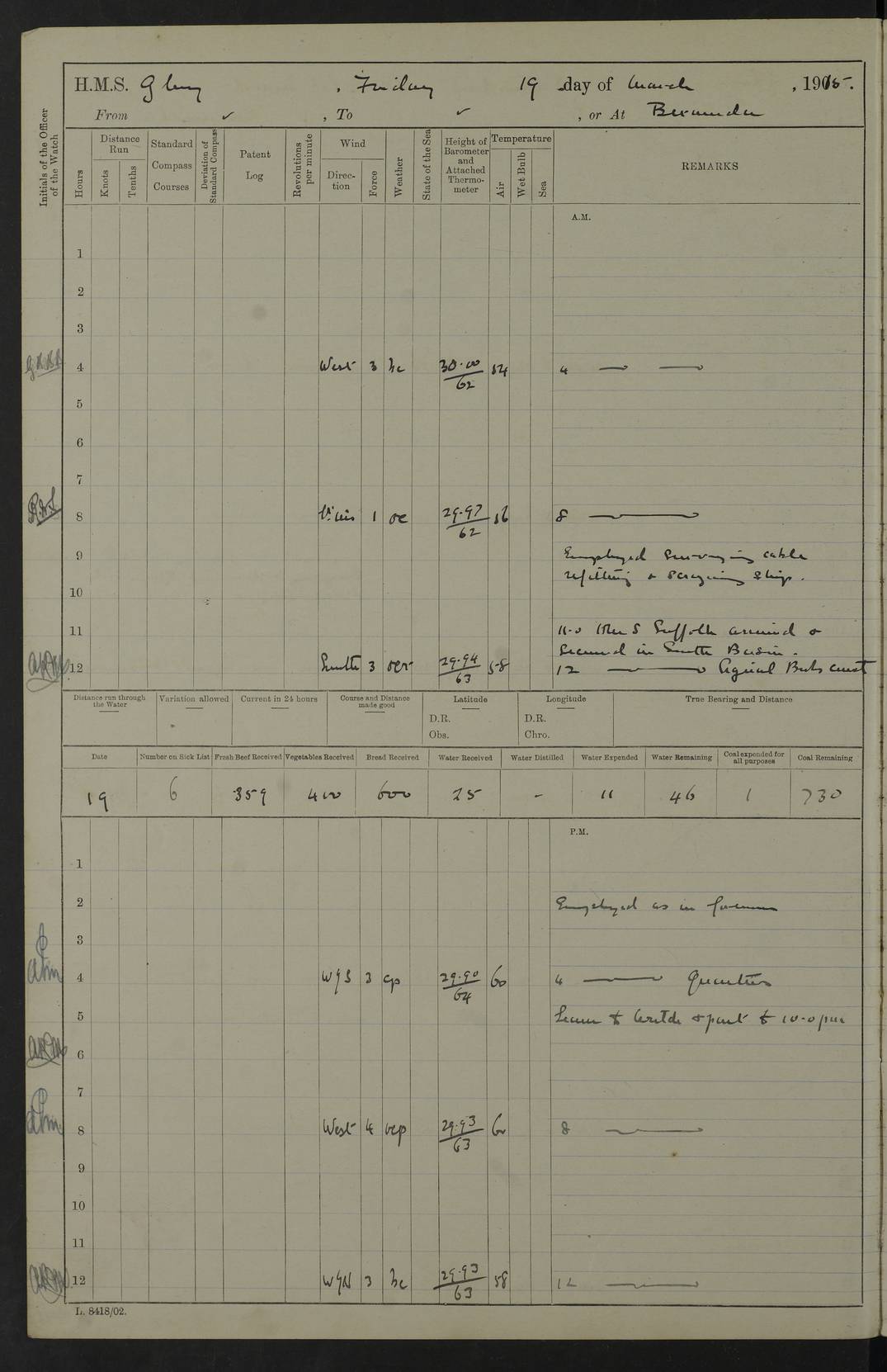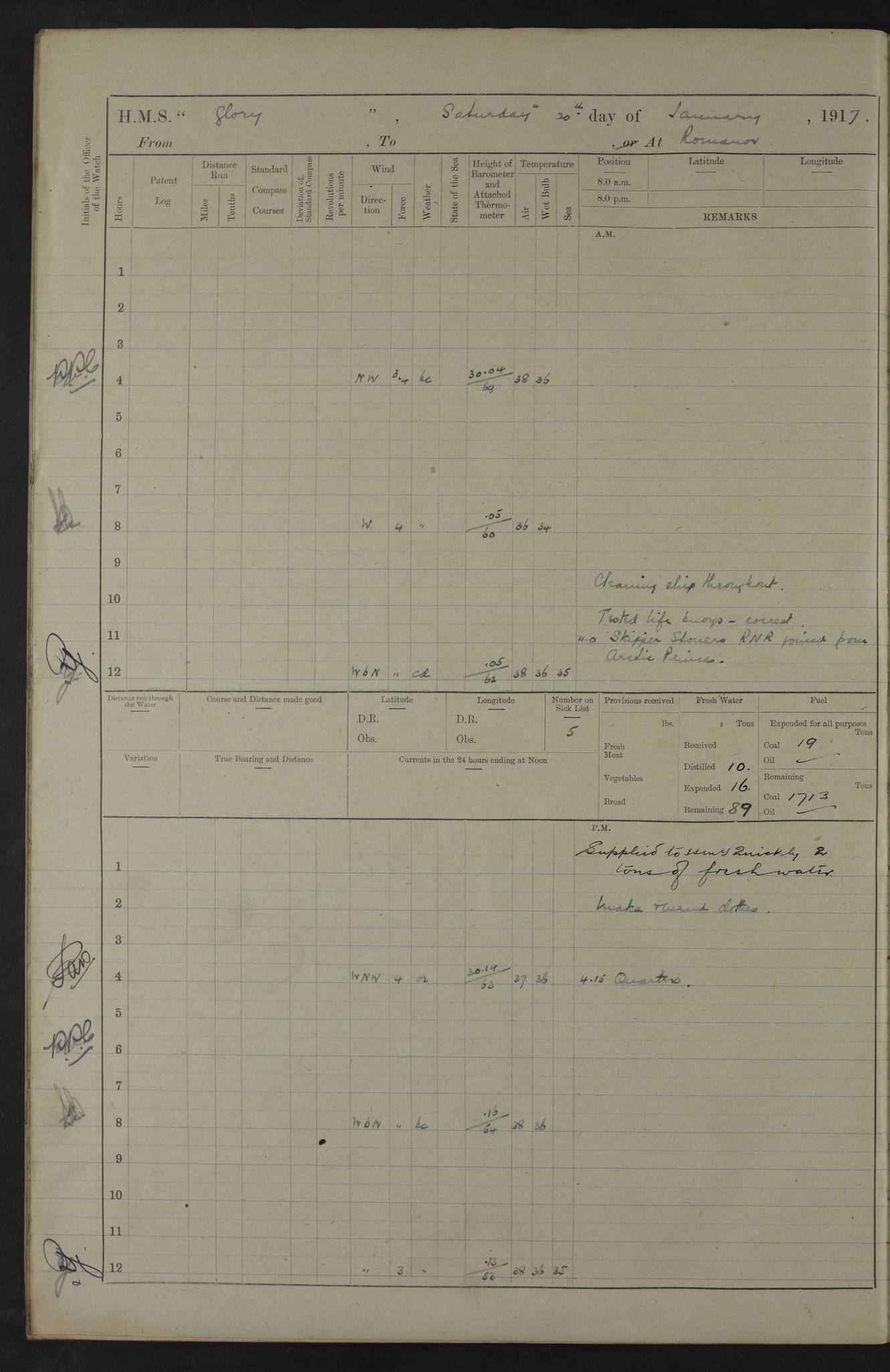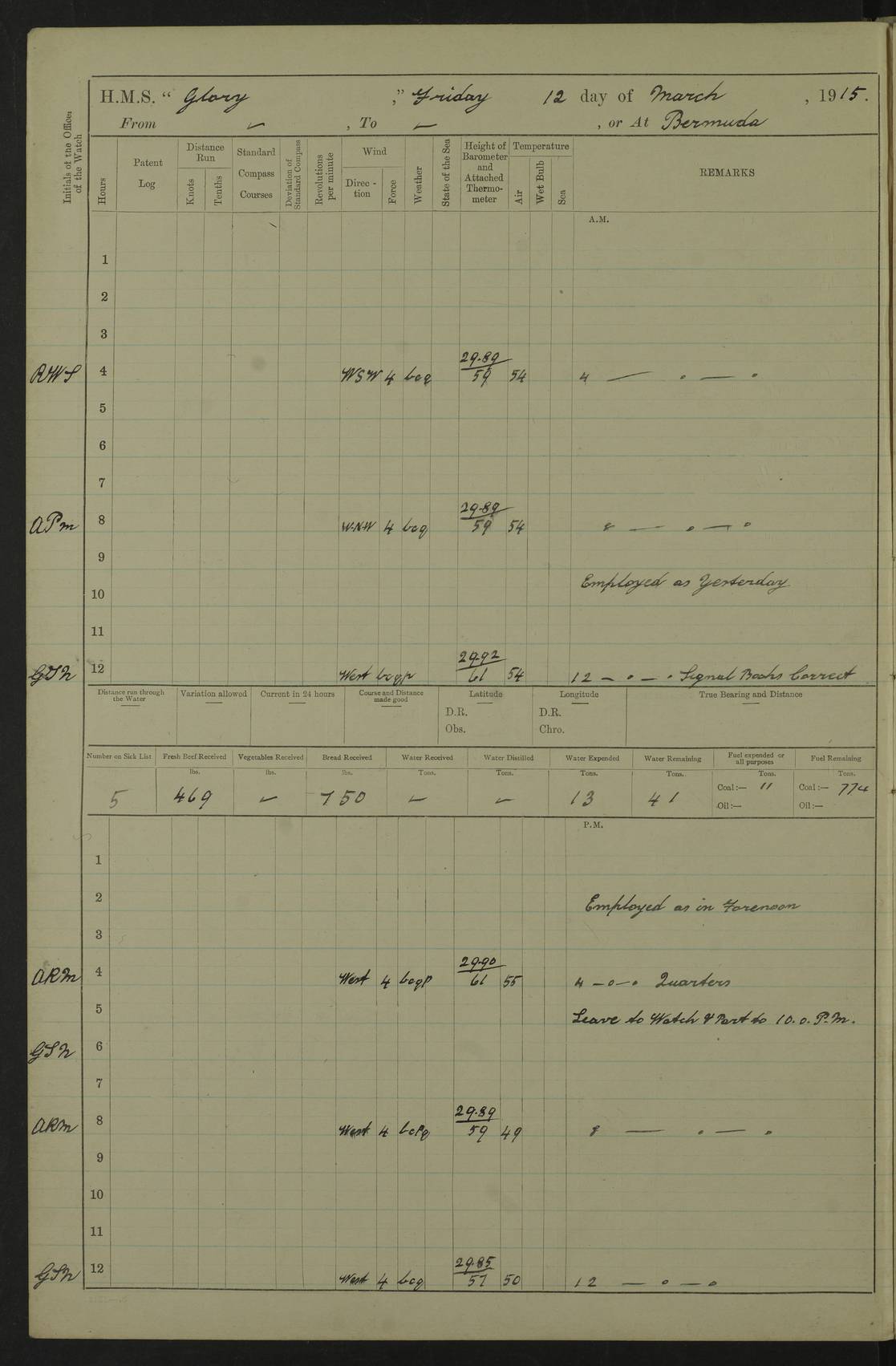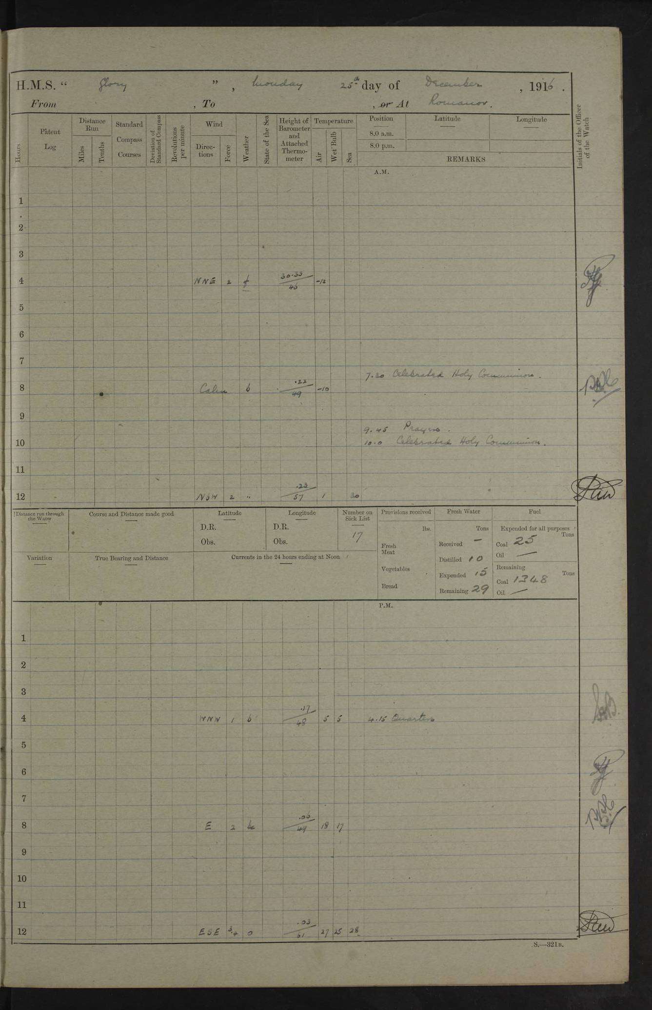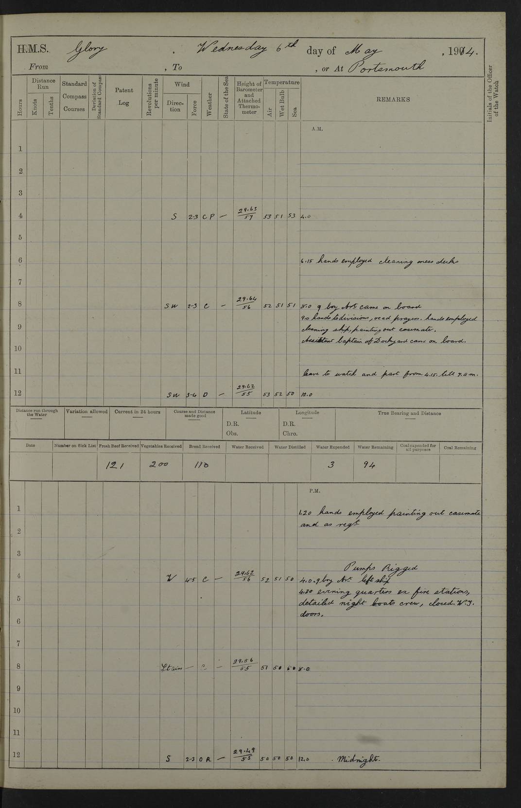 22 June 1915 At sea, Gibraltar to Lemnos Lat 36.1, Long -1.3 4.15am: Sighted land on starboard bow. 10.20am: Stopped port engine for repairs. 11.20am: proceeded with port engine. pm: a/c due to change in deviation. 10.00pm: Cape Tenez Light abeam, 18 miles. 4f73cd61a2fc8ea9030015f6: (https://s3.amazonaws.com:443/oldweather/ADM53-43015/0012_1.jpg) 23 June 1915 At sea, Gibraltar to Lemnos Lat 37.5, Long 4.8 Number on sick list: 4 5.00am: Secured from night defence stations. Placed anti-submarine guns. pm: Life saving appliances served out to men stationed in ? ?at abandon ship. 4f73cd61a2fc8ea9030015f7: (https://s3.amazonaws.com:443/oldweather/ADM53-43015/0013_0.jpg) 24 June 1915 At sea, Gibraltar to Lemnos Lat 37.4, Long 10.8 Position in log clearly bears no resemblance to the location of the ship. Position above is approximate and is based sighting of Zembra Island at 11.55am. 5.00am: Dispersed from night defence stations. Manned anti-submarine guns. am: Sighted two French torpedo boats. am: Torpedo boats passed to ~ No 362, 363. am: Sighted land on starboard beam. 11.55am: Zembra Island abeam, 25 miles. 2.00pm: Sighted Pantellaria S34ºE. 4.45pm: Pantellaria Light House abeam 12 miles. 4f73cd61a2fc8ea9030015f8: (https://s3.amazonaws.com:443/oldweather/ADM53-43015/0013_1.jpg) 25 June 1915 At sea, Gibraltar to Lemnos Lat 35.5, Long 16.7 2.10am: Gozo Light abeam 17 miles. 5.00am: Dispersed from night defence stations. Manned anti-submarine guns. 4f73cd61a2fc8ea9030015f9: (https://s3.amazonaws.com:443/oldweather/ADM53-43015/0014_0.jpg) 26 June 1915 At sea, Gibraltar to Lemnos Lat 35.5, Long 22.6 Number on sick list: 5 5.00am: Dispersed from night defence stations. Manned anti-submarine guns. am: Aired night clothing. am: marines at maxim practice on quarter deck. 2.00pm: Observed land on either bow. 3.00pm: Sighted French patrol destroyer. 4.15pm: Sighted French patrol destroyer. 9.40pm: Milo Peak N63ºW. 10.26pm: Polino Light abeam to port 5.5 miles. 4f73cd62a2fc8ea9030015fa: (https://s3.amazonaws.com:443/oldweather/ADM53-43015/0014_1.jpg) 27 June 1915 At sea and at Lemnos Lat 39.1, Long 24.4 From 0.50 to 3.05am sighting of multiple light houses. 3.50am: a/c to N39ºW and commenced to zig-zag. 5.00am: Dispersed from night defence stations and placed anti-submarine guns and look-outs. am: Lost overboard by accident Hazlewood fender, pat. 311, one in number. 10.30am: Held Divine Service onboard. pm: Met and signalled HMS Minerva on patrol duty. pm: Courses and speeds as requisite while waiting orders to approach Mudros. 3.00pm: Proceeded. 5.16pm: Increased to 90 revs, commenced to zig-zag. Course as requisite for Mudros. 7.00pm: Entered Mudros Bay. 7.47pm: Stopped. Let go port anchor in ‘M3’. 8.30pm: Darkened ship. pm: Manned one 6” and one 12 pdr. 4f73cd62a2fc8ea9030015fb: (https://s3.amazonaws.com:443/oldweather/ADM53-43015/0015_0.jpg) 28 June 1915 Mudros Bay, Lemnos Lat 39.89, Long 25.24 5,00am: HMS Vengeance entered harbour. HMS Vengeance was a pre-dreadnought of the Canopus class, launched in 1899 at Vickers, Barrow, and sold for scrapping in 1921. Details at http://en.wikipedia.org/wiki/HMS_Vengeance_(1899) . am/pm/: hands preparing for coaling and about ship’s work. pm: Collier Wabana secured alongside. 4f73cd62a2fc8ea9030015fc: (https://s3.amazonaws.com:443/oldweather/ADM53-43015/0015_1.jpg) 29 June 1915 Mudros Bay, Lemnos Lat 39.89, Long 25.24 5.15am: Commenced coaling. 2.00pm: Finished coaling. Collier left. 4f73cd62a2fc8ea9030015fd: (https://s3.amazonaws.com:443/oldweather/ADM53-43015/0016_0.jpg) 30 June 1915 Mudros Bay, Lemnos Lat 39.89, Long 25.24 am: Parties away sanding, and with fire engines onshore. am: Boats away disembarking troops. am: French Flagship Patrie sailed. The Patrie was a French pre-dreadnought, launched at La Seyne shipyard in 1903, and stricken in 1921. Details at http://en.wikipedia.org/wiki/French_battleship_Patrie . 6.30pm: Hands to bathe. 4f73cd63a2fc8ea9030015fe: (https://s3.amazonaws.com:443/oldweather/ADM53-43015/0016_1.jpg) 4f73cd63a2fc8ea9030015ff: (https://s3.amazonaws.com:443/oldweather/ADM53-43015/0017_0.jpg) 4f73cd63a2fc8ea903001600: (https://s3.amazonaws.com:443/oldweather/ADM53-43015/0017_1.jpg) 4f73cd63a2fc8ea903001601: (https://s3.amazonaws.com:443/oldweather/ADM53-43015/0018_0.jpg) 4f73cd64a2fc8ea903001602: (https://s3.amazonaws.com:443/oldweather/ADM53-43015/0018_1.jpg) LOGS FOR JULY 1915 From July to October 1915, HMS Glory spent her time at Port Mudros. Certain activities typically took place daily and are not generally noted in the pages below. These activities include: Lighting fires in the picket boat around 4am and drawing the fires in the late evening; Divisions at around 9–9.30am and Evening Quarters at 4pm; Darken ship at around 8.30pm; Daily ‘cleaning ship’, with variations thereof; SBC (for ‘Signal Books Correct’) at the watch changes. 4f73cd64a2fc8ea903001603: (https://s3.amazonaws.com:443/oldweather/ADM53-43016/0000_0.jpg) 4f73cd64a2fc8ea903001604: (https://s3.amazonaws.com:443/oldweather/ADM53-43016/0000_1.jpg) 4f73cd65a2fc8ea903001605: (https://s3.amazonaws.com:443/oldweather/ADM53-43016/0001_0.jpg) 4f73cd65a2fc8ea903001606: (https://s3.amazonaws.com:443/oldweather/ADM53-43016/0001_1.jpg) 1 July 1915 Port Mudros Lat 39.89, Long 25.24 6.30am: Landed working parties preparing boom defence ships. am: Discharged Acting Commander Rayne to Hector. Hector was a kite balloon ship. No further details readily available. 5.00pm: Tug T.10 made fast astern. 7.15pm: HMS Venerable went out. 7.30pm: HMS Chatham went out. HMS Chatham was a ‘Town’ cruiser and lead ship of her class. She was launched in 1911 at Chatham Dockyard and sold in 1926. Details at http://en.wikipedia.org/wiki/HMS_Chatham_(1911) . 4f73cd65a2fc8ea903001607: (https://s3.amazonaws.com:443/oldweather/ADM53-43016/0002_0.jpg) 2 July 1915 Port Mudros Lat 39.89, Long 25.24 5.35am: Landed working parties preparing boom defence ships. am/pm: Boom defence par
