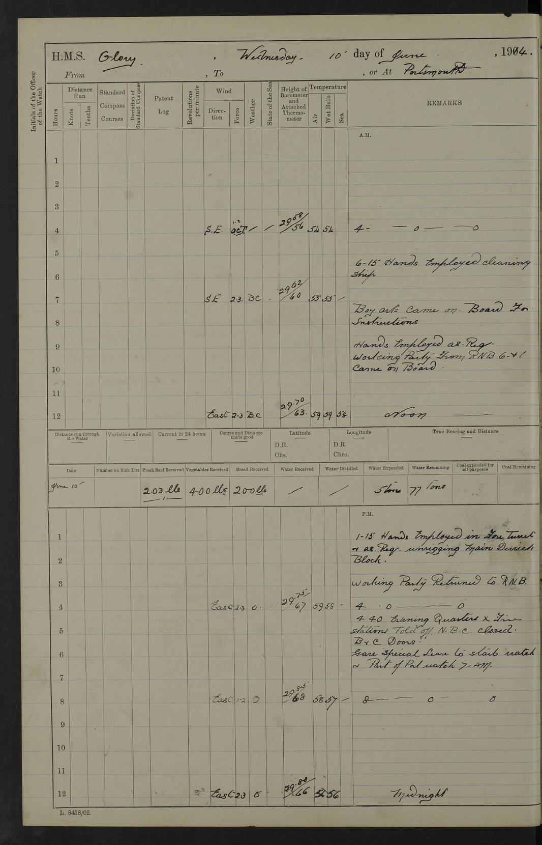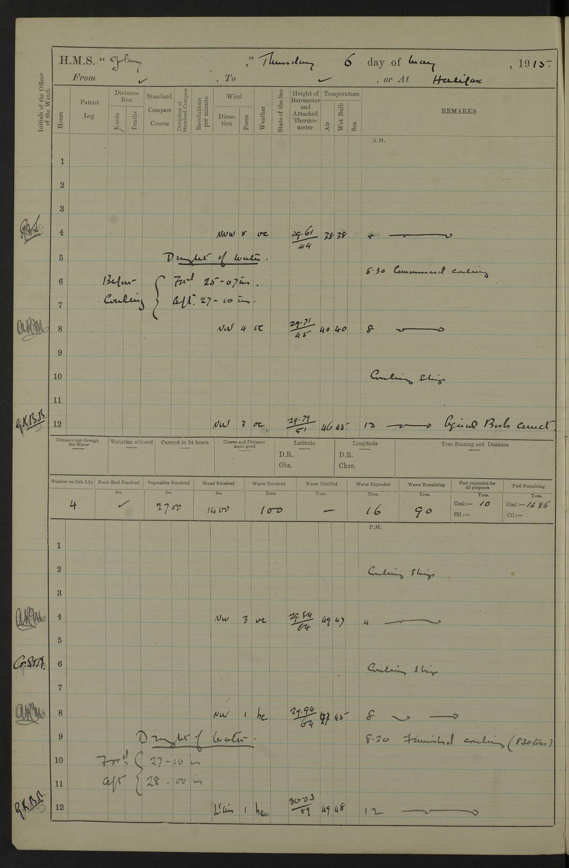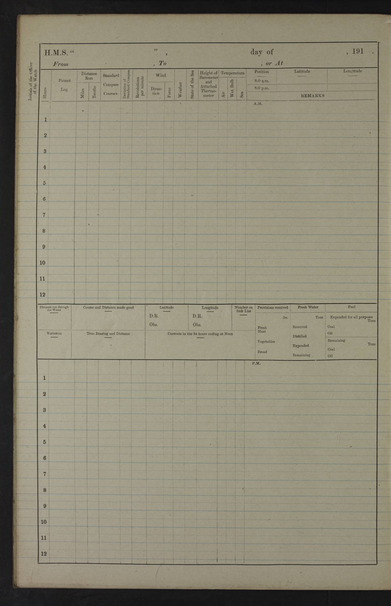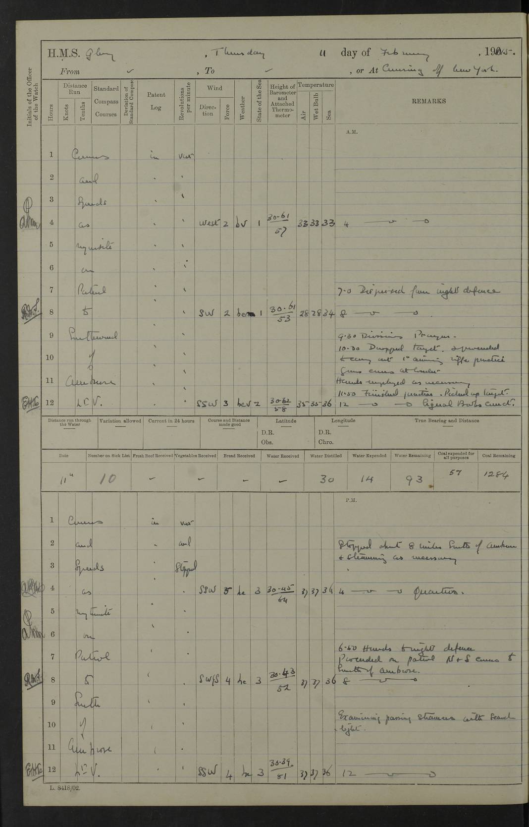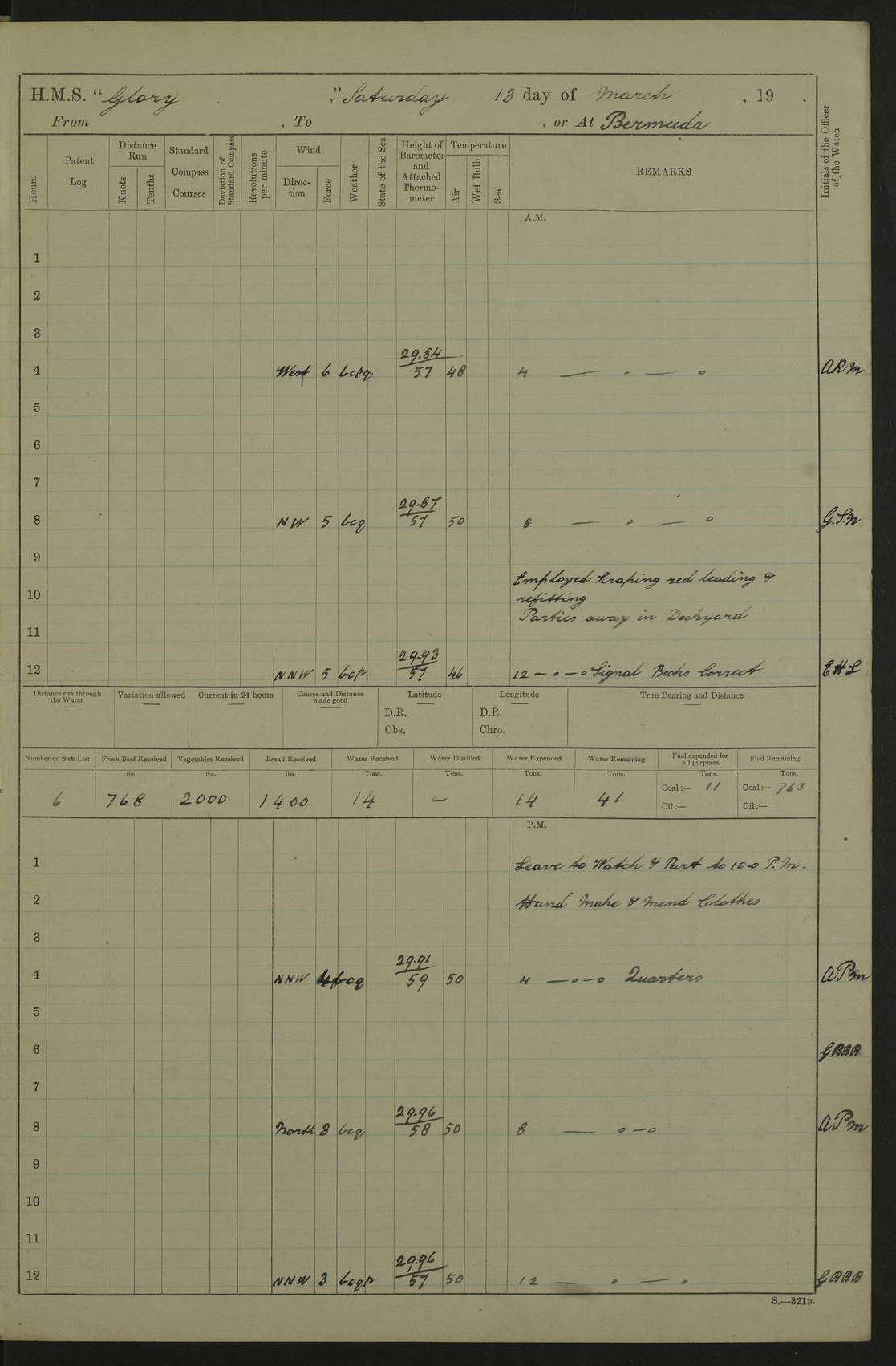 22 June 1915 At sea, Gibraltar to Lemnos Lat 36.1, Long -1.3 4.15am: Sighted land on starboard bow. 10.20am: Stopped port engine for repairs. 11.20am: proceeded with port engine. pm: a/c due to change in deviation. 10.00pm: Cape Tenez Light abeam, 18 miles. 4f73cd61a2fc8ea9030015f6: (https://s3.amazonaws.com:443/oldweather/ADM53-43015/0012_1.jpg) 23 June 1915 At sea, Gibraltar to Lemnos Lat 37.5, Long 4.8 Number on sick list: 4 5.00am: Secured from night defence stations. Placed anti-submarine guns. pm: Life saving appliances served out to men stationed in ? ?at abandon ship. 4f73cd61a2fc8ea9030015f7: (https://s3.amazonaws.com:443/oldweather/ADM53-43015/0013_0.jpg) 24 June 1915 At sea, Gibraltar to Lemnos Lat 37.4, Long 10.8 Position in log clearly bears no resemblance to the location of the ship. Position above is approximate and is based sighting of Zembra Island at 11.55am. 5.00am: Dispersed from night defence stations. Manned anti-submarine guns. am: Sighted two French torpedo boats. am: Torpedo boats passed to ~ No 362, 363. am: Sighted land on starboard beam. 11.55am: Zembra Island abeam, 25 miles. 2.00pm: Sighted Pantellaria S34ºE. 4.45pm: Pantellaria Light House abeam 12 miles. 4f73cd61a2fc8ea9030015f8: (https://s3.amazonaws.com:443/oldweather/ADM53-43015/0013_1.jpg) 25 June 1915 At sea, Gibraltar to Lemnos Lat 35.5, Long 16.7 2.10am: Gozo Light abeam 17 miles. 5.00am: Dispersed from night defence stations. Manned anti-submarine guns. 4f73cd61a2fc8ea9030015f9: (https://s3.amazonaws.com:443/oldweather/ADM53-43015/0014_0.jpg) 26 June 1915 At sea, Gibraltar to Lemnos Lat 35.5, Long 22.6 Number on sick list: 5 5.00am: Dispersed from night defence stations. Manned anti-submarine guns. am: Aired night clothing. am: marines at maxim practice on quarter deck. 2.00pm: Observed land on either bow. 3.00pm: Sighted French patrol destroyer. 4.15pm: Sighted French patrol destroyer. 9.40pm: Milo Peak N63ºW. 10.26pm: Polino Light abeam to port 5.5 miles. 4f73cd62a2fc8ea9030015fa: (https://s3.amazonaws.com:443/oldweather/ADM53-43015/0014_1.jpg) 27 June 1915 At sea and at Lemnos Lat 39.1, Long 24.4 From 0.50 to 3.05am sighting of multiple light houses. 3.50am: a/c to N39ºW and commenced to zig-zag. 5.00am: Dispersed from night defence stations and placed anti-submarine guns and look-outs. am: Lost overboard by accident Hazlewood fender, pat. 311, one in number. 10.30am: Held Divine Service onboard. pm: Met and signalled HMS Minerva on patrol duty. pm: Courses and speeds as requisite while waiting orders to approach Mudros. 3.00pm: Proceeded. 5.16pm: Increased to 90 revs, commenced to zig-zag. Course as requisite for Mudros. 7.00pm: Entered Mudros Bay. 7.47pm: Stopped. Let go port anchor in ‘M3’. 8.30pm: Darkened ship. pm: Manned one 6” and one 12 pdr. 4f73cd62a2fc8ea9030015fb: (https://s3.amazonaws.com:443/oldweather/ADM53-43015/0015_0.jpg) 28 June 1915 Mudros Bay, Lemnos Lat 39.89, Long 25.24 5,00am: HMS Vengeance entered harbour. HMS Vengeance was a pre-dreadnought of the Canopus class, launched in 1899 at Vickers, Barrow, and sold for scrapping in 1921. Details at http://en.wikipedia.org/wiki/HMS_Vengeance_(1899) . am/pm/: hands preparing for coaling and about ship’s work. pm: Collier Wabana secured alongside. 4f73cd62a2fc8ea9030015fc: (https://s3.amazonaws.com:443/oldweather/ADM53-43015/0015_1.jpg) 29 June 1915 Mudros Bay, Lemnos Lat 39.89, Long 25.24 5.15am: Commenced coaling. 2.00pm: Finished coaling. Collier left. 4f73cd62a2fc8ea9030015fd: (https://s3.amazonaws.com:443/oldweather/ADM53-43015/0016_0.jpg) 30 June 1915 Mudros Bay, Lemnos Lat 39.89, Long 25.24 am: Parties away sanding, and with fire engines onshore. am: Boats away disembarking troops. am: French Flagship Patrie sailed. The Patrie was a French pre-dreadnought, launched at La Seyne shipyard in 1903, and stricken in 1921. Details at http://en.wikipedia.org/wiki/French_battleship_Patrie . 6.30pm: Hands to bathe. 4f73cd63a2fc8ea9030015fe: (https://s3.amazonaws.com:443/oldweather/ADM53-43015/0016_1.jpg) 4f73cd63a2fc8ea9030015ff: (https://s3.amazonaws.com:443/oldweather/ADM53-43015/0017_0.jpg) 4f73cd63a2fc8ea903001600: (https://s3.amazonaws.com:443/oldweather/ADM53-43015/0017_1.jpg) 4f73cd63a2fc8ea903001601: (https://s3.amazonaws.com:443/oldweather/ADM53-43015/0018_0.jpg) 4f73cd64a2fc8ea903001602: (https://s3.amazonaws.com:443/oldweather/ADM53-43015/0018_1.jpg) LOGS FOR JULY 1915 From July to October 1915, HMS Glory spent her time at Port Mudros. Certain activities typically took place daily and are not generally noted in the pages below. These activities include: Lighting fires in the picket boat around 4am and drawing the fires in the late evening; Divisions at around 9–9.30am and Evening Quarters at 4pm; Darken ship at around 8.30pm; Daily ‘cleaning ship’, with variations thereof; SBC (for ‘Signal Books Correct’) at the watch changes. 4f73cd64a2fc8ea903001603: (https://s3.amazonaws.com:443/oldweather/ADM53-43016/0000_0.jpg) 4f73cd64a2fc8ea903001604: (https://s3.amazonaws.com:443/oldweather/ADM53-43016/0000_1.jpg) 4f73cd65a2fc8ea903001605: (https://s3.amazonaws.com:443/oldweather/ADM53-43016/0001_0.jpg) 4f73cd65a2fc8ea903001606: (https://s3.amazonaws.com:443/oldweather/ADM53-43016/0001_1.jpg) 1 July 1915 Port Mudros Lat 39.89, Long 25.24 6.30am: Landed working parties preparing boom defence ships. am: Discharged Acting Commander Rayne to Hector. Hector was a kite balloon ship. No further details readily available. 5.00pm: Tug T.10 made fast astern. 7.15pm: HMS Venerable went out. 7.30pm: HMS Chatham went out. HMS Chatham was a ‘Town’ cruiser and lead ship of her class. She was launched in 1911 at Chatham Dockyard and sold in 1926. Details at http://en.wikipedia.org/wiki/HMS_Chatham_(1911) . 4f73cd65a2fc8ea903001607: (https://s3.amazonaws.com:443/oldweather/ADM53-43016/0002_0.jpg) 2 July 1915 Port Mudros Lat 39.89, Long 25.24 5.35am: Landed working parties preparing boom defence ships. am/pm: Boom defence par