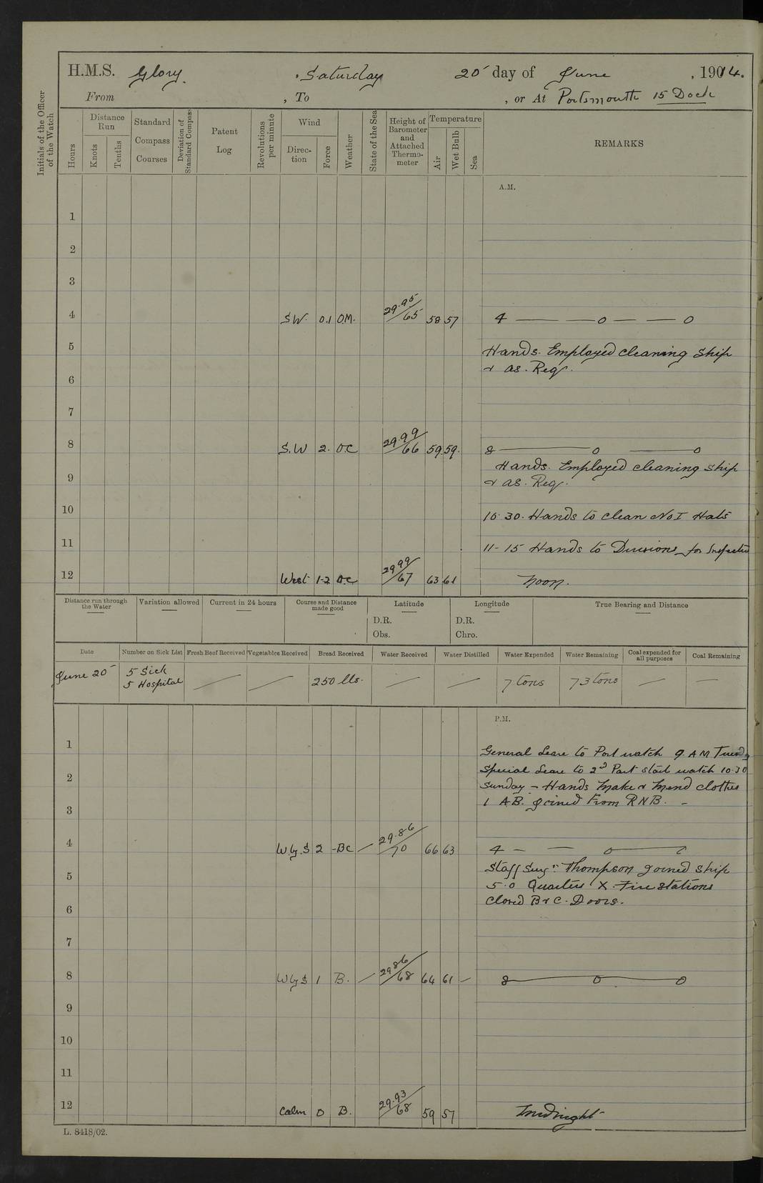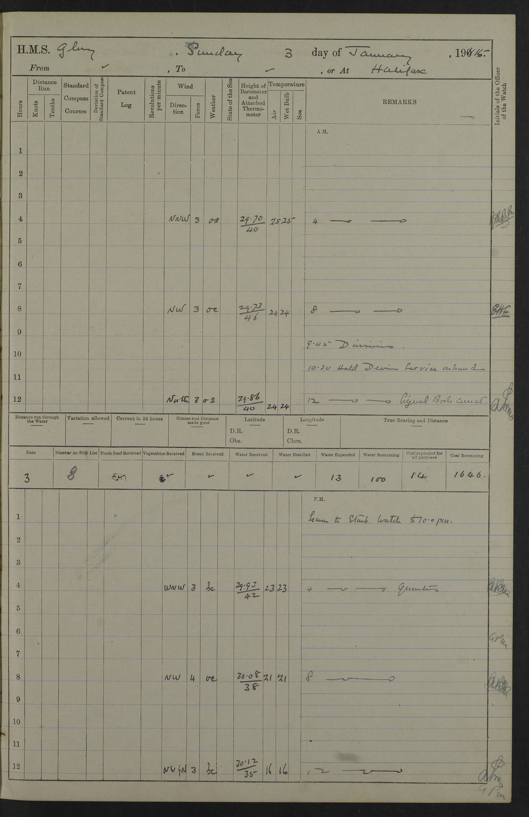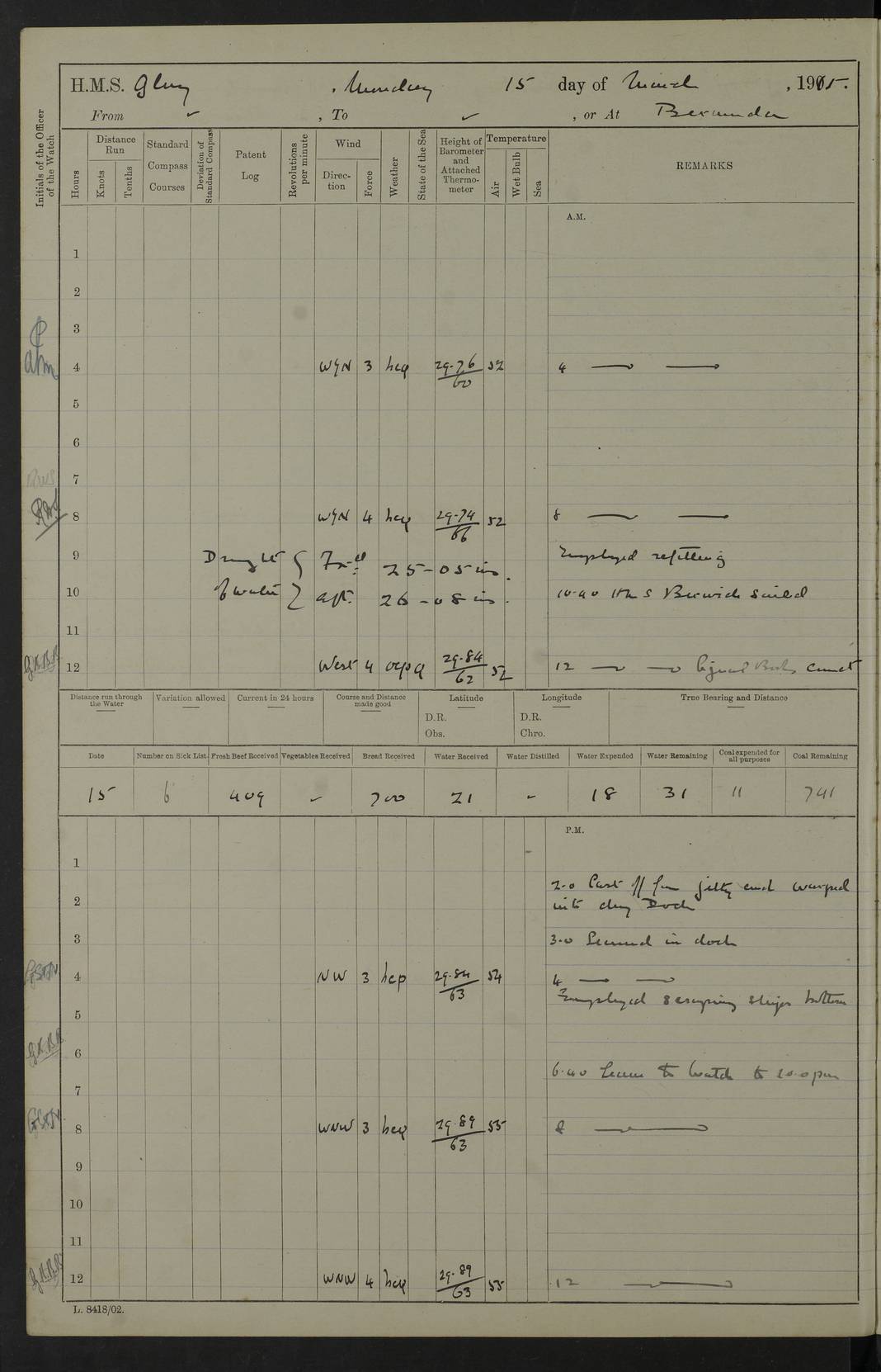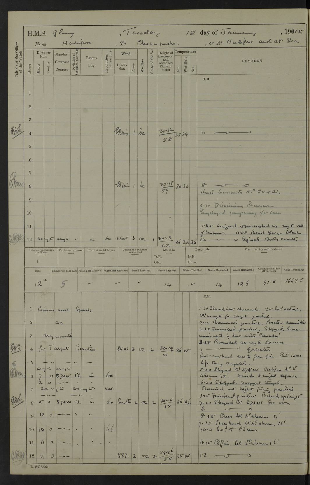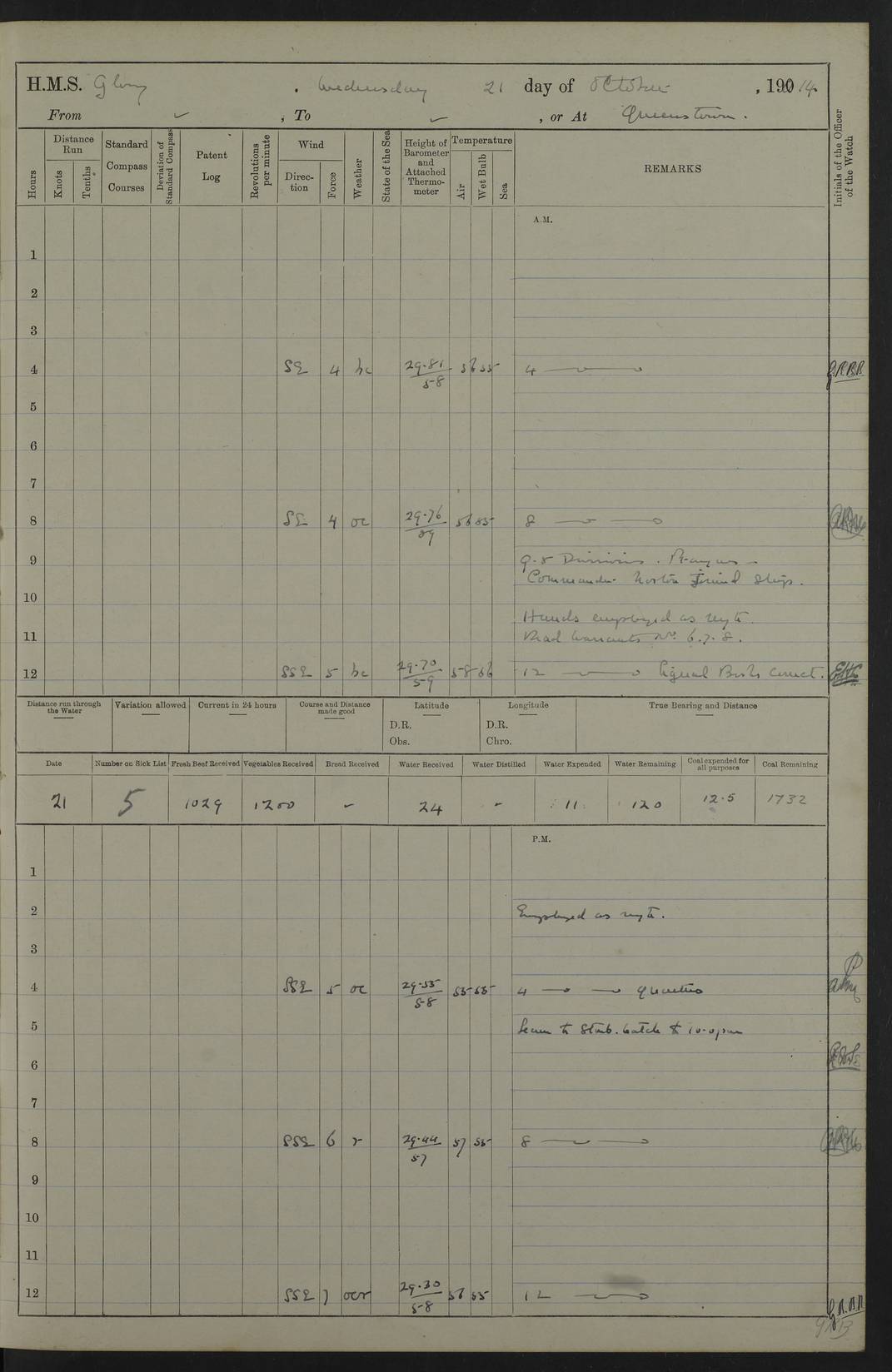 22 June 1915 At sea, Gibraltar to Lemnos Lat 36.1, Long -1.3 4.15am: Sighted land on starboard bow. 10.20am: Stopped port engine for repairs. 11.20am: proceeded with port engine. pm: a/c due to change in deviation. 10.00pm: Cape Tenez Light abeam, 18 miles. 4f73cd61a2fc8ea9030015f6: (https://s3.amazonaws.com:443/oldweather/ADM53-43015/0012_1.jpg) 23 June 1915 At sea, Gibraltar to Lemnos Lat 37.5, Long 4.8 Number on sick list: 4 5.00am: Secured from night defence stations. Placed anti-submarine guns. pm: Life saving appliances served out to men stationed in ? ?at abandon ship. 4f73cd61a2fc8ea9030015f7: (https://s3.amazonaws.com:443/oldweather/ADM53-43015/0013_0.jpg) 24 June 1915 At sea, Gibraltar to Lemnos Lat 37.4, Long 10.8 Position in log clearly bears no resemblance to the location of the ship. Position above is approximate and is based sighting of Zembra Island at 11.55am. 5.00am: Dispersed from night defence stations. Manned anti-submarine guns. am: Sighted two French torpedo boats. am: Torpedo boats passed to ~ No 362, 363. am: Sighted land on starboard beam. 11.55am: Zembra Island abeam, 25 miles. 2.00pm: Sighted Pantellaria S34ºE. 4.45pm: Pantellaria Light House abeam 12 miles. 4f73cd61a2fc8ea9030015f8: (https://s3.amazonaws.com:443/oldweather/ADM53-43015/0013_1.jpg) 25 June 1915 At sea, Gibraltar to Lemnos Lat 35.5, Long 16.7 2.10am: Gozo Light abeam 17 miles. 5.00am: Dispersed from night defence stations. Manned anti-submarine guns. 4f73cd61a2fc8ea9030015f9: (https://s3.amazonaws.com:443/oldweather/ADM53-43015/0014_0.jpg) 26 June 1915 At sea, Gibraltar to Lemnos Lat 35.5, Long 22.6 Number on sick list: 5 5.00am: Dispersed from night defence stations. Manned anti-submarine guns. am: Aired night clothing. am: marines at maxim practice on quarter deck. 2.00pm: Observed land on either bow. 3.00pm: Sighted French patrol destroyer. 4.15pm: Sighted French patrol destroyer. 9.40pm: Milo Peak N63ºW. 10.26pm: Polino Light abeam to port 5.5 miles. 4f73cd62a2fc8ea9030015fa: (https://s3.amazonaws.com:443/oldweather/ADM53-43015/0014_1.jpg) 27 June 1915 At sea and at Lemnos Lat 39.1, Long 24.4 From 0.50 to 3.05am sighting of multiple light houses. 3.50am: a/c to N39ºW and commenced to zig-zag. 5.00am: Dispersed from night defence stations and placed anti-submarine guns and look-outs. am: Lost overboard by accident Hazlewood fender, pat. 311, one in number. 10.30am: Held Divine Service onboard. pm: Met and signalled HMS Minerva on patrol duty. pm: Courses and speeds as requisite while waiting orders to approach Mudros. 3.00pm: Proceeded. 5.16pm: Increased to 90 revs, commenced to zig-zag. Course as requisite for Mudros. 7.00pm: Entered Mudros Bay. 7.47pm: Stopped. Let go port anchor in ‘M3’. 8.30pm: Darkened ship. pm: Manned one 6” and one 12 pdr. 4f73cd62a2fc8ea9030015fb: (https://s3.amazonaws.com:443/oldweather/ADM53-43015/0015_0.jpg) 28 June 1915 Mudros Bay, Lemnos Lat 39.89, Long 25.24 5,00am: HMS Vengeance entered harbour. HMS Vengeance was a pre-dreadnought of the Canopus class, launched in 1899 at Vickers, Barrow, and sold for scrapping in 1921. Details at http://en.wikipedia.org/wiki/HMS_Vengeance_(1899) . am/pm/: hands preparing for coaling and about ship’s work. pm: Collier Wabana secured alongside. 4f73cd62a2fc8ea9030015fc: (https://s3.amazonaws.com:443/oldweather/ADM53-43015/0015_1.jpg) 29 June 1915 Mudros Bay, Lemnos Lat 39.89, Long 25.24 5.15am: Commenced coaling. 2.00pm: Finished coaling. Collier left. 4f73cd62a2fc8ea9030015fd: (https://s3.amazonaws.com:443/oldweather/ADM53-43015/0016_0.jpg) 30 June 1915 Mudros Bay, Lemnos Lat 39.89, Long 25.24 am: Parties away sanding, and with fire engines onshore. am: Boats away disembarking troops. am: French Flagship Patrie sailed. The Patrie was a French pre-dreadnought, launched at La Seyne shipyard in 1903, and stricken in 1921. Details at http://en.wikipedia.org/wiki/French_battleship_Patrie . 6.30pm: Hands to bathe. 4f73cd63a2fc8ea9030015fe: (https://s3.amazonaws.com:443/oldweather/ADM53-43015/0016_1.jpg) 4f73cd63a2fc8ea9030015ff: (https://s3.amazonaws.com:443/oldweather/ADM53-43015/0017_0.jpg) 4f73cd63a2fc8ea903001600: (https://s3.amazonaws.com:443/oldweather/ADM53-43015/0017_1.jpg) 4f73cd63a2fc8ea903001601: (https://s3.amazonaws.com:443/oldweather/ADM53-43015/0018_0.jpg) 4f73cd64a2fc8ea903001602: (https://s3.amazonaws.com:443/oldweather/ADM53-43015/0018_1.jpg) LOGS FOR JULY 1915 From July to October 1915, HMS Glory spent her time at Port Mudros. Certain activities typically took place daily and are not generally noted in the pages below. These activities include: Lighting fires in the picket boat around 4am and drawing the fires in the late evening; Divisions at around 9–9.30am and Evening Quarters at 4pm; Darken ship at around 8.30pm; Daily ‘cleaning ship’, with variations thereof; SBC (for ‘Signal Books Correct’) at the watch changes. 4f73cd64a2fc8ea903001603: (https://s3.amazonaws.com:443/oldweather/ADM53-43016/0000_0.jpg) 4f73cd64a2fc8ea903001604: (https://s3.amazonaws.com:443/oldweather/ADM53-43016/0000_1.jpg) 4f73cd65a2fc8ea903001605: (https://s3.amazonaws.com:443/oldweather/ADM53-43016/0001_0.jpg) 4f73cd65a2fc8ea903001606: (https://s3.amazonaws.com:443/oldweather/ADM53-43016/0001_1.jpg) 1 July 1915 Port Mudros Lat 39.89, Long 25.24 6.30am: Landed working parties preparing boom defence ships. am: Discharged Acting Commander Rayne to Hector. Hector was a kite balloon ship. No further details readily available. 5.00pm: Tug T.10 made fast astern. 7.15pm: HMS Venerable went out. 7.30pm: HMS Chatham went out. HMS Chatham was a ‘Town’ cruiser and lead ship of her class. She was launched in 1911 at Chatham Dockyard and sold in 1926. Details at http://en.wikipedia.org/wiki/HMS_Chatham_(1911) . 4f73cd65a2fc8ea903001607: (https://s3.amazonaws.com:443/oldweather/ADM53-43016/0002_0.jpg) 2 July 1915 Port Mudros Lat 39.89, Long 25.24 5.35am: Landed working parties preparing boom defence ships. am/pm: Boom defence par