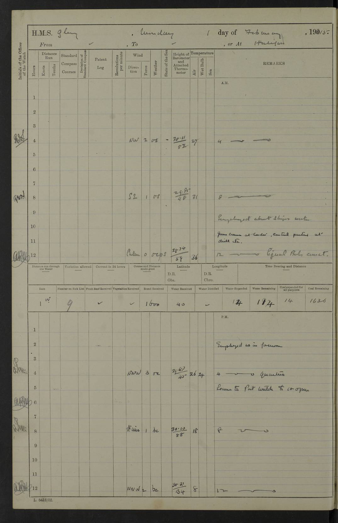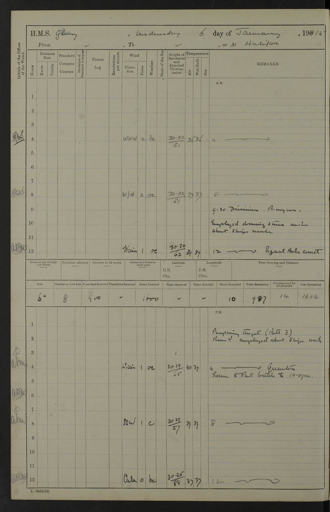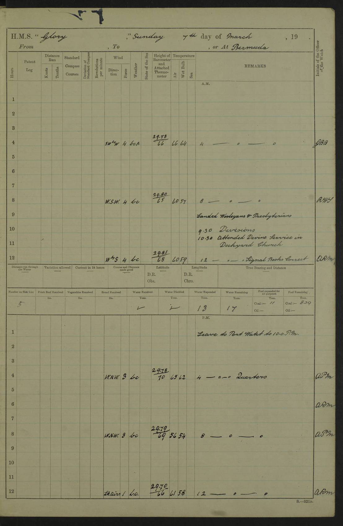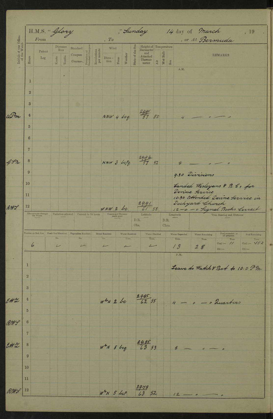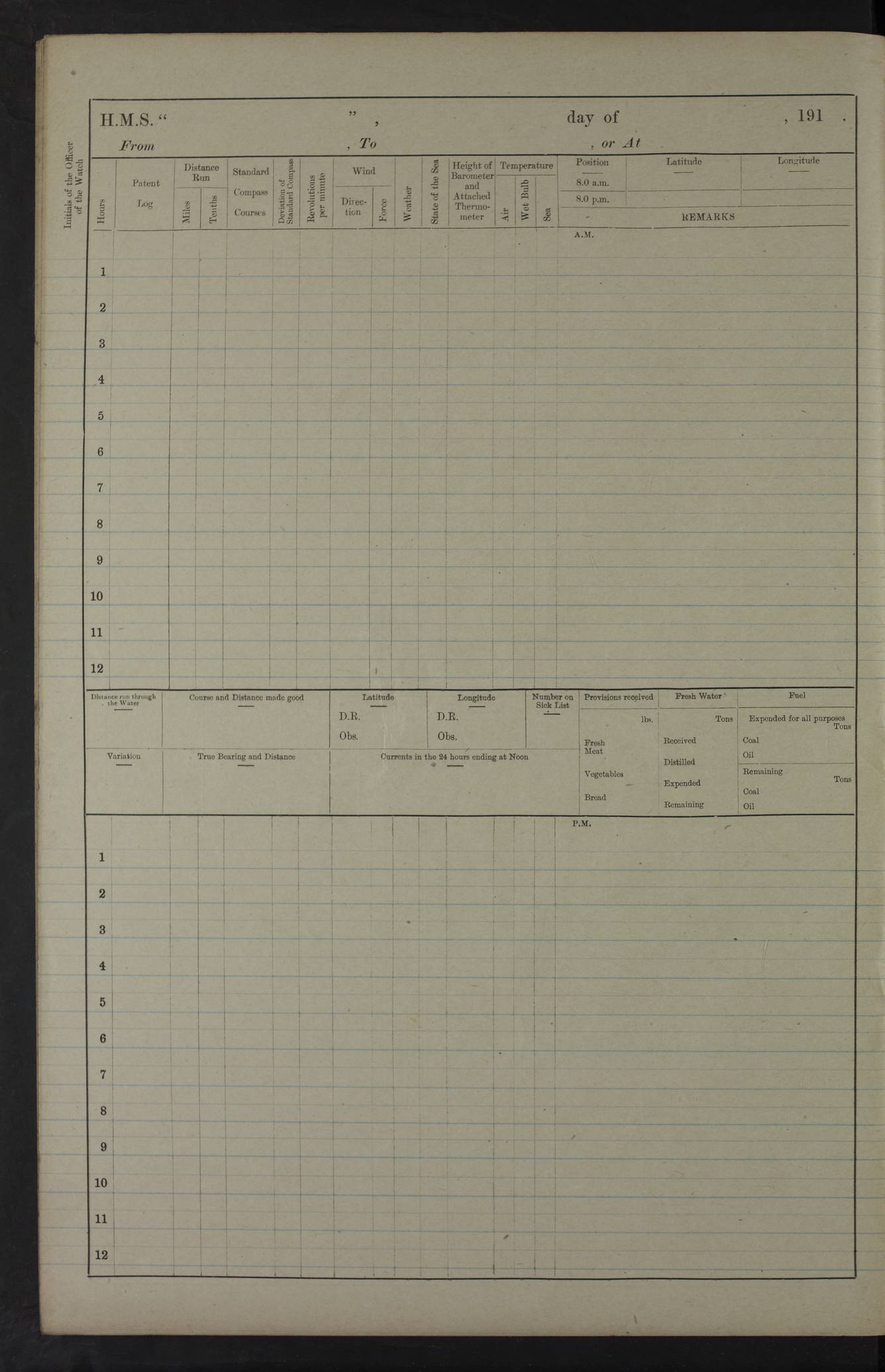 22 June 1915 At sea, Gibraltar to Lemnos Lat 36.1, Long -1.3 4.15am: Sighted land on starboard bow. 10.20am: Stopped port engine for repairs. 11.20am: proceeded with port engine. pm: a/c due to change in deviation. 10.00pm: Cape Tenez Light abeam, 18 miles. 4f73cd61a2fc8ea9030015f6: (https://s3.amazonaws.com:443/oldweather/ADM53-43015/0012_1.jpg) 23 June 1915 At sea, Gibraltar to Lemnos Lat 37.5, Long 4.8 Number on sick list: 4 5.00am: Secured from night defence stations. Placed anti-submarine guns. pm: Life saving appliances served out to men stationed in ? ?at abandon ship. 4f73cd61a2fc8ea9030015f7: (https://s3.amazonaws.com:443/oldweather/ADM53-43015/0013_0.jpg) 24 June 1915 At sea, Gibraltar to Lemnos Lat 37.4, Long 10.8 Position in log clearly bears no resemblance to the location of the ship. Position above is approximate and is based sighting of Zembra Island at 11.55am. 5.00am: Dispersed from night defence stations. Manned anti-submarine guns. am: Sighted two French torpedo boats. am: Torpedo boats passed to ~ No 362, 363. am: Sighted land on starboard beam. 11.55am: Zembra Island abeam, 25 miles. 2.00pm: Sighted Pantellaria S34ºE. 4.45pm: Pantellaria Light House abeam 12 miles. 4f73cd61a2fc8ea9030015f8: (https://s3.amazonaws.com:443/oldweather/ADM53-43015/0013_1.jpg) 25 June 1915 At sea, Gibraltar to Lemnos Lat 35.5, Long 16.7 2.10am: Gozo Light abeam 17 miles. 5.00am: Dispersed from night defence stations. Manned anti-submarine guns. 4f73cd61a2fc8ea9030015f9: (https://s3.amazonaws.com:443/oldweather/ADM53-43015/0014_0.jpg) 26 June 1915 At sea, Gibraltar to Lemnos Lat 35.5, Long 22.6 Number on sick list: 5 5.00am: Dispersed from night defence stations. Manned anti-submarine guns. am: Aired night clothing. am: marines at maxim practice on quarter deck. 2.00pm: Observed land on either bow. 3.00pm: Sighted French patrol destroyer. 4.15pm: Sighted French patrol destroyer. 9.40pm: Milo Peak N63ºW. 10.26pm: Polino Light abeam to port 5.5 miles. 4f73cd62a2fc8ea9030015fa: (https://s3.amazonaws.com:443/oldweather/ADM53-43015/0014_1.jpg) 27 June 1915 At sea and at Lemnos Lat 39.1, Long 24.4 From 0.50 to 3.05am sighting of multiple light houses. 3.50am: a/c to N39ºW and commenced to zig-zag. 5.00am: Dispersed from night defence stations and placed anti-submarine guns and look-outs. am: Lost overboard by accident Hazlewood fender, pat. 311, one in number. 10.30am: Held Divine Service onboard. pm: Met and signalled HMS Minerva on patrol duty. pm: Courses and speeds as requisite while waiting orders to approach Mudros. 3.00pm: Proceeded. 5.16pm: Increased to 90 revs, commenced to zig-zag. Course as requisite for Mudros. 7.00pm: Entered Mudros Bay. 7.47pm: Stopped. Let go port anchor in ‘M3’. 8.30pm: Darkened ship. pm: Manned one 6” and one 12 pdr. 4f73cd62a2fc8ea9030015fb: (https://s3.amazonaws.com:443/oldweather/ADM53-43015/0015_0.jpg) 28 June 1915 Mudros Bay, Lemnos Lat 39.89, Long 25.24 5,00am: HMS Vengeance entered harbour. HMS Vengeance was a pre-dreadnought of the Canopus class, launched in 1899 at Vickers, Barrow, and sold for scrapping in 1921. Details at http://en.wikipedia.org/wiki/HMS_Vengeance_(1899) . am/pm/: hands preparing for coaling and about ship’s work. pm: Collier Wabana secured alongside. 4f73cd62a2fc8ea9030015fc: (https://s3.amazonaws.com:443/oldweather/ADM53-43015/0015_1.jpg) 29 June 1915 Mudros Bay, Lemnos Lat 39.89, Long 25.24 5.15am: Commenced coaling. 2.00pm: Finished coaling. Collier left. 4f73cd62a2fc8ea9030015fd: (https://s3.amazonaws.com:443/oldweather/ADM53-43015/0016_0.jpg) 30 June 1915 Mudros Bay, Lemnos Lat 39.89, Long 25.24 am: Parties away sanding, and with fire engines onshore. am: Boats away disembarking troops. am: French Flagship Patrie sailed. The Patrie was a French pre-dreadnought, launched at La Seyne shipyard in 1903, and stricken in 1921. Details at http://en.wikipedia.org/wiki/French_battleship_Patrie . 6.30pm: Hands to bathe. 4f73cd63a2fc8ea9030015fe: (https://s3.amazonaws.com:443/oldweather/ADM53-43015/0016_1.jpg) 4f73cd63a2fc8ea9030015ff: (https://s3.amazonaws.com:443/oldweather/ADM53-43015/0017_0.jpg) 4f73cd63a2fc8ea903001600: (https://s3.amazonaws.com:443/oldweather/ADM53-43015/0017_1.jpg) 4f73cd63a2fc8ea903001601: (https://s3.amazonaws.com:443/oldweather/ADM53-43015/0018_0.jpg) 4f73cd64a2fc8ea903001602: (https://s3.amazonaws.com:443/oldweather/ADM53-43015/0018_1.jpg) LOGS FOR JULY 1915 From July to October 1915, HMS Glory spent her time at Port Mudros. Certain activities typically took place daily and are not generally noted in the pages below. These activities include: Lighting fires in the picket boat around 4am and drawing the fires in the late evening; Divisions at around 9–9.30am and Evening Quarters at 4pm; Darken ship at around 8.30pm; Daily ‘cleaning ship’, with variations thereof; SBC (for ‘Signal Books Correct’) at the watch changes. 4f73cd64a2fc8ea903001603: (https://s3.amazonaws.com:443/oldweather/ADM53-43016/0000_0.jpg) 4f73cd64a2fc8ea903001604: (https://s3.amazonaws.com:443/oldweather/ADM53-43016/0000_1.jpg) 4f73cd65a2fc8ea903001605: (https://s3.amazonaws.com:443/oldweather/ADM53-43016/0001_0.jpg) 4f73cd65a2fc8ea903001606: (https://s3.amazonaws.com:443/oldweather/ADM53-43016/0001_1.jpg) 1 July 1915 Port Mudros Lat 39.89, Long 25.24 6.30am: Landed working parties preparing boom defence ships. am: Discharged Acting Commander Rayne to Hector. Hector was a kite balloon ship. No further details readily available. 5.00pm: Tug T.10 made fast astern. 7.15pm: HMS Venerable went out. 7.30pm: HMS Chatham went out. HMS Chatham was a ‘Town’ cruiser and lead ship of her class. She was launched in 1911 at Chatham Dockyard and sold in 1926. Details at http://en.wikipedia.org/wiki/HMS_Chatham_(1911) . 4f73cd65a2fc8ea903001607: (https://s3.amazonaws.com:443/oldweather/ADM53-43016/0002_0.jpg) 2 July 1915 Port Mudros Lat 39.89, Long 25.24 5.35am: Landed working parties preparing boom defence ships. am/pm: Boom defence par