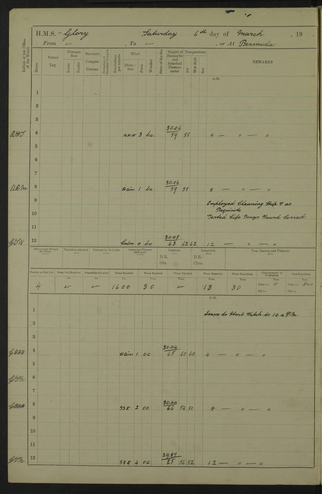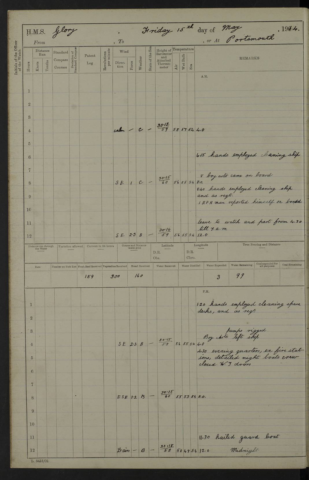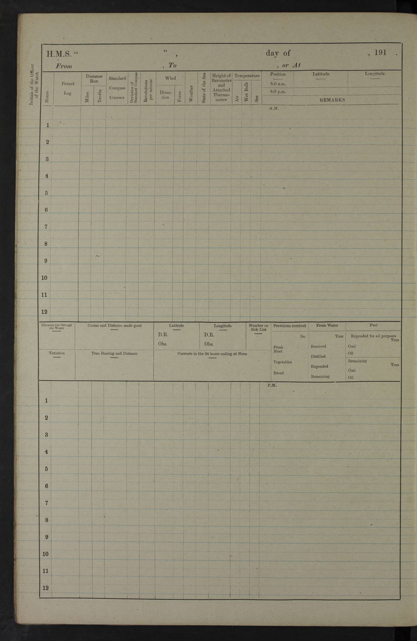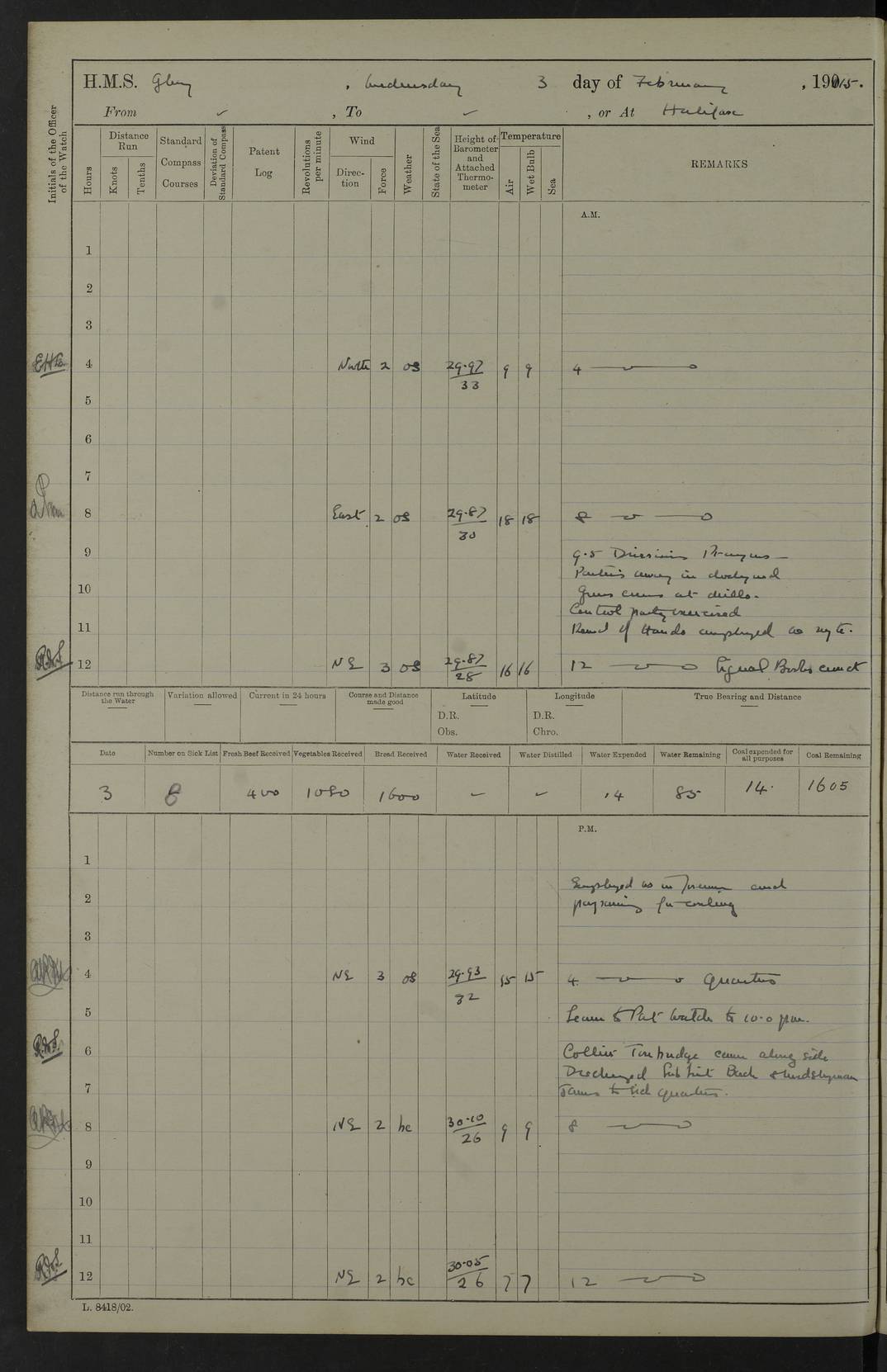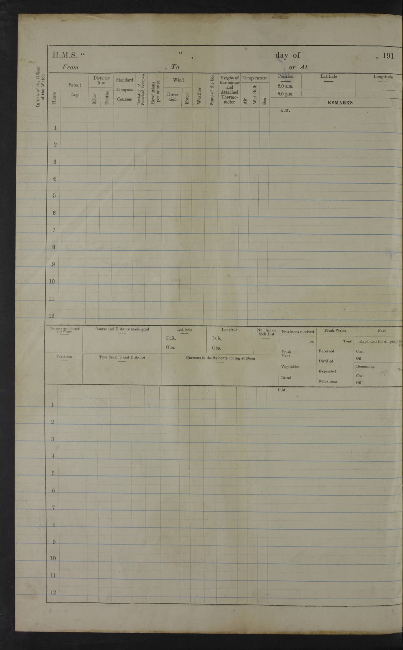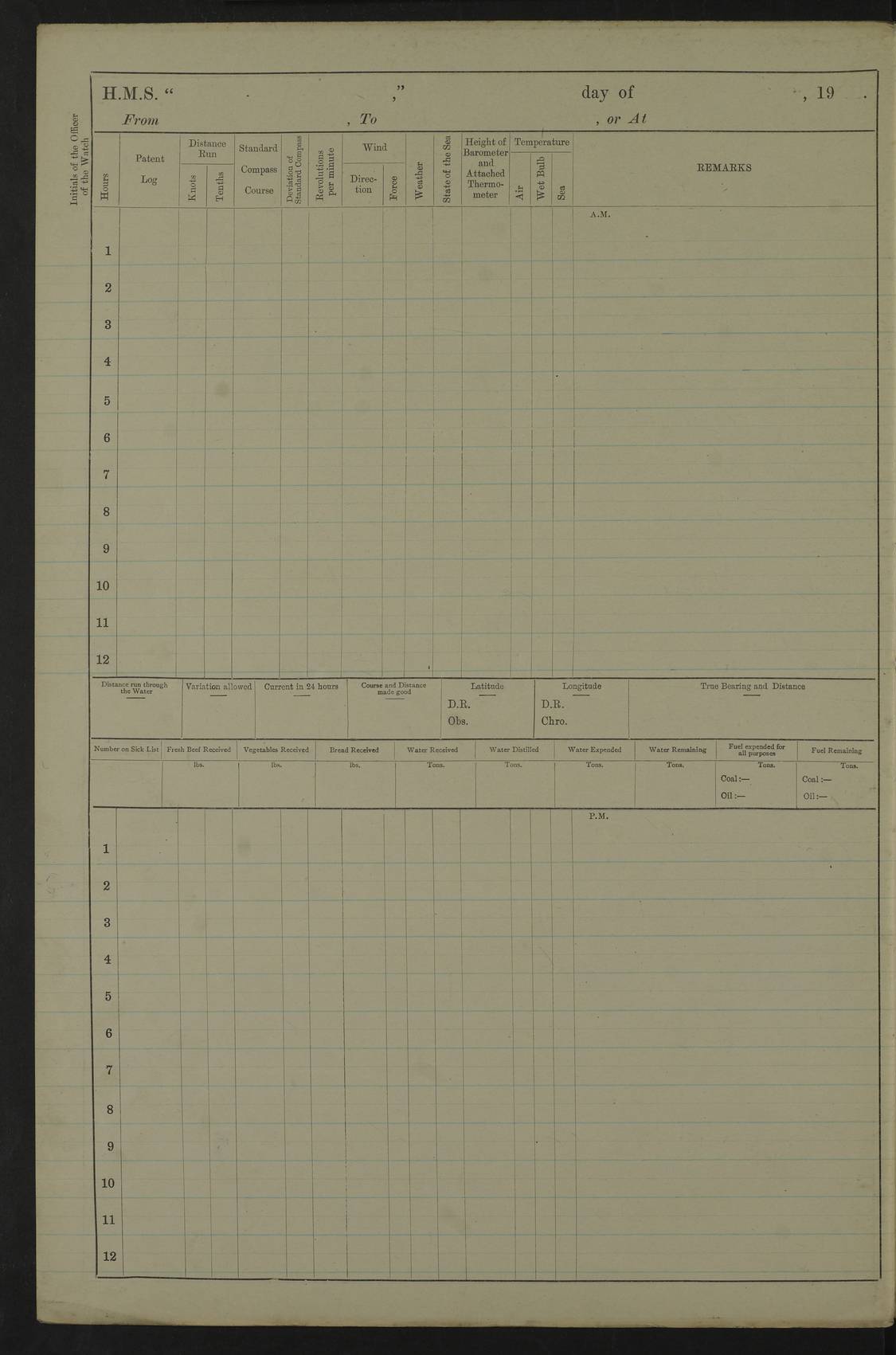 22 June 1915 At sea, Gibraltar to Lemnos Lat 36.1, Long -1.3 4.15am: Sighted land on starboard bow. 10.20am: Stopped port engine for repairs. 11.20am: proceeded with port engine. pm: a/c due to change in deviation. 10.00pm: Cape Tenez Light abeam, 18 miles. 4f73cd61a2fc8ea9030015f6: (https://s3.amazonaws.com:443/oldweather/ADM53-43015/0012_1.jpg) 23 June 1915 At sea, Gibraltar to Lemnos Lat 37.5, Long 4.8 Number on sick list: 4 5.00am: Secured from night defence stations. Placed anti-submarine guns. pm: Life saving appliances served out to men stationed in ? ?at abandon ship. 4f73cd61a2fc8ea9030015f7: (https://s3.amazonaws.com:443/oldweather/ADM53-43015/0013_0.jpg) 24 June 1915 At sea, Gibraltar to Lemnos Lat 37.4, Long 10.8 Position in log clearly bears no resemblance to the location of the ship. Position above is approximate and is based sighting of Zembra Island at 11.55am. 5.00am: Dispersed from night defence stations. Manned anti-submarine guns. am: Sighted two French torpedo boats. am: Torpedo boats passed to ~ No 362, 363. am: Sighted land on starboard beam. 11.55am: Zembra Island abeam, 25 miles. 2.00pm: Sighted Pantellaria S34ºE. 4.45pm: Pantellaria Light House abeam 12 miles. 4f73cd61a2fc8ea9030015f8: (https://s3.amazonaws.com:443/oldweather/ADM53-43015/0013_1.jpg) 25 June 1915 At sea, Gibraltar to Lemnos Lat 35.5, Long 16.7 2.10am: Gozo Light abeam 17 miles. 5.00am: Dispersed from night defence stations. Manned anti-submarine guns. 4f73cd61a2fc8ea9030015f9: (https://s3.amazonaws.com:443/oldweather/ADM53-43015/0014_0.jpg) 26 June 1915 At sea, Gibraltar to Lemnos Lat 35.5, Long 22.6 Number on sick list: 5 5.00am: Dispersed from night defence stations. Manned anti-submarine guns. am: Aired night clothing. am: marines at maxim practice on quarter deck. 2.00pm: Observed land on either bow. 3.00pm: Sighted French patrol destroyer. 4.15pm: Sighted French patrol destroyer. 9.40pm: Milo Peak N63ºW. 10.26pm: Polino Light abeam to port 5.5 miles. 4f73cd62a2fc8ea9030015fa: (https://s3.amazonaws.com:443/oldweather/ADM53-43015/0014_1.jpg) 27 June 1915 At sea and at Lemnos Lat 39.1, Long 24.4 From 0.50 to 3.05am sighting of multiple light houses. 3.50am: a/c to N39ºW and commenced to zig-zag. 5.00am: Dispersed from night defence stations and placed anti-submarine guns and look-outs. am: Lost overboard by accident Hazlewood fender, pat. 311, one in number. 10.30am: Held Divine Service onboard. pm: Met and signalled HMS Minerva on patrol duty. pm: Courses and speeds as requisite while waiting orders to approach Mudros. 3.00pm: Proceeded. 5.16pm: Increased to 90 revs, commenced to zig-zag. Course as requisite for Mudros. 7.00pm: Entered Mudros Bay. 7.47pm: Stopped. Let go port anchor in ‘M3’. 8.30pm: Darkened ship. pm: Manned one 6” and one 12 pdr. 4f73cd62a2fc8ea9030015fb: (https://s3.amazonaws.com:443/oldweather/ADM53-43015/0015_0.jpg) 28 June 1915 Mudros Bay, Lemnos Lat 39.89, Long 25.24 5,00am: HMS Vengeance entered harbour. HMS Vengeance was a pre-dreadnought of the Canopus class, launched in 1899 at Vickers, Barrow, and sold for scrapping in 1921. Details at http://en.wikipedia.org/wiki/HMS_Vengeance_(1899) . am/pm/: hands preparing for coaling and about ship’s work. pm: Collier Wabana secured alongside. 4f73cd62a2fc8ea9030015fc: (https://s3.amazonaws.com:443/oldweather/ADM53-43015/0015_1.jpg) 29 June 1915 Mudros Bay, Lemnos Lat 39.89, Long 25.24 5.15am: Commenced coaling. 2.00pm: Finished coaling. Collier left. 4f73cd62a2fc8ea9030015fd: (https://s3.amazonaws.com:443/oldweather/ADM53-43015/0016_0.jpg) 30 June 1915 Mudros Bay, Lemnos Lat 39.89, Long 25.24 am: Parties away sanding, and with fire engines onshore. am: Boats away disembarking troops. am: French Flagship Patrie sailed. The Patrie was a French pre-dreadnought, launched at La Seyne shipyard in 1903, and stricken in 1921. Details at http://en.wikipedia.org/wiki/French_battleship_Patrie . 6.30pm: Hands to bathe. 4f73cd63a2fc8ea9030015fe: (https://s3.amazonaws.com:443/oldweather/ADM53-43015/0016_1.jpg) 4f73cd63a2fc8ea9030015ff: (https://s3.amazonaws.com:443/oldweather/ADM53-43015/0017_0.jpg) 4f73cd63a2fc8ea903001600: (https://s3.amazonaws.com:443/oldweather/ADM53-43015/0017_1.jpg) 4f73cd63a2fc8ea903001601: (https://s3.amazonaws.com:443/oldweather/ADM53-43015/0018_0.jpg) 4f73cd64a2fc8ea903001602: (https://s3.amazonaws.com:443/oldweather/ADM53-43015/0018_1.jpg) LOGS FOR JULY 1915 From July to October 1915, HMS Glory spent her time at Port Mudros. Certain activities typically took place daily and are not generally noted in the pages below. These activities include: Lighting fires in the picket boat around 4am and drawing the fires in the late evening; Divisions at around 9–9.30am and Evening Quarters at 4pm; Darken ship at around 8.30pm; Daily ‘cleaning ship’, with variations thereof; SBC (for ‘Signal Books Correct’) at the watch changes. 4f73cd64a2fc8ea903001603: (https://s3.amazonaws.com:443/oldweather/ADM53-43016/0000_0.jpg) 4f73cd64a2fc8ea903001604: (https://s3.amazonaws.com:443/oldweather/ADM53-43016/0000_1.jpg) 4f73cd65a2fc8ea903001605: (https://s3.amazonaws.com:443/oldweather/ADM53-43016/0001_0.jpg) 4f73cd65a2fc8ea903001606: (https://s3.amazonaws.com:443/oldweather/ADM53-43016/0001_1.jpg) 1 July 1915 Port Mudros Lat 39.89, Long 25.24 6.30am: Landed working parties preparing boom defence ships. am: Discharged Acting Commander Rayne to Hector. Hector was a kite balloon ship. No further details readily available. 5.00pm: Tug T.10 made fast astern. 7.15pm: HMS Venerable went out. 7.30pm: HMS Chatham went out. HMS Chatham was a ‘Town’ cruiser and lead ship of her class. She was launched in 1911 at Chatham Dockyard and sold in 1926. Details at http://en.wikipedia.org/wiki/HMS_Chatham_(1911) . 4f73cd65a2fc8ea903001607: (https://s3.amazonaws.com:443/oldweather/ADM53-43016/0002_0.jpg) 2 July 1915 Port Mudros Lat 39.89, Long 25.24 5.35am: Landed working parties preparing boom defence ships. am/pm: Boom defence par