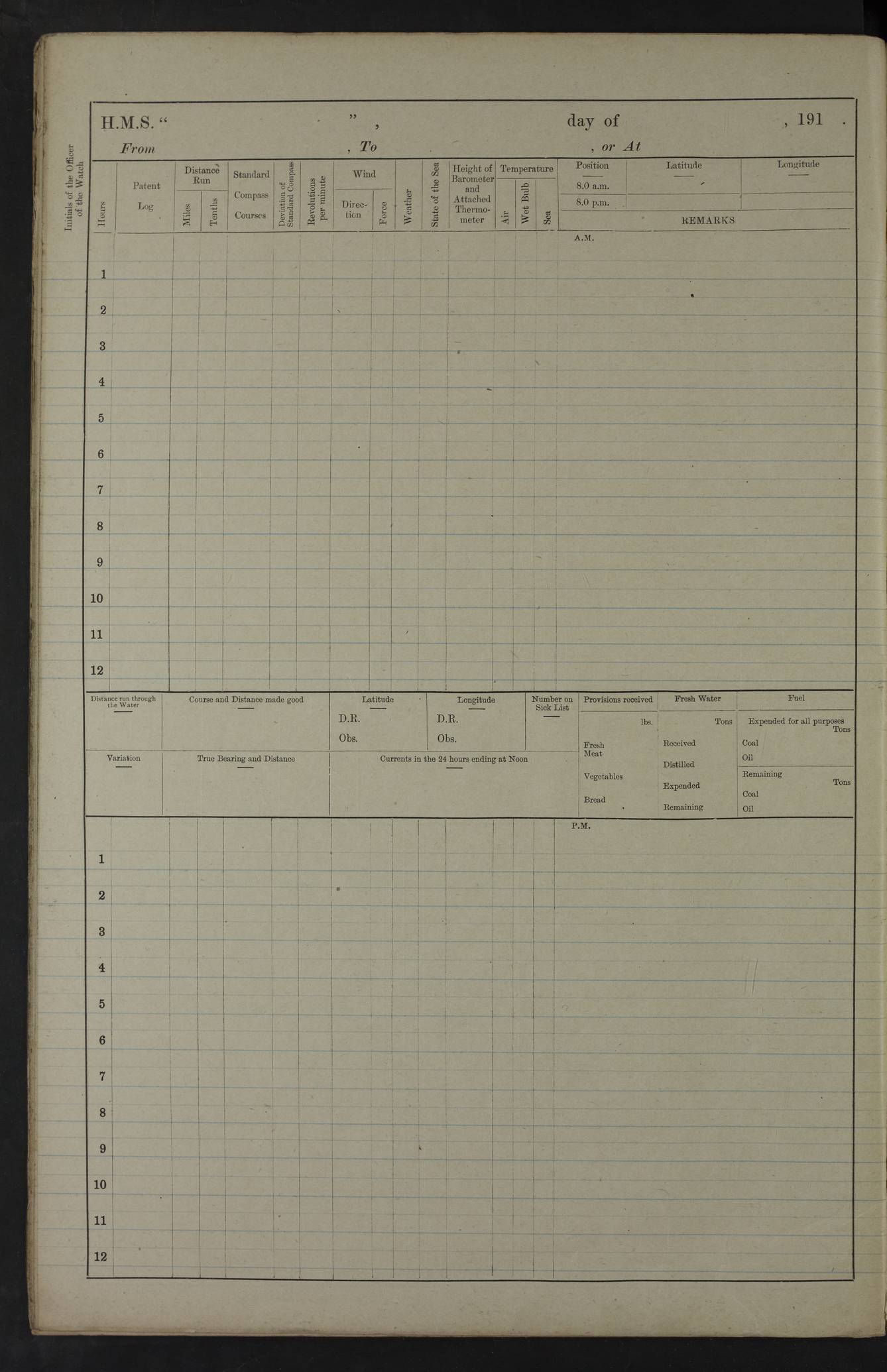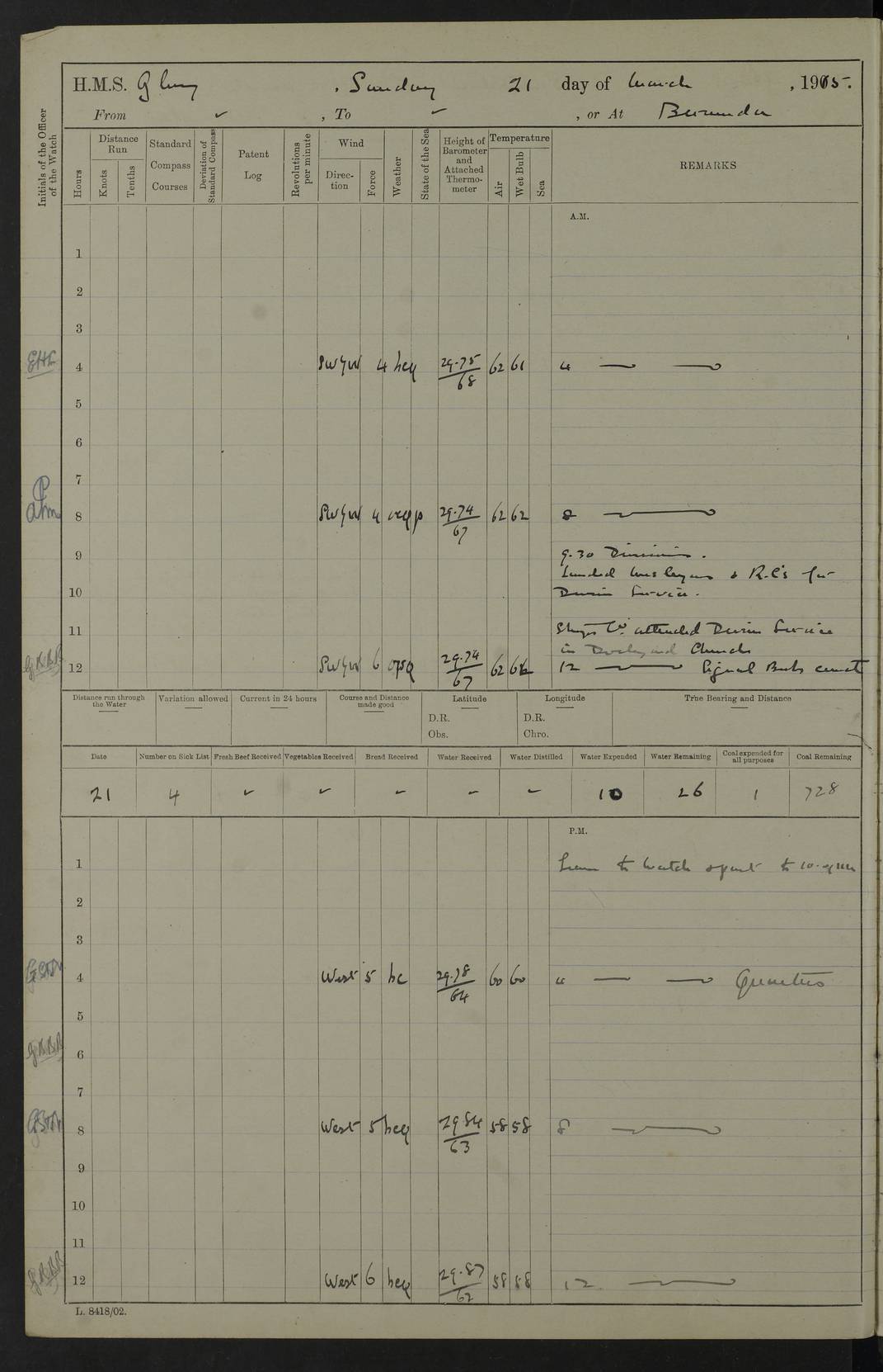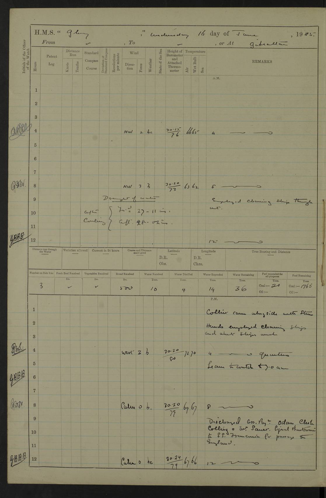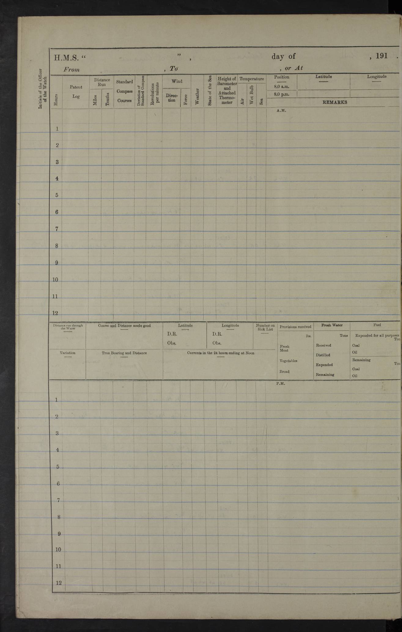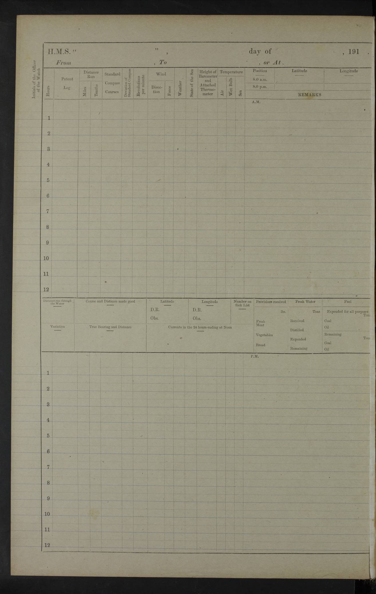22 June 1915 At sea, Gibraltar to Lemnos Lat 36.1, Long -1.3 4.15am: Sighted land on starboard bow. 10.20am: Stopped port engine for repairs. 11.20am: proceeded with port engine. pm: a/c due to change in deviation. 10.00pm: Cape Tenez Light abeam, 18 miles. 4f73cd61a2fc8ea9030015f6: (https://s3.amazonaws.com:443/oldweather/ADM53-43015/0012_1.jpg) 23 June 1915 At sea, Gibraltar to Lemnos Lat 37.5, Long 4.8 Number on sick list: 4 5.00am: Secured from night defence stations. Placed anti-submarine guns. pm: Life saving appliances served out to men stationed in ? ?at abandon ship. 4f73cd61a2fc8ea9030015f7: (https://s3.amazonaws.com:443/oldweather/ADM53-43015/0013_0.jpg) 24 June 1915 At sea, Gibraltar to Lemnos Lat 37.4, Long 10.8 Position in log clearly bears no resemblance to the location of the ship. Position above is approximate and is based sighting of Zembra Island at 11.55am. 5.00am: Dispersed from night defence stations. Manned anti-submarine guns. am: Sighted two French torpedo boats. am: Torpedo boats passed to ~ No 362, 363. am: Sighted land on starboard beam. 11.55am: Zembra Island abeam, 25 miles. 2.00pm: Sighted Pantellaria S34ºE. 4.45pm: Pantellaria Light House abeam 12 miles. 4f73cd61a2fc8ea9030015f8: (https://s3.amazonaws.com:443/oldweather/ADM53-43015/0013_1.jpg) 25 June 1915 At sea, Gibraltar to Lemnos Lat 35.5, Long 16.7 2.10am: Gozo Light abeam 17 miles. 5.00am: Dispersed from night defence stations. Manned anti-submarine guns. 4f73cd61a2fc8ea9030015f9: (https://s3.amazonaws.com:443/oldweather/ADM53-43015/0014_0.jpg) 26 June 1915 At sea, Gibraltar to Lemnos Lat 35.5, Long 22.6 Number on sick list: 5 5.00am: Dispersed from night defence stations. Manned anti-submarine guns. am: Aired night clothing. am: marines at maxim practice on quarter deck. 2.00pm: Observed land on either bow. 3.00pm: Sighted French patrol destroyer. 4.15pm: Sighted French patrol destroyer. 9.40pm: Milo Peak N63ºW. 10.26pm: Polino Light abeam to port 5.5 miles. 4f73cd62a2fc8ea9030015fa: (https://s3.amazonaws.com:443/oldweather/ADM53-43015/0014_1.jpg) 27 June 1915 At sea and at Lemnos Lat 39.1, Long 24.4 From 0.50 to 3.05am sighting of multiple light houses. 3.50am: a/c to N39ºW and commenced to zig-zag. 5.00am: Dispersed from night defence stations and placed anti-submarine guns and look-outs. am: Lost overboard by accident Hazlewood fender, pat. 311, one in number. 10.30am: Held Divine Service onboard. pm: Met and signalled HMS Minerva on patrol duty. pm: Courses and speeds as requisite while waiting orders to approach Mudros. 3.00pm: Proceeded. 5.16pm: Increased to 90 revs, commenced to zig-zag. Course as requisite for Mudros. 7.00pm: Entered Mudros Bay. 7.47pm: Stopped. Let go port anchor in ‘M3’. 8.30pm: Darkened ship. pm: Manned one 6” and one 12 pdr. 4f73cd62a2fc8ea9030015fb: (https://s3.amazonaws.com:443/oldweather/ADM53-43015/0015_0.jpg) 28 June 1915 Mudros Bay, Lemnos Lat 39.89, Long 25.24 5,00am: HMS Vengeance entered harbour. HMS Vengeance was a pre-dreadnought of the Canopus class, launched in 1899 at Vickers, Barrow, and sold for scrapping in 1921. Details at http://en.wikipedia.org/wiki/HMS_Vengeance_(1899) . am/pm/: hands preparing for coaling and about ship’s work. pm: Collier Wabana secured alongside. 4f73cd62a2fc8ea9030015fc: (https://s3.amazonaws.com:443/oldweather/ADM53-43015/0015_1.jpg) 29 June 1915 Mudros Bay, Lemnos Lat 39.89, Long 25.24 5.15am: Commenced coaling. 2.00pm: Finished coaling. Collier left. 4f73cd62a2fc8ea9030015fd: (https://s3.amazonaws.com:443/oldweather/ADM53-43015/0016_0.jpg) 30 June 1915 Mudros Bay, Lemnos Lat 39.89, Long 25.24 am: Parties away sanding, and with fire engines onshore. am: Boats away disembarking troops. am: French Flagship Patrie sailed. The Patrie was a French pre-dreadnought, launched at La Seyne shipyard in 1903, and stricken in 1921. Details at http://en.wikipedia.org/wiki/French_battleship_Patrie . 6.30pm: Hands to bathe. 4f73cd63a2fc8ea9030015fe: (https://s3.amazonaws.com:443/oldweather/ADM53-43015/0016_1.jpg) 4f73cd63a2fc8ea9030015ff: (https://s3.amazonaws.com:443/oldweather/ADM53-43015/0017_0.jpg) 4f73cd63a2fc8ea903001600: (https://s3.amazonaws.com:443/oldweather/ADM53-43015/0017_1.jpg) 4f73cd63a2fc8ea903001601: (https://s3.amazonaws.com:443/oldweather/ADM53-43015/0018_0.jpg) 4f73cd64a2fc8ea903001602: (https://s3.amazonaws.com:443/oldweather/ADM53-43015/0018_1.jpg) LOGS FOR JULY 1915 From July to October 1915, HMS Glory spent her time at Port Mudros. Certain activities typically took place daily and are not generally noted in the pages below. These activities include: Lighting fires in the picket boat around 4am and drawing the fires in the late evening; Divisions at around 9–9.30am and Evening Quarters at 4pm; Darken ship at around 8.30pm; Daily ‘cleaning ship’, with variations thereof; SBC (for ‘Signal Books Correct’) at the watch changes. 4f73cd64a2fc8ea903001603: (https://s3.amazonaws.com:443/oldweather/ADM53-43016/0000_0.jpg) 4f73cd64a2fc8ea903001604: (https://s3.amazonaws.com:443/oldweather/ADM53-43016/0000_1.jpg) 4f73cd65a2fc8ea903001605: (https://s3.amazonaws.com:443/oldweather/ADM53-43016/0001_0.jpg) 4f73cd65a2fc8ea903001606: (https://s3.amazonaws.com:443/oldweather/ADM53-43016/0001_1.jpg) 1 July 1915 Port Mudros Lat 39.89, Long 25.24 6.30am: Landed working parties preparing boom defence ships. am: Discharged Acting Commander Rayne to Hector. Hector was a kite balloon ship. No further details readily available. 5.00pm: Tug T.10 made fast astern. 7.15pm: HMS Venerable went out. 7.30pm: HMS Chatham went out. HMS Chatham was a ‘Town’ cruiser and lead ship of her class. She was launched in 1911 at Chatham Dockyard and sold in 1926. Details at http://en.wikipedia.org/wiki/HMS_Chatham_(1911) . 4f73cd65a2fc8ea903001607: (https://s3.amazonaws.com:443/oldweather/ADM53-43016/0002_0.jpg) 2 July 1915 Port Mudros Lat 39.89, Long 25.24 5.35am: Landed working parties preparing boom defence ships. am/pm: Boom defence par