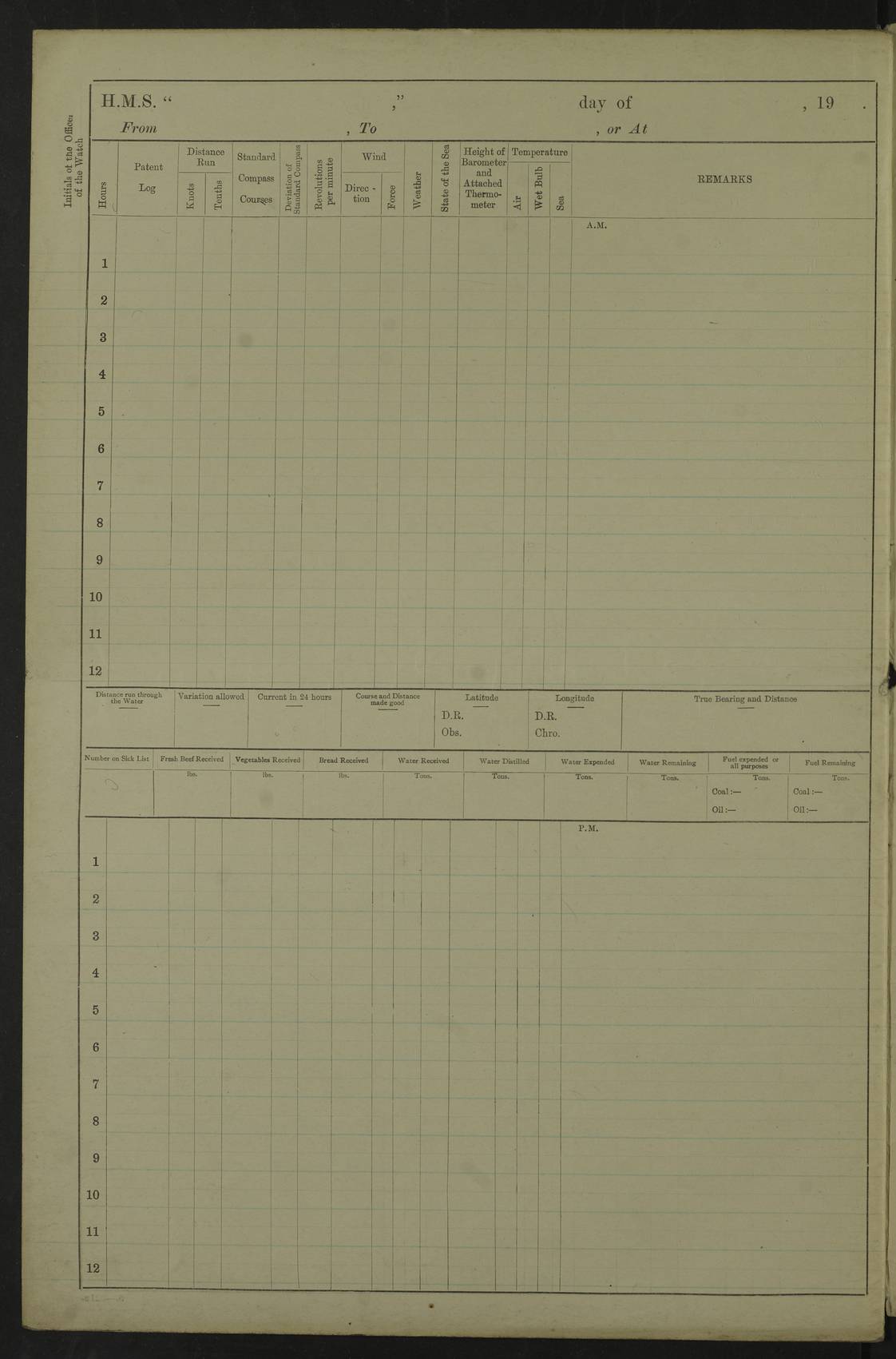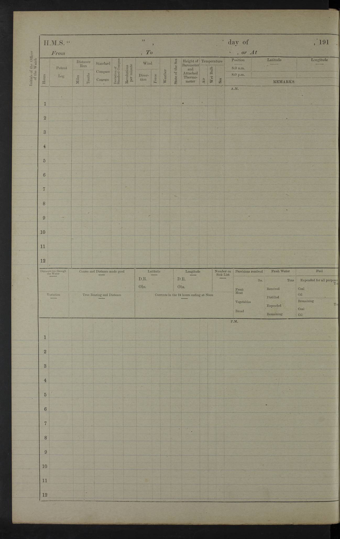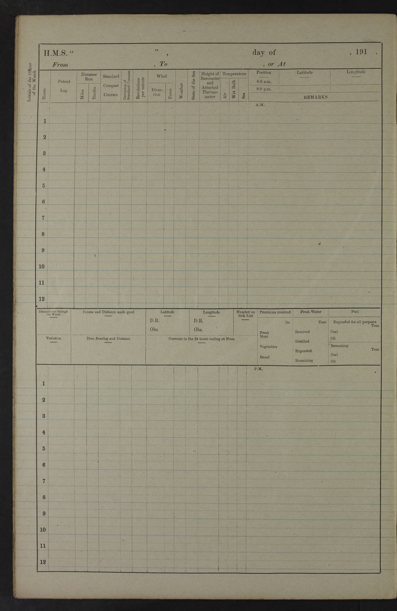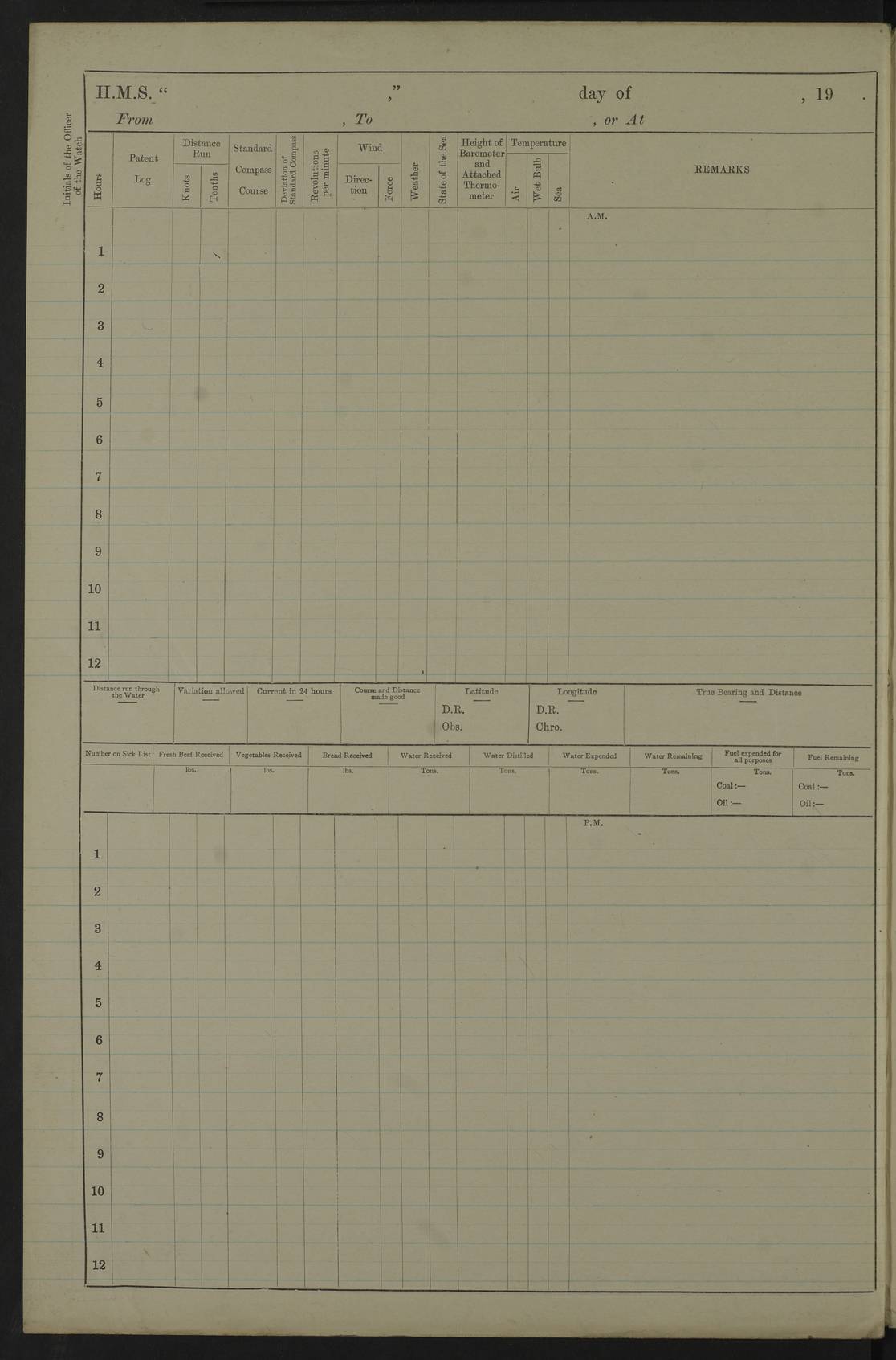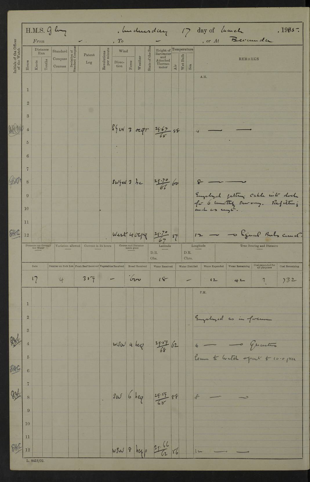 22 June 1915 At sea, Gibraltar to Lemnos Lat 36.1, Long -1.3 4.15am: Sighted land on starboard bow. 10.20am: Stopped port engine for repairs. 11.20am: proceeded with port engine. pm: a/c due to change in deviation. 10.00pm: Cape Tenez Light abeam, 18 miles. 4f73cd61a2fc8ea9030015f6: (https://s3.amazonaws.com:443/oldweather/ADM53-43015/0012_1.jpg) 23 June 1915 At sea, Gibraltar to Lemnos Lat 37.5, Long 4.8 Number on sick list: 4 5.00am: Secured from night defence stations. Placed anti-submarine guns. pm: Life saving appliances served out to men stationed in ? ?at abandon ship. 4f73cd61a2fc8ea9030015f7: (https://s3.amazonaws.com:443/oldweather/ADM53-43015/0013_0.jpg) 24 June 1915 At sea, Gibraltar to Lemnos Lat 37.4, Long 10.8 Position in log clearly bears no resemblance to the location of the ship. Position above is approximate and is based sighting of Zembra Island at 11.55am. 5.00am: Dispersed from night defence stations. Manned anti-submarine guns. am: Sighted two French torpedo boats. am: Torpedo boats passed to ~ No 362, 363. am: Sighted land on starboard beam. 11.55am: Zembra Island abeam, 25 miles. 2.00pm: Sighted Pantellaria S34ºE. 4.45pm: Pantellaria Light House abeam 12 miles. 4f73cd61a2fc8ea9030015f8: (https://s3.amazonaws.com:443/oldweather/ADM53-43015/0013_1.jpg) 25 June 1915 At sea, Gibraltar to Lemnos Lat 35.5, Long 16.7 2.10am: Gozo Light abeam 17 miles. 5.00am: Dispersed from night defence stations. Manned anti-submarine guns. 4f73cd61a2fc8ea9030015f9: (https://s3.amazonaws.com:443/oldweather/ADM53-43015/0014_0.jpg) 26 June 1915 At sea, Gibraltar to Lemnos Lat 35.5, Long 22.6 Number on sick list: 5 5.00am: Dispersed from night defence stations. Manned anti-submarine guns. am: Aired night clothing. am: marines at maxim practice on quarter deck. 2.00pm: Observed land on either bow. 3.00pm: Sighted French patrol destroyer. 4.15pm: Sighted French patrol destroyer. 9.40pm: Milo Peak N63ºW. 10.26pm: Polino Light abeam to port 5.5 miles. 4f73cd62a2fc8ea9030015fa: (https://s3.amazonaws.com:443/oldweather/ADM53-43015/0014_1.jpg) 27 June 1915 At sea and at Lemnos Lat 39.1, Long 24.4 From 0.50 to 3.05am sighting of multiple light houses. 3.50am: a/c to N39ºW and commenced to zig-zag. 5.00am: Dispersed from night defence stations and placed anti-submarine guns and look-outs. am: Lost overboard by accident Hazlewood fender, pat. 311, one in number. 10.30am: Held Divine Service onboard. pm: Met and signalled HMS Minerva on patrol duty. pm: Courses and speeds as requisite while waiting orders to approach Mudros. 3.00pm: Proceeded. 5.16pm: Increased to 90 revs, commenced to zig-zag. Course as requisite for Mudros. 7.00pm: Entered Mudros Bay. 7.47pm: Stopped. Let go port anchor in ‘M3’. 8.30pm: Darkened ship. pm: Manned one 6” and one 12 pdr. 4f73cd62a2fc8ea9030015fb: (https://s3.amazonaws.com:443/oldweather/ADM53-43015/0015_0.jpg) 28 June 1915 Mudros Bay, Lemnos Lat 39.89, Long 25.24 5,00am: HMS Vengeance entered harbour. HMS Vengeance was a pre-dreadnought of the Canopus class, launched in 1899 at Vickers, Barrow, and sold for scrapping in 1921. Details at http://en.wikipedia.org/wiki/HMS_Vengeance_(1899) . am/pm/: hands preparing for coaling and about ship’s work. pm: Collier Wabana secured alongside. 4f73cd62a2fc8ea9030015fc: (https://s3.amazonaws.com:443/oldweather/ADM53-43015/0015_1.jpg) 29 June 1915 Mudros Bay, Lemnos Lat 39.89, Long 25.24 5.15am: Commenced coaling. 2.00pm: Finished coaling. Collier left. 4f73cd62a2fc8ea9030015fd: (https://s3.amazonaws.com:443/oldweather/ADM53-43015/0016_0.jpg) 30 June 1915 Mudros Bay, Lemnos Lat 39.89, Long 25.24 am: Parties away sanding, and with fire engines onshore. am: Boats away disembarking troops. am: French Flagship Patrie sailed. The Patrie was a French pre-dreadnought, launched at La Seyne shipyard in 1903, and stricken in 1921. Details at http://en.wikipedia.org/wiki/French_battleship_Patrie . 6.30pm: Hands to bathe. 4f73cd63a2fc8ea9030015fe: (https://s3.amazonaws.com:443/oldweather/ADM53-43015/0016_1.jpg) 4f73cd63a2fc8ea9030015ff: (https://s3.amazonaws.com:443/oldweather/ADM53-43015/0017_0.jpg) 4f73cd63a2fc8ea903001600: (https://s3.amazonaws.com:443/oldweather/ADM53-43015/0017_1.jpg) 4f73cd63a2fc8ea903001601: (https://s3.amazonaws.com:443/oldweather/ADM53-43015/0018_0.jpg) 4f73cd64a2fc8ea903001602: (https://s3.amazonaws.com:443/oldweather/ADM53-43015/0018_1.jpg) LOGS FOR JULY 1915 From July to October 1915, HMS Glory spent her time at Port Mudros. Certain activities typically took place daily and are not generally noted in the pages below. These activities include: Lighting fires in the picket boat around 4am and drawing the fires in the late evening; Divisions at around 9–9.30am and Evening Quarters at 4pm; Darken ship at around 8.30pm; Daily ‘cleaning ship’, with variations thereof; SBC (for ‘Signal Books Correct’) at the watch changes. 4f73cd64a2fc8ea903001603: (https://s3.amazonaws.com:443/oldweather/ADM53-43016/0000_0.jpg) 4f73cd64a2fc8ea903001604: (https://s3.amazonaws.com:443/oldweather/ADM53-43016/0000_1.jpg) 4f73cd65a2fc8ea903001605: (https://s3.amazonaws.com:443/oldweather/ADM53-43016/0001_0.jpg) 4f73cd65a2fc8ea903001606: (https://s3.amazonaws.com:443/oldweather/ADM53-43016/0001_1.jpg) 1 July 1915 Port Mudros Lat 39.89, Long 25.24 6.30am: Landed working parties preparing boom defence ships. am: Discharged Acting Commander Rayne to Hector. Hector was a kite balloon ship. No further details readily available. 5.00pm: Tug T.10 made fast astern. 7.15pm: HMS Venerable went out. 7.30pm: HMS Chatham went out. HMS Chatham was a ‘Town’ cruiser and lead ship of her class. She was launched in 1911 at Chatham Dockyard and sold in 1926. Details at http://en.wikipedia.org/wiki/HMS_Chatham_(1911) . 4f73cd65a2fc8ea903001607: (https://s3.amazonaws.com:443/oldweather/ADM53-43016/0002_0.jpg) 2 July 1915 Port Mudros Lat 39.89, Long 25.24 5.35am: Landed working parties preparing boom defence ships. am/pm: Boom defence par