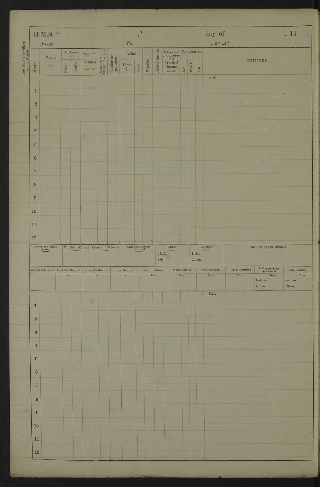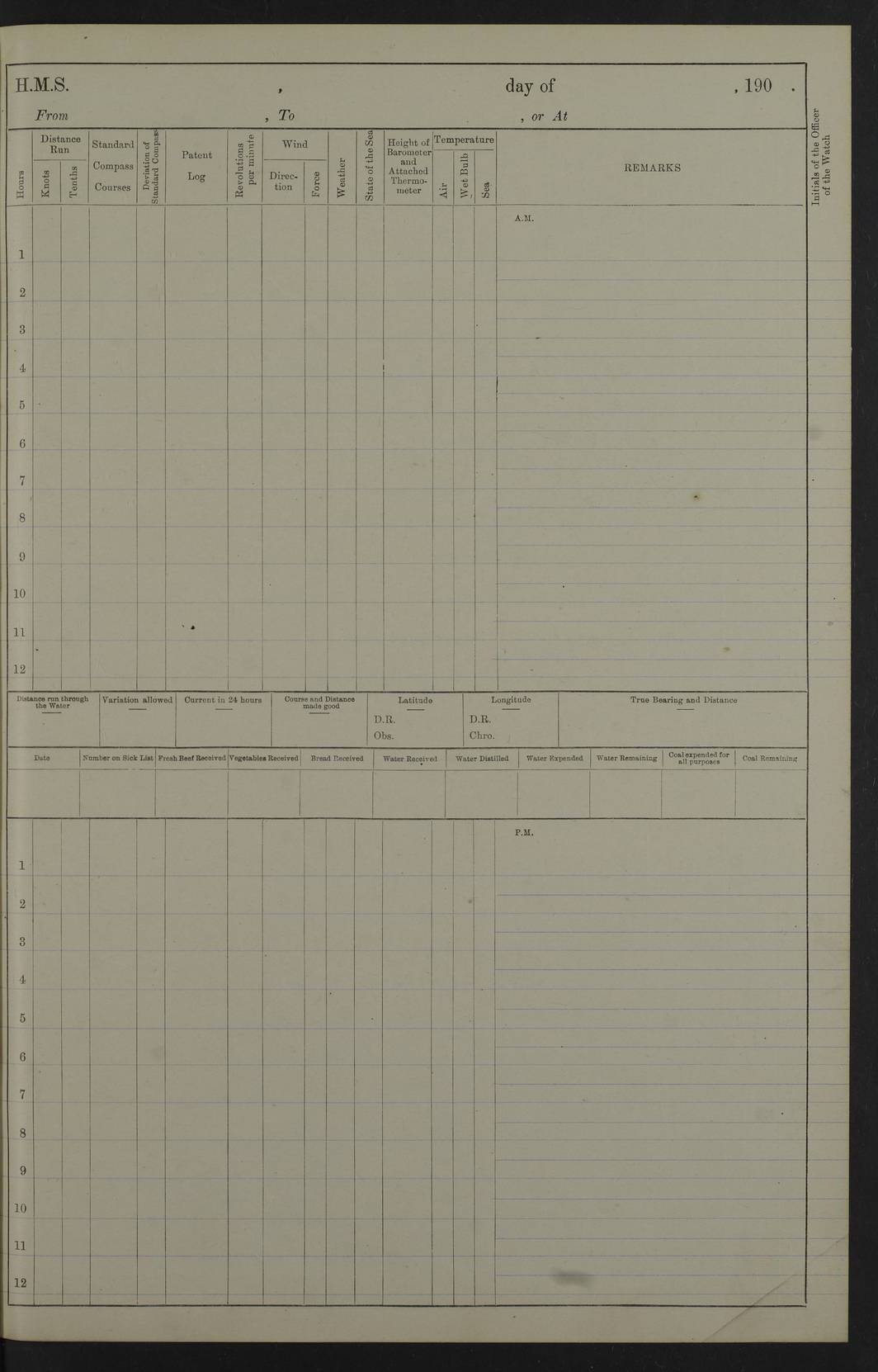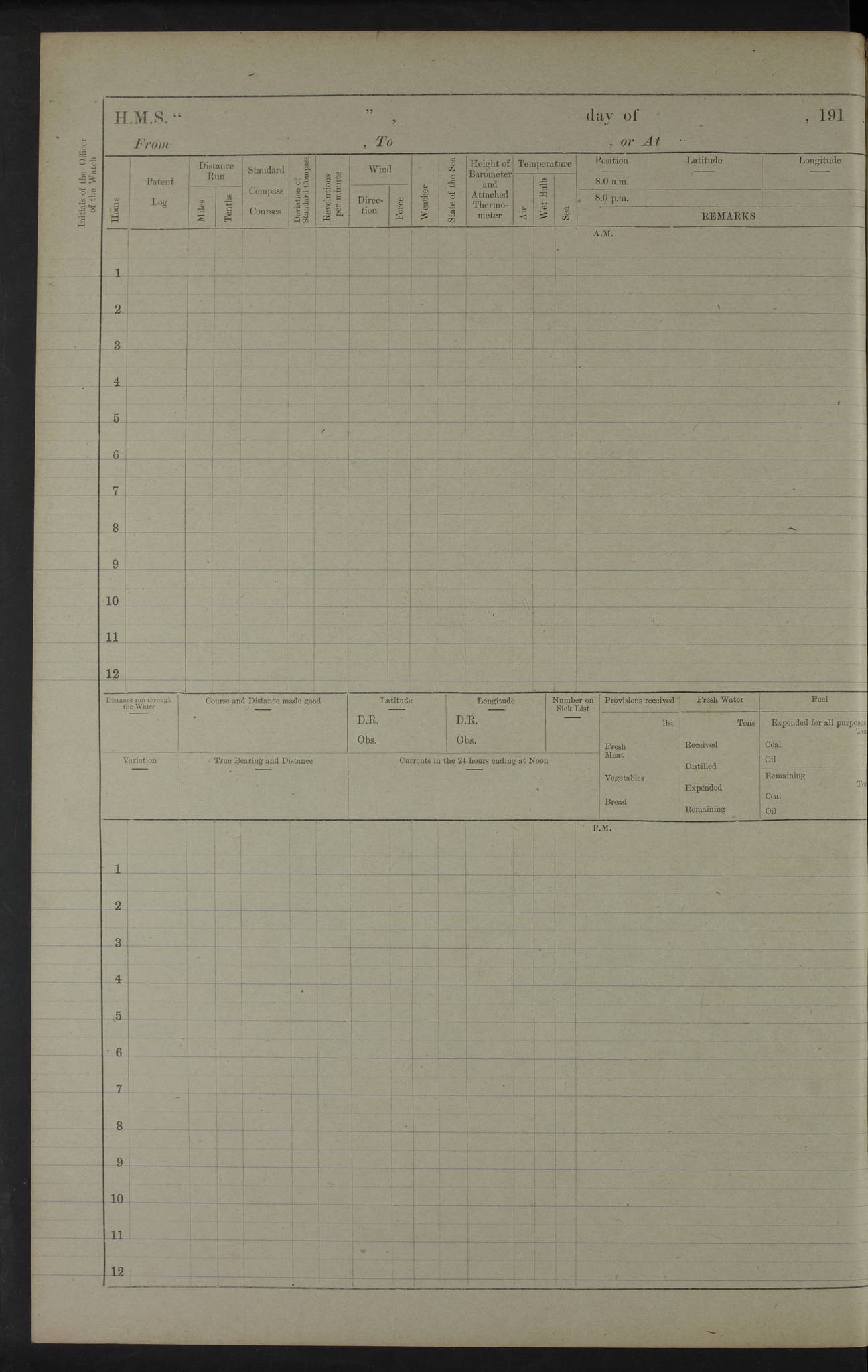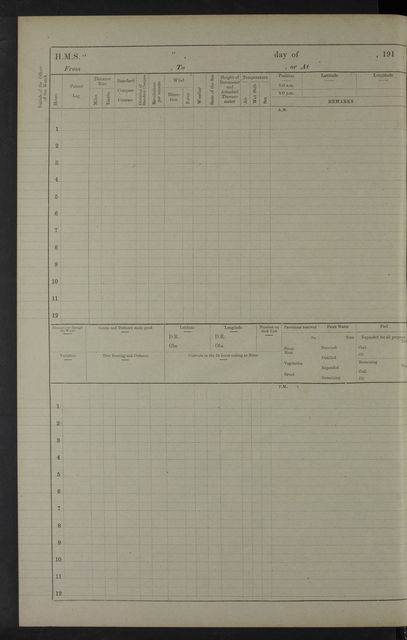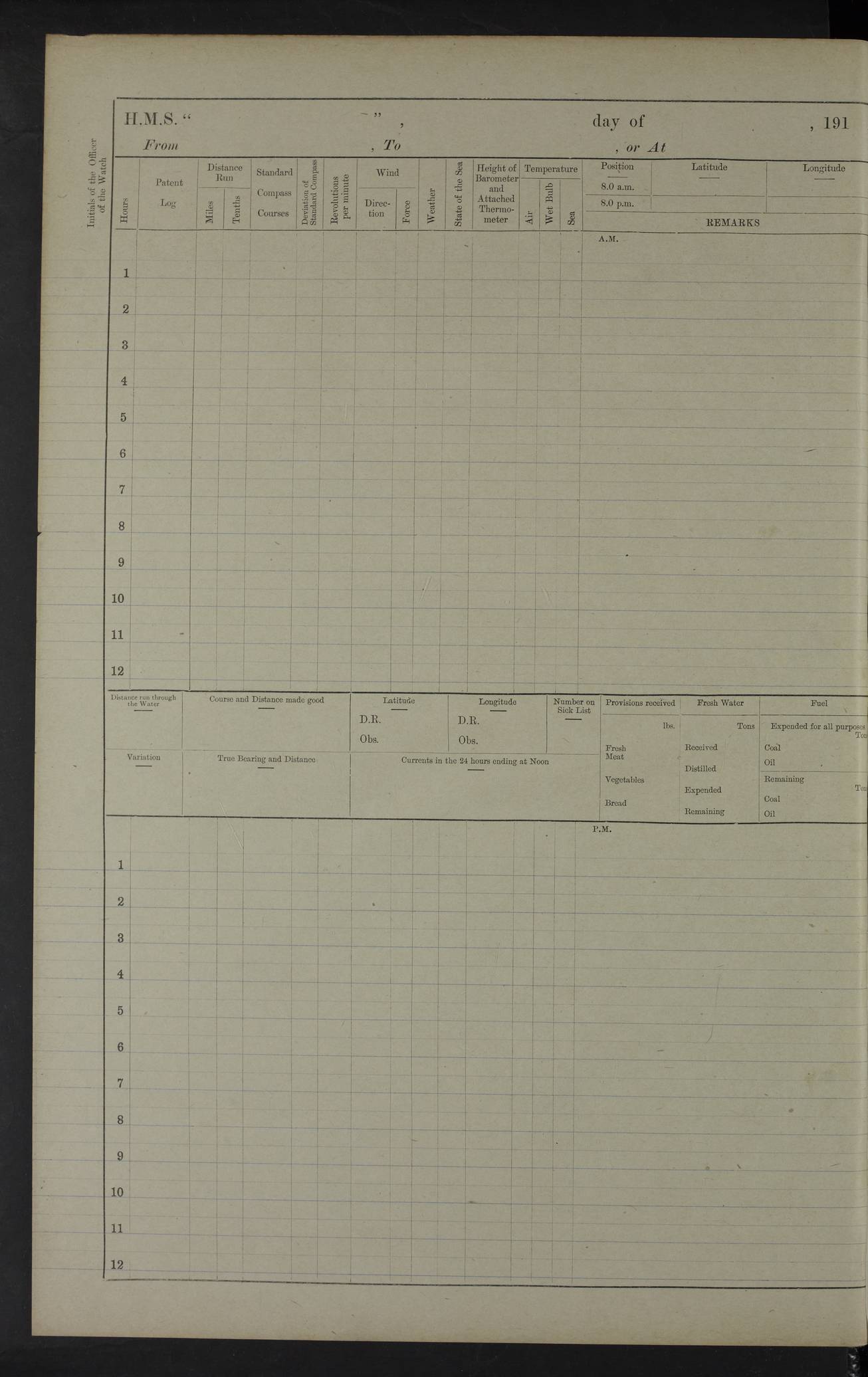 22 June 1915 At sea, Gibraltar to Lemnos Lat 36.1, Long -1.3 4.15am: Sighted land on starboard bow. 10.20am: Stopped port engine for repairs. 11.20am: proceeded with port engine. pm: a/c due to change in deviation. 10.00pm: Cape Tenez Light abeam, 18 miles. 4f73cd61a2fc8ea9030015f6: (https://s3.amazonaws.com:443/oldweather/ADM53-43015/0012_1.jpg) 23 June 1915 At sea, Gibraltar to Lemnos Lat 37.5, Long 4.8 Number on sick list: 4 5.00am: Secured from night defence stations. Placed anti-submarine guns. pm: Life saving appliances served out to men stationed in ? ?at abandon ship. 4f73cd61a2fc8ea9030015f7: (https://s3.amazonaws.com:443/oldweather/ADM53-43015/0013_0.jpg) 24 June 1915 At sea, Gibraltar to Lemnos Lat 37.4, Long 10.8 Position in log clearly bears no resemblance to the location of the ship. Position above is approximate and is based sighting of Zembra Island at 11.55am. 5.00am: Dispersed from night defence stations. Manned anti-submarine guns. am: Sighted two French torpedo boats. am: Torpedo boats passed to ~ No 362, 363. am: Sighted land on starboard beam. 11.55am: Zembra Island abeam, 25 miles. 2.00pm: Sighted Pantellaria S34ºE. 4.45pm: Pantellaria Light House abeam 12 miles. 4f73cd61a2fc8ea9030015f8: (https://s3.amazonaws.com:443/oldweather/ADM53-43015/0013_1.jpg) 25 June 1915 At sea, Gibraltar to Lemnos Lat 35.5, Long 16.7 2.10am: Gozo Light abeam 17 miles. 5.00am: Dispersed from night defence stations. Manned anti-submarine guns. 4f73cd61a2fc8ea9030015f9: (https://s3.amazonaws.com:443/oldweather/ADM53-43015/0014_0.jpg) 26 June 1915 At sea, Gibraltar to Lemnos Lat 35.5, Long 22.6 Number on sick list: 5 5.00am: Dispersed from night defence stations. Manned anti-submarine guns. am: Aired night clothing. am: marines at maxim practice on quarter deck. 2.00pm: Observed land on either bow. 3.00pm: Sighted French patrol destroyer. 4.15pm: Sighted French patrol destroyer. 9.40pm: Milo Peak N63ºW. 10.26pm: Polino Light abeam to port 5.5 miles. 4f73cd62a2fc8ea9030015fa: (https://s3.amazonaws.com:443/oldweather/ADM53-43015/0014_1.jpg) 27 June 1915 At sea and at Lemnos Lat 39.1, Long 24.4 From 0.50 to 3.05am sighting of multiple light houses. 3.50am: a/c to N39ºW and commenced to zig-zag. 5.00am: Dispersed from night defence stations and placed anti-submarine guns and look-outs. am: Lost overboard by accident Hazlewood fender, pat. 311, one in number. 10.30am: Held Divine Service onboard. pm: Met and signalled HMS Minerva on patrol duty. pm: Courses and speeds as requisite while waiting orders to approach Mudros. 3.00pm: Proceeded. 5.16pm: Increased to 90 revs, commenced to zig-zag. Course as requisite for Mudros. 7.00pm: Entered Mudros Bay. 7.47pm: Stopped. Let go port anchor in ‘M3’. 8.30pm: Darkened ship. pm: Manned one 6” and one 12 pdr. 4f73cd62a2fc8ea9030015fb: (https://s3.amazonaws.com:443/oldweather/ADM53-43015/0015_0.jpg) 28 June 1915 Mudros Bay, Lemnos Lat 39.89, Long 25.24 5,00am: HMS Vengeance entered harbour. HMS Vengeance was a pre-dreadnought of the Canopus class, launched in 1899 at Vickers, Barrow, and sold for scrapping in 1921. Details at http://en.wikipedia.org/wiki/HMS_Vengeance_(1899) . am/pm/: hands preparing for coaling and about ship’s work. pm: Collier Wabana secured alongside. 4f73cd62a2fc8ea9030015fc: (https://s3.amazonaws.com:443/oldweather/ADM53-43015/0015_1.jpg) 29 June 1915 Mudros Bay, Lemnos Lat 39.89, Long 25.24 5.15am: Commenced coaling. 2.00pm: Finished coaling. Collier left. 4f73cd62a2fc8ea9030015fd: (https://s3.amazonaws.com:443/oldweather/ADM53-43015/0016_0.jpg) 30 June 1915 Mudros Bay, Lemnos Lat 39.89, Long 25.24 am: Parties away sanding, and with fire engines onshore. am: Boats away disembarking troops. am: French Flagship Patrie sailed. The Patrie was a French pre-dreadnought, launched at La Seyne shipyard in 1903, and stricken in 1921. Details at http://en.wikipedia.org/wiki/French_battleship_Patrie . 6.30pm: Hands to bathe. 4f73cd63a2fc8ea9030015fe: (https://s3.amazonaws.com:443/oldweather/ADM53-43015/0016_1.jpg) 4f73cd63a2fc8ea9030015ff: (https://s3.amazonaws.com:443/oldweather/ADM53-43015/0017_0.jpg) 4f73cd63a2fc8ea903001600: (https://s3.amazonaws.com:443/oldweather/ADM53-43015/0017_1.jpg) 4f73cd63a2fc8ea903001601: (https://s3.amazonaws.com:443/oldweather/ADM53-43015/0018_0.jpg) 4f73cd64a2fc8ea903001602: (https://s3.amazonaws.com:443/oldweather/ADM53-43015/0018_1.jpg) LOGS FOR JULY 1915 From July to October 1915, HMS Glory spent her time at Port Mudros. Certain activities typically took place daily and are not generally noted in the pages below. These activities include: Lighting fires in the picket boat around 4am and drawing the fires in the late evening; Divisions at around 9–9.30am and Evening Quarters at 4pm; Darken ship at around 8.30pm; Daily ‘cleaning ship’, with variations thereof; SBC (for ‘Signal Books Correct’) at the watch changes. 4f73cd64a2fc8ea903001603: (https://s3.amazonaws.com:443/oldweather/ADM53-43016/0000_0.jpg) 4f73cd64a2fc8ea903001604: (https://s3.amazonaws.com:443/oldweather/ADM53-43016/0000_1.jpg) 4f73cd65a2fc8ea903001605: (https://s3.amazonaws.com:443/oldweather/ADM53-43016/0001_0.jpg) 4f73cd65a2fc8ea903001606: (https://s3.amazonaws.com:443/oldweather/ADM53-43016/0001_1.jpg) 1 July 1915 Port Mudros Lat 39.89, Long 25.24 6.30am: Landed working parties preparing boom defence ships. am: Discharged Acting Commander Rayne to Hector. Hector was a kite balloon ship. No further details readily available. 5.00pm: Tug T.10 made fast astern. 7.15pm: HMS Venerable went out. 7.30pm: HMS Chatham went out. HMS Chatham was a ‘Town’ cruiser and lead ship of her class. She was launched in 1911 at Chatham Dockyard and sold in 1926. Details at http://en.wikipedia.org/wiki/HMS_Chatham_(1911) . 4f73cd65a2fc8ea903001607: (https://s3.amazonaws.com:443/oldweather/ADM53-43016/0002_0.jpg) 2 July 1915 Port Mudros Lat 39.89, Long 25.24 5.35am: Landed working parties preparing boom defence ships. am/pm: Boom defence par
